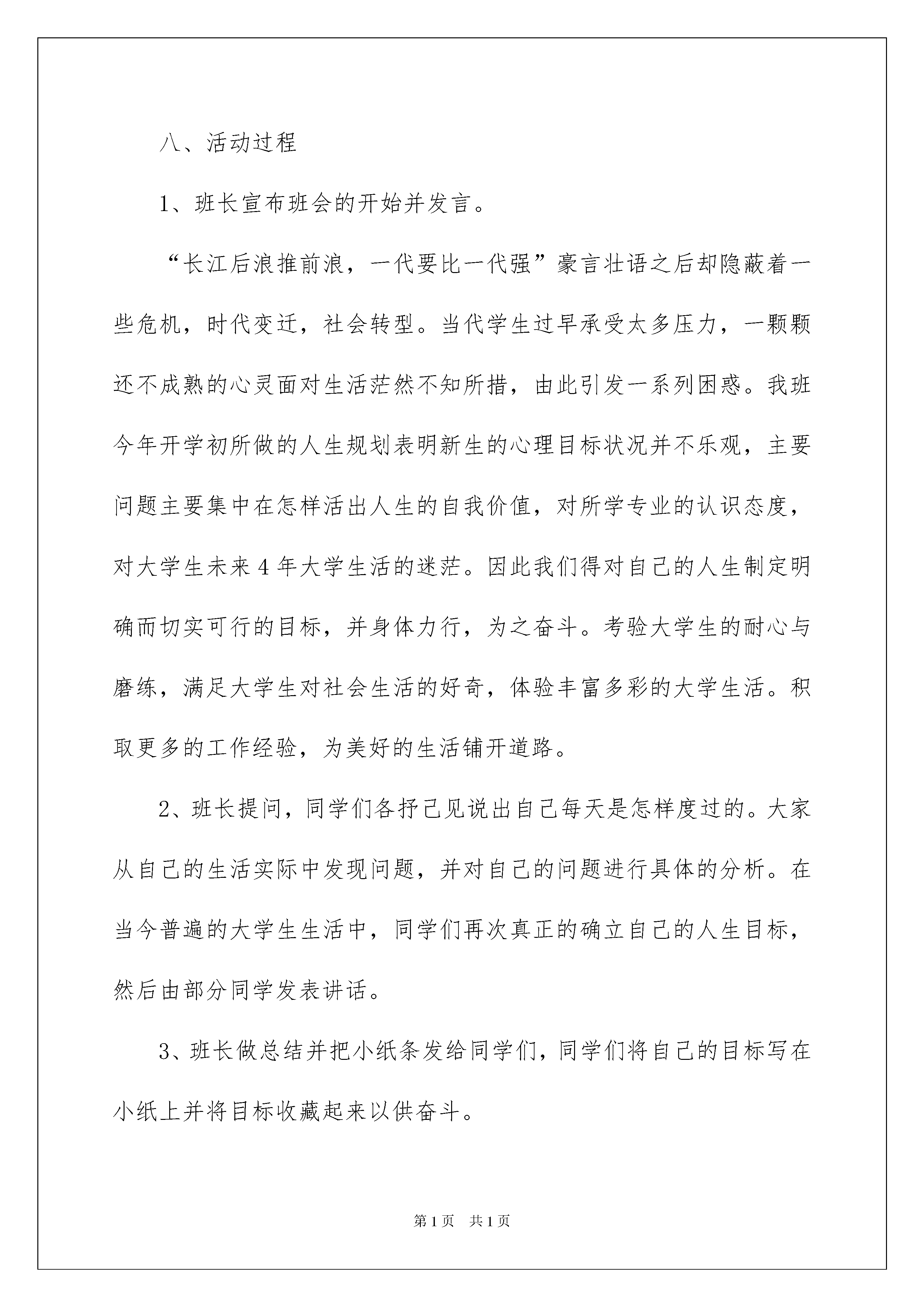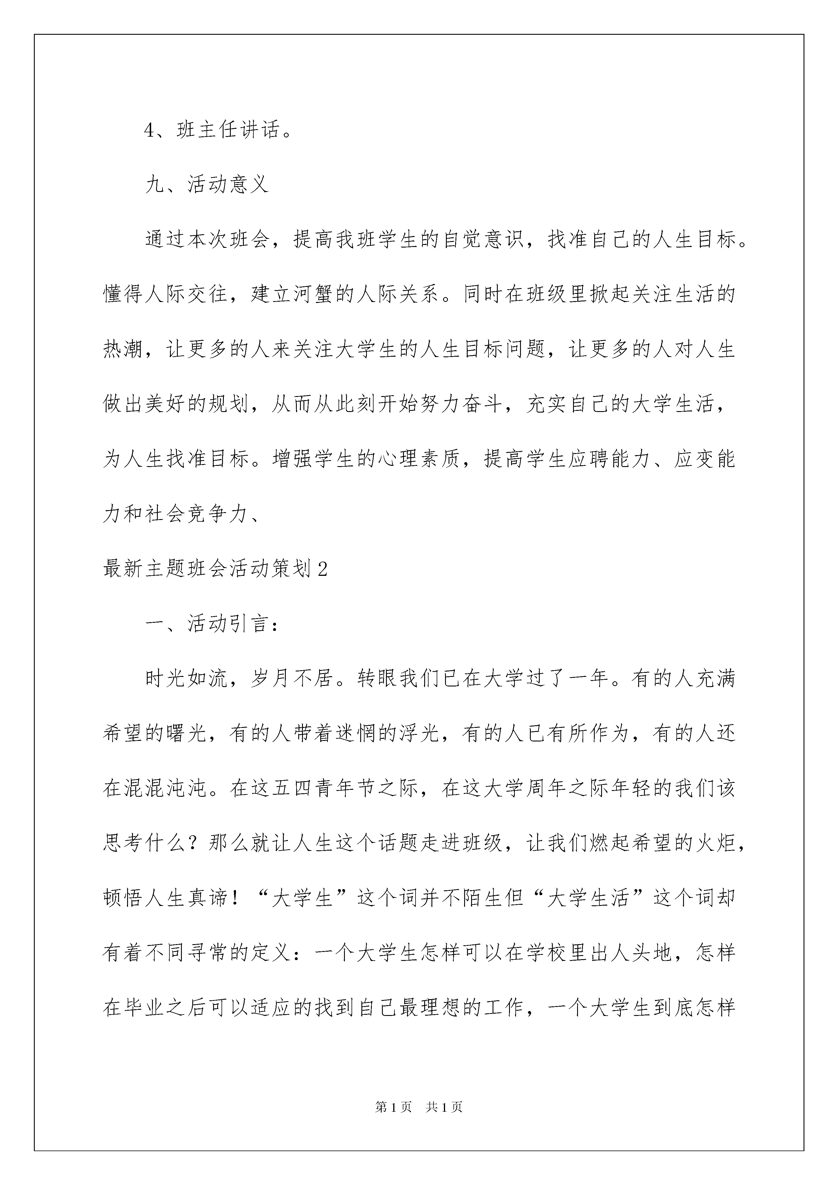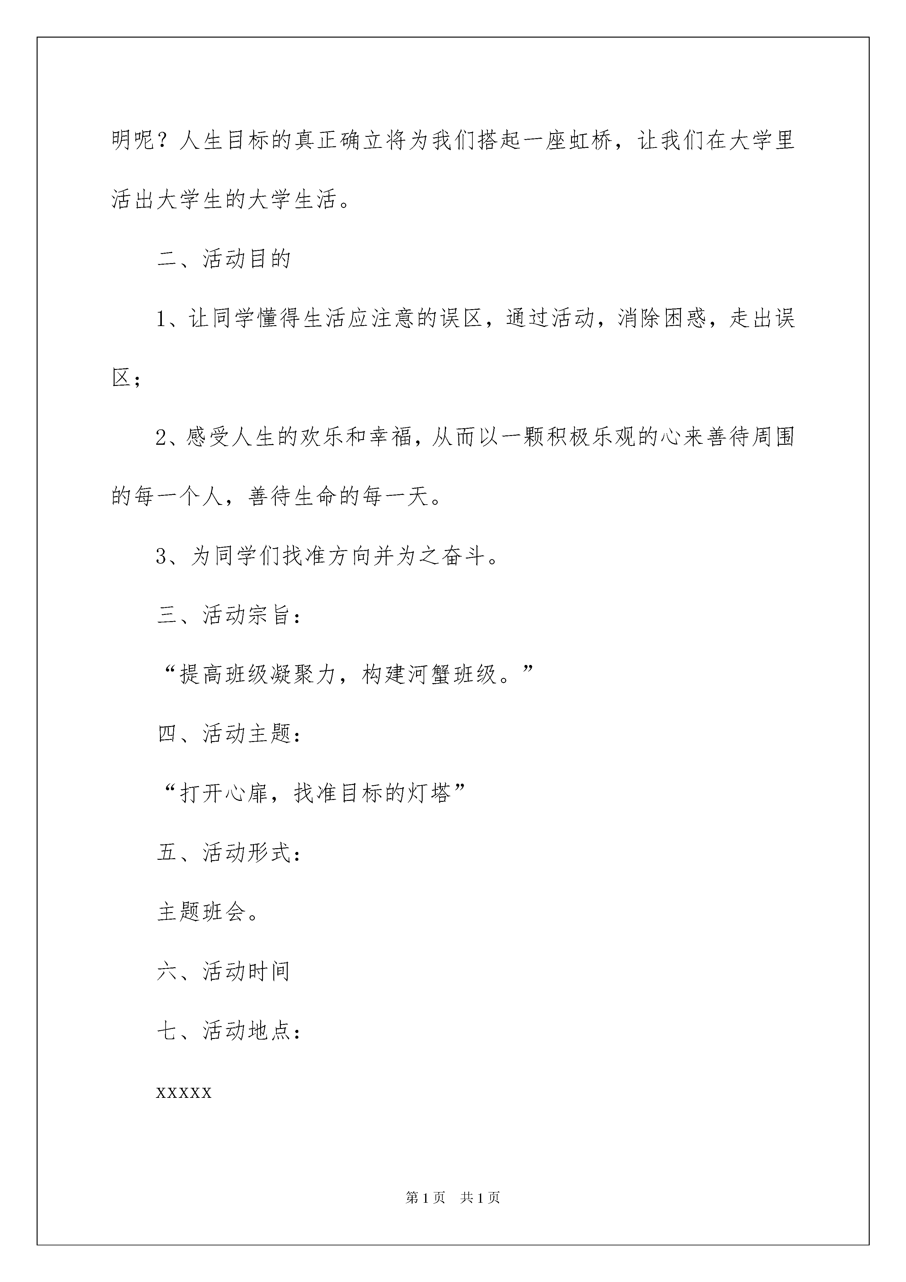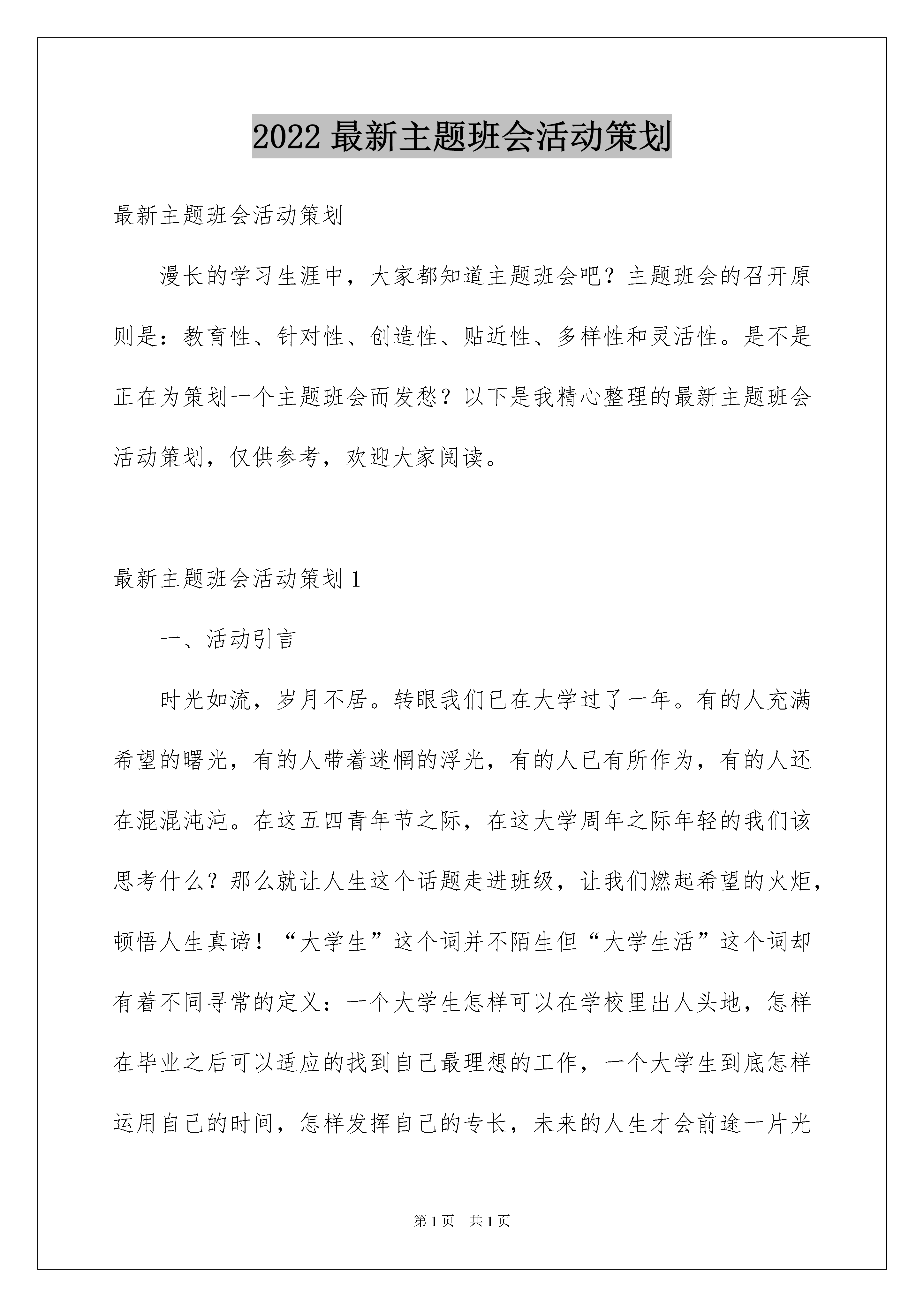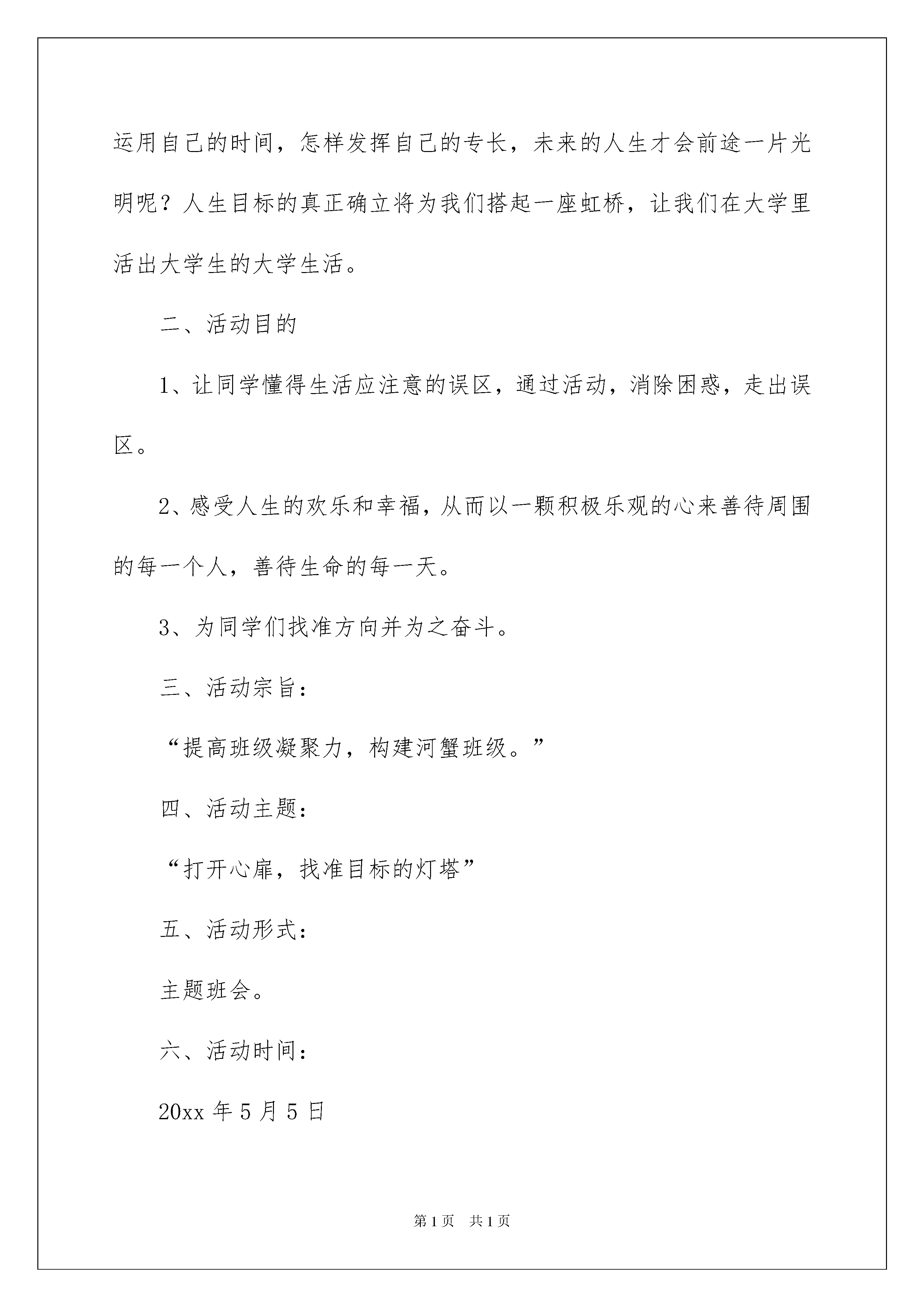 2022最新主题班会活动策划最新主题班会活动策划漫长的学习生涯中,大家都知道主题班会吧?主题班会的召开原则是:教育性、针对性、创造性、贴近性、多样性和灵活性。是不是正在为策划一个主题班会而发愁?以下是我精心整理的最新主题班会活动策划,仅供参考,欢迎大家阅读。最新主题班会活动策划1一、活动引言时光如流,岁月不居。转眼我们已在大学过了一年。有的人充满希望的曙光,有的人带着迷惘的浮光,有的人已有所作为,有的人还在混混沌沌。在这五四青年节之际,在这大学周年之际年轻的我们该思考什么?那么就让人生这个话题走进班级,让我们燃起希望的火炬,顿悟人生真谛!“大学生”这个词并不陌生但“大学生活”这个词却有着不同寻常的定义:一个大学生怎样可以在学校里出人头地,怎样在毕业之后可以适应的找到自己最理想的工作,一个大学生到底怎样运用自己的时间,怎样发挥自己的专长,未来的人生才会前途一片光明呢?人生目标的真正确立将为我们搭起一座虹桥,让我们在大学里活出大学生的大学生活。二、活动目的1、让同学懂得生活应注意的误区,通过活动,消除困惑,走出误区;2、感受人生的欢乐和幸福,从而以一颗积极乐观的心来善待周围的每一个人,善待生命的每一天。3、为同学们找准方向并为之奋斗。三、活动宗旨:“提高班级凝聚力,构建河蟹班级。”四、活动主题:“打开心扉,找准目标的灯塔”五、活动形式:主题班会。六、活动时间七、活动地点:xxxxx八、活动过程1、班长宣布班会的开始并发言。“长江后浪推前浪,一代要比一代强”豪言壮语之后却隐蔽着一些危机,时代变迁,社会转型。当代学生过早承受太多压力,一颗颗还不成熟的心灵面对生活茫然不知所措,由此引发一系列困惑。我班今年开学初所做的人生规划表明新生的心理目标状况并不乐观,主要问题主要集中在怎样活出人生的自我价值,对所学专业的认识态度,对大学生未来4年大学生活的迷茫。因此我们得对自己的人生制定明确而切实可行的目标,并身体力行,为之奋斗。考验大学生的耐心与磨练,满足大学生对社会生活的好奇,体验丰富多彩的大学生活。积取更多的工作经验,为美好的生活铺开道路。2、班长提问,同学们各抒己见说出自己每天是怎样度过的。大家从自己的生活实际中发现问题,并对自己的问题进行具体的分析。在当今普遍的大学生生活中,同学们再次真正的确立自己的人生目标,然后由部分同学发表讲话。3、班长做总结并把小纸条发给同学们,同学们将自己的目标写在小纸上并将目标收藏起来以供奋斗。4、班主任讲话。九、活动意义通过本次班会,提高我班学生的自觉意识,找准自己的人生目标。懂得人际交往,建立河蟹的人际关系。同时在班级里掀起关注生活的热潮,让更多的人来关注大学生的人生目标问题,让更多的人对人生做出美好的规划,从而从此刻开始努力奋斗,充实自己的大学生活,为人生找准目标。增强学生的心理素质,提高学生应聘能力、应变能力和社会竞争力、最新主题班会活动策划2一、活动引言:时光如流,岁月不居。转眼我们已在大学过了一年。有的人充满希望的曙光,有的人带着迷惘的浮光,有的人已有所作为,有的人还在混混沌沌。在这五四青年节之际,在这大学周年之际年轻的我们该思考什么?那么就让人生这个话题走进班级,让我们燃起希望的火炬,顿悟人生真谛!“大学生”这个词并不陌生但“大学生活”这个词却有着不同寻常的定义:一个大学生怎样可以在学校里出人头地,怎样在毕业之后可以适应的找到自己最理想的工作,一个大学生到底怎样运用自己的时间,怎样发挥自己的专长,未来的人生才会前途一片光明呢?人生目标的真正确立将为我们搭起一座虹桥,让我们在大学里活出大学生的大学生活。二、活动目的1、让同学懂得生活应注意的误区,通过活动,消除困惑,走出误区。2、感受人生的欢乐和幸福,从而以一颗积极乐观的心来善待周围的每一个人,善待生命的每一天。3、为同学们找准方向并为之奋斗。三、活动宗旨:“提高班级凝聚力,构建河蟹班级。”四、活动主题:“打开心扉,找准目标的灯塔”五、活动形式:主题班会。六、活动时间:20xx年5月5日七、活动地点:xxxxx八、活动过程1、班长宣布班会的开始并发言。“长江后浪推前浪,一代要比一代强”豪言壮语之后却隐蔽着一些危机,时代变迁,社会转型。当代学生过早承受太多压力,一颗颗还不成熟的心灵面对生活茫然不知所措,由此引发一系列困惑。我班今年开学初对20xx级所做的人生规划表明新生的心理目标状况并不乐观,主要问题主要集中在怎样活出人生的自我价值,对所学专业的认识态度,对大学生未来4年大学生活的迷茫。因此我们得对自己的人生制定明确而切实可行的目标,并身体力行,为之奋斗。考验80、90后大学生的耐心与磨练,满足大