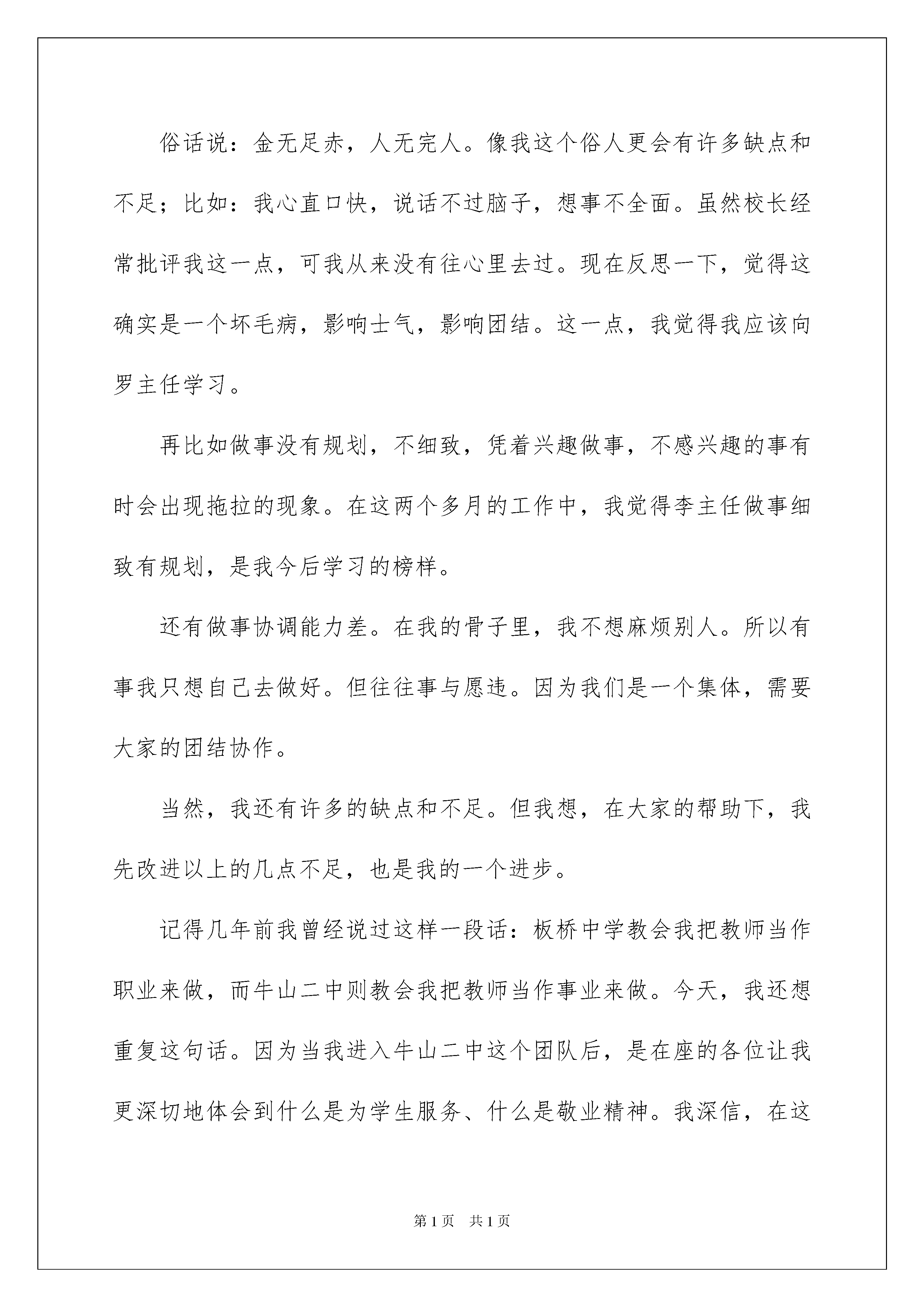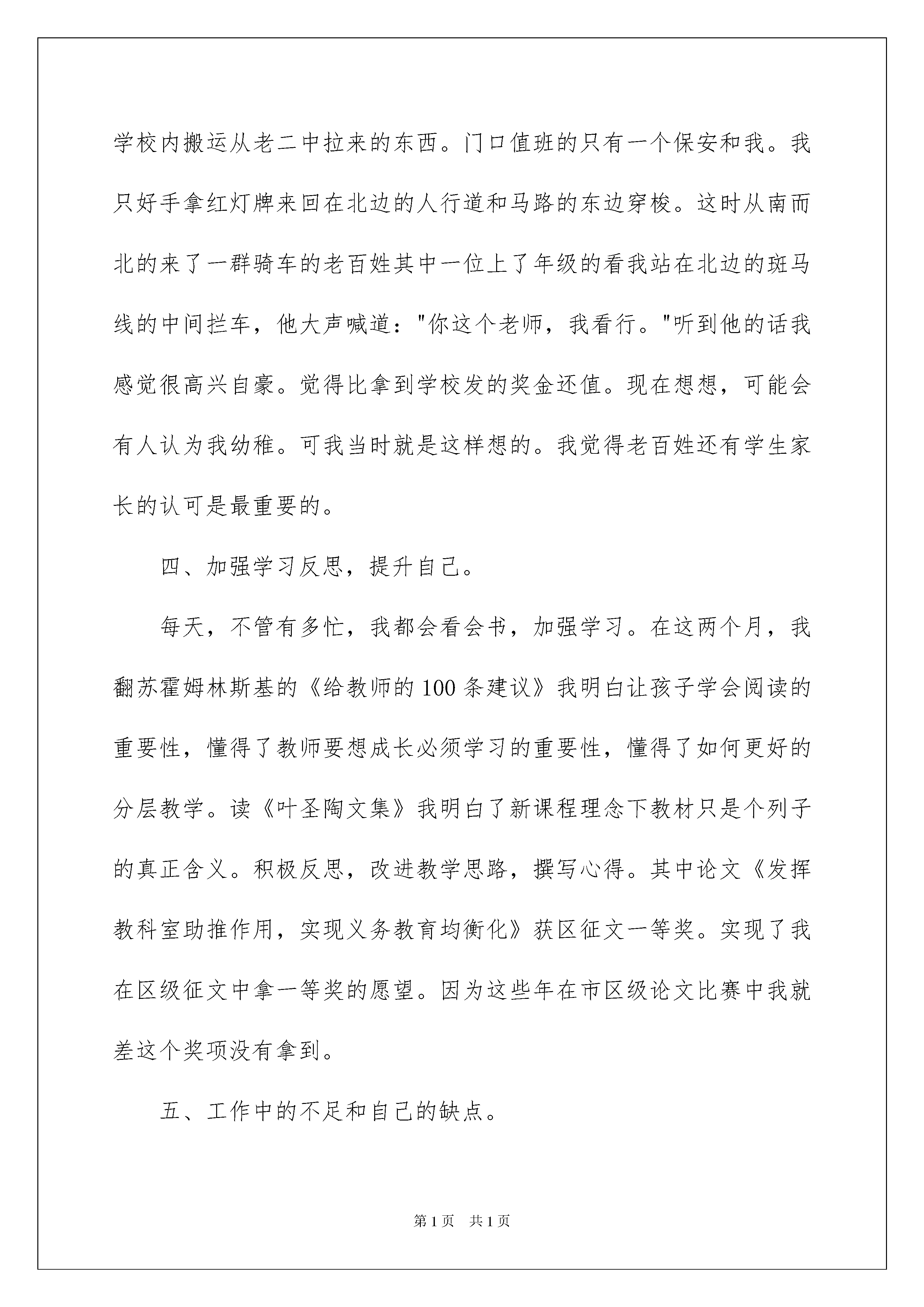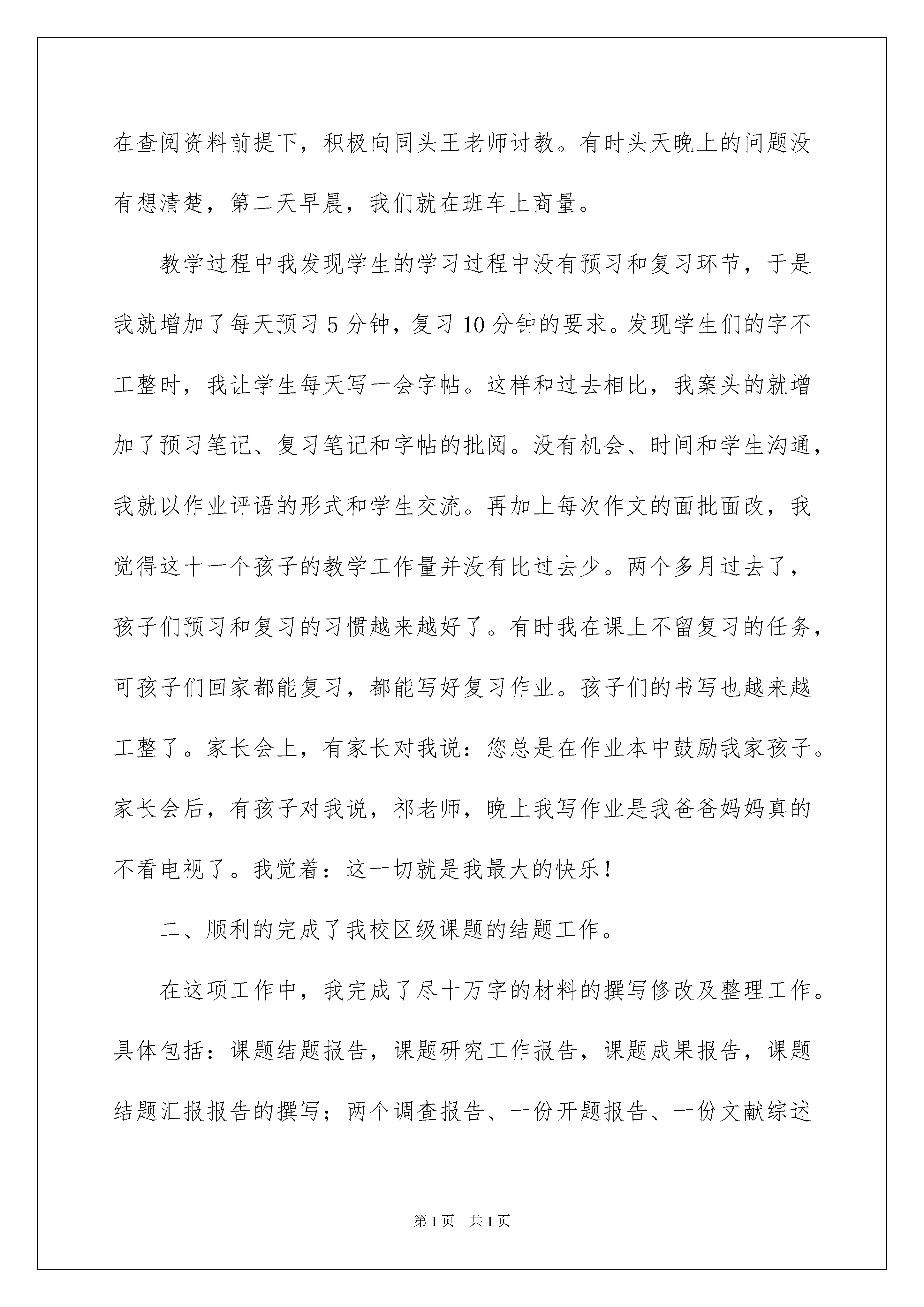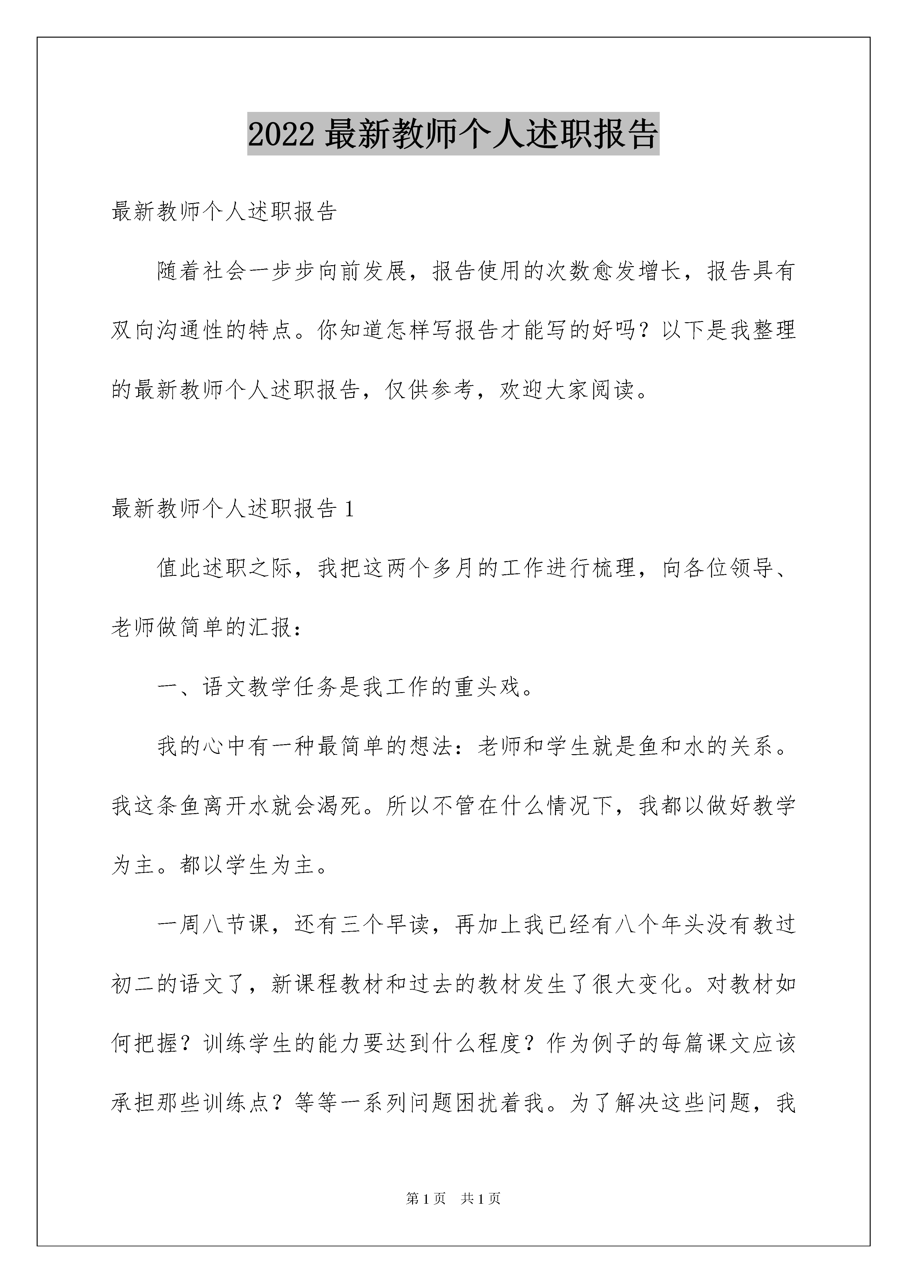 2022最新教师个人述职报告最新教师个人述职报告随着社会一步步向前发展,报告使用的次数愈发增长,报告具有双向沟通性的特点。你知道怎样写报告才能写的好吗?以下是我整理的最新教师个人述职报告,仅供参考,欢迎大家阅读。最新教师个人述职报告1值此述职之际,我把这两个多月的工作进行梳理,向各位领导、老师做简单的汇报:一、语文教学任务是我工作的重头戏。我的心中有一种最简单的想法:老师和学生就是鱼和水的关系。我这条鱼离开水就会渴死。所以不管在什么情况下,我都以做好教学为主。都以学生为主。一周八节课,还有三个早读,再加上我已经有八个年头没有教过初二的语文了,新课程教材和过去的教材发生了很大变化。对教材如何把握?训练学生的能力要达到什么程度?作为例子的每篇课文应该承担那些训练点?等等一系列问题困扰着我。为了解决这些问题,我在查阅资料前提下,积极向同头王老师讨教。有时头天晚上的问题没有想清楚,第二天早晨,我们就在班车上商量。教学过程中我发现学生的学习过程中没有预习和复习环节,于是我就增加了每天预习5分钟,复习10分钟的要求。发现学生们的字不工整时,我让学生每天写一会字帖。这样和过去相比,我案头的就增加了预习笔记、复习笔记和字帖的批阅。没有机会、时间和学生沟通,我就以作业评语的形式和学生交流。再加上每次作文的面批面改,我觉得这十一个孩子的教学工作量并没有比过去少。两个多月过去了,孩子们预习和复习的习惯越来越好了。有时我在课上不留复习的任务,可孩子们回家都能复习,都能写好复习作业。孩子们的书写也越来越工整了。家长会上,有家长对我说:您总是在作业本中鼓励我家孩子。家长会后,有孩子对我说,祁老师,晚上我写作业是我爸爸妈妈真的不看电视了。我觉着:这一切就是我最大的快乐!二、顺利的完成了我校区级课题的结题工作。在这项工作中,我完成了尽十万字的材料的撰写修改及整理工作。具体包括:课题结题报告,课题研究工作报告,课题成果报告,课题结题汇报报告的撰写;两个调查报告、一份开题报告、一份文献综述的修改;结题时汇报用的PPT的制作;四年来研究过程中的各类资料的整理、修改和打印等等。白天上课、做其它杂事,没法静下心来写作。我只好每天晚上或者周六日在家加班加点的写,修改。九月份一个月我都是在熬夜中度过的。我想,喜欢写点东西的老师一定会体会到其中的辛苦、不易和快乐的。九月二十八号顺利完成结题工作。受到了与会专家的一致好评。三、其它的协助工作协助政教处完成给老师一封信的评选活动;协助班主任老师完成给老师的一封信、感恩教育等的学生征文参评活动;在各位的支持下完成区教科室的关于师生的彩虹征文活动;在后勤组的支持下完成学校教科室、会议室的搬迁、卫生及布置工作;协助李景文主任完成我校党员的党纪党规的测试活动等等。总之,在学校工作中,只要是我能想到的,能看到的我都尽自己最大的努力去做它。在我的潜意识中,我始终认为学生有两条生命线,一条是教育教学,另一条就是安全。尤其是学校门口的交通安全问题。所以,只要我在学校,放学时我一定会去大门口值班,看到学生安全离开后才能放心的吃食堂吃饭。记得上月的一个下午放学时,学校其他领导、保安和后勤老师们都在学校内搬运从老二中拉来的东西。门口值班的只有一个保安和我。我只好手拿红灯牌来回在北边的人行道和马路的东边穿梭。这时从南而北的来了一群骑车的老百姓其中一位上了年级的看我站在北边的斑马线的中间拦车,他大声喊道:"你这个老师,我看行。"听到他的话我感觉很高兴自豪。觉得比拿到学校发的奖金还值。现在想想,可能会有人认为我幼稚。可我当时就是这样想的。我觉得老百姓还有学生家长的认可是最重要的。四、加强学习反思,提升自己。每天,不管有多忙,我都会看会书,加强学习。在这两个月,我翻苏霍姆林斯基的《给教师的100条建议》我明白让孩子学会阅读的重要性,懂得了教师要想成长必须学习的重要性,懂得了如何更好的分层教学。读《叶圣陶文集》我明白了新课程理念下教材只是个列子的真正含义。积极反思,改进教学思路,撰写心得。其中论文《发挥教科室助推作用,实现义务教育均衡化》获区征文一等奖。实现了我在区级征文中拿一等奖的愿望。因为这些年在市区级论文比赛中我就差这个奖项没有拿到。五、工作中的不足和自己的缺点。俗话说:金无足赤,人无完人。像我这个俗人更会有许多缺点和不足;比如:我心直口快,说话不过脑子,想事不全面。虽然校长经常批评我这一点,可我从来没有往心里去过。现在反思一下,觉得这确实是一个坏毛病,影响士气,影响团结。这一点,我觉得我应该向罗主任学习。再比如做事没有规划,不细致,凭着兴趣做事,不感兴趣的事有时会出现拖拉的现象。在这两个多月的工作