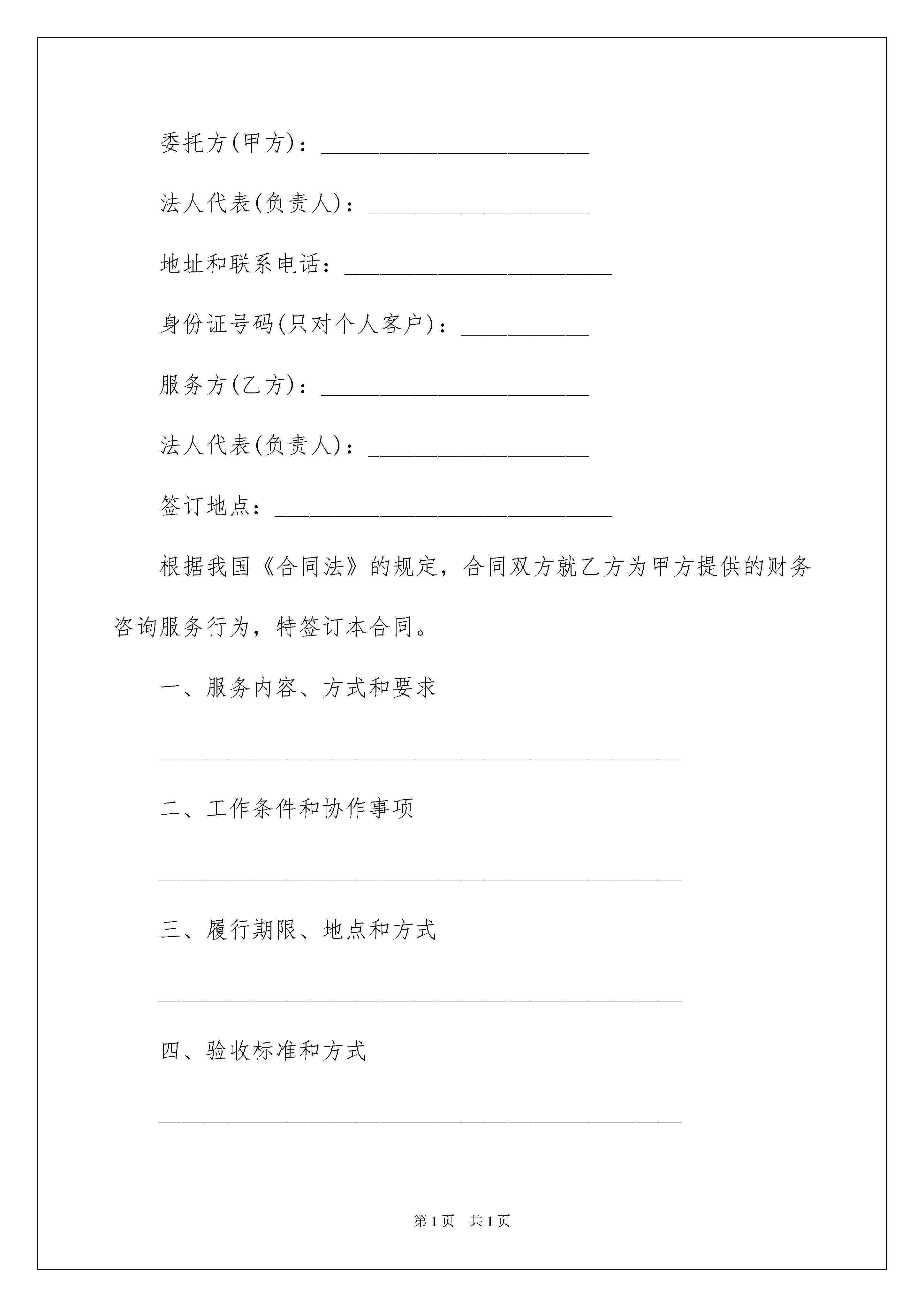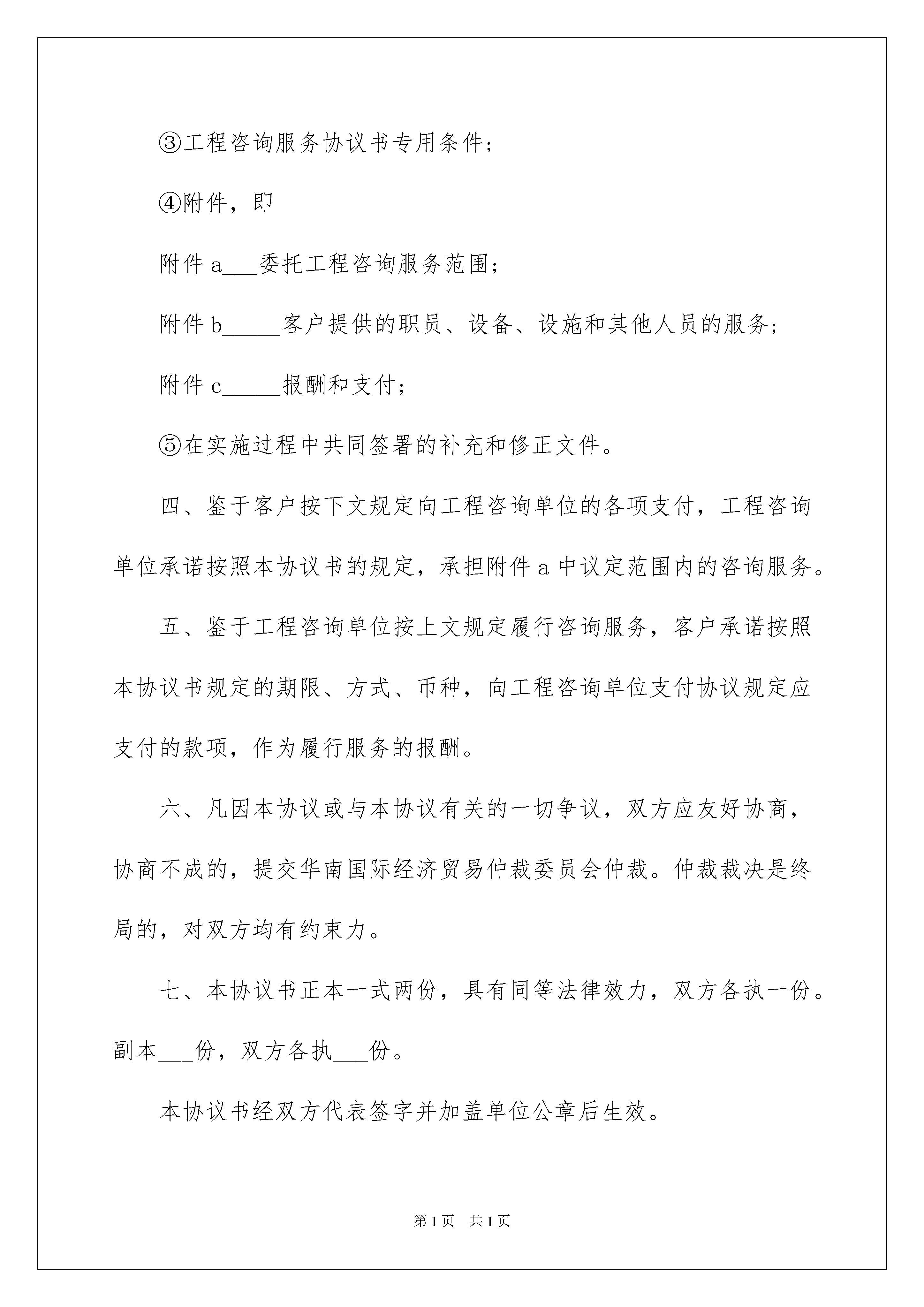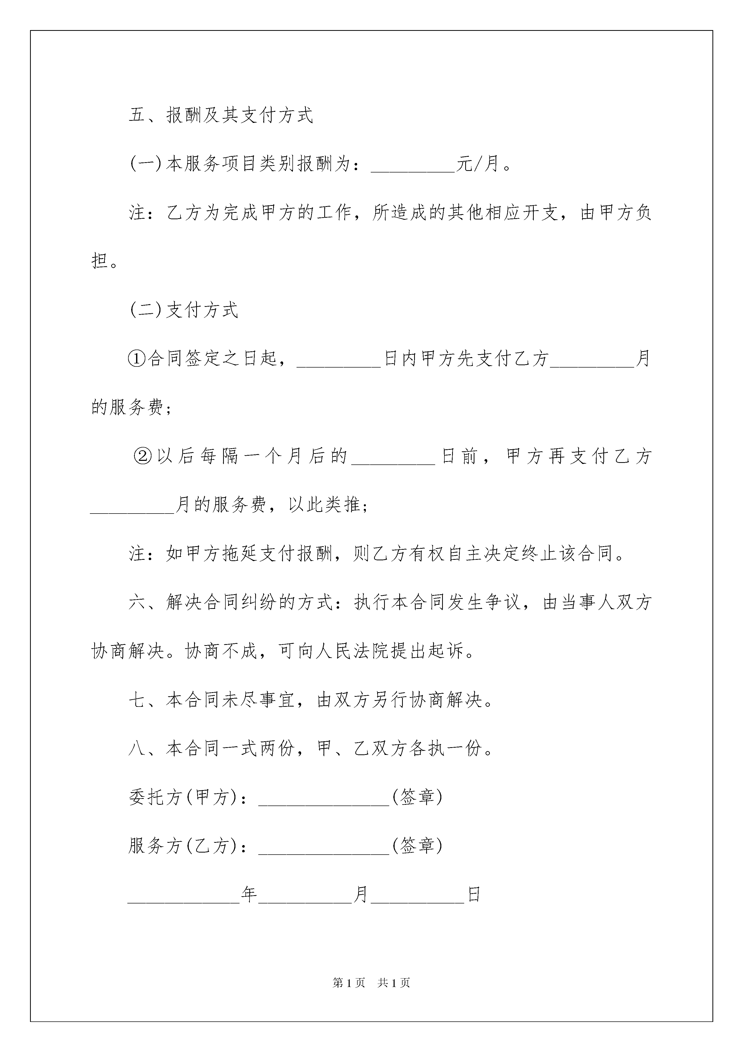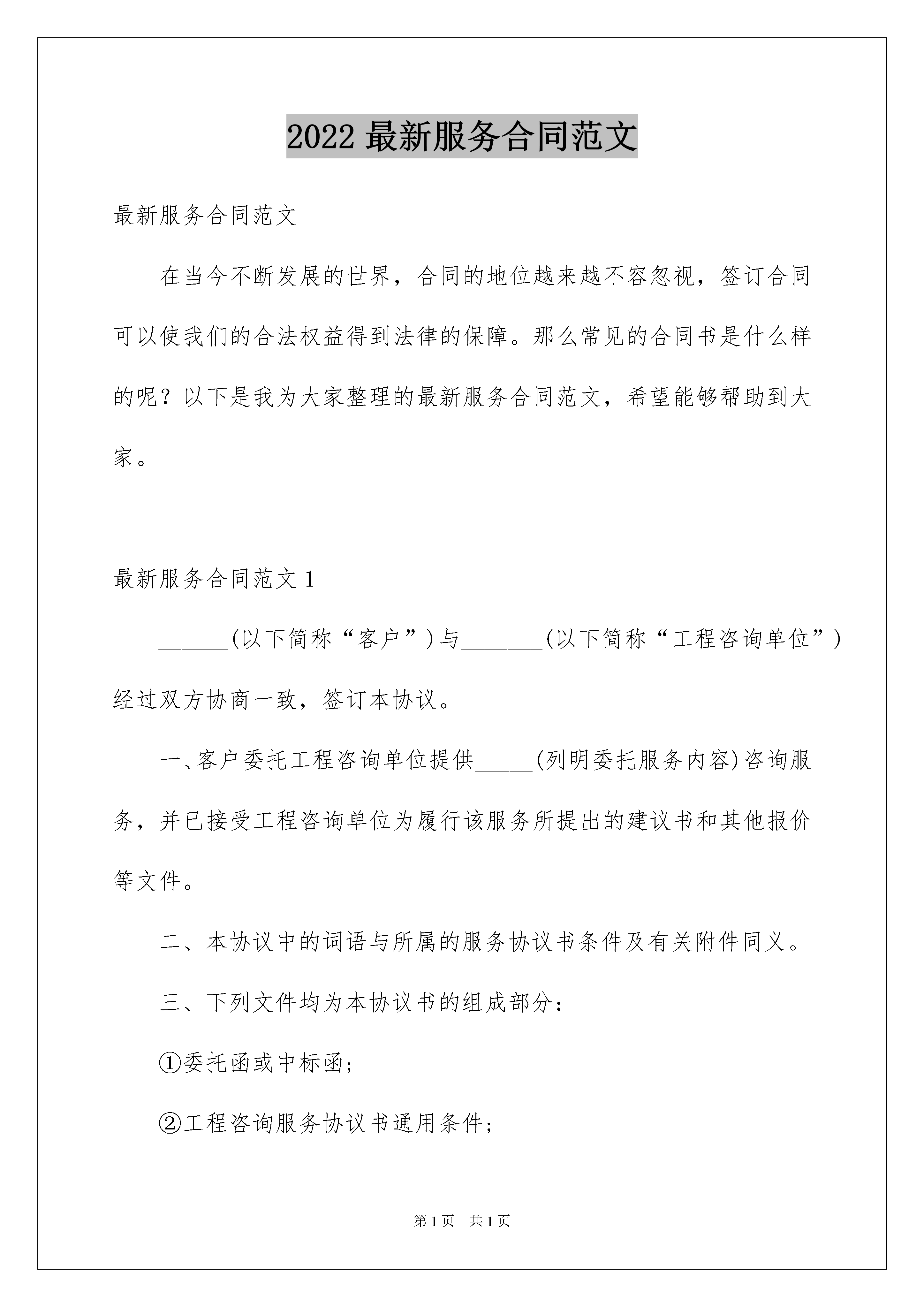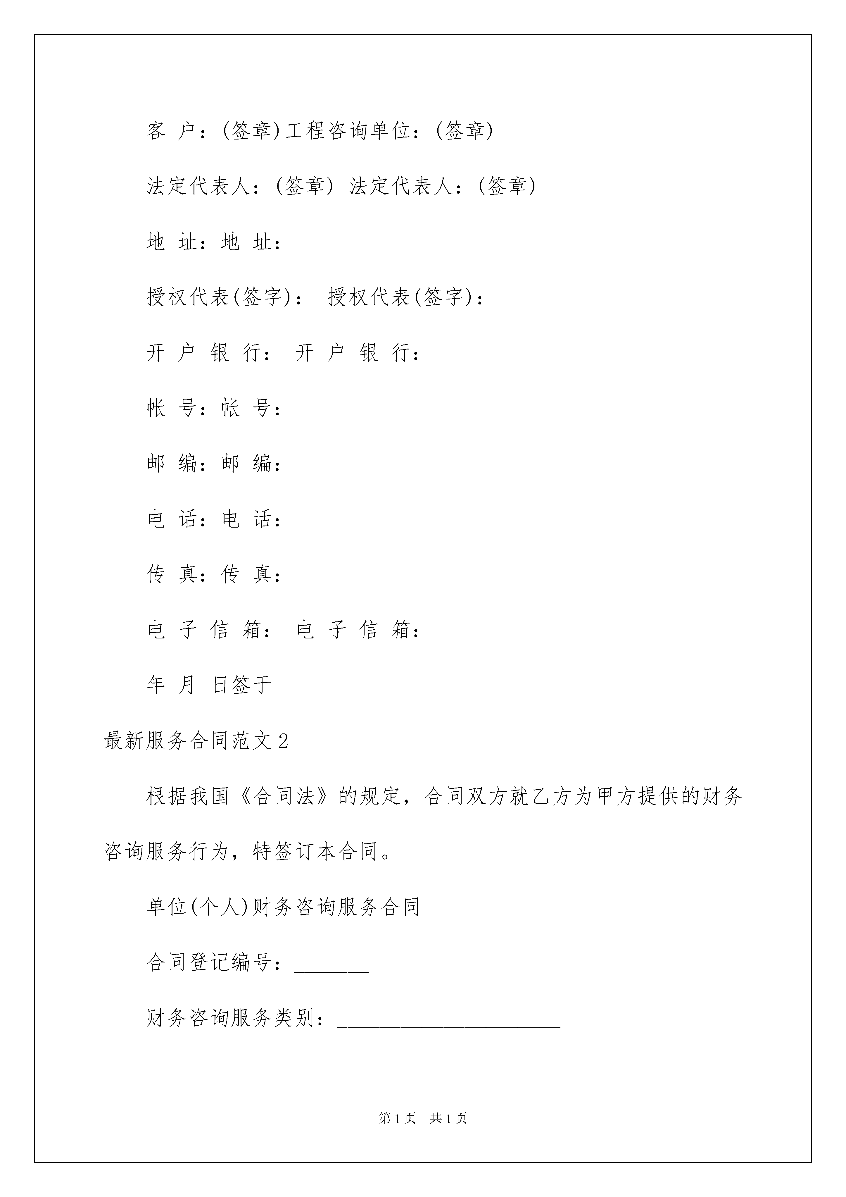 2022最新服务合同范文最新服务合同范文在当今不断发展的世界,合同的地位越来越不容忽视,签订合同可以使我们的合法权益得到法律的保障。那么常见的合同书是什么样的呢?以下是我为大家整理的最新服务合同范文,希望能够帮助到大家。最新服务合同范文1______(以下简称“客户”)与_______(以下简称“工程咨询单位”)经过双方协商一致,签订本协议。一、客户委托工程咨询单位提供_____(列明委托服务内容)咨询服务,并已接受工程咨询单位为履行该服务所提出的建议书和其他报价等文件。二、本协议中的词语与所属的服务协议书条件及有关附件同义。三、下列文件均为本协议书的组成部分:①委托函或中标函;②工程咨询服务协议书通用条件;③工程咨询服务协议书专用条件;④附件,即附件a___委托工程咨询服务范围;附件b_____客户提供的职员、设备、设施和其他人员的服务;附件c_____报酬和支付;⑤在实施过程中共同签署的补充和修正文件。四、鉴于客户按下文规定向工程咨询单位的各项支付,工程咨询单位承诺按照本协议书的规定,承担附件a中议定范围内的咨询服务。五、鉴于工程咨询单位按上文规定履行咨询服务,客户承诺按照本协议书规定的期限、方式、币种,向工程咨询单位支付协议规定应支付的款项,作为履行服务的报酬。六、凡因本协议或与本协议有关的一切争议,双方应友好协商,协商不成的,提交华南国际经济贸易仲裁委员会仲裁。仲裁裁决是终局的,对双方均有约束力。七、本协议书正本一式两份,具有同等法律效力,双方各执一份。副本___份,双方各执___份。本协议书经双方代表签字并加盖单位公章后生效。客户:(签章)工程咨询单位:(签章)法定代表人:(签章)法定代表人:(签章)地址:地址:授权代表(签字):授权代表(签字):开户银行:开户银行:帐号:帐号:邮编:邮编:电话:电话:传真:传真:电子信箱:电子信箱:年月日签于最新服务合同范文2根据我国《合同法》的规定,合同双方就乙方为甲方提供的财务咨询服务行为,特签订本合同。单位(个人)财务咨询服务合同合同登记编号:_______财务咨询服务类别:_____________________委托方(甲方):_______________________法人代表(负责人):___________________地址和联系电话:_______________________身份证号码(只对个人客户):___________服务方(乙方):_______________________法人代表(负责人):___________________签订地点:_____________________________根据我国《合同法》的规定,合同双方就乙方为甲方提供的财务咨询服务行为,特签订本合同。一、服务内容、方式和要求_____________________________________________二、工作条件和协作事项_____________________________________________三、履行期限、地点和方式_____________________________________________四、验收标准和方式_____________________________________________五、报酬及其支付方式(一)本服务项目类别报酬为:_________元/月。注:乙方为完成甲方的工作,所造成的其他相应开支,由甲方负担。(二)支付方式①合同签定之日起,_________日内甲方先支付乙方_________月的服务费;②以后每隔一个月后的_________日前,甲方再支付乙方_________月的服务费,以此类推;注:如甲方拖延支付报酬,则乙方有权自主决定终止该合同。六、解决合同纠纷的方式:执行本合同发生争议,由当事人双方协商解决。协商不成,可向人民法院提出起诉。七、本合同未尽事宜,由双方另行协商解决。八、本合同一式两份,甲、乙双方各执一份。委托方(甲方):______________(签章)服务方(乙方):______________(签章)____________年__________月__________日最新服务合同范文3甲方:乙方:为解决南河家园业主装修垃圾运输问题,甲乙双方在平等、自愿的基础上经友好协商,确定由乙方承运甲方的装修垃圾的运输工作。为保证甲乙双方利益,明确双方职责,特定如下条款:1、运输垃圾范围是南河小区2#、3#、6#楼办理装修手续的业主。2、乙方须按时完成小区业主装修过程中所产生的装修垃圾(不含绿化垃圾、生活垃圾),有延误运输所造成后