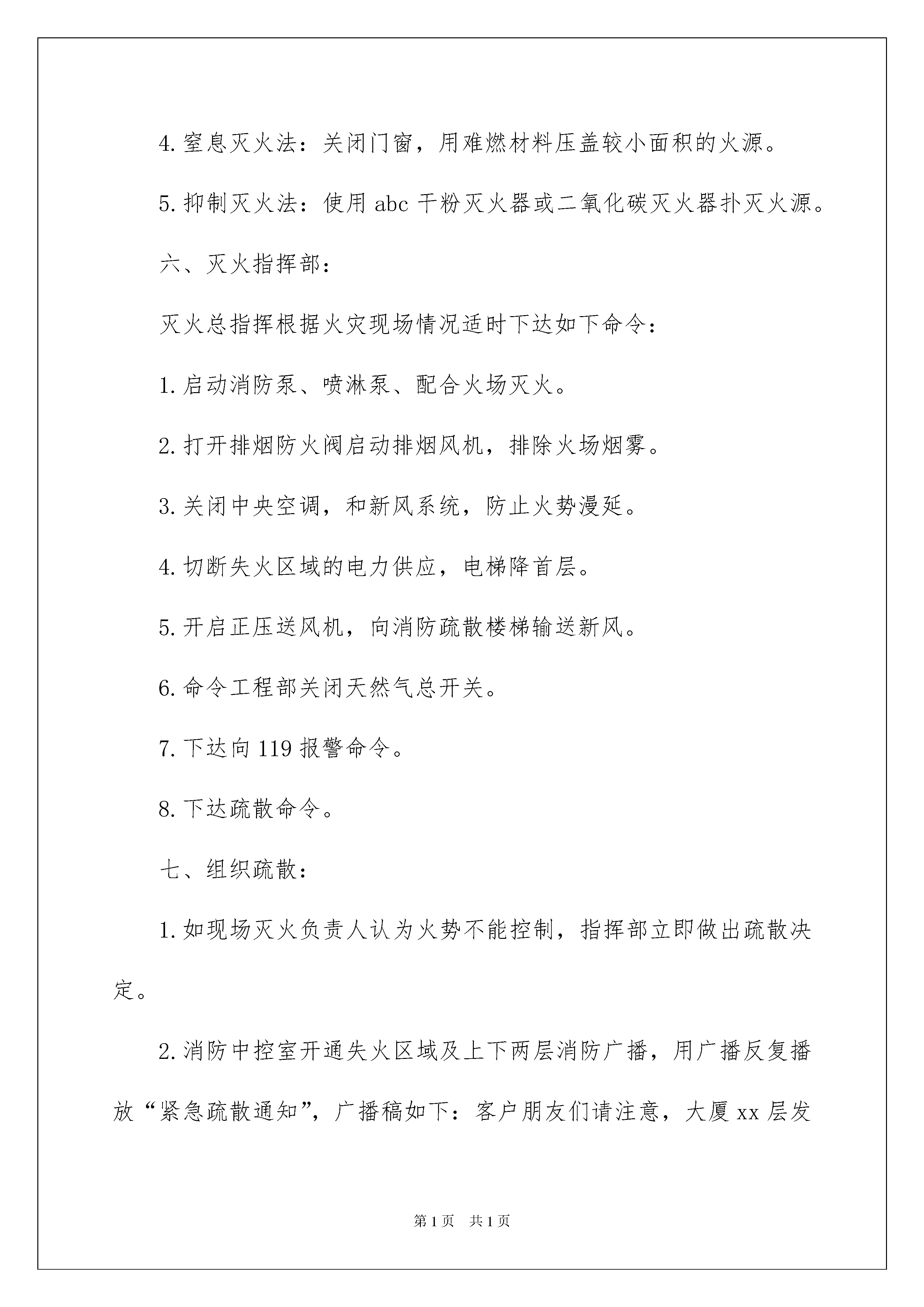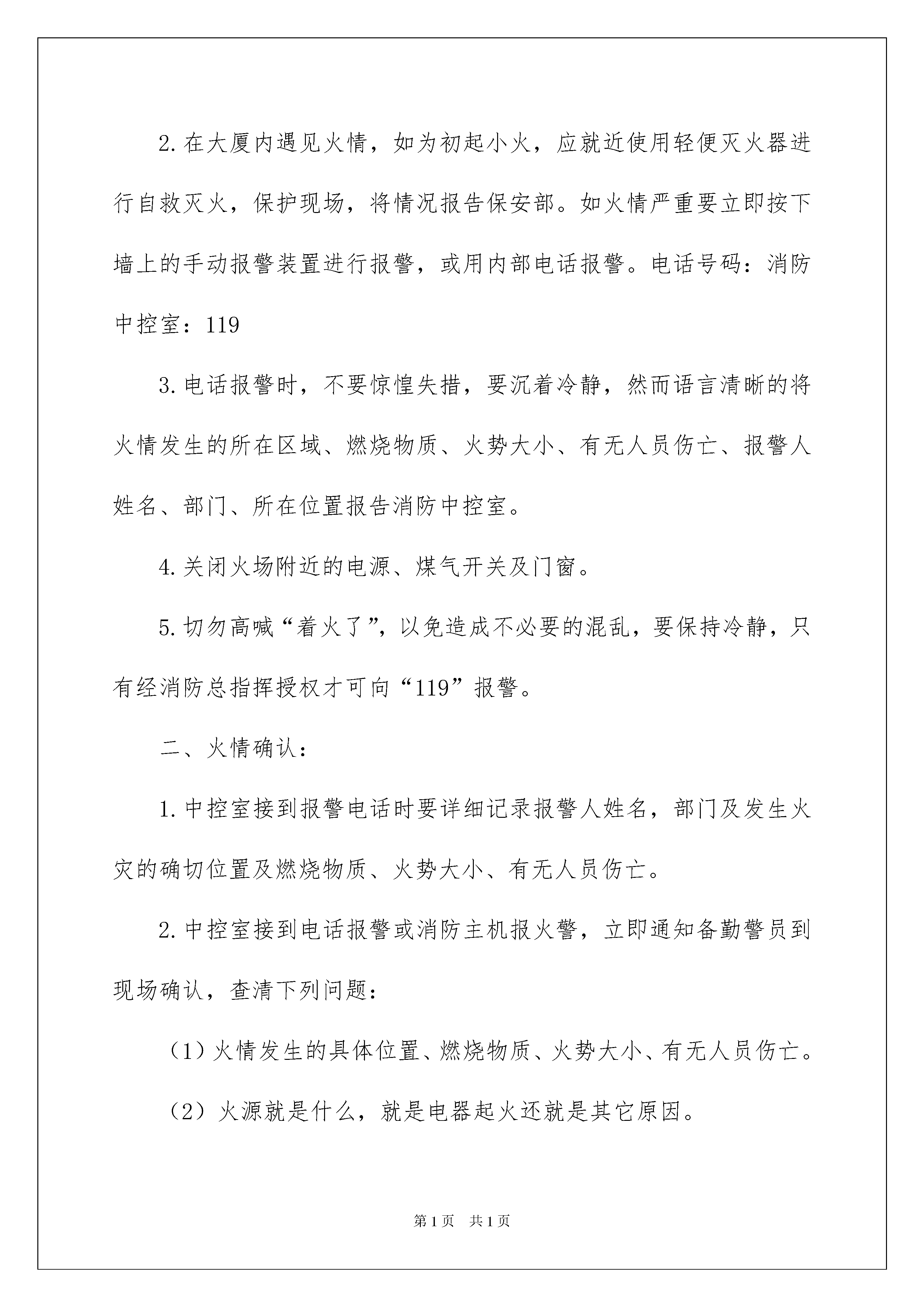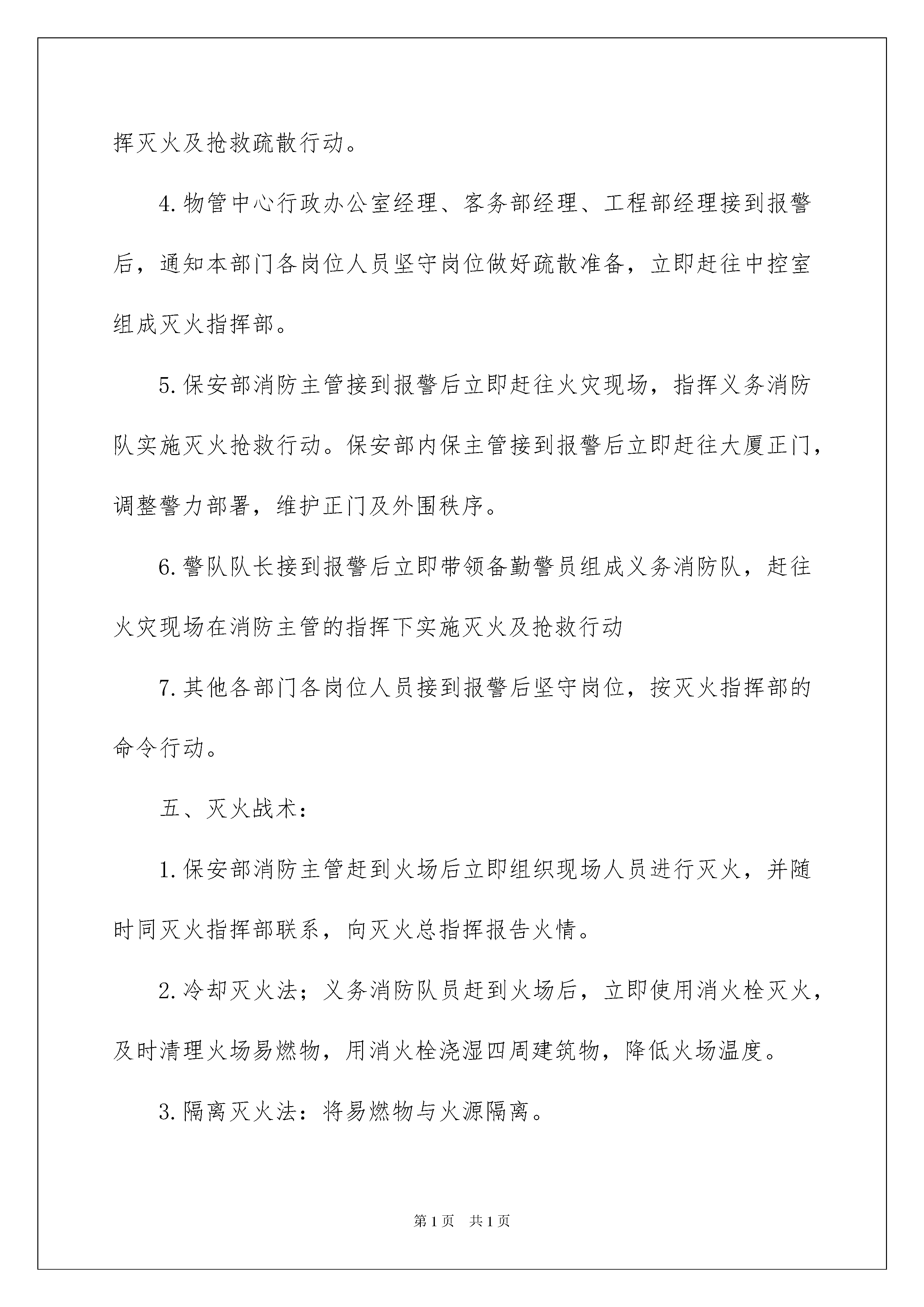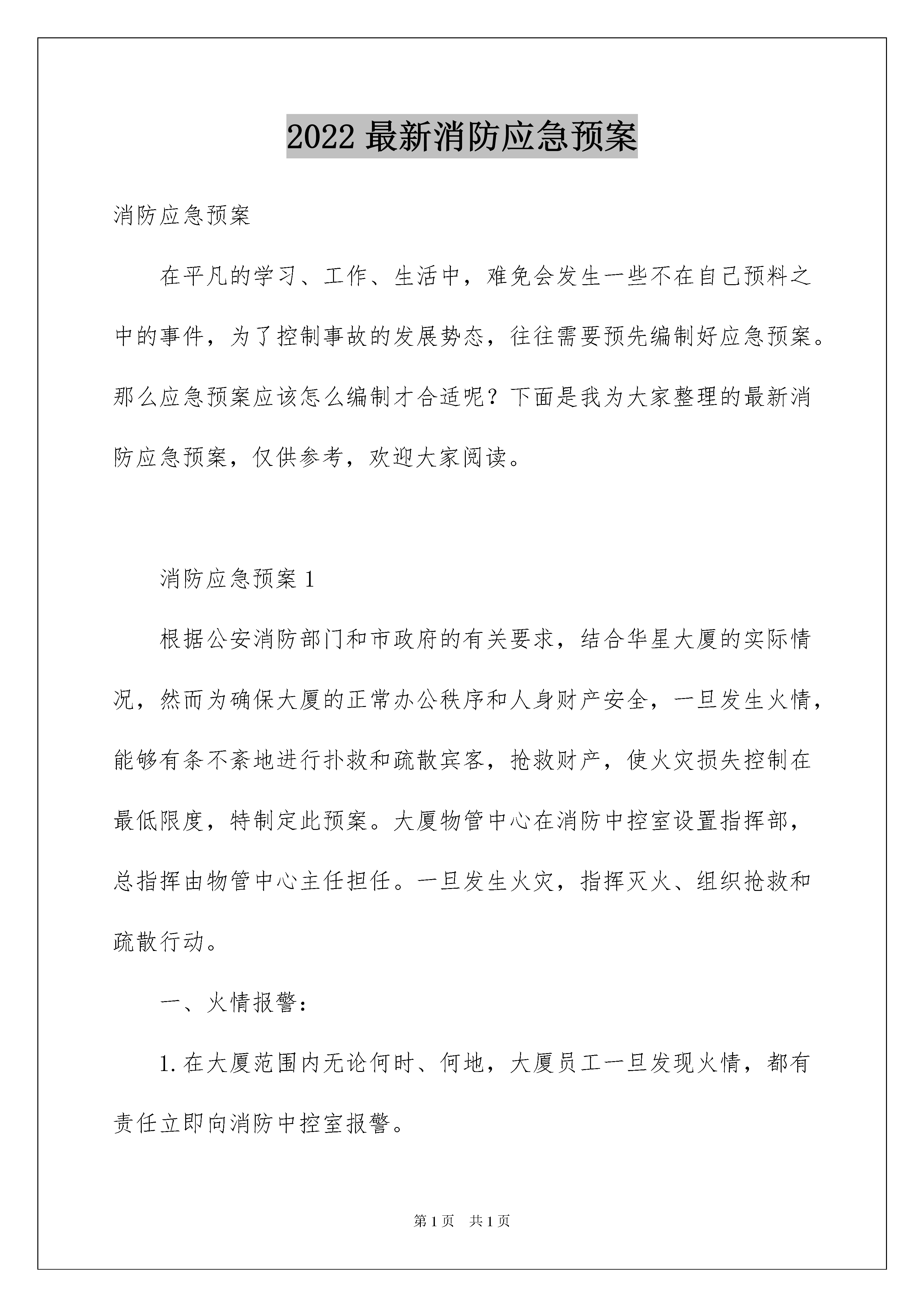2022最新消防应急预案消防应急预案在平凡的学习、工作、生活中,难免会发生一些不在自己预料之中的事件,为了控制事故的发展势态,往往需要预先编制好应急预案。那么应急预案应该怎么编制才合适呢?下面是我为大家整理的最新消防应急预案,仅供参考,欢迎大家阅读。消防应急预案1根据公安消防部门和市政府的有关要求,结合华星大厦的实际情况,然而为确保大厦的正常办公秩序和人身财产安全,一旦发生火情,能够有条不紊地进行扑救和疏散宾客,抢救财产,使火灾损失控制在最低限度,特制定此预案。大厦物管中心在消防中控室设置指挥部,总指挥由物管中心主任担任。一旦发生火灾,指挥灭火、组织抢救和疏散行动。一、火情报警:1.在大厦范围内无论何时、何地,大厦员工一旦发现火情,都有责任立即向消防中控室报警。2.在大厦内遇见火情,如为初起小火,应就近使用轻便灭火器进行自救灭火,保护现场,将情况报告保安部。如火情严重要立即按下墙上的手动报警装置进行报警,或用内部电话报警。电话号码:消防中控室:1193.电话报警时,不要惊惶失措,要沉着冷静,然而语言清晰的将火情发生的所在区域、燃烧物质、火势大小、有无人员伤亡、报警人姓名、部门、所在位置报告消防中控室。4.关闭火场附近的电源、煤气开关及门窗。5.切勿高喊“着火了”,以免造成不必要的混乱,要保持冷静,只有经消防总指挥授权才可向“119”报警。二、火情确认:1.中控室接到报警电话时要详细记录报警人姓名,部门及发生火灾的确切位置及燃烧物质、火势大小、有无人员伤亡。2.中控室接到电话报警或消防主机报火警,立即通知备勤警员到现场确认,查清下列问题:(1)火情发生的具体位置、燃烧物质、火势大小、有无人员伤亡。(2)火源就是什么,就是电器起火还就是其它原因。(3)确认火情时应注意,不得莽撞开门,要先试一下门体的温度,如果正常可开门检查,如门体温度高,可确认内有火情,此时房内如有人,应先设法救人,然而开门时注意不要把身体正对开门处,视情况进入。(4)确认火情后,立即将信息反馈给中控室。三、火情报告:1.火情确认后中控室值班员立即(正常上班时间)向保安部经理和消防主管报告(夜间、节假日)向值班经理报告,同时向保安宿舍发出警报信号。2.向总机值班员(正常上班时间)报警。3.总机值班员接到报警后立即通知物管中心主任和各部门经理。四、各级人员行动:1.大厦物管中心主任接到报警后立即赶往中控室组建灭火指挥部,指挥灭火及抢救疏散行动。2.非正常上班时间值班经理接到报警后立即赶往失火现场指挥灭火行动。3.保安部经理接到报警后立即赶往中控室,协助物管中心主任指挥灭火及抢救疏散行动。4.物管中心行政办公室经理、客务部经理、工程部经理接到报警后,通知本部门各岗位人员坚守岗位做好疏散准备,立即赶往中控室组成灭火指挥部。5.保安部消防主管接到报警后立即赶往火灾现场,指挥义务消防队实施灭火抢救行动。保安部内保主管接到报警后立即赶往大厦正门,调整警力部署,维护正门及外围秩序。6.警队队长接到报警后立即带领备勤警员组成义务消防队,赶往火灾现场在消防主管的指挥下实施灭火及抢救行动7.其他各部门各岗位人员接到报警后坚守岗位,按灭火指挥部的命令行动。五、灭火战术:1.保安部消防主管赶到火场后立即组织现场人员进行灭火,并随时同灭火指挥部联系,向灭火总指挥报告火情。2.冷却灭火法;义务消防队员赶到火场后,立即使用消火栓灭火,及时清理火场易燃物,用消火栓浇湿四周建筑物,降低火场温度。3.隔离灭火法:将易燃物与火源隔离。4.窒息灭火法:关闭门窗,用难燃材料压盖较小面积的火源。5.抑制灭火法:使用abc干粉灭火器或二氧化碳灭火器扑灭火源。六、灭火指挥部:灭火总指挥根据火灾现场情况适时下达如下命令:1.启动消防泵、喷淋泵、配合火场灭火。2.打开排烟防火阀启动排烟风机,排除火场烟雾。3.关闭中央空调,和新风系统,防止火势漫延。4.切断失火区域的电力供应,电梯降首层。5.开启正压送风机,向消防疏散楼梯输送新风。6.命令工程部关闭天然气总开关。7.下达向119报警命令。8.下达疏散命令。七、组织疏散:1.如现场灭火负责人认为火势不能控制,指挥部立即做出疏散决定。2.消防中控室开通失火区域及上下两层消防广播,用广播反复播放“紧急疏散通知”,广播稿如下:客户朋友们请注意,大厦xx层发生火灾事故,消防人员正在进行扑救,为了您的安全,请迅速离开房间,疏散前请保管好自己的财物,疏散时请不要乘坐电梯,以免发生危险,请按疏散指示方向走消防疏散通道,谢谢您的合作。3.失火区域及上下两层进行紧急疏散后,根据人员离开情况,对其它楼层进行广播疏散。4.客务部接到疏