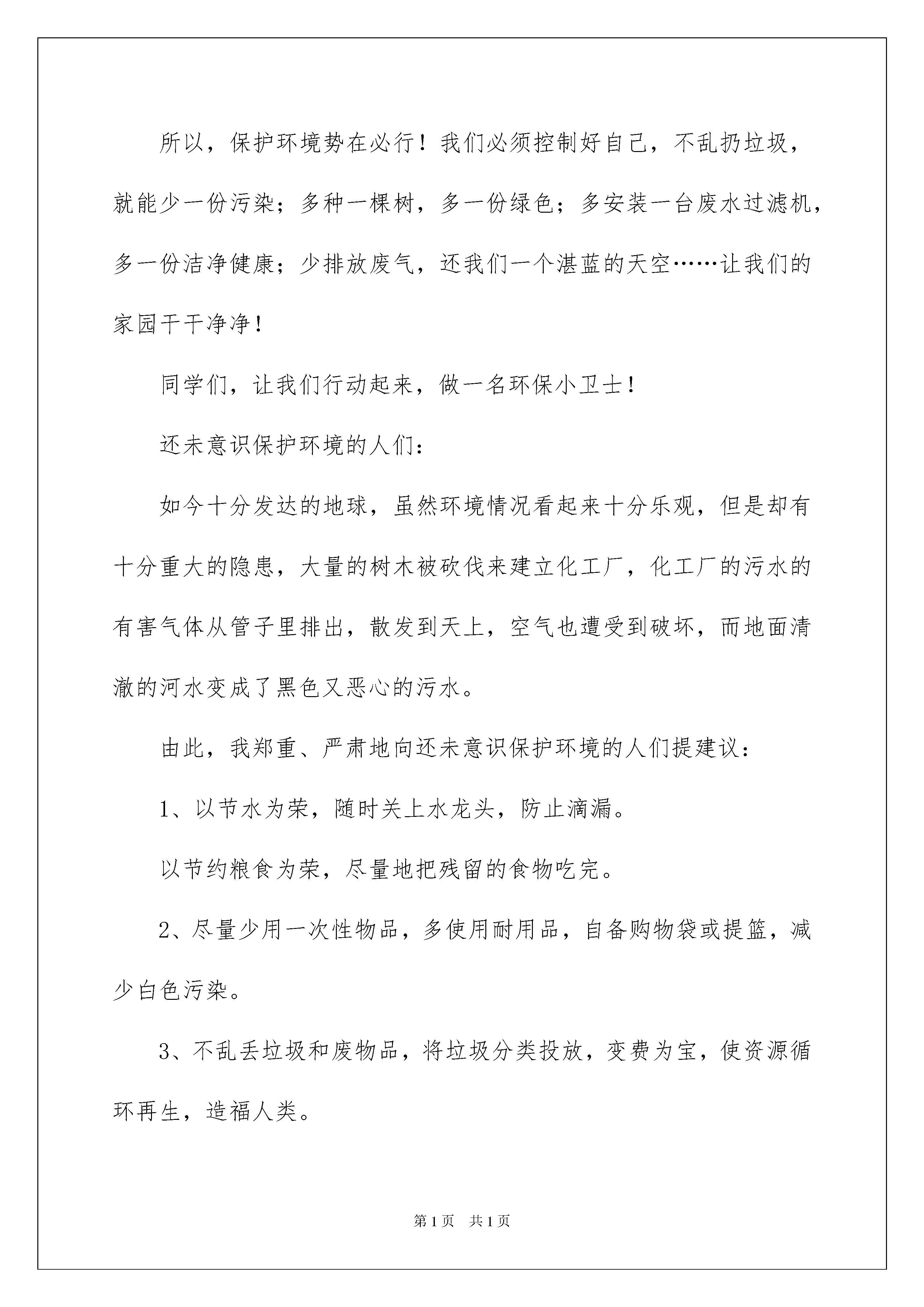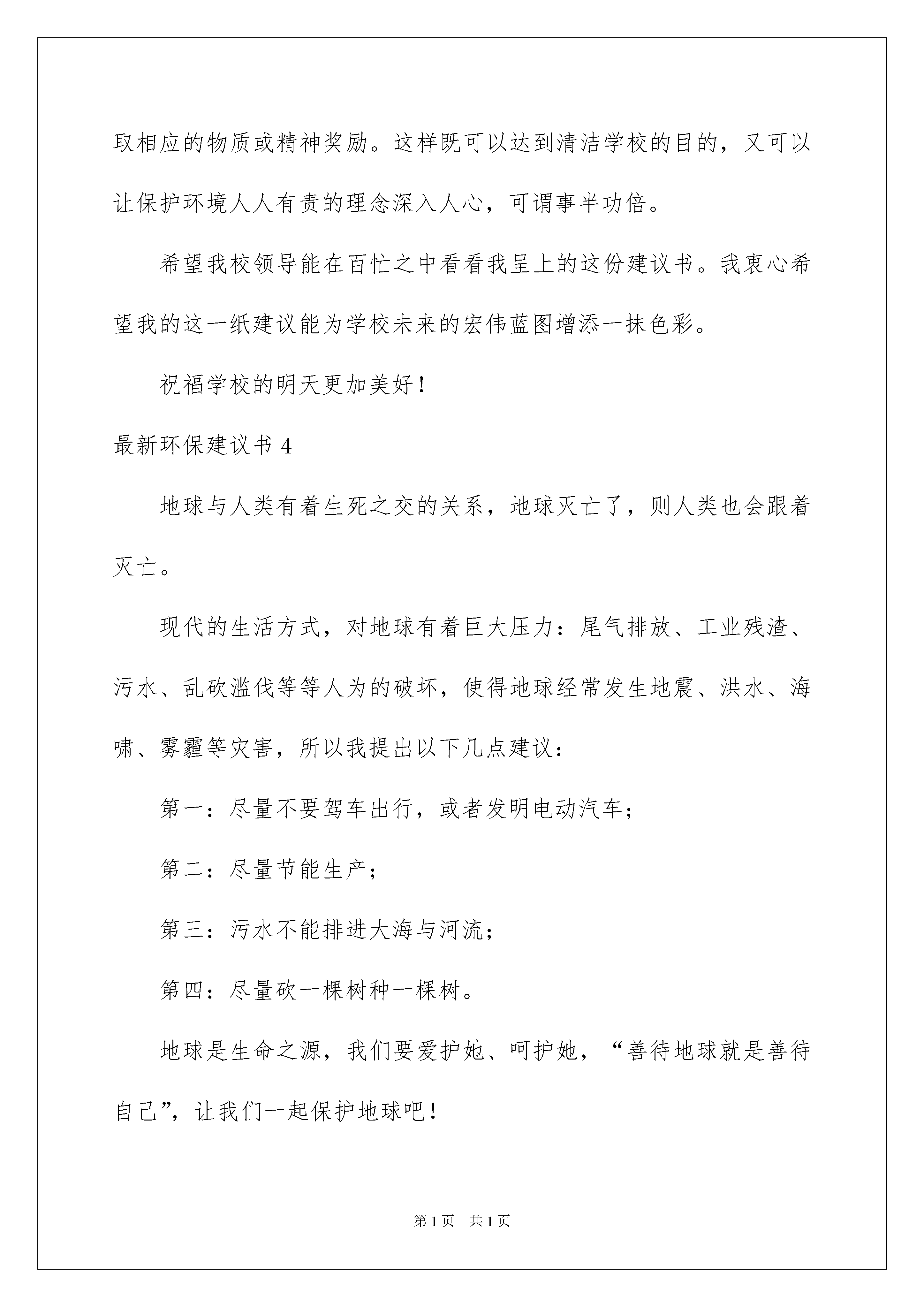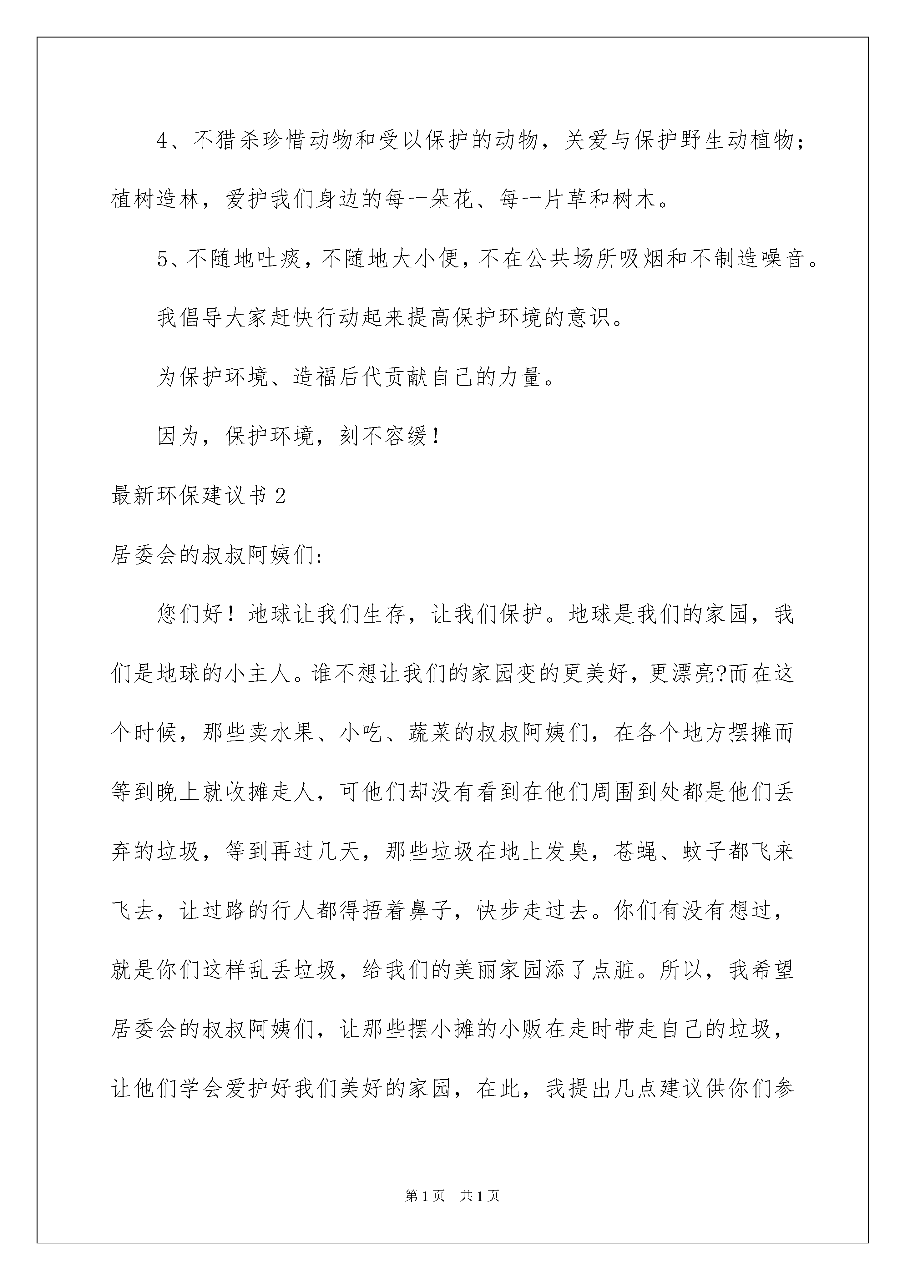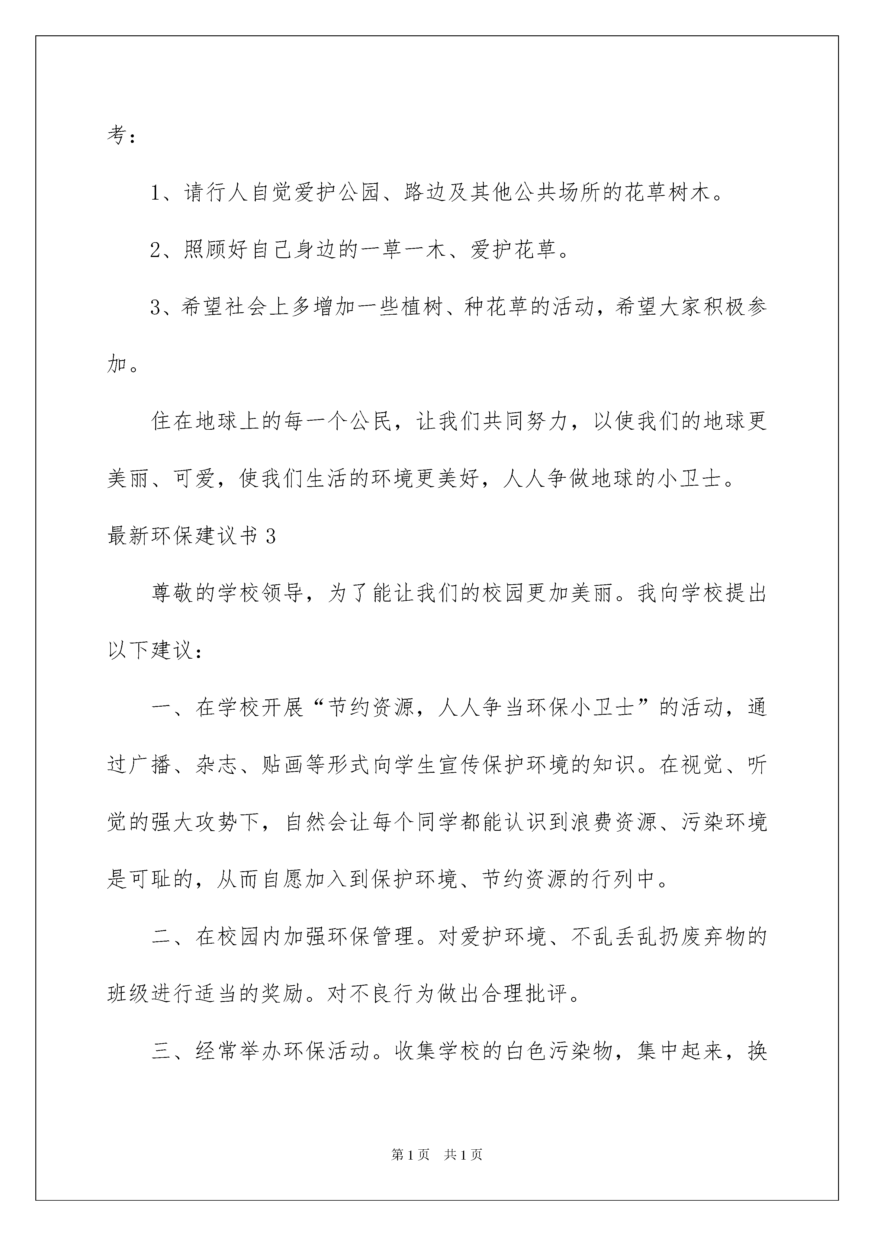 2022最新环保建议书(15篇)最新环保建议书随着社会一步步向前发展,接触并使用建议书的人越来越多,我们在写建议书时要分条列出建议的具体内容。相信很多朋友都对写建议书感到非常苦恼吧,以下是我整理的最新环保建议书,仅供参考,希望能够帮助到大家。最新环保建议书1在我们身边,有这样一些景象:道路上,垃圾四处丢;河流中,废水天天见;空气中,各种“黑龙”肆意排放,臭气熏天…给我们的生活了带来重大的伤害!树木砍光了,只要暴雨来临,水和泥沙形成巨大的泥石流,后果不堪设想;“黑龙”污染蓝天,使人无法正常呼吸;河中废水有人喝了,就引发了水中毒……难道这些不引人深思吗?在环境污染日益严重的今天,我们又能做些什么呢?在人们随手丢垃圾时,在人们向河里倾倒废水时,有多少人能想到他们毁灭了自己没有?所以,保护环境势在必行!我们必须控制好自己,不乱扔垃圾,就能少一份污染;多种一棵树,多一份绿色;多安装一台废水过滤机,多一份洁净健康;少排放废气,还我们一个湛蓝的天空……让我们的家园干干净净!同学们,让我们行动起来,做一名环保小卫士!还未意识保护环境的人们:如今十分发达的地球,虽然环境情况看起来十分乐观,但是却有十分重大的隐患,大量的树木被砍伐来建立化工厂,化工厂的污水的有害气体从管子里排出,散发到天上,空气也遭受到破坏,而地面清澈的河水变成了黑色又恶心的污水。由此,我郑重、严肃地向还未意识保护环境的人们提建议:1、以节水为荣,随时关上水龙头,防止滴漏。以节约粮食为荣,尽量地把残留的食物吃完。2、尽量少用一次性物品,多使用耐用品,自备购物袋或提篮,减少白色污染。3、不乱丢垃圾和废物品,将垃圾分类投放,变费为宝,使资源循环再生,造福人类。4、不猎杀珍惜动物和受以保护的动物,关爱与保护野生动植物;植树造林,爱护我们身边的每一朵花、每一片草和树木。5、不随地吐痰,不随地大小便,不在公共场所吸烟和不制造噪音。我倡导大家赶快行动起来提高保护环境的意识。为保护环境、造福后代贡献自己的力量。因为,保护环境,刻不容缓!最新环保建议书2居委会的叔叔阿姨们:您们好!地球让我们生存,让我们保护。地球是我们的家园,我们是地球的小主人。谁不想让我们的家园变的更美好,更漂亮?而在这个时候,那些卖水果、小吃、蔬菜的叔叔阿姨们,在各个地方摆摊而等到晚上就收摊走人,可他们却没有看到在他们周围到处都是他们丢弃的垃圾,等到再过几天,那些垃圾在地上发臭,苍蝇、蚊子都飞来飞去,让过路的行人都得捂着鼻子,快步走过去。你们有没有想过,就是你们这样乱丢垃圾,给我们的美丽家园添了点脏。所以,我希望居委会的叔叔阿姨们,让那些摆小摊的小贩在走时带走自己的垃圾,让他们学会爱护好我们美好的家园,在此,我提出几点建议供你们参考:1、请行人自觉爱护公园、路边及其他公共场所的花草树木。2、照顾好自己身边的一草一木、爱护花草。3、希望社会上多增加一些植树、种花草的活动,希望大家积极参加。住在地球上的每一个公民,让我们共同努力,以使我们的地球更美丽、可爱,使我们生活的环境更美好,人人争做地球的小卫士。最新环保建议书3尊敬的学校领导,为了能让我们的校园更加美丽。我向学校提出以下建议:一、在学校开展“节约资源,人人争当环保小卫士”的活动,通过广播、杂志、贴画等形式向学生宣传保护环境的知识。在视觉、听觉的强大攻势下,自然会让每个同学都能认识到浪费资源、污染环境是可耻的,从而自愿加入到保护环境、节约资源的行列中。二、在校园内加强环保管理。对爱护环境、不乱丢乱扔废弃物的班级进行适当的奖励。对不良行为做出合理批评。三、经常举办环保活动。收集学校的白色污染物,集中起来,换取相应的物质或精神奖励。这样既可以达到清洁学校的目的,又可以让保护环境人人有责的理念深入人心,可谓事半功倍。希望我校领导能在百忙之中看看我呈上的这份建议书。我衷心希望我的这一纸建议能为学校未来的宏伟蓝图增添一抹色彩。祝福学校的明天更加美好!最新环保建议书4地球与人类有着生死之交的关系,地球灭亡了,则人类也会跟着灭亡。现代的生活方式,对地球有着巨大压力:尾气排放、工业残渣、污水、乱砍滥伐等等人为的破坏,使得地球经常发生地震、洪水、海啸、雾霾等灾害,所以我提出以下几点建议:第一:尽量不要驾车出行,或者发明电动汽车;第二:尽量节能生产;第三:污水不能排进大海与河流;第四:尽量砍一棵树种一棵树。地球是生命之源,我们要爱护她、呵护她,“善待地球就是善待自己”,让我们一起保护地球吧!8月7日六年级:姜智最新环保建议书5环保局的叔叔阿姨们:你们好。地球是我们人类赖以生存的家园,它就向母亲一样,为我们提供生存资源和条件。谁不想让自己的
