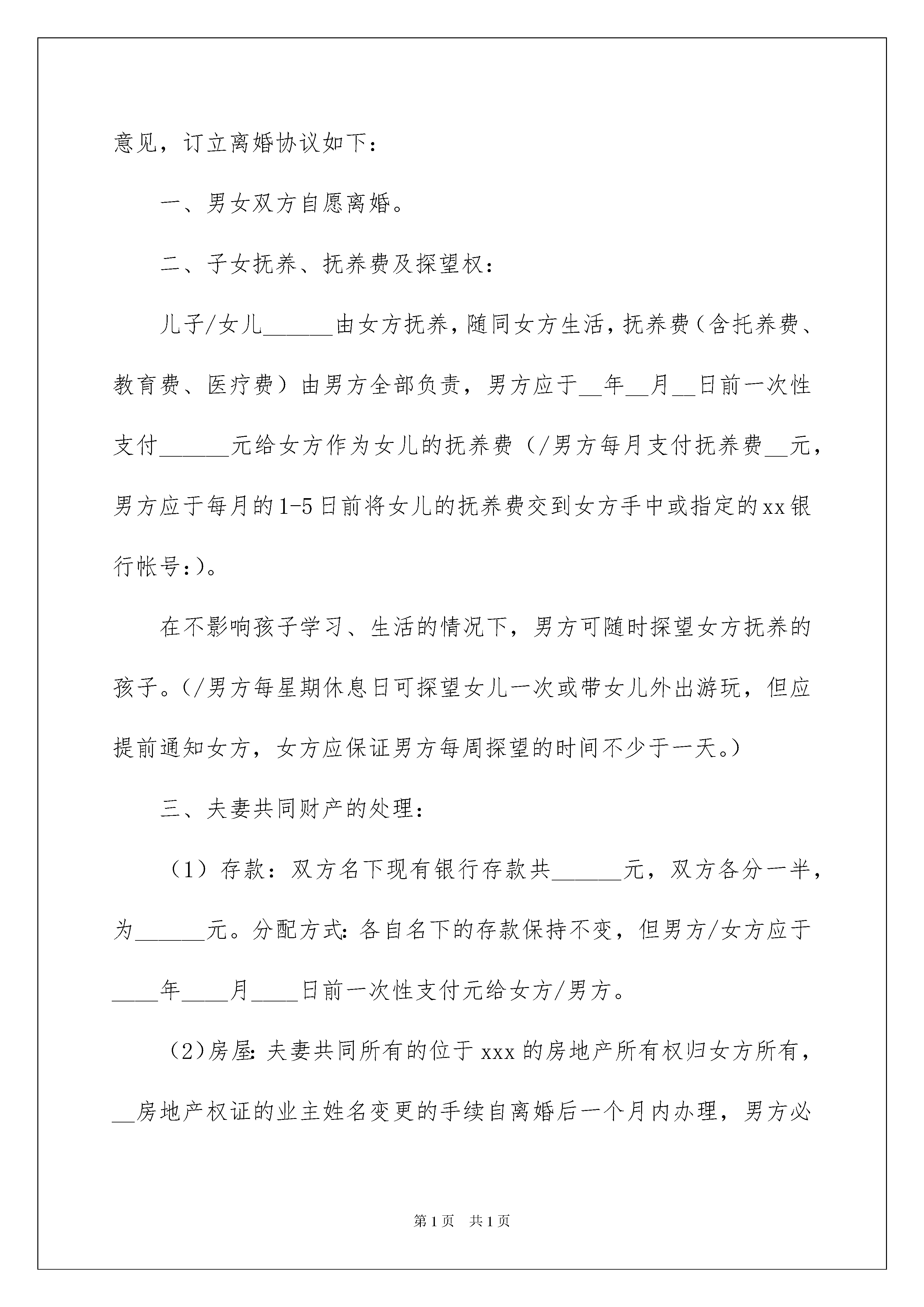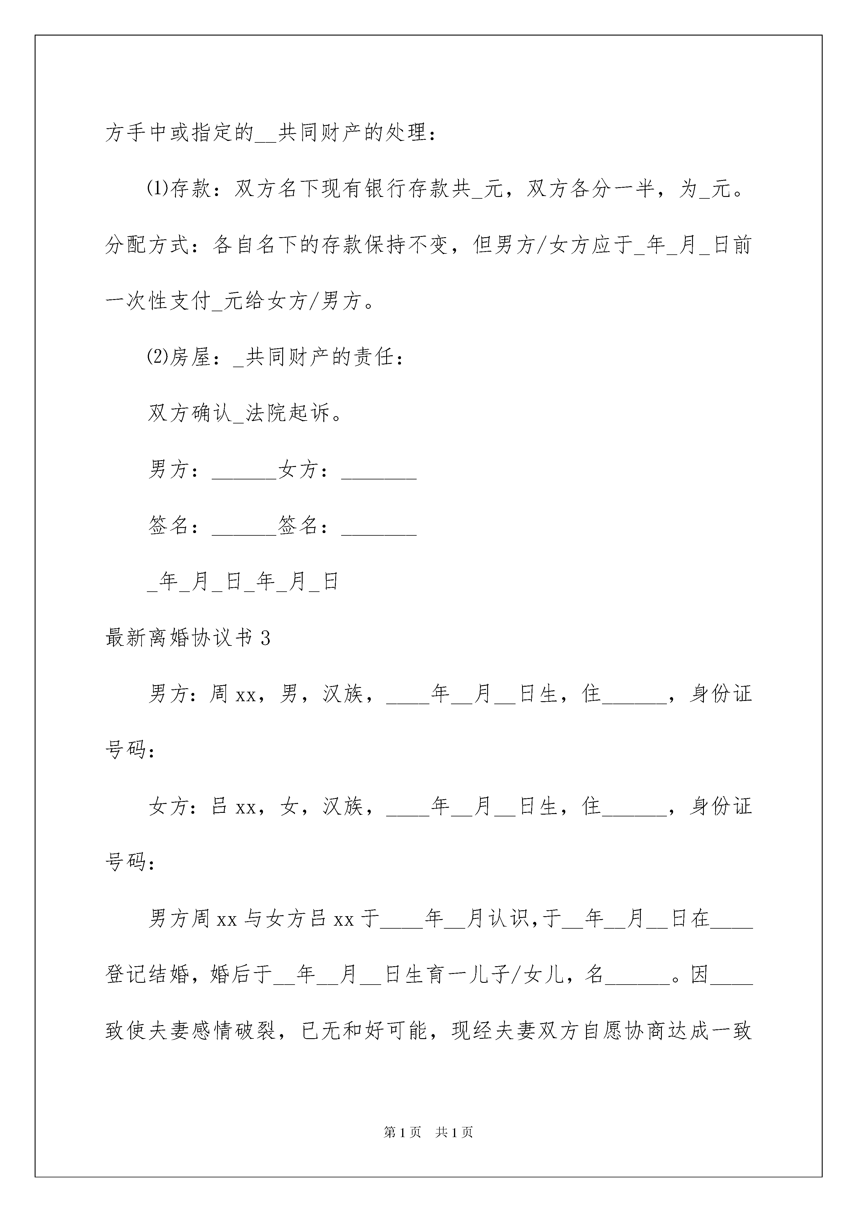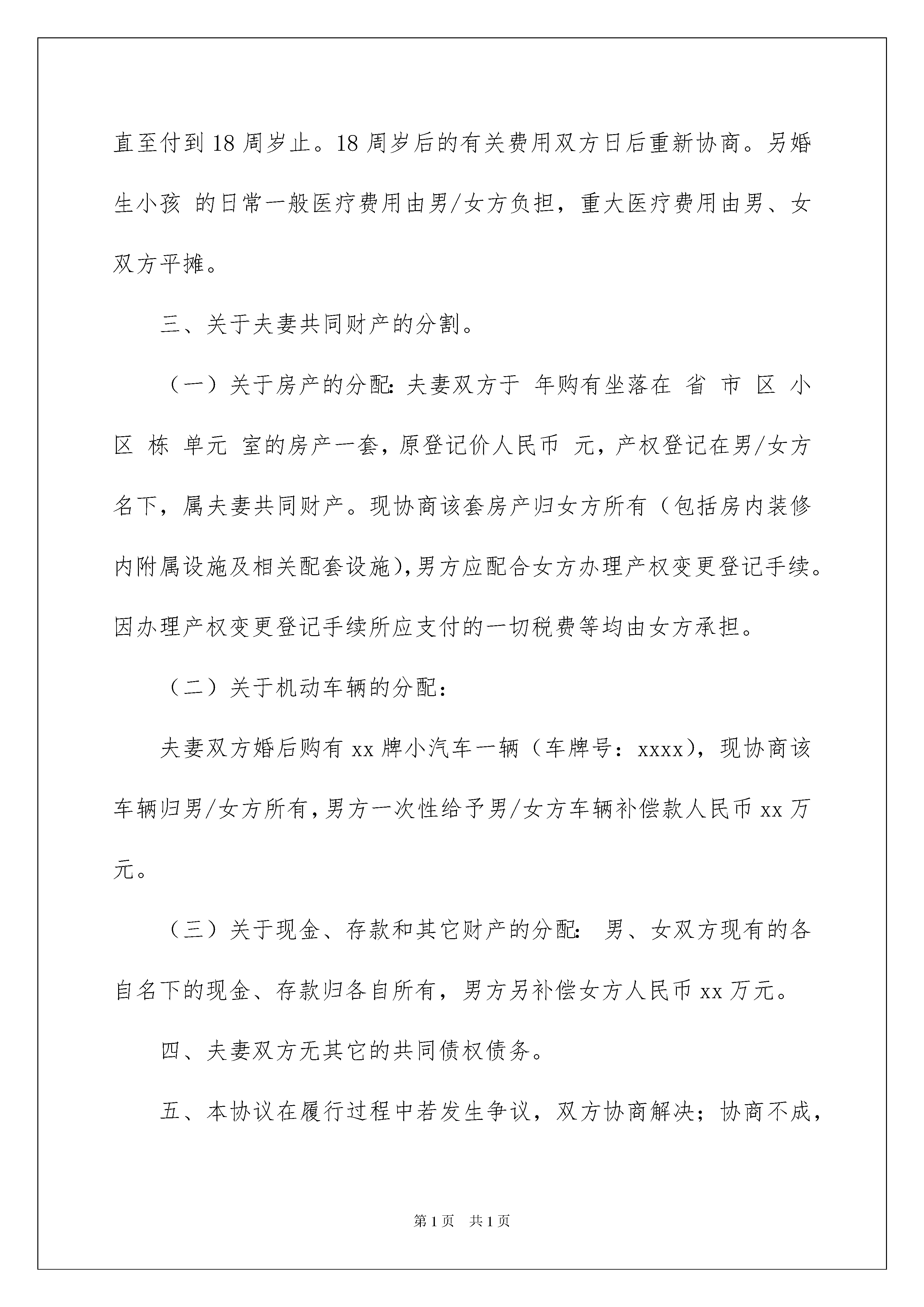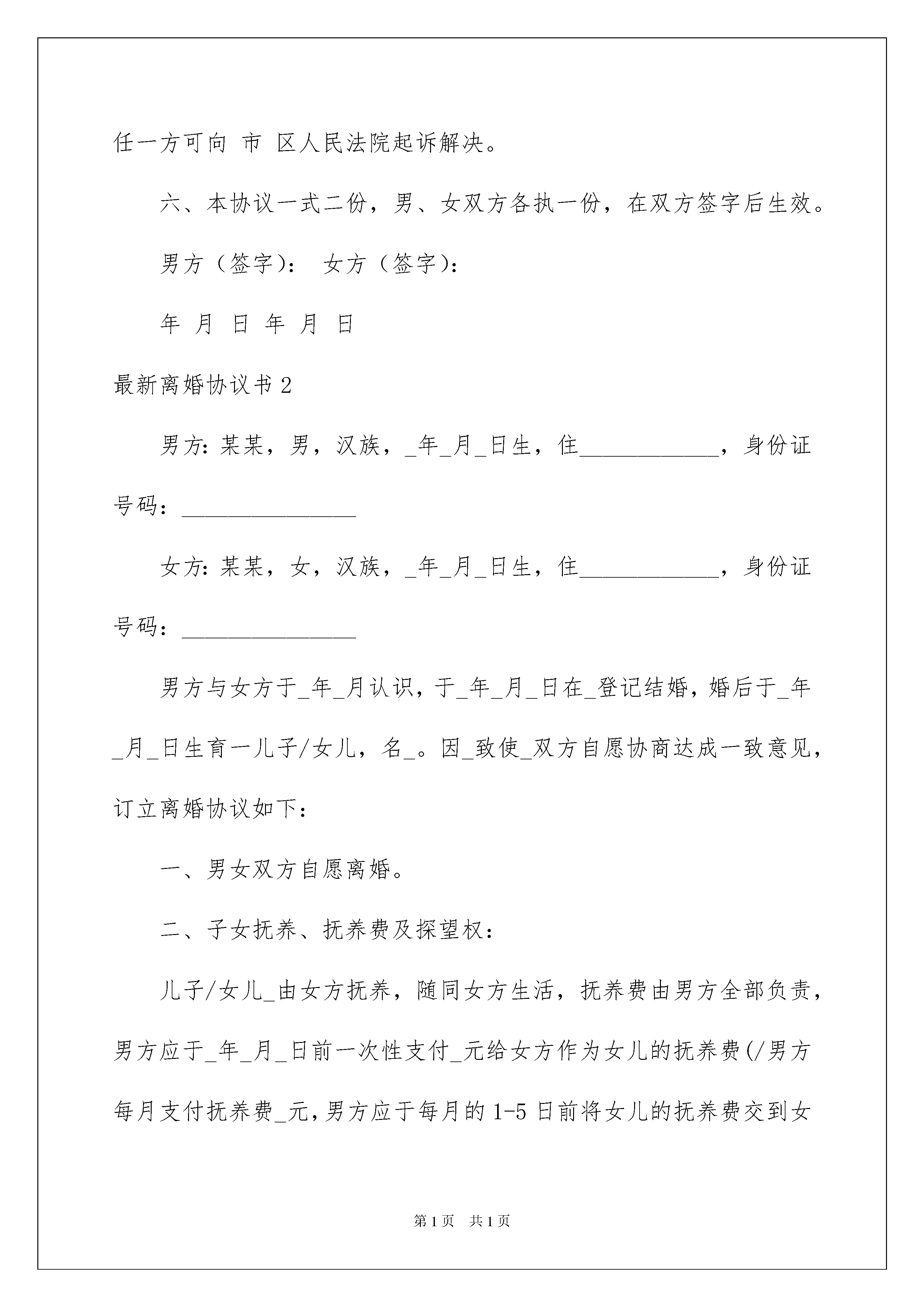 2022最新离婚协议书最新离婚协议书在社会发展不断提速的今天,协议书起到的作用越来越大,签订协议书后则有法可依,有据可寻。我们该怎么拟定协议书呢?以下是我为大家收集的最新离婚协议书,欢迎阅读与收藏。最新离婚协议书1男方:男,汉族,年月日生身份证号:住址:xx女方:女,汉族,年月日生身份证号:住址:xx男、女双方于XX年xx月xx日在xx省xx县民政局登记结婚。XX年xx月xx日,婚生小孩出生。现因双方性格不合无法共同生活,夫妻感情已完全破裂,经双方协商一致,现双方自愿达成如下协议:一、男方与女方离婚。二、有关子女的抚养:婚生小孩随男/女方共同生活,由女/男方每月给付抚养费人民币xxx元,于每月10号前以转帐的方式支付,直至付到18周岁止。18周岁后的有关费用双方日后重新协商。另婚生小孩的日常一般医疗费用由男/女方负担,重大医疗费用由男、女双方平摊。三、关于夫妻共同财产的分割。(一)关于房产的分配:夫妻双方于年购有坐落在省市区小区栋单元室的房产一套,原登记价人民币元,产权登记在男/女方名下,属夫妻共同财产。现协商该套房产归女方所有(包括房内装修内附属设施及相关配套设施),男方应配合女方办理产权变更登记手续。因办理产权变更登记手续所应支付的一切税费等均由女方承担。(二)关于机动车辆的分配:夫妻双方婚后购有xx牌小汽车一辆(车牌号:xxxx),现协商该车辆归男/女方所有,男方一次性给予男/女方车辆补偿款人民币xx万元。(三)关于现金、存款和其它财产的分配:男、女双方现有的各自名下的现金、存款归各自所有,男方另补偿女方人民币xx万元。四、夫妻双方无其它的共同债权债务。五、本协议在履行过程中若发生争议,双方协商解决;协商不成,任一方可向市区人民法院起诉解决。六、本协议一式二份,男、女双方各执一份,在双方签字后生效。男方(签字):女方(签字):年月日年月日最新离婚协议书2男方:某某,男,汉族,_年_月_日生,住____________,身份证号码:_______________女方:某某,女,汉族,_年_月_日生,住____________,身份证号码:_______________男方与女方于_年_月认识,于_年_月_日在_登记结婚,婚后于_年_月_日生育一儿子/女儿,名_。因_致使_双方自愿协商达成一致意见,订立离婚协议如下:一、男女双方自愿离婚。二、子女抚养、抚养费及探望权:儿子/女儿_由女方抚养,随同女方生活,抚养费由男方全部负责,男方应于_年_月_日前一次性支付_元给女方作为女儿的抚养费(/男方每月支付抚养费_元,男方应于每月的1-5日前将女儿的抚养费交到女方手中或指定的__共同财产的处理:⑴存款:双方名下现有银行存款共_元,双方各分一半,为_元。分配方式:各自名下的存款保持不变,但男方/女方应于_年_月_日前一次性支付_元给女方/男方。⑵房屋:_共同财产的责任:双方确认_法院起诉。男方:______女方:_______签名:______签名:________年_月_日_年_月_日最新离婚协议书3男方:周xx,男,汉族,____年__月__日生,住______,身份证号码:女方:吕xx,女,汉族,____年__月__日生,住______,身份证号码:男方周xx与女方吕xx于____年__月认识,于__年__月__日在____登记结婚,婚后于__年__月__日生育一儿子/女儿,名______。因____致使夫妻感情破裂,已无和好可能,现经夫妻双方自愿协商达成一致意见,订立离婚协议如下:一、男女双方自愿离婚。二、子女抚养、抚养费及探望权:儿子/女儿______由女方抚养,随同女方生活,抚养费(含托养费、教育费、医疗费)由男方全部负责,男方应于__年__月__日前一次性支付______元给女方作为女儿的抚养费(/男方每月支付抚养费__元,男方应于每月的1-5日前将女儿的抚养费交到女方手中或指定的xx银行帐号:)。在不影响孩子学习、生活的情况下,男方可随时探望女方抚养的孩子。(/男方每星期休息日可探望女儿一次或带女儿外出游玩,但应提前通知女方,女方应保证男方每周探望的时间不少于一天。)三、夫妻共同财产的处理:(1)存款:双方名下现有银行存款共______元,双方各分一半,为______元。分配方式:各自名下的存款保持不变,但男方/女方应于____年____月____日前一次性支付元给女方/男方。(2)房屋:夫妻共同所有的位于xxx的房地产所有权归女方所有,__房地产权证的业主姓名变更的手续自离婚后一个月内办理,男方必须协助女方办理变更的一切手续,过户费用由女方负责。女方应于____