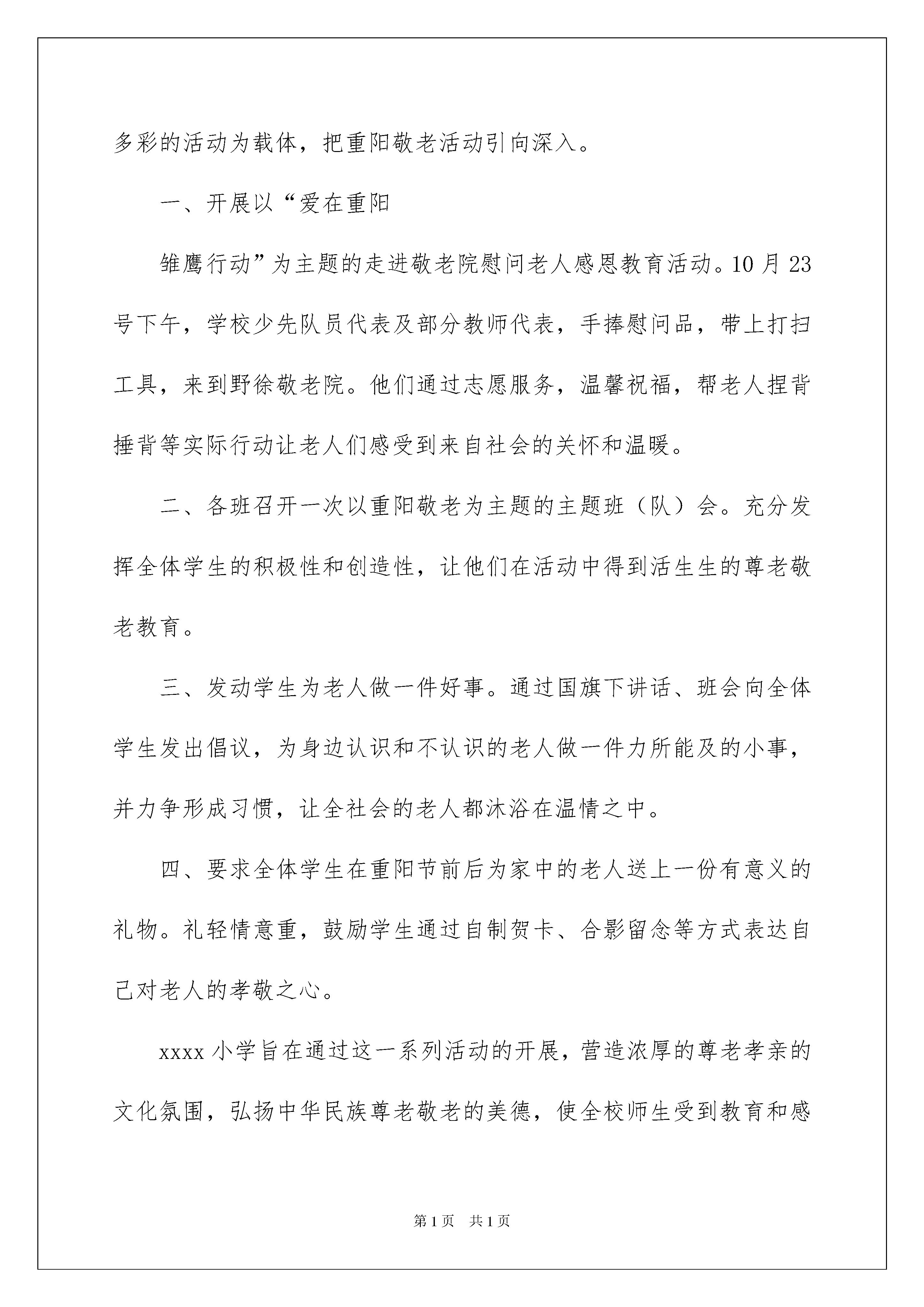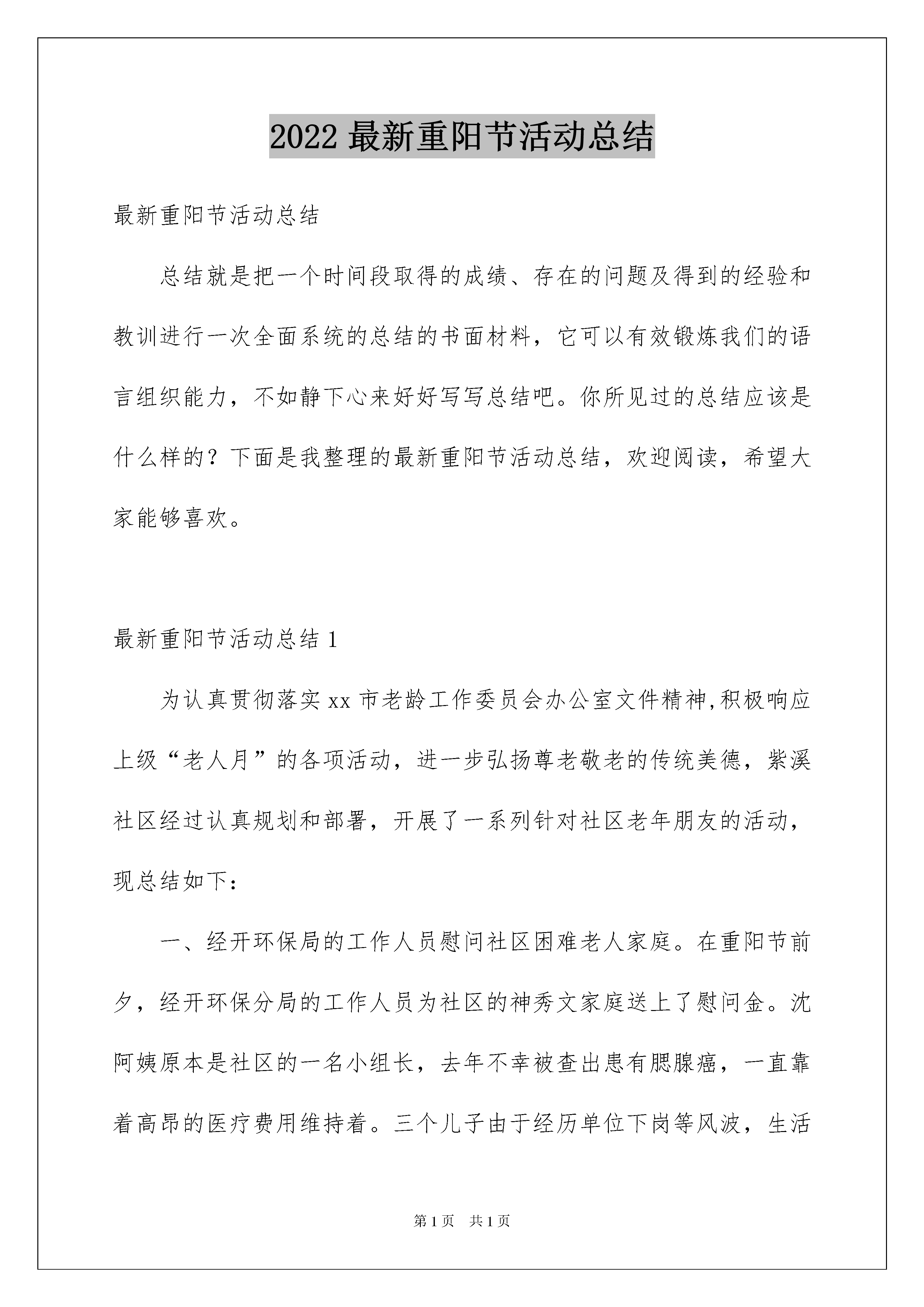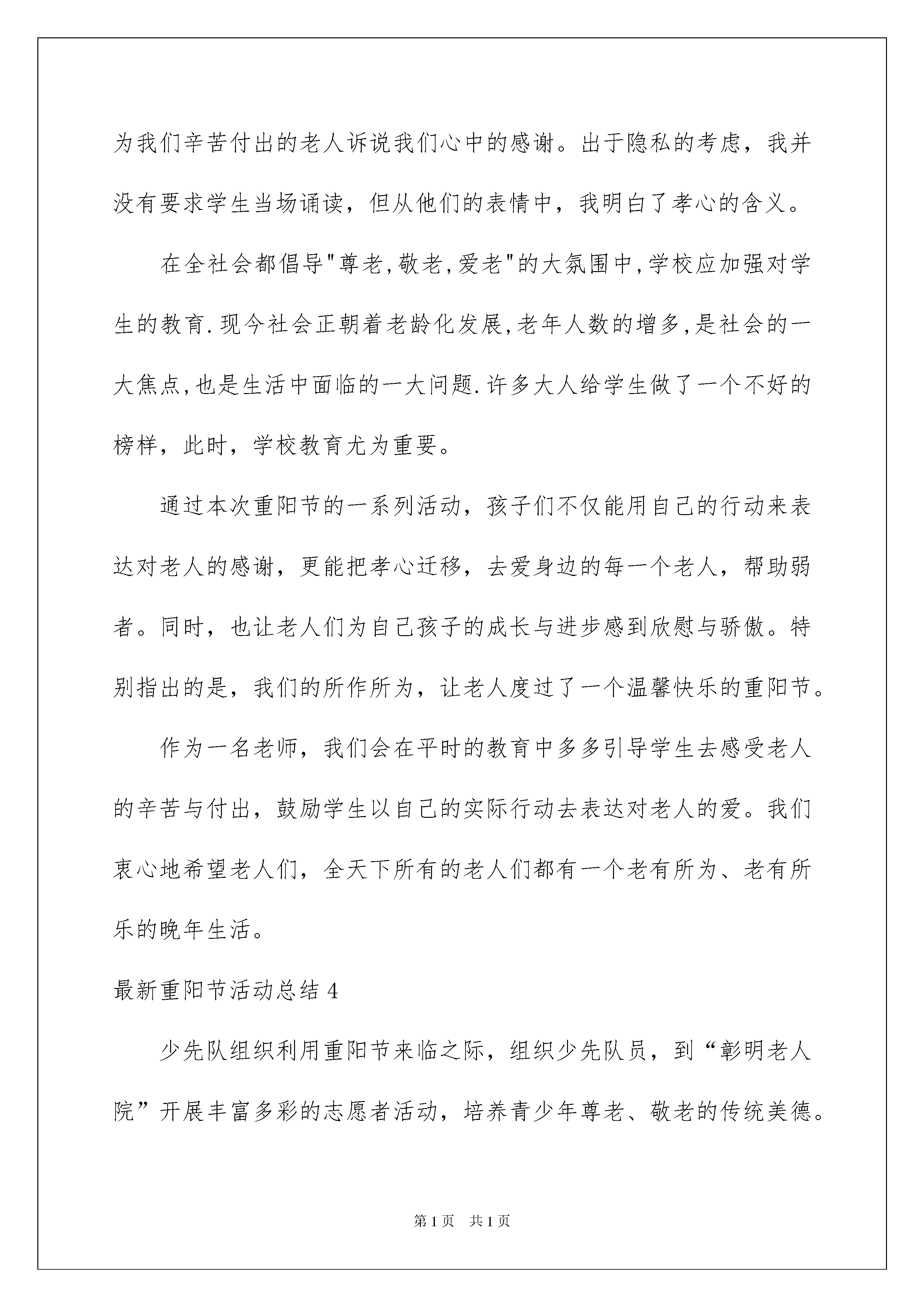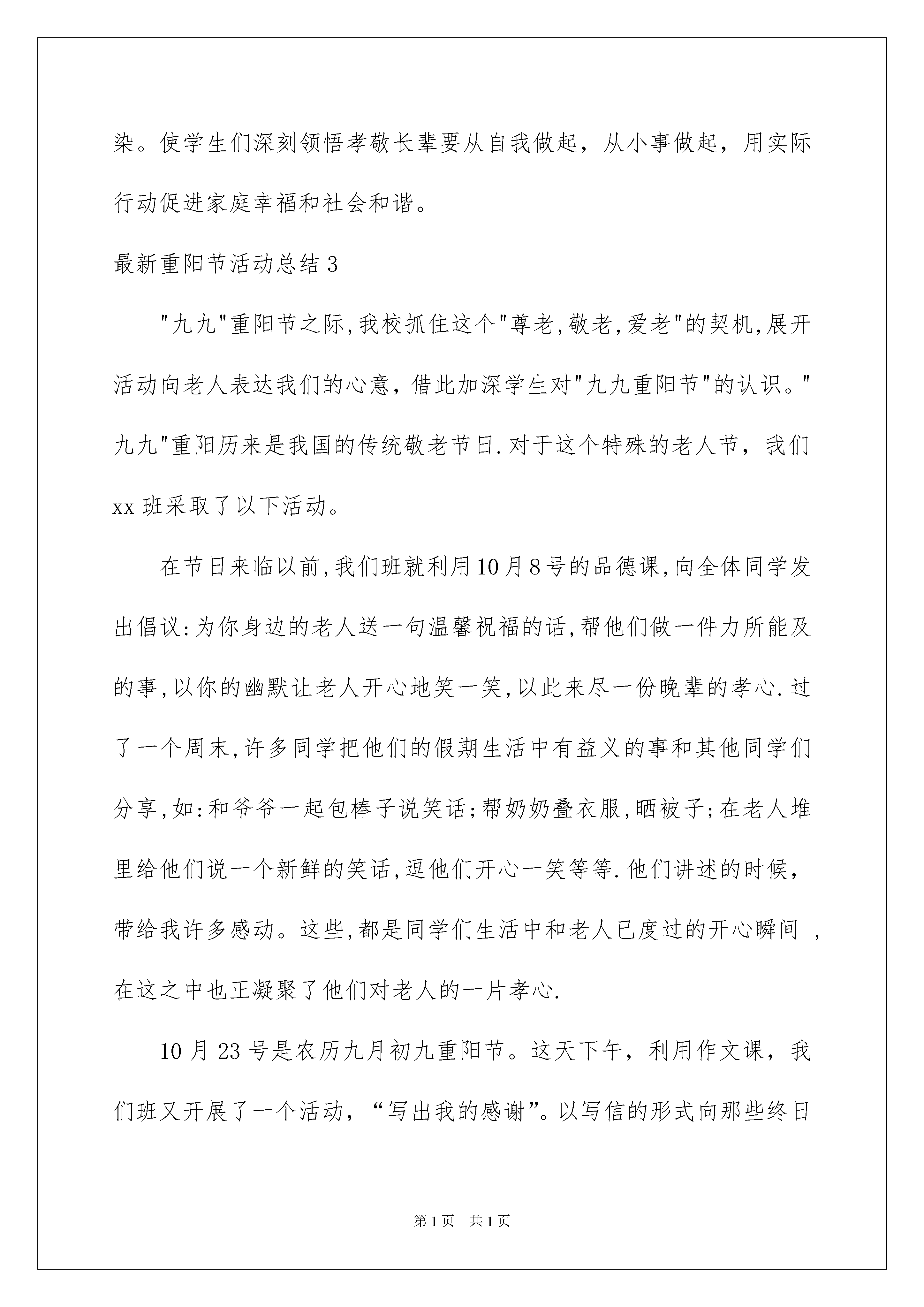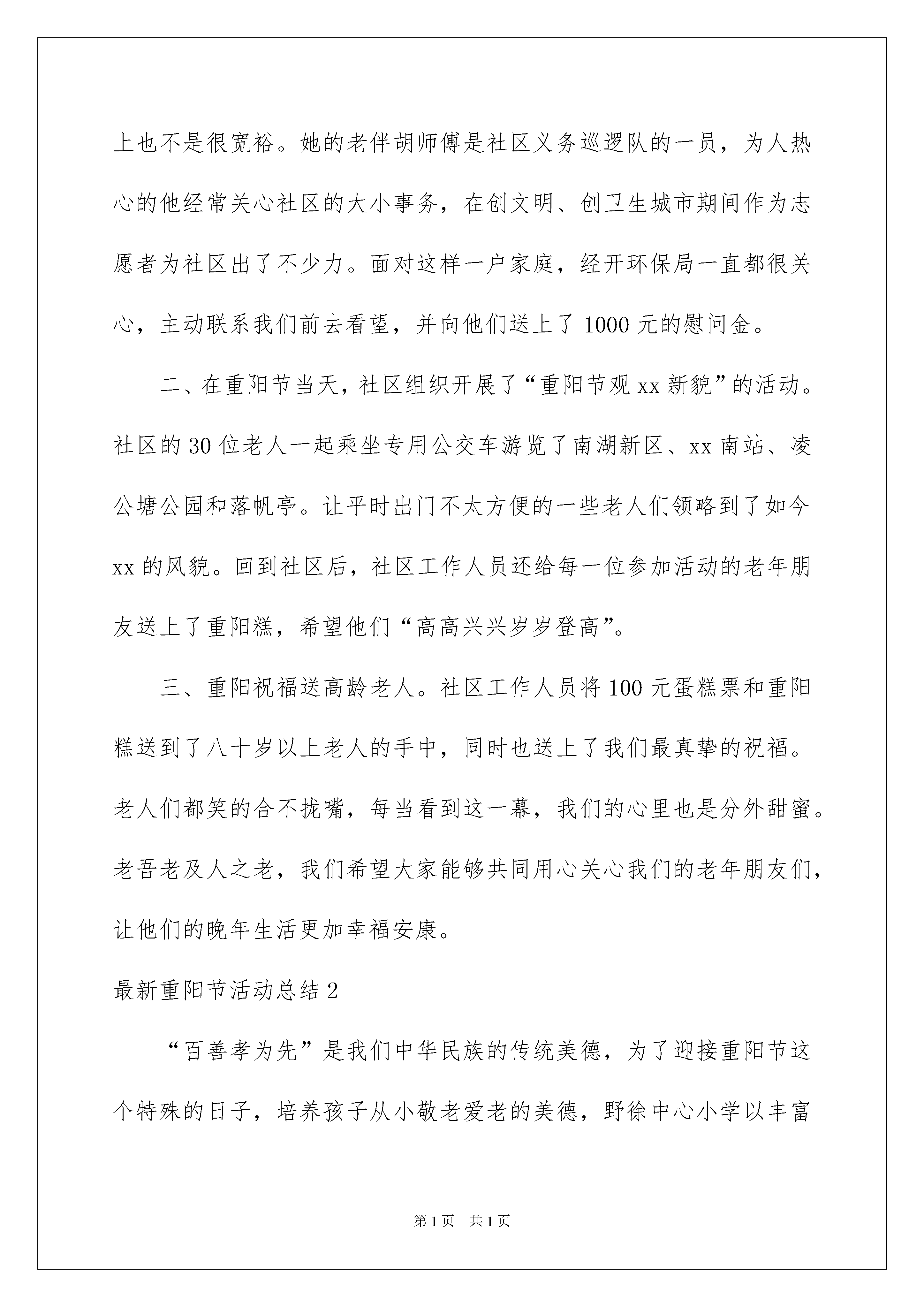 2022最新重阳节活动总结最新重阳节活动总结总结就是把一个时间段取得的成绩、存在的问题及得到的经验和教训进行一次全面系统的总结的书面材料,它可以有效锻炼我们的语言组织能力,不如静下心来好好写写总结吧。你所见过的总结应该是什么样的?下面是我整理的最新重阳节活动总结,欢迎阅读,希望大家能够喜欢。最新重阳节活动总结1为认真贯彻落实xx市老龄工作委员会办公室文件精神,积极响应上级“老人月”的各项活动,进一步弘扬尊老敬老的传统美德,紫溪社区经过认真规划和部署,开展了一系列针对社区老年朋友的活动,现总结如下:一、经开环保局的工作人员慰问社区困难老人家庭。在重阳节前夕,经开环保分局的工作人员为社区的神秀文家庭送上了慰问金。沈阿姨原本是社区的一名小组长,去年不幸被查出患有腮腺癌,一直靠着高昂的医疗费用维持着。三个儿子由于经历单位下岗等风波,生活上也不是很宽裕。她的老伴胡师傅是社区义务巡逻队的一员,为人热心的他经常关心社区的大小事务,在创文明、创卫生城市期间作为志愿者为社区出了不少力。面对这样一户家庭,经开环保局一直都很关心,主动联系我们前去看望,并向他们送上了1000元的慰问金。二、在重阳节当天,社区组织开展了“重阳节观xx新貌”的活动。社区的30位老人一起乘坐专用公交车游览了南湖新区、xx南站、凌公塘公园和落帆亭。让平时出门不太方便的一些老人们领略到了如今xx的风貌。回到社区后,社区工作人员还给每一位参加活动的老年朋友送上了重阳糕,希望他们“高高兴兴岁岁登高”。三、重阳祝福送高龄老人。社区工作人员将100元蛋糕票和重阳糕送到了八十岁以上老人的手中,同时也送上了我们最真挚的祝福。老人们都笑的合不拢嘴,每当看到这一幕,我们的心里也是分外甜蜜。老吾老及人之老,我们希望大家能够共同用心关心我们的老年朋友们,让他们的晚年生活更加幸福安康。最新重阳节活动总结2“百善孝为先”是我们中华民族的传统美德,为了迎接重阳节这个特殊的日子,培养孩子从小敬老爱老的美德,野徐中心小学以丰富多彩的活动为载体,把重阳敬老活动引向深入。一、开展以“爱在重阳雏鹰行动”为主题的走进敬老院慰问老人感恩教育活动。10月23号下午,学校少先队员代表及部分教师代表,手捧慰问品,带上打扫工具,来到野徐敬老院。他们通过志愿服务,温馨祝福,帮老人捏背捶背等实际行动让老人们感受到来自社会的关怀和温暖。二、各班召开一次以重阳敬老为主题的主题班(队)会。充分发挥全体学生的积极性和创造性,让他们在活动中得到活生生的尊老敬老教育。三、发动学生为老人做一件好事。通过国旗下讲话、班会向全体学生发出倡议,为身边认识和不认识的老人做一件力所能及的小事,并力争形成习惯,让全社会的老人都沐浴在温情之中。四、要求全体学生在重阳节前后为家中的老人送上一份有意义的礼物。礼轻情意重,鼓励学生通过自制贺卡、合影留念等方式表达自己对老人的孝敬之心。xxxx小学旨在通过这一系列活动的开展,营造浓厚的尊老孝亲的文化氛围,弘扬中华民族尊老敬老的美德,使全校师生受到教育和感染。使学生们深刻领悟孝敬长辈要从自我做起,从小事做起,用实际行动促进家庭幸福和社会和谐。最新重阳节活动总结3"九九"重阳节之际,我校抓住这个"尊老,敬老,爱老"的契机,展开活动向老人表达我们的心意,借此加深学生对"九九重阳节"的认识。"九九"重阳历来是我国的传统敬老节日.对于这个特殊的老人节,我们xx班采取了以下活动。在节日来临以前,我们班就利用10月8号的品德课,向全体同学发出倡议:为你身边的老人送一句温馨祝福的话,帮他们做一件力所能及的事,以你的幽默让老人开心地笑一笑,以此来尽一份晚辈的孝心.过了一个周末,许多同学把他们的假期生活中有益义的事和其他同学们分享,如:和爷爷一起包棒子说笑话;帮奶奶叠衣服,晒被子;在老人堆里给他们说一个新鲜的笑话,逗他们开心一笑等等.他们讲述的时候,带给我许多感动。这些,都是同学们生活中和老人已度过的开心瞬间,在这之中也正凝聚了他们对老人的一片孝心.10月23号是农历九月初九重阳节。这天下午,利用作文课,我们班又开展了一个活动,“写出我的感谢”。以写信的形式向那些终日为我们辛苦付出的老人诉说我们心中的感谢。出于隐私的考虑,我并没有要求学生当场诵读,但从他们的表情中,我明白了孝心的含义。在全社会都倡导"尊老,敬老,爱老"的大氛围中,学校应加强对学生的教育.现今社会正朝着老龄化发展,老年人数的增多,是社会的一大焦点,也是生活中面临的一大问题.许多大人给学生做了一个不好的榜样,此时,学校教育尤为重要。通过本次重阳节的一系列活动,孩子们不仅能用自己的行动来表达对老人的感谢,更能把孝心迁