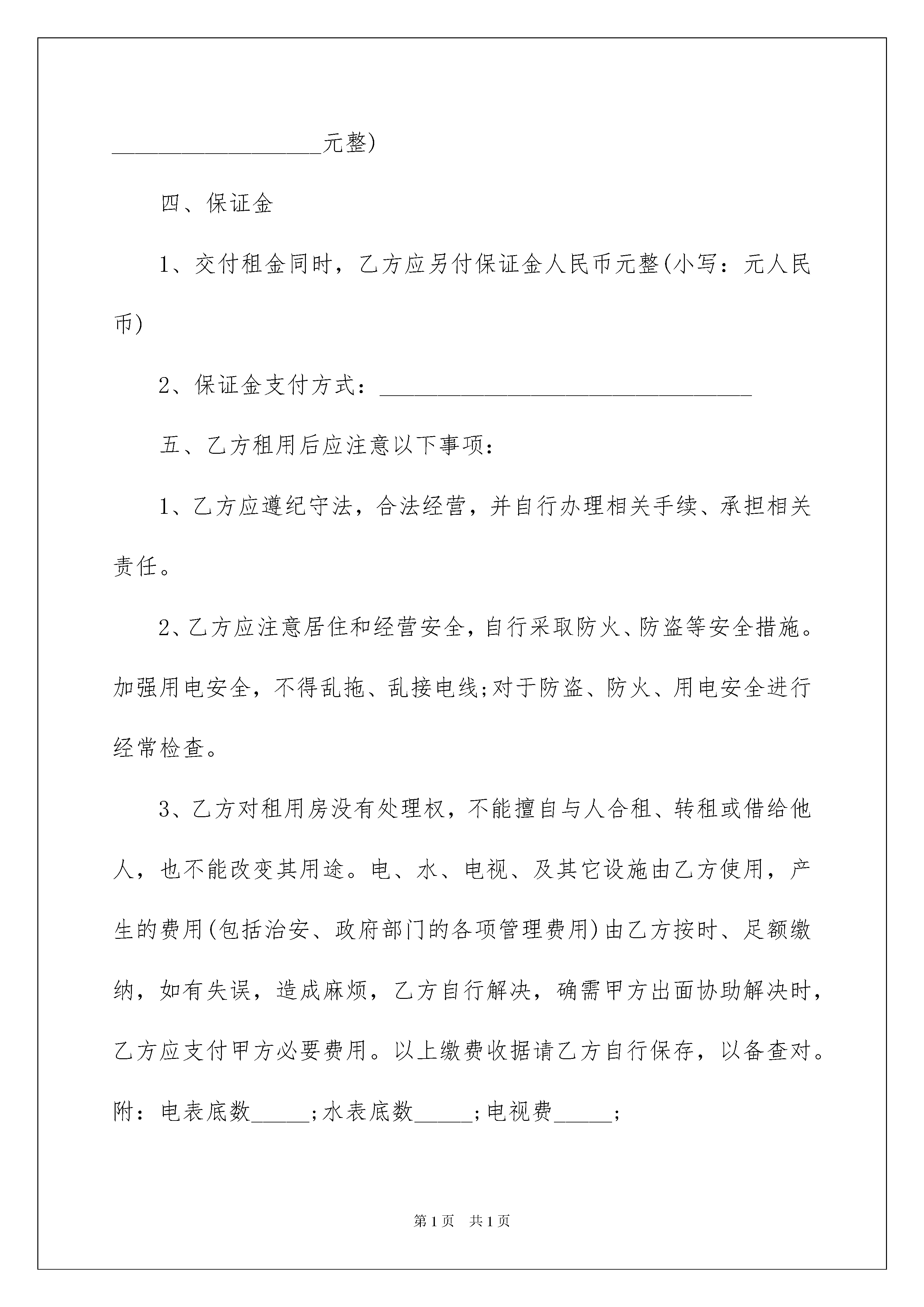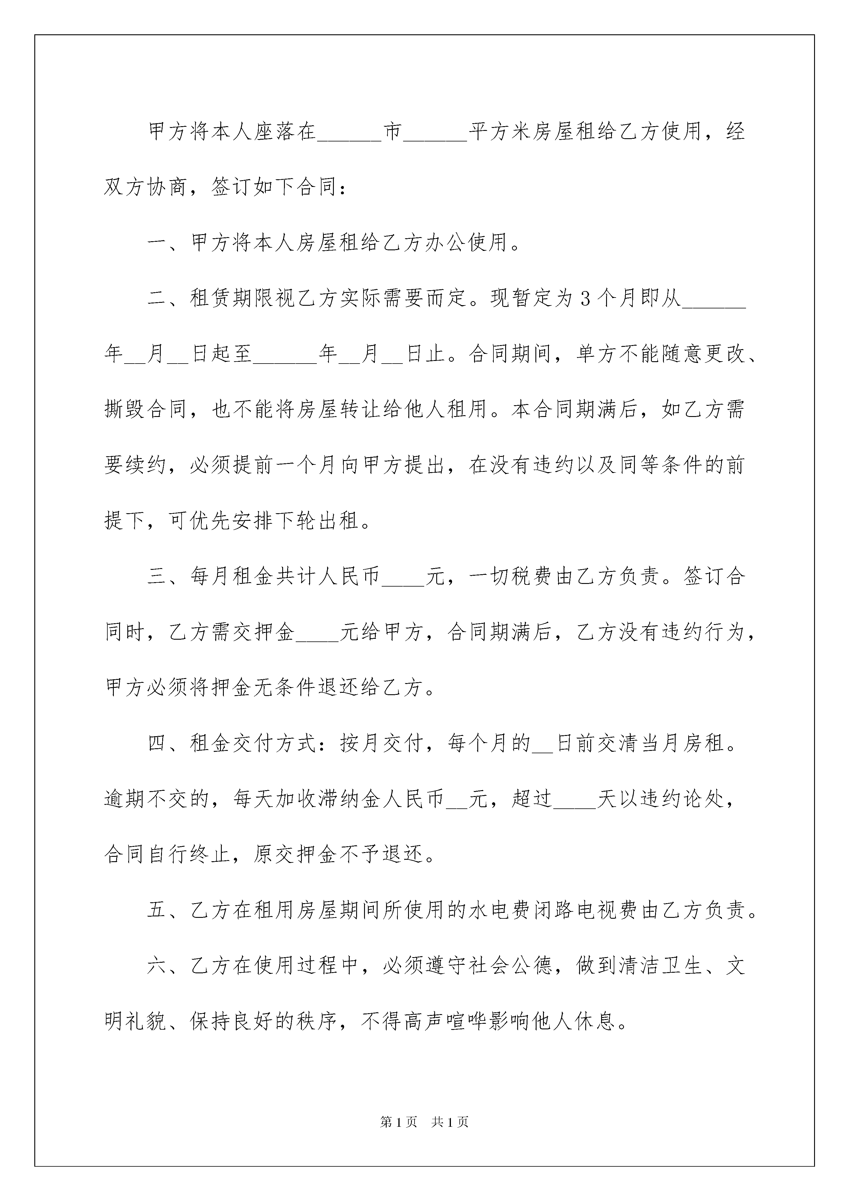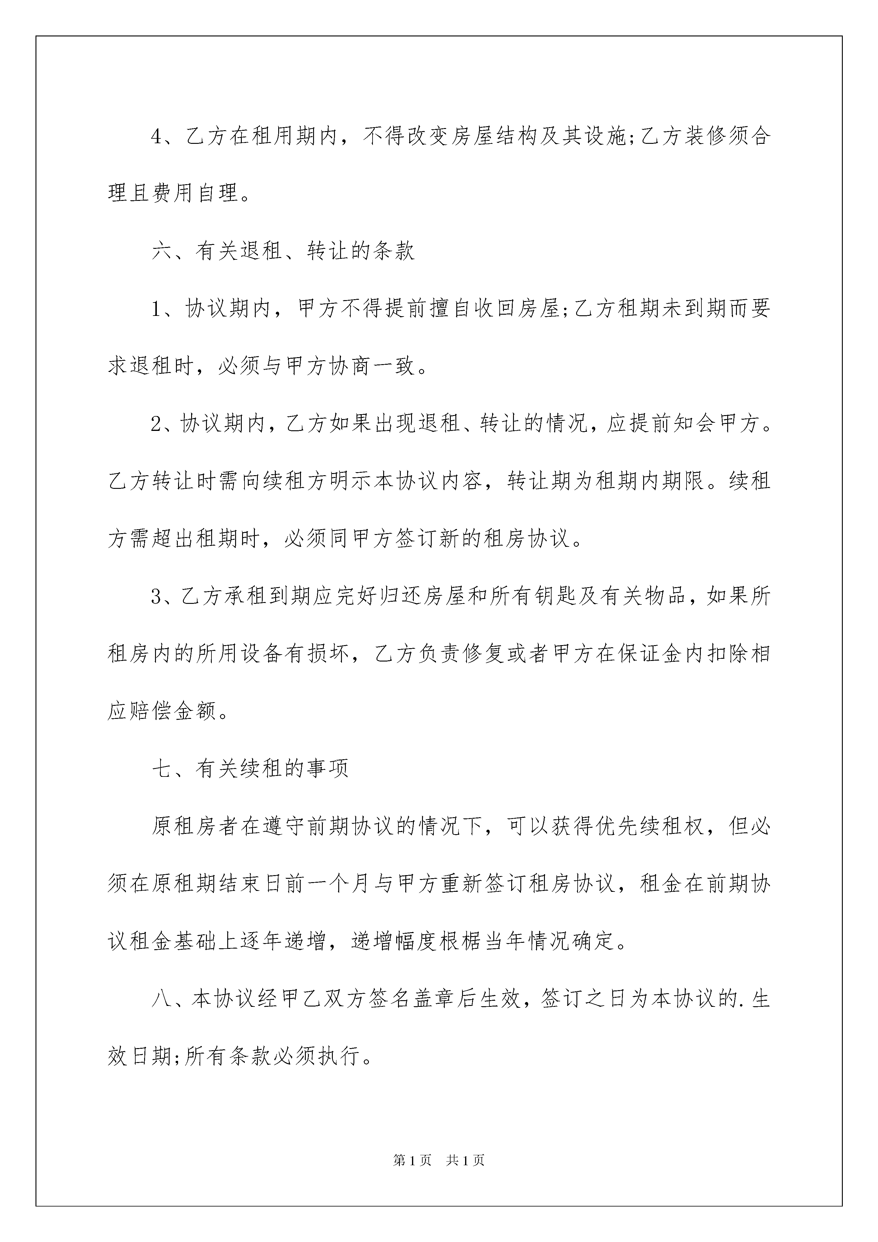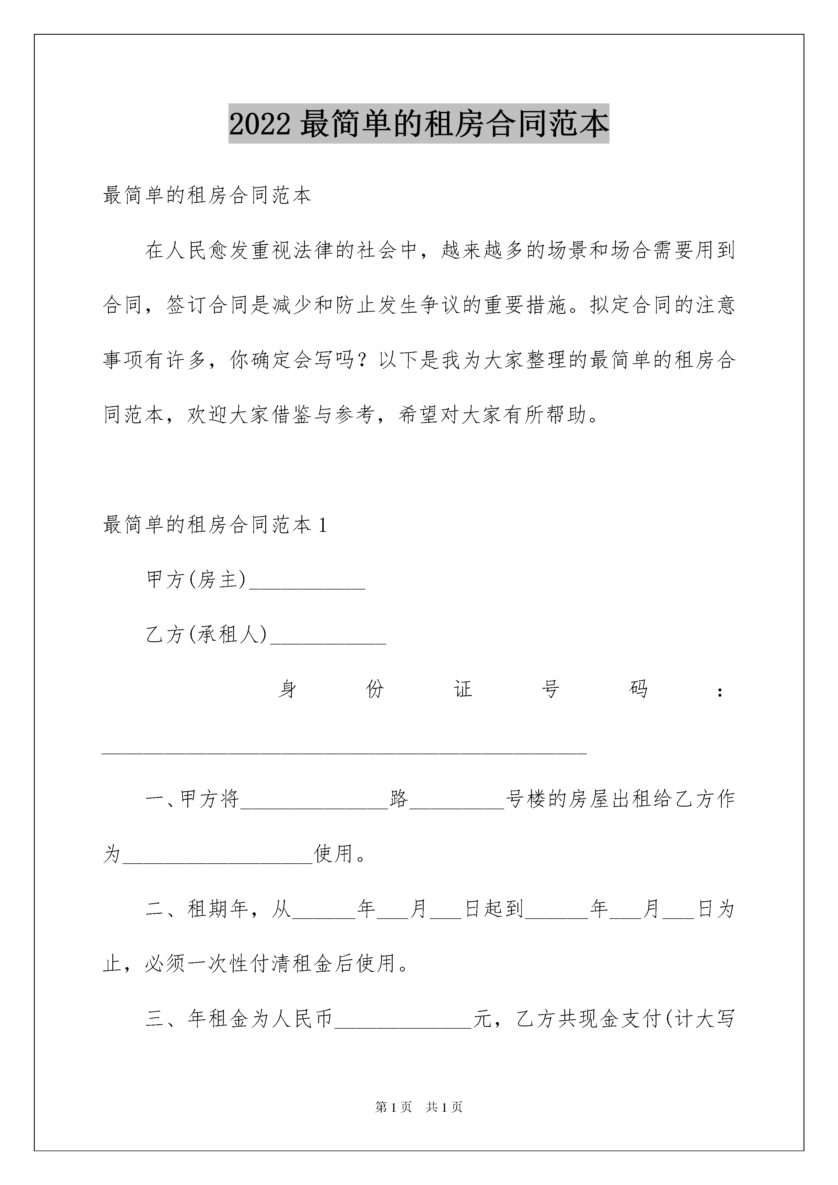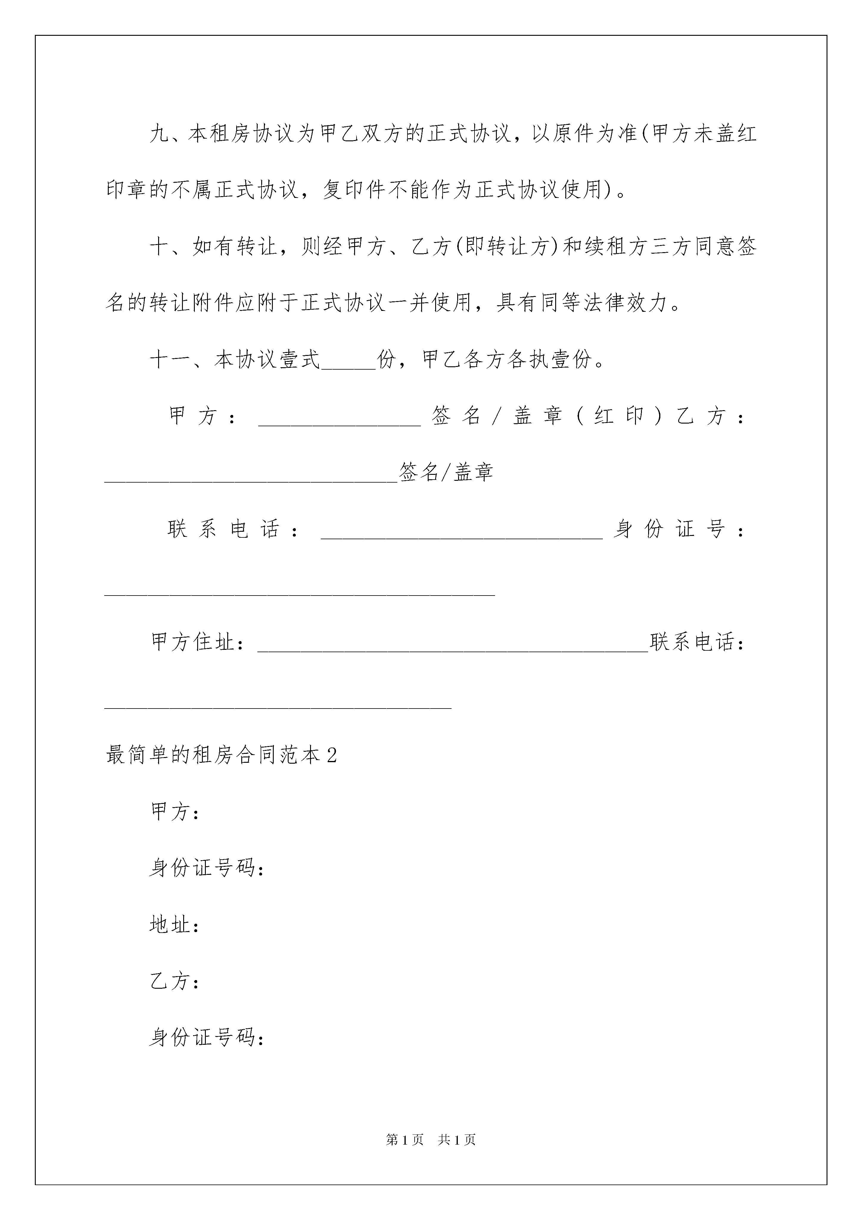 2022最简单的租房合同范本最简单的租房合同范本在人民愈发重视法律的社会中,越来越多的场景和场合需要用到合同,签订合同是减少和防止发生争议的重要措施。拟定合同的注意事项有许多,你确定会写吗?以下是我为大家整理的最简单的租房合同范本,欢迎大家借鉴与参考,希望对大家有所帮助。最简单的租房合同范本1甲方(房主)___________乙方(承租人)___________身份证号码:______________________________________________一、甲方将______________路_________号楼的房屋出租给乙方作为__________________使用。二、租期年,从______年___月___日起到______年___月___日为止,必须一次性付清租金后使用。三、年租金为人民币_____________元,乙方共现金支付(计大写__________________元整)四、保证金1、交付租金同时,乙方应另付保证金人民币元整(小写:元人民币)2、保证金支付方式:________________________________五、乙方租用后应注意以下事项:1、乙方应遵纪守法,合法经营,并自行办理相关手续、承担相关责任。2、乙方应注意居住和经营安全,自行采取防火、防盗等安全措施。加强用电安全,不得乱拖、乱接电线;对于防盗、防火、用电安全进行经常检查。3、乙方对租用房没有处理权,不能擅自与人合租、转租或借给他人,也不能改变其用途。电、水、电视、及其它设施由乙方使用,产生的费用(包括治安、政府部门的各项管理费用)由乙方按时、足额缴纳,如有失误,造成麻烦,乙方自行解决,确需甲方出面协助解决时,乙方应支付甲方必要费用。以上缴费收据请乙方自行保存,以备查对。附:电表底数_____;水表底数_____;电视费_____;4、乙方在租用期内,不得改变房屋结构及其设施;乙方装修须合理且费用自理。六、有关退租、转让的条款1、协议期内,甲方不得提前擅自收回房屋;乙方租期未到期而要求退租时,必须与甲方协商一致。2、协议期内,乙方如果出现退租、转让的情况,应提前知会甲方。乙方转让时需向续租方明示本协议内容,转让期为租期内期限。续租方需超出租期时,必须同甲方签订新的租房协议。3、乙方承租到期应完好归还房屋和所有钥匙及有关物品,如果所租房内的所用设备有损坏,乙方负责修复或者甲方在保证金内扣除相应赔偿金额。七、有关续租的事项原租房者在遵守前期协议的情况下,可以获得优先续租权,但必须在原租期结束日前一个月与甲方重新签订租房协议,租金在前期协议租金基础上逐年递增,递增幅度根椐当年情况确定。八、本协议经甲乙双方签名盖章后生效,签订之日为本协议的.生效日期;所有条款必须执行。九、本租房协议为甲乙双方的正式协议,以原件为准(甲方未盖红印章的不属正式协议,复印件不能作为正式协议使用)。十、如有转让,则经甲方、乙方(即转让方)和续租方三方同意签名的转让附件应附于正式协议一并使用,具有同等法律效力。十一、本协议壹式_____份,甲乙各方各执壹份。甲方:_______________签名/盖章(红印)乙方:___________________________签名/盖章联系电话:__________________________身份证号:____________________________________甲方住址:____________________________________联系电话:________________________________最简单的租房合同范本2甲方:身份证号码:地址:乙方:身份证号码:甲方将本人座落在______市______平方米房屋租给乙方使用,经双方协商,签订如下合同:一、甲方将本人房屋租给乙方办公使用。二、租赁期限视乙方实际需要而定。现暂定为3个月即从______年__月__日起至______年__月__日止。合同期间,单方不能随意更改、撕毁合同,也不能将房屋转让给他人租用。本合同期满后,如乙方需要续约,必须提前一个月向甲方提出,在没有违约以及同等条件的前提下,可优先安排下轮出租。三、每月租金共计人民币____元,一切税费由乙方负责。签订合同时,乙方需交押金____元给甲方,合同期满后,乙方没有违约行为,甲方必须将押金无条件退还给乙方。四、租金交付方式:按月交付,每个月的__日前交清当月房租。逾期不交的,每天加收滞纳金人民币__元,超过____天以违约论处,合同自行终止,原交押金不予退还。五、乙方在租用房屋期间所使用的水电费闭路电视费由乙方负