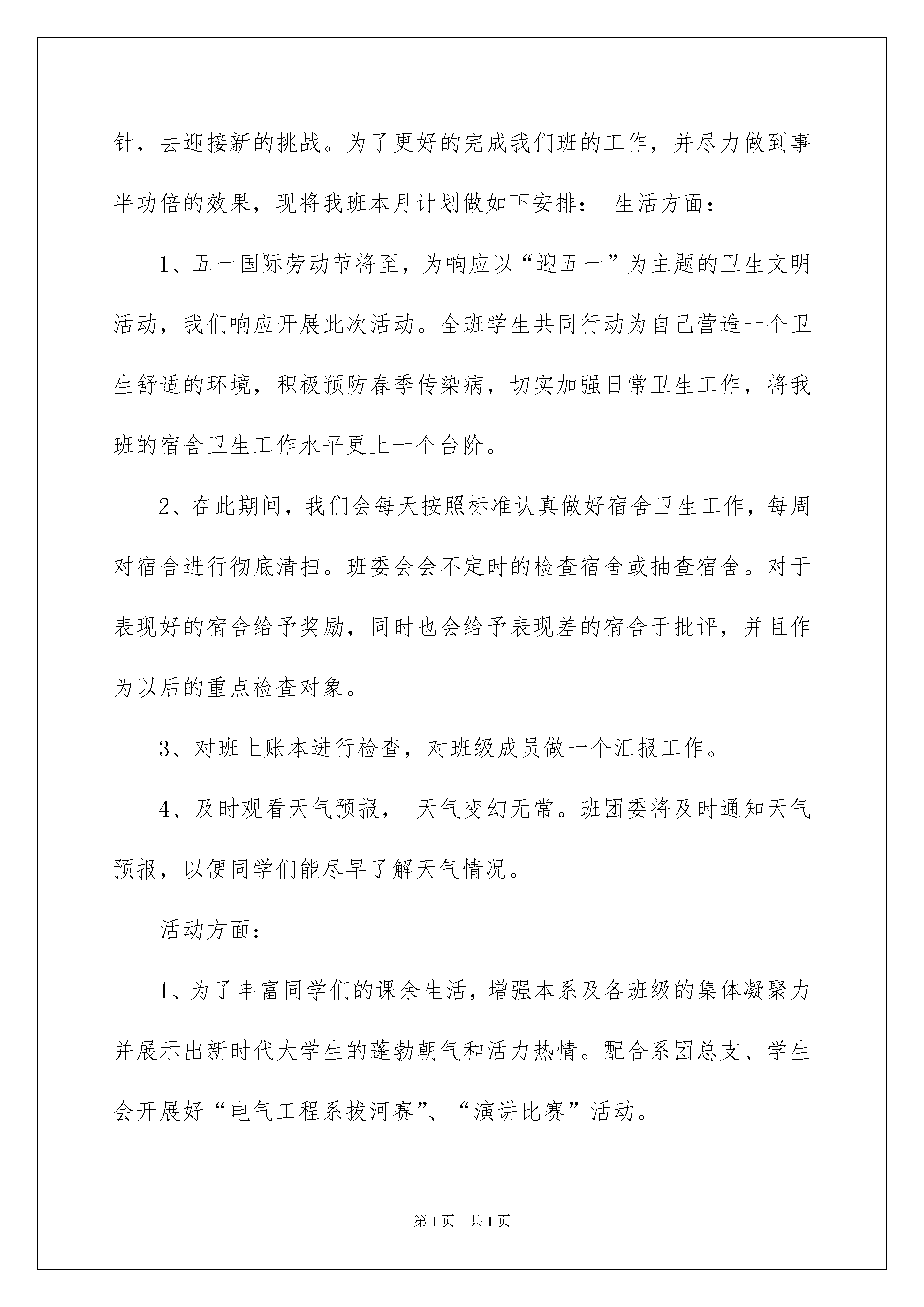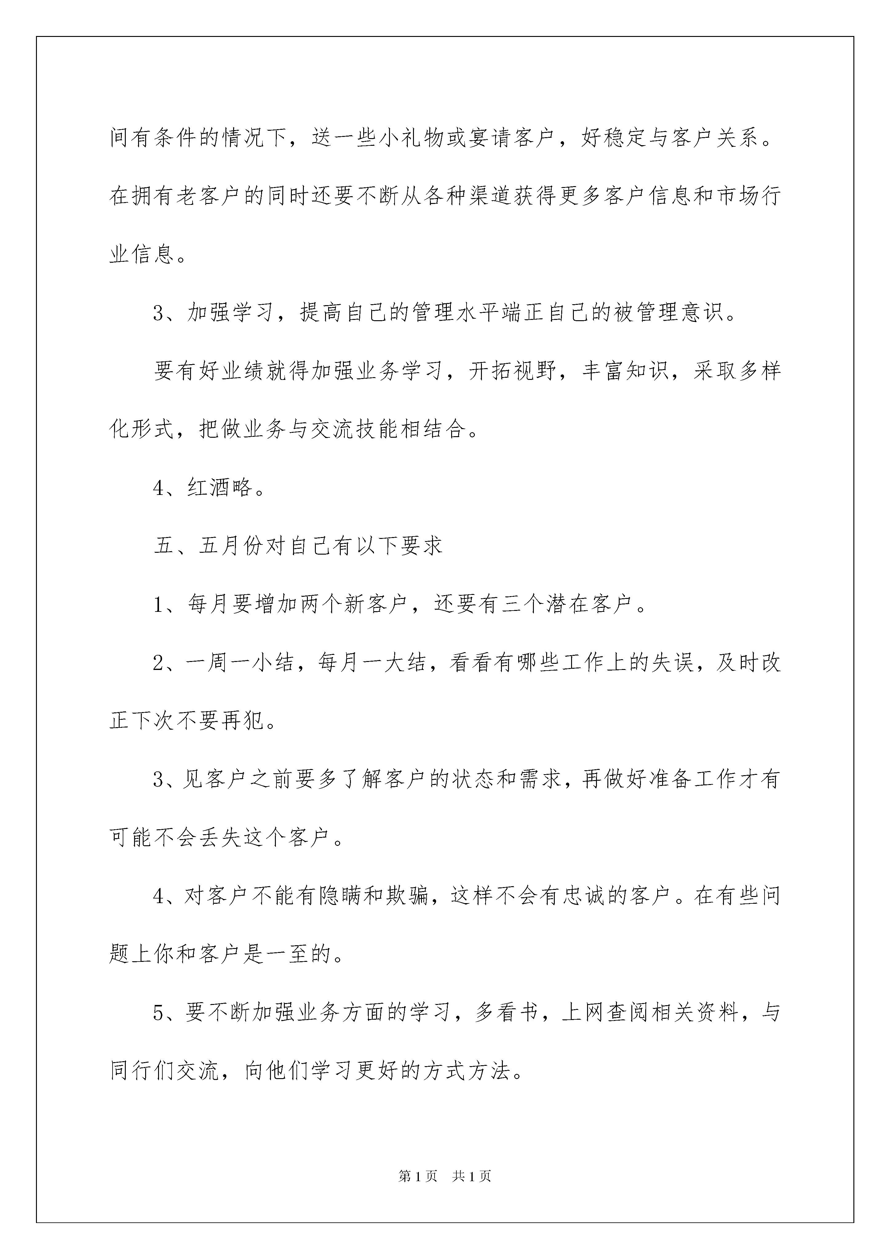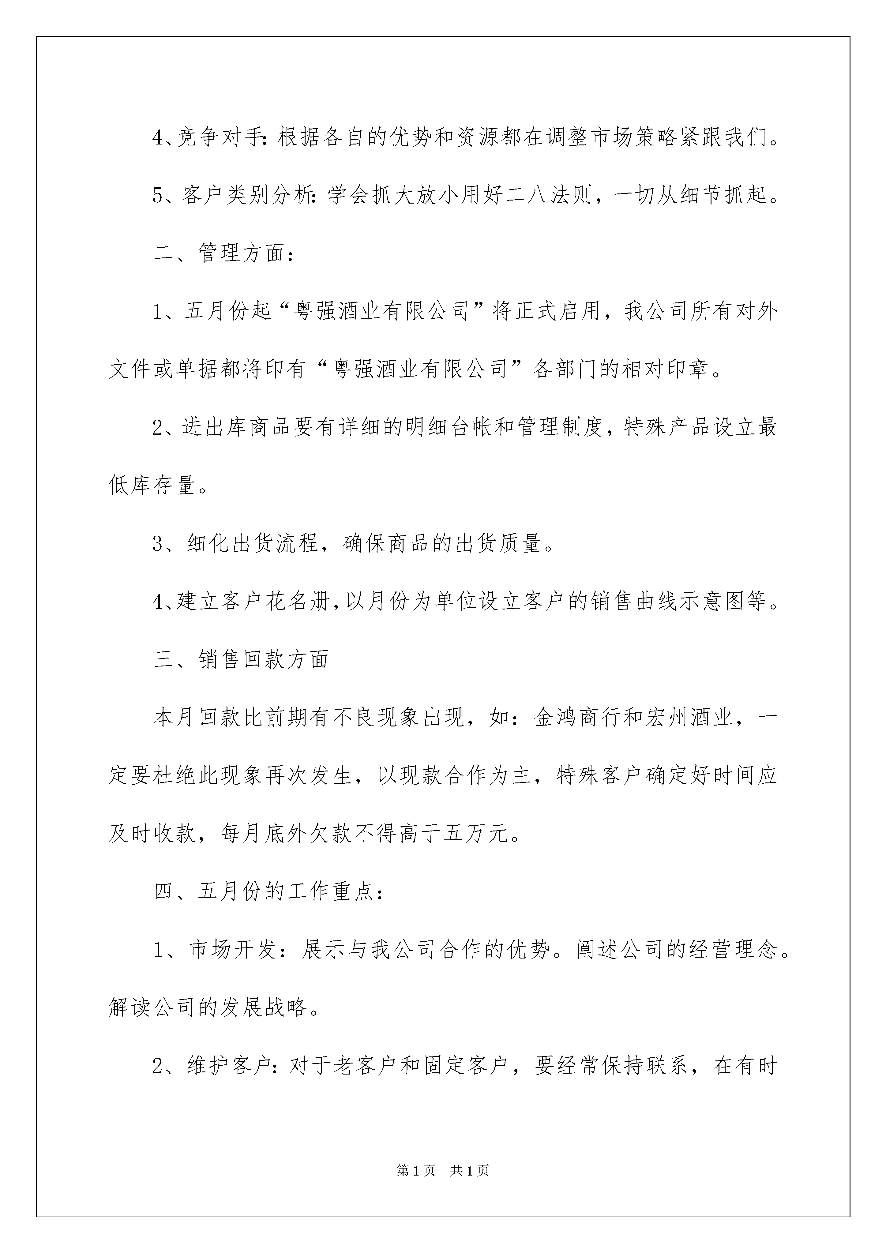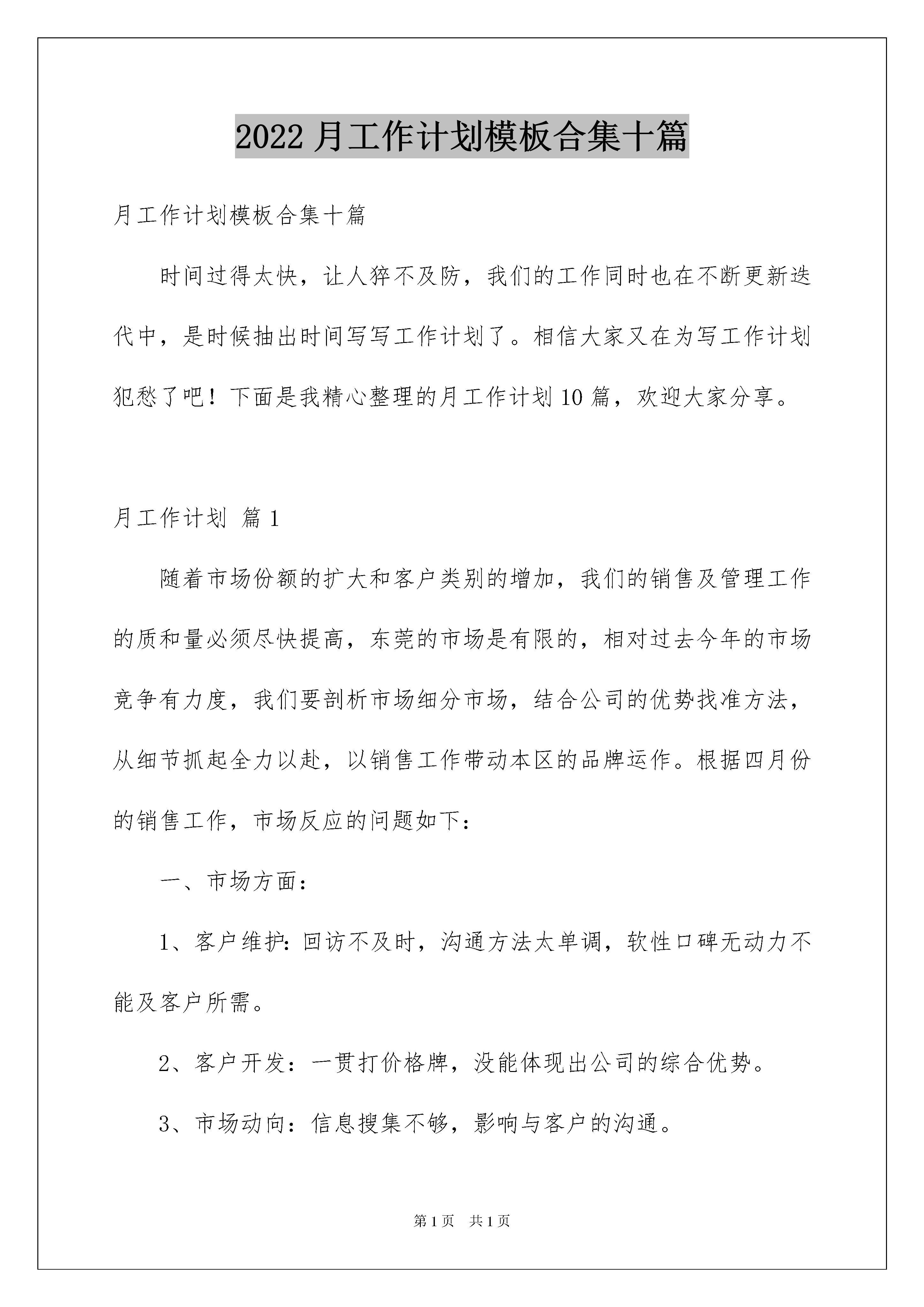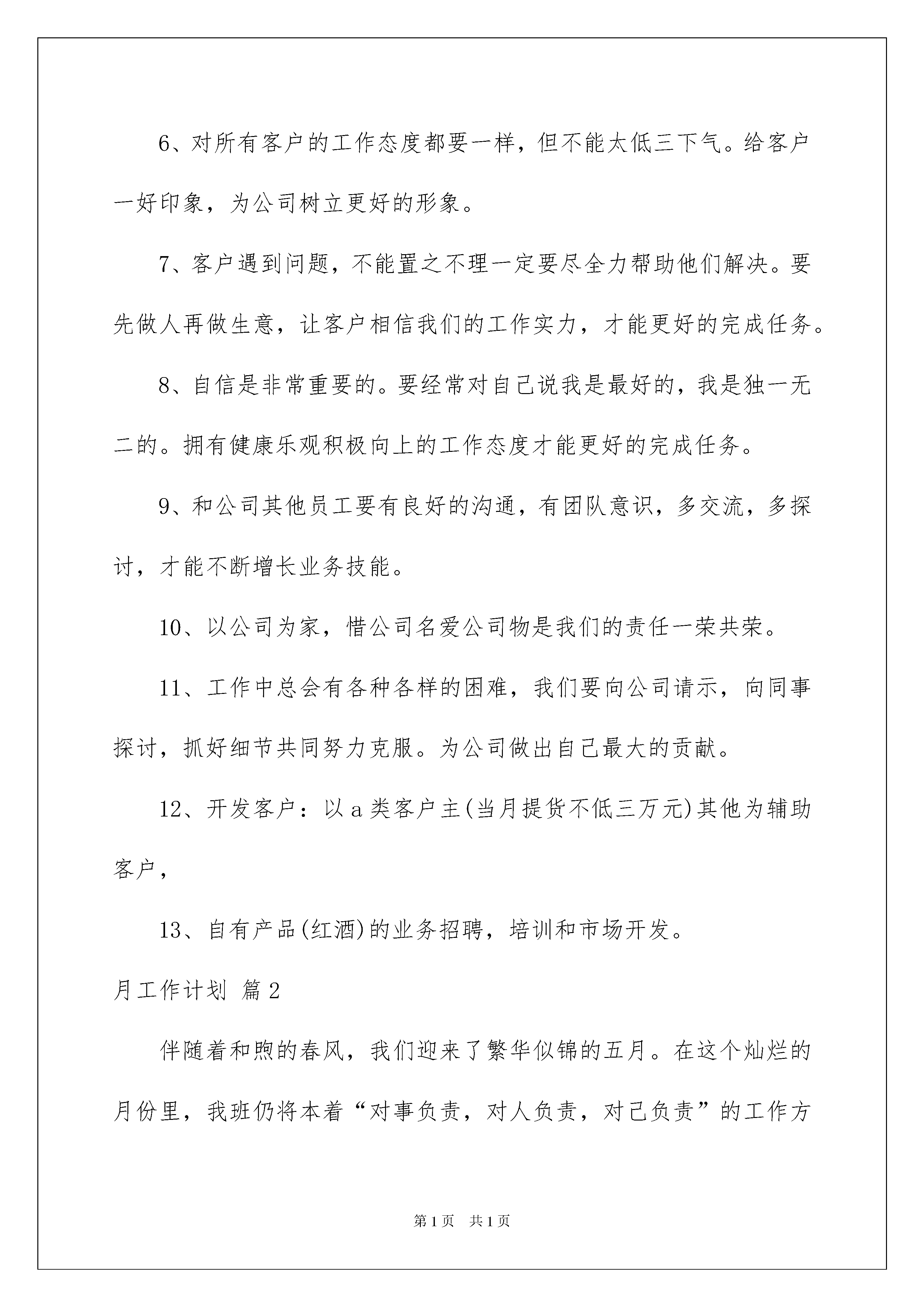 2022月工作计划模板合集十篇月工作计划模板合集十篇时间过得太快,让人猝不及防,我们的工作同时也在不断更新迭代中,是时候抽出时间写写工作计划了。相信大家又在为写工作计划犯愁了吧!下面是我精心整理的月工作计划10篇,欢迎大家分享。月工作计划篇1随着市场份额的扩大和客户类别的增加,我们的销售及管理工作的质和量必须尽快提高,东莞的市场是有限的,相对过去今年的市场竞争有力度,我们要剖析市场细分市场,结合公司的优势找准方法,从细节抓起全力以赴,以销售工作带动本区的品牌运作。根据四月份的销售工作,市场反应的问题如下:一、市场方面:1、客户维护:回访不及时,沟通方法太单调,软性口碑无动力不能及客户所需。2、客户开发:一贯打价格牌,没能体现出公司的综合优势。3、市场动向:信息搜集不够,影响与客户的沟通。4、竞争对手:根据各自的优势和资源都在调整市场策略紧跟我们。5、客户类别分析:学会抓大放小用好二八法则,一切从细节抓起。二、管理方面:1、五月份起“粤强酒业有限公司”将正式启用,我公司所有对外文件或单据都将印有“粤强酒业有限公司”各部门的相对印章。2、进出库商品要有详细的明细台帐和管理制度,特殊产品设立最低库存量。3、细化出货流程,确保商品的出货质量。4、建立客户花名册,以月份为单位设立客户的销售曲线示意图等。三、销售回款方面本月回款比前期有不良现象出现,如:金鸿商行和宏州酒业,一定要杜绝此现象再次发生,以现款合作为主,特殊客户确定好时间应及时收款,每月底外欠款不得高于五万元。四、五月份的工作重点:1、市场开发:展示与我公司合作的优势。阐述公司的经营理念。解读公司的发展战略。2、维护客户:对于老客户和固定客户,要经常保持联系,在有时间有条件的情况下,送一些小礼物或宴请客户,好稳定与客户关系。在拥有老客户的同时还要不断从各种渠道获得更多客户信息和市场行业信息。3、加强学习,提高自己的管理水平端正自己的被管理意识。要有好业绩就得加强业务学习,开拓视野,丰富知识,采取多样化形式,把做业务与交流技能相结合。4、红酒略。五、五月份对自己有以下要求1、每月要增加两个新客户,还要有三个潜在客户。2、一周一小结,每月一大结,看看有哪些工作上的失误,及时改正下次不要再犯。3、见客户之前要多了解客户的状态和需求,再做好准备工作才有可能不会丢失这个客户。4、对客户不能有隐瞒和欺骗,这样不会有忠诚的客户。在有些问题上你和客户是一至的。5、要不断加强业务方面的学习,多看书,上网查阅相关资料,与同行们交流,向他们学习更好的方式方法。6、对所有客户的工作态度都要一样,但不能太低三下气。给客户一好印象,为公司树立更好的形象。7、客户遇到问题,不能置之不理一定要尽全力帮助他们解决。要先做人再做生意,让客户相信我们的工作实力,才能更好的完成任务。8、自信是非常重要的。要经常对自己说我是最好的,我是独一无二的。拥有健康乐观积极向上的工作态度才能更好的完成任务。9、和公司其他员工要有良好的沟通,有团队意识,多交流,多探讨,才能不断增长业务技能。10、以公司为家,惜公司名爱公司物是我们的责任一荣共荣。11、工作中总会有各种各样的困难,我们要向公司请示,向同事探讨,抓好细节共同努力克服。为公司做出自己最大的贡献。12、开发客户:以a类客户主(当月提货不低三万元)其他为辅助客户,13、自有产品(红酒)的业务招聘,培训和市场开发。月工作计划篇2伴随着和煦的春风,我们迎来了繁华似锦的五月。在这个灿烂的月份里,我班仍将本着“对事负责,对人负责,对己负责”的工作方针,去迎接新的挑战。为了更好的完成我们班的工作,并尽力做到事半功倍的效果,现将我班本月计划做如下安排:生活方面:1、五一国际劳动节将至,为响应以“迎五一”为主题的卫生文明活动,我们响应开展此次活动。全班学生共同行动为自己营造一个卫生舒适的环境,积极预防春季传染病,切实加强日常卫生工作,将我班的宿舍卫生工作水平更上一个台阶。2、在此期间,我们会每天按照标准认真做好宿舍卫生工作,每周对宿舍进行彻底清扫。班委会会不定时的检查宿舍或抽查宿舍。对于表现好的宿舍给予奖励,同时也会给予表现差的宿舍于批评,并且作为以后的重点检查对象。3、对班上账本进行检查,对班级成员做一个汇报工作。4、及时观看天气预报,天气变幻无常。班团委将及时通知天气预报,以便同学们能尽早了解天气情况。活动方面:1、为了丰富同学们的课余生活,增强本系及各班级的集体凝聚力并展示出新时代大学生的蓬勃朝气和活力热情。配合系团总支、学生会开展好“电气工程系拔河赛”、“演讲比赛”活动。2、开展院系部组织的“大学城”空间建设评比,为勤学了一