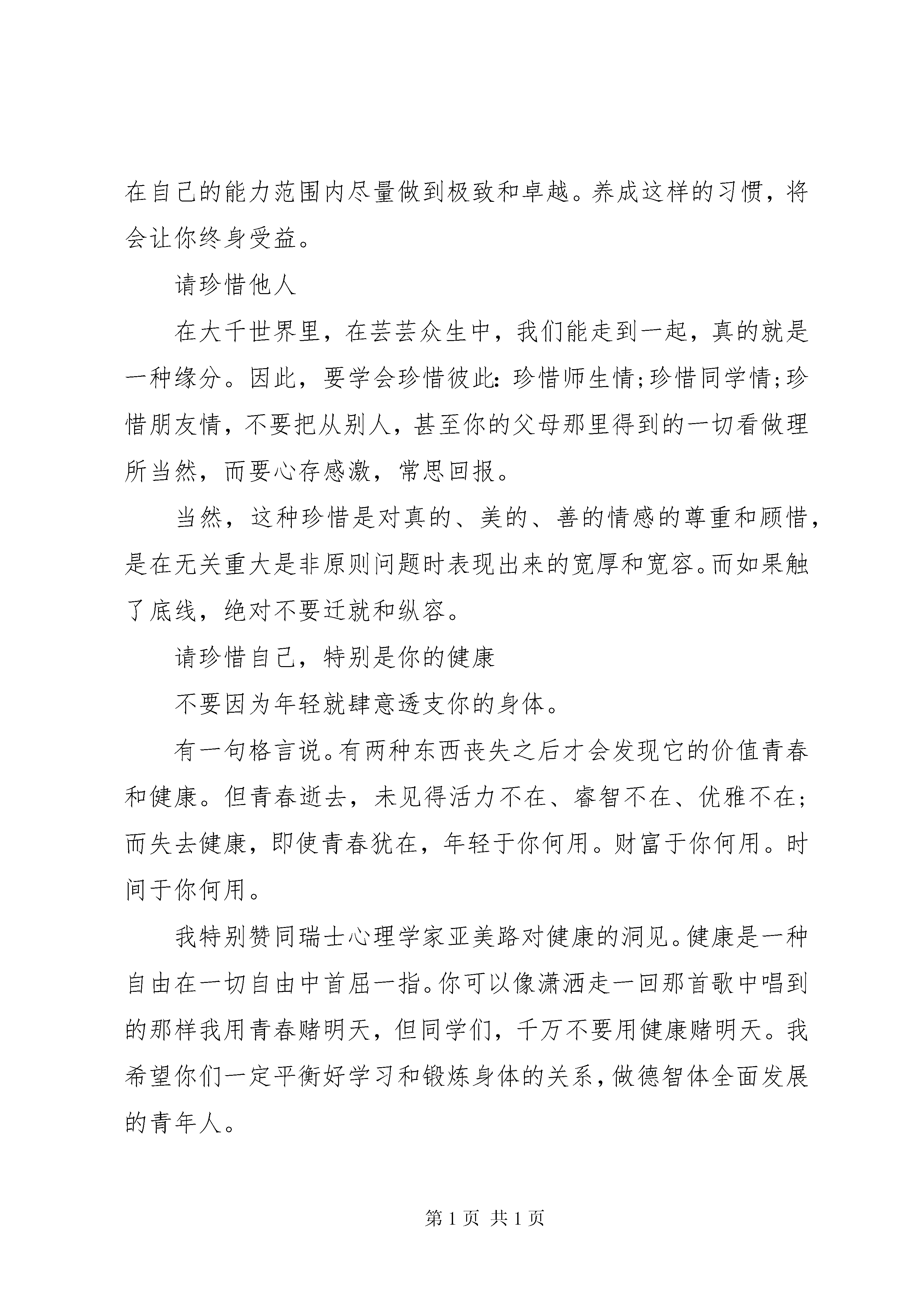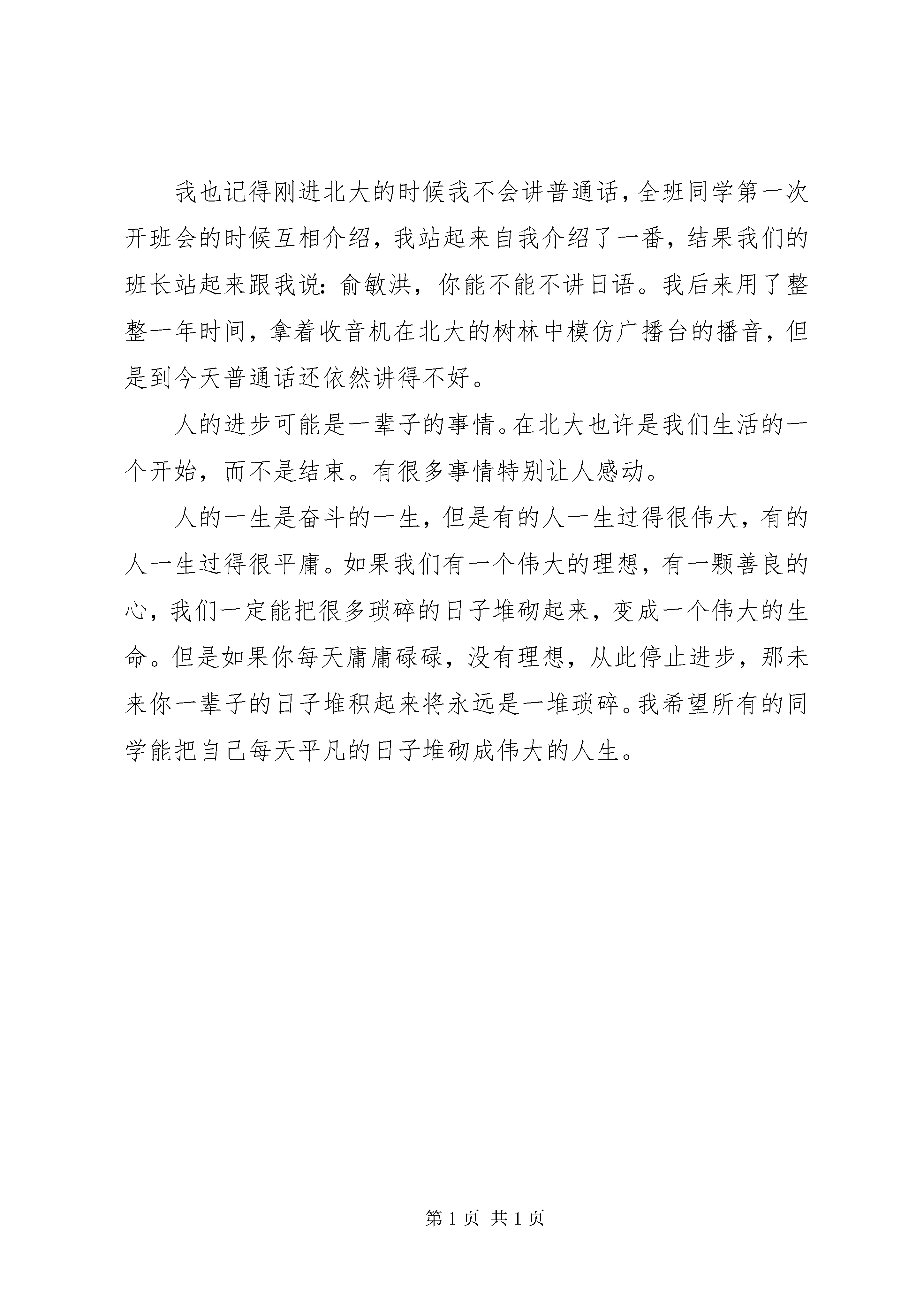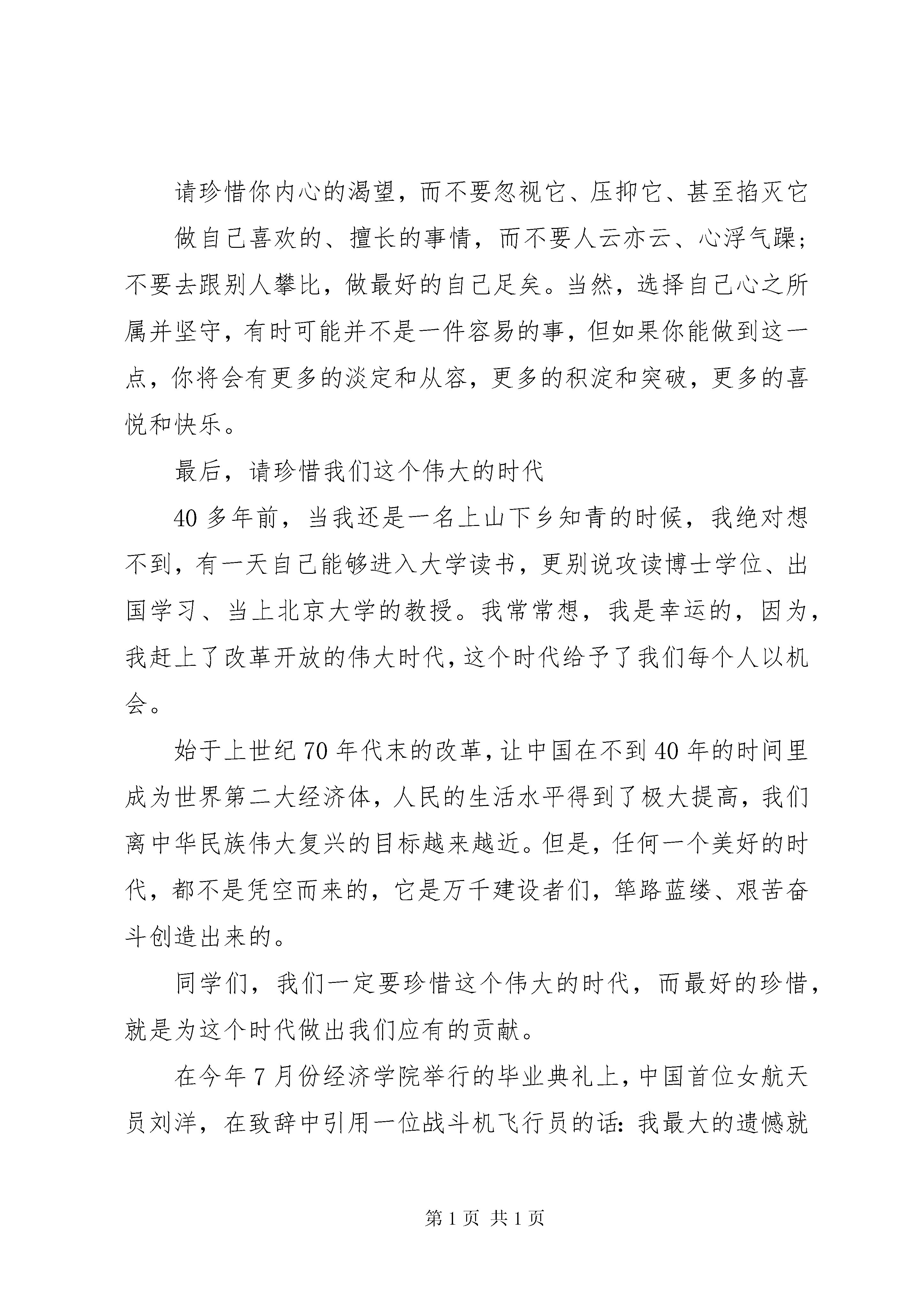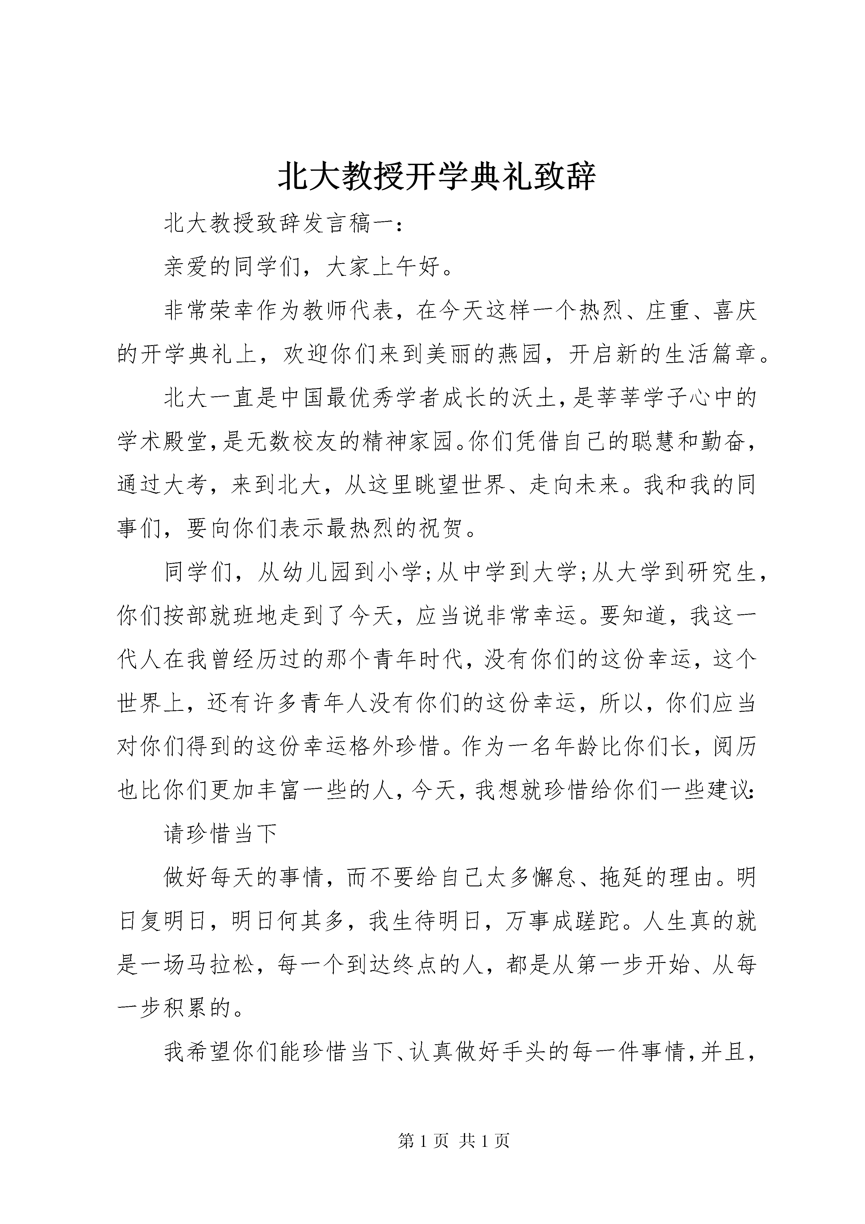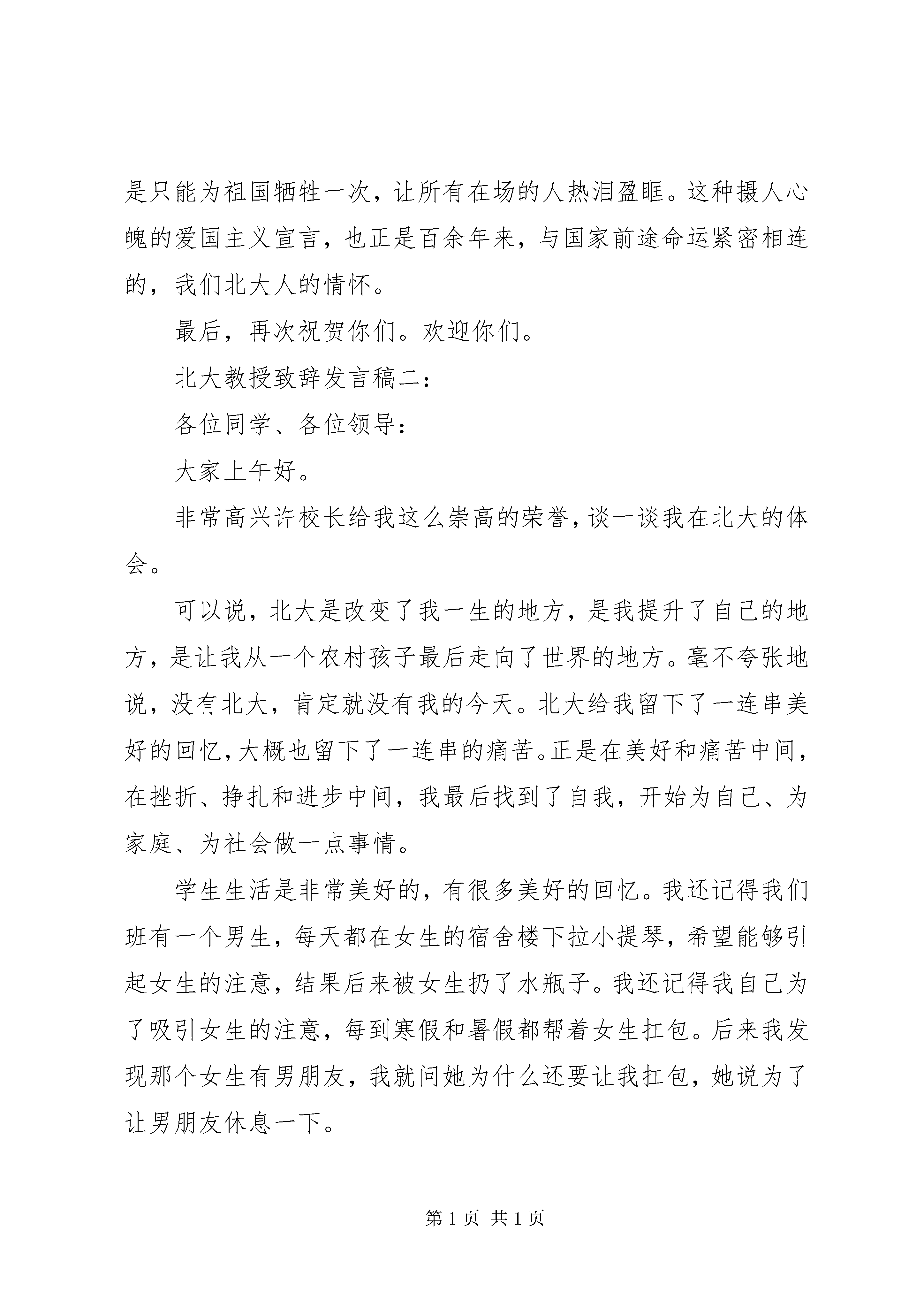 北大教授开学典礼致辞北大教授致辞发言稿一:亲爱的同学们,大家上午好。非常荣幸作为教师代表,在今天这样一个热烈、庄重、喜庆的开学典礼上,欢迎你们来到美丽的燕园,开启新的生活篇章。北大一直是中国最优秀学者成长的沃土,是莘莘学子心中的学术殿堂,是无数校友的精神家园。你们凭借自己的聪慧和勤奋,通过大考,来到北大,从这里眺望世界、走向未来。我和我的同事们,要向你们表示最热烈的祝贺。同学们,从幼儿园到小学;从中学到大学;从大学到研究生,你们按部就班地走到了今天,应当说非常幸运。要知道,我这一代人在我曾经历过的那个青年时代,没有你们的这份幸运,这个世界上,还有许多青年人没有你们的这份幸运,所以,你们应当对你们得到的这份幸运格外珍惜。作为一名年龄比你们长,阅历也比你们更加丰富一些的人,今天,我想就珍惜给你们一些建议:请珍惜当下做好每天的事情,而不要给自己太多懈怠、拖延的理由。明日复明日,明日何其多,我生待明日,万事成蹉跎。人生真的就是一场马拉松,每一个到达终点的人,都是从第一步开始、从每一步积累的。我希望你们能珍惜当下、认真做好手头的每一件事情,并且,在自己的能力范围内尽量做到极致和卓越。养成这样的习惯,将会让你终身受益。请珍惜他人在大千世界里,在芸芸众生中,我们能走到一起,真的就是一种缘分。因此,要学会珍惜彼此:珍惜师生情;珍惜同学情;珍惜朋友情,不要把从别人,甚至你的父母那里得到的一切看做理所当然,而要心存感激,常思回报。当然,这种珍惜是对真的、美的、善的情感的尊重和顾惜,是在无关重大是非原则问题时表现出来的宽厚和宽容。而如果触了底线,绝对不要迁就和纵容。请珍惜自己,特别是你的健康不要因为年轻就肆意透支你的身体。有一句格言说。有两种东西丧失之后才会发现它的价值青春和健康。但青春逝去,未见得活力不在、睿智不在、优雅不在;而失去健康,即使青春犹在,年轻于你何用。财富于你何用。时间于你何用。我特别赞同瑞士心理学家亚美路对健康的洞见。健康是一种自由在一切自由中首屈一指。你可以像潇洒走一回那首歌中唱到的那样我用青春赌明天,但同学们,千万不要用健康赌明天。我希望你们一定平衡好学习和锻炼身体的关系,做德智体全面发展的青年人。请珍惜你内心的渴望,而不要忽视它、压抑它、甚至掐灭它做自己喜欢的、擅长的事情,而不要人云亦云、心浮气躁;不要去跟别人攀比,做最好的自己足矣。当然,选择自己心之所属并坚守,有时可能并不是一件容易的事,但如果你能做到这一点,你将会有更多的淡定和从容,更多的积淀和突破,更多的喜悦和快乐。最后,请珍惜我们这个伟大的时代40多年前,当我还是一名上山下乡知青的时候,我绝对想不到,有一天自己能够进入大学读书,更别说攻读博士学位、出国学习、当上北京大学的教授。我常常想,我是幸运的,因为,我赶上了改革开放的伟大时代,这个时代给予了我们每个人以机会。始于上世纪70年代末的改革,让中国在不到40年的时间里成为世界第二大经济体,人民的生活水平得到了极大提高,我们离中华民族伟大复兴的目标越来越近。但是,任何一个美好的时代,都不是凭空而来的,它是万千建设者们,筚路蓝缕、艰苦奋斗创造出来的。同学们,我们一定要珍惜这个伟大的时代,而最好的珍惜,就是为这个时代做出我们应有的贡献。在今年7月份经济学院举行的毕业典礼上,中国首位女航天员刘洋,在致辞中引用一位战斗机飞行员的话:我最大的遗憾就是只能为祖国牺牲一次,让所有在场的人热泪盈眶。这种摄人心魄的爱国主义宣言,也正是百余年来,与国家前途命运紧密相连的,我们北大人的情怀。最后,再次祝贺你们。欢迎你们。北大教授致辞发言稿二:各位同学、各位领导:大家上午好。非常高兴许校长给我这么崇高的荣誉,谈一谈我在北大的体会。可以说,北大是改变了我一生的地方,是我提升了自己的地方,是让我从一个农村孩子最后走向了世界的地方。毫不夸张地说,没有北大,肯定就没有我的今天。北大给我留下了一连串美好的回忆,大概也留下了一连串的痛苦。正是在美好和痛苦中间,在挫折、挣扎和进步中间,我最后找到了自我,开始为自己、为家庭、为社会做一点事情。学生生活是非常美好的,有很多美好的回忆。我还记得我们班有一个男生,每天都在女生的宿舍楼下拉小提琴,希望能够引起女生的注意,结果后来被女生扔了水瓶子。我还记得我自己为了吸引女生的注意,每到寒假和暑假都帮着女生扛包。后来我发现那个女生有男朋友,我就问她为什么还要让我扛包,她说为了让男朋友休息一下。我也记得刚进北大的时候我不会讲普通话,全班同学第一次开班会的时候互相介绍,我站起来自我介绍了一番,结果我们的班长站起来跟我说:俞敏洪,你能不能不讲日语。我后来用了整整一年时间,拿着收音机在北大的树林中模仿广播台的播音,但是到今天普通话还依然讲得不好。人的进步可能是一辈子的事情。在北大也许是我们生活的一个开始