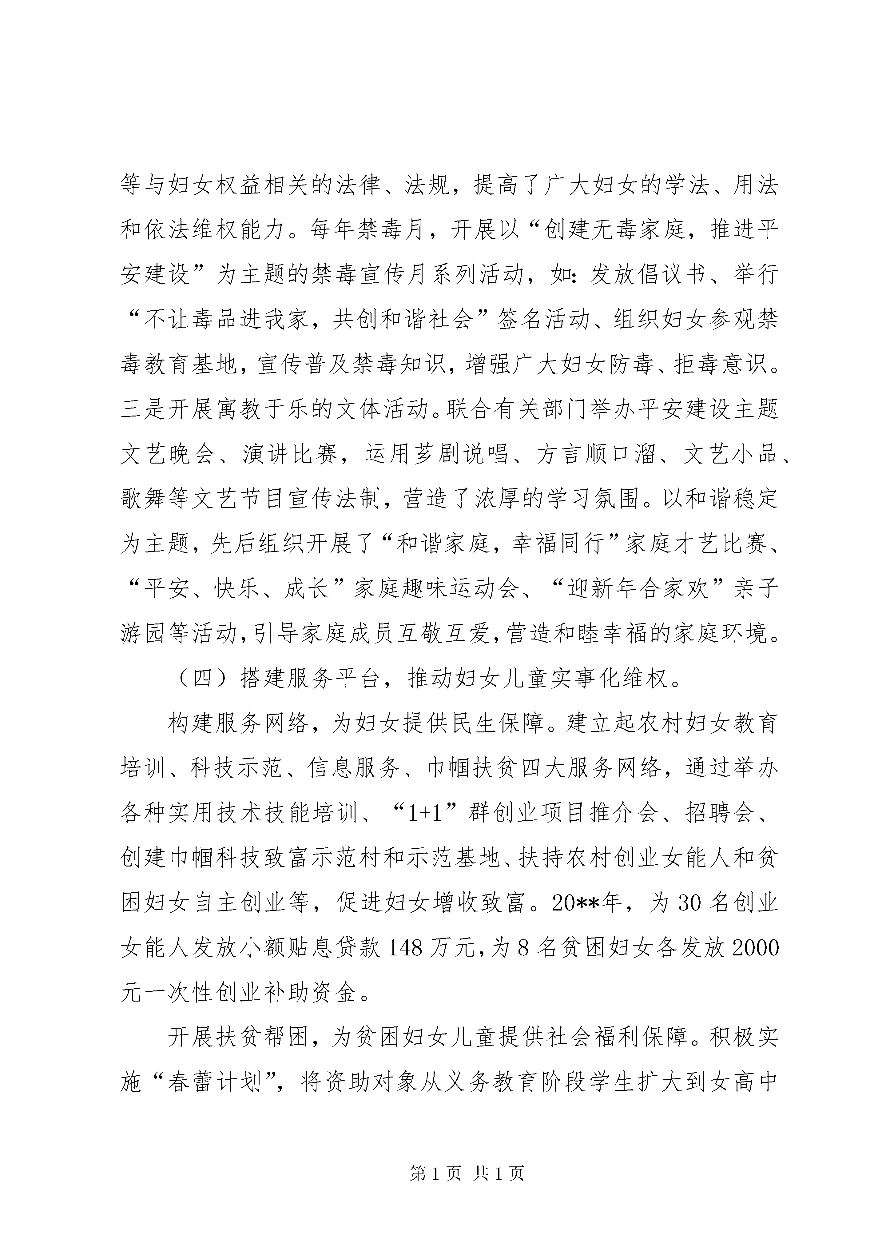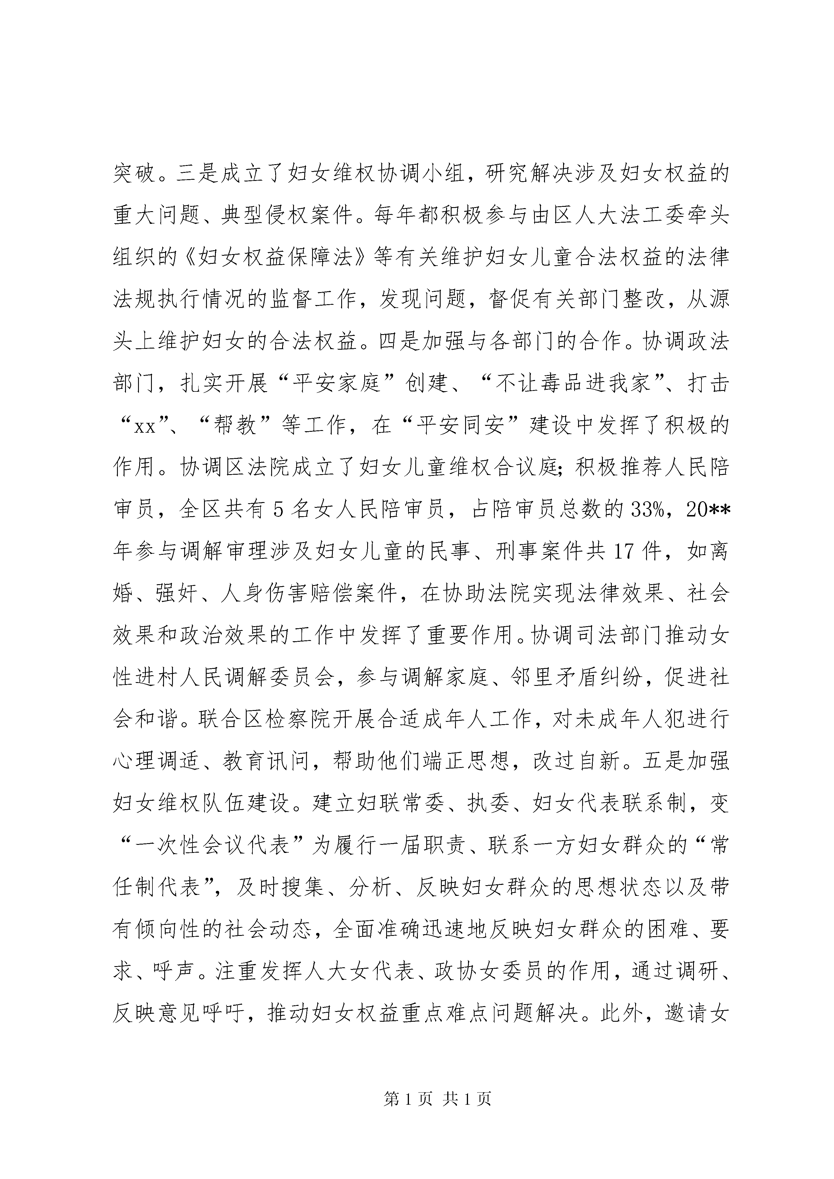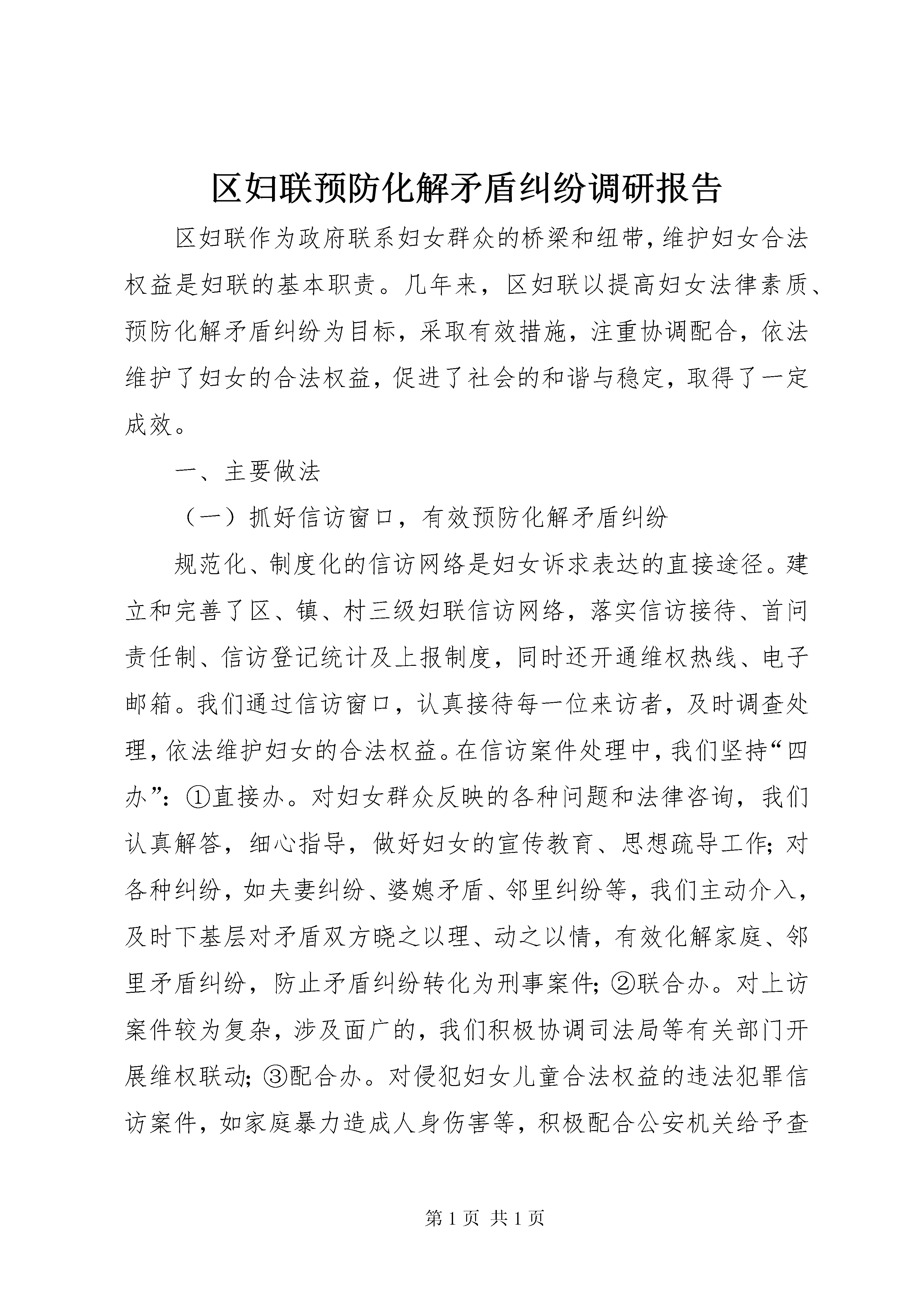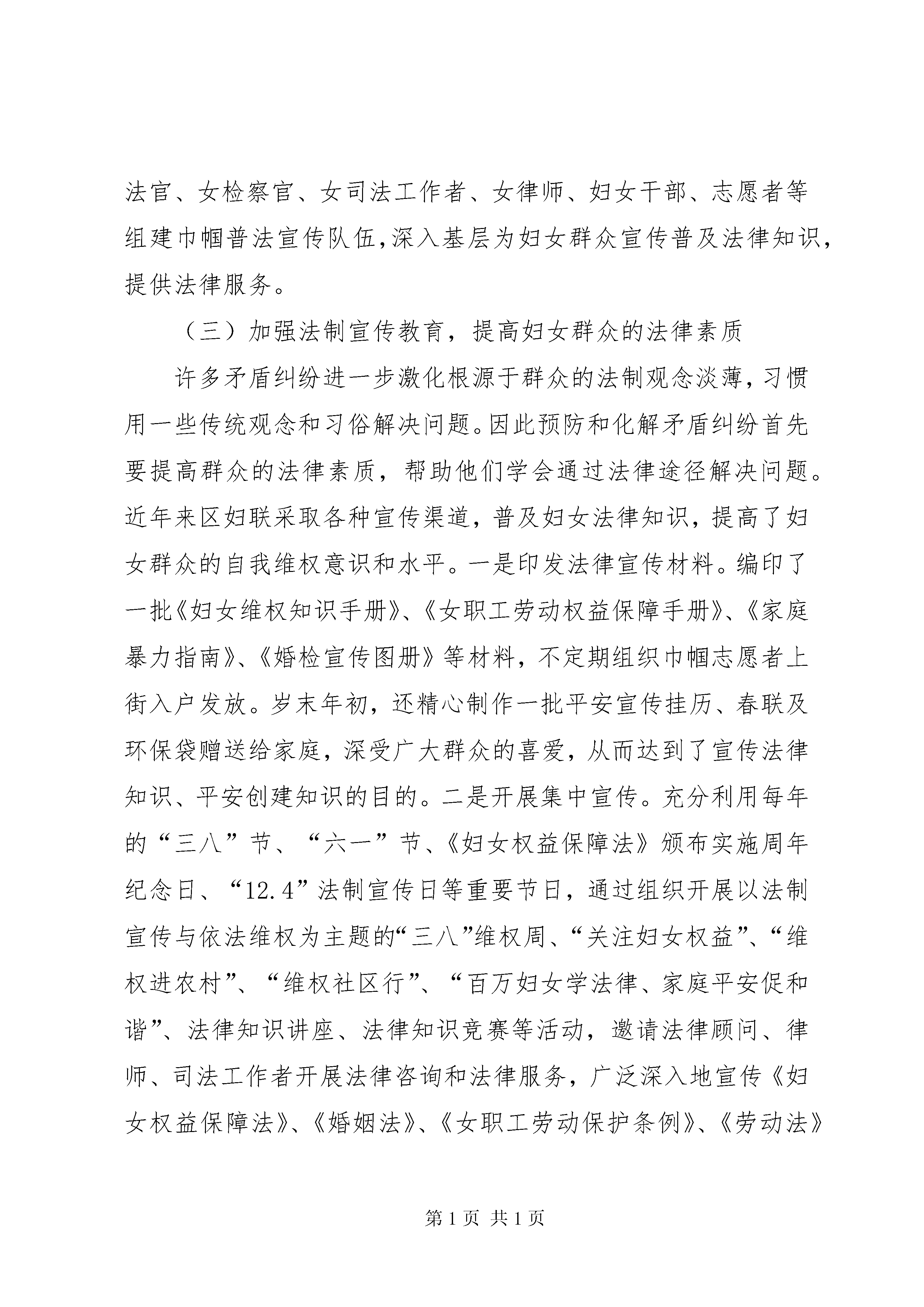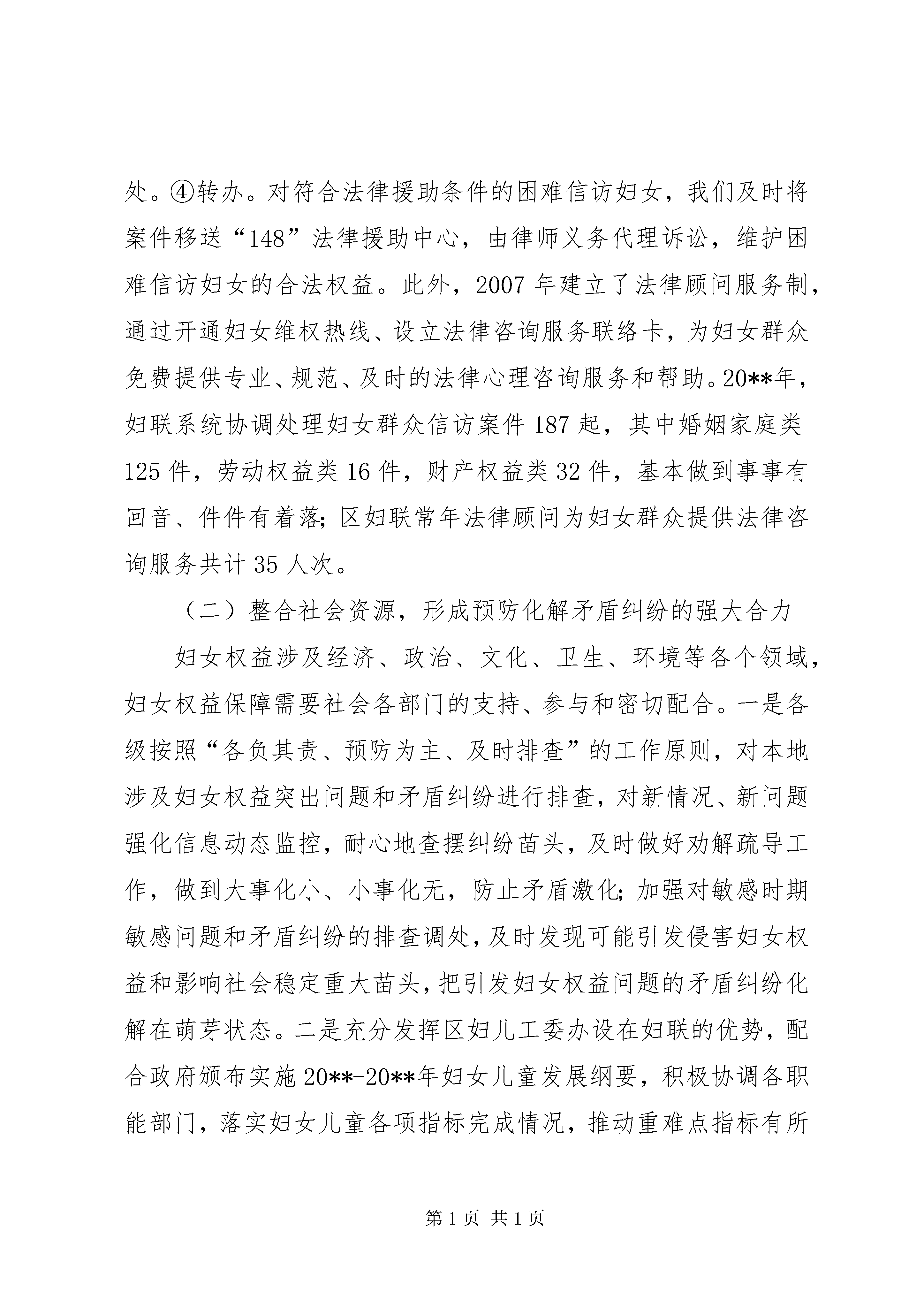 区妇联预防化解矛盾纠纷调研报告区妇联作为政府联系妇女群众的桥梁和纽带,维护妇女合法权益是妇联的基本职责。几年来,区妇联以提高妇女法律素质、预防化解矛盾纠纷为目标,采取有效措施,注重协调配合,依法维护了妇女的合法权益,促进了社会的和谐与稳定,取得了一定成效。一、主要做法(一)抓好信访窗口,有效预防化解矛盾纠纷规范化、制度化的信访网络是妇女诉求表达的直接途径。建立和完善了区、镇、村三级妇联信访网络,落实信访接待、首问责任制、信访登记统计及上报制度,同时还开通维权热线、电子邮箱。我们通过信访窗口,认真接待每一位来访者,及时调查处理,依法维护妇女的合法权益。在信访案件处理中,我们坚持“四办”:①直接办。对妇女群众反映的各种问题和法律咨询,我们认真解答,细心指导,做好妇女的宣传教育、思想疏导工作;对各种纠纷,如夫妻纠纷、婆媳矛盾、邻里纠纷等,我们主动介入,及时下基层对矛盾双方晓之以理、动之以情,有效化解家庭、邻里矛盾纠纷,防止矛盾纠纷转化为刑事案件;②联合办。对上访案件较为复杂,涉及面广的,我们积极协调司法局等有关部门开展维权联动;③配合办。对侵犯妇女儿童合法权益的违法犯罪信访案件,如家庭暴力造成人身伤害等,积极配合公安机关给予查处。④转办。对符合法律援助条件的困难信访妇女,我们及时将案件移送“148”法律援助中心,由律师义务代理诉讼,维护困难信访妇女的合法权益。此外,2007年建立了法律顾问服务制,通过开通妇女维权热线、设立法律咨询服务联络卡,为妇女群众免费提供专业、规范、及时的法律心理咨询服务和帮助。20**年,妇联系统协调处理妇女群众信访案件187起,其中婚姻家庭类125件,劳动权益类16件,财产权益类32件,基本做到事事有回音、件件有着落;区妇联常年法律顾问为妇女群众提供法律咨询服务共计35人次。(二)整合社会资源,形成预防化解矛盾纠纷的强大合力妇女权益涉及经济、政治、文化、卫生、环境等各个领域,妇女权益保障需要社会各部门的支持、参与和密切配合。一是各级按照“各负其责、预防为主、及时排查”的工作原则,对本地涉及妇女权益突出问题和矛盾纠纷进行排查,对新情况、新问题强化信息动态监控,耐心地查摆纠纷苗头,及时做好劝解疏导工作,做到大事化小、小事化无,防止矛盾激化;加强对敏感时期敏感问题和矛盾纠纷的排查调处,及时发现可能引发侵害妇女权益和影响社会稳定重大苗头,把引发妇女权益问题的矛盾纠纷化解在萌芽状态。二是充分发挥区妇儿工委办设在妇联的优势,配合政府颁布实施20**-20**年妇女儿童发展纲要,积极协调各职能部门,落实妇女儿童各项指标完成情况,推动重难点指标有所突破。三是成立了妇女维权协调小组,研究解决涉及妇女权益的重大问题、典型侵权案件。每年都积极参与由区人大法工委牵头组织的《妇女权益保障法》等有关维护妇女儿童合法权益的法律法规执行情况的监督工作,发现问题,督促有关部门整改,从源头上维护妇女的合法权益。四是加强与各部门的合作。协调政法部门,扎实开展“平安家庭”创建、“不让毒品进我家”、打击“xx”、“帮教”等工作,在“平安同安”建设中发挥了积极的作用。协调区法院成立了妇女儿童维权合议庭;积极推荐人民陪审员,全区共有5名女人民陪审员,占陪审员总数的33%,20**年参与调解审理涉及妇女儿童的民事、刑事案件共17件,如离婚、强奸、人身伤害赔偿案件,在协助法院实现法律效果、社会效果和政治效果的工作中发挥了重要作用。协调司法部门推动女性进村人民调解委员会,参与调解家庭、邻里矛盾纠纷,促进社会和谐。联合区检察院开展合适成年人工作,对未成年人犯进行心理调适、教育讯问,帮助他们端正思想,改过自新。五是加强妇女维权队伍建设。建立妇联常委、执委、妇女代表联系制,变“一次性会议代表”为履行一届职责、联系一方妇女群众的“常任制代表”,及时搜集、分析、反映妇女群众的思想状态以及带有倾向性的社会动态,全面准确迅速地反映妇女群众的困难、要求、呼声。注重发挥人大女代表、政协女委员的作用,通过调研、反映意见呼吁,推动妇女权益重点难点问题解决。此外,邀请女法官、女检察官、女司法工作者、女律师、妇女干部、志愿者等组建巾帼普法宣传队伍,深入基层为妇女群众宣传普及法律知识,提供法律服务。(三)加强法制宣传教育,提高妇女群众的法律素质许多矛盾纠纷进一步激化根源于群众的法制观念淡薄,习惯用一些传统观念和习俗解决问题。因此预防和化解矛盾纠纷首先要提高群众的法律素质,帮助他们学会通过法律途径解决问题。近年来区妇联采取各种宣传渠道,普及妇女法律知识,提高了妇女群众的自我维权意识和水平。一是印发法律宣传材料。编印了一批《妇女维权知识手册》、《女职工劳动权益保障手册》、《家庭暴力指南》、《婚检宣传图册》等材料,不定期组织巾帼志愿者上街入户发放。岁末年初,还精心制