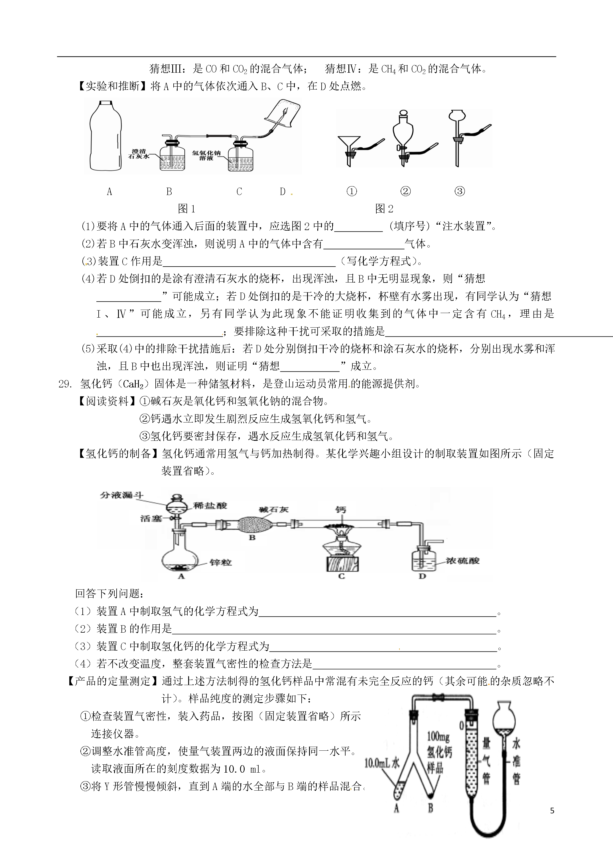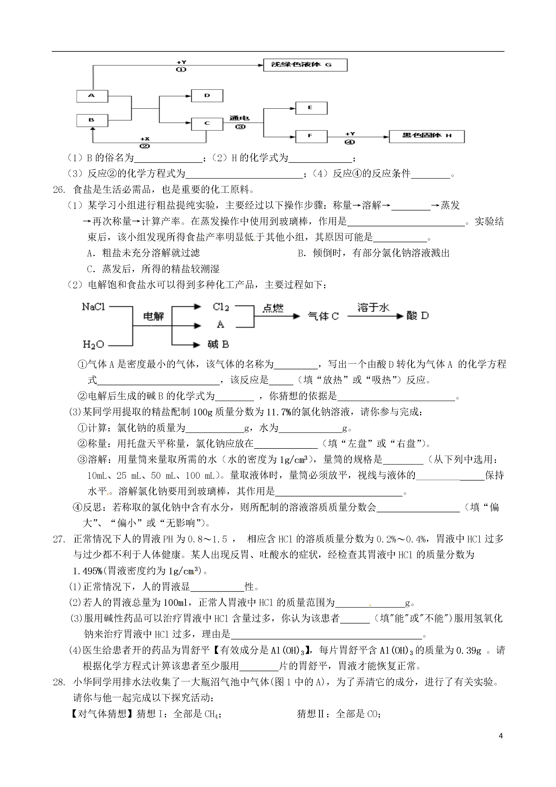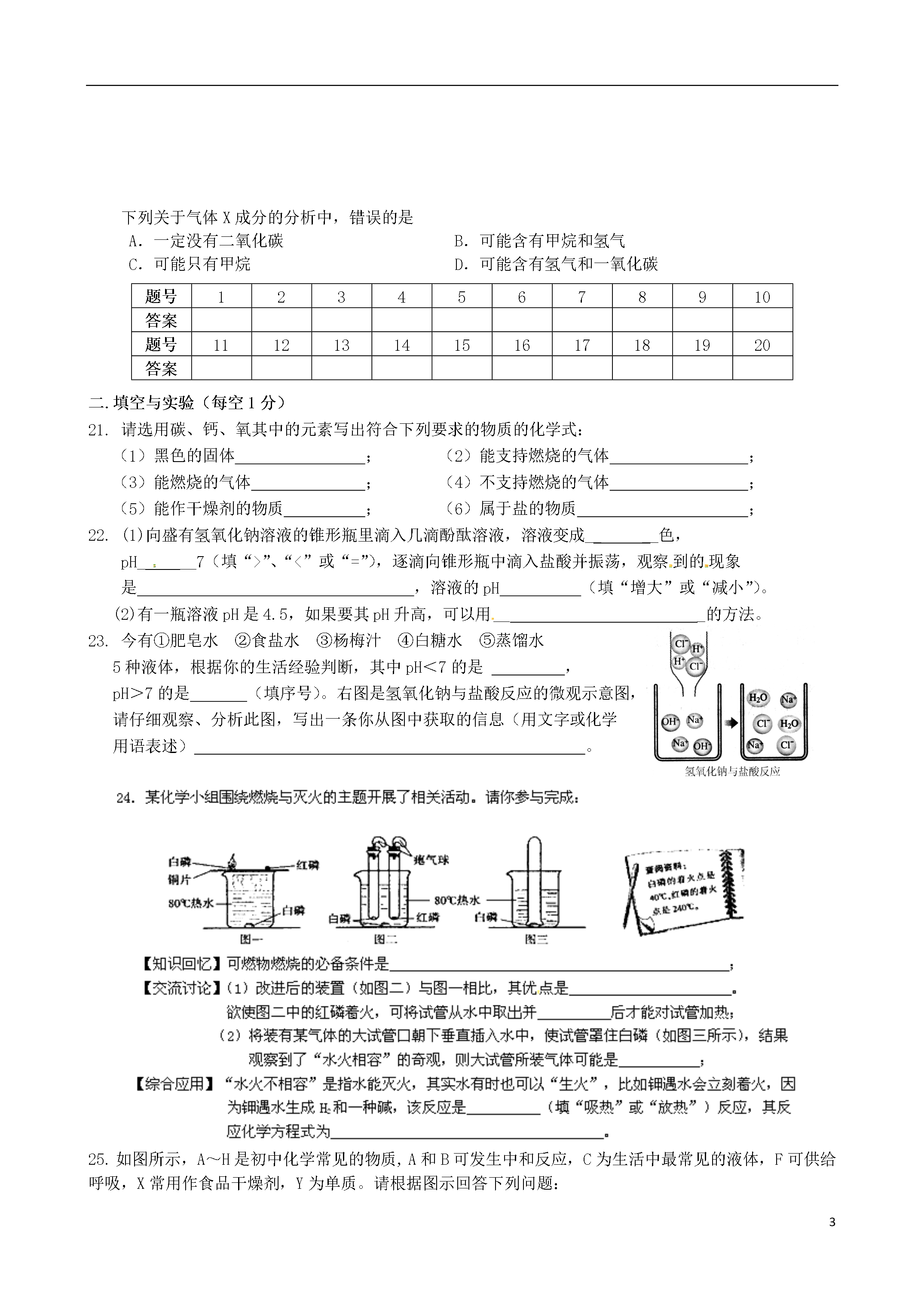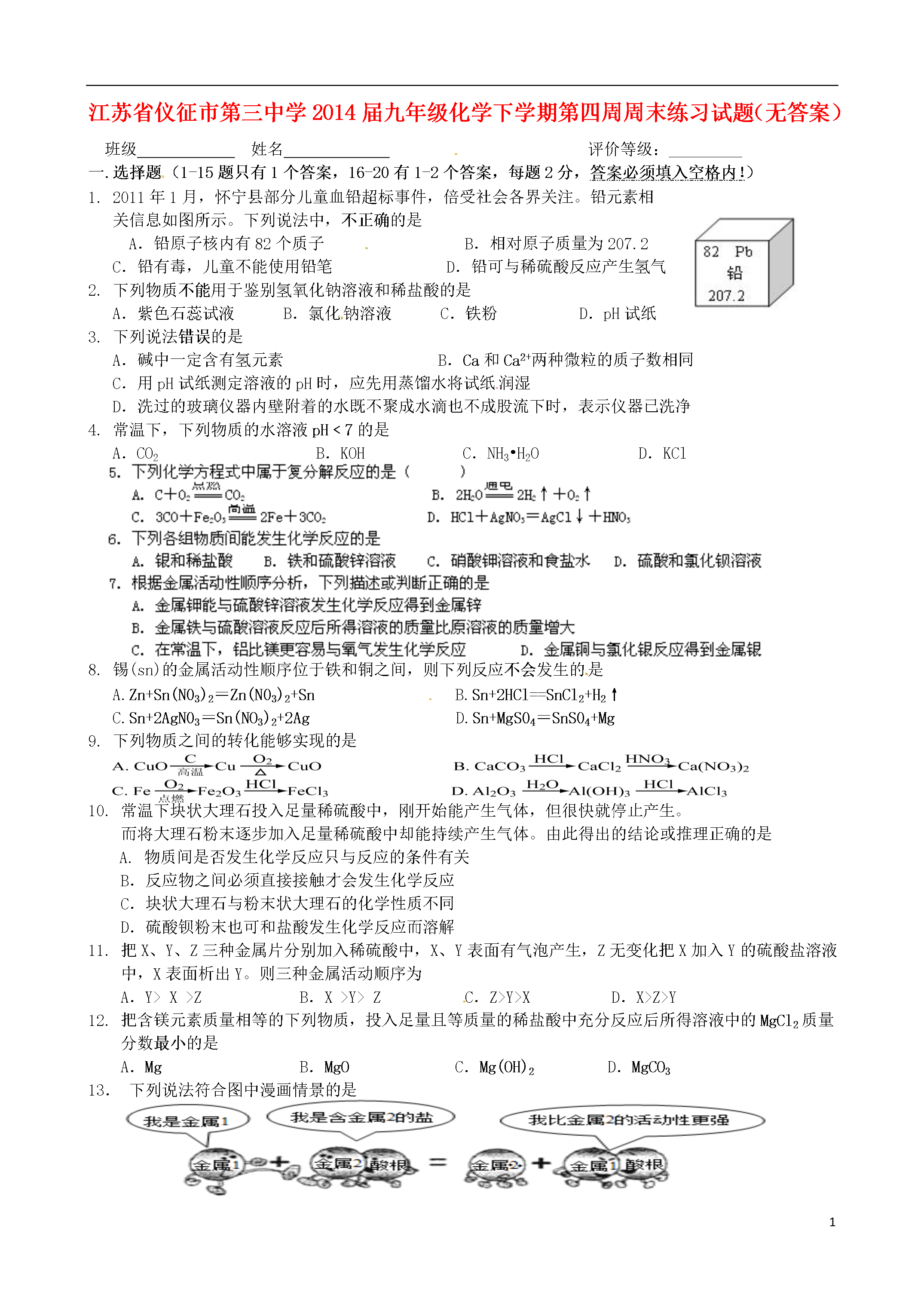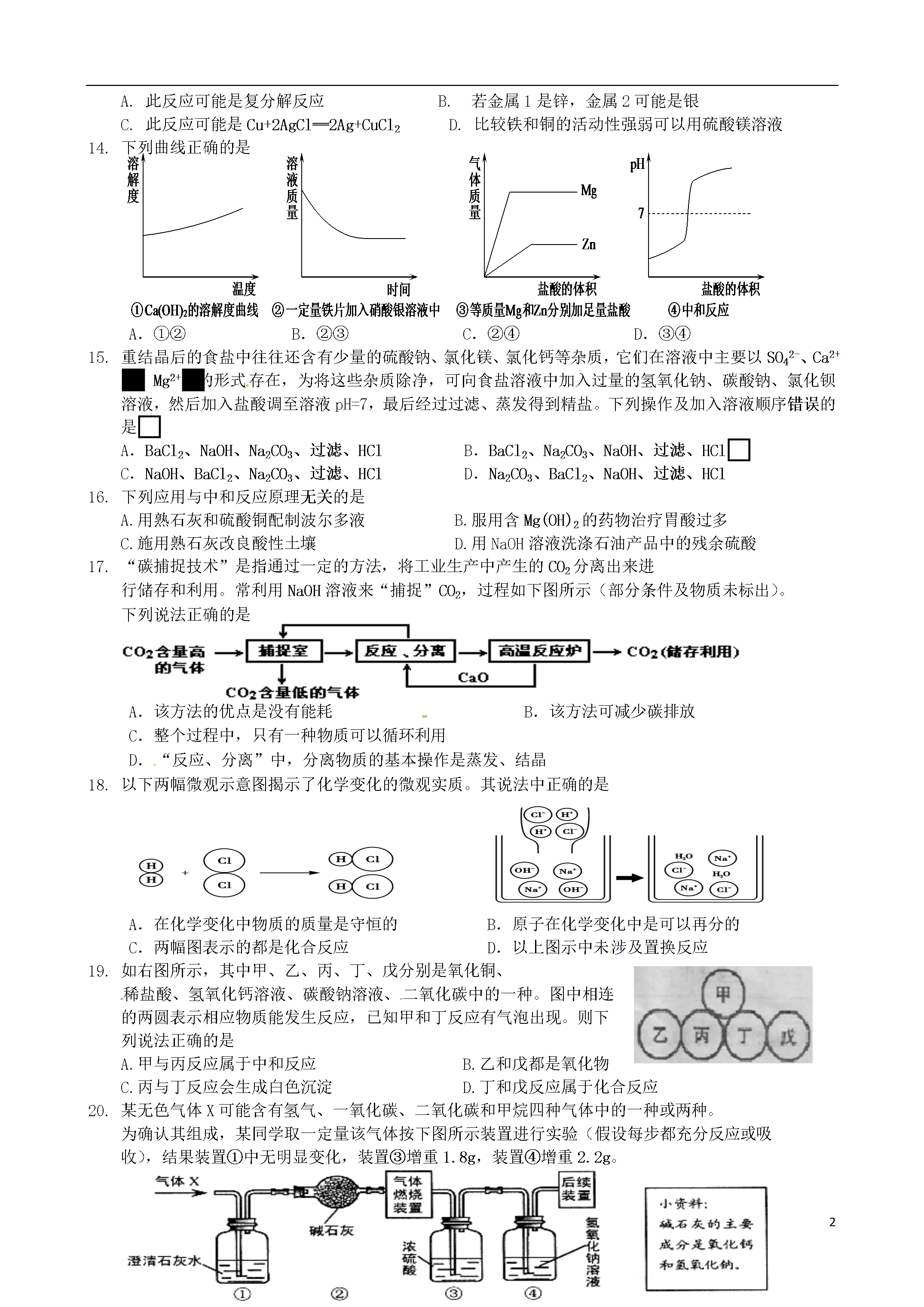 6江苏省仪征市第三中学2014届九年级化学下学期第四周周末练习试题(无答案)班级姓名评价等级:_________一.选择题(1-15题只有1个答案,16-20有1-2个答案,每题2分,答案必须填入空格内!)1.2011年1月,怀宁县部分儿童血铅超标事件,倍受社会各界关注。铅元素相关信息如图所示。下列说法中,不正确的是A.铅原子核内有82个质子B.相对原子质量为207.2C.铅有毒,儿童不能使用铅笔D.铅可与稀硫酸反应产生氢气2.下列物质不能用于鉴别氢氧化钠溶液和稀盐酸的是A.紫色石蕊试液B.氯化钠溶液C.铁粉D.pH试纸3.下列说法错误的是A.碱中一定含有氢元素B.Ca和Ca2+两种微粒的质子数相同C.用pH试纸测定溶液的pH时,应先用蒸馏水将试纸润湿D.洗过的玻璃仪器内壁附着的水既不聚成水滴也不成股流下时,表示仪器已洗净4.常温下,下列物质的水溶液pH﹤7的是A.CO2B.KOHC.NH3•H2OD.KCl8.锡(sn)的金属活动性顺序位于铁和铜之间,则下列反应不会发生的是A.Zn+Sn(N03)2=Zn(N03)2+SnB.Sn+2HCl==SnCl2+H2↑C.Sn+2AgN03=Sn(NO3)2+2AgD.Sn+MgS04=SnS04+Mg9.下列物质之间的转化能够实现的是10.常温下块状大理石投入足量稀硫酸中,刚开始能产生气体,但很快就停止产生。而将大理石粉末逐步加入足量稀硫酸中却能持续产生气体。由此得出的结论或推理正确的是A.物质间是否发生化学反应只与反应的条件有关B.反应物之间必须直接接触才会发生化学反应C.块状大理石与粉末状大理石的化学性质不同D.硫酸钡粉末也可和盐酸发生化学反应而溶解11.把X、Y、Z三种金属片分别加入稀硫酸中,X、Y表面有气泡产生,Z无变化把X加入Y的硫酸盐溶液中,X表面析出Y。则三种金属活动顺序为A.Y>X>ZB.X>Y>ZC.Z>Y>XD.X>Z>Y12.把含镁元素质量相等的下列物质,投入足量且等质量的稀盐酸中充分反应后所得溶液中的MgCl2质量分数最小的是A.MgB.MgOC.Mg(OH)2D.MgCO313.下列说法符合图中漫画情景的是A.此反应可能是复分解反应B.若金属1是锌,金属2可能是银C.此反应可能是Cu+2AgCl═2Ag+CuCl2D.比较铁和铜的活动性强弱可以用硫酸镁溶液14.下列曲线正确的是A.①②B.②③C.②④D.③④15.重结晶后的食盐中往往还含有少量的硫酸钠、氯化镁、氯化钙等杂质,它们在溶液中主要以SO42-、Ca2+、Mg2+的形式存在,为将这些杂质除净,可向食盐溶液中加入过量的氢氧化钠、碳酸钠、氯化钡溶液,然后加入盐酸调至溶液pH=7,最后经过过滤、蒸发得到精盐。下列操作及加入溶液顺序错误的是A.BaCl2、NaOH、Na2CO3、过滤、HClB.BaCl2、Na2CO3、NaOH、过滤、HClC.NaOH、BaCl2、Na2CO3、过滤、HClD.Na2CO3、BaCl2、NaOH、过滤、HCl16.下列应用与中和反应原理无关的是A.用熟石灰和硫酸铜配制波尔多液B.服用含Mg(OH)2的药物治疗胃酸过多C.施用熟石灰改良酸性土壤D.用NaOH溶液洗涤石油产品中的残余硫酸17.“碳捕捉技术”是指通过一定的方法,将工业生产中产生的CO2分离出来进行储存和利用。常利用NaOH溶液来“捕捉”CO2,过程如下图所示(部分条件及物质未标出)。下列说法正确的是A.该方法的优点是没有能耗B.该方法可减少碳排放C.整个过程中,只有一种物质可以循环利用D.“反应、分离”中,分离物质的基本操作是蒸发、结晶18.以下两幅微观示意图揭示了化学变化的微观实质。其说法中正确的是A.在化学变化中物质的质量是守恒的B.原子在化学变化中是可以再分的C.两幅图表示的都是化合反应D.以上图示中未涉及置换反应19.如右图所示,其中甲、乙、丙、丁、戊分别是氧化铜、稀盐酸、氢氧化钙溶液、碳酸钠溶液、二氧化碳中的一种。图中相连的两圆表示相应物质能发生反应,已知甲和丁反应有气泡出现。则下列说法正确的是A.甲与丙反应属于中和反应B.乙和戊都是氧化物C.丙与丁反应会生成白色沉淀D.丁和戊反应属于化合反应20.某无色气体X可能含有氢气、一氧化碳、二氧化碳和甲烷四种气体中的一种或两种。为确认其组成,某同学取一定量该气体按下图所示装置进行实验(假设每步都充分反应或吸收),结果装置①中无明显变化,装置③增重1.8g,装置④增重2.2g。下列关于气体X成分的分析中,错误的是A.一定没有二氧化碳B.可能含有甲烷和氢气C.可能只有甲烷D.可能含有氢气和一氧化碳题号12345678910答案题号11121314151617181920答案二.填空与实验(每空1分)21.请选用碳、钙、氧其中的元素写出符合下列要求的物