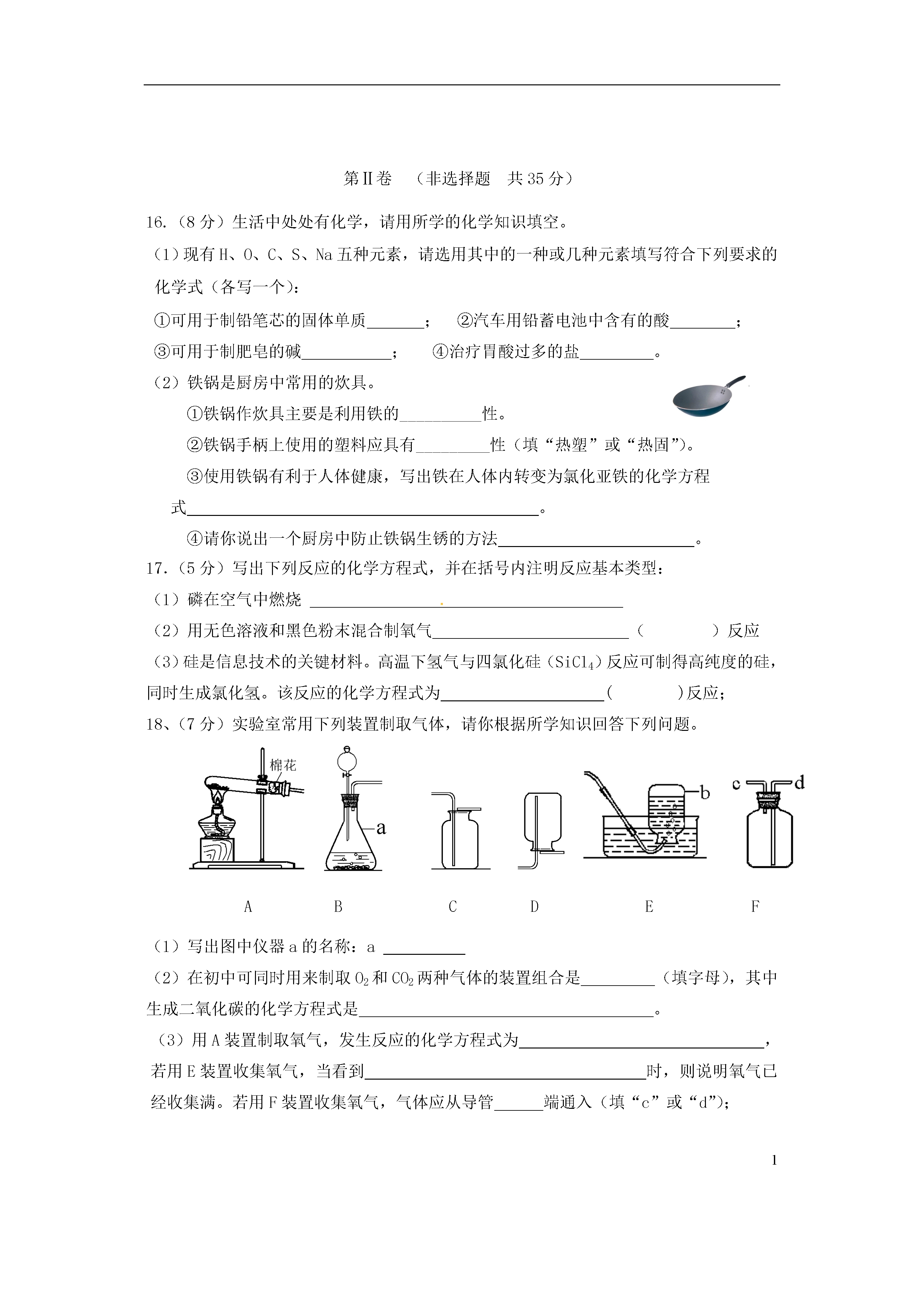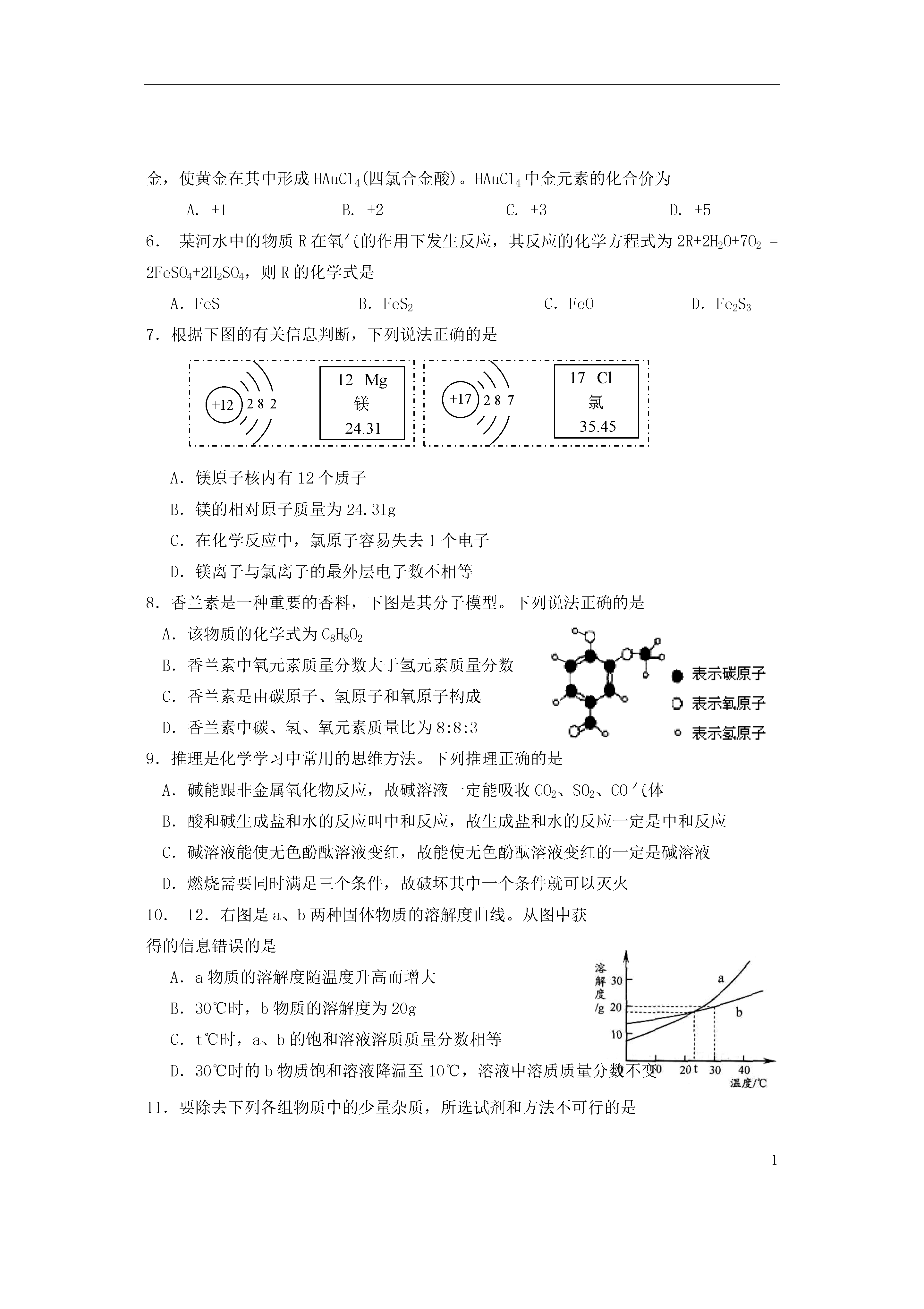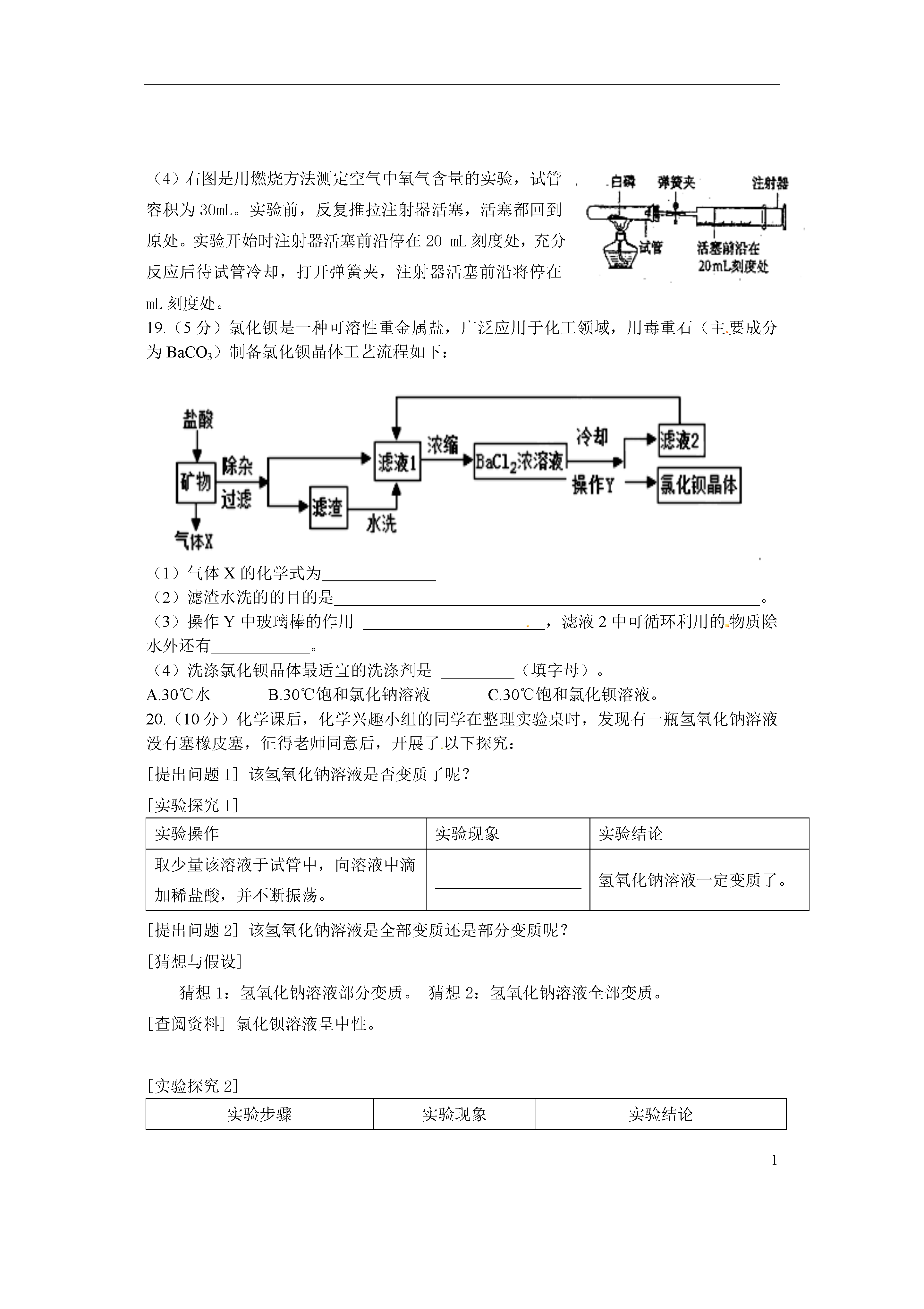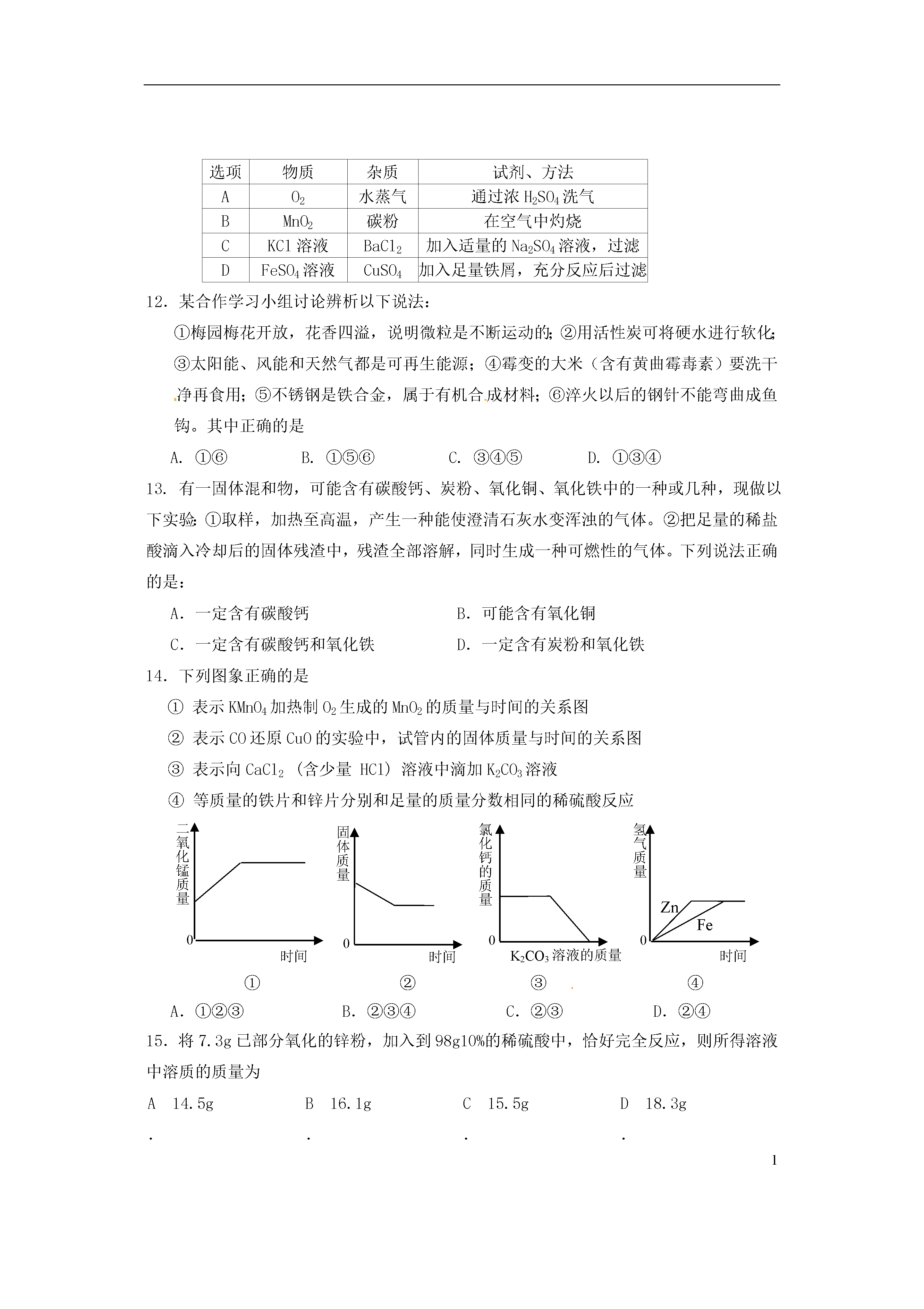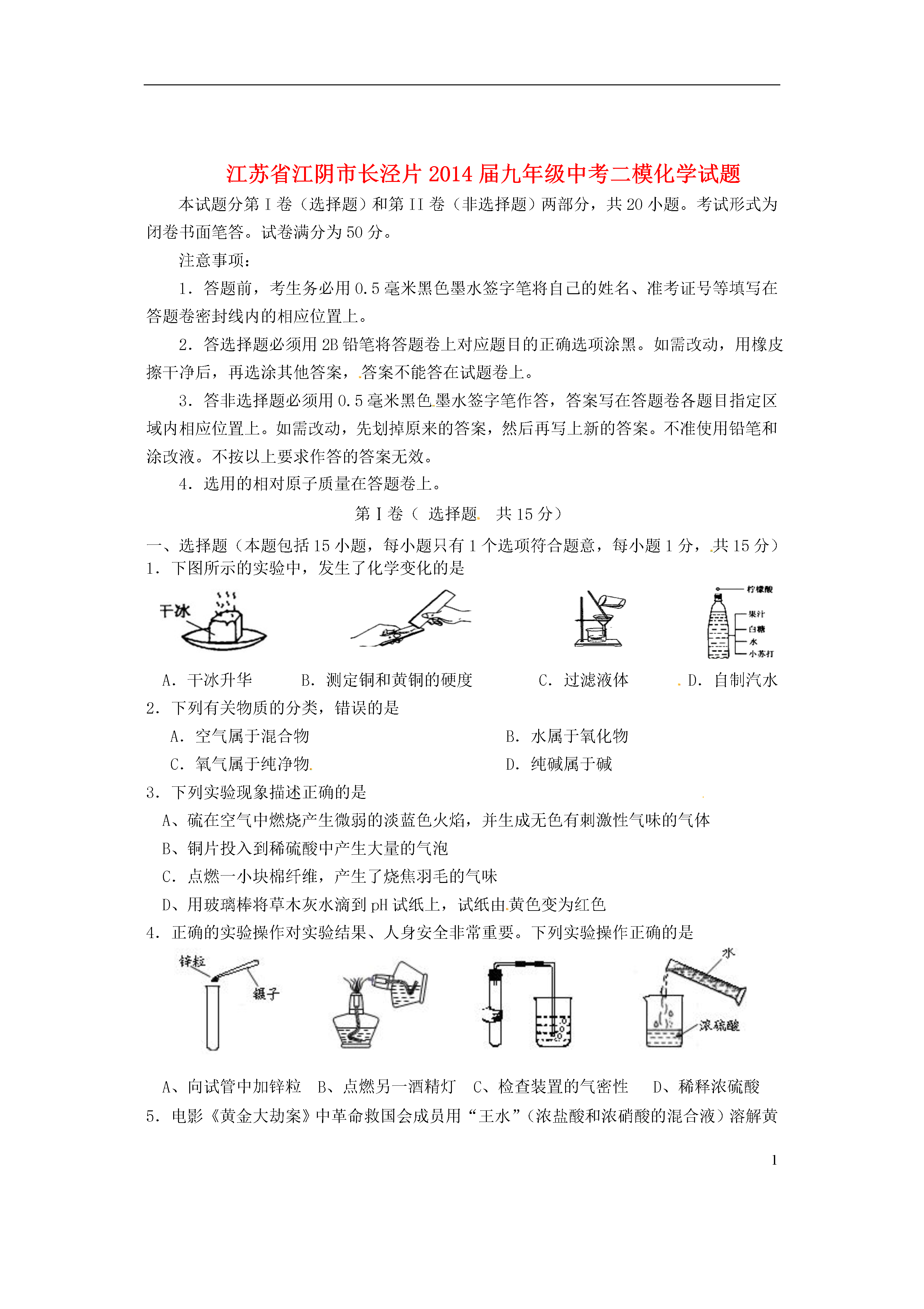1江苏省江阴市长泾片2014届九年级中考二模化学试题本试题分第I卷(选择题)和第II卷(非选择题)两部分,共20小题。考试形式为闭卷书面笔答。试卷满分为50分。注意事项:1.答题前,考生务必用0.5毫米黑色墨水签字笔将自己的姓名、准考证号等填写在答题卷密封线内的相应位置上。2.答选择题必须用2B铅笔将答题卷上对应题目的正确选项涂黑。如需改动,用橡皮擦干净后,再选涂其他答案,答案不能答在试题卷上。3.答非选择题必须用0.5毫米黑色墨水签字笔作答,答案写在答题卷各题目指定区域内相应位置上。如需改动,先划掉原来的答案,然后再写上新的答案。不准使用铅笔和涂改液。不按以上要求作答的答案无效。4.选用的相对原子质量在答题卷上。第Ⅰ卷(选择题共15分)一、选择题(本题包括15小题,每小题只有1个选项符合题意,每小题1分,共15分)1.下图所示的实验中,发生了化学变化的是A.干冰升华B.测定铜和黄铜的硬度C.过滤液体D.自制汽水2.下列有关物质的分类,错误的是A.空气属于混合物B.水属于氧化物C.氧气属于纯净物D.纯碱属于碱3.下列实验现象描述正确的是A、硫在空气中燃烧产生微弱的淡蓝色火焰,并生成无色有刺激性气味的气体B、铜片投入到稀硫酸中产生大量的气泡C.点燃一小块棉纤维,产生了烧焦羽毛的气味D、用玻璃棒将草木灰水滴到pH试纸上,试纸由黄色变为红色4.正确的实验操作对实验结果、人身安全非常重要。下列实验操作正确的是A、向试管中加锌粒B、点燃另一酒精灯C、检查装置的气密性D、稀释浓硫酸5.电影《黄金大劫案》中革命救国会成员用“王水”(浓盐酸和浓硝酸的混合液)溶解黄金,使黄金在其中形成HAuCl4(四氯合金酸)。HAuCl4中金元素的化合价为A.+1B.+2C.+3D.+56.某河水中的物质R在氧气的作用下发生反应,其反应的化学方程式为2R+2H2O+7O2=2FeSO4+2H2SO4,则R的化学式是A.FeSB.FeS2C.FeOD.Fe2S37.根据下图的有关信息判断,下列说法正确的是282+12287+17Cl氯35.45Mg镁24.31A.镁原子核内有12个质子B.镁的相对原子质量为24.31gC.在化学反应中,氯原子容易失去1个电子D.镁离子与氯离子的最外层电子数不相等8.香兰素是一种重要的香料,下图是其分子模型。下列说法正确的是A.该物质的化学式为C8H8O2B.香兰素中氧元素质量分数大于氢元素质量分数C.香兰素是由碳原子、氢原子和氧原子构成D.香兰素中碳、氢、氧元素质量比为8:8:39.推理是化学学习中常用的思维方法。下列推理正确的是A.碱能跟非金属氧化物反应,故碱溶液一定能吸收CO2、SO2、CO气体B.酸和碱生成盐和水的反应叫中和反应,故生成盐和水的反应一定是中和反应C.碱溶液能使无色酚酞溶液变红,故能使无色酚酞溶液变红的一定是碱溶液D.燃烧需要同时满足三个条件,故破坏其中一个条件就可以灭火10.12.右图是a、b两种固体物质的溶解度曲线。从图中获得的信息错误的是A.a物质的溶解度随温度升高而增大B.30℃时,b物质的溶解度为20gC.t℃时,a、b的饱和溶液溶质质量分数相等D.30℃时的b物质饱和溶液降温至10℃,溶液中溶质质量分数不变11.要除去下列各组物质中的少量杂质,所选试剂和方法不可行的是选项物质杂质试剂、方法AO2水蒸气通过浓H2SO4洗气BMnO2碳粉在空气中灼烧CKCl溶液BaCl2加入适量的Na2SO4溶液,过滤DFeSO4溶液CuSO4加入足量铁屑,充分反应后过滤12.某合作学习小组讨论辨析以下说法:①梅园梅花开放,花香四溢,说明微粒是不断运动的;②用活性炭可将硬水进行软化;③太阳能、风能和天然气都是可再生能源;④霉变的大米(含有黄曲霉毒素)要洗干净再食用;⑤不锈钢是铁合金,属于有机合成材料;⑥淬火以后的钢针不能弯曲成鱼钩。其中正确的是A.①⑥B.①⑤⑥C.③④⑤D.①③④13.有一固体混和物,可能含有碳酸钙、炭粉、氧化铜、氧化铁中的一种或几种,现做以下实验:①取样,加热至高温,产生一种能使澄清石灰水变浑浊的气体。②把足量的稀盐酸滴入冷却后的固体残渣中,残渣全部溶解,同时生成一种可燃性的气体。下列说法正确的是:A.一定含有碳酸钙B.可能含有氧化铜C.一定含有碳酸钙和氧化铁D.一定含有炭粉和氧化铁14.下列图象正确的是①表示KMnO4加热制O2生成的MnO2的质量与时间的关系图②表示CO还原CuO的实验中,试管内的固体质量与时间的关系图③表示向CaCl2(含少量HCl)溶液中滴加K2CO3溶液④等质量的铁片和锌片分别和足量的质量分数