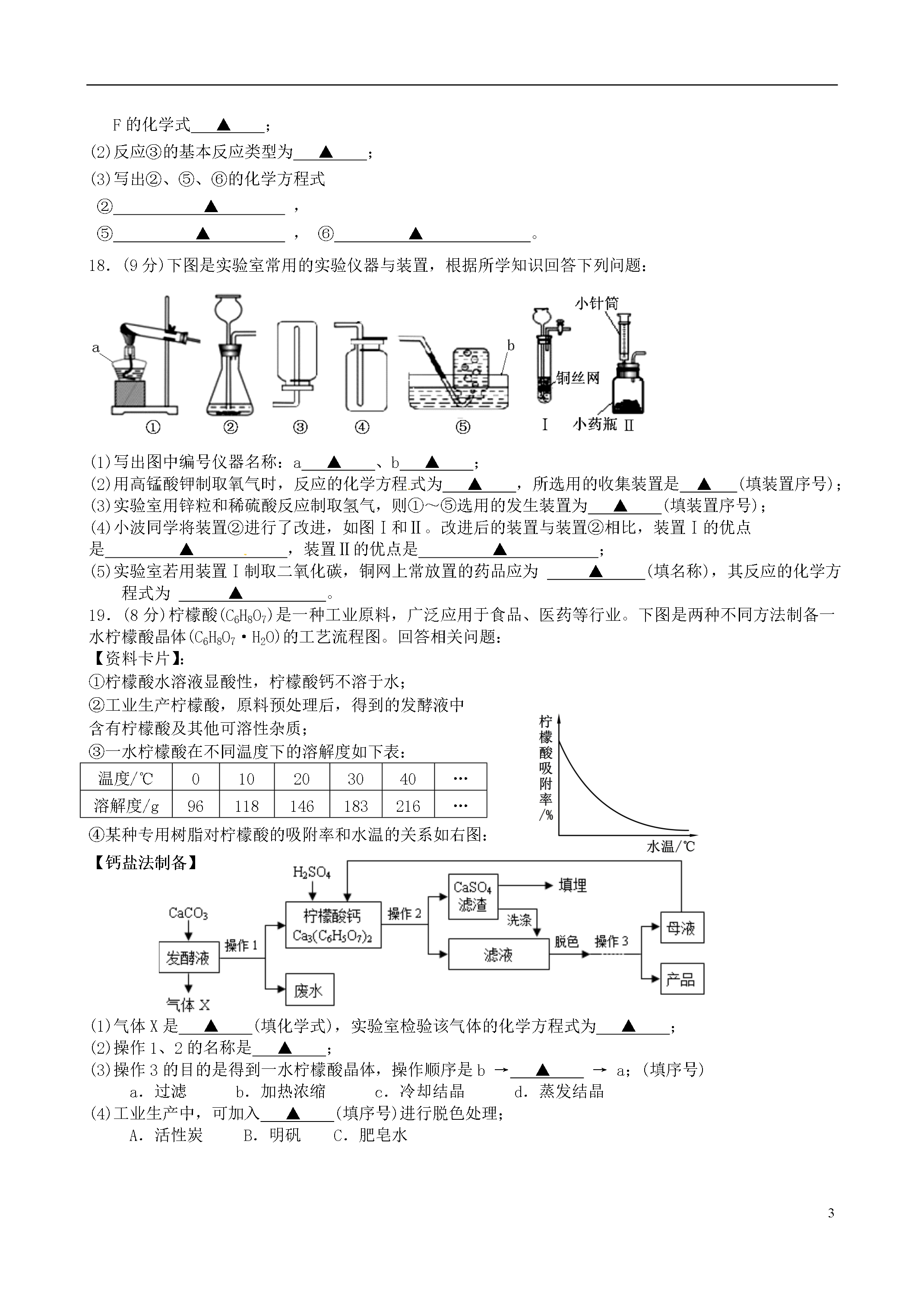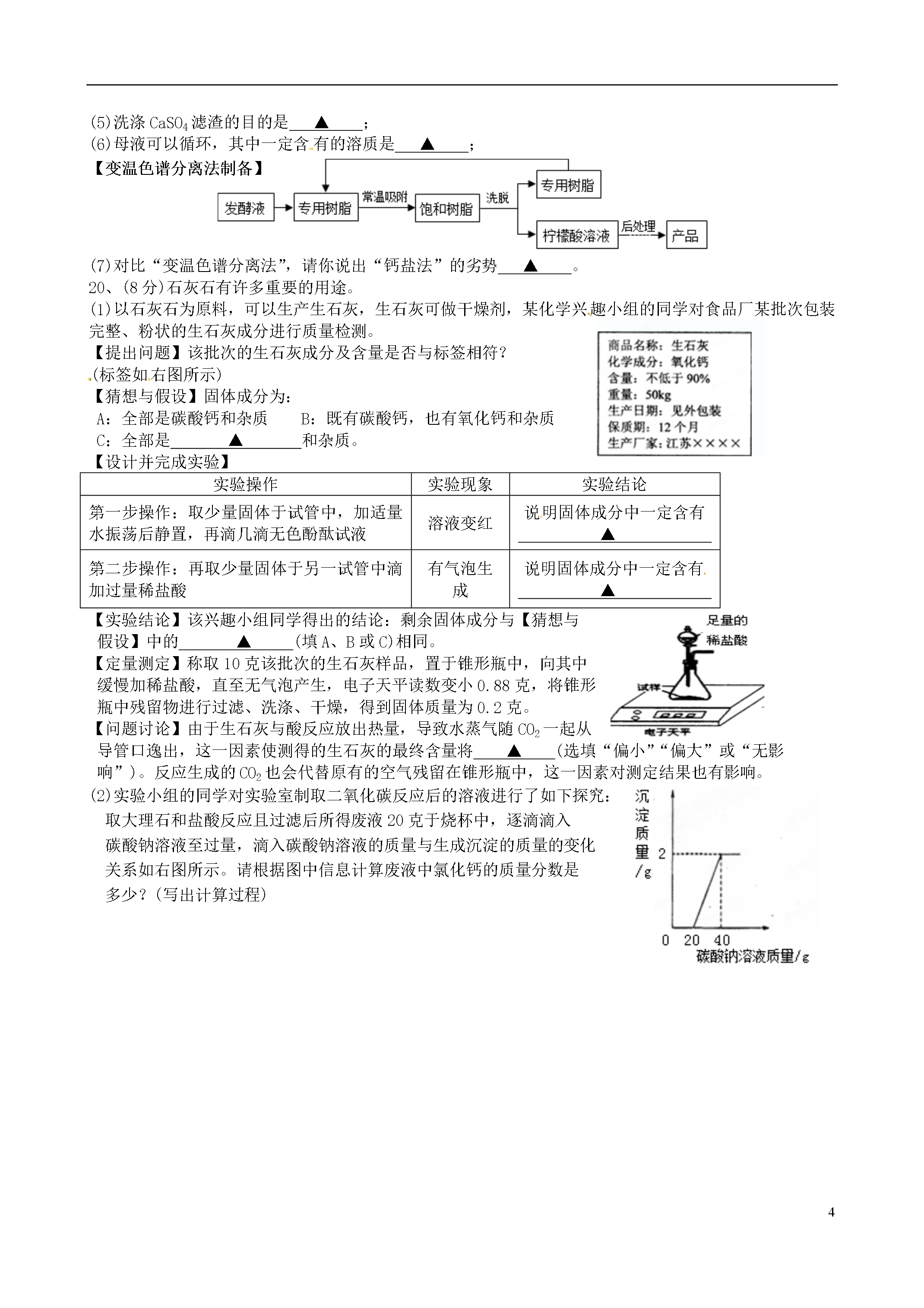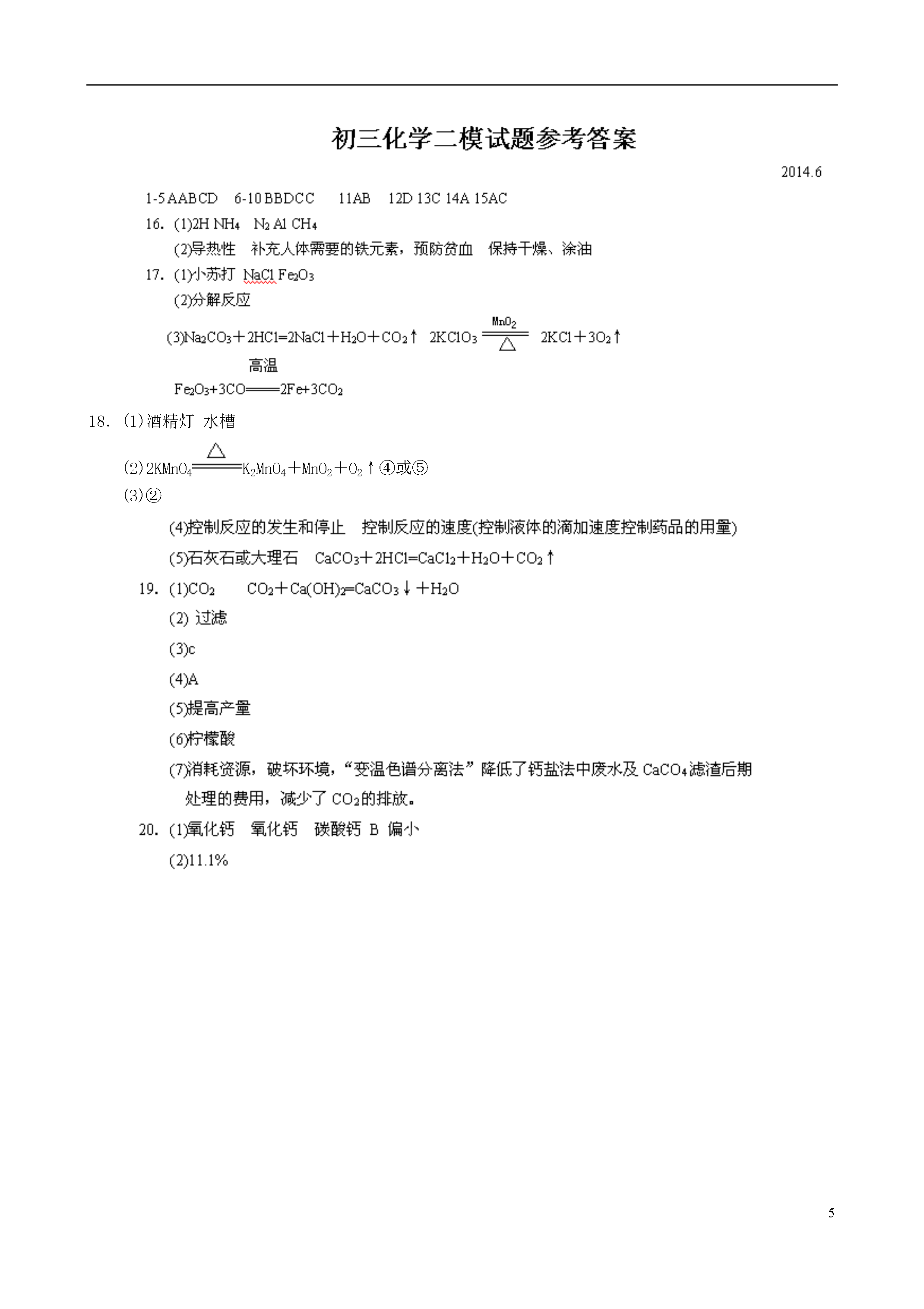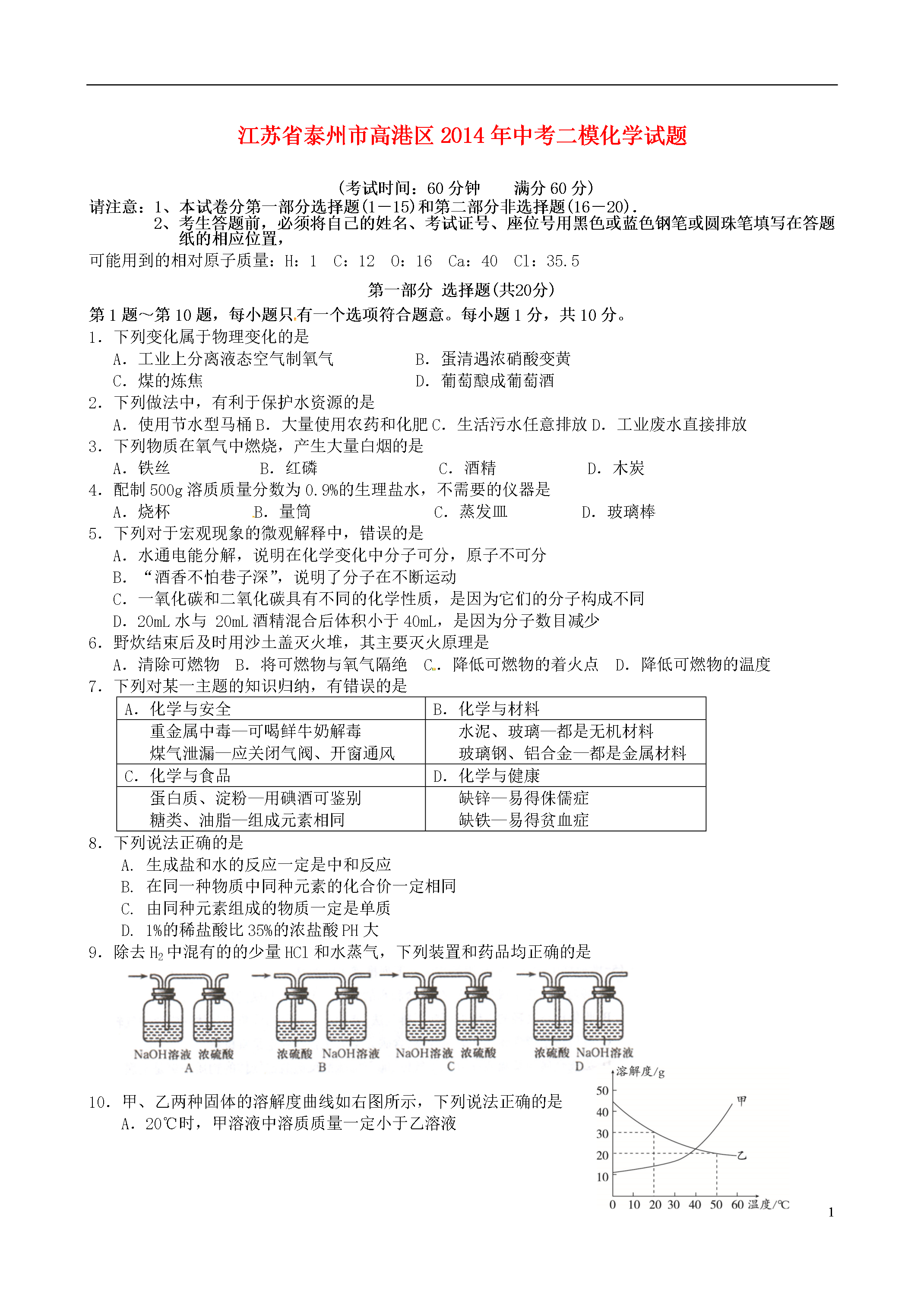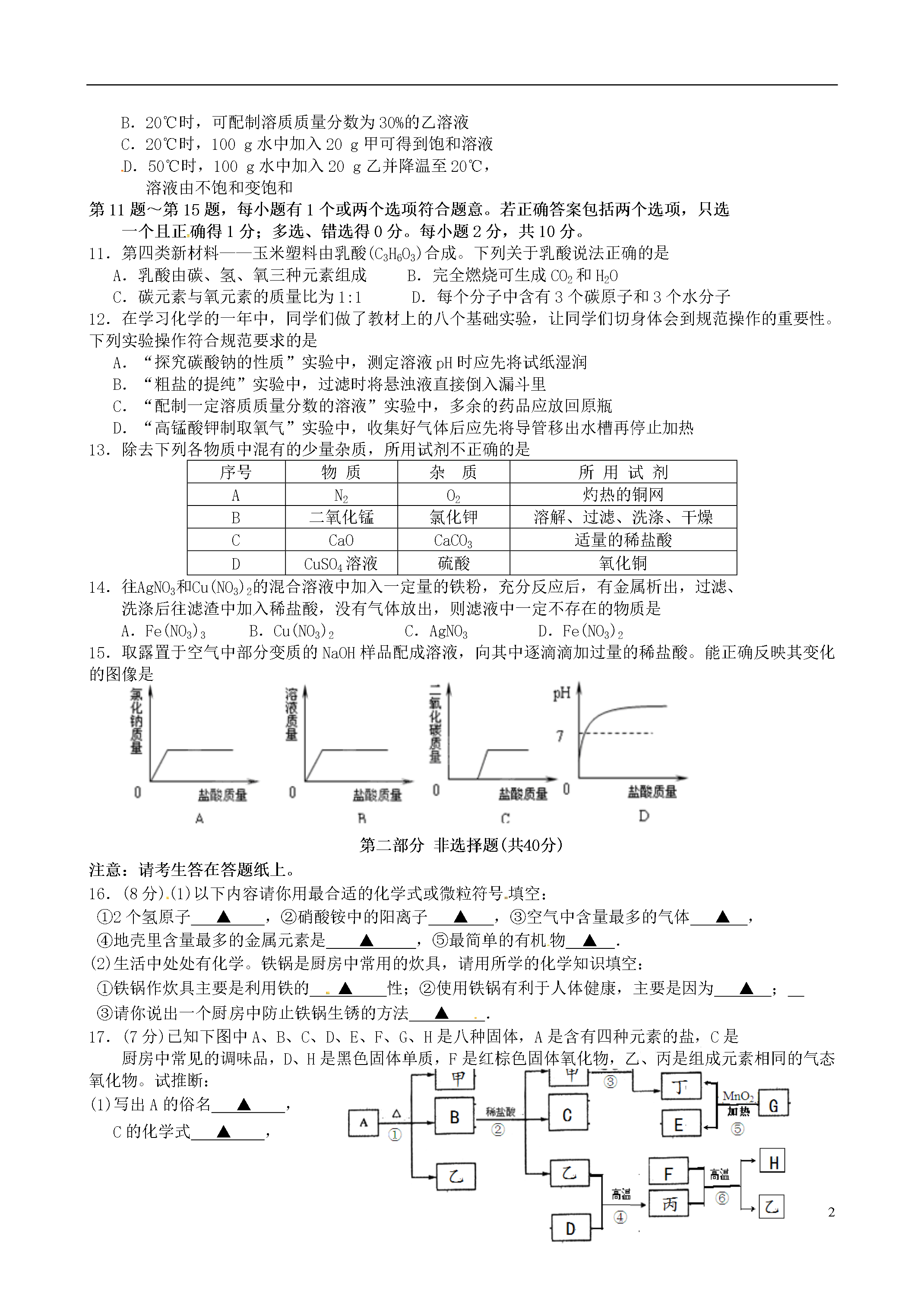 5江苏省泰州市高港区2014年中考二模化学试题(考试时间:60分钟满分60分)请注意:1、本试卷分第一部分选择题(1-15)和第二部分非选择题(16-20).2、考生答题前,必须将自己的姓名、考试证号、座位号用黑色或蓝色钢笔或圆珠笔填写在答题纸的相应位置,可能用到的相对原子质量:H:1C:12O:16Ca:40Cl:35.5第一部分选择题(共20分)第1题~第10题,每小题只有一个选项符合题意。每小题1分,共10分。1.下列变化属于物理变化的是A.工业上分离液态空气制氧气B.蛋清遇浓硝酸变黄C.煤的炼焦D.葡萄酿成葡萄酒2.下列做法中,有利于保护水资源的是A.使用节水型马桶B.大量使用农药和化肥C.生活污水任意排放D.工业废水直接排放3.下列物质在氧气中燃烧,产生大量白烟的是A.铁丝B.红磷C.酒精D.木炭4.配制500g溶质质量分数为0.9%的生理盐水,不需要的仪器是A.烧杯B.量筒C.蒸发皿D.玻璃棒5.下列对于宏观现象的微观解释中,错误的是A.水通电能分解,说明在化学变化中分子可分,原子不可分B.“酒香不怕巷子深”,说明了分子在不断运动C.一氧化碳和二氧化碳具有不同的化学性质,是因为它们的分子构成不同D.20mL水与20mL酒精混合后体积小于40mL,是因为分子数目减少6.野炊结束后及时用沙土盖灭火堆,其主要灭火原理是A.清除可燃物B.将可燃物与氧气隔绝C.降低可燃物的着火点D.降低可燃物的温度7.下列对某一主题的知识归纳,有错误的是A.化学与安全B.化学与材料重金属中毒—可喝鲜牛奶解毒煤气泄漏—应关闭气阀、开窗通风水泥、玻璃—都是无机材料玻璃钢、铝合金—都是金属材料C.化学与食品D.化学与健康蛋白质、淀粉—用碘酒可鉴别糖类、油脂—组成元素相同缺锌—易得侏儒症缺铁—易得贫血症8.下列说法正确的是A.生成盐和水的反应一定是中和反应B.在同一种物质中同种元素的化合价一定相同C.由同种元素组成的物质一定是单质D.1%的稀盐酸比35%的浓盐酸PH大9.除去H2中混有的的少量HCl和水蒸气,下列装置和药品均正确的是10.甲、乙两种固体的溶解度曲线如右图所示,下列说法正确的是A.20℃时,甲溶液中溶质质量一定小于乙溶液B.20℃时,可配制溶质质量分数为30%的乙溶液C.20℃时,100g水中加入20g甲可得到饱和溶液D.50℃时,100g水中加入20g乙并降温至20℃,溶液由不饱和变饱和第11题~第15题,每小题有1个或两个选项符合题意。若正确答案包括两个选项,只选一个且正确得1分;多选、错选得0分。每小题2分,共10分。11.第四类新材料——玉米塑料由乳酸(C3H6O3)合成。下列关于乳酸说法正确的是A.乳酸由碳、氢、氧三种元素组成B.完全燃烧可生成CO2和H2OC.碳元素与氧元素的质量比为1:1D.每个分子中含有3个碳原子和3个水分子12.在学习化学的一年中,同学们做了教材上的八个基础实验,让同学们切身体会到规范操作的重要性。下列实验操作符合规范要求的是A.“探究碳酸钠的性质”实验中,测定溶液pH时应先将试纸湿润B.“粗盐的提纯”实验中,过滤时将悬浊液直接倒入漏斗里C.“配制一定溶质质量分数的溶液”实验中,多余的药品应放回原瓶D.“高锰酸钾制取氧气”实验中,收集好气体后应先将导管移出水槽再停止加热13.除去下列各物质中混有的少量杂质,所用试剂不正确的是序号物质杂质所用试剂AN2O2灼热的铜网B二氧化锰氯化钾溶解、过滤、洗涤、干燥CCaOCaCO3适量的稀盐酸DCuSO4溶液硫酸氧化铜14.往AgNO3和Cu(NO3)2的混合溶液中加入一定量的铁粉,充分反应后,有金属析出,过滤、洗涤后往滤渣中加入稀盐酸,没有气体放出,则滤液中一定不存在的物质是A.Fe(NO3)3B.Cu(NO3)2C.AgNO3D.Fe(NO3)215.取露置于空气中部分变质的NaOH样品配成溶液,向其中逐滴滴加过量的稀盐酸。能正确反映其变化的图像是第二部分非选择题(共40分)注意:请考生答在答题纸上。16.(8分)(1)以下内容请你用最合适的化学式或微粒符号填空:①2个氢原子▲,②硝酸铵中的阳离子▲,③空气中含量最多的气体▲,④地壳里含量最多的金属元素是▲,⑤最简单的有机物▲.(2)生活中处处有化学。铁锅是厨房中常用的炊具,请用所学的化学知识填空:①铁锅作炊具主要是利用铁的▲性;②使用铁锅有利于人体健康,主要是因为▲;③请你说出一个厨房中防止铁锅生锈的方法▲.17.(7分)已知下图中A、B、C、D、E、F、G、H是八种固体,A是含有四种元素的盐,C是厨房中常见的调味品,D、H是黑色固体单质,F是红棕色固体氧化物,乙、丙是组成元素相同的气态氧化物。试推断:(1)写出A的俗名▲,C的化学式▲,F的化学式▲;(2)反应③的基本反应类型为▲;(3)写出②、⑤、⑥的化学