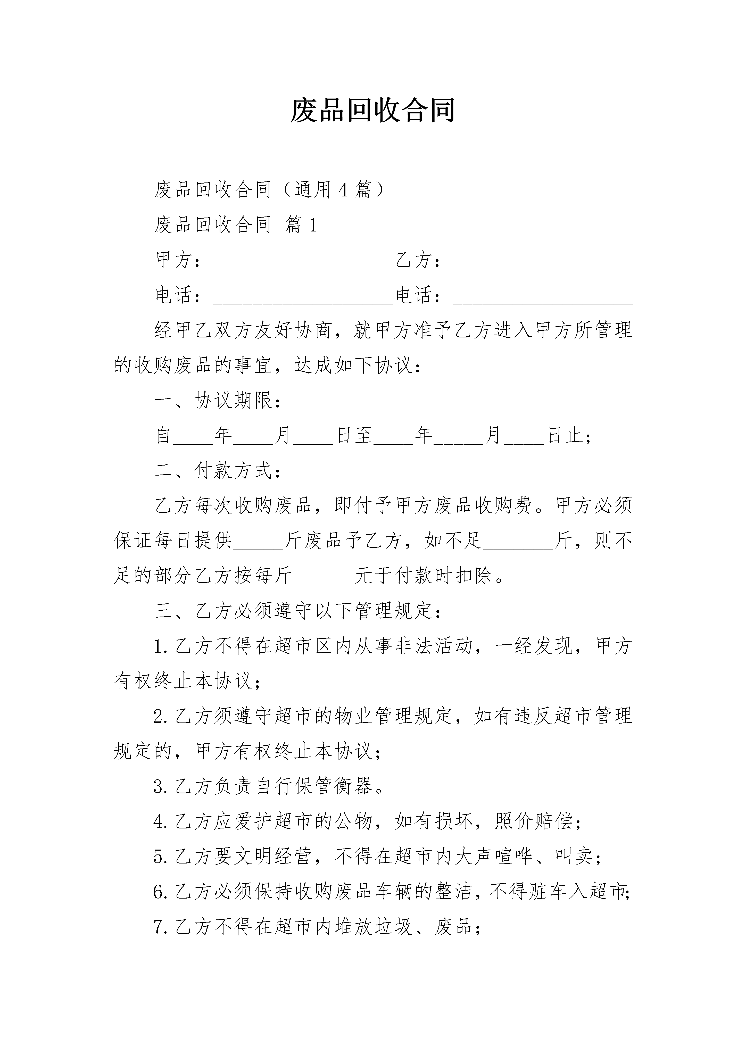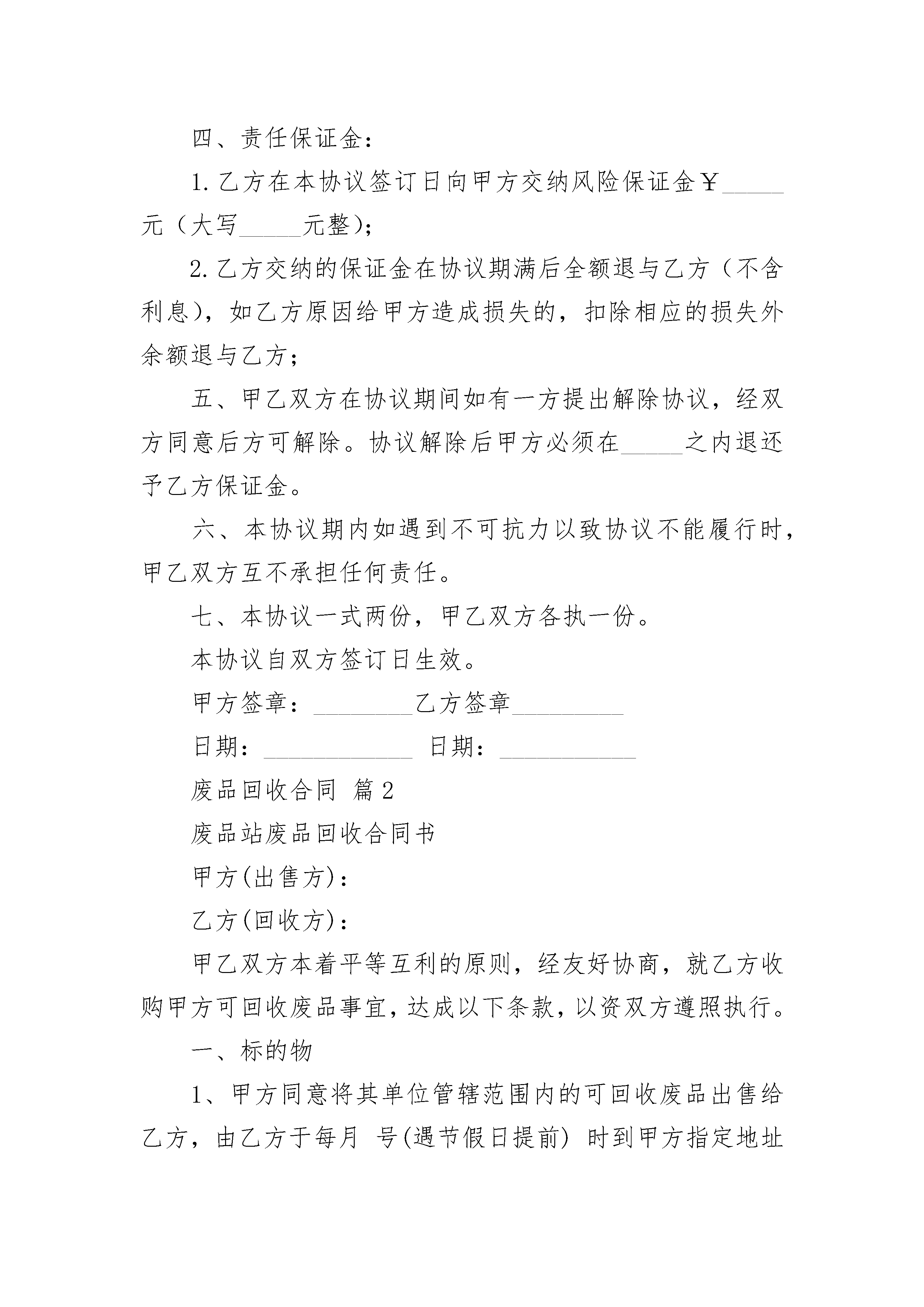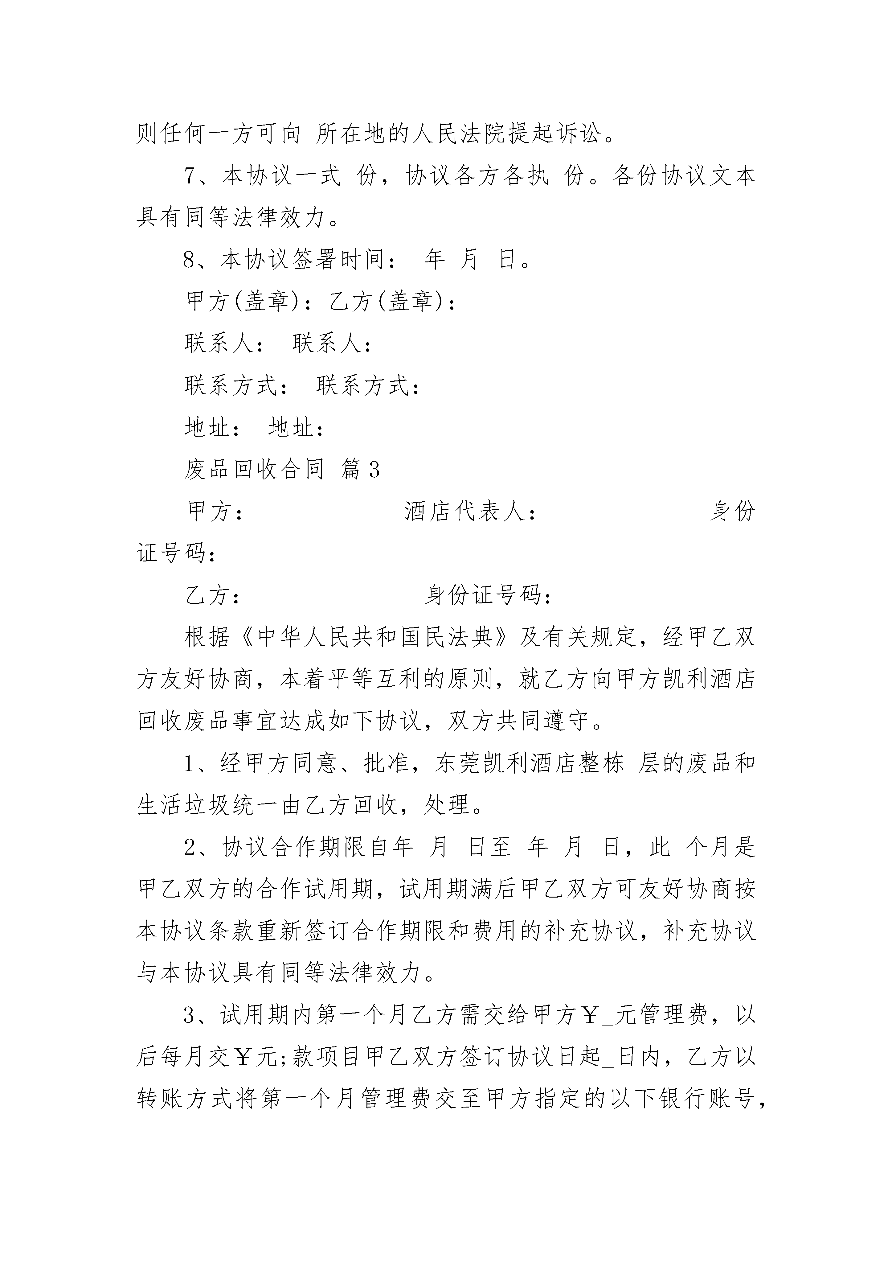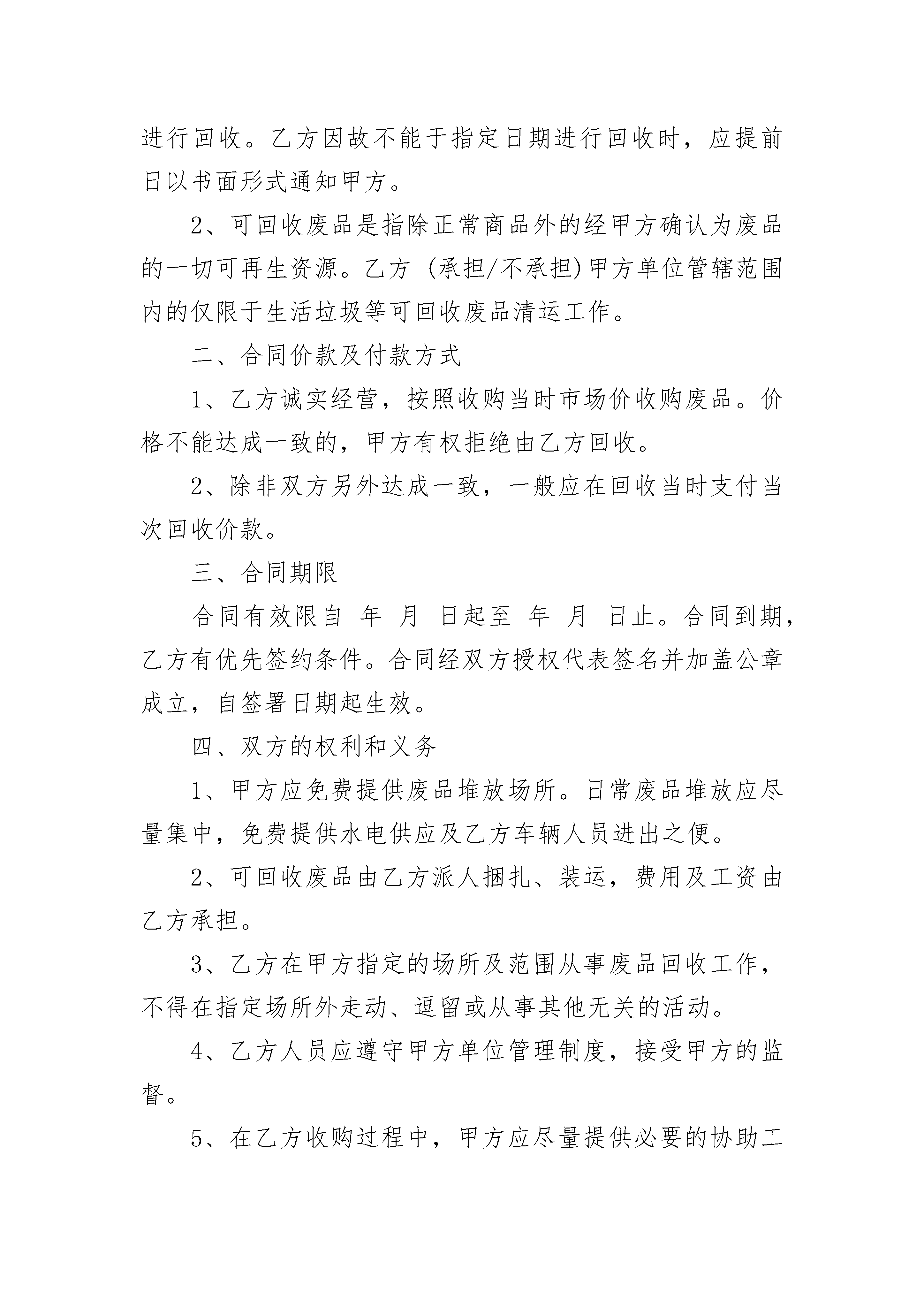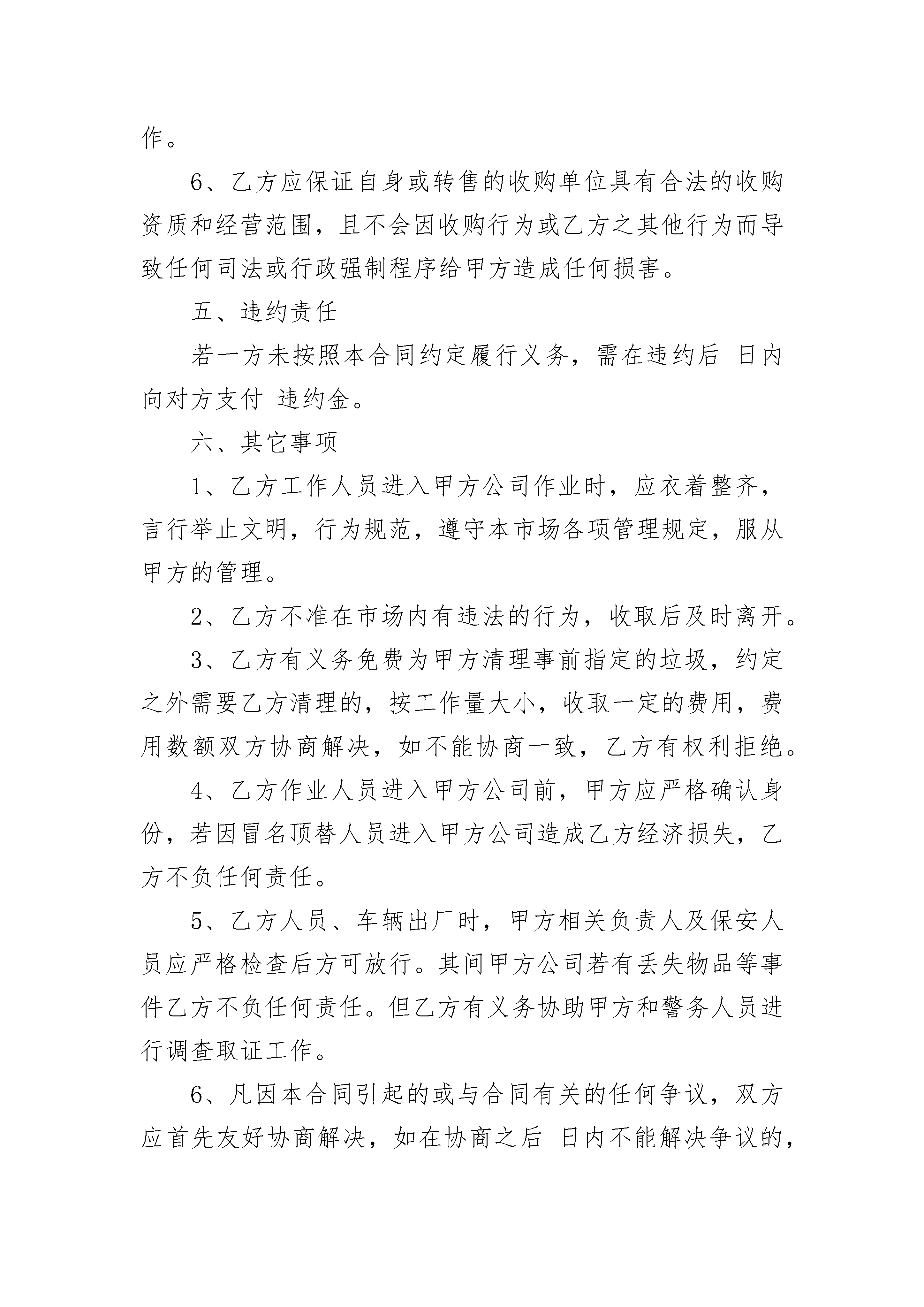 废品回收合同废品回收合同(通用4篇)废品回收合同篇1甲方:__________________乙方:__________________电话:__________________电话:__________________经甲乙双方友好协商,就甲方准予乙方进入甲方所管理的收购废品的事宜,达成如下协议:一、协议期限:自____年____月____日至____年_____月____日止;二、付款方式:乙方每次收购废品,即付予甲方废品收购费。甲方必须保证每日提供_____斤废品予乙方,如不足_______斤,则不足的部分乙方按每斤______元于付款时扣除。三、乙方必须遵守以下管理规定:1.乙方不得在超市区内从事非法活动,一经发现,甲方有权终止本协议;2.乙方须遵守超市的物业管理规定,如有违反超市管理规定的,甲方有权终止本协议;3.乙方负责自行保管衡器。4.乙方应爱护超市的公物,如有损坏,照价赔偿;5.乙方要文明经营,不得在超市内大声喧哗、叫卖;6.乙方必须保持收购废品车辆的整洁,不得赃车入超市;7.乙方不得在超市内堆放垃圾、废品;四、责任保证金:1.乙方在本协议签订日向甲方交纳风险保证金¥_____元(大写_____元整);2.乙方交纳的保证金在协议期满后全额退与乙方(不含利息),如乙方原因给甲方造成损失的,扣除相应的损失外余额退与乙方;五、甲乙双方在协议期间如有一方提出解除协议,经双方同意后方可解除。协议解除后甲方必须在_____之内退还予乙方保证金。六、本协议期内如遇到不可抗力以致协议不能履行时,甲乙双方互不承担任何责任。七、本协议一式两份,甲乙双方各执一份。本协议自双方签订日生效。甲方签章:________乙方签章_________日期:____________日期:___________废品回收合同篇2废品站废品回收合同书甲方(出售方):乙方(回收方):甲乙双方本着平等互利的原则,经友好协商,就乙方收购甲方可回收废品事宜,达成以下条款,以资双方遵照执行。一、标的物1、甲方同意将其单位管辖范围内的可回收废品出售给乙方,由乙方于每月号(遇节假日提前)时到甲方指定地址进行回收。乙方因故不能于指定日期进行回收时,应提前日以书面形式通知甲方。2、可回收废品是指除正常商品外的经甲方确认为废品的一切可再生资源。乙方(承担/不承担)甲方单位管辖范围内的仅限于生活垃圾等可回收废品清运工作。二、合同价款及付款方式1、乙方诚实经营,按照收购当时市场价收购废品。价格不能达成一致的,甲方有权拒绝由乙方回收。2、除非双方另外达成一致,一般应在回收当时支付当次回收价款。三、合同期限合同有效限自年月日起至年月日止。合同到期,乙方有优先签约条件。合同经双方授权代表签名并加盖公章成立,自签署日期起生效。四、双方的权利和义务1、甲方应免费提供废品堆放场所。日常废品堆放应尽量集中,免费提供水电供应及乙方车辆人员进出之便。2、可回收废品由乙方派人捆扎、装运,费用及工资由乙方承担。3、乙方在甲方指定的场所及范围从事废品回收工作,不得在指定场所外走动、逗留或从事其他无关的活动。4、乙方人员应遵守甲方单位管理制度,接受甲方的监督。5、在乙方收购过程中,甲方应尽量提供必要的协助工作。6、乙方应保证自身或转售的收购单位具有合法的收购资质和经营范围,且不会因收购行为或乙方之其他行为而导致任何司法或行政强制程序给甲方造成任何损害。五、违约责任若一方未按照本合同约定履行义务,需在违约后日内向对方支付违约金。六、其它事项1、乙方工作人员进入甲方公司作业时,应衣着整齐,言行举止文明,行为规范,遵守本市场各项管理规定,服从甲方的管理。2、乙方不准在市场内有违法的行为,收取后及时离开。3、乙方有义务免费为甲方清理事前指定的垃圾,约定之外需要乙方清理的,按工作量大小,收取一定的费用,费用数额双方协商解决,如不能协商一致,乙方有权利拒绝。4、乙方作业人员进入甲方公司前,甲方应严格确认身份,若因冒名顶替人员进入甲方公司造成乙方经济损失,乙方不负任何责任。5、乙方人员、车辆出厂时,甲方相关负责人及保安人员应严格检查后方可放行。其间甲方公司若有丢失物品等事件乙方不负任何责任。但乙方有义务协助甲方和警务人员进行调查取证工作。6、凡因本合同引起的或与合同有关的任何争议,双方应首先友好协商解决,如在协商之后日内不能解决争议的,则任何一方可向所在地的人民法院提起诉讼。7、本协议一式份,协议各方各执份。各份协议文本具有同等法律效力。8、本协议签署时间:年月日。甲方(盖章):乙方(盖章):联系人:联系人:联系方式:联系方式:地址:地址:废品回收合同篇3甲方:____________酒店代表人:_____________身份证号码:______________乙方:______________身份证号码:__