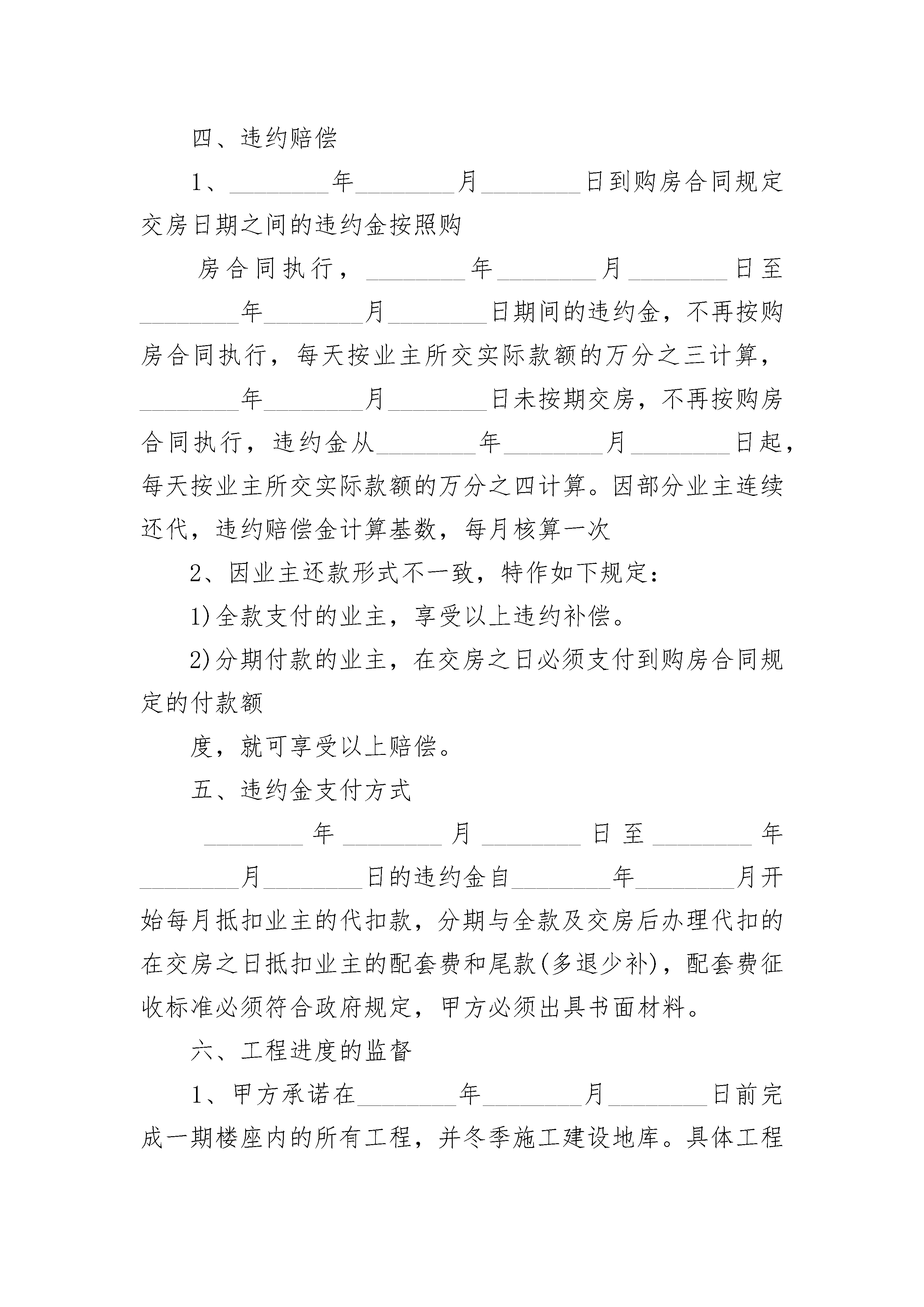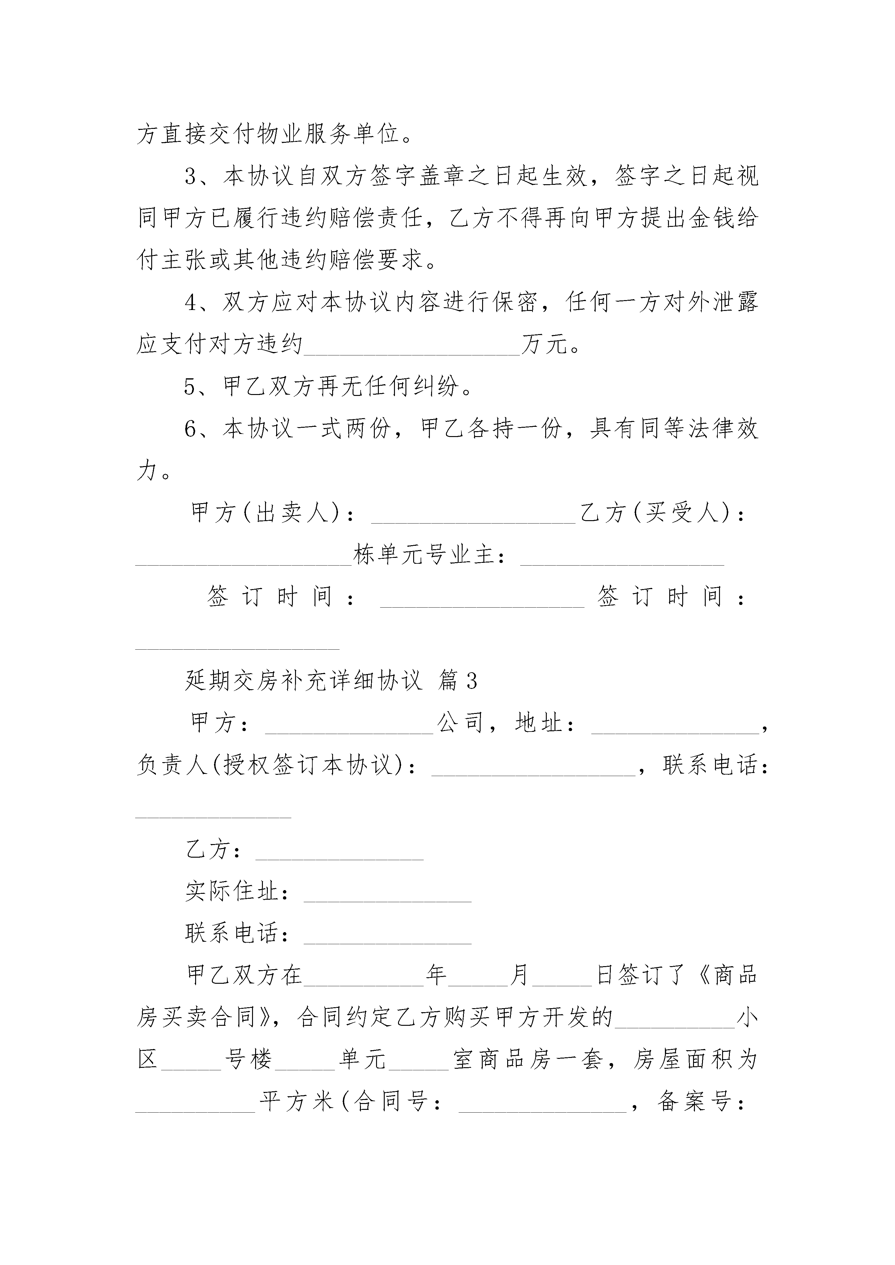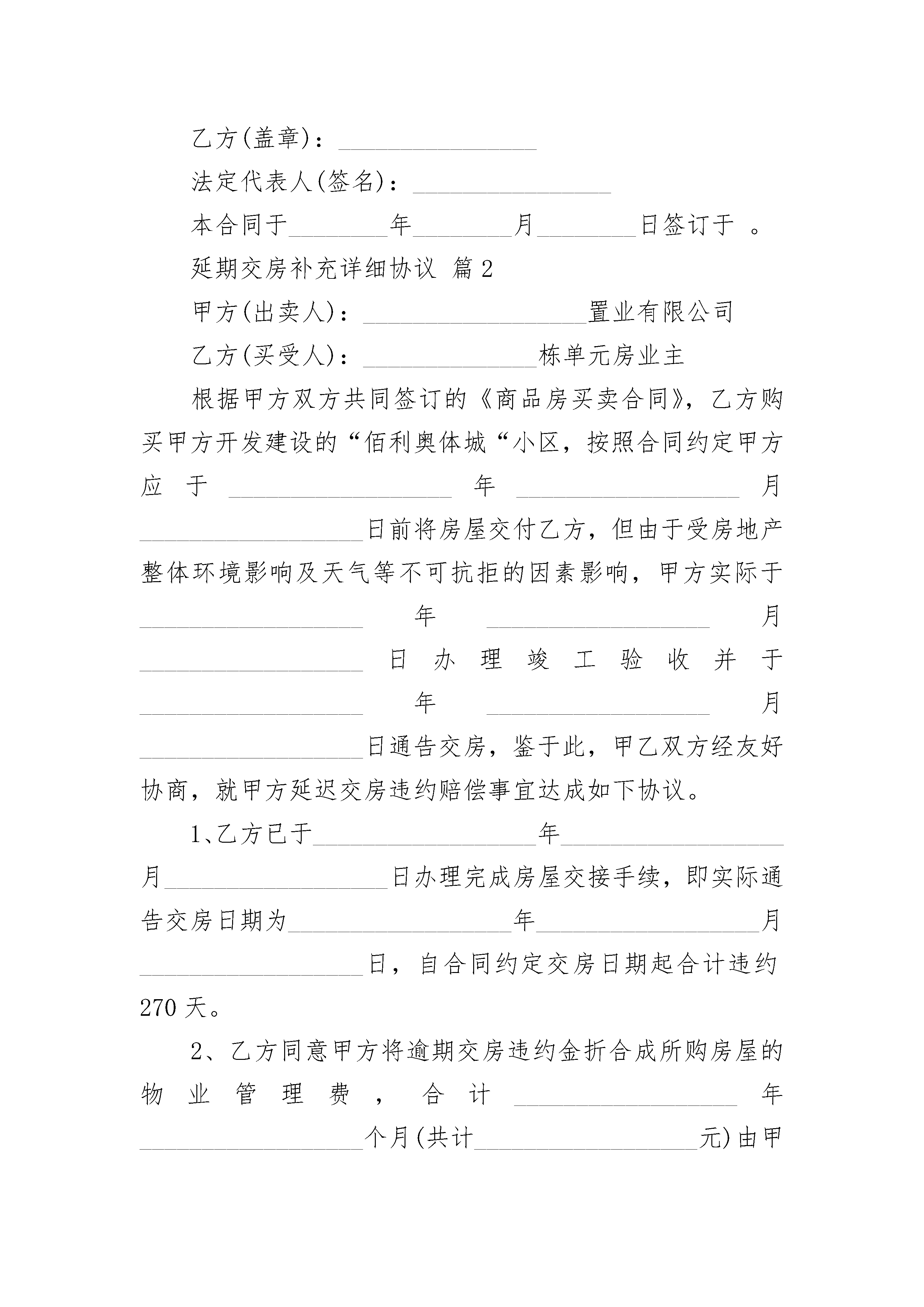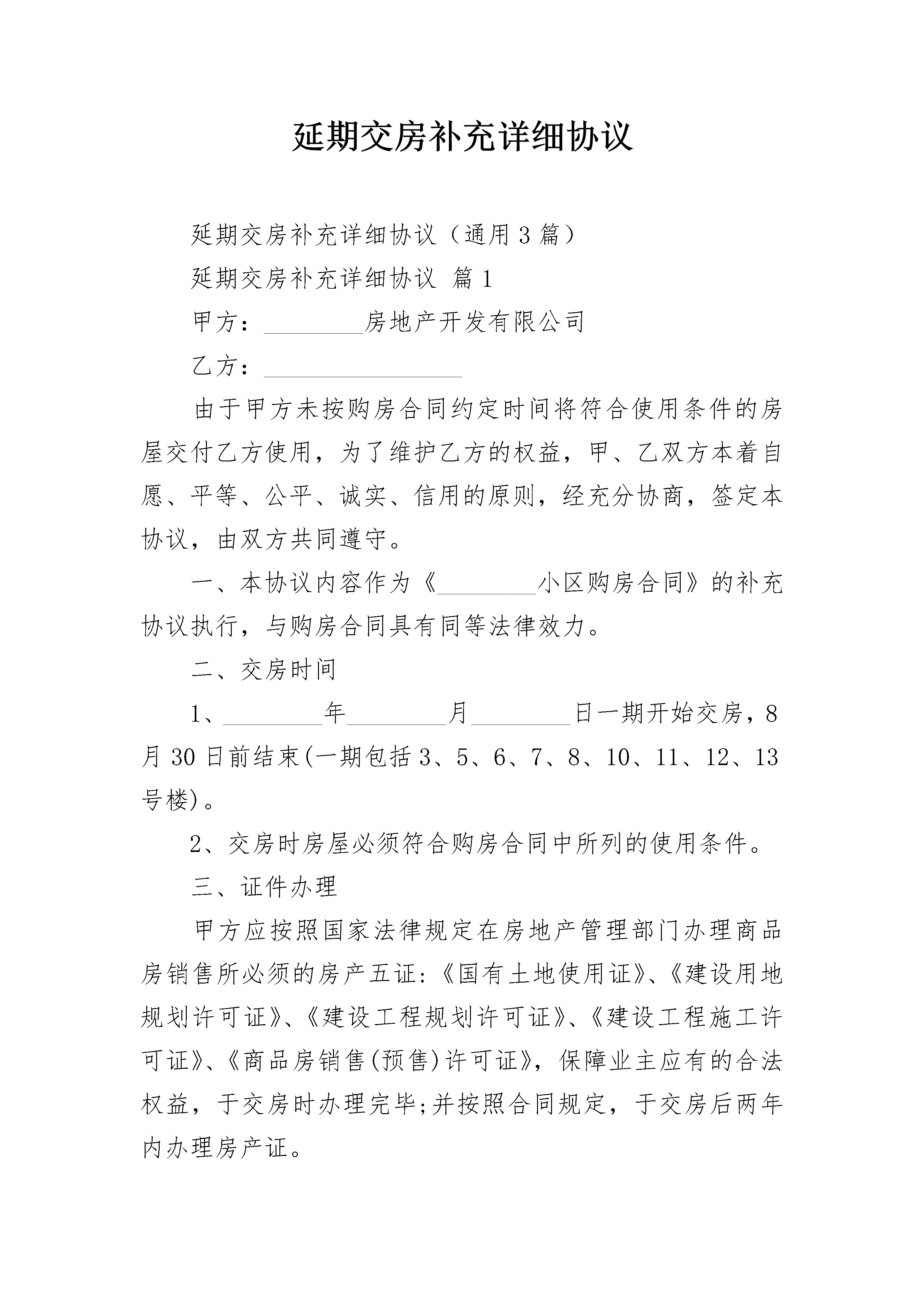 延期交房补充详细协议延期交房补充详细协议(通用3篇)延期交房补充详细协议篇1甲方:________房地产开发有限公司乙方:________________由于甲方未按购房合同约定时间将符合使用条件的房屋交付乙方使用,为了维护乙方的权益,甲、乙双方本着自愿、平等、公平、诚实、信用的原则,经充分协商,签定本协议,由双方共同遵守。一、本协议内容作为《________小区购房合同》的补充协议执行,与购房合同具有同等法律效力。二、交房时间1、________年________月________日一期开始交房,8月30日前结束(一期包括3、5、6、7、8、10、11、12、13号楼)。2、交房时房屋必须符合购房合同中所列的使用条件。三、证件办理甲方应按照国家法律规定在房地产管理部门办理商品房销售所必须的房产五证:《国有土地使用证》、《建设用地规划许可证》、《建设工程规划许可证》、《建设工程施工许可证》、《商品房销售(预售)许可证》,保障业主应有的合法权益,于交房时办理完毕;并按照合同规定,于交房后两年内办理房产证。四、违约赔偿1、________年________月________日到购房合同规定交房日期之间的违约金按照购房合同执行,________年________月________日至________年________月________日期间的违约金,不再按购房合同执行,每天按业主所交实际款额的万分之三计算,________年________月________日未按期交房,不再按购房合同执行,违约金从________年________月________日起,每天按业主所交实际款额的万分之四计算。因部分业主连续还代,违约赔偿金计算基数,每月核算一次2、因业主还款形式不一致,特作如下规定:1)全款支付的业主,享受以上违约补偿。2)分期付款的业主,在交房之日必须支付到购房合同规定的付款额度,就可享受以上赔偿。五、违约金支付方式________年________月________日至________年________月________日的违约金自________年________月开始每月抵扣业主的代扣款,分期与全款及交房后办理代扣的在交房之日抵扣业主的配套费和尾款(多退少补),配套费征收标准必须符合政府规定,甲方必须出具书面材料。六、工程进度的监督1、甲方承诺在________年________月________日前完成一期楼座内的所有工程,并冬季施工建设地库。具体工程计划及施工进度表,甲方须向业主公示。2、乙方自发推选工程监督人员,并按甲方提供的工程计划及施工进度表每星期实地考察监督,并在业主群公示施工进度的图片和文字,甲方须向乙方监督人员提供安全防护装备。3、工程进度未达到工程计划及施工进度要求的,甲方有义务向乙方监督人员做出解释。七、解决争议的方式本合同未尽事宜,双方以友好协商的原则妥善解决,如双方发生争议,可向**市仲裁委员会申请仲裁,亦可直接向太原市人民法院起诉。八、附则1、本协议为主合同不可分割的组成部分,与主合同具有同等法律效力。2、其它未尽事宜,双方协商另签补充协议,与主合同具有同等法律效力。3、本协议及合同或附件的任何变更、修改或增减均须双方同意后由授权代表签署书面文件,具有本合同同等效力。4、合同签定后,不经双方同意,任何一方不得随意变更或解除。如单方解除合同,应赔偿对方因此造成的一切损失。备注:本协议,自双方签字盖章之日起生效。甲方(盖章):________________法定代表人(签名):________________乙方(盖章):________________法定代表人(签名):________________本合同于________年________月________日签订于。延期交房补充详细协议篇2甲方(出卖人):__________________置业有限公司乙方(买受人):______________栋单元房业主根据甲方双方共同签订的《商品房买卖合同》,乙方购买甲方开发建设的“佰利奥体城“小区,按照合同约定甲方应于__________________年__________________月__________________日前将房屋交付乙方,但由于受房地产整体环境影响及天气等不可抗拒的因素影响,甲方实际于__________________年__________________月__________________日办理竣工验收并于__________________年__________________月__________________日通告交房,鉴于此,甲乙双方经友好协商,就甲方延迟交房违约赔偿事宜达成如下协议。1、乙方已于__________________年__________