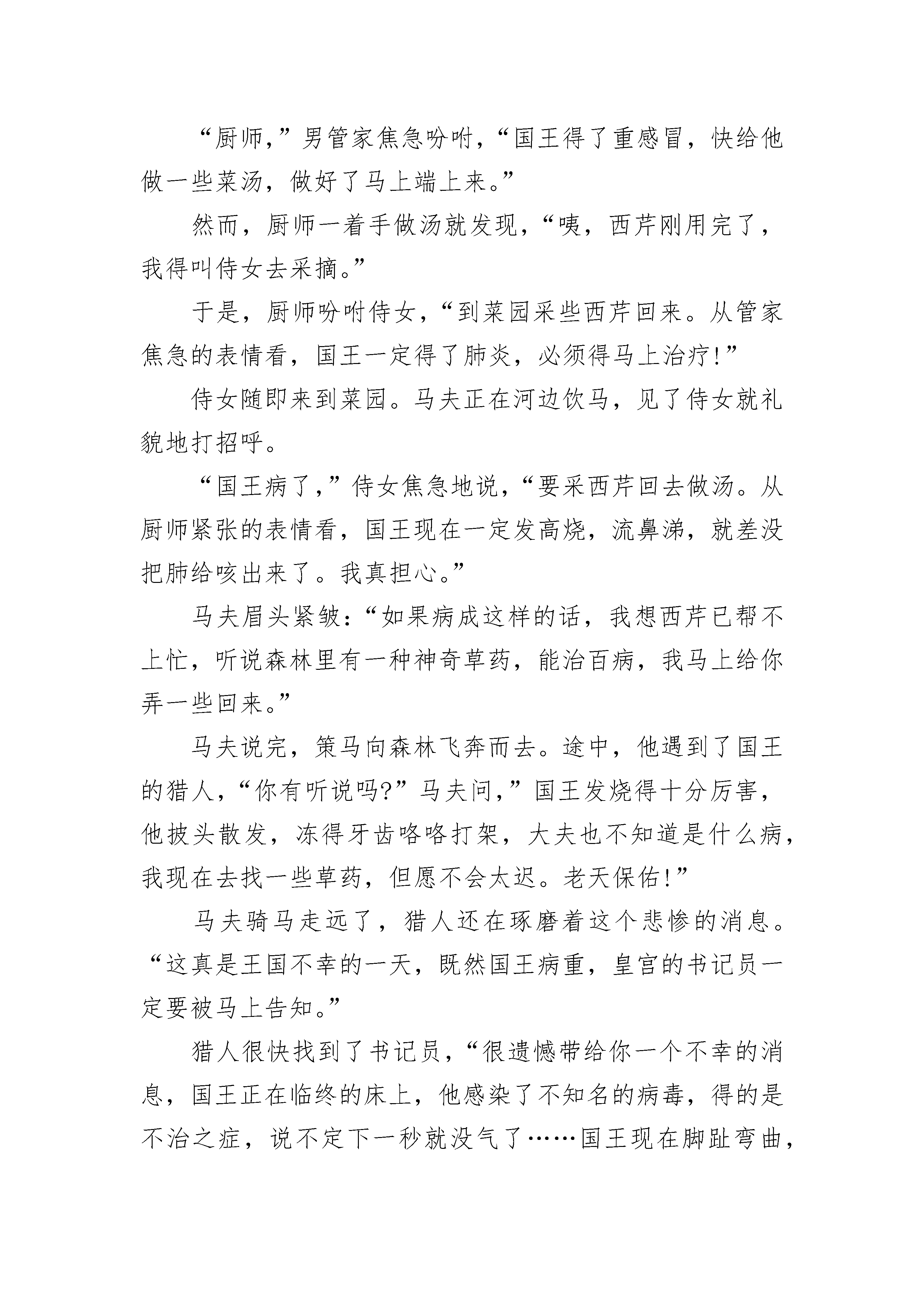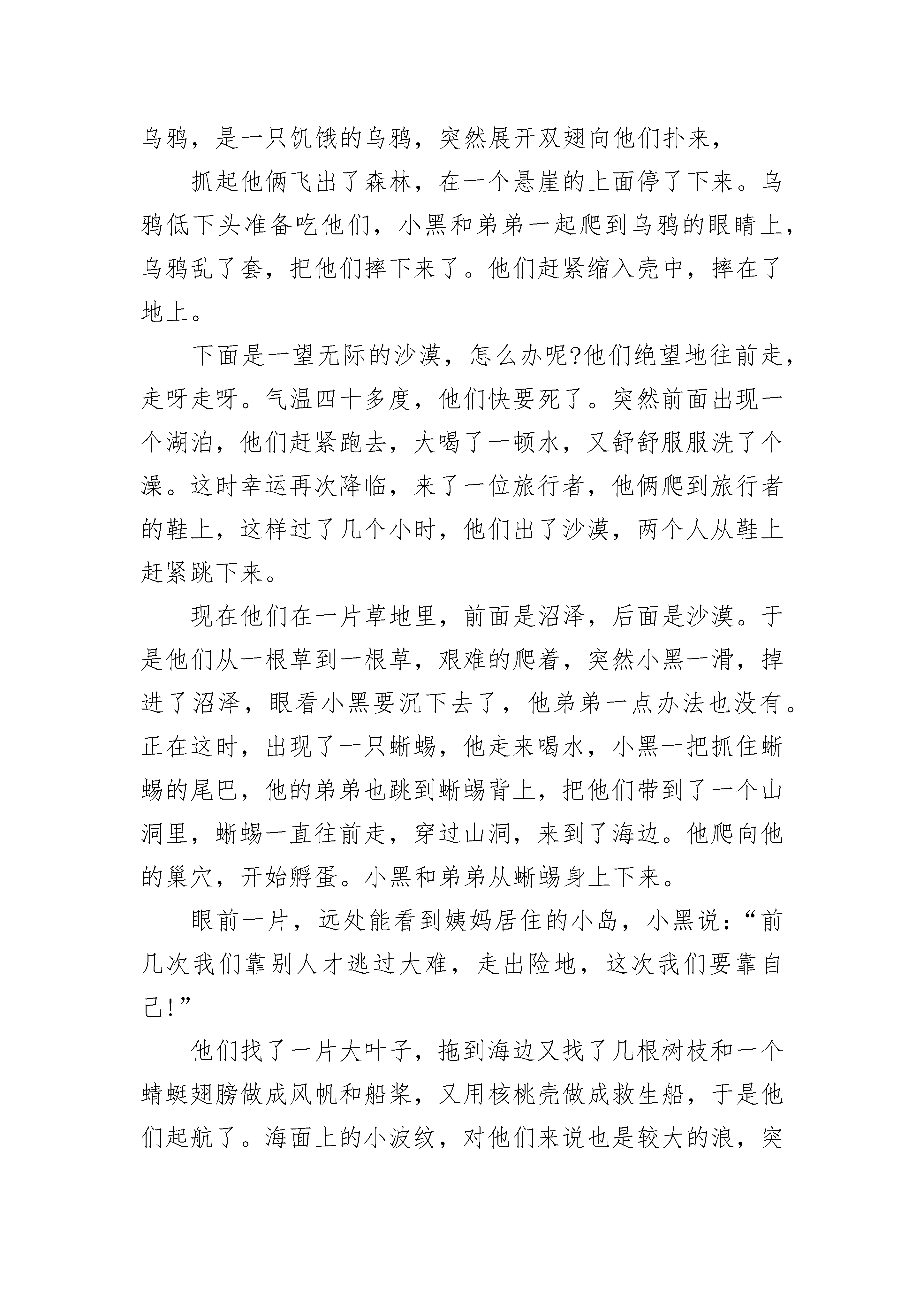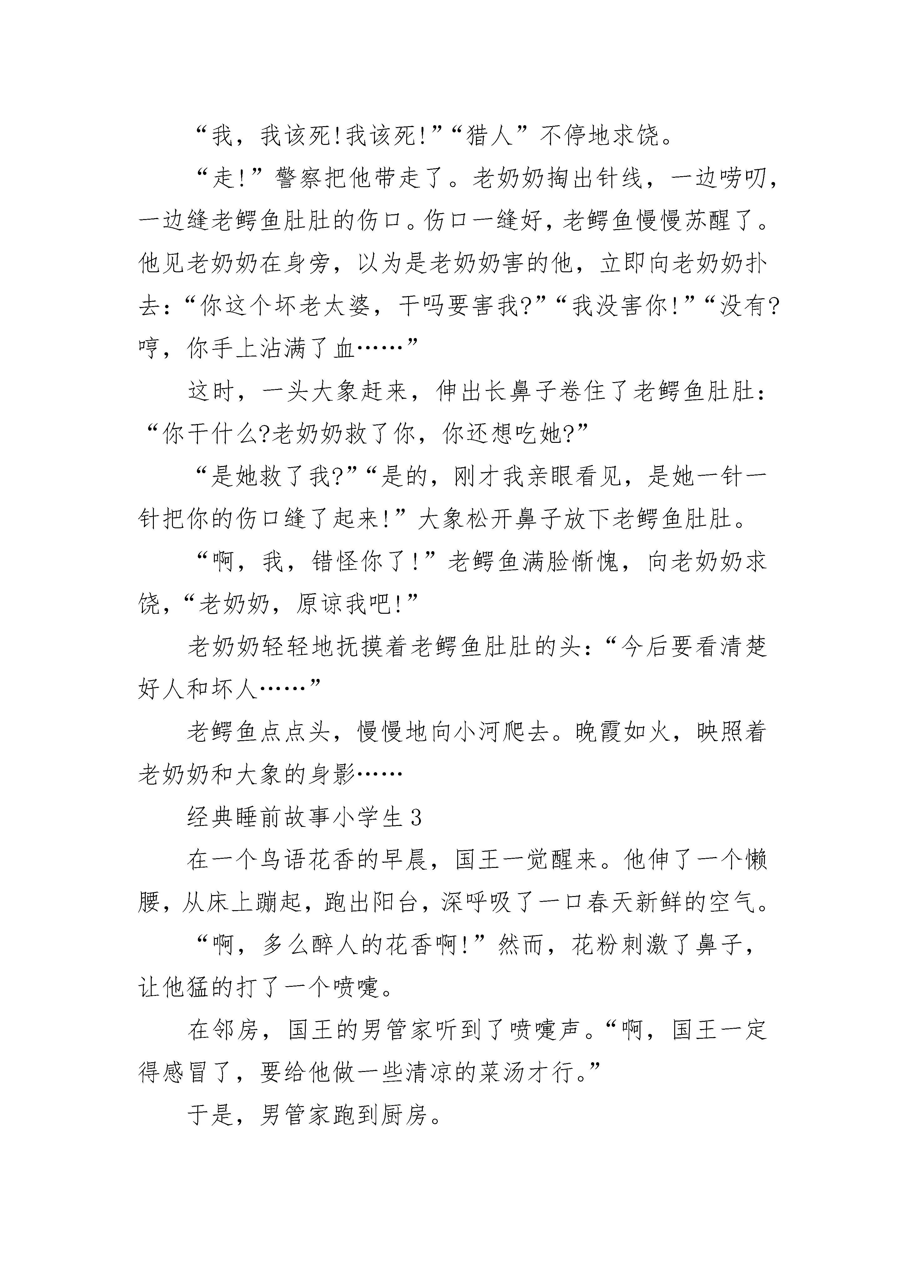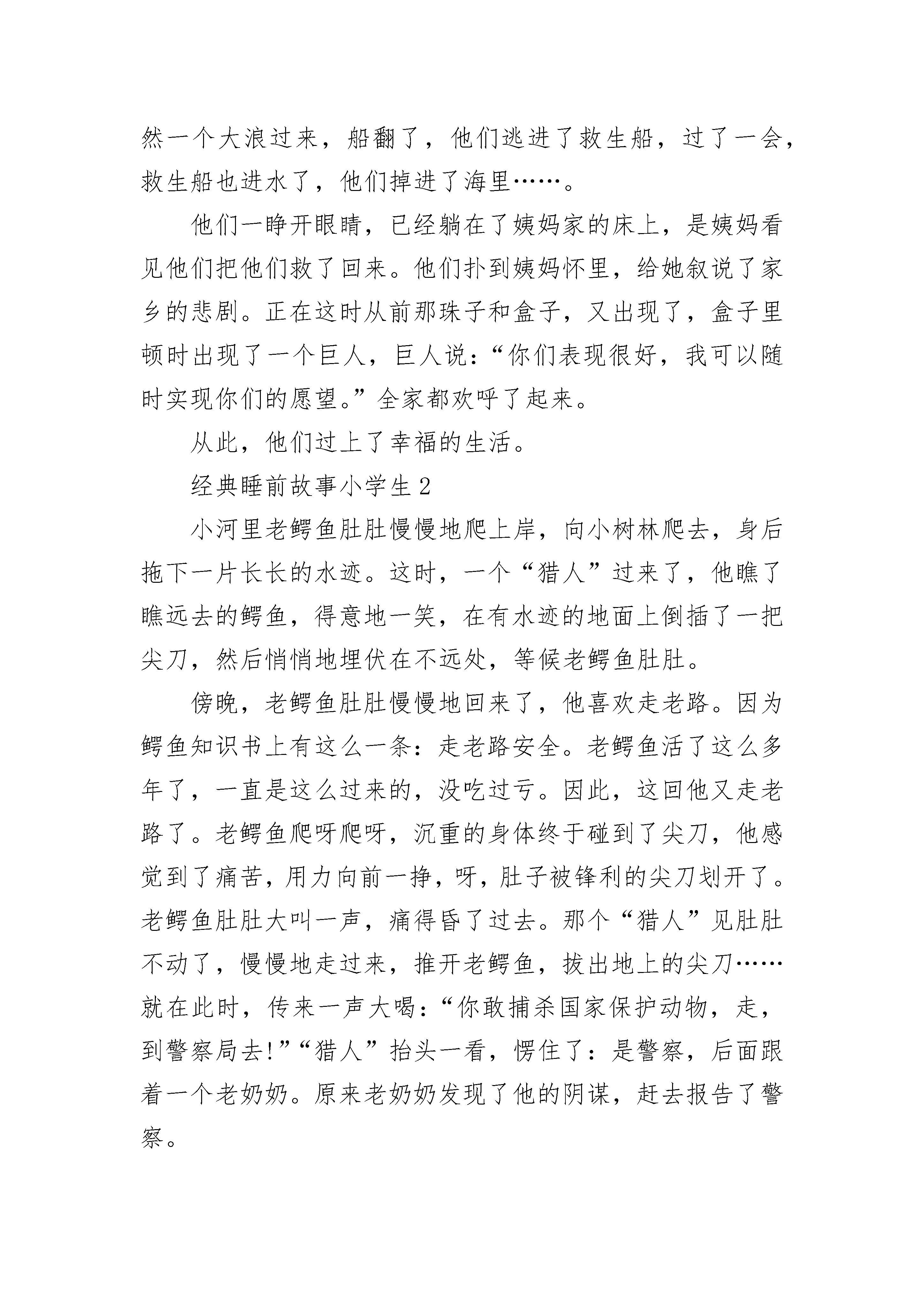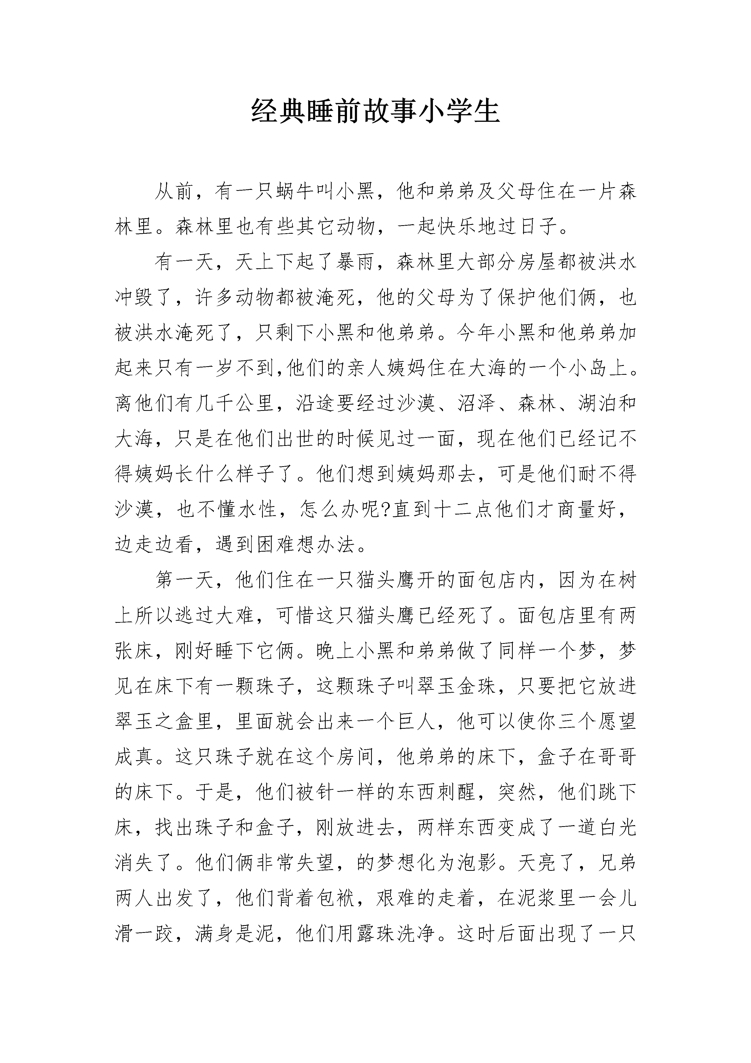经典睡前故事小学生从前,有一只蜗牛叫小黑,他和弟弟及父母住在一片森林里。森林里也有些其它动物,一起快乐地过日子。有一天,天上下起了暴雨,森林里大部分房屋都被洪水冲毁了,许多动物都被淹死,他的父母为了保护他们俩,也被洪水淹死了,只剩下小黑和他弟弟。今年小黑和他弟弟加起来只有一岁不到,他们的亲人姨妈住在大海的一个小岛上。离他们有几千公里,沿途要经过沙漠、沼泽、森林、湖泊和大海,只是在他们出世的时候见过一面,现在他们已经记不得姨妈长什么样子了。他们想到姨妈那去,可是他们耐不得沙漠,也不懂水性,怎么办呢?直到十二点他们才商量好,边走边看,遇到困难想办法。第一天,他们住在一只猫头鹰开的面包店内,因为在树上所以逃过大难,可惜这只猫头鹰已经死了。面包店里有两张床,刚好睡下它俩。晚上小黑和弟弟做了同样一个梦,梦见在床下有一颗珠子,这颗珠子叫翠玉金珠,只要把它放进翠玉之盒里,里面就会出来一个巨人,他可以使你三个愿望成真。这只珠子就在这个房间,他弟弟的床下,盒子在哥哥的床下。于是,他们被针一样的东西刺醒,突然,他们跳下床,找出珠子和盒子,刚放进去,两样东西变成了一道白光消失了。他们俩非常失望,的梦想化为泡影。天亮了,兄弟两人出发了,他们背着包袱,艰难的走着,在泥浆里一会儿滑一跤,满身是泥,他们用露珠洗净。这时后面出现了一只乌鸦,是一只饥饿的乌鸦,突然展开双翅向他们扑来,抓起他俩飞出了森林,在一个悬崖的上面停了下来。乌鸦低下头准备吃他们,小黑和弟弟一起爬到乌鸦的眼睛上,乌鸦乱了套,把他们摔下来了。他们赶紧缩入壳中,摔在了地上。下面是一望无际的沙漠,怎么办呢?他们绝望地往前走,走呀走呀。气温四十多度,他们快要死了。突然前面出现一个湖泊,他们赶紧跑去,大喝了一顿水,又舒舒服服洗了个澡。这时幸运再次降临,来了一位旅行者,他俩爬到旅行者的鞋上,这样过了几个小时,他们出了沙漠,两个人从鞋上赶紧跳下来。现在他们在一片草地里,前面是沼泽,后面是沙漠。于是他们从一根草到一根草,艰难的爬着,突然小黑一滑,掉进了沼泽,眼看小黑要沉下去了,他弟弟一点办法也没有。正在这时,出现了一只蜥蜴,他走来喝水,小黑一把抓住蜥蜴的尾巴,他的弟弟也跳到蜥蜴背上,把他们带到了一个山洞里,蜥蜴一直往前走,穿过山洞,来到了海边。他爬向他的巢穴,开始孵蛋。小黑和弟弟从蜥蜴身上下来。眼前一片,远处能看到姨妈居住的小岛,小黑说:“前几次我们靠别人才逃过大难,走出险地,这次我们要靠自己!”他们找了一片大叶子,拖到海边又找了几根树枝和一个蜻蜓翅膀做成风帆和船桨,又用核桃壳做成救生船,于是他们起航了。海面上的小波纹,对他们来说也是较大的浪,突然一个大浪过来,船翻了,他们逃进了救生船,过了一会,救生船也进水了,他们掉进了海里……。他们一睁开眼睛,已经躺在了姨妈家的床上,是姨妈看见他们把他们救了回来。他们扑到姨妈怀里,给她叙说了家乡的悲剧。正在这时从前那珠子和盒子,又出现了,盒子里顿时出现了一个巨人,巨人说:“你们表现很好,我可以随时实现你们的愿望。”全家都欢呼了起来。从此,他们过上了幸福的生活。经典睡前故事小学生2小河里老鳄鱼肚肚慢慢地爬上岸,向小树林爬去,身后拖下一片长长的水迹。这时,一个“猎人”过来了,他瞧了瞧远去的鳄鱼,得意地一笑,在有水迹的地面上倒插了一把尖刀,然后悄悄地埋伏在不远处,等候老鳄鱼肚肚。傍晚,老鳄鱼肚肚慢慢地回来了,他喜欢走老路。因为鳄鱼知识书上有这么一条:走老路安全。老鳄鱼活了这么多年了,一直是这么过来的,没吃过亏。因此,这回他又走老路了。老鳄鱼爬呀爬呀,沉重的身体终于碰到了尖刀,他感觉到了痛苦,用力向前一挣,呀,肚子被锋利的尖刀划开了。老鳄鱼肚肚大叫一声,痛得昏了过去。那个“猎人”见肚肚不动了,慢慢地走过来,推开老鳄鱼,拔出地上的尖刀……就在此时,传来一声大喝:“你敢捕杀国家保护动物,走,到警察局去!”“猎人”抬头一看,愣住了:是警察,后面跟着一个老奶奶。原来老奶奶发现了他的阴谋,赶去报告了警察。“我,我该死!我该死!”“猎人”不停地求饶。“走!”警察把他带走了。老奶奶掏出针线,一边唠叨,一边缝老鳄鱼肚肚的伤口。伤口一缝好,老鳄鱼慢慢苏醒了。他见老奶奶在身旁,以为是老奶奶害的他,立即向老奶奶扑去:“你这个坏老太婆,干吗要害我?”“我没害你!”“没有?哼,你手上沾满了血……”这时,一头大象赶来,伸出长鼻子卷住了老鳄鱼肚肚:“你干什么?老奶奶救了你,你还想吃她?”“是她救了我?”“是的,刚才我亲眼看见,是她一针一针把你的伤口缝了起来!”大象松开鼻子放下老鳄鱼肚肚。“啊,我,错怪你了!”老鳄鱼满脸惭愧,向老奶奶求饶,“老奶奶,原谅我吧!”老奶奶轻轻地抚摸着老鳄鱼肚肚的头:“今后要看清楚好人和坏人……”老鳄鱼点点头,慢慢地向小河爬去。晚霞如火,映照着老奶奶和大象的身影……经典睡前故事