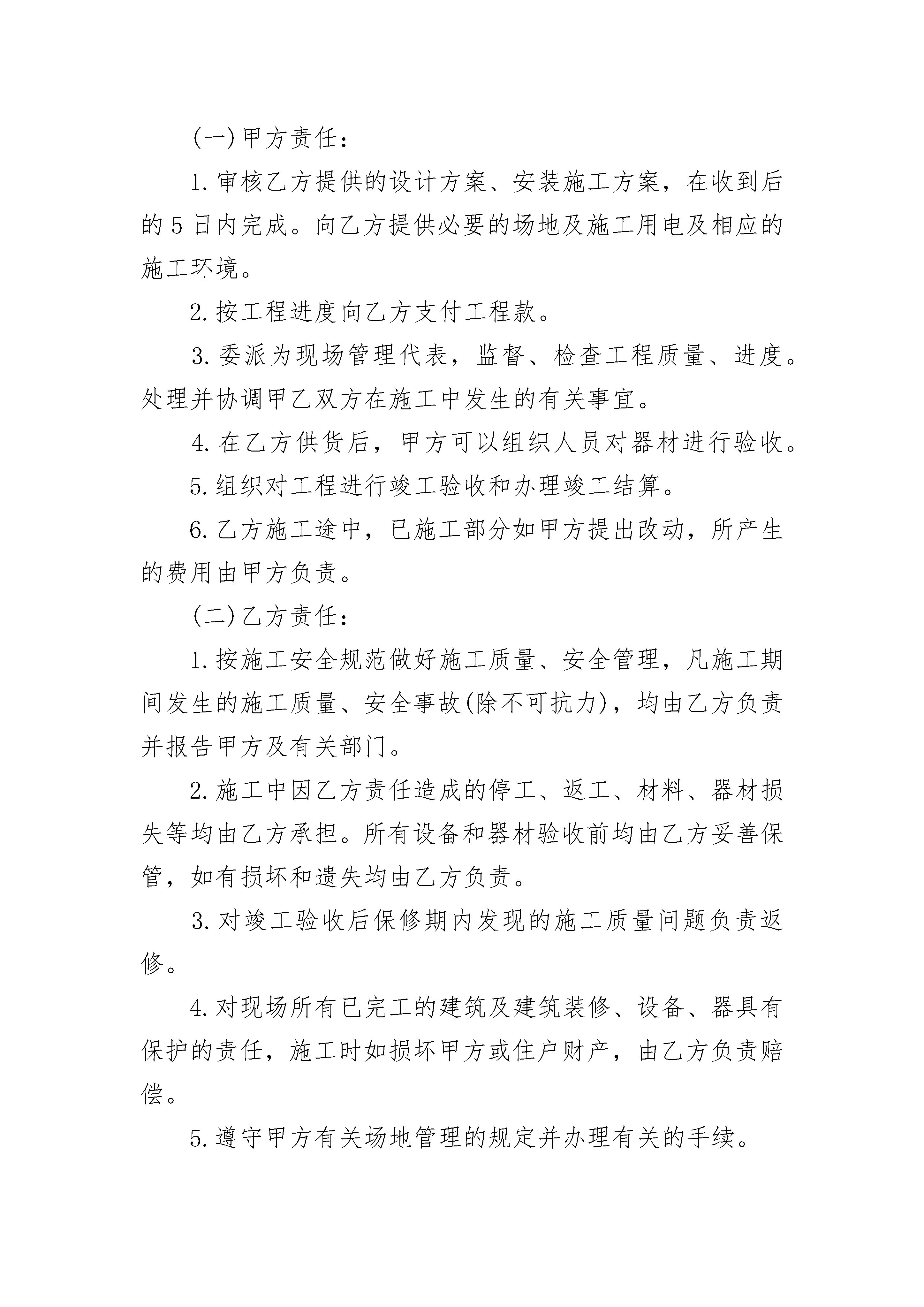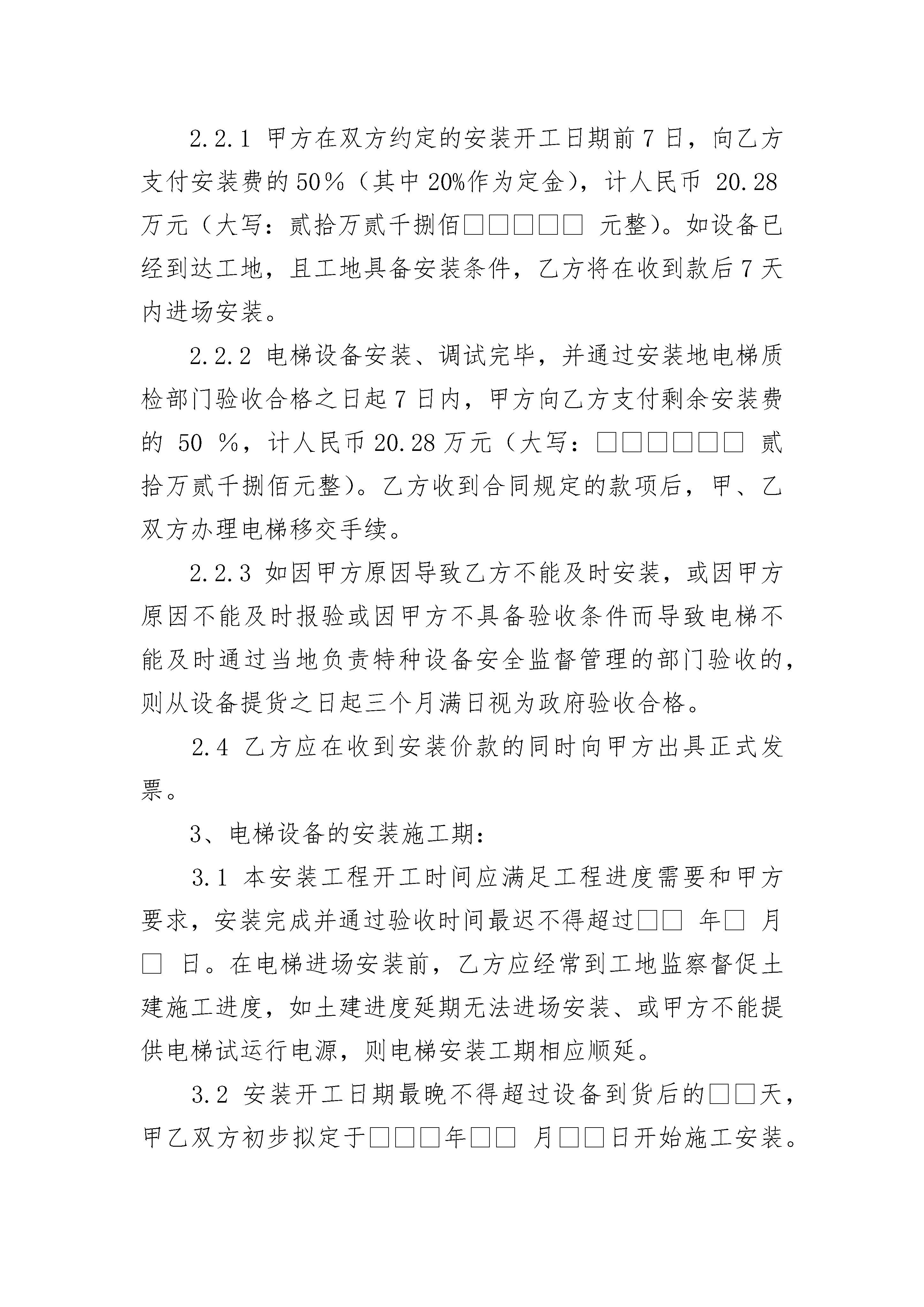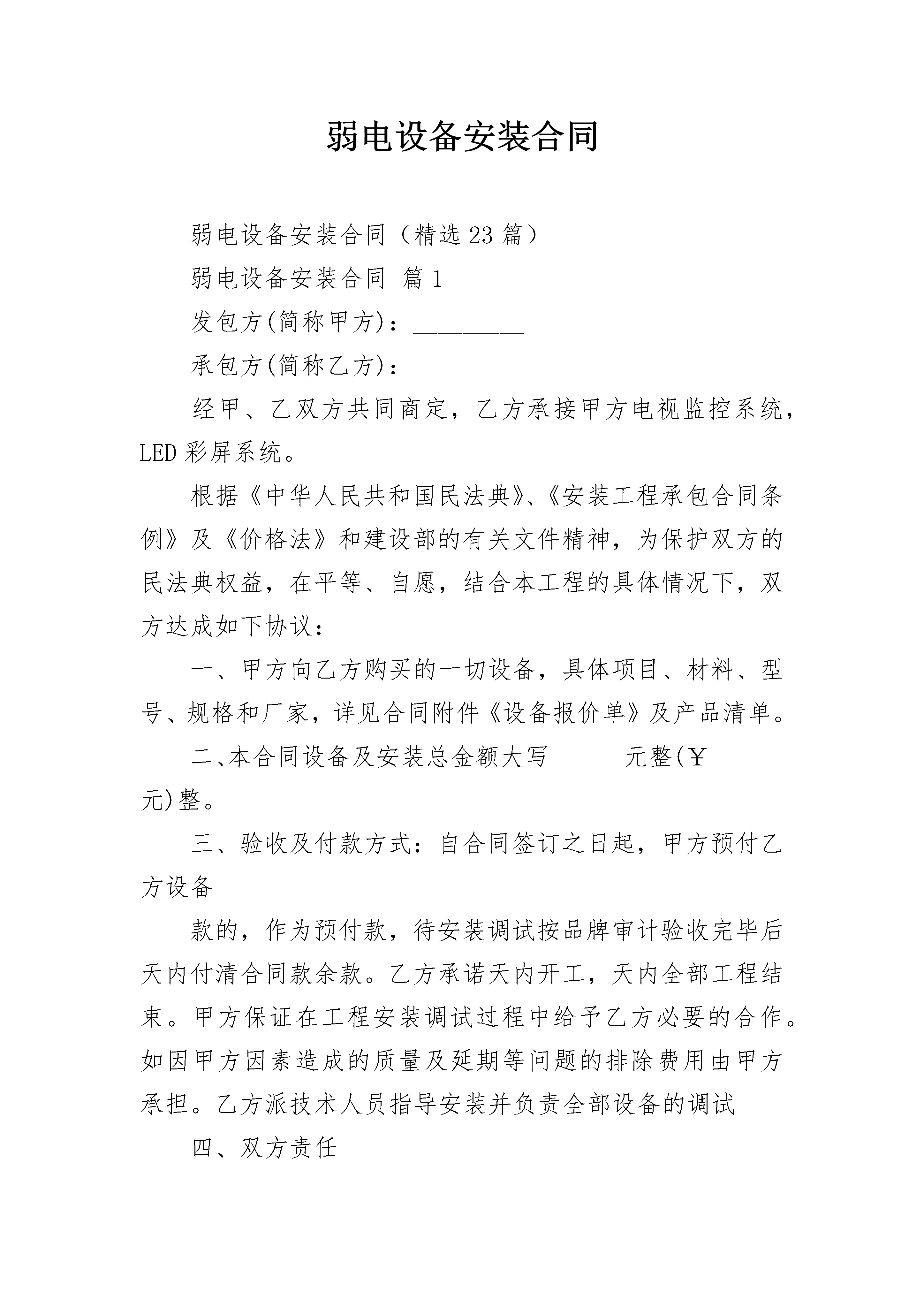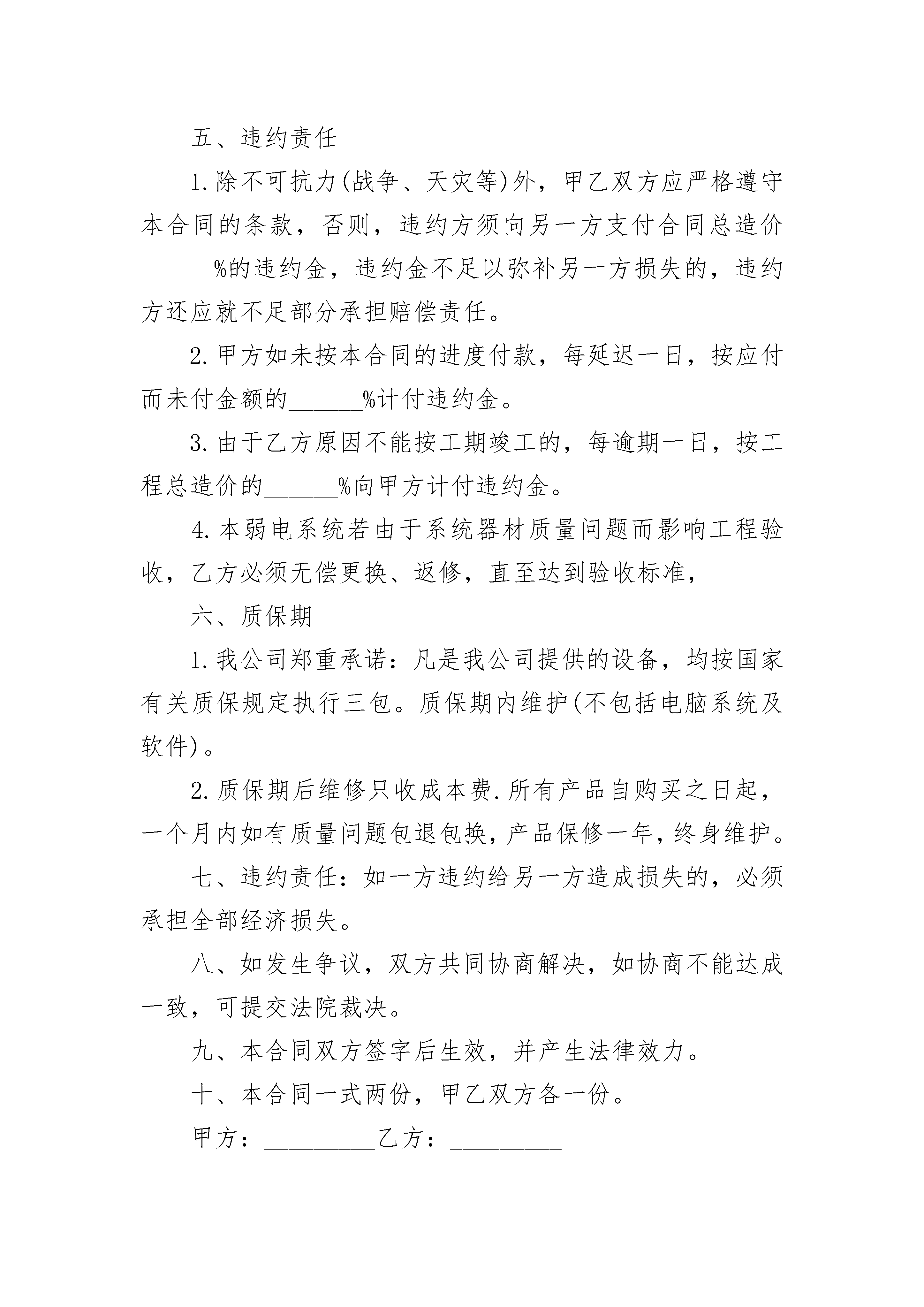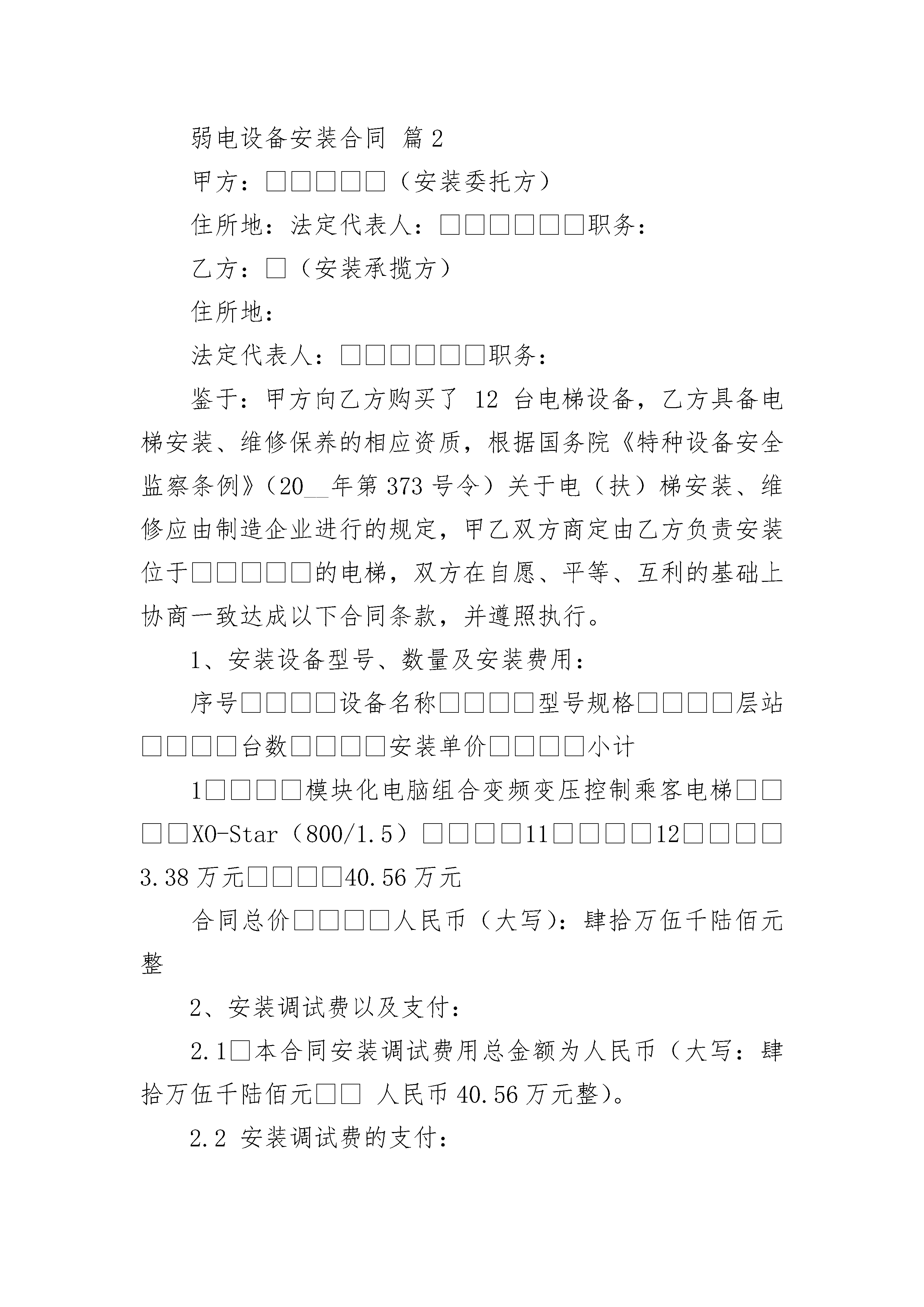 弱电设备安装合同弱电设备安装合同(精选23篇)弱电设备安装合同篇1发包方(简称甲方):_________承包方(简称乙方):_________经甲、乙双方共同商定,乙方承接甲方电视监控系统,LED彩屏系统。根据《中华人民共和国民法典》、《安装工程承包合同条例》及《价格法》和建设部的有关文件精神,为保护双方的民法典权益,在平等、自愿,结合本工程的具体情况下,双方达成如下协议:一、甲方向乙方购买的一切设备,具体项目、材料、型号、规格和厂家,详见合同附件《设备报价单》及产品清单。二、本合同设备及安装总金额大写______元整(¥______元)整。三、验收及付款方式:自合同签订之日起,甲方预付乙方设备款的,作为预付款,待安装调试按品牌审计验收完毕后天内付清合同款余款。乙方承诺天内开工,天内全部工程结束。甲方保证在工程安装调试过程中给予乙方必要的合作。如因甲方因素造成的质量及延期等问题的排除费用由甲方承担。乙方派技术人员指导安装并负责全部设备的调试四、双方责任(一)甲方责任:1.审核乙方提供的设计方案、安装施工方案,在收到后的5日内完成。向乙方提供必要的场地及施工用电及相应的施工环境。2.按工程进度向乙方支付工程款。3.委派为现场管理代表,监督、检查工程质量、进度。处理并协调甲乙双方在施工中发生的有关事宜。4.在乙方供货后,甲方可以组织人员对器材进行验收。5.组织对工程进行竣工验收和办理竣工结算。6.乙方施工途中,已施工部分如甲方提出改动,所产生的费用由甲方负责。(二)乙方责任:1.按施工安全规范做好施工质量、安全管理,凡施工期间发生的施工质量、安全事故(除不可抗力),均由乙方负责并报告甲方及有关部门。2.施工中因乙方责任造成的停工、返工、材料、器材损失等均由乙方承担。所有设备和器材验收前均由乙方妥善保管,如有损坏和遗失均由乙方负责。3.对竣工验收后保修期内发现的施工质量问题负责返修。4.对现场所有已完工的建筑及建筑装修、设备、器具有保护的责任,施工时如损坏甲方或住户财产,由乙方负责赔偿。5.遵守甲方有关场地管理的规定并办理有关的手续。五、违约责任1.除不可抗力(战争、天灾等)外,甲乙双方应严格遵守本合同的条款,否则,违约方须向另一方支付合同总造价______%的违约金,违约金不足以弥补另一方损失的,违约方还应就不足部分承担赔偿责任。2.甲方如未按本合同的进度付款,每延迟一日,按应付而未付金额的______%计付违约金。3.由于乙方原因不能按工期竣工的,每逾期一日,按工程总造价的______%向甲方计付违约金。4.本弱电系统若由于系统器材质量问题而影响工程验收,乙方必须无偿更换、返修,直至达到验收标准,六、质保期1.我公司郑重承诺:凡是我公司提供的设备,均按国家有关质保规定执行三包。质保期内维护(不包括电脑系统及软件)。2.质保期后维修只收成本费.所有产品自购买之日起,一个月内如有质量问题包退包换,产品保修一年,终身维护。七、违约责任:如一方违约给另一方造成损失的,必须承担全部经济损失。八、如发生争议,双方共同协商解决,如协商不能达成一致,可提交法院裁决。九、本合同双方签字后生效,并产生法律效力。十、本合同一式两份,甲乙双方各一份。甲方:_________乙方:_________弱电设备安装合同篇2甲方:(安装委托方)住所地:法定代表人:职务:乙方:(安装承揽方)住所地:法定代表人:职务:鉴于:甲方向乙方购买了12台电梯设备,乙方具备电梯安装、维修保养的相应资质,根据国务院《特种设备安全监察条例》(20__年第373号令)关于电(扶)梯安装、维修应由制造企业进行的规定,甲乙双方商定由乙方负责安装位于的电梯,双方在自愿、平等、互利的基础上协商一致达成以下合同条款,并遵照执行。1、安装设备型号、数量及安装费用:序号设备名称型号规格层站台数安装单价小计1模块化电脑组合变频变压控制乘客电梯XO-Star(800/1.5)11123.38万元40.56万元合同总价人民币(大写):肆拾万伍千陆佰元整2、安装调试费以及支付:2.1本合同安装调试费用总金额为人民币(大写:肆拾万伍千陆佰元人民币40.56万元整)。2.2安装调试费的支付:2.2.1甲方在双方约定的安装开工日期前7日,向乙方支付安装费的50%(其中20%作为定金),计人民币20.28万元(大写:贰拾万贰千捌佰元整)。如设备已经到达工地,且工地具备安装条件,乙方将在收到款后7天内进场安装。2.2.2电梯设备安装、调试完毕,并通过安装地电梯质检部门验收合格之日起7日内,甲方向乙方支付剩余安装费的50%,计人民币20.28万元