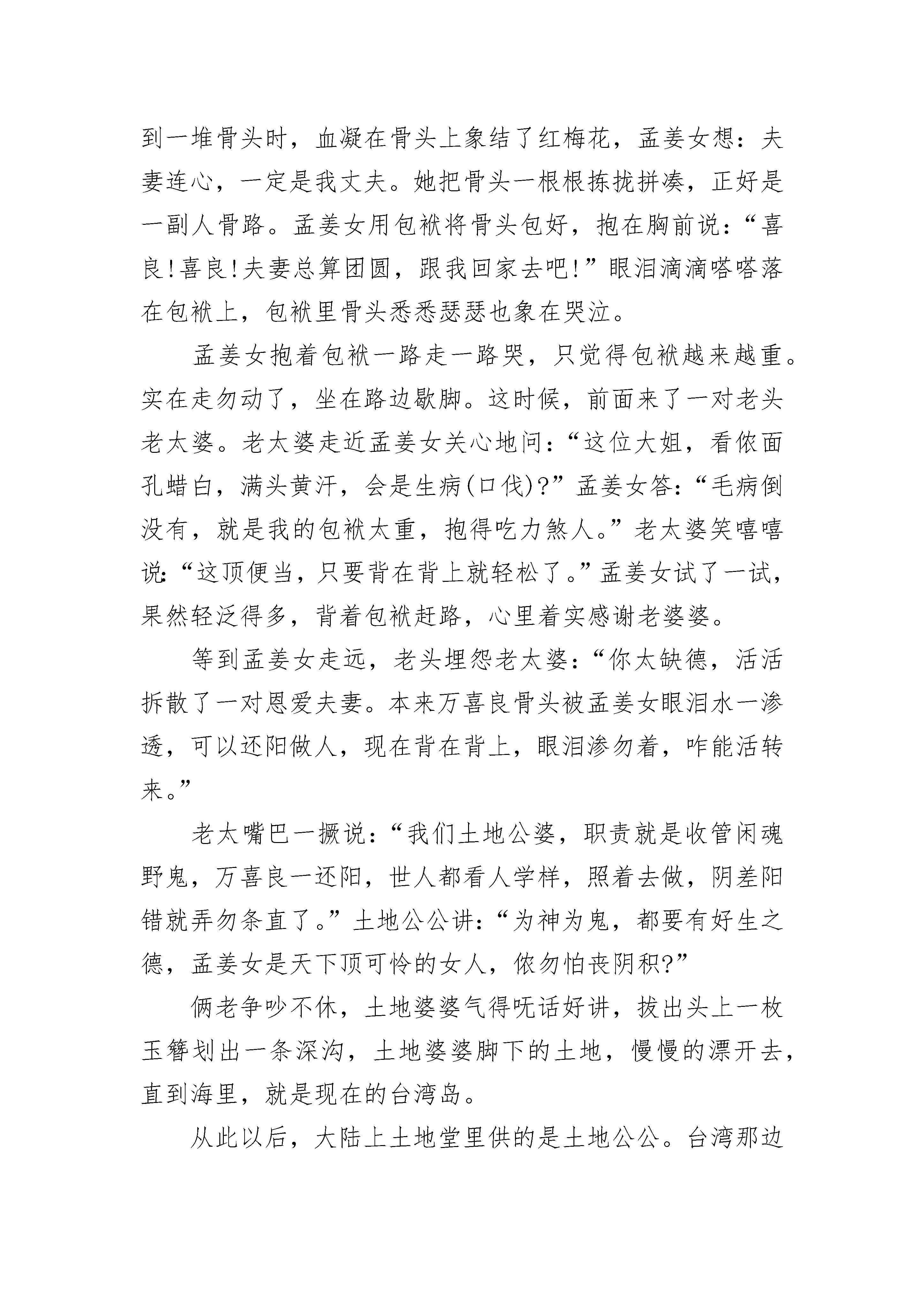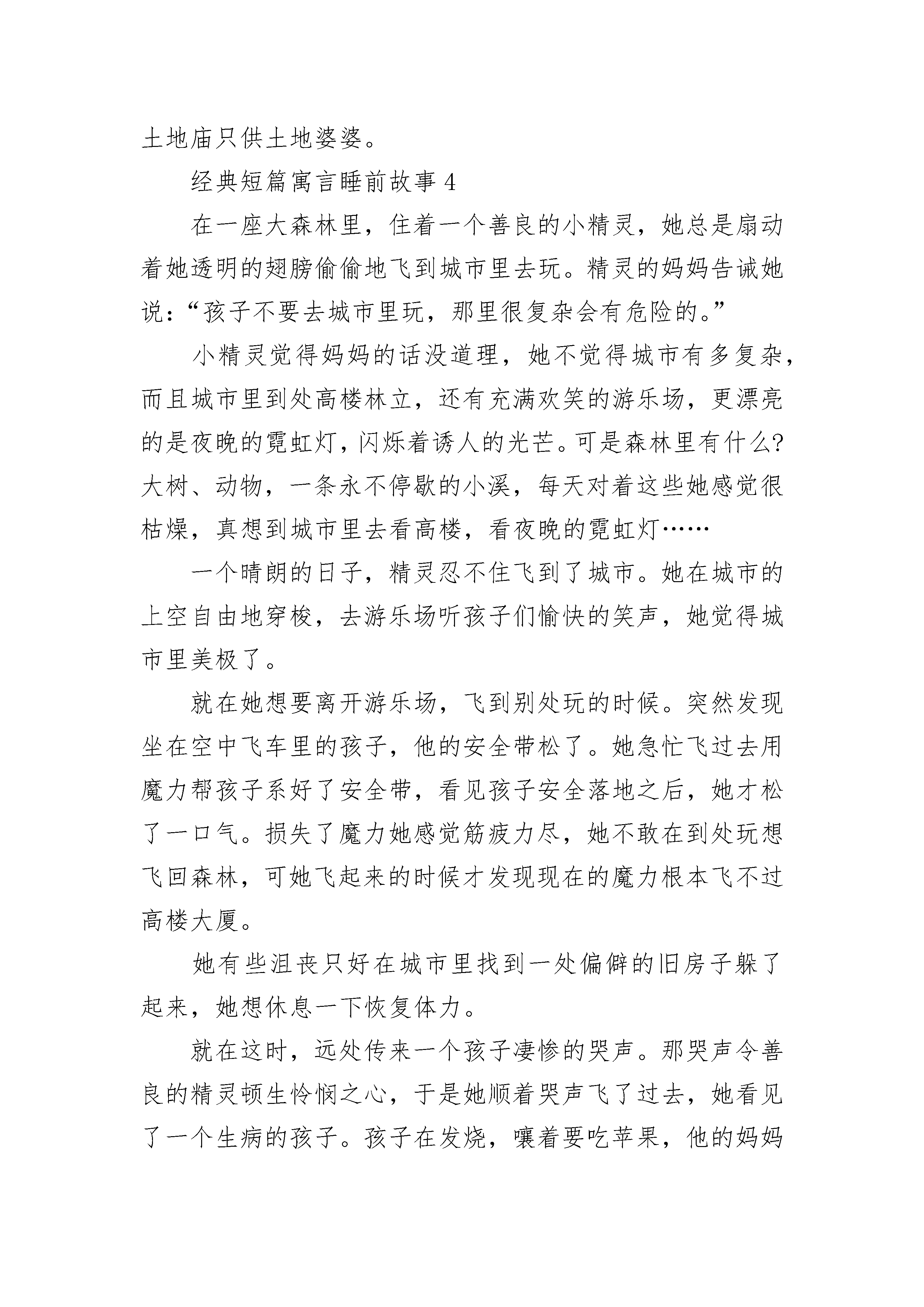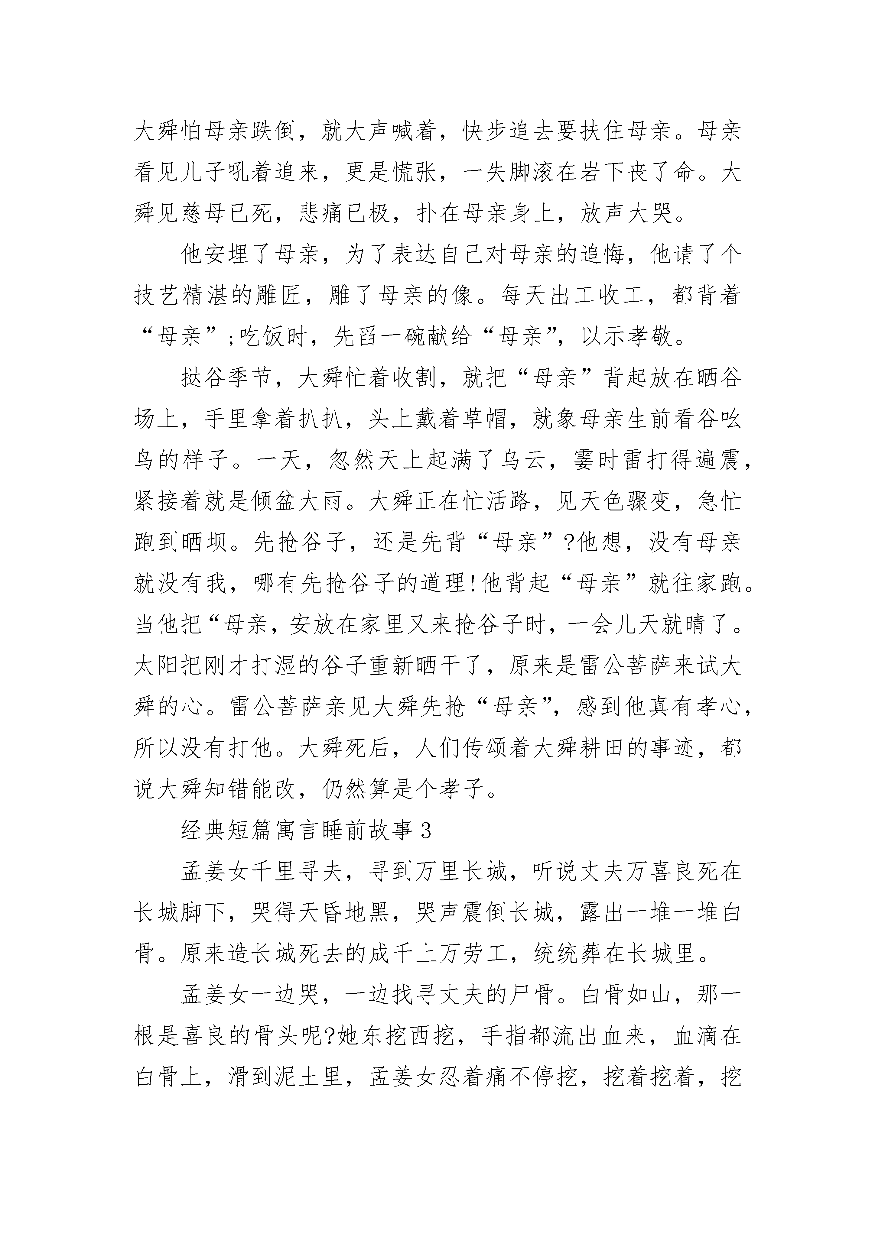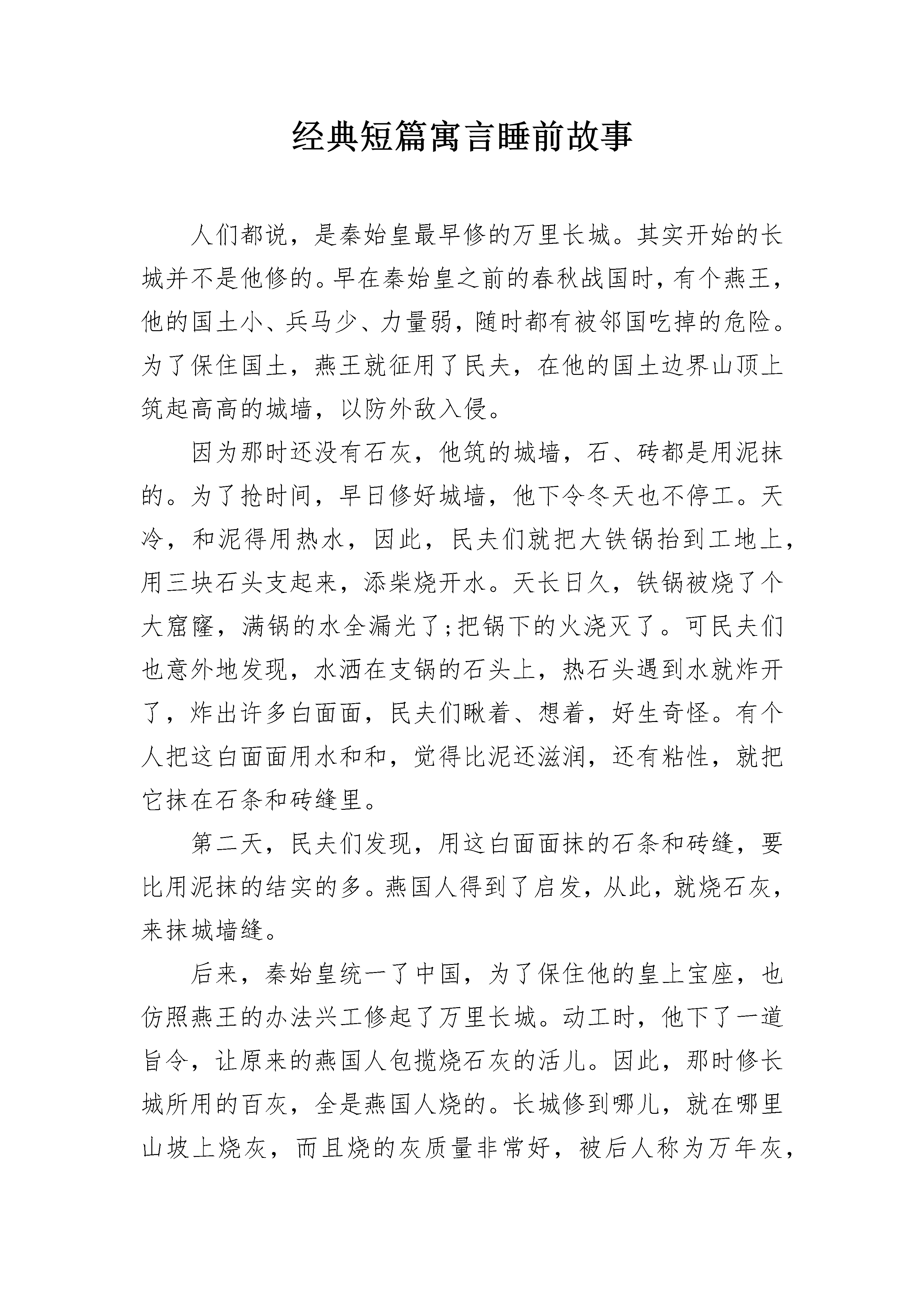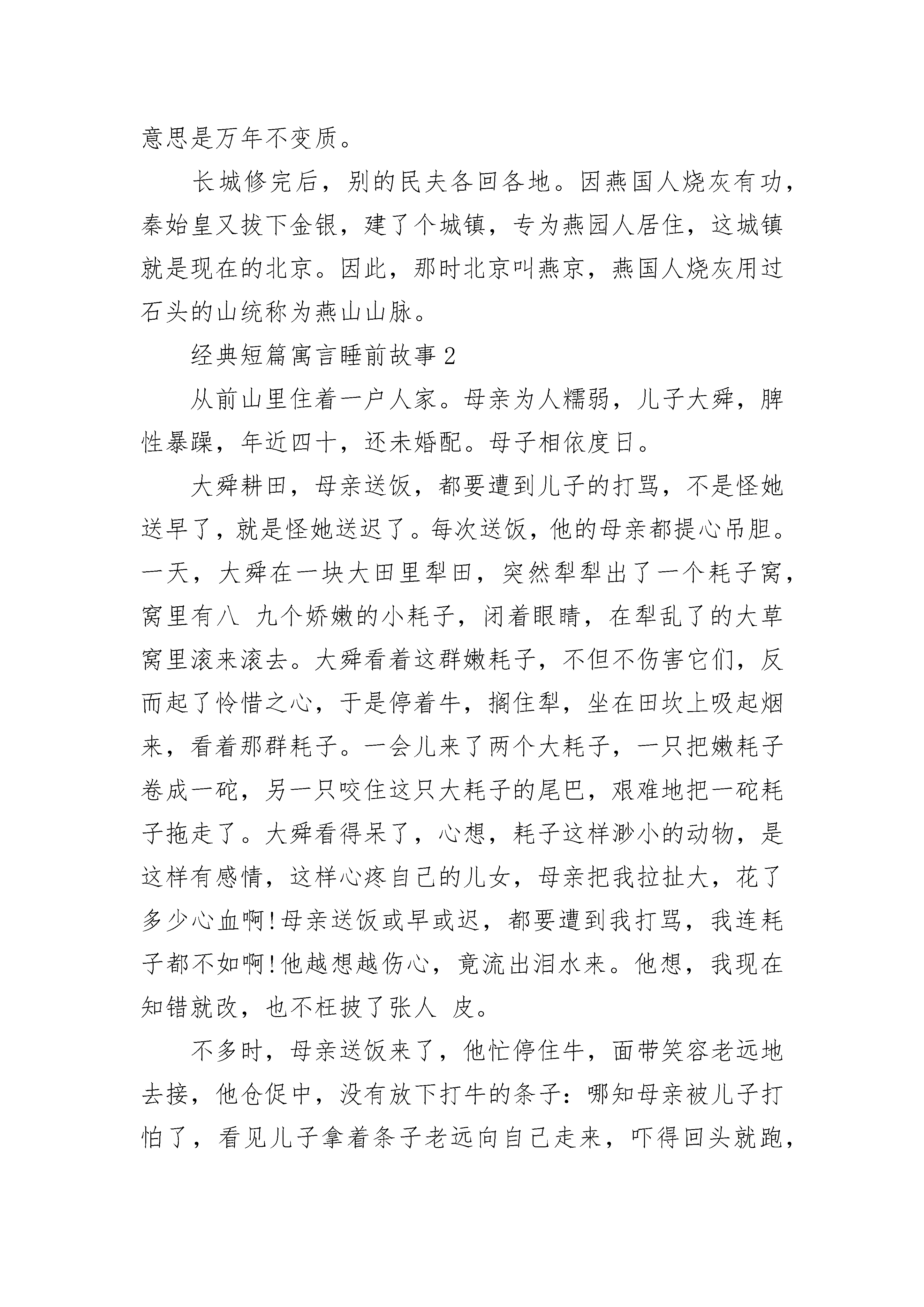 经典短篇寓言睡前故事人们都说,是秦始皇最早修的万里长城。其实开始的长城并不是他修的。早在秦始皇之前的春秋战国时,有个燕王,他的国土小、兵马少、力量弱,随时都有被邻国吃掉的危险。为了保住国土,燕王就征用了民夫,在他的国土边界山顶上筑起高高的城墙,以防外敌入侵。因为那时还没有石灰,他筑的城墙,石、砖都是用泥抹的。为了抢时间,早日修好城墙,他下令冬天也不停工。天冷,和泥得用热水,因此,民夫们就把大铁锅抬到工地上,用三块石头支起来,添柴烧开水。天长日久,铁锅被烧了个大窟窿,满锅的水全漏光了;把锅下的火浇灭了。可民夫们也意外地发现,水洒在支锅的石头上,热石头遇到水就炸开了,炸出许多白面面,民夫们瞅着、想着,好生奇怪。有个人把这白面面用水和和,觉得比泥还滋润,还有粘性,就把它抹在石条和砖缝里。第二天,民夫们发现,用这白面面抹的石条和砖缝,要比用泥抹的结实的多。燕国人得到了启发,从此,就烧石灰,来抹城墙缝。后来,秦始皇统一了中国,为了保住他的皇上宝座,也仿照燕王的办法兴工修起了万里长城。动工时,他下了一道旨令,让原来的燕国人包揽烧石灰的活儿。因此,那时修长城所用的百灰,全是燕国人烧的。长城修到哪儿,就在哪里山坡上烧灰,而且烧的灰质量非常好,被后人称为万年灰,意思是万年不变质。长城修完后,别的民夫各回各地。因燕国人烧灰有功,秦始皇又拔下金银,建了个城镇,专为燕园人居住,这城镇就是现在的北京。因此,那时北京叫燕京,燕国人烧灰用过石头的山统称为燕山山脉。经典短篇寓言睡前故事2从前山里住着一户人家。母亲为人糯弱,儿子大舜,脾性暴躁,年近四十,还未婚配。母子相依度日。大舜耕田,母亲送饭,都要遭到儿子的打骂,不是怪她送早了,就是怪她送迟了。每次送饭,他的母亲都提心吊胆。一天,大舜在一块大田里犁田,突然犁犁出了一个耗子窝,窝里有八九个娇嫩的小耗子,闭着眼睛,在犁乱了的大草窝里滚来滚去。大舜看着这群嫩耗子,不但不伤害它们,反而起了怜惜之心,于是停着牛,搁住犁,坐在田坎上吸起烟来,看着那群耗子。一会儿来了两个大耗子,一只把嫩耗子卷成一砣,另一只咬住这只大耗子的尾巴,艰难地把一砣耗子拖走了。大舜看得呆了,心想,耗子这样渺小的动物,是这样有感情,这样心疼自己的儿女,母亲把我拉扯大,花了多少心血啊!母亲送饭或早或迟,都要遭到我打骂,我连耗子都不如啊!他越想越伤心,竟流出泪水来。他想,我现在知错就改,也不枉披了张人皮。不多时,母亲送饭来了,他忙停住牛,面带笑容老远地去接,他仓促中,没有放下打牛的条子:哪知母亲被儿子打怕了,看见儿子拿着条子老远向自己走来,吓得回头就跑,大舜怕母亲跌倒,就大声喊着,快步追去要扶住母亲。母亲看见儿子吼着追来,更是慌张,一失脚滚在岩下丧了命。大舜见慈母已死,悲痛已极,扑在母亲身上,放声大哭。他安埋了母亲,为了表达自己对母亲的追悔,他请了个技艺精湛的雕匠,雕了母亲的像。每天出工收工,都背着“母亲”;吃饭时,先舀一碗献给“母亲”,以示孝敬。挞谷季节,大舜忙着收割,就把“母亲”背起放在晒谷场上,手里拿着扒扒,头上戴着草帽,就象母亲生前看谷吆鸟的样子。一天,忽然天上起满了乌云,霎时雷打得遍震,紧接着就是倾盆大雨。大舜正在忙活路,见天色骤变,急忙跑到晒坝。先抢谷子,还是先背“母亲”?他想,没有母亲就没有我,哪有先抢谷子的道理!他背起“母亲”就往家跑。当他把“母亲,安放在家里又来抢谷子时,一会儿天就晴了。太阳把刚才打湿的谷子重新晒干了,原来是雷公菩萨来试大舜的心。雷公菩萨亲见大舜先抢“母亲”,感到他真有孝心,所以没有打他。大舜死后,人们传颂着大舜耕田的事迹,都说大舜知错能改,仍然算是个孝子。经典短篇寓言睡前故事3孟姜女千里寻夫,寻到万里长城,听说丈夫万喜良死在长城脚下,哭得天昏地黑,哭声震倒长城,露出一堆一堆白骨。原来造长城死去的成千上万劳工,统统葬在长城里。孟姜女一边哭,一边找寻丈夫的尸骨。白骨如山,那一根是喜良的骨头呢?她东挖西挖,手指都流出血来,血滴在白骨上,滑到泥土里,孟姜女忍着痛不停挖,挖着挖着,挖到一堆骨头时,血凝在骨头上象结了红梅花,孟姜女想:夫妻连心,一定是我丈夫。她把骨头一根根拣拢拼凑,正好是一副人骨路。孟姜女用包袱将骨头包好,抱在胸前说:“喜良!喜良!夫妻总算团圆,跟我回家去吧!”眼泪滴滴嗒嗒落在包袱上,包袱里骨头悉悉瑟瑟也象在哭泣。孟姜女抱着包袱一路走一路哭,只觉得包袱越来越重。实在走勿动了,坐在路边歇脚。这时候,前面来了一对老头老太婆。老太婆走近孟姜女关心地问:“这位大姐,看侬面孔蜡白,满头黄汗,会是生病(口伐)?”孟姜女答:“毛病倒没有,就是我的包袱太重,抱得吃力煞人。”老太婆笑嘻嘻说:“这顶便当,只要背在背上就轻松了。”孟姜女试了一试,果然轻泛得多,背着包袱赶路,心里着实感谢老婆婆。等到孟姜女走远,老头埋怨老太婆:“你太