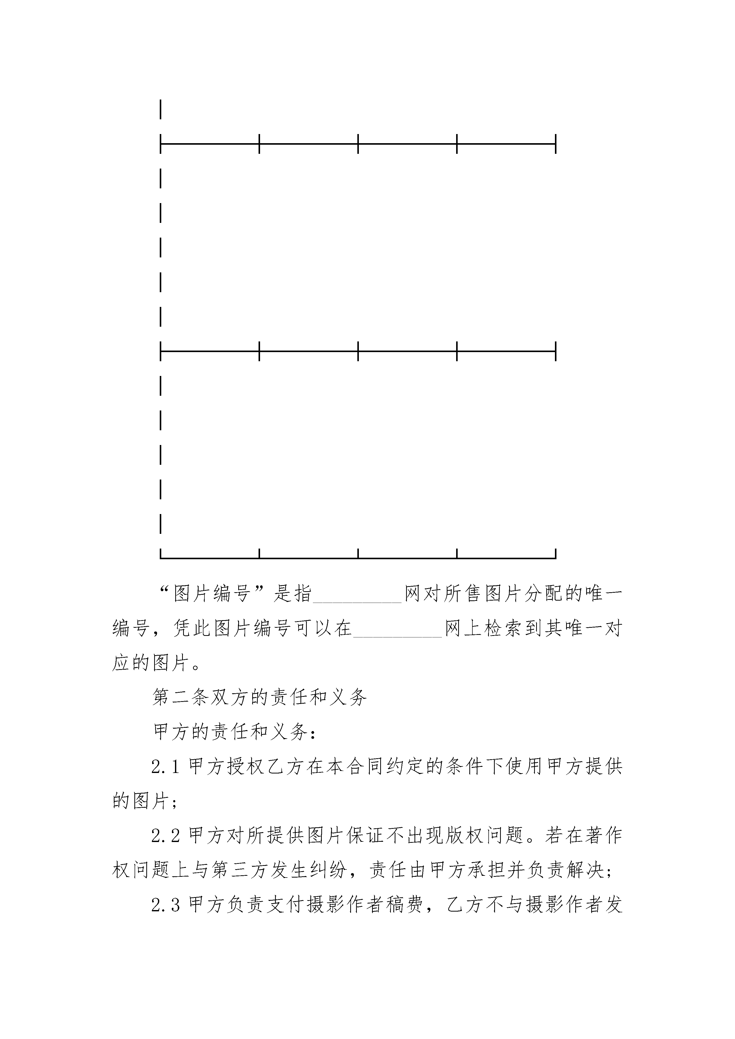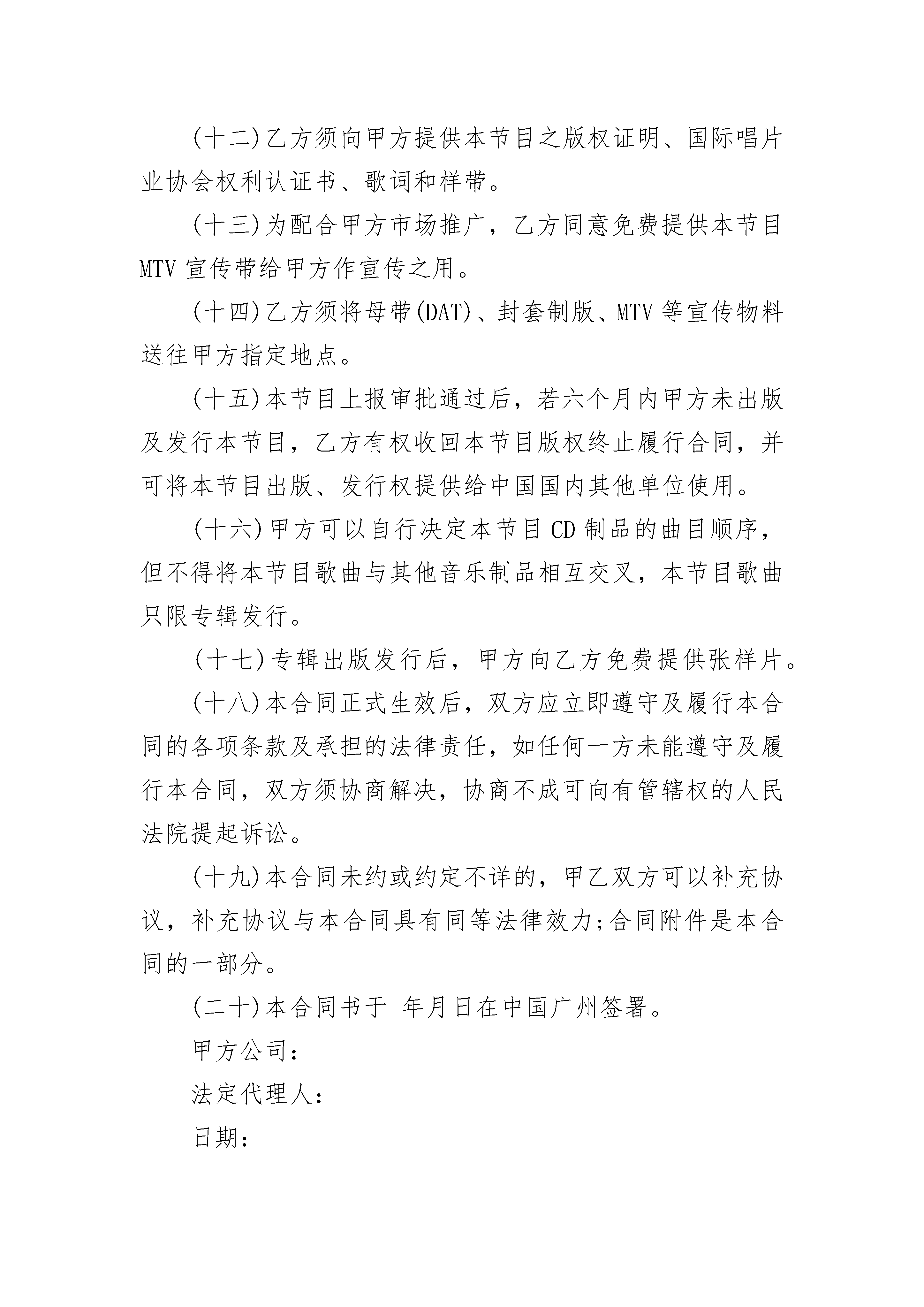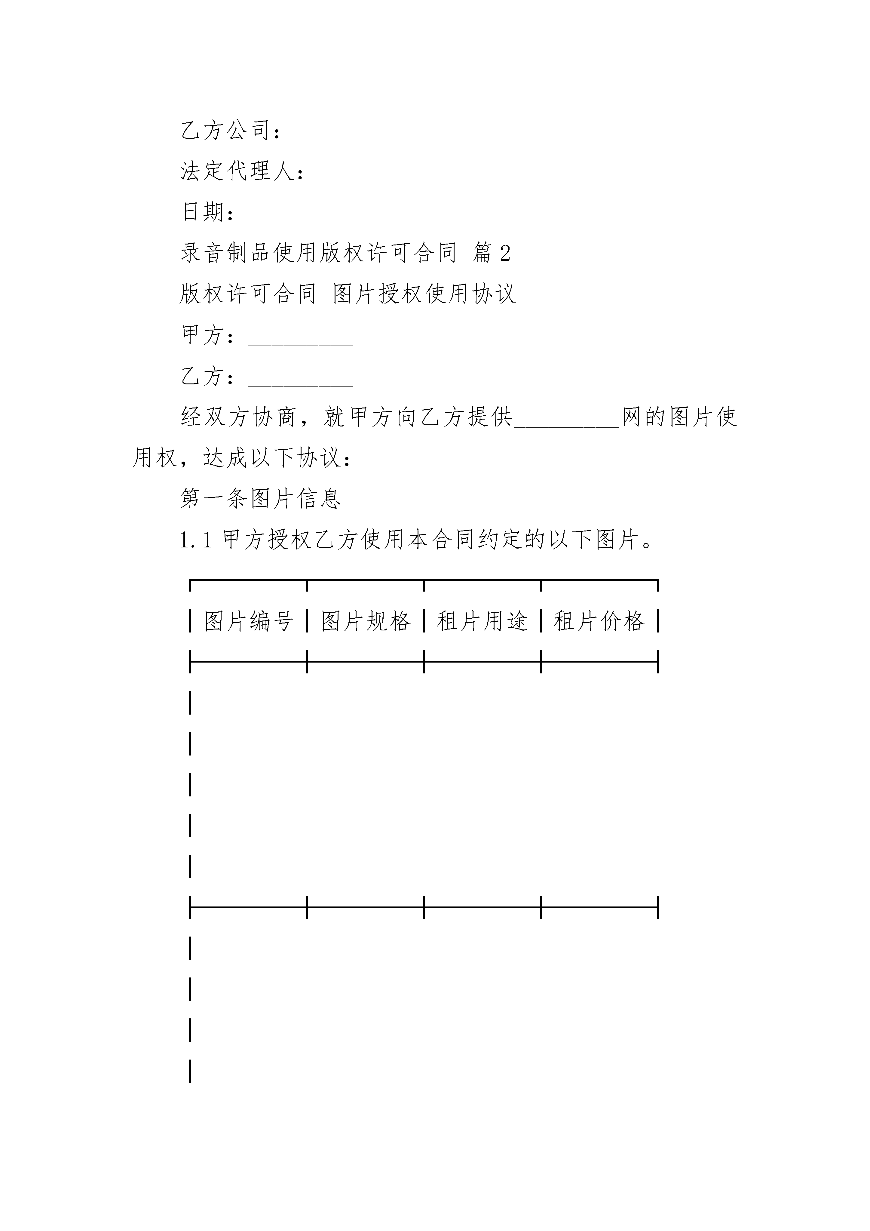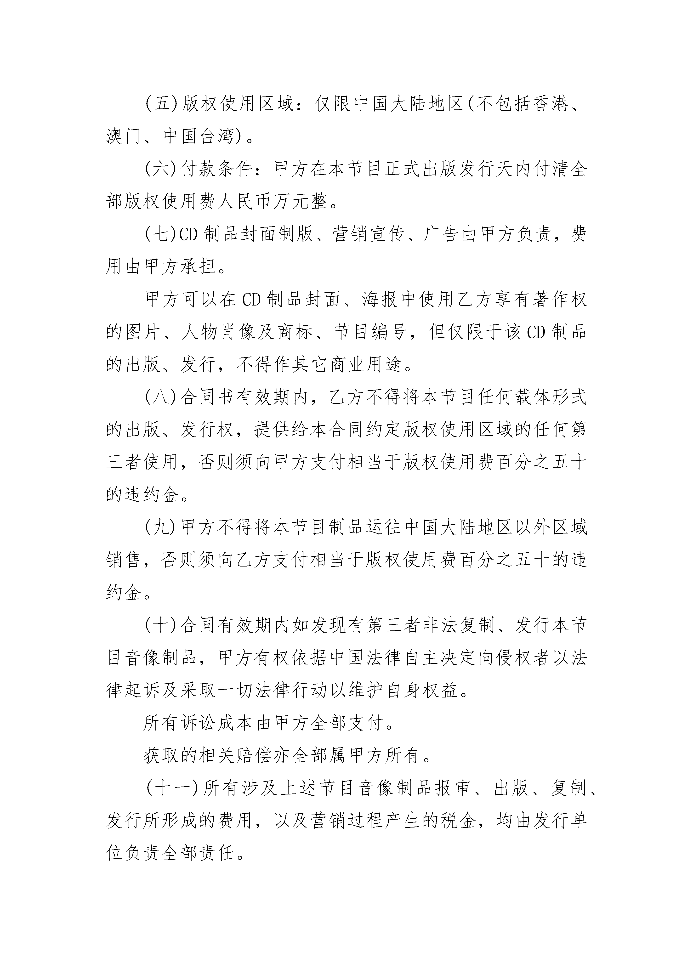 录音制品使用版权许可合同录音制品使用版权许可合同(精选24篇)录音制品使用版权许可合同篇1甲方:地址:电话:电话:传真:邮编:乙方:地址:电话:电话:传真:邮编:甲乙双方经平等协商,就乙方许可甲方使用录音制品(见合同附件)事宜达成如下协议:(—)乙方同意甲方使用乙方拥有版权的录音制品,在中国大陆地区独家出版、发行该录音制品的音像制品,出版物载体为CD;(二)版权使用期限为年,自甲方取得出版、发行以上节目的行政批文起算。年期内,乙方转让以上节目版权应当通知甲方,甲方在同等条件下享有优先购买的权利;甲方未取得乙方同意不得将以上音像制品的出版、发行权转让给第三人。(三)年使用期限届满后,甲方对上述音像制品的出版、发行权即终止。乙方同意延长甲方销售存货期为使用期限届满后的个月。个月时限届满后,甲方须停止销售上述音像制品,但已经进入市场流通的上述音像制品不视为甲方发行行为。(四)双方商定本节目CD制品发行基数为万张,版权使用费为人民币元整/张,合计人民币万元整。(五)版权使用区域:仅限中国大陆地区(不包括香港、澳门、中国台湾)。(六)付款条件:甲方在本节目正式出版发行天内付清全部版权使用费人民币万元整。(七)CD制品封面制版、营销宣传、广告由甲方负责,费用由甲方承担。甲方可以在CD制品封面、海报中使用乙方享有著作权的图片、人物肖像及商标、节目编号,但仅限于该CD制品的出版、发行,不得作其它商业用途。(八)合同书有效期内,乙方不得将本节目任何载体形式的出版、发行权,提供给本合同约定版权使用区域的任何第三者使用,否则须向甲方支付相当于版权使用费百分之五十的违约金。(九)甲方不得将本节目制品运往中国大陆地区以外区域销售,否则须向乙方支付相当于版权使用费百分之五十的违约金。(十)合同有效期内如发现有第三者非法复制、发行本节目音像制品,甲方有权依据中国法律自主决定向侵权者以法律起诉及采取一切法律行动以维护自身权益。所有诉讼成本由甲方全部支付。获取的相关赔偿亦全部属甲方所有。(十一)所有涉及上述节目音像制品报审、出版、复制、发行所形成的费用,以及营销过程产生的税金,均由发行单位负责全部责任。(十二)乙方须向甲方提供本节目之版权证明、国际唱片业协会权利认证书、歌词和样带。(十三)为配合甲方市场推广,乙方同意免费提供本节目MTV宣传带给甲方作宣传之用。(十四)乙方须将母带(DAT)、封套制版、MTV等宣传物料送往甲方指定地点。(十五)本节目上报审批通过后,若六个月内甲方未出版及发行本节目,乙方有权收回本节目版权终止履行合同,并可将本节目出版、发行权提供给中国国内其他单位使用。(十六)甲方可以自行决定本节目CD制品的曲目顺序,但不得将本节目歌曲与其他音乐制品相互交叉,本节目歌曲只限专辑发行。(十七)专辑出版发行后,甲方向乙方免费提供张样片。(十八)本合同正式生效后,双方应立即遵守及履行本合同的各项条款及承担的法律责任,如任何一方未能遵守及履行本合同,双方须协商解决,协商不成可向有管辖权的人民法院提起诉讼。(十九)本合同未约或约定不详的,甲乙双方可以补充协议,补充协议与本合同具有同等法律效力;合同附件是本合同的一部分。(二十)本合同书于年月日在中国广州签署。甲方公司:法定代理人:日期:乙方公司:法定代理人:日期:录音制品使用版权许可合同篇2版权许可合同图片授权使用协议甲方:_________乙方:_________经双方协商,就甲方向乙方提供_________网的图片使用权,达成以下协议:第一条图片信息1.1甲方授权乙方使用本合同约定的以下图片。┌────┬────┬────┬────┐│图片编号│图片规格│租片用途│租片价格│├────┼────┼────┼────┤│││││├────┼────┼────┼────┤│││││├────┼────┼────┼────┤│││││├────┼────┼────┼────┤│││││└────┴────┴────┴────┘“图片编号”是指_________网对所售图片分配的唯一编号,凭此图片编号可以在_________网上检索到其唯一对应的图片。第二条双方的责任和义务甲方的责任和义务:2.1甲方授权乙方在本合同约定的条件下使用甲方提供的图片;2.2甲方对所提供图片保证不出现版权问题。若在著作权问题上与第三方发生纠纷,责任由甲方承担并负责解决;2.3甲方负责支付摄影作者稿费,乙方不与摄影作者发生稿费支付关系。乙方的责任和义务:2.4乙方承诺对甲方提供的图片仅限于合同约定的范围内使用,不得向第三方转供图片,否则向甲方支付租片价格的双倍违约金;2.5乙方将图片用于其他商业用途须经过甲方另行授权;2.6乙方使用甲方提供的图片为一次性使用,再次使用甲方图片须经另行授权;2.7乙方应将所使用图片的效果图,附印刷品