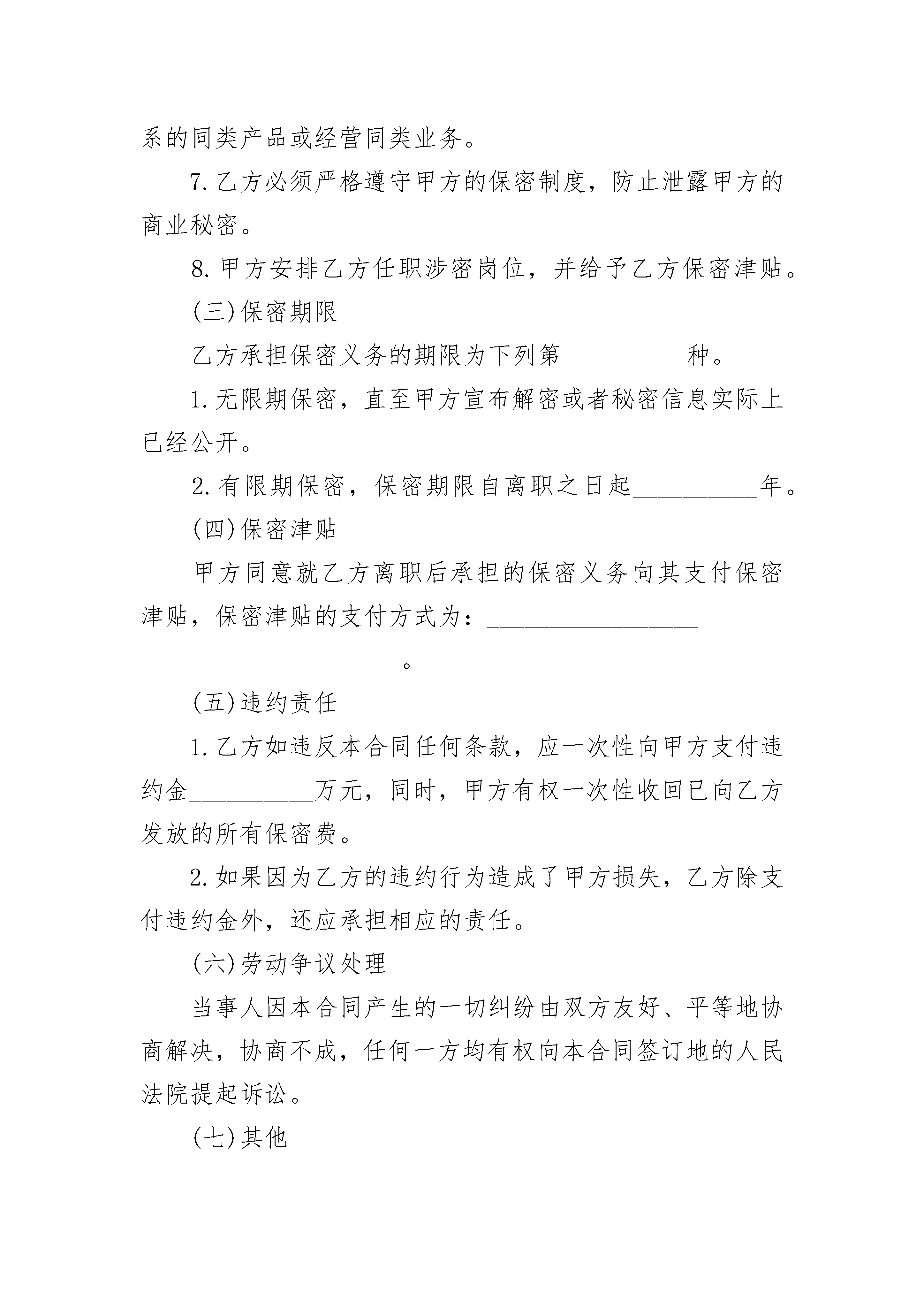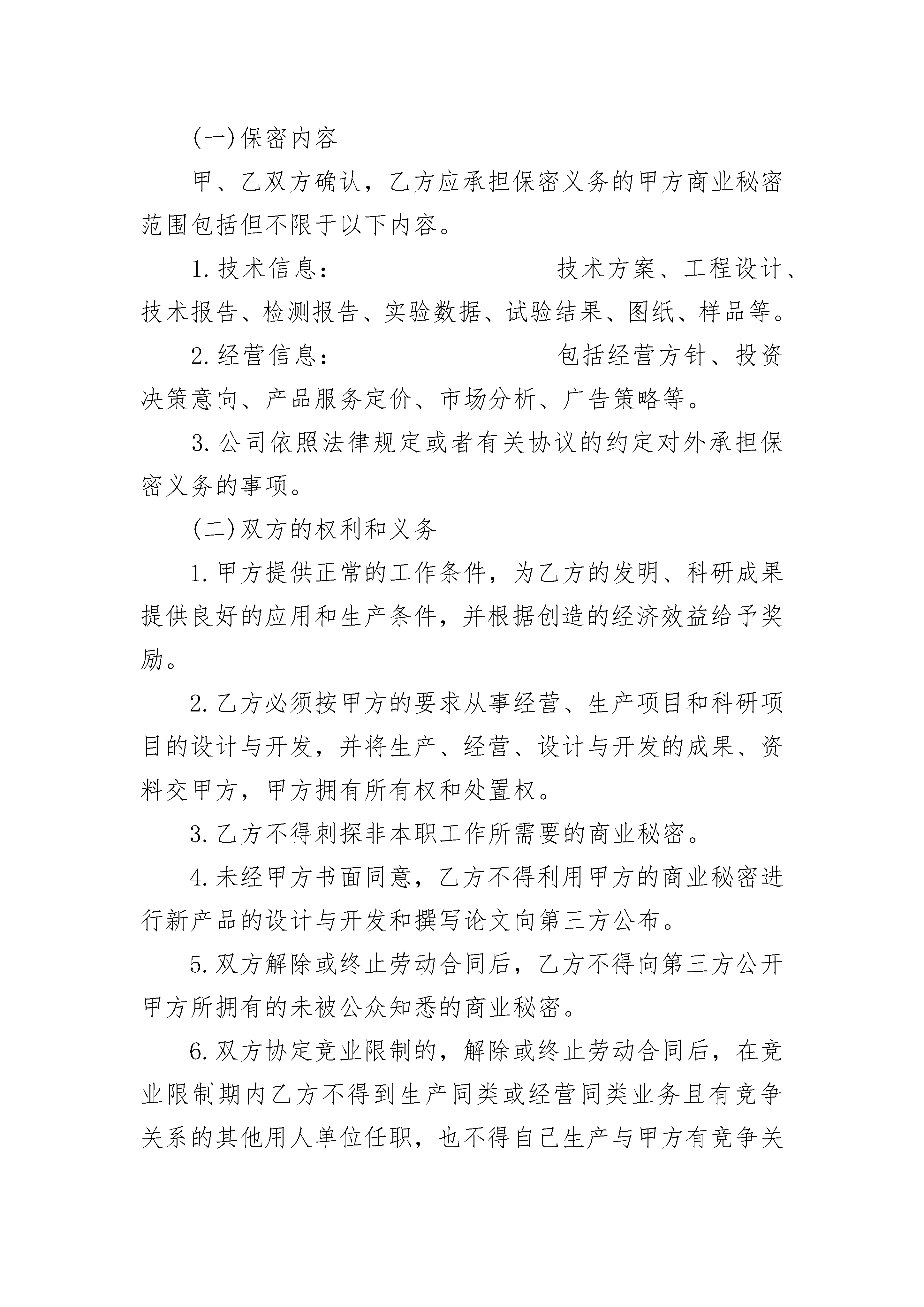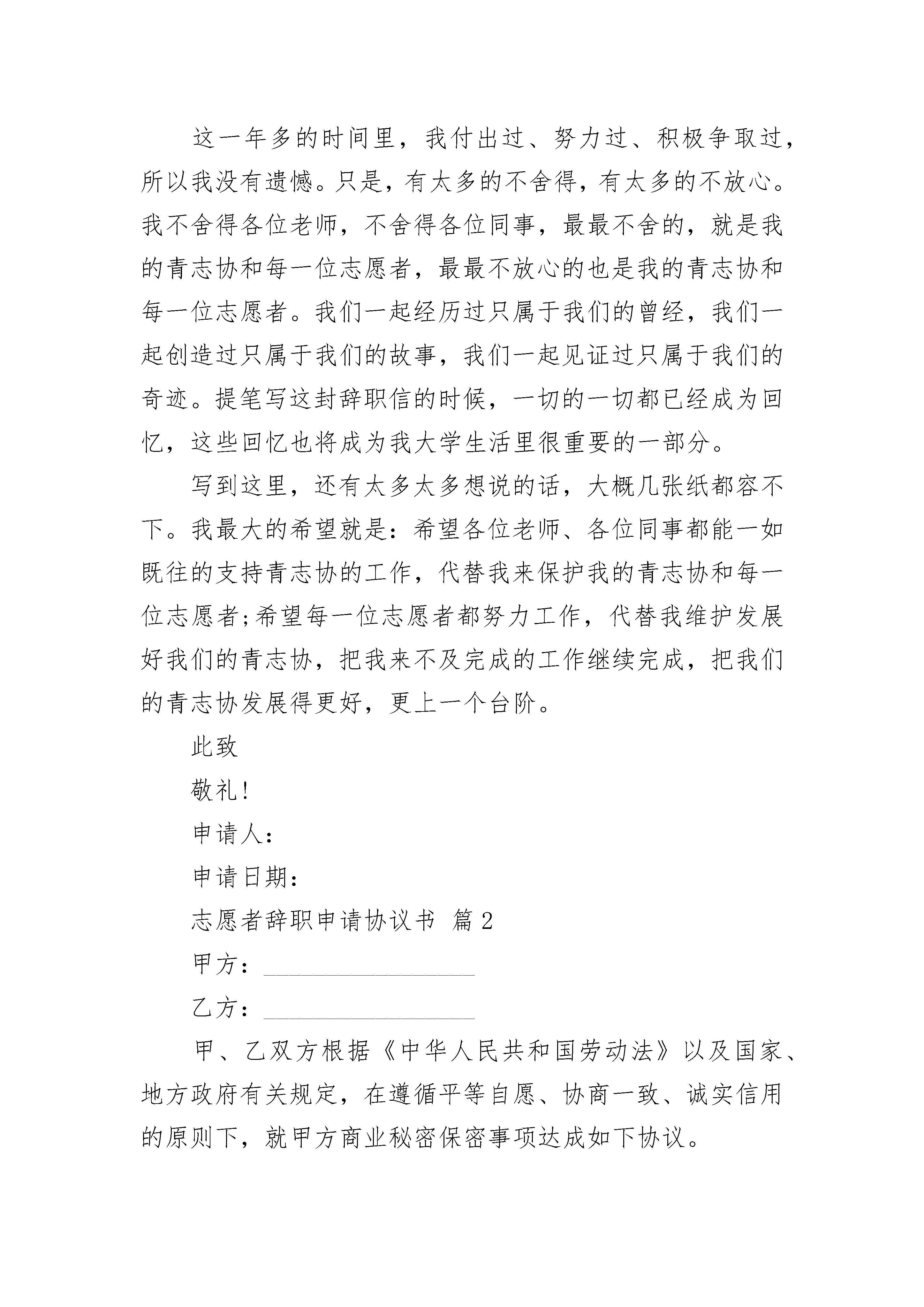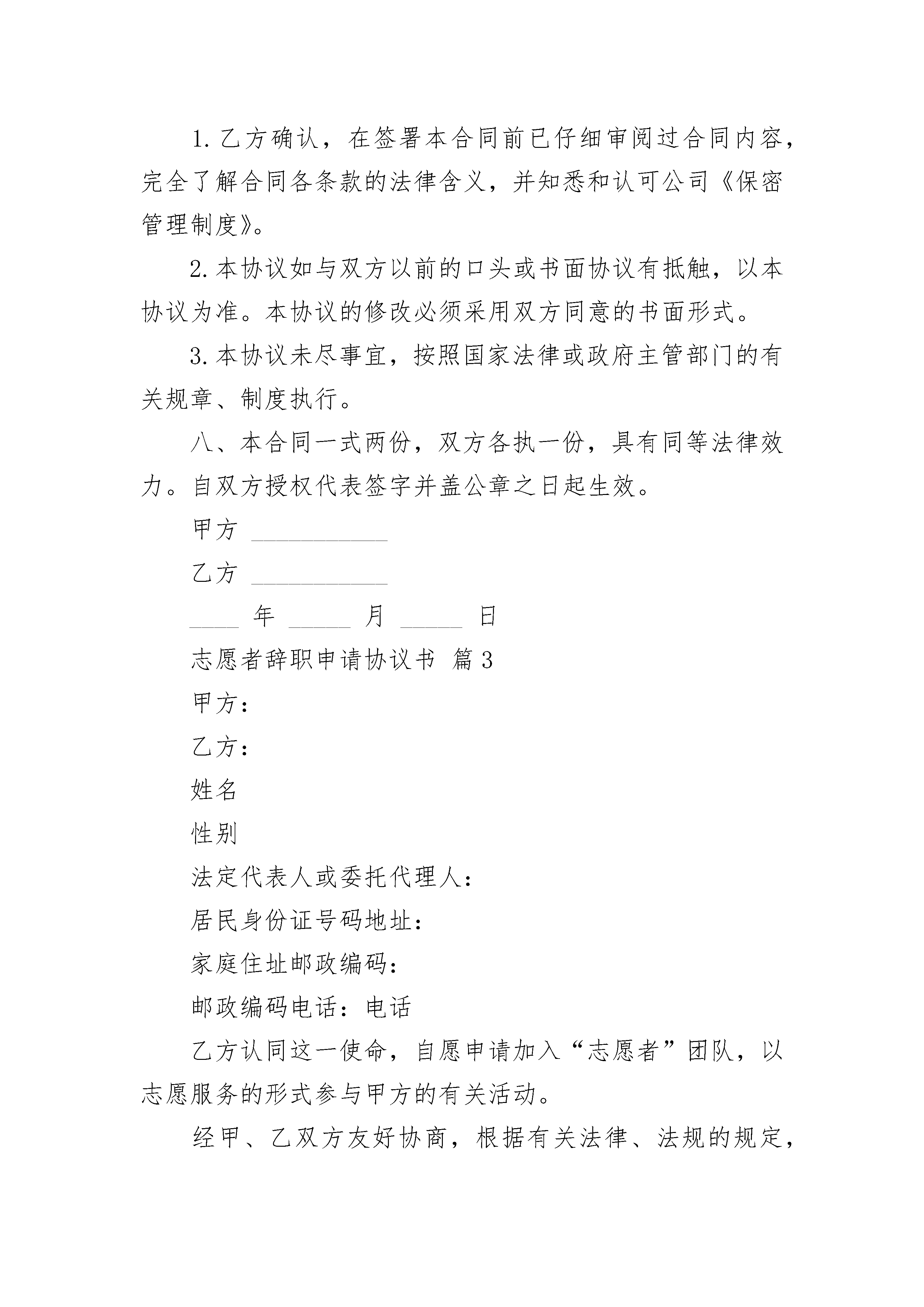 志愿者辞职申请协议书志愿者辞职申请协议书(精选3篇)志愿者辞职申请协议书篇1尊敬的团委老师:我是坚果云,现任学院团委社会实践与青年志愿者工作部副部长、西京学院青年志愿者协会会长职位。由于这学期学习任务加重,我没有太多的时间和精力可以投入到工作中,可能无法把工作做到至善至美,经再三考虑,我决定:辞去所任职位。从20年月份起,我开始接手青志协的组织管理工作,至今快一年的时间,在这个过程中,我哭过、笑过、失落过、欢喜过、委屈过、满足过,我学到了太多太多,也真的成长了。我要感谢各位老师,感谢各位老师对我生活工作上的支持和鼓励,感谢各位老师教会了我太多太多的东西;我要感谢各位同事,和他们在一起开会、讨论,是我工作中很精彩的一部分,从他们身上,我也学到了太多太多东西;我要感谢我们每一位志愿者,他们都是我的亲人、我的朋友、我的兄弟姐妹,他们善良、天真、可爱,有热情、有激情,充满活力。我远离家乡,是他们给了我太多温暖、太多亲情,他们包容我、体谅我、支持我、鼓励我,甚至像家人一样宠爱我,让我不孤单,让我充满力量。这一年多的时间里,我不免有的时候讲话或者行为不得当,有的时候犯点小错误,在这里,我向大家说声:对不起,请大家原谅。这一年多的时间里,我付出过、努力过、积极争取过,所以我没有遗憾。只是,有太多的不舍得,有太多的不放心。我不舍得各位老师,不舍得各位同事,最最不舍的,就是我的青志协和每一位志愿者,最最不放心的也是我的青志协和每一位志愿者。我们一起经历过只属于我们的曾经,我们一起创造过只属于我们的故事,我们一起见证过只属于我们的奇迹。提笔写这封辞职信的时候,一切的一切都已经成为回忆,这些回忆也将成为我大学生活里很重要的一部分。写到这里,还有太多太多想说的话,大概几张纸都容不下。我最大的希望就是:希望各位老师、各位同事都能一如既往的支持青志协的工作,代替我来保护我的青志协和每一位志愿者;希望每一位志愿者都努力工作,代替我维护发展好我们的青志协,把我来不及完成的工作继续完成,把我们的青志协发展得更好,更上一个台阶。此致敬礼!申请人:申请日期:志愿者辞职申请协议书篇2甲方:_________________乙方:_________________甲、乙双方根据《中华人民共和国劳动法》以及国家、地方政府有关规定,在遵循平等自愿、协商一致、诚实信用的原则下,就甲方商业秘密保密事项达成如下协议。(一)保密内容甲、乙双方确认,乙方应承担保密义务的甲方商业秘密范围包括但不限于以下内容。1.技术信息:_________________技术方案、工程设计、技术报告、检测报告、实验数据、试验结果、图纸、样品等。2.经营信息:_________________包括经营方针、投资决策意向、产品服务定价、市场分析、广告策略等。3.公司依照法律规定或者有关协议的约定对外承担保密义务的事项。(二)双方的权利和义务1.甲方提供正常的工作条件,为乙方的发明、科研成果提供良好的应用和生产条件,并根据创造的经济效益给予奖励。2.乙方必须按甲方的要求从事经营、生产项目和科研项目的设计与开发,并将生产、经营、设计与开发的成果、资料交甲方,甲方拥有所有权和处置权。3.乙方不得刺探非本职工作所需要的商业秘密。4.未经甲方书面同意,乙方不得利用甲方的商业秘密进行新产品的设计与开发和撰写论文向第三方公布。5.双方解除或终止劳动合同后,乙方不得向第三方公开甲方所拥有的未被公众知悉的商业秘密。6.双方协定竞业限制的,解除或终止劳动合同后,在竞业限制期内乙方不得到生产同类或经营同类业务且有竞争关系的其他用人单位任职,也不得自己生产与甲方有竞争关系的同类产品或经营同类业务。7.乙方必须严格遵守甲方的保密制度,防止泄露甲方的商业秘密。8.甲方安排乙方任职涉密岗位,并给予乙方保密津贴。(三)保密期限乙方承担保密义务的期限为下列第__________种。1.无限期保密,直至甲方宣布解密或者秘密信息实际上已经公开。2.有限期保密,保密期限自离职之日起__________年。(四)保密津贴甲方同意就乙方离职后承担的保密义务向其支付保密津贴,保密津贴的支付方式为:__________________________________。(五)违约责任1.乙方如违反本合同任何条款,应一次性向甲方支付违约金__________万元,同时,甲方有权一次性收回已向乙方发放的所有保密费。2.如果因为乙方的违约行为造成了甲方损失,乙方除支付违约金外,还应承担相应的责任。(六)劳动争议处理当事人因本合同产生的一切纠纷由双方友好、平等地协商解决,协商不成,任何一方均有权向本合同签订地的人民法院提起诉讼。(七)其他1.乙方确认,在签署本合同前已仔细审阅过合同内容,完全了解合同各条款的法律含义,并知悉和认可公司《保密管理制度》。2.本