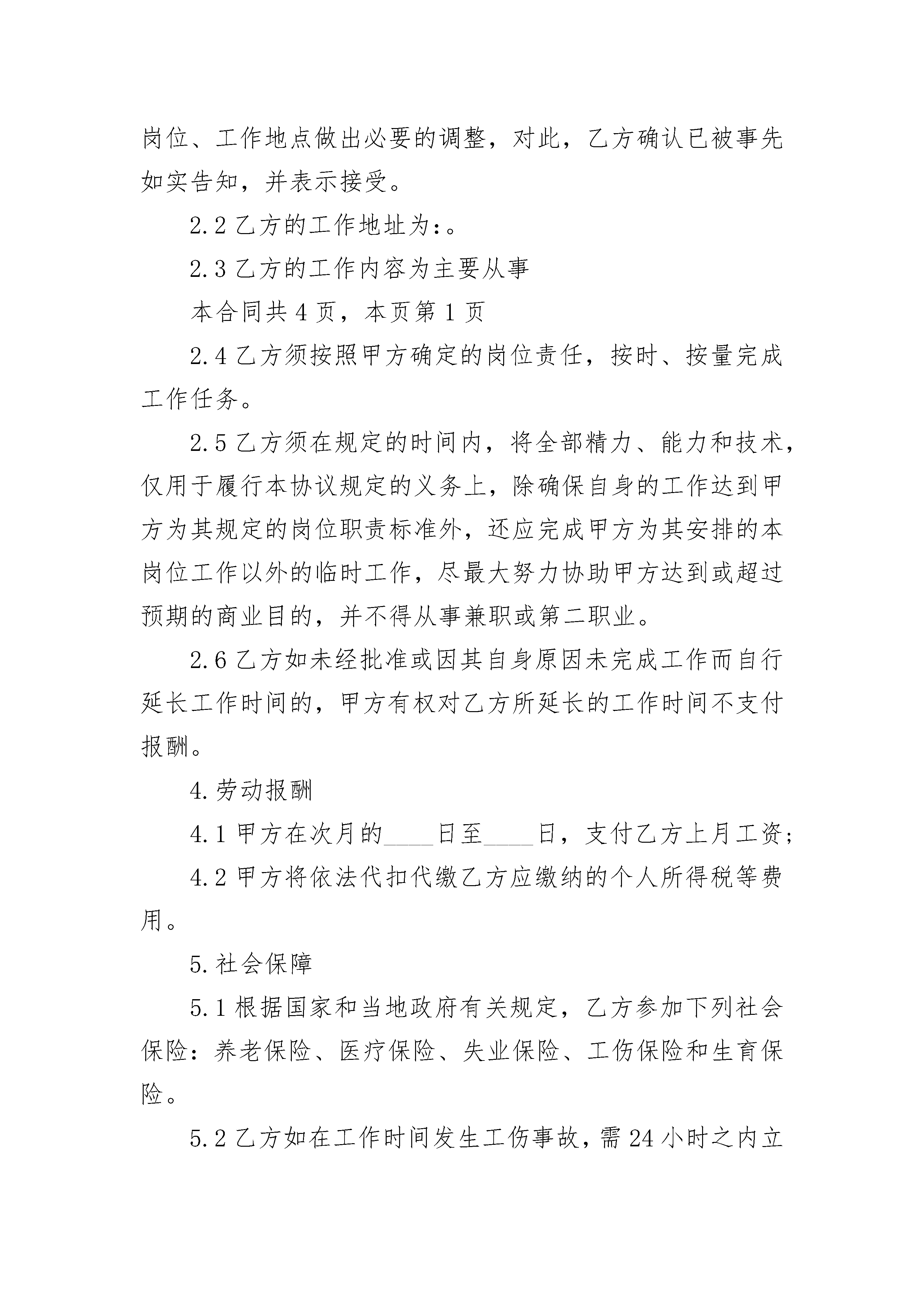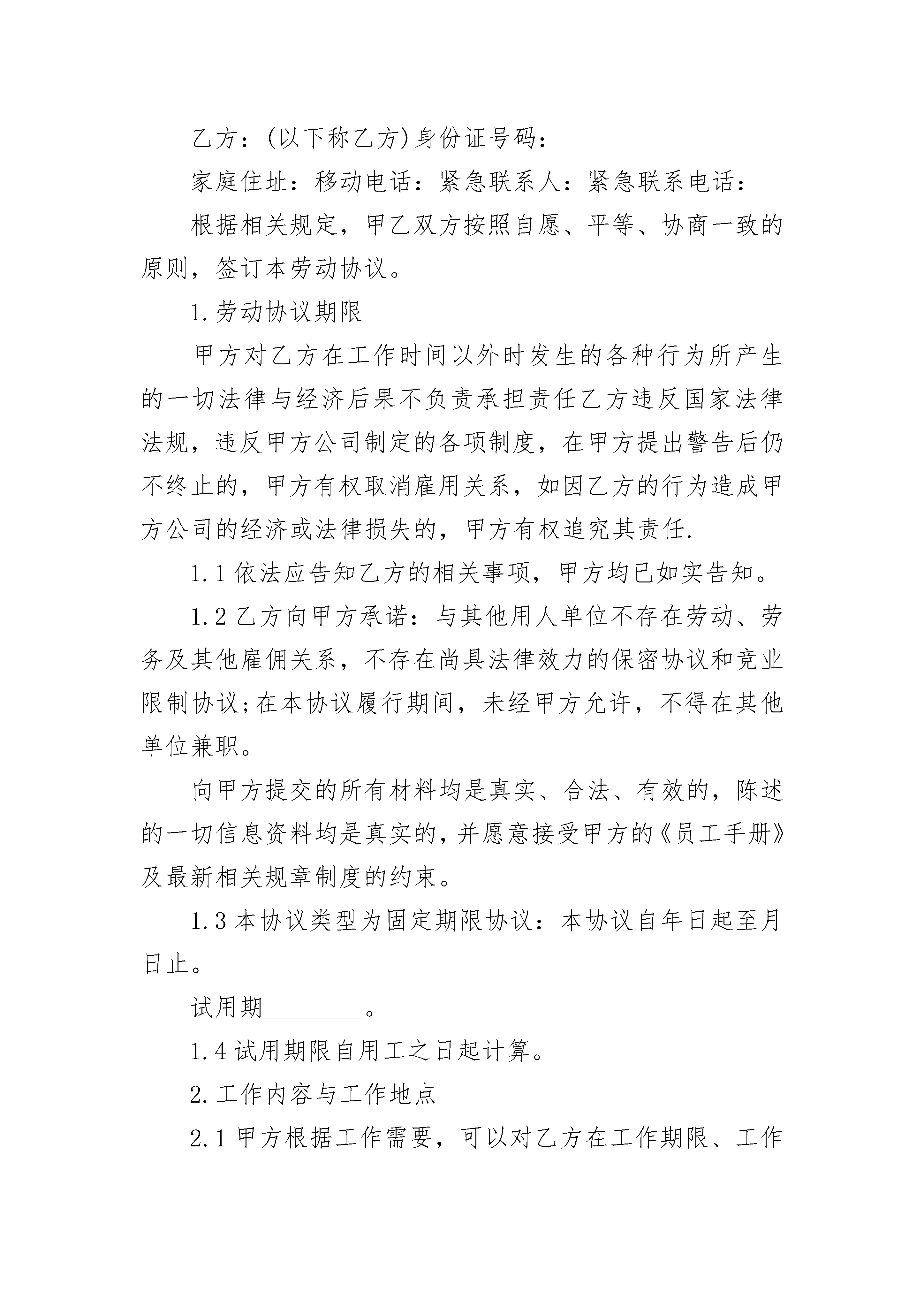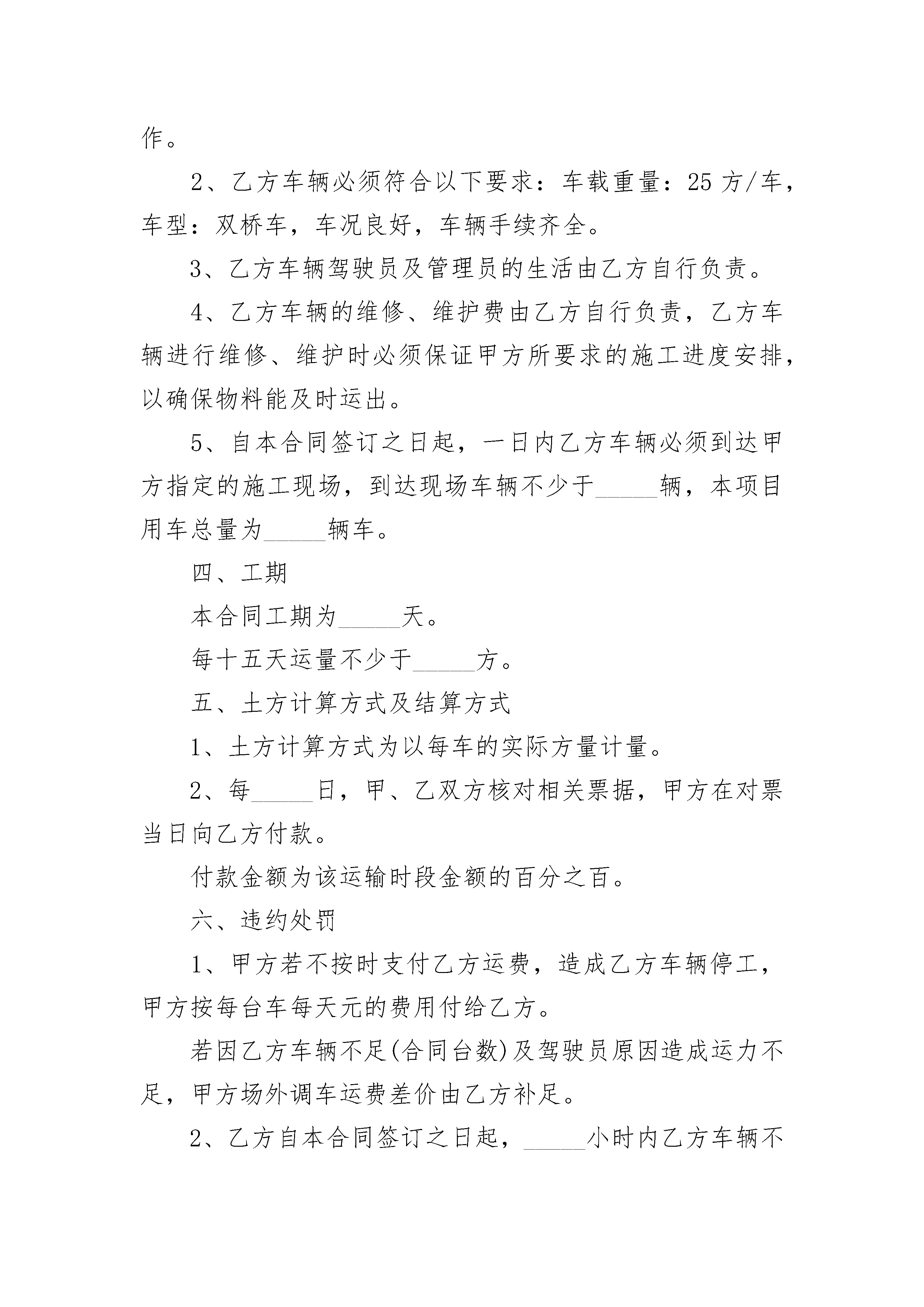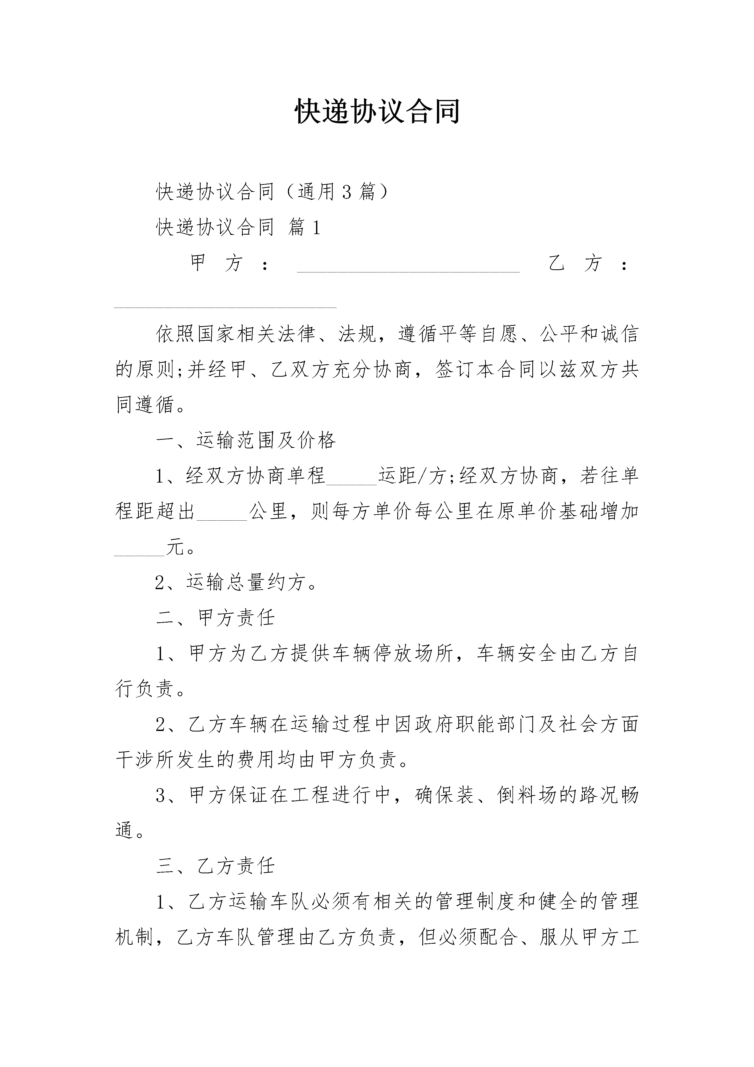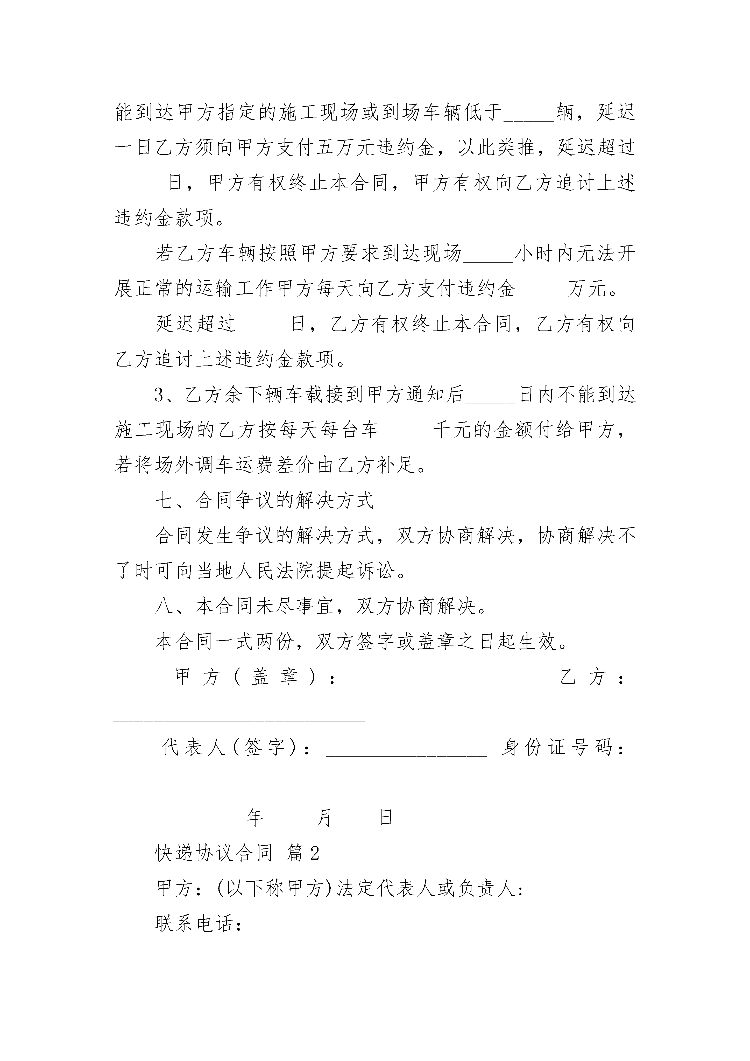 快递协议合同快递协议合同(通用3篇)快递协议合同篇1甲方:______________________乙方:______________________依照国家相关法律、法规,遵循平等自愿、公平和诚信的原则;并经甲、乙双方充分协商,签订本合同以兹双方共同遵循。一、运输范围及价格1、经双方协商单程_____运距/方;经双方协商,若往单程距超出_____公里,则每方单价每公里在原单价基础增加_____元。2、运输总量约方。二、甲方责任1、甲方为乙方提供车辆停放场所,车辆安全由乙方自行负责。2、乙方车辆在运输过程中因政府职能部门及社会方面干涉所发生的费用均由甲方负责。3、甲方保证在工程进行中,确保装、倒料场的路况畅通。三、乙方责任1、乙方运输车队必须有相关的管理制度和健全的管理机制,乙方车队管理由乙方负责,但必须配合、服从甲方工作。2、乙方车辆必须符合以下要求:车载重量:25方/车,车型:双桥车,车况良好,车辆手续齐全。3、乙方车辆驾驶员及管理员的生活由乙方自行负责。4、乙方车辆的维修、维护费由乙方自行负责,乙方车辆进行维修、维护时必须保证甲方所要求的施工进度安排,以确保物料能及时运出。5、自本合同签订之日起,一日内乙方车辆必须到达甲方指定的施工现场,到达现场车辆不少于_____辆,本项目用车总量为_____辆车。四、工期本合同工期为_____天。每十五天运量不少于_____方。五、土方计算方式及结算方式1、土方计算方式为以每车的实际方量计量。2、每_____日,甲、乙双方核对相关票据,甲方在对票当日向乙方付款。付款金额为该运输时段金额的百分之百。六、违约处罚1、甲方若不按时支付乙方运费,造成乙方车辆停工,甲方按每台车每天元的费用付给乙方。若因乙方车辆不足(合同台数)及驾驶员原因造成运力不足,甲方场外调车运费差价由乙方补足。2、乙方自本合同签订之日起,_____小时内乙方车辆不能到达甲方指定的施工现场或到场车辆低于_____辆,延迟一日乙方须向甲方支付五万元违约金,以此类推,延迟超过_____日,甲方有权终止本合同,甲方有权向乙方追讨上述违约金款项。若乙方车辆按照甲方要求到达现场_____小时内无法开展正常的运输工作甲方每天向乙方支付违约金_____万元。延迟超过_____日,乙方有权终止本合同,乙方有权向乙方追讨上述违约金款项。3、乙方余下辆车载接到甲方通知后_____日内不能到达施工现场的乙方按每天每台车_____千元的金额付给甲方,若将场外调车运费差价由乙方补足。七、合同争议的解决方式合同发生争议的解决方式,双方协商解决,协商解决不了时可向当地人民法院提起诉讼。八、本合同未尽事宜,双方协商解决。本合同一式两份,双方签字或盖章之日起生效。甲方(盖章):__________________乙方:_________________________代表人(签字):________________身份证号码:_____________________________年_____月____日快递协议合同篇2甲方:(以下称甲方)法定代表人或负责人:联系电话:乙方:(以下称乙方)身份证号码:家庭住址:移动电话:紧急联系人:紧急联系电话:根据相关规定,甲乙双方按照自愿、平等、协商一致的原则,签订本劳动协议。1.劳动协议期限甲方对乙方在工作时间以外时发生的各种行为所产生的一切法律与经济后果不负责承担责任乙方违反国家法律法规,违反甲方公司制定的各项制度,在甲方提出警告后仍不终止的,甲方有权取消雇用关系,如因乙方的行为造成甲方公司的经济或法律损失的,甲方有权追究其责任.1.1依法应告知乙方的相关事项,甲方均已如实告知。1.2乙方向甲方承诺:与其他用人单位不存在劳动、劳务及其他雇佣关系,不存在尚具法律效力的保密协议和竞业限制协议;在本协议履行期间,未经甲方允许,不得在其他单位兼职。向甲方提交的所有材料均是真实、合法、有效的,陈述的一切信息资料均是真实的,并愿意接受甲方的《员工手册》及最新相关规章制度的约束。1.3本协议类型为固定期限协议:本协议自年日起至月日止。试用期________。1.4试用期限自用工之日起计算。2.工作内容与工作地点2.1甲方根据工作需要,可以对乙方在工作期限、工作岗位、工作地点做出必要的调整,对此,乙方确认已被事先如实告知,并表示接受。2.2乙方的工作地址为:。2.3乙方的工作内容为主要从事本合同,本页2.4乙方须按照甲方确定的岗位责任,按时、按量完成工作任务。2.5乙方须在规定的时间内,将全部精力、能力和技术,仅用于履行本协议规定的义务上,除确保自身的工作达到甲方为其规定的岗位职责标准外,还应完成甲方为其安排的本岗位工作以外的临时工作,尽最大努力协助甲方达到或超过预期的商业目的,并不得从事兼职或第二职业。2.6