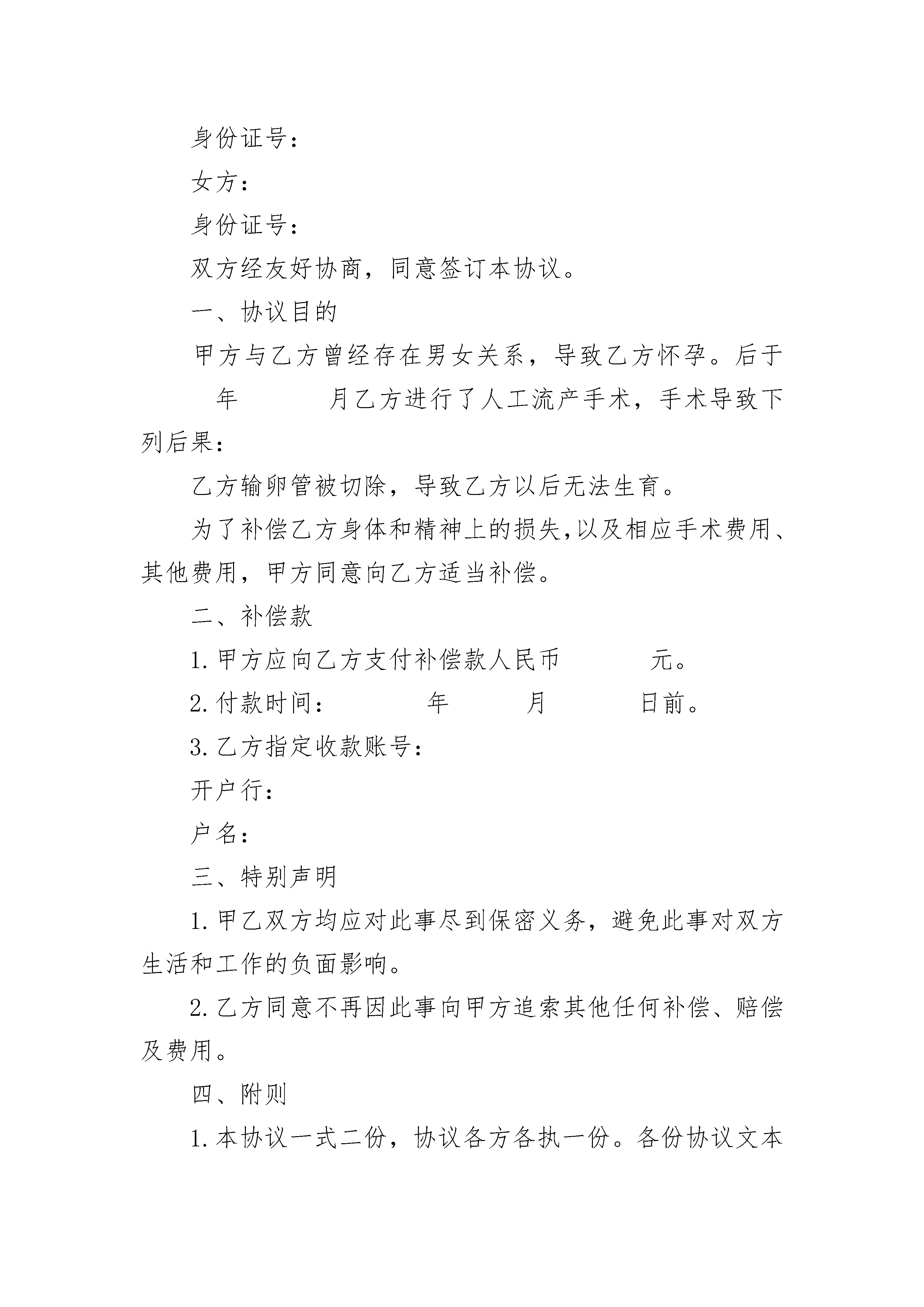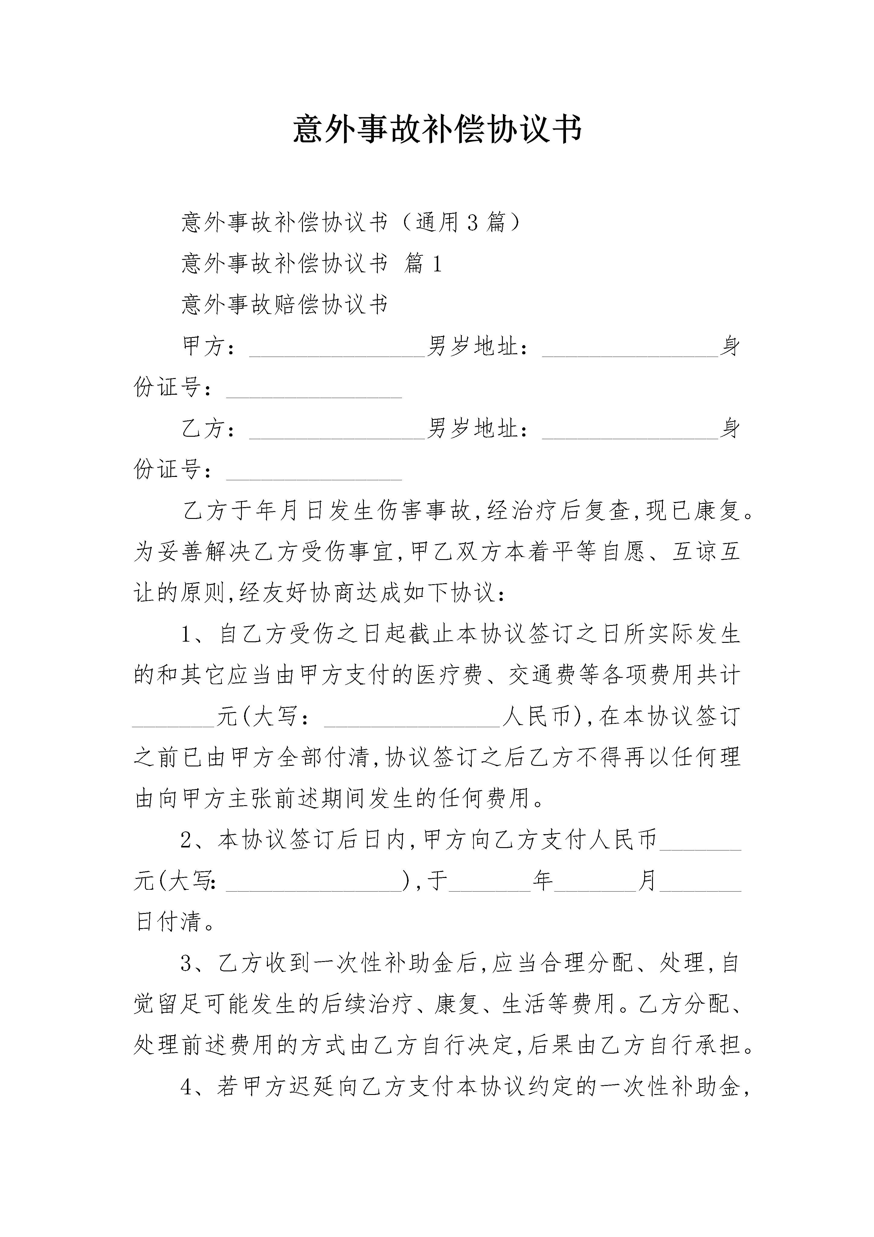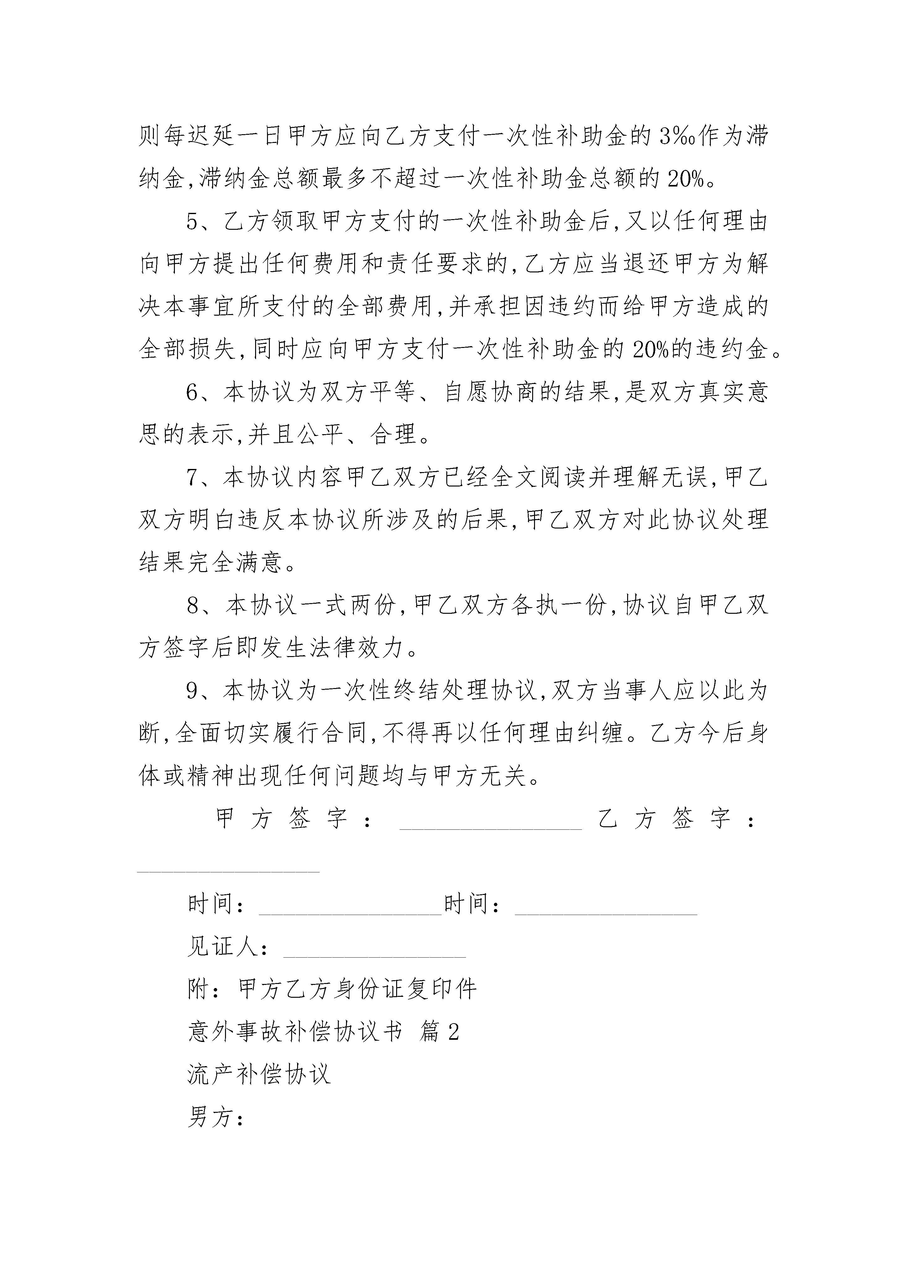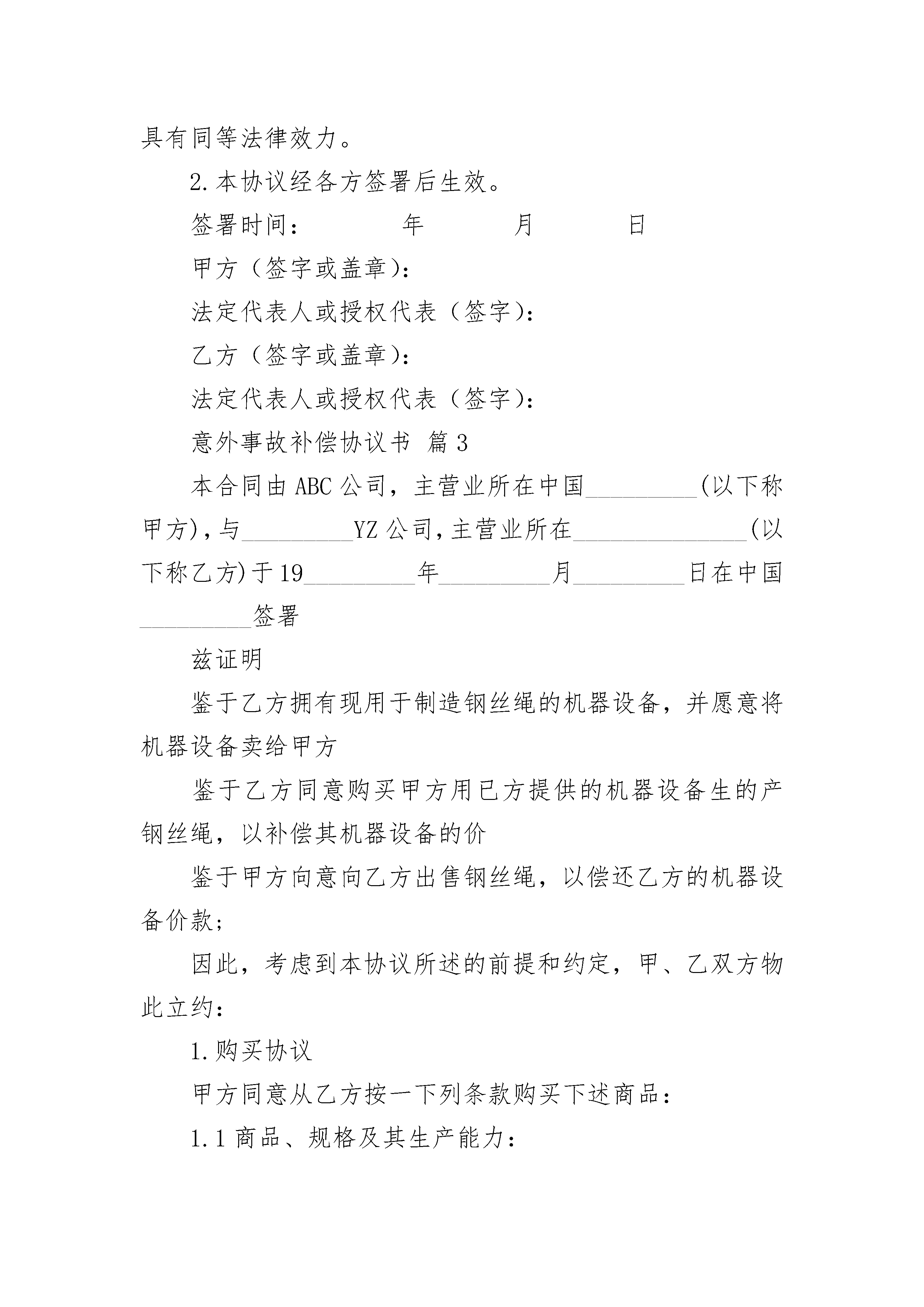 意外事故补偿协议书意外事故补偿协议书(通用3篇)意外事故补偿协议书篇1意外事故赔偿协议书甲方:_______________男岁地址:_______________身份证号:_______________乙方:_______________男岁地址:_______________身份证号:_______________乙方于年月日发生伤害事故,经治疗后复查,现已康复。为妥善解决乙方受伤事宜,甲乙双方本着平等自愿、互谅互让的原则,经友好协商达成如下协议:1、自乙方受伤之日起截止本协议签订之日所实际发生的和其它应当由甲方支付的医疗费、交通费等各项费用共计_______元(大写:_______________人民币),在本协议签订之前已由甲方全部付清,协议签订之后乙方不得再以任何理由向甲方主张前述期间发生的任何费用。2、本协议签订后日内,甲方向乙方支付人民币_______元(大写:_______________),于_______年_______月_______日付清。3、乙方收到一次性补助金后,应当合理分配、处理,自觉留足可能发生的后续治疗、康复、生活等费用。乙方分配、处理前述费用的方式由乙方自行决定,后果由乙方自行承担。4、若甲方迟延向乙方支付本协议约定的一次性补助金,则每迟延一日甲方应向乙方支付一次性补助金的3‰作为滞纳金,滞纳金总额最多不超过一次性补助金总额的20%。5、乙方领取甲方支付的一次性补助金后,又以任何理由向甲方提出任何费用和责任要求的,乙方应当退还甲方为解决本事宜所支付的全部费用,并承担因违约而给甲方造成的全部损失,同时应向甲方支付一次性补助金的20%的违约金。6、本协议为双方平等、自愿协商的结果,是双方真实意思的表示,并且公平、合理。7、本协议内容甲乙双方已经全文阅读并理解无误,甲乙双方明白违反本协议所涉及的后果,甲乙双方对此协议处理结果完全满意。8、本协议一式两份,甲乙双方各执一份,协议自甲乙双方签字后即发生法律效力。9、本协议为一次性终结处理协议,双方当事人应以此为断,全面切实履行合同,不得再以任何理由纠缠。乙方今后身体或精神出现任何问题均与甲方无关。甲方签字:_______________乙方签字:_______________时间:_______________时间:_______________见证人:_______________附:甲方乙方身份证复印件意外事故补偿协议书篇2流产补偿协议男方:身份证号:女方:身份证号:双方经友好协商,同意签订本协议。一、协议目的甲方与乙方曾经存在男女关系,导致乙方怀孕。后于年月乙方进行了人工流产手术,手术导致下列后果:乙方输卵管被切除,导致乙方以后无法生育。为了补偿乙方身体和精神上的损失,以及相应手术费用、其他费用,甲方同意向乙方适当补偿。二、补偿款1.甲方应向乙方支付补偿款人民币元。2.付款时间:年月日前。3.乙方指定收款账号:开户行:户名:三、特别声明1.甲乙双方均应对此事尽到保密义务,避免此事对双方生活和工作的负面影响。2.乙方同意不再因此事向甲方追索其他任何补偿、赔偿及费用。四、附则1.本协议一式二份,协议各方各执一份。各份协议文本具有同等法律效力。2.本协议经各方签署后生效。签署时间:年月日甲方(签字或盖章):法定代表人或授权代表(签字):乙方(签字或盖章):法定代表人或授权代表(签字):意外事故补偿协议书篇3本合同由ABC公司,主营业所在中国_________(以下称甲方),与_________YZ公司,主营业所在______________(以下称乙方)于19_________年_________月_________日在中国_________签署兹证明鉴于乙方拥有现用于制造钢丝绳的机器设备,并愿意将机器设备卖给甲方鉴于乙方同意购买甲方用已方提供的机器设备生的产钢丝绳,以补偿其机器设备的价鉴于甲方向意向乙方出售钢丝绳,以偿还乙方的机器设备价款;因此,考虑到本协议所述的前提和约定,甲、乙双方物此立约:1.购买协议甲方同意从乙方按一下列条款购买下述商品:1.1商品、规格及其生产能力:商品:规格:生产能力:1.2数量:2台。1.3价格:_________港FOB价:单价:总价:1.4支付:机器设备价款以甲方的产品--钢丝绳偿还,全部价款在边疆三年内平均三次付清,自_________日开始支付。1.5装运:装运期:装运港:目的港:装运唛头:1.6_____:由甲方_____。1.7检验:1.8保证:乙方保证其机器设备从未用这,性能先进,质量好,并保证该机器能生产_________规格钢丝绳,产量每小时_________米。2.销售协议甲方以钢丝黾偿还购买乙方机器设