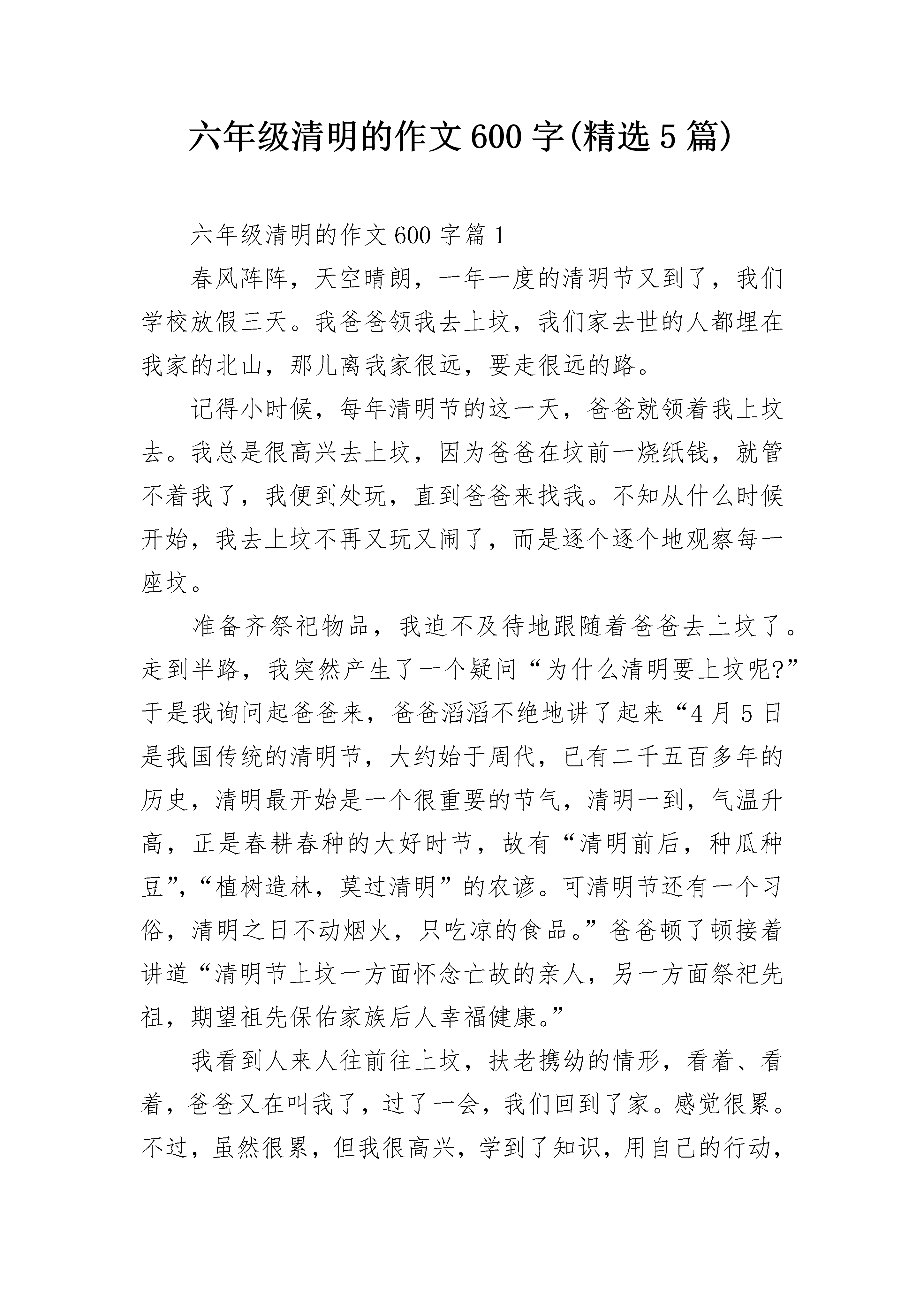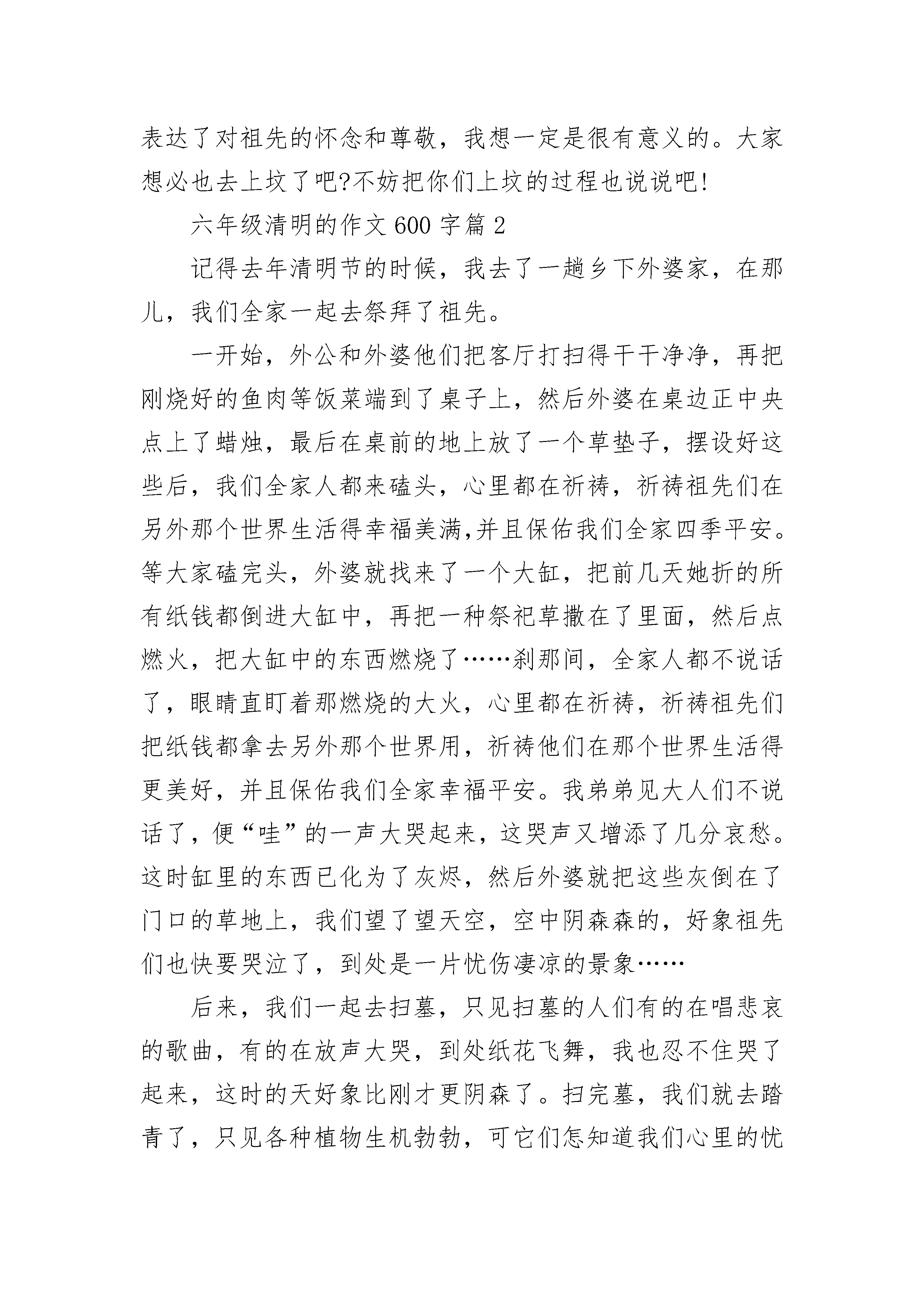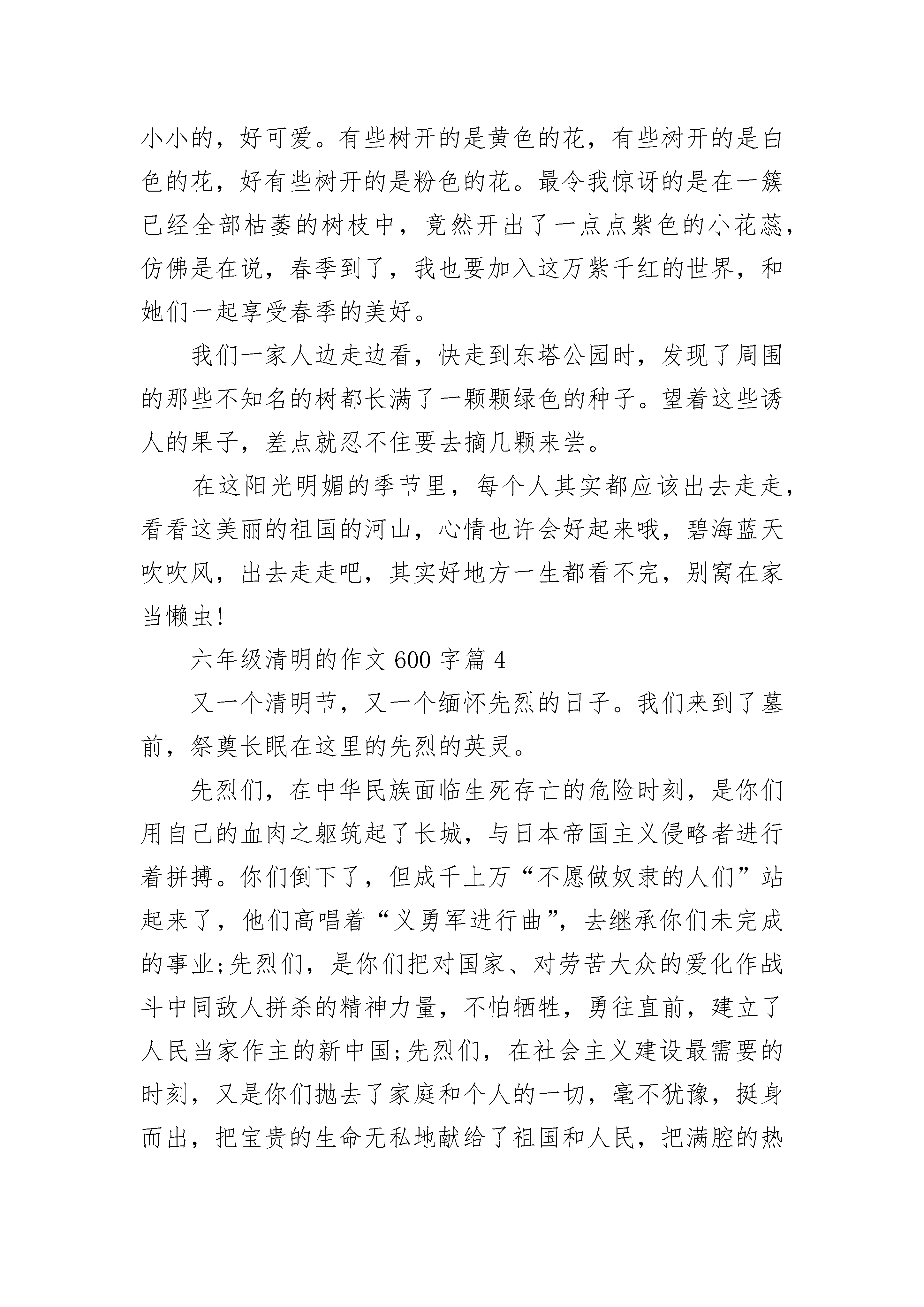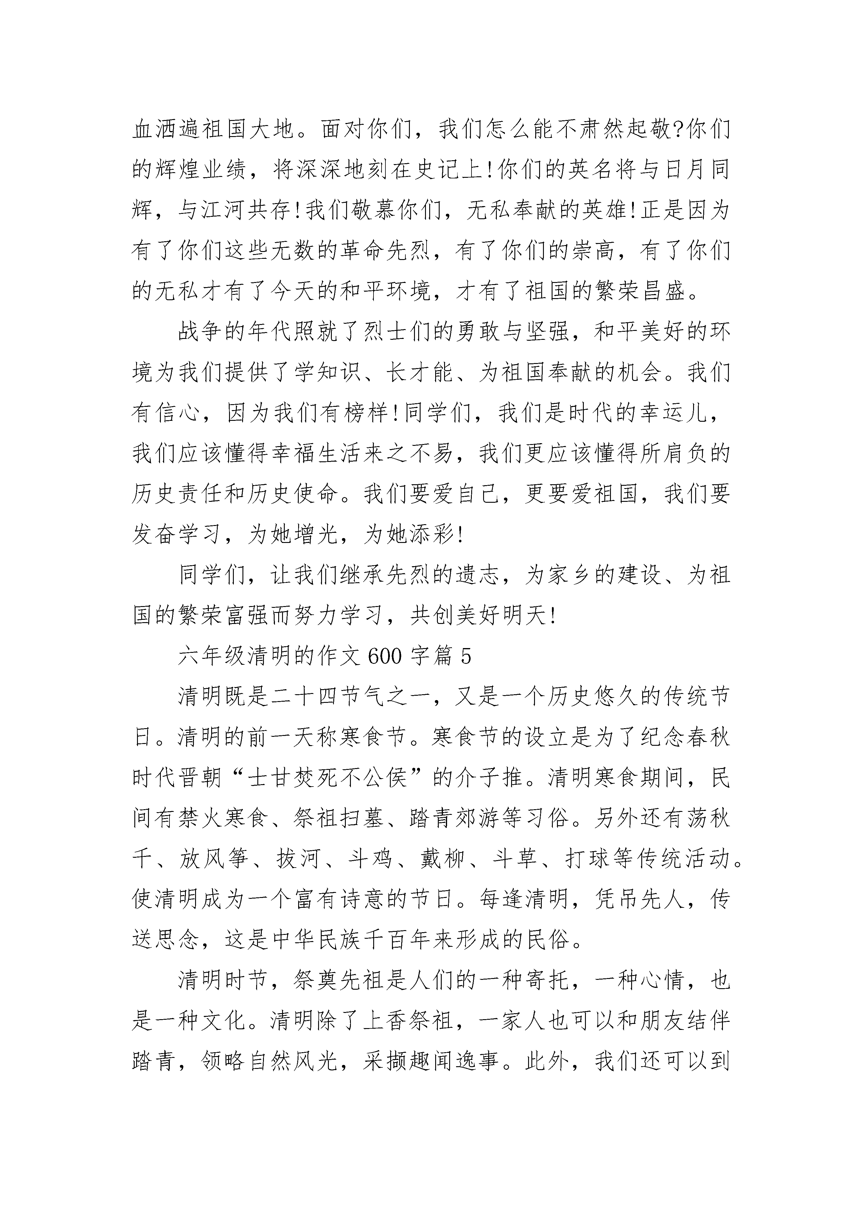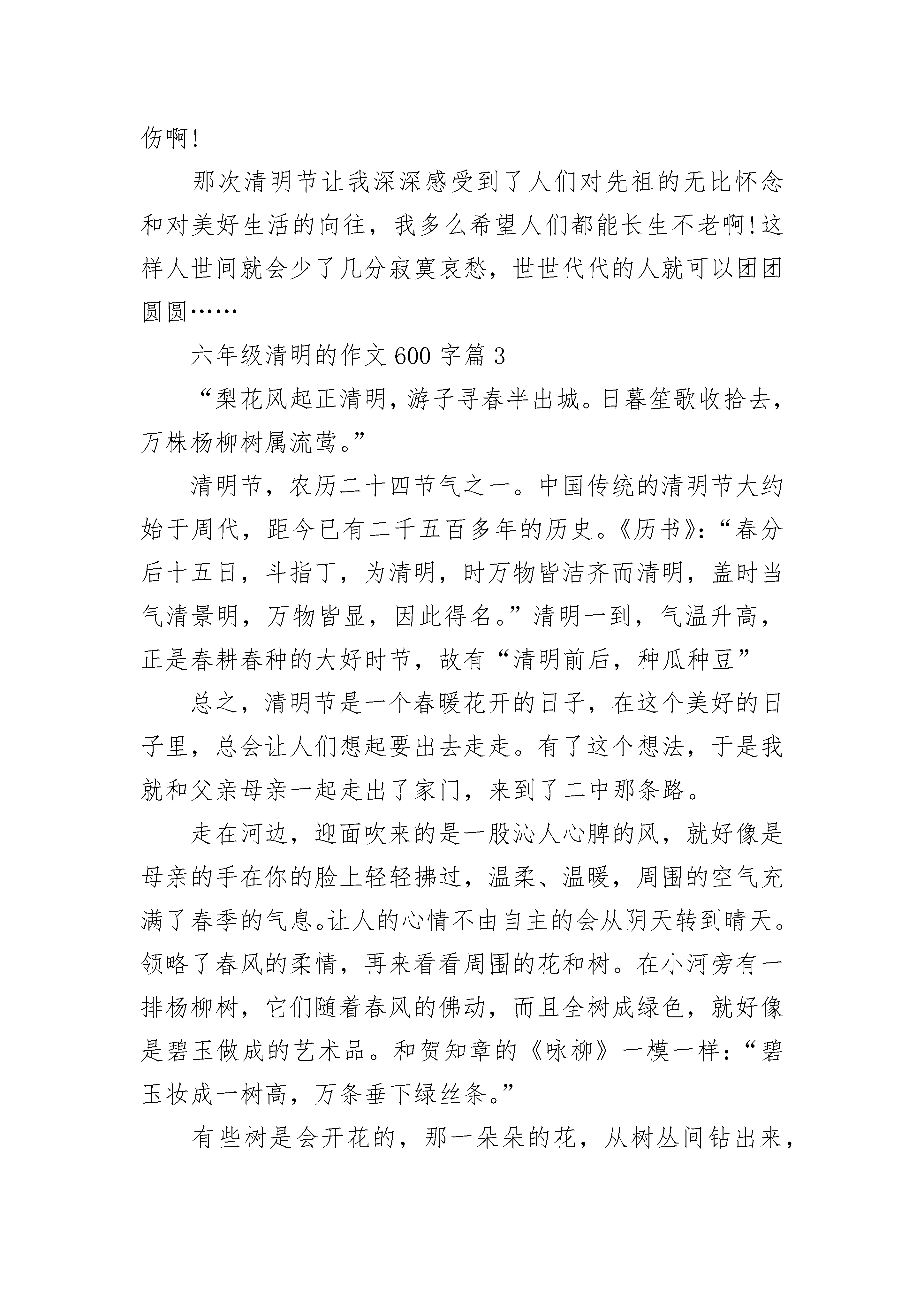 六年级清明的作文600字(精选5篇)六年级清明的作文600字篇1春风阵阵,天空晴朗,一年一度的清明节又到了,我们学校放假三天。我爸爸领我去上坟,我们家去世的人都埋在我家的北山,那儿离我家很远,要走很远的路。记得小时候,每年清明节的这一天,爸爸就领着我上坟去。我总是很高兴去上坟,因为爸爸在坟前一烧纸钱,就管不着我了,我便到处玩,直到爸爸来找我。不知从什么时候开始,我去上坟不再又玩又闹了,而是逐个逐个地观察每一座坟。准备齐祭祀物品,我迫不及待地跟随着爸爸去上坟了。走到半路,我突然产生了一个疑问“为什么清明要上坟呢?”于是我询问起爸爸来,爸爸滔滔不绝地讲了起来“4月5日是我国传统的清明节,大约始于周代,已有二千五百多年的历史,清明最开始是一个很重要的节气,清明一到,气温升高,正是春耕春种的大好时节,故有“清明前后,种瓜种豆”,“植树造林,莫过清明”的农谚。可清明节还有一个习俗,清明之日不动烟火,只吃凉的食品。”爸爸顿了顿接着讲道“清明节上坟一方面怀念亡故的亲人,另一方面祭祀先祖,期望祖先保佑家族后人幸福健康。”我看到人来人往前往上坟,扶老携幼的情形,看着、看着,爸爸又在叫我了,过了一会,我们回到了家。感觉很累。不过,虽然很累,但我很高兴,学到了知识,用自己的行动,表达了对祖先的怀念和尊敬,我想一定是很有意义的。大家想必也去上坟了吧?不妨把你们上坟的过程也说说吧!六年级清明的作文600字篇2记得去年清明节的时候,我去了一趟乡下外婆家,在那儿,我们全家一起去祭拜了祖先。一开始,外公和外婆他们把客厅打扫得干干净净,再把刚烧好的鱼肉等饭菜端到了桌子上,然后外婆在桌边正中央点上了蜡烛,最后在桌前的地上放了一个草垫子,摆设好这些后,我们全家人都来磕头,心里都在祈祷,祈祷祖先们在另外那个世界生活得幸福美满,并且保佑我们全家四季平安。等大家磕完头,外婆就找来了一个大缸,把前几天她折的所有纸钱都倒进大缸中,再把一种祭祀草撒在了里面,然后点燃火,把大缸中的东西燃烧了……刹那间,全家人都不说话了,眼睛直盯着那燃烧的大火,心里都在祈祷,祈祷祖先们把纸钱都拿去另外那个世界用,祈祷他们在那个世界生活得更美好,并且保佑我们全家幸福平安。我弟弟见大人们不说话了,便“哇”的一声大哭起来,这哭声又增添了几分哀愁。这时缸里的东西已化为了灰烬,然后外婆就把这些灰倒在了门口的草地上,我们望了望天空,空中阴森森的,好象祖先们也快要哭泣了,到处是一片忧伤凄凉的景象……后来,我们一起去扫墓,只见扫墓的人们有的在唱悲哀的歌曲,有的在放声大哭,到处纸花飞舞,我也忍不住哭了起来,这时的天好象比刚才更阴森了。扫完墓,我们就去踏青了,只见各种植物生机勃勃,可它们怎知道我们心里的忧伤啊!那次清明节让我深深感受到了人们对先祖的无比怀念和对美好生活的向往,我多么希望人们都能长生不老啊!这样人世间就会少了几分寂寞哀愁,世世代代的人就可以团团圆圆……六年级清明的作文600字篇3“梨花风起正清明,游子寻春半出城。日暮笙歌收拾去,万株杨柳树属流莺。”清明节,农历二十四节气之一。中国传统的清明节大约始于周代,距今已有二千五百多年的历史。《历书》:“春分后十五日,斗指丁,为清明,时万物皆洁齐而清明,盖时当气清景明,万物皆显,因此得名。”清明一到,气温升高,正是春耕春种的大好时节,故有“清明前后,种瓜种豆”总之,清明节是一个春暖花开的日子,在这个美好的日子里,总会让人们想起要出去走走。有了这个想法,于是我就和父亲母亲一起走出了家门,来到了二中那条路。走在河边,迎面吹来的是一股沁人心脾的风,就好像是母亲的手在你的脸上轻轻拂过,温柔、温暖,周围的空气充满了春季的气息。让人的心情不由自主的会从阴天转到晴天。领略了春风的柔情,再来看看周围的花和树。在小河旁有一排杨柳树,它们随着春风的佛动,而且全树成绿色,就好像是碧玉做成的艺术品。和贺知章的《咏柳》一模一样:“碧玉妆成一树高,万条垂下绿丝条。”有些树是会开花的,那一朵朵的花,从树丛间钻出来,小小的,好可爱。有些树开的是黄色的花,有些树开的是白色的花,好有些树开的是粉色的花。最令我惊讶的是在一簇已经全部枯萎的树枝中,竟然开出了一点点紫色的小花蕊,仿佛是在说,春季到了,我也要加入这万紫千红的世界,和她们一起享受春季的美好。我们一家人边走边看,快走到东塔公园时,发现了周围的那些不知名的树都长满了一颗颗绿色的种子。望着这些诱人的果子,差点就忍不住要去摘几颗来尝。在这阳光明媚的季节里,每个人其实都应该出去走走,看看这美丽的祖国的河山,心情也许会好起来哦,碧海蓝天吹吹风,出去走走吧,其实好地方一生都看不完,别窝在家当懒虫!六年级清明的作文600字篇4又一个清明节,又一个缅怀先烈的日子。我们来到了墓前,祭奠长眠在这里的先烈的英灵。先烈们,在中华民族面临生死存亡的危险时刻,是你们