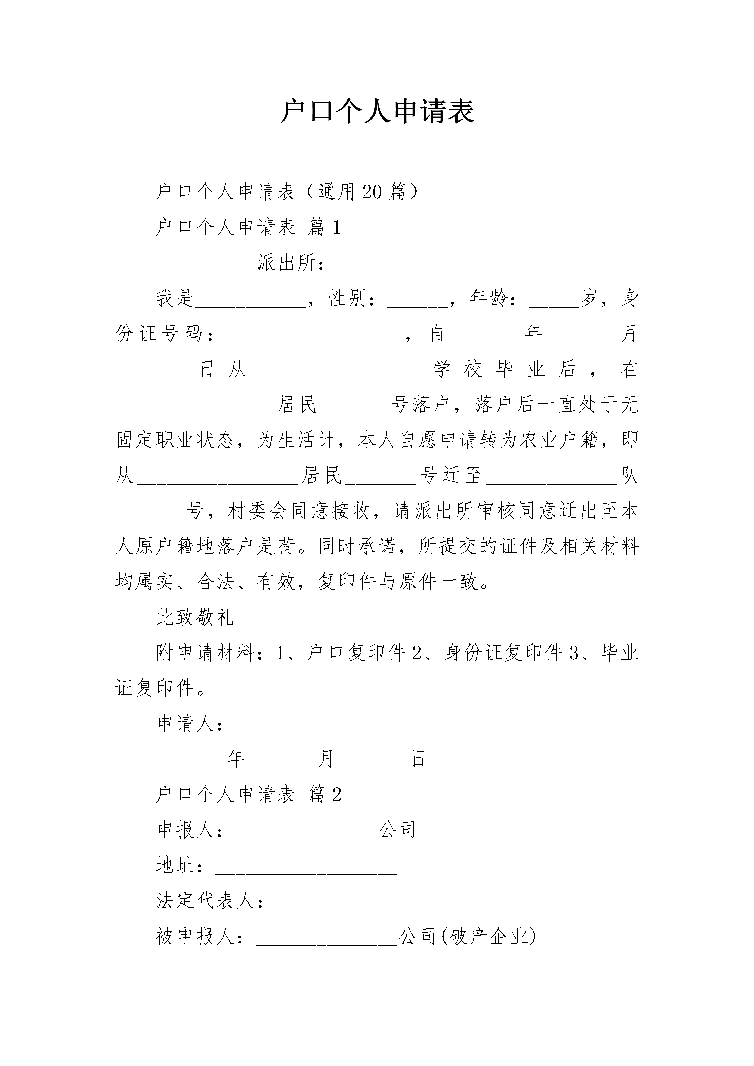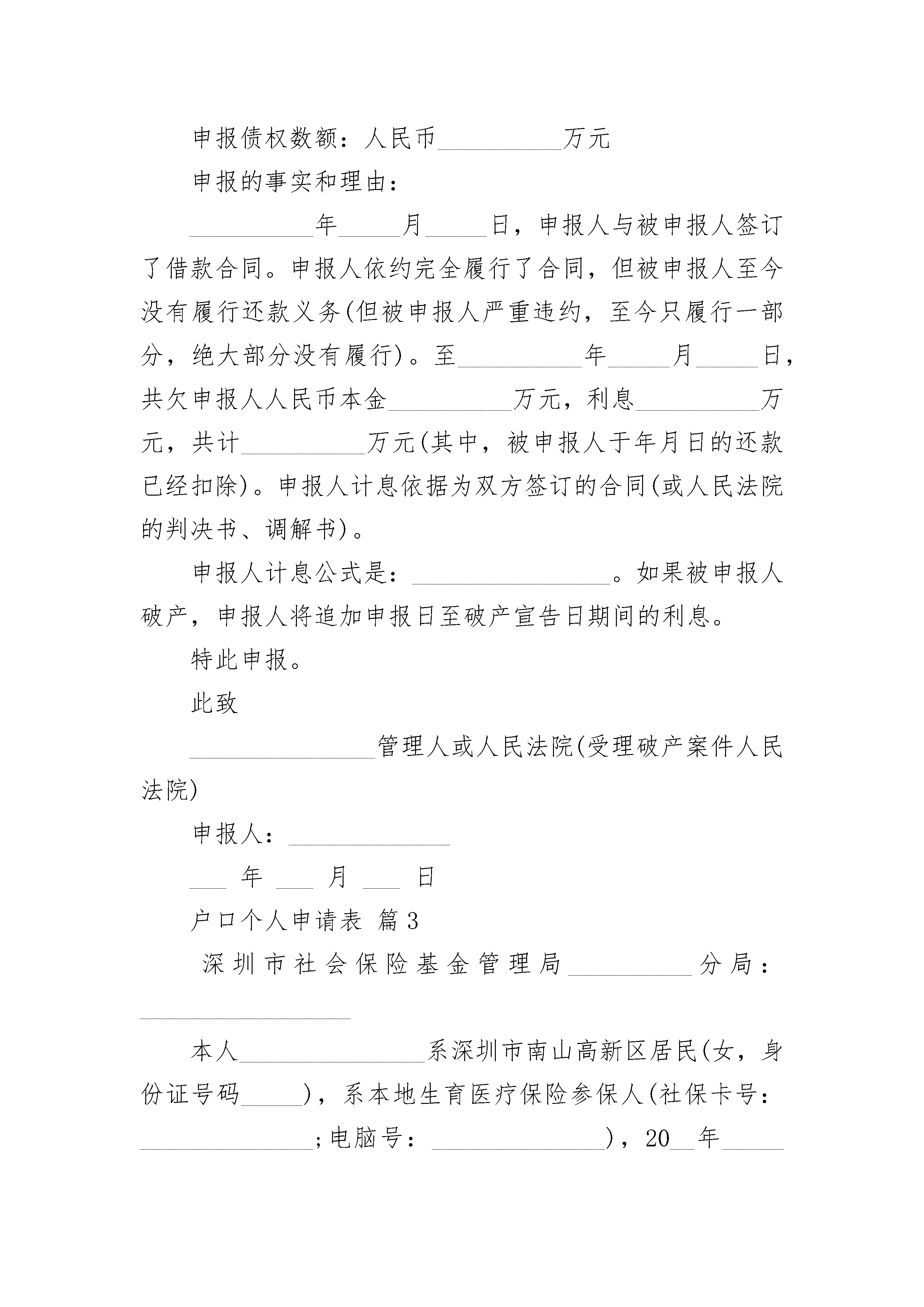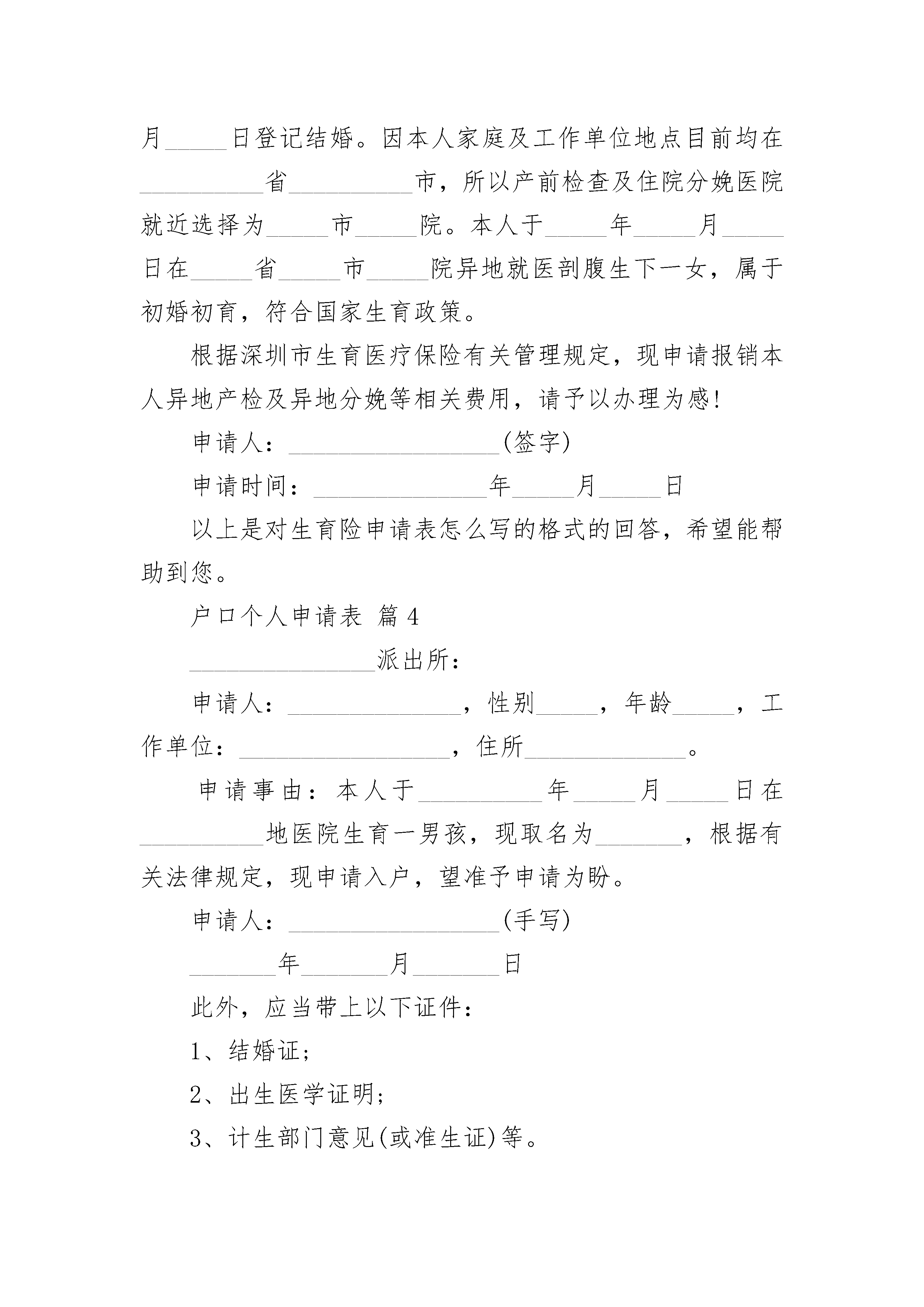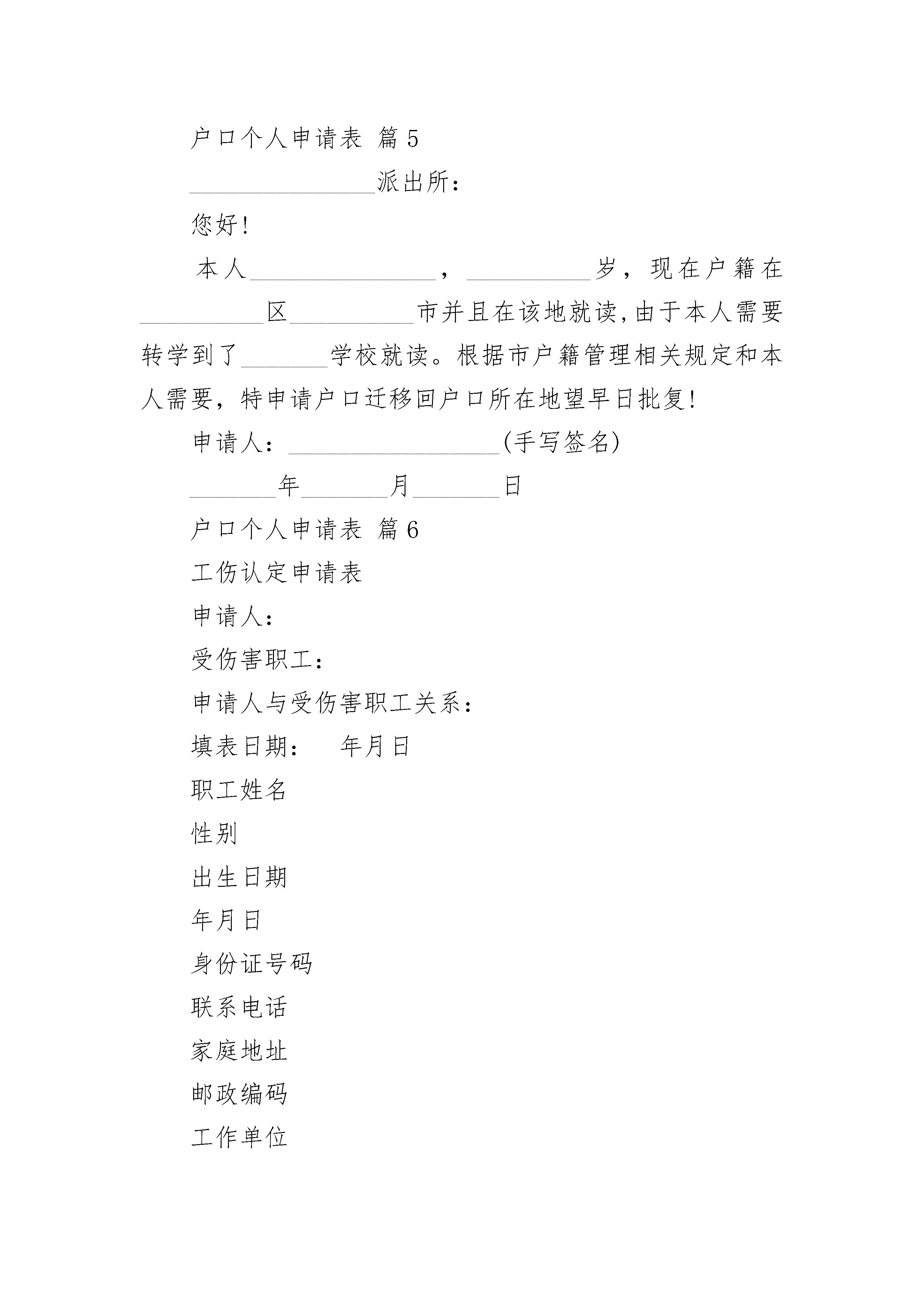 户口个人申请表户口个人申请表(通用20篇)户口个人申请表篇1__________派出所:我是___________,性别:______,年龄:_____岁,身份证号码:_________________,自_______年_______月_______日从________________学校毕业后,在________________居民_______号落户,落户后一直处于无固定职业状态,为生活计,本人自愿申请转为农业户籍,即从________________居民_______号迁至_____________队_______号,村委会同意接收,请派出所审核同意迁出至本人原户籍地落户是荷。同时承诺,所提交的证件及相关材料均属实、合法、有效,复印件与原件一致。此致敬礼附申请材料:1、户口复印件2、身份证复印件3、毕业证复印件。申请人:_________________________年_______月_______日户口个人申请表篇2申报人:______________公司地址:__________________法定代表人:______________被申报人:______________公司(破产企业)申报债权数额:人民币__________万元申报的事实和理由:__________年_____月_____日,申报人与被申报人签订了借款合同。申报人依约完全履行了合同,但被申报人至今没有履行还款义务(但被申报人严重违约,至今只履行一部分,绝大部分没有履行)。至__________年_____月_____日,共欠申报人人民币本金__________万元,利息__________万元,共计__________万元(其中,被申报人于年月日的还款已经扣除)。申报人计息依据为双方签订的合同(或人民法院的判决书、调解书)。申报人计息公式是:________________。如果被申报人破产,申报人将追加申报日至破产宣告日期间的利息。特此申报。此致_______________管理人或人民法院(受理破产案件人民法院)申报人:________________年___月___日户口个人申请表篇3深圳市社会保险基金管理局__________分局:_________________本人_______________系深圳市南山高新区居民(女,身份证号码_____),系本地生育医疗保险参保人(社保卡号:______________;电脑号:______________),20__年_____月_____日登记结婚。因本人家庭及工作单位地点目前均在__________省__________市,所以产前检查及住院分娩医院就近选择为_____市_____院。本人于_____年_____月_____日在_____省_____市_____院异地就医剖腹生下一女,属于初婚初育,符合国家生育政策。根据深圳市生育医疗保险有关管理规定,现申请报销本人异地产检及异地分娩等相关费用,请予以办理为感!申请人:_________________(签字)申请时间:______________年_____月_____日以上是对生育险申请表怎么写的格式的回答,希望能帮助到您。户口个人申请表篇4_______________派出所:申请人:______________,性别_____,年龄_____,工作单位:_________________,住所_____________。申请事由:本人于__________年_____月_____日在__________地医院生育一男孩,现取名为_______,根据有关法律规定,现申请入户,望准予申请为盼。申请人:_________________(手写)_______年_______月_______日此外,应当带上以下证件:1、结婚证;2、出生医学证明;3、计生部门意见(或准生证)等。户口个人申请表篇5_______________派出所:您好!本人_______________,__________岁,现在户籍在__________区__________市并且在该地就读,由于本人需要转学到了_______学校就读。根据市户籍管理相关规定和本人需要,特申请户口迁移回户口所在地望早日批复!申请人:_________________(手写签名)_______年_______月_______日户口个人申请表篇6工伤认定申请表申请人:受伤害职工:申请人与受伤害职工关系:填表日期:年月日职工姓名性别出生日期年月日身份证号码联系电话家庭地址邮政编码工作单位联系电话单位地址邮政编码职业、工种或工作岗位参加工作时间事故时间、地点及主要原因诊断时间受伤害部位职业病名称接触职业病危害岗位接触职业病危害时间受伤害经过简述(可附页)申请事项:申请人签字:年月日