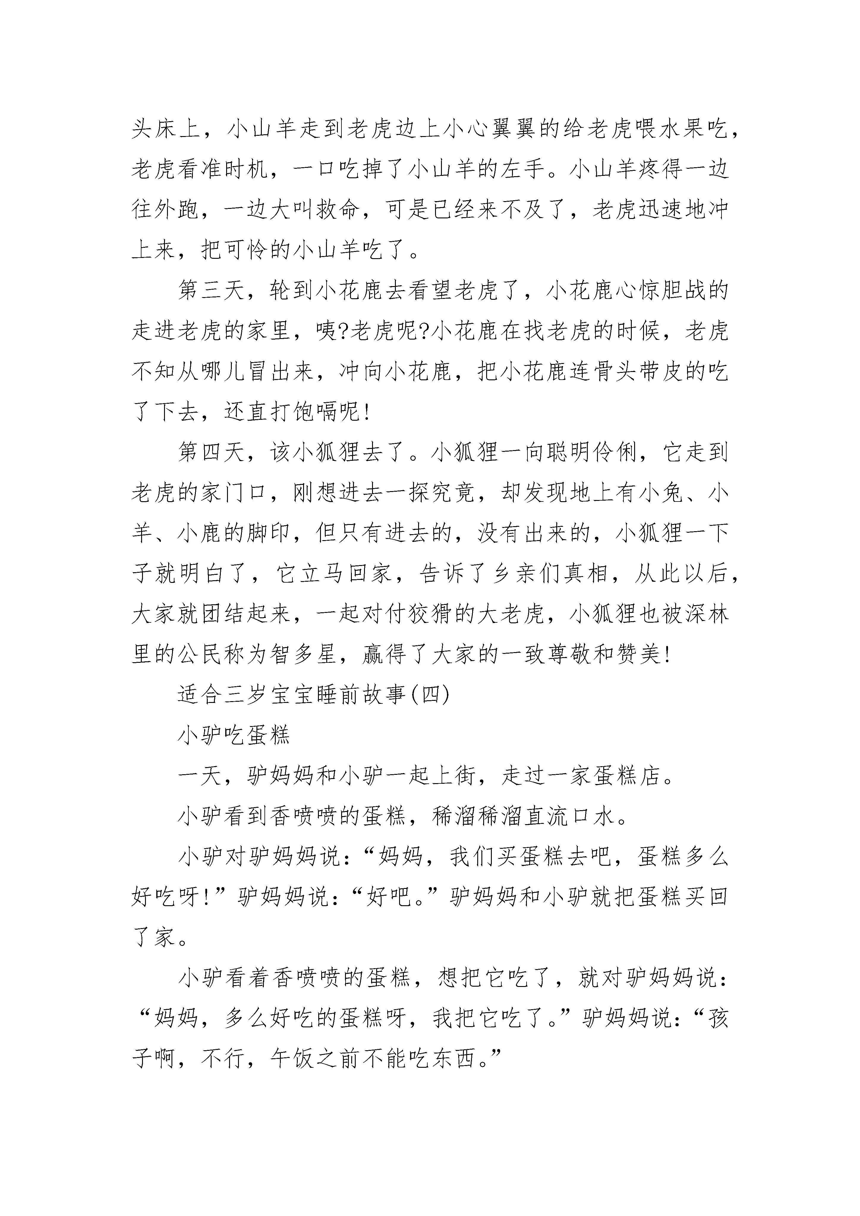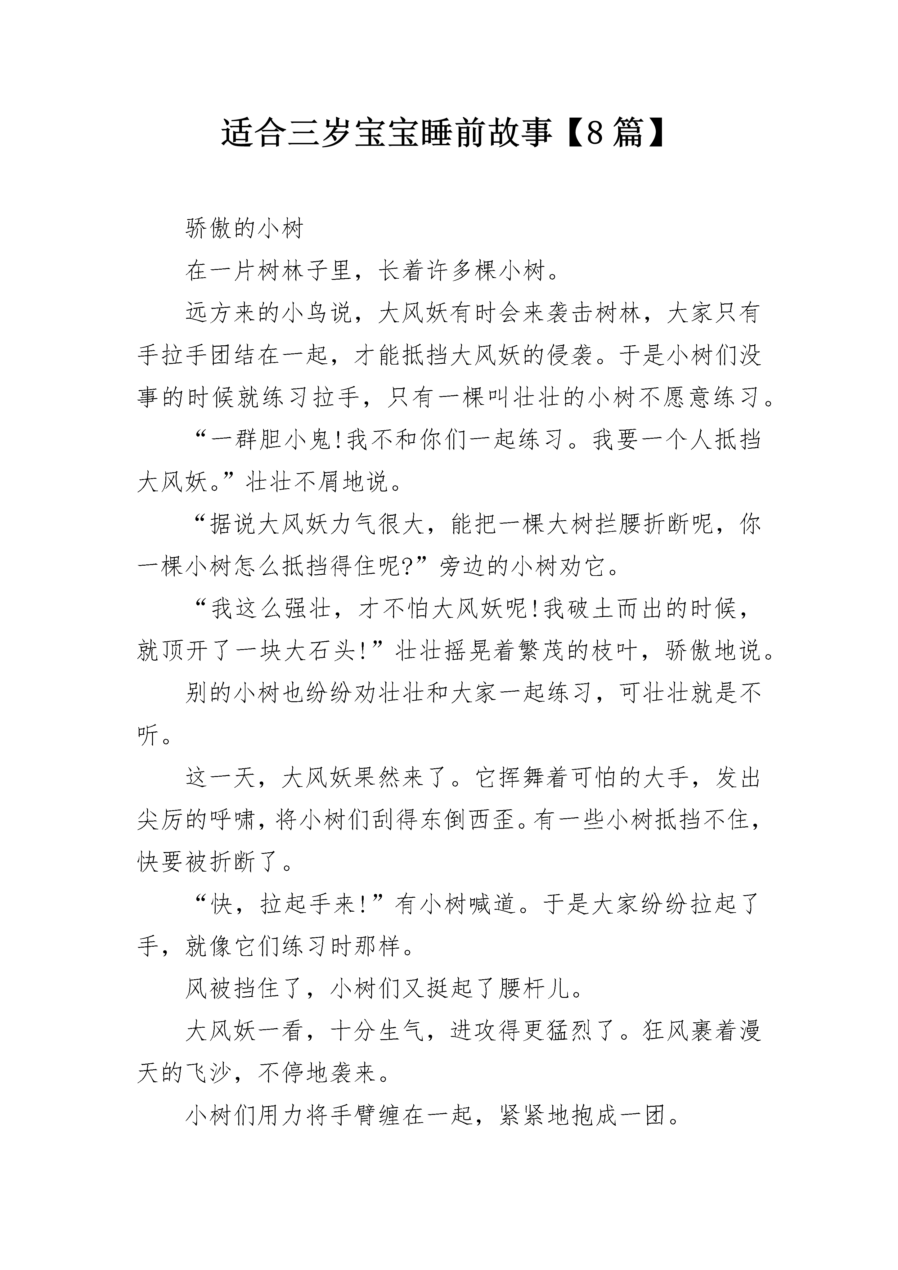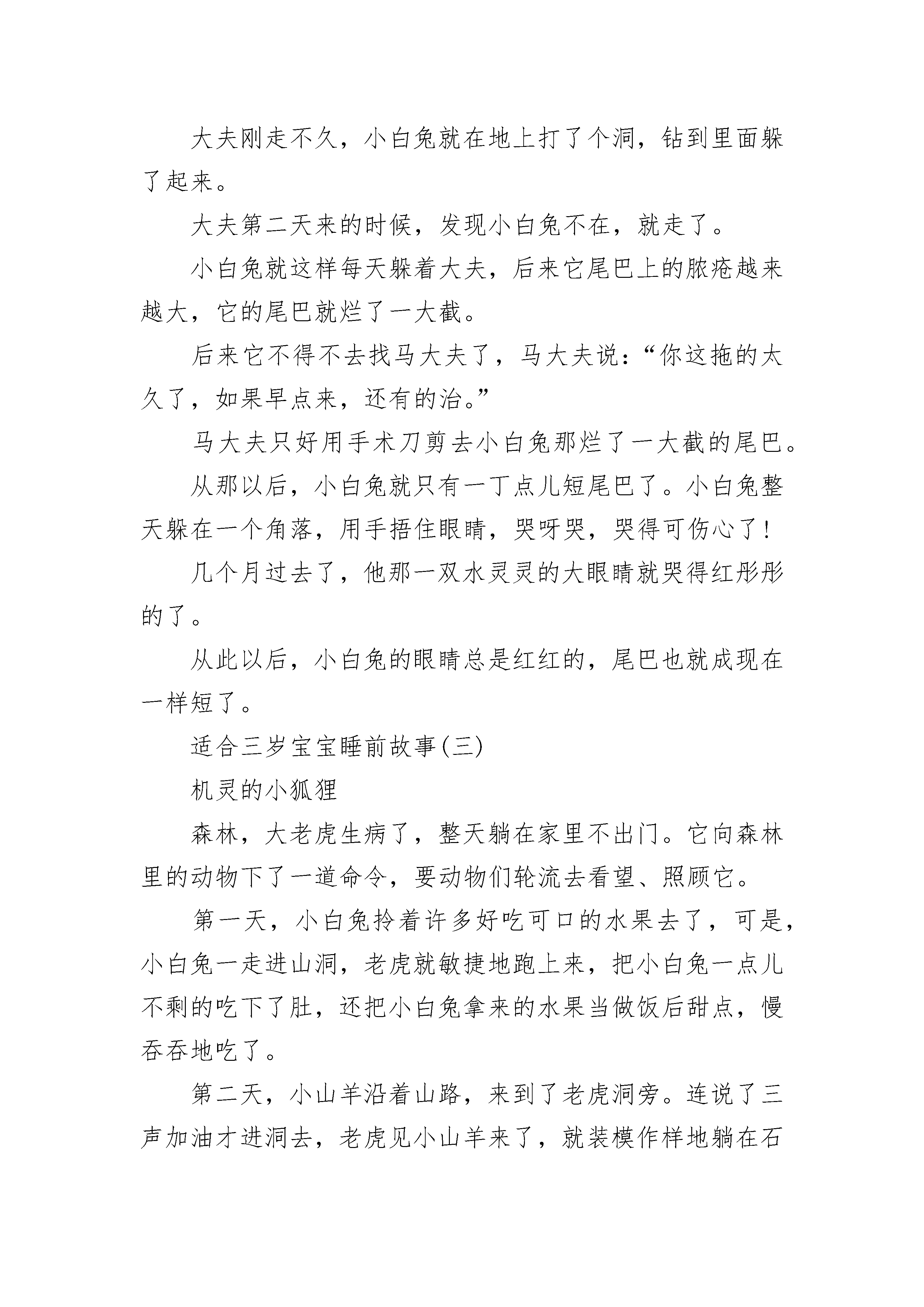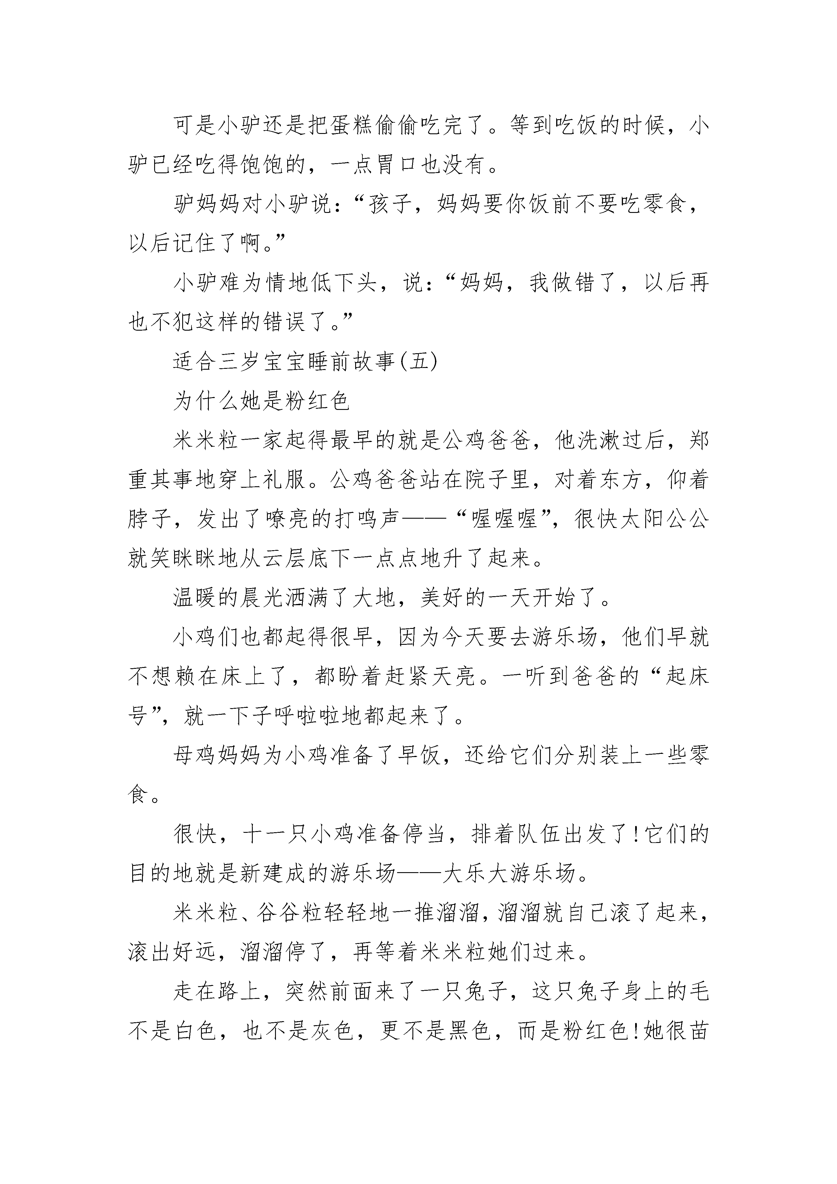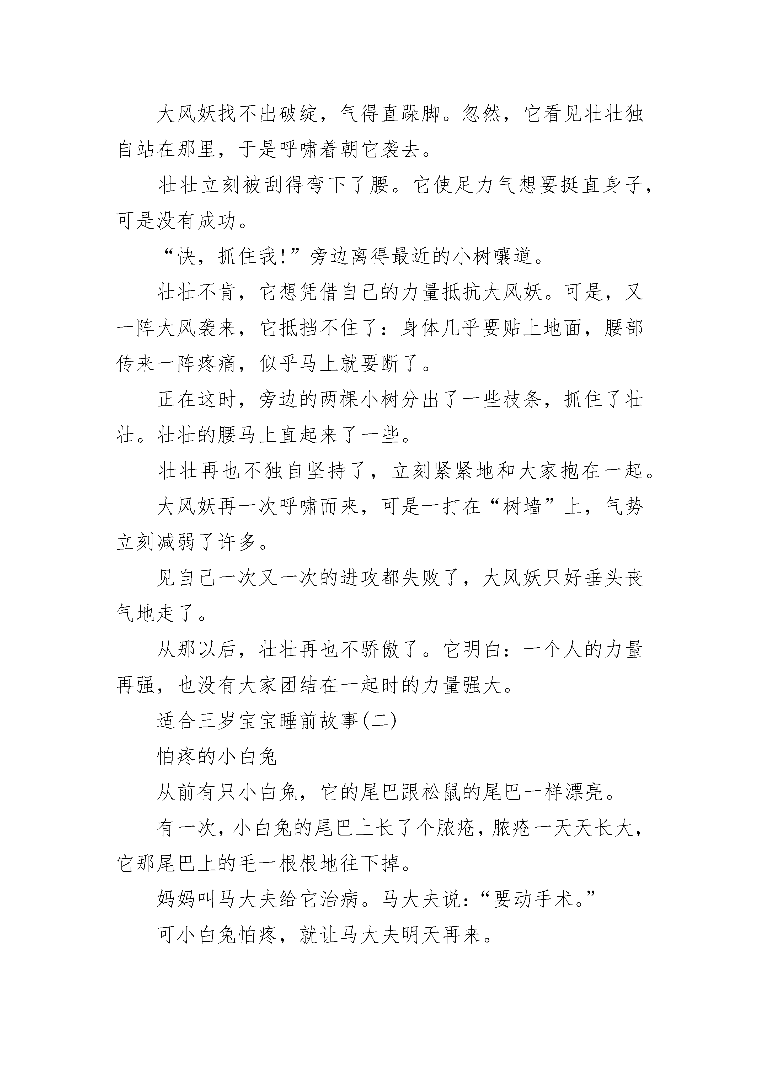 适合三岁宝宝睡前故事【8篇】骄傲的小树在一片树林子里,长着许多棵小树。远方来的小鸟说,大风妖有时会来袭击树林,大家只有手拉手团结在一起,才能抵挡大风妖的侵袭。于是小树们没事的时候就练习拉手,只有一棵叫壮壮的小树不愿意练习。“一群胆小鬼!我不和你们一起练习。我要一个人抵挡大风妖。”壮壮不屑地说。“据说大风妖力气很大,能把一棵大树拦腰折断呢,你一棵小树怎么抵挡得住呢?”旁边的小树劝它。“我这么强壮,才不怕大风妖呢!我破土而出的时候,就顶开了一块大石头!”壮壮摇晃着繁茂的枝叶,骄傲地说。别的小树也纷纷劝壮壮和大家一起练习,可壮壮就是不听。这一天,大风妖果然来了。它挥舞着可怕的大手,发出尖厉的呼啸,将小树们刮得东倒西歪。有一些小树抵挡不住,快要被折断了。“快,拉起手来!”有小树喊道。于是大家纷纷拉起了手,就像它们练习时那样。风被挡住了,小树们又挺起了腰杆儿。大风妖一看,十分生气,进攻得更猛烈了。狂风裹着漫天的飞沙,不停地袭来。小树们用力将手臂缠在一起,紧紧地抱成一团。大风妖找不出破绽,气得直跺脚。忽然,它看见壮壮独自站在那里,于是呼啸着朝它袭去。壮壮立刻被刮得弯下了腰。它使足力气想要挺直身子,可是没有成功。“快,抓住我!”旁边离得最近的小树嚷道。壮壮不肯,它想凭借自己的力量抵抗大风妖。可是,又一阵大风袭来,它抵挡不住了:身体几乎要贴上地面,腰部传来一阵疼痛,似乎马上就要断了。正在这时,旁边的两棵小树分出了一些枝条,抓住了壮壮。壮壮的腰马上直起来了一些。壮壮再也不独自坚持了,立刻紧紧地和大家抱在一起。大风妖再一次呼啸而来,可是一打在“树墙”上,气势立刻减弱了许多。见自己一次又一次的进攻都失败了,大风妖只好垂头丧气地走了。从那以后,壮壮再也不骄傲了。它明白:一个人的力量再强,也没有大家团结在一起时的力量强大。适合三岁宝宝睡前故事(二)怕疼的小白兔从前有只小白兔,它的尾巴跟松鼠的尾巴一样漂亮。有一次,小白兔的尾巴上长了个脓疮,脓疮一天天长大,它那尾巴上的毛一根根地往下掉。妈妈叫马大夫给它治病。马大夫说:“要动手术。”可小白兔怕疼,就让马大夫明天再来。大夫刚走不久,小白兔就在地上打了个洞,钻到里面躲了起来。大夫第二天来的时候,发现小白兔不在,就走了。小白兔就这样每天躲着大夫,后来它尾巴上的脓疮越来越大,它的尾巴就烂了一大截。后来它不得不去找马大夫了,马大夫说:“你这拖的太久了,如果早点来,还有的治。”马大夫只好用手术刀剪去小白兔那烂了一大截的尾巴。从那以后,小白兔就只有一丁点儿短尾巴了。小白兔整天躲在一个角落,用手捂住眼睛,哭呀哭,哭得可伤心了!几个月过去了,他那一双水灵灵的大眼睛就哭得红彤彤的了。从此以后,小白兔的眼睛总是红红的,尾巴也就成现在一样短了。适合三岁宝宝睡前故事(三)机灵的小狐狸森林,大老虎生病了,整天躺在家里不出门。它向森林里的动物下了一道命令,要动物们轮流去看望、照顾它。第一天,小白兔拎着许多好吃可口的水果去了,可是,小白兔一走进山洞,老虎就敏捷地跑上来,把小白兔一点儿不剩的吃下了肚,还把小白兔拿来的水果当做饭后甜点,慢吞吞地吃了。第二天,小山羊沿着山路,来到了老虎洞旁。连说了三声加油才进洞去,老虎见小山羊来了,就装模作样地躺在石头床上,小山羊走到老虎边上小心翼翼的给老虎喂水果吃,老虎看准时机,一口吃掉了小山羊的左手。小山羊疼得一边往外跑,一边大叫救命,可是已经来不及了,老虎迅速地冲上来,把可怜的小山羊吃了。第三天,轮到小花鹿去看望老虎了,小花鹿心惊胆战的走进老虎的家里,咦?老虎呢?小花鹿在找老虎的时候,老虎不知从哪儿冒出来,冲向小花鹿,把小花鹿连骨头带皮的吃了下去,还直打饱嗝呢!第四天,该小狐狸去了。小狐狸一向聪明伶俐,它走到老虎的家门口,刚想进去一探究竟,却发现地上有小兔、小羊、小鹿的脚印,但只有进去的,没有出来的,小狐狸一下子就明白了,它立马回家,告诉了乡亲们真相,从此以后,大家就团结起来,一起对付狡猾的大老虎,小狐狸也被深林里的公民称为智多星,赢得了大家的一致尊敬和赞美!适合三岁宝宝睡前故事(四)小驴吃蛋糕一天,驴妈妈和小驴一起上街,走过一家蛋糕店。小驴看到香喷喷的蛋糕,稀溜稀溜直流口水。小驴对驴妈妈说:“妈妈,我们买蛋糕去吧,蛋糕多么好吃呀!”驴妈妈说:“好吧。”驴妈妈和小驴就把蛋糕买回了家。小驴看着香喷喷的蛋糕,想把它吃了,就对驴妈妈说:“妈妈,多么好吃的蛋糕呀,我把它吃了。”驴妈妈说:“孩子啊,不行,午饭之前不能吃东西。”可是小驴还是把蛋糕偷偷吃完了。等到吃饭的时候,小驴已经吃得饱饱的,一点胃口也没有。驴妈妈对小驴说:“孩子,妈妈要你饭前不要吃零食,以后记住了啊。”小驴难为情地低下头,说:“妈妈,我做错了,以后再也不犯这样的错误了。”适合三岁宝宝睡前故事(五)为什么她是粉红色米米粒一家起得最早的就是公鸡爸爸