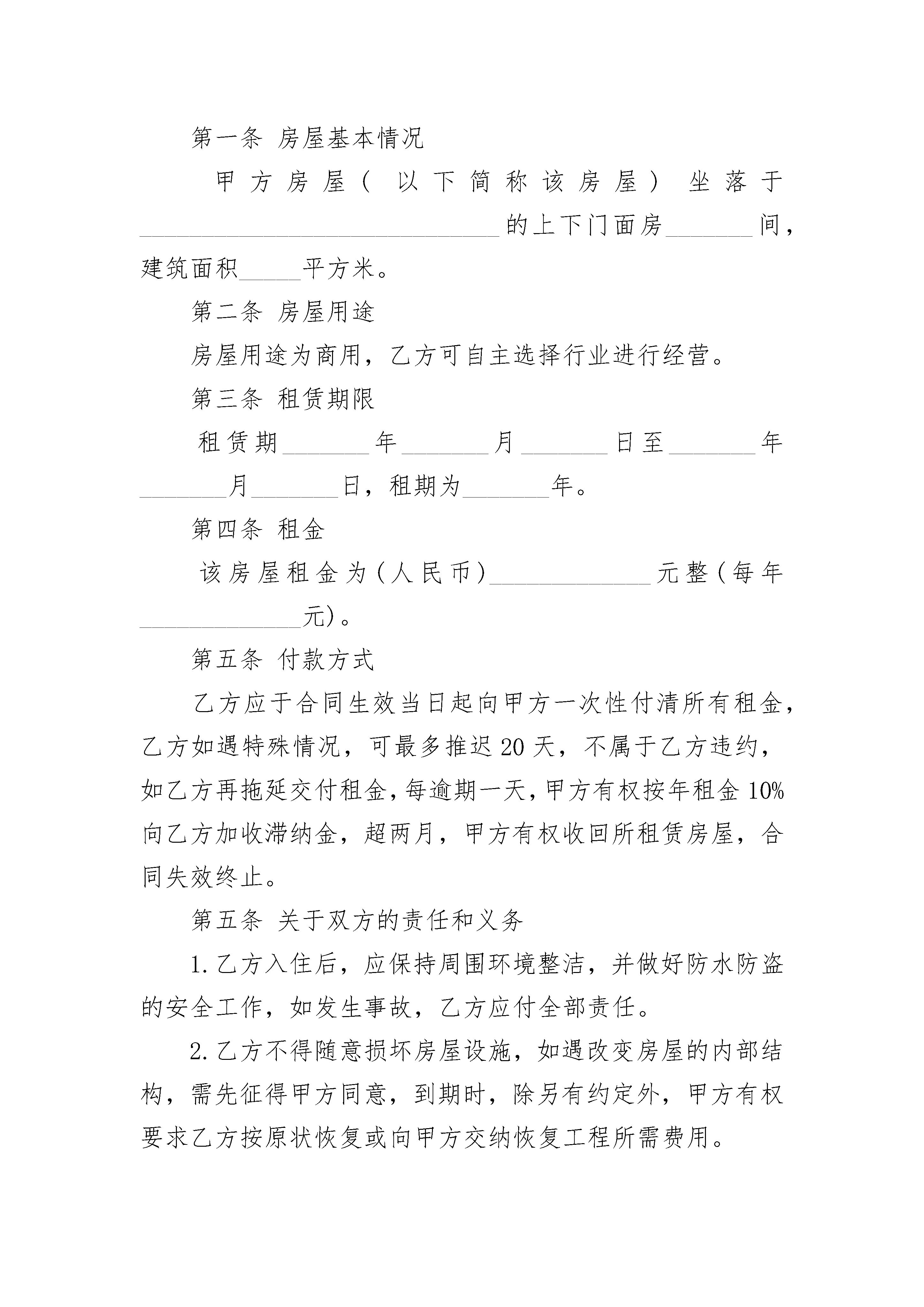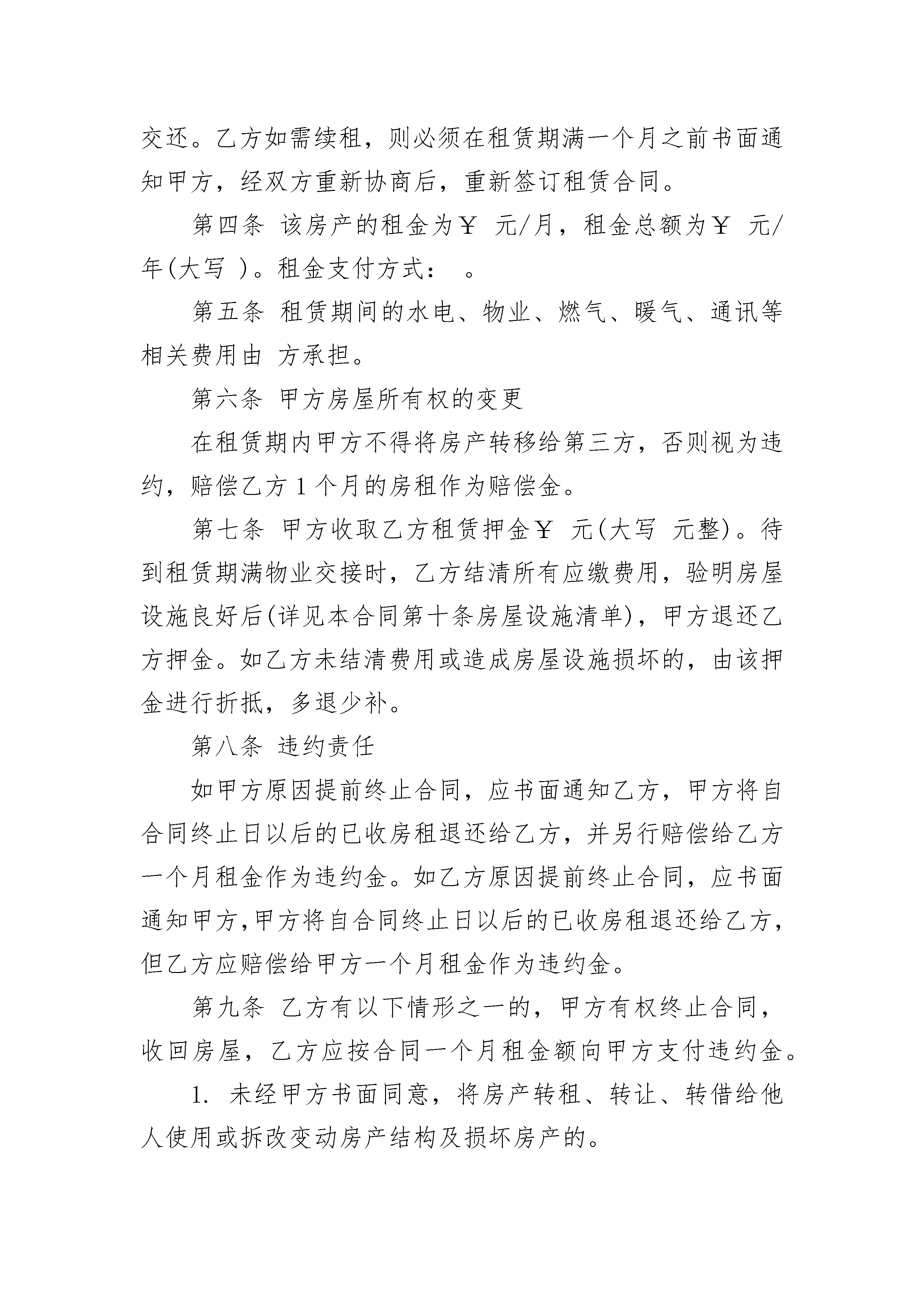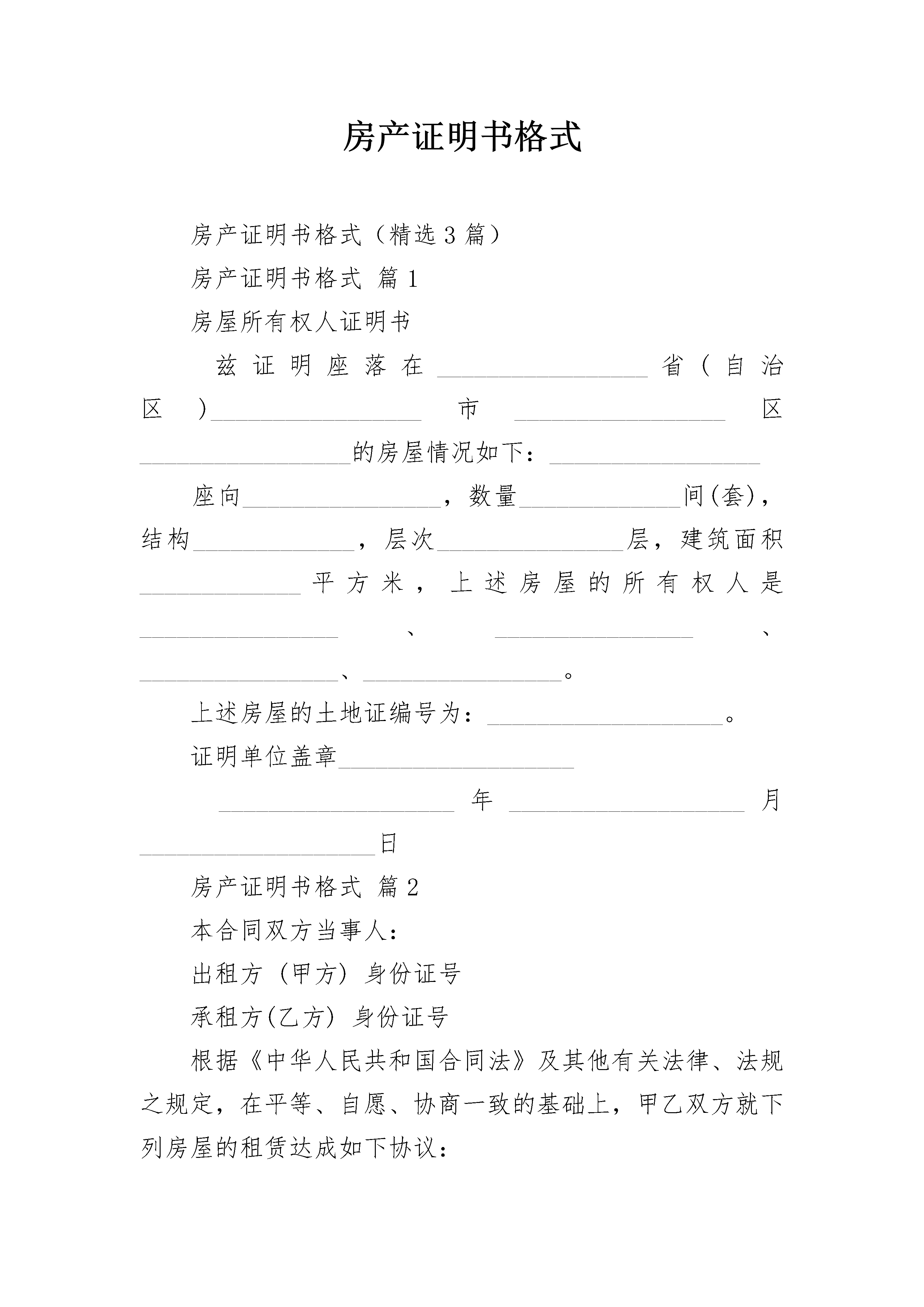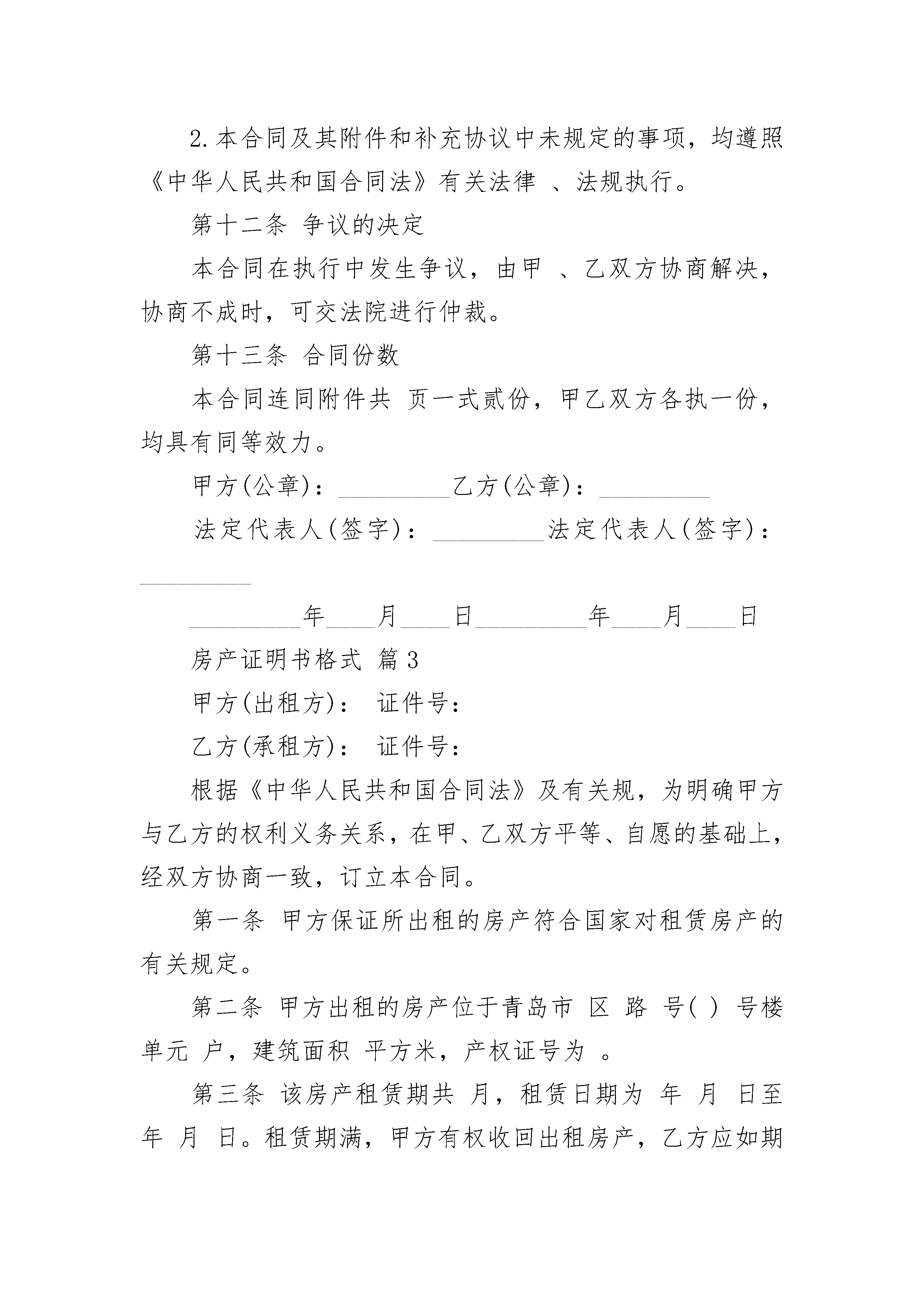 房产证明书格式房产证明书格式(精选3篇)房产证明书格式篇1房屋所有权人证明书兹证明座落在_________________省(自治区)_________________市_________________区_________________的房屋情况如下:_________________座向________________,数量_____________间(套),结构_____________,层次_______________层,建筑面积_____________平方米,上述房屋的所有权人是________________、________________、________________、________________。上述房屋的土地证编号为:___________________。证明单位盖章______________________________________年___________________月___________________日房产证明书格式篇2本合同双方当事人:出租方(甲方)身份证号承租方(乙方)身份证号根据《中华人民共和国合同法》及其他有关法律、法规之规定,在平等、自愿、协商一致的基础上,甲乙双方就下列房屋的租赁达成如下协议:第一条房屋基本情况甲方房屋(以下简称该房屋)坐落于_____________________________的上下门面房_______间,建筑面积_____平方米。第二条房屋用途房屋用途为商用,乙方可自主选择行业进行经营。第三条租赁期限租赁期_______年_______月_______日至_______年_______月_______日,租期为_______年。第四条租金该房屋租金为(人民币)_____________元整(每年_____________元)。第五条付款方式乙方应于合同生效当日起向甲方一次性付清所有租金,乙方如遇特殊情况,可最多推迟20天,不属于乙方违约,如乙方再拖延交付租金,每逾期一天,甲方有权按年租金10%向乙方加收滞纳金,超两月,甲方有权收回所租赁房屋,合同失效终止。第五条关于双方的责任和义务1.乙方入住后,应保持周围环境整洁,并做好防水防盗的安全工作,如发生事故,乙方应付全部责任。2.乙方不得随意损坏房屋设施,如遇改变房屋的内部结构,需先征得甲方同意,到期时,除另有约定外,甲方有权要求乙方按原状恢复或向甲方交纳恢复工程所需费用。第六条关于房屋租赁期间的有关费用在房屋租赁期间,经营所产生的水电等费用由乙方支付,并由乙方承担延期付款的违约责任。第七条租赁期满及租赁期间1.在乙方租赁该房经营期间,乙方在付清甲方房租的基础上,可承包给第三方经营,也有权对经营权进行转让。合同终止,由甲方在同等条件下与第三方签订正式租赁合同。合同期内乙方具有该房屋转租权,甲方不得干预。2.乙方不得故意损坏承租房屋,利用承租房屋进行违法活动,影响四周邻里生活,如有上述情况,甲方有权终止合同,造成损失由乙方承担。第八条提前终止合同如因国家建设,不可抗力因素不得不出现合同终止的情况时,甲方不负责乙方损失,若乙方提前终止合同或搬出,闲置房屋,剩余租金甲方不再退还。第九条不可抗力因不可抗力原因导致房屋损坏和造成损失,双方互不承担责任。第十条其它本合同未尽事宜,由甲乙双方另行议定,并签订补充协议,补充协议与本合同一致的,以补充协议为准。第十一条合同效力1.本合同附件均为本合同不可分割之一部分。本合同及其附件内空格部分撰写的文字与印刷文字具有同等效力。2.本合同及其附件和补充协议中未规定的事项,均遵照《中华人民共和国合同法》有关法律、法规执行。第十二条争议的决定本合同在执行中发生争议,由甲、乙双方协商解决,协商不成时,可交法院进行仲裁。第十三条合同份数本合同连同附件共页一式贰份,甲乙双方各执一份,均具有同等效力。甲方(公章):_________乙方(公章):_________法定代表人(签字):_________法定代表人(签字):__________________年____月____日_________年____月____日房产证明书格式篇3甲方(出租方):证件号:乙方(承租方):证件号:根据《中华人民共和国合同法》及有关规,为明确甲方与乙方的权利义务关系,在甲、乙双方平等、自愿的基础上,经双方协商一致,订立本合同。第一条甲方保证所出租的房产符合国家对租赁房产的有关规定。第二条甲方出租的房产位于青岛市区路号()号楼单元户,建筑面积平方米,产权证号为。第三条该房产租赁期共月,租赁日期为年月日至年月日。租赁期满,甲方有权收回出租房产,乙方应如期交还。乙方如需续租,则必须在租赁期满一个月之前书面通知甲方,经双方重新协商后,重新签订租赁合同。第四条该房产的租金为¥元/月,租金总额为¥元/