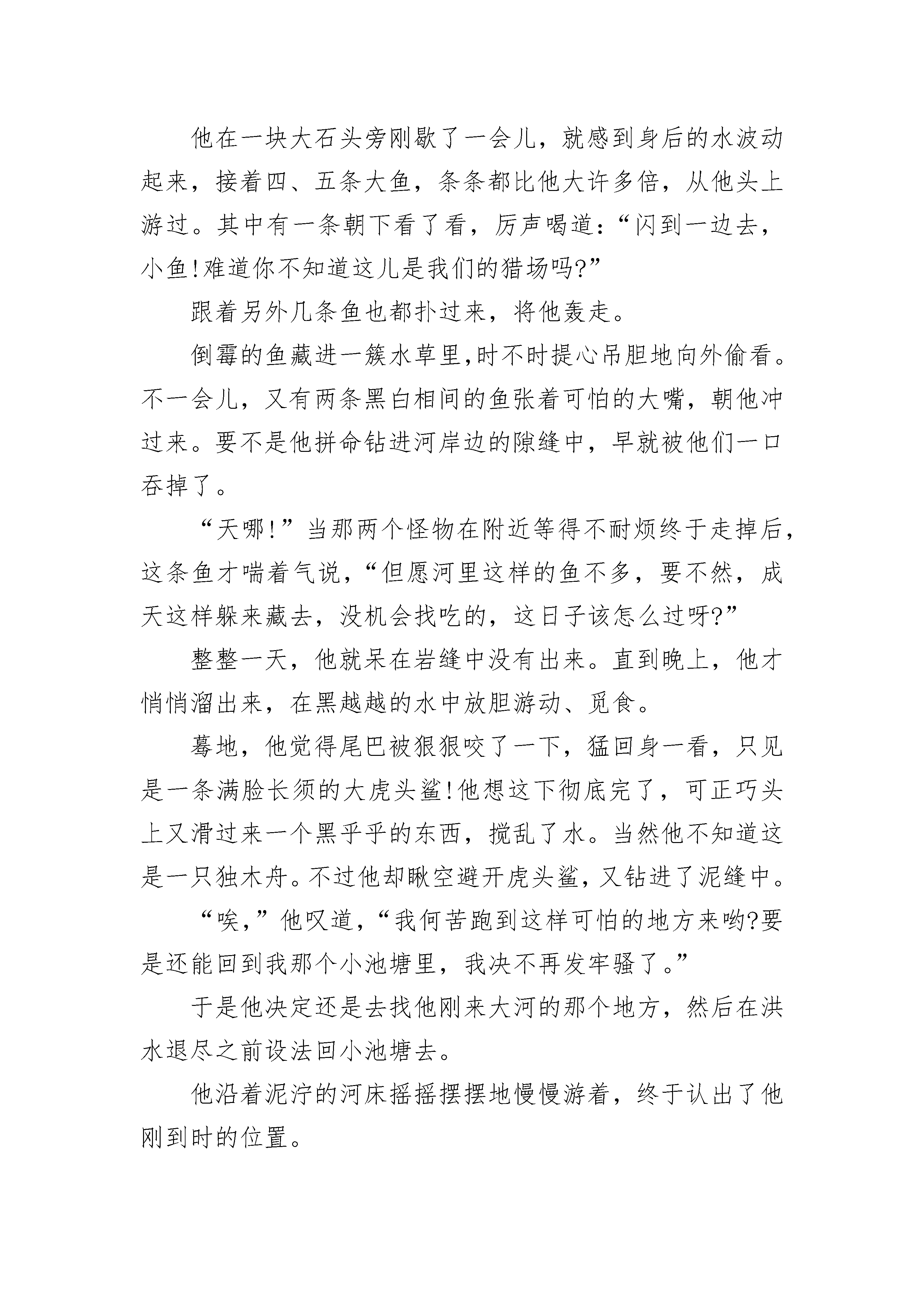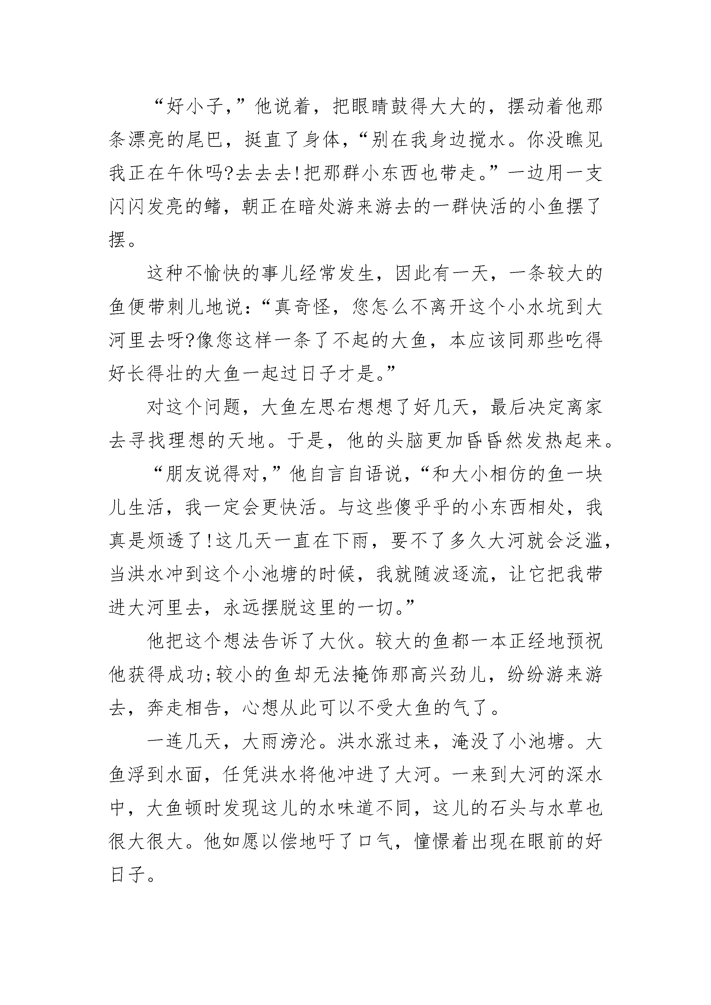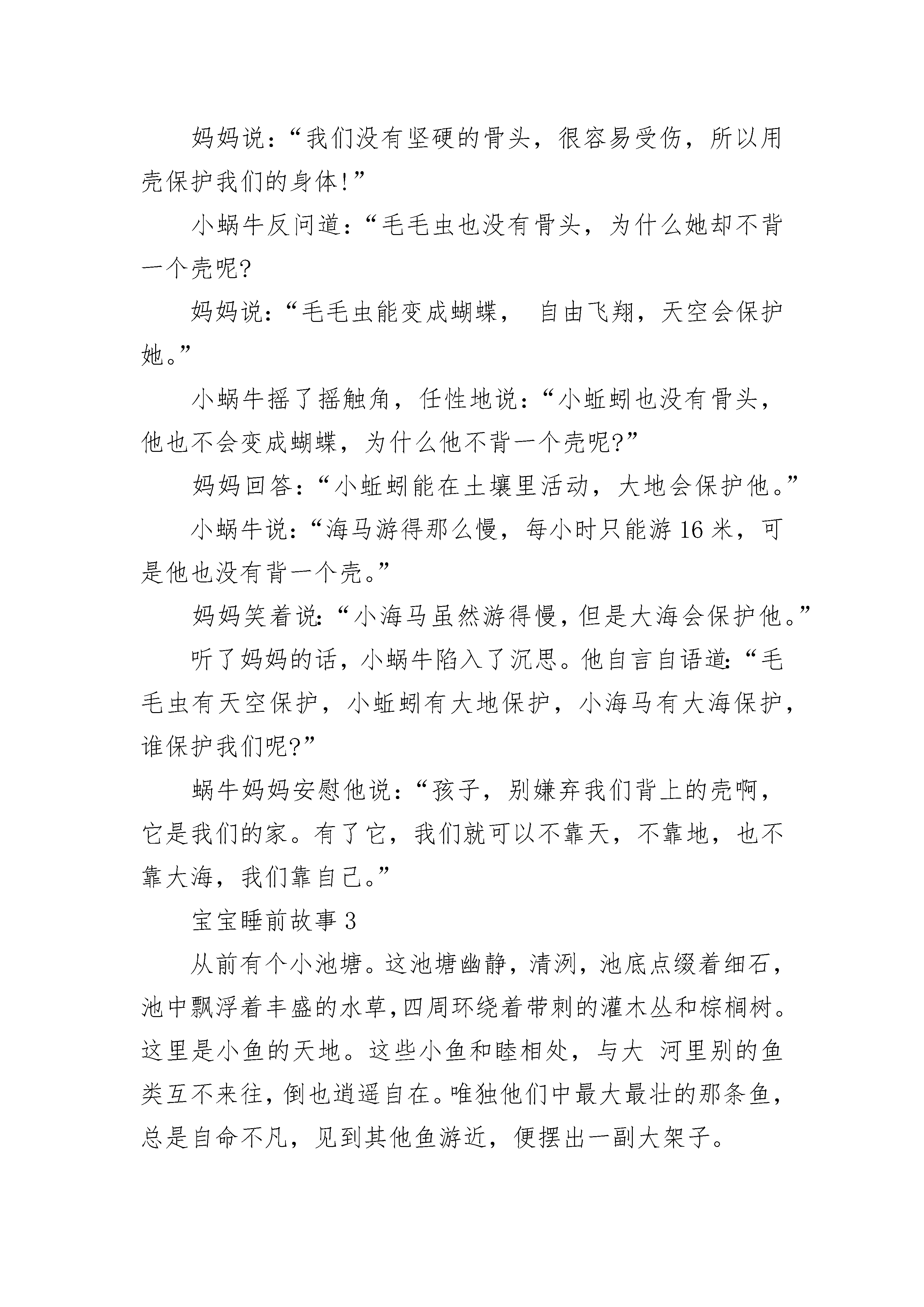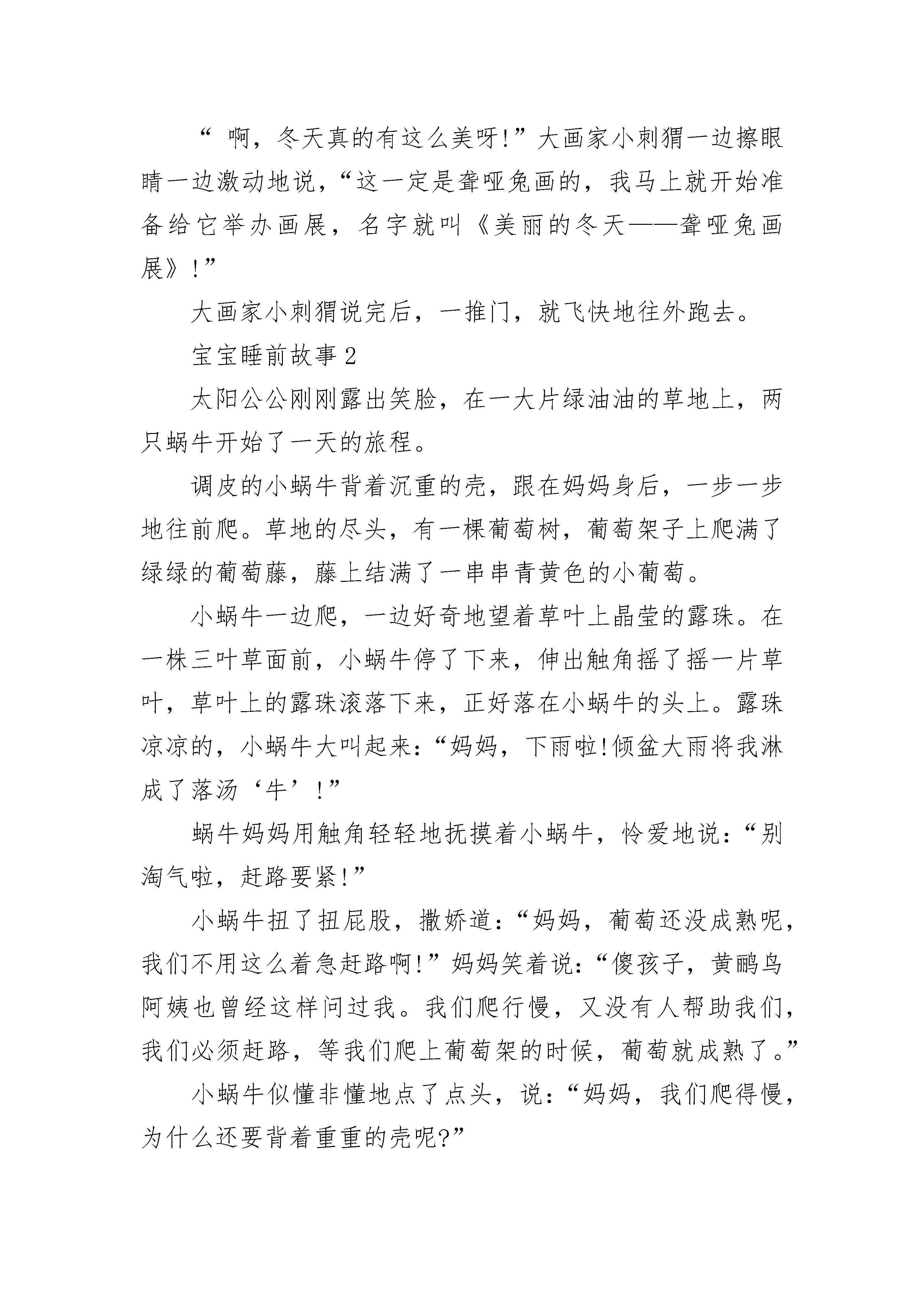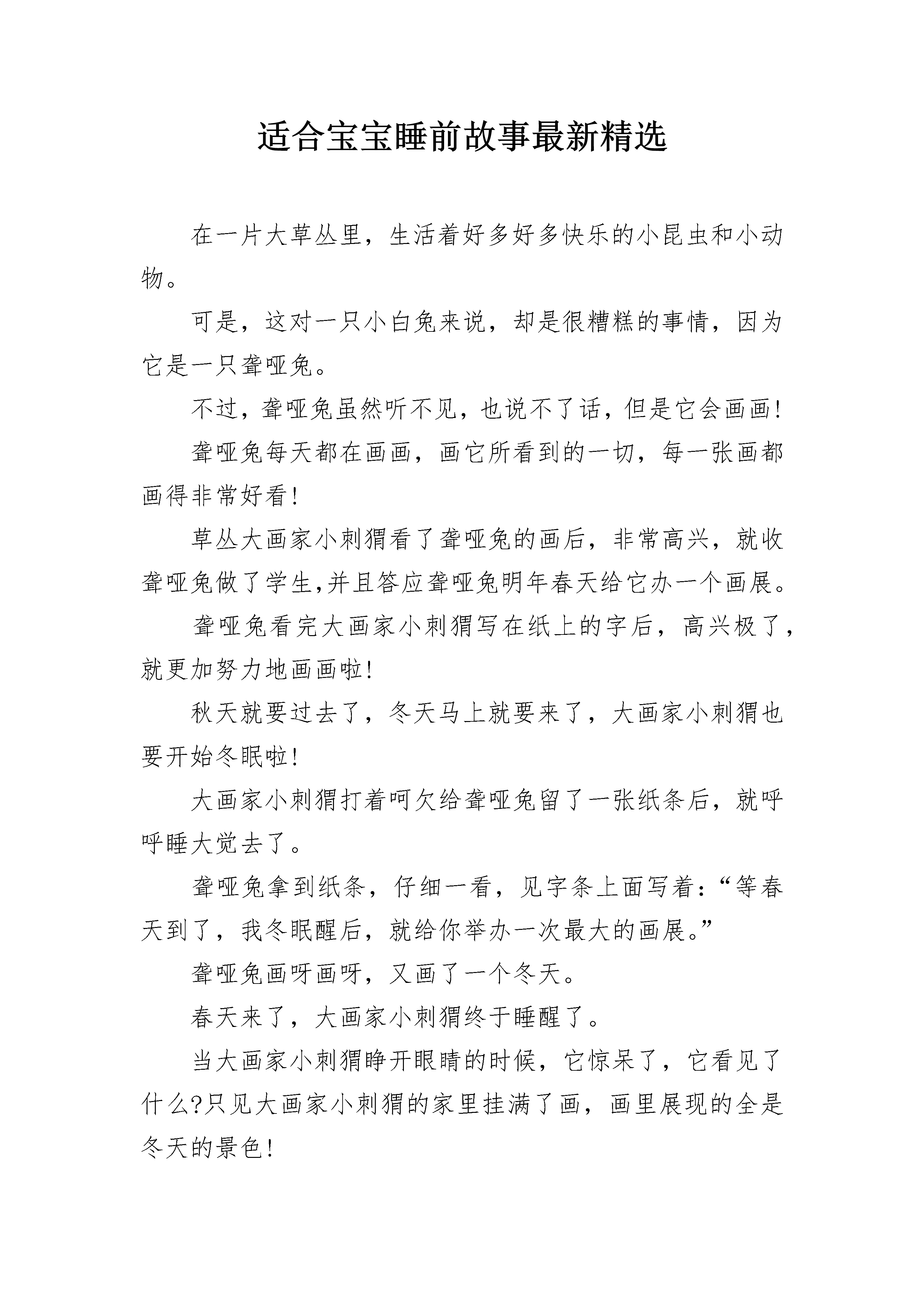 适合宝宝睡前故事最新精选在一片大草丛里,生活着好多好多快乐的小昆虫和小动物。可是,这对一只小白兔来说,却是很糟糕的事情,因为它是一只聋哑兔。不过,聋哑兔虽然听不见,也说不了话,但是它会画画!聋哑兔每天都在画画,画它所看到的一切,每一张画都画得非常好看!草丛大画家小刺猬看了聋哑兔的画后,非常高兴,就收聋哑兔做了学生,并且答应聋哑兔明年春天给它办一个画展。聋哑兔看完大画家小刺猬写在纸上的字后,高兴极了,就更加努力地画画啦!秋天就要过去了,冬天马上就要来了,大画家小刺猬也要开始冬眠啦!大画家小刺猬打着呵欠给聋哑兔留了一张纸条后,就呼呼睡大觉去了。聋哑兔拿到纸条,仔细一看,见字条上面写着:“等春天到了,我冬眠醒后,就给你举办一次最大的画展。”聋哑兔画呀画呀,又画了一个冬天。春天来了,大画家小刺猬终于睡醒了。当大画家小刺猬睁开眼睛的时候,它惊呆了,它看见了什么?只见大画家小刺猬的家里挂满了画,画里展现的全是冬天的景色!“啊,冬天真的有这么美呀!”大画家小刺猬一边擦眼睛一边激动地说,“这一定是聋哑兔画的,我马上就开始准备给它举办画展,名字就叫《美丽的冬天——聋哑兔画展》!”大画家小刺猬说完后,一推门,就飞快地往外跑去。宝宝睡前故事2太阳公公刚刚露出笑脸,在一大片绿油油的草地上,两只蜗牛开始了一天的旅程。调皮的小蜗牛背着沉重的壳,跟在妈妈身后,一步一步地往前爬。草地的尽头,有一棵葡萄树,葡萄架子上爬满了绿绿的葡萄藤,藤上结满了一串串青黄色的小葡萄。小蜗牛一边爬,一边好奇地望着草叶上晶莹的露珠。在一株三叶草面前,小蜗牛停了下来,伸出触角摇了摇一片草叶,草叶上的露珠滚落下来,正好落在小蜗牛的头上。露珠凉凉的,小蜗牛大叫起来:“妈妈,下雨啦!倾盆大雨将我淋成了落汤‘牛’!”蜗牛妈妈用触角轻轻地抚摸着小蜗牛,怜爱地说:“别淘气啦,赶路要紧!”小蜗牛扭了扭屁股,撒娇道:“妈妈,葡萄还没成熟呢,我们不用这么着急赶路啊!”妈妈笑着说:“傻孩子,黄鹂鸟阿姨也曾经这样问过我。我们爬行慢,又没有人帮助我们,我们必须赶路,等我们爬上葡萄架的时候,葡萄就成熟了。”小蜗牛似懂非懂地点了点头,说:“妈妈,我们爬得慢,为什么还要背着重重的壳呢?”妈妈说:“我们没有坚硬的骨头,很容易受伤,所以用壳保护我们的身体!”小蜗牛反问道:“毛毛虫也没有骨头,为什么她却不背一个壳呢?妈妈说:“毛毛虫能变成蝴蝶,自由飞翔,天空会保护她。”小蜗牛摇了摇触角,任性地说:“小蚯蚓也没有骨头,他也不会变成蝴蝶,为什么他不背一个壳呢?”妈妈回答:“小蚯蚓能在土壤里活动,大地会保护他。”小蜗牛说:“海马游得那么慢,每小时只能游16米,可是他也没有背一个壳。”妈妈笑着说:“小海马虽然游得慢,但是大海会保护他。”听了妈妈的话,小蜗牛陷入了沉思。他自言自语道:“毛毛虫有天空保护,小蚯蚓有大地保护,小海马有大海保护,谁保护我们呢?”蜗牛妈妈安慰他说:“孩子,别嫌弃我们背上的壳啊,它是我们的家。有了它,我们就可以不靠天,不靠地,也不靠大海,我们靠自己。”宝宝睡前故事3从前有个小池塘。这池塘幽静,清洌,池底点缀着细石,池中飘浮着丰盛的水草,四周环绕着带刺的灌木丛和棕榈树。这里是小鱼的天地。这些小鱼和睦相处,与大河里别的鱼类互不来往,倒也逍遥自在。唯独他们中最大最壮的那条鱼,总是自命不凡,见到其他鱼游近,便摆出一副大架子。“好小子,”他说着,把眼睛鼓得大大的,摆动着他那条漂亮的尾巴,挺直了身体,“别在我身边搅水。你没瞧见我正在午休吗?去去去!把那群小东西也带走。”一边用一支闪闪发亮的鳍,朝正在暗处游来游去的一群快活的小鱼摆了摆。这种不愉快的事儿经常发生,因此有一天,一条较大的鱼便带刺儿地说:“真奇怪,您怎么不离开这个小水坑到大河里去呀?像您这样一条了不起的大鱼,本应该同那些吃得好长得壮的大鱼一起过日子才是。”对这个问题,大鱼左思右想想了好几天,最后决定离家去寻找理想的天地。于是,他的头脑更加昏昏然发热起来。“朋友说得对,”他自言自语说,“和大小相仿的鱼一块儿生活,我一定会更快活。与这些傻乎乎的小东西相处,我真是烦透了!这几天一直在下雨,要不了多久大河就会泛滥,当洪水冲到这个小池塘的时候,我就随波逐流,让它把我带进大河里去,永远摆脱这里的一切。”他把这个想法告诉了大伙。较大的鱼都一本正经地预祝他获得成功;较小的鱼却无法掩饰那高兴劲儿,纷纷游来游去,奔走相告,心想从此可以不受大鱼的气了。一连几天,大雨滂沦。洪水涨过来,淹没了小池塘。大鱼浮到水面,任凭洪水将他冲进了大河。一来到大河的深水中,大鱼顿时发现这儿的水味道不同,这儿的石头与水草也很大很大。他如愿以偿地吁了口气,憧憬着出现在眼前的好日子。他在一块大石头旁刚歇了一会儿,就感到身后的水波动起来,接着四、五条大鱼,条条都比他大许多倍,从他头上游过。其中有一条朝下