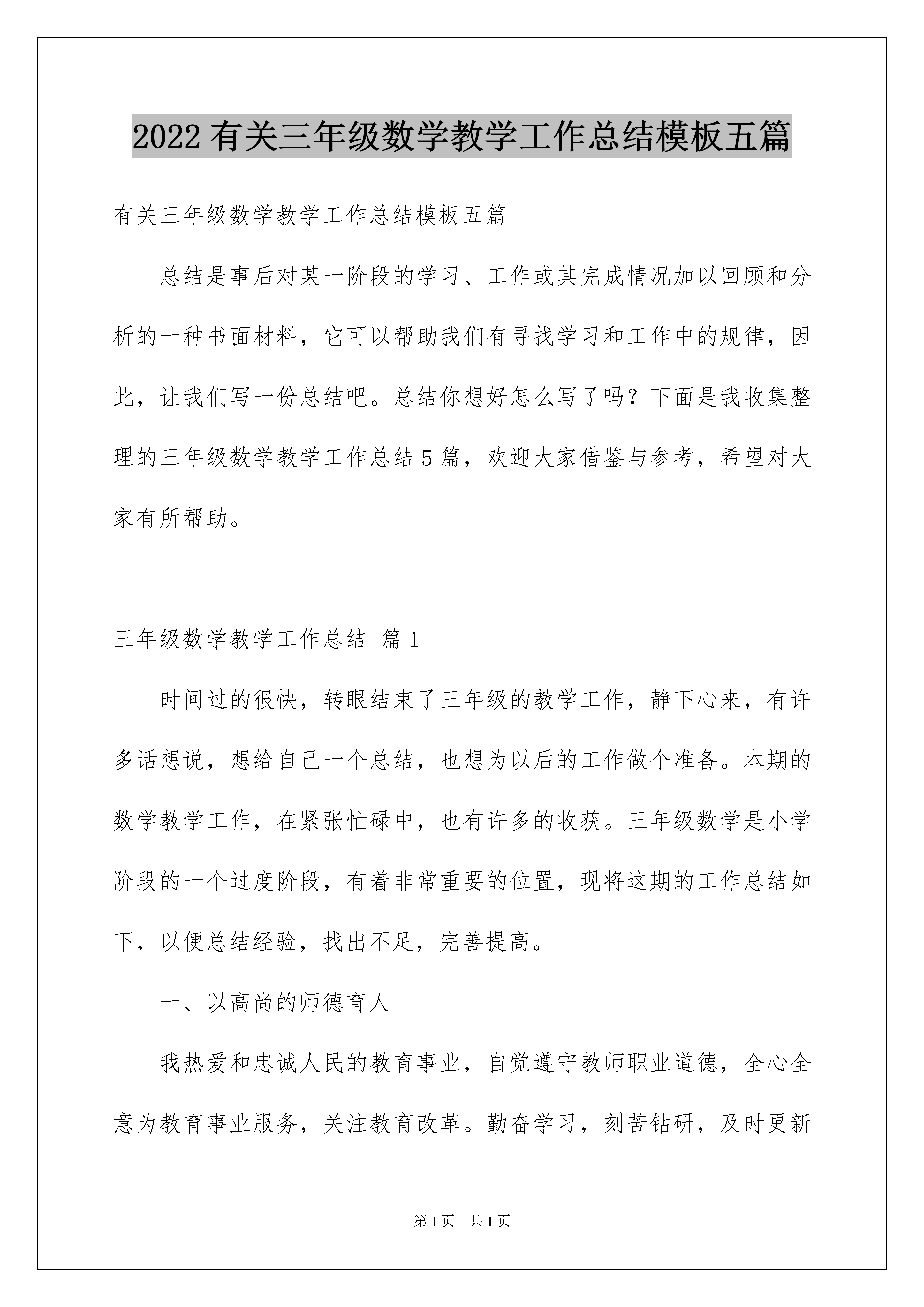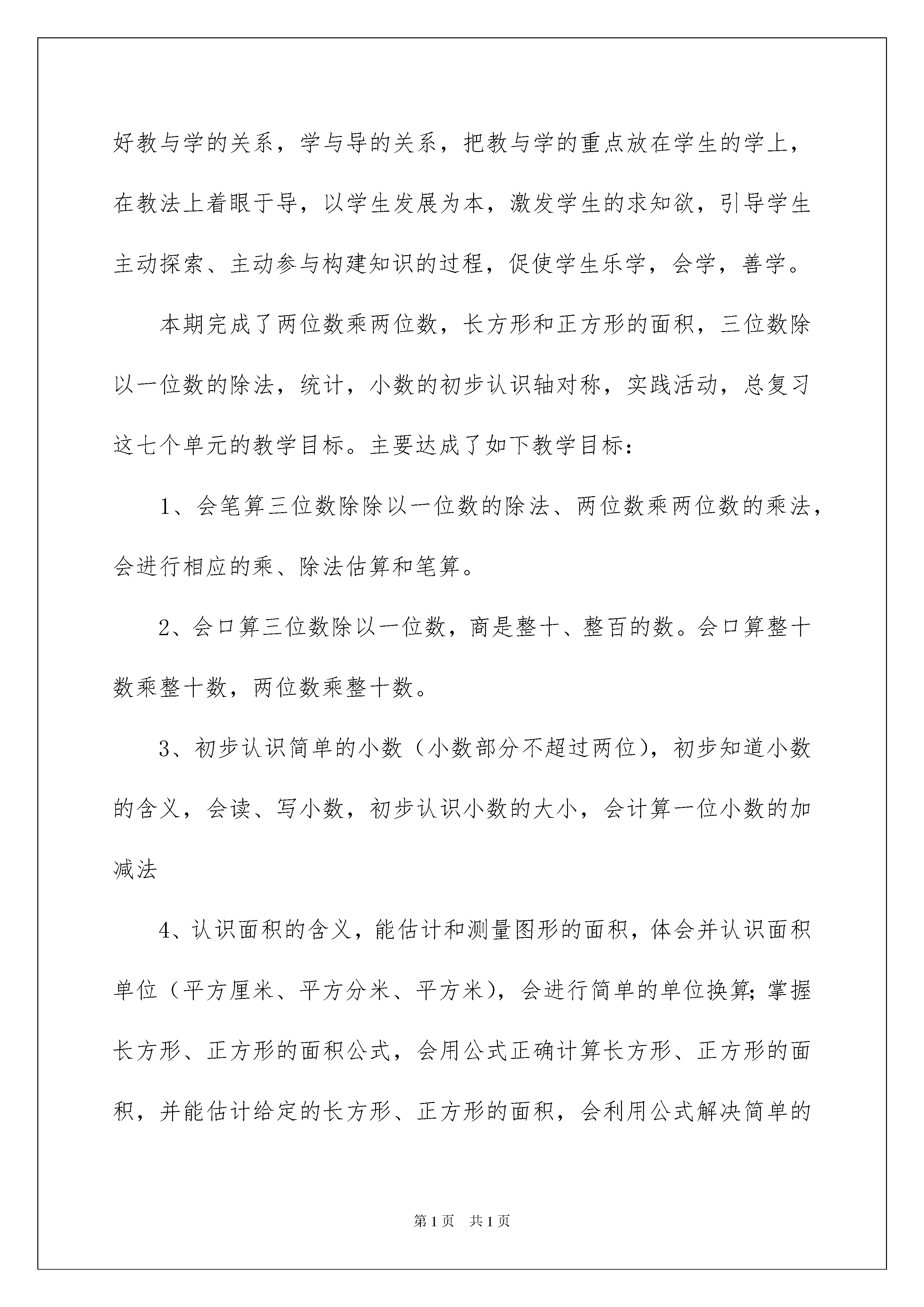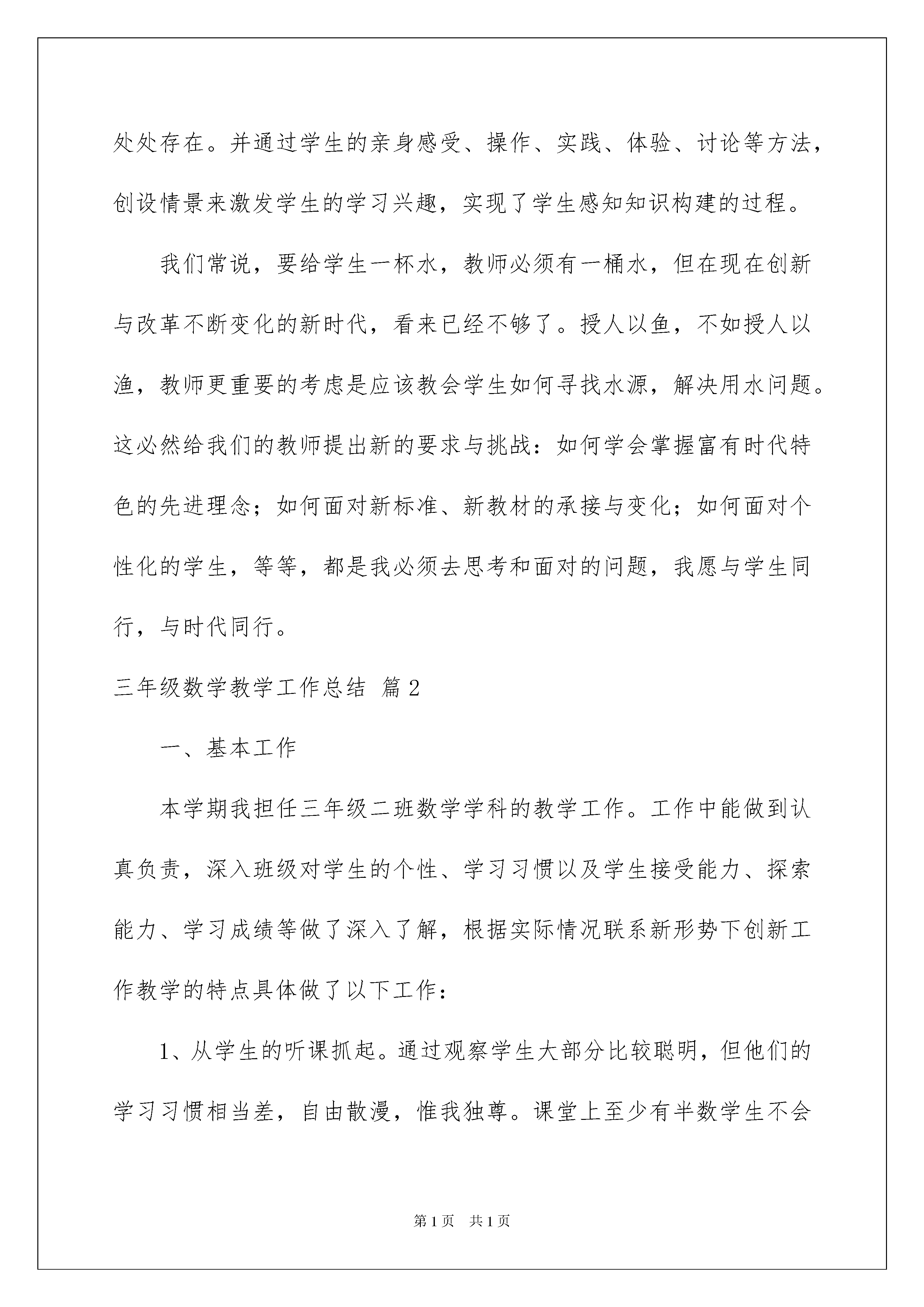 2022有关三年级数学教学工作总结模板五篇有关三年级数学教学工作总结模板五篇总结是事后对某一阶段的学习、工作或其完成情况加以回顾和分析的一种书面材料,它可以帮助我们有寻找学习和工作中的规律,因此,让我们写一份总结吧。总结你想好怎么写了吗?下面是我收集整理的三年级数学教学工作总结5篇,欢迎大家借鉴与参考,希望对大家有所帮助。三年级数学教学工作总结篇1时间过的很快,转眼结束了三年级的教学工作,静下心来,有许多话想说,想给自己一个总结,也想为以后的工作做个准备。本期的数学教学工作,在紧张忙碌中,也有许多的收获。三年级数学是小学阶段的一个过度阶段,有着非常重要的位置,现将这期的工作总结如下,以便总结经验,找出不足,完善提高。一、以高尚的师德育人我热爱和忠诚人民的教育事业,自觉遵守教师职业道德,全心全意为教育事业服务,关注教育改革。勤奋学习,刻苦钻研,及时更新知识,不断提高教育和教学能力。以认真负责的态度上好每堂课;用满腔的爱关心学生,关心学生的学习,生活,积极做好学生的思想工作,循循善诱,既教书又育人。能主动、认真地服从和配合学校各级领导安排的工作,与同事们团结协作,相互帮助,共同完成学校交给的各项工作任务。二、以认真的态度学习新时代要求教师要不断更新充实自己的学识,要有终身学习的观念,具备渊博的知识和多方面的才能对每一位教师来说很重要。因为我们的产品会说话,会思考,他们什么问题都会提出来,而且往往"打破沙锅问到底"。没有广博的知识,就不能很好地解学生之"惑",传为人之"道"。所以我认真参加学校组织的各种教研活动,我努力学习别人先进的教学经验,改变旧的教学观念,把新的教学理念运用在自己教育教学之上。三、以满腔的热情教学著名教育心理学家布鲁纳认为:"认知是一个过程,而不是一个结果。"因此,他强调"教一个人某门学科,不是要他把一些结果记下来,而是教他参与把知识建立起来的过程。"我在教学课堂教学中正确处理好教与学的关系,学与导的关系,把教与学的重点放在学生的学上,在教法上着眼于导,以学生发展为本,激发学生的求知欲,引导学生主动探索、主动参与构建知识的过程,促使学生乐学,会学,善学。本期完成了两位数乘两位数,长方形和正方形的面积,三位数除以一位数的除法,统计,小数的初步认识轴对称,实践活动,总复习这七个单元的教学目标。主要达成了如下教学目标:1、会笔算三位数除除以一位数的除法、两位数乘两位数的乘法,会进行相应的乘、除法估算和笔算。2、会口算三位数除以一位数,商是整十、整百的数。会口算整十数乘整十数,两位数乘整十数。3、初步认识简单的小数(小数部分不超过两位),初步知道小数的含义,会读、写小数,初步认识小数的大小,会计算一位小数的加减法4、认识面积的含义,能估计和测量图形的面积,体会并认识面积单位(平方厘米、平方分米、平方米),会进行简单的单位换算;掌握长方形、正方形的面积公式,会用公式正确计算长方形、正方形的面积,并能估计给定的长方形、正方形的面积,会利用公式解决简单的实际问题。5、了解统计图,初步学会简单的数据分析;能初步体会统计在现实生活中的作用。6、初步认识轴对称,知道生活中的对称现象和轴对称图形,了解生活中的对称美,感受数学来源于生活。7、经历从实际生活中发现问题、提出问题、解决问题的过程,体会数学在日常生活中的作用,初步形成综合运用数学知识解决问题的能力。8、体会学习数学的乐趣,提高学习数学的兴趣,建立学好数学的信心。9、养成认真作业、书写整洁的'良好习惯。总之,在整个教学工作只,我认真地备好每一节课,在备课中,我认真钻研教材、教学用书。学习好新教学大纲,虚心地学习别人的先进经验。力求吃透教材,找准重点、难点。认真的上好每一节课,上课时认真讲课,力求抓住重点,突破难点。运用多种教学方法。从学生的实际出发,注意调动学生学习的积极性和创造性。在教学中,有意识地通过生活、实例、活动、游戏等形式引入新知识点,让学生感受数学知识在日常生活中处处存在。并通过学生的亲身感受、操作、实践、体验、讨论等方法,创设情景来激发学生的学习兴趣,实现了学生感知知识构建的过程。我们常说,要给学生一杯水,教师必须有一桶水,但在现在创新与改革不断变化的新时代,看来已经不够了。授人以鱼,不如授人以渔,教师更重要的考虑是应该教会学生如何寻找水源,解决用水问题。这必然给我们的教师提出新的要求与挑战:如何学会掌握富有时代特色的先进理念;如何面对新标准、新教材的承接与变化;如何面对个性化的学生,等等,都是我必须去思考和面对的问题,我愿与学生同行,与时代同行。三年级数学教学工作总结篇2一、基本工作本学期我担任三年级二班数