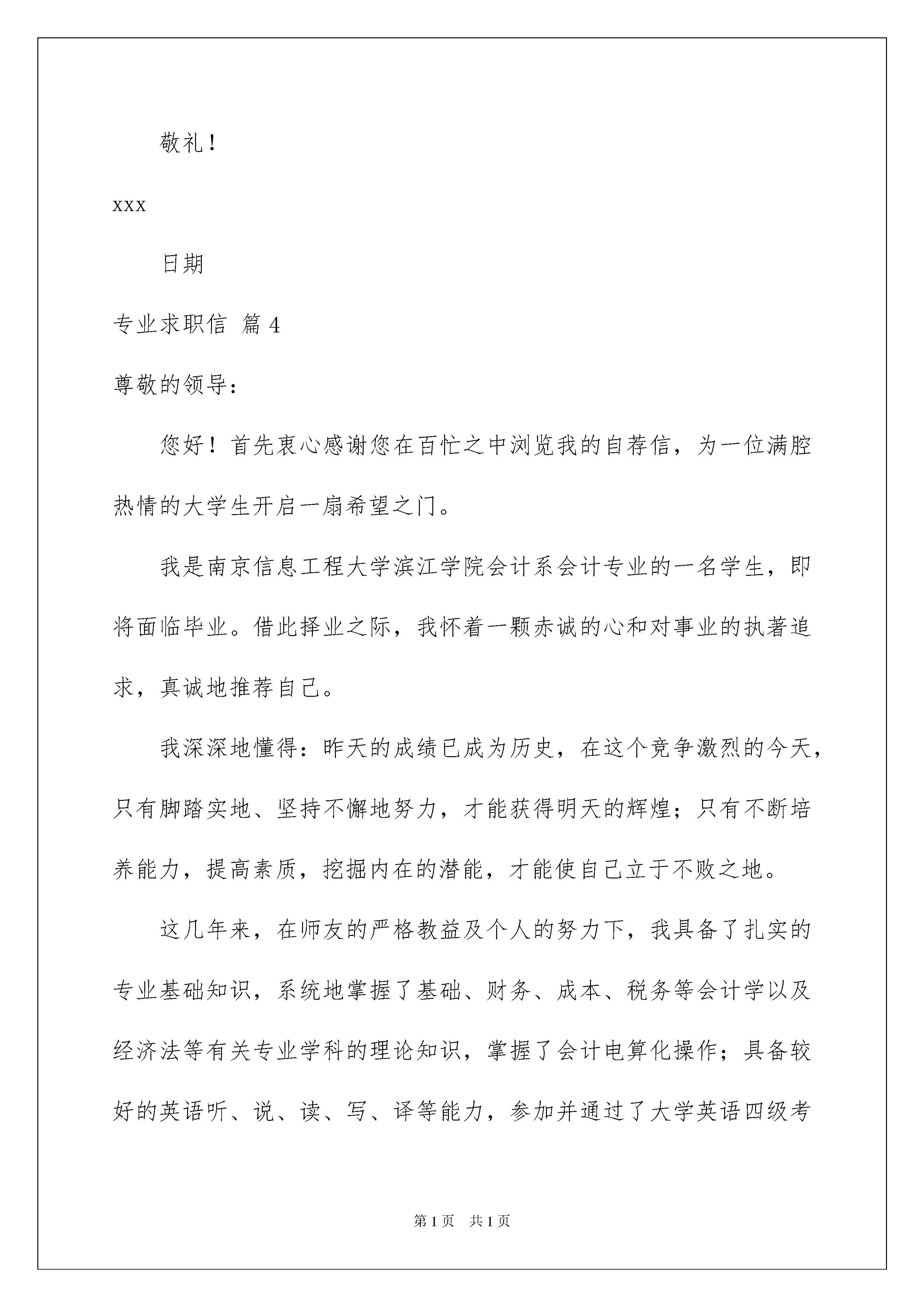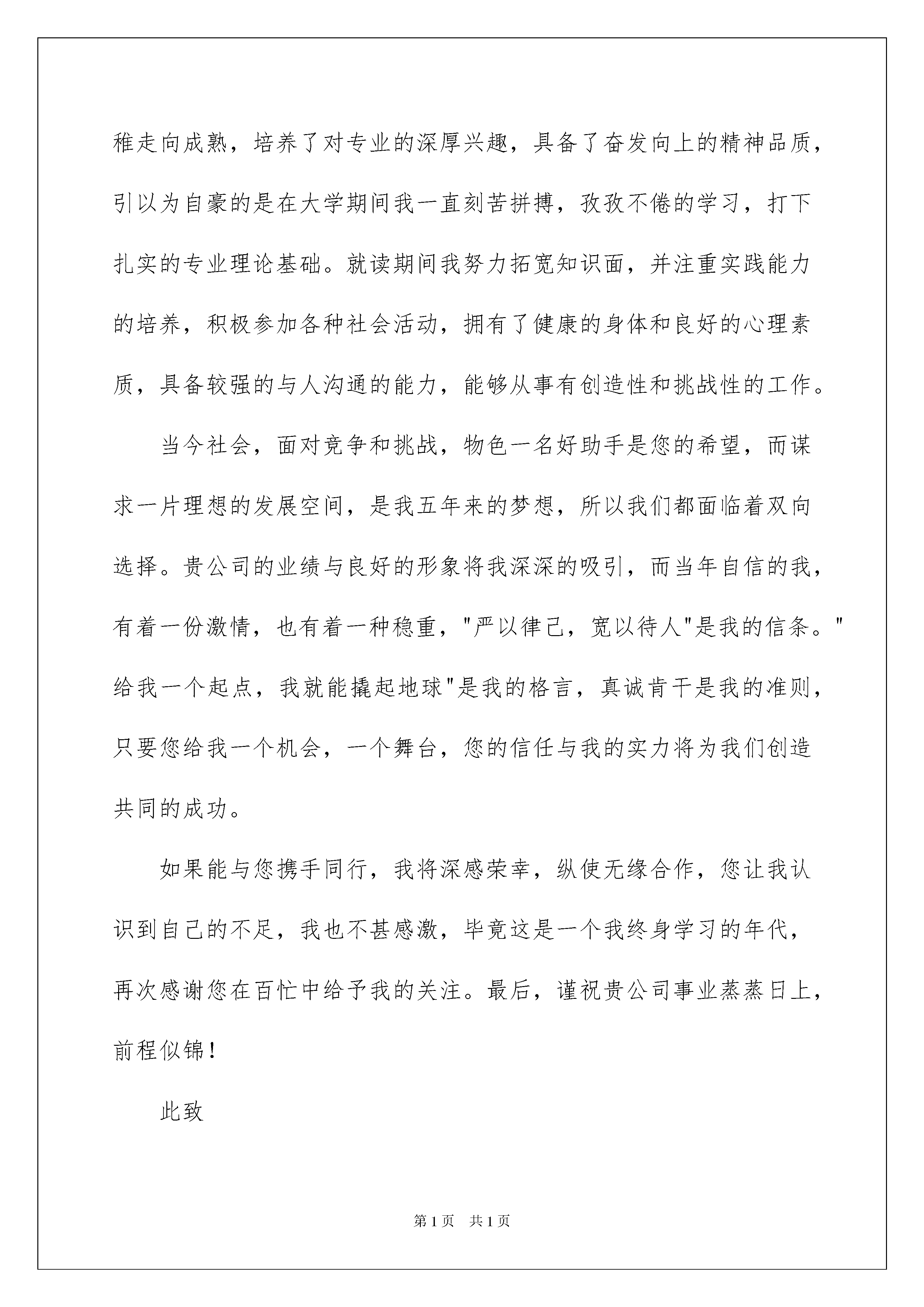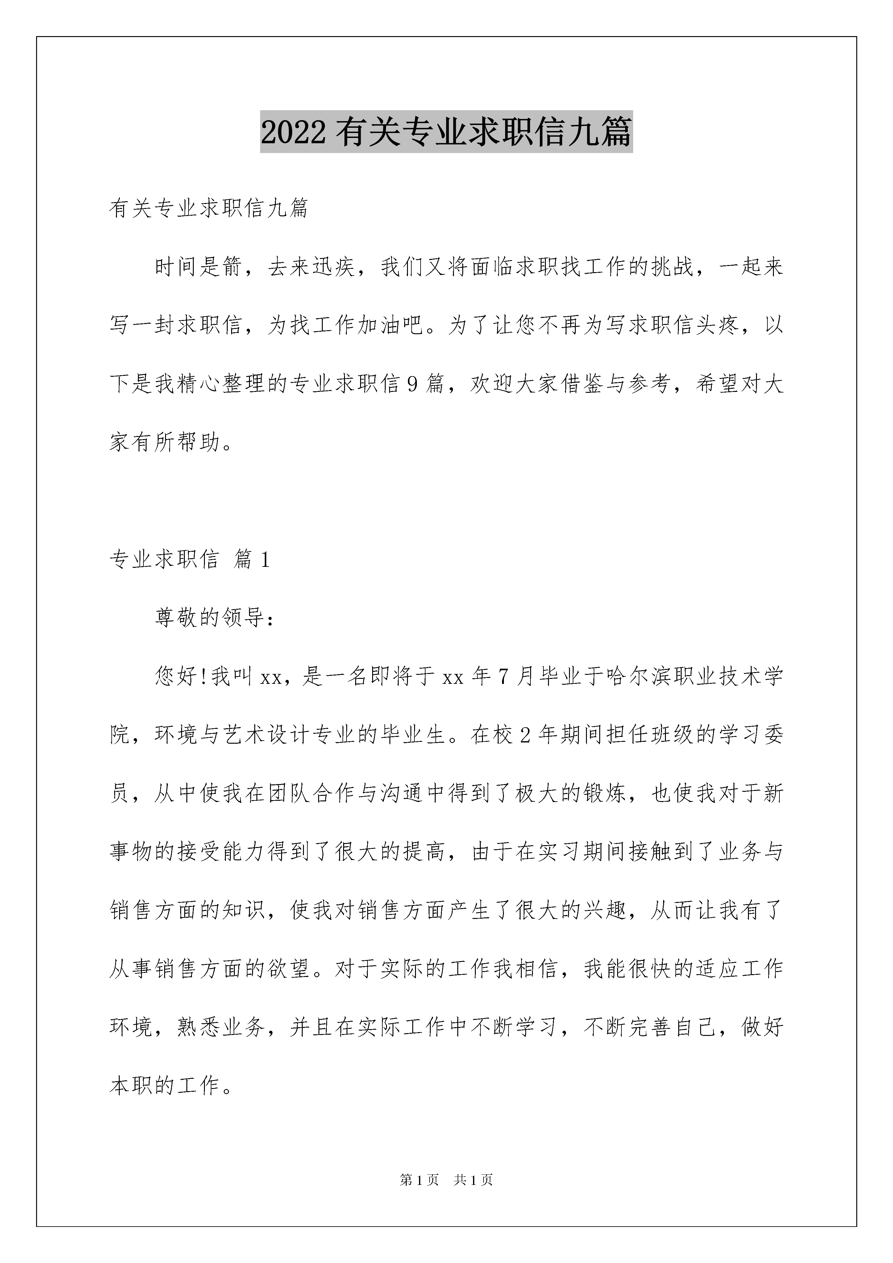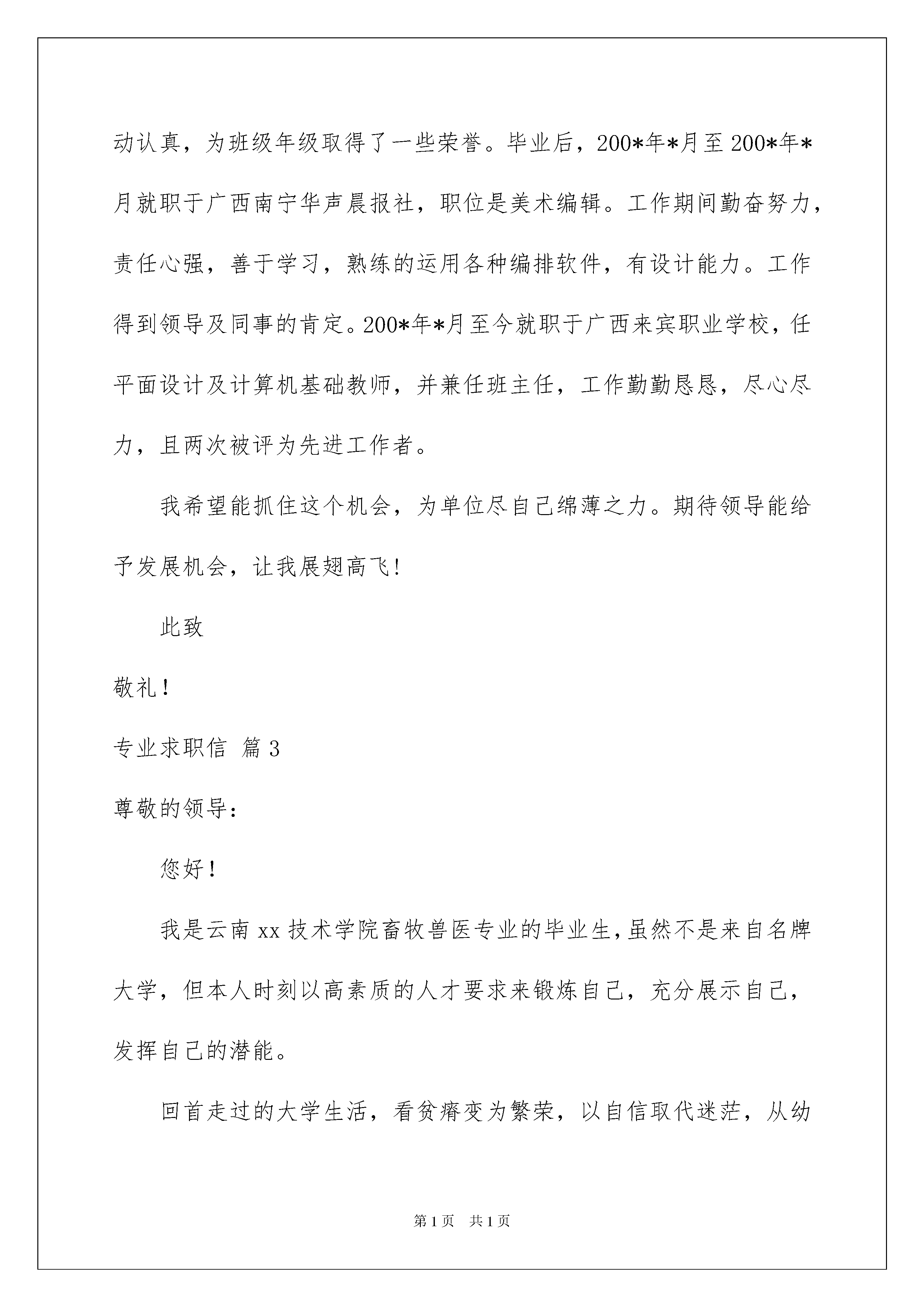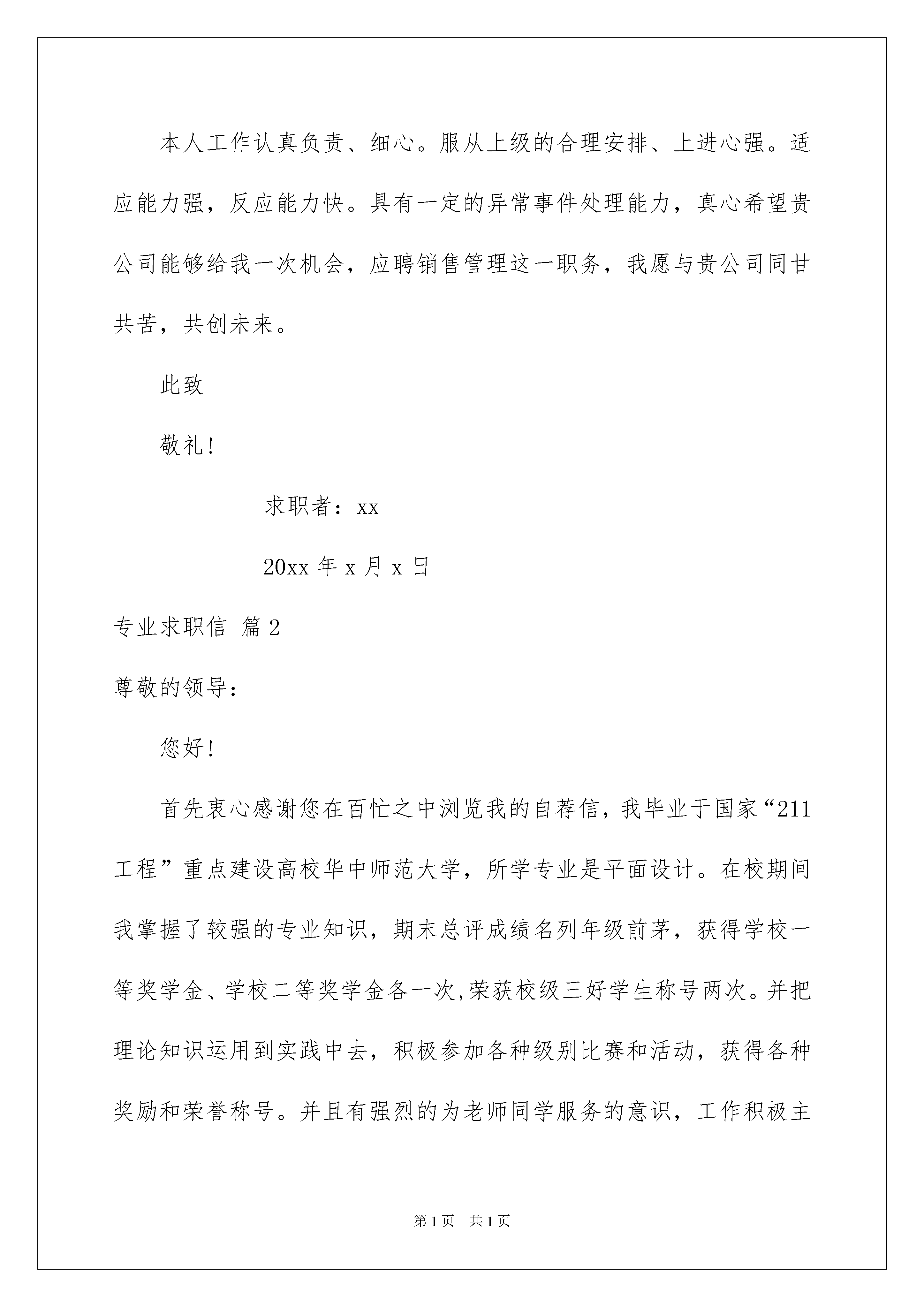 2022有关专业求职信九篇有关专业求职信九篇时间是箭,去来迅疾,我们又将面临求职找工作的挑战,一起来写一封求职信,为找工作加油吧。为了让您不再为写求职信头疼,以下是我精心整理的专业求职信9篇,欢迎大家借鉴与参考,希望对大家有所帮助。专业求职信篇1尊敬的领导:您好!我叫xx,是一名即将于xx年7月毕业于哈尔滨职业技术学院,环境与艺术设计专业的毕业生。在校2年期间担任班级的学习委员,从中使我在团队合作与沟通中得到了极大的锻炼,也使我对于新事物的接受能力得到了很大的提高,由于在实习期间接触到了业务与销售方面的知识,使我对销售方面产生了很大的兴趣,从而让我有了从事销售方面的欲望。对于实际的工作我相信,我能很快的适应工作环境,熟悉业务,并且在实际工作中不断学习,不断完善自己,做好本职的工作。本人工作认真负责、细心。服从上级的合理安排、上进心强。适应能力强,反应能力快。具有一定的异常事件处理能力,真心希望贵公司能够给我一次机会,应聘销售管理这一职务,我愿与贵公司同甘共苦,共创未来。此致敬礼!求职者:xx20xx年x月x日专业求职信篇2尊敬的领导:您好!首先衷心感谢您在百忙之中浏览我的自荐信,我毕业于国家“211工程”重点建设高校华中师范大学,所学专业是平面设计。在校期间我掌握了较强的专业知识,期末总评成绩名列年级前茅,获得学校一等奖学金、学校二等奖学金各一次,荣获校级三好学生称号两次。并把理论知识运用到实践中去,积极参加各种级别比赛和活动,获得各种奖励和荣誉称号。并且有强烈的为老师同学服务的意识,工作积极主动认真,为班级年级取得了一些荣誉。毕业后,200*年*月至200*年*月就职于广西南宁华声晨报社,职位是美术编辑。工作期间勤奋努力,责任心强,善于学习,熟练的运用各种编排软件,有设计能力。工作得到领导及同事的肯定。200*年*月至今就职于广西来宾职业学校,任平面设计及计算机基础教师,并兼任班主任,工作勤勤恳恳,尽心尽力,且两次被评为先进工作者。我希望能抓住这个机会,为单位尽自己绵薄之力。期待领导能给予发展机会,让我展翅高飞!此致敬礼!专业求职信篇3尊敬的领导:您好!我是云南xx技术学院畜牧兽医专业的毕业生,虽然不是来自名牌大学,但本人时刻以高素质的人才要求来锻炼自己,充分展示自己,发挥自己的潜能。回首走过的大学生活,看贫瘠变为繁荣,以自信取代迷茫,从幼稚走向成熟,培养了对专业的深厚兴趣,具备了奋发向上的精神品质,引以为自豪的是在大学期间我一直刻苦拼搏,孜孜不倦的学习,打下扎实的专业理论基础。就读期间我努力拓宽知识面,并注重实践能力的培养,积极参加各种社会活动,拥有了健康的身体和良好的心理素质,具备较强的与人沟通的能力,能够从事有创造性和挑战性的工作。当今社会,面对竞争和挑战,物色一名好助手是您的希望,而谋求一片理想的发展空间,是我五年来的梦想,所以我们都面临着双向选择。贵公司的业绩与良好的形象将我深深的吸引,而当年自信的我,有着一份激情,也有着一种稳重,"严以律己,宽以待人"是我的信条。"给我一个起点,我就能撬起地球"是我的格言,真诚肯干是我的准则,只要您给我一个机会,一个舞台,您的信任与我的实力将为我们创造共同的成功。如果能与您携手同行,我将深感荣幸,纵使无缘合作,您让我认识到自己的不足,我也不甚感激,毕竟这是一个我终身学习的年代,再次感谢您在百忙中给予我的关注。最后,谨祝贵公司事业蒸蒸日上,前程似锦!此致敬礼!xxx日期专业求职信篇4尊敬的领导:您好!首先衷心感谢您在百忙之中浏览我的自荐信,为一位满腔热情的大学生开启一扇希望之门。我是南京信息工程大学滨江学院会计系会计专业的一名学生,即将面临毕业。借此择业之际,我怀着一颗赤诚的心和对事业的执著追求,真诚地推荐自己。我深深地懂得:昨天的成绩已成为历史,在这个竞争激烈的今天,只有脚踏实地、坚持不懈地努力,才能获得明天的辉煌;只有不断培养能力,提高素质,挖掘内在的潜能,才能使自己立于不败之地。这几年来,在师友的严格教益及个人的努力下,我具备了扎实的专业基础知识,系统地掌握了基础、财务、成本、税务等会计学以及经济法等有关专业学科的理论知识,掌握了会计电算化操作;具备较好的英语听、说、读、写、译等能力,参加并通过了大学英语四级考试;能熟练操作计算机办公软件。同时,我利用课余时间参加了业余活动,也培养了自己多方面的技能。更重要的是,严谨的学风和端正的学习态度塑造了我朴实、稳重、创新的性格特点。我刻苦学习,力求上进,严谨认真。在校期间主修:《基础会计学》、《经济法基础》、《统计学原理》、《税法》、《成本会计学》、《会计信息系统》、《财务管理》