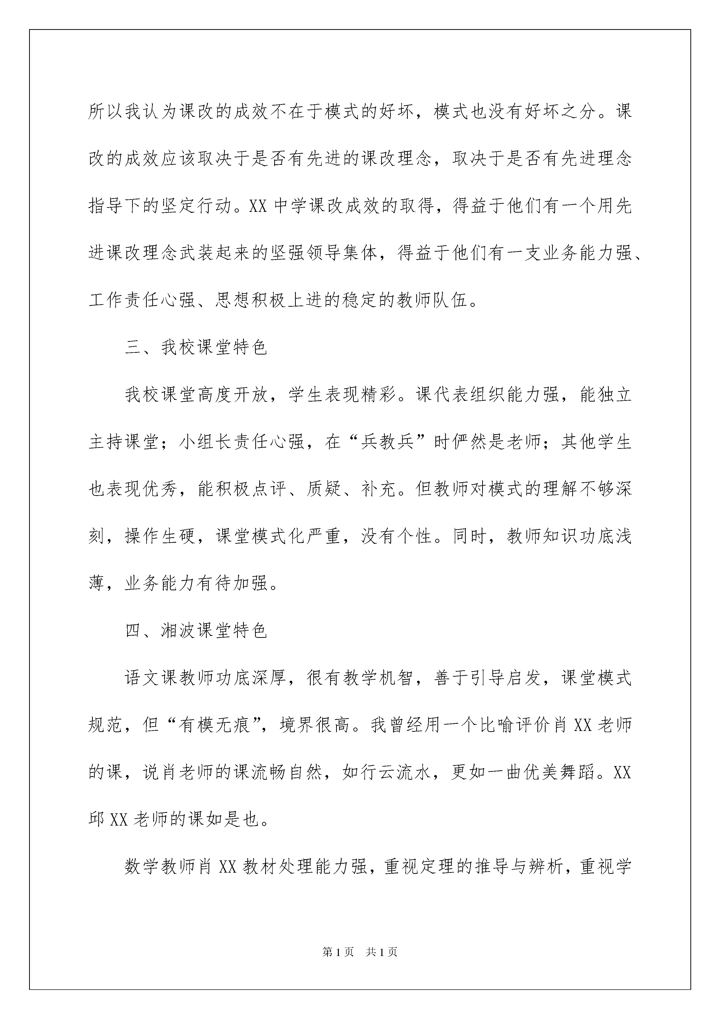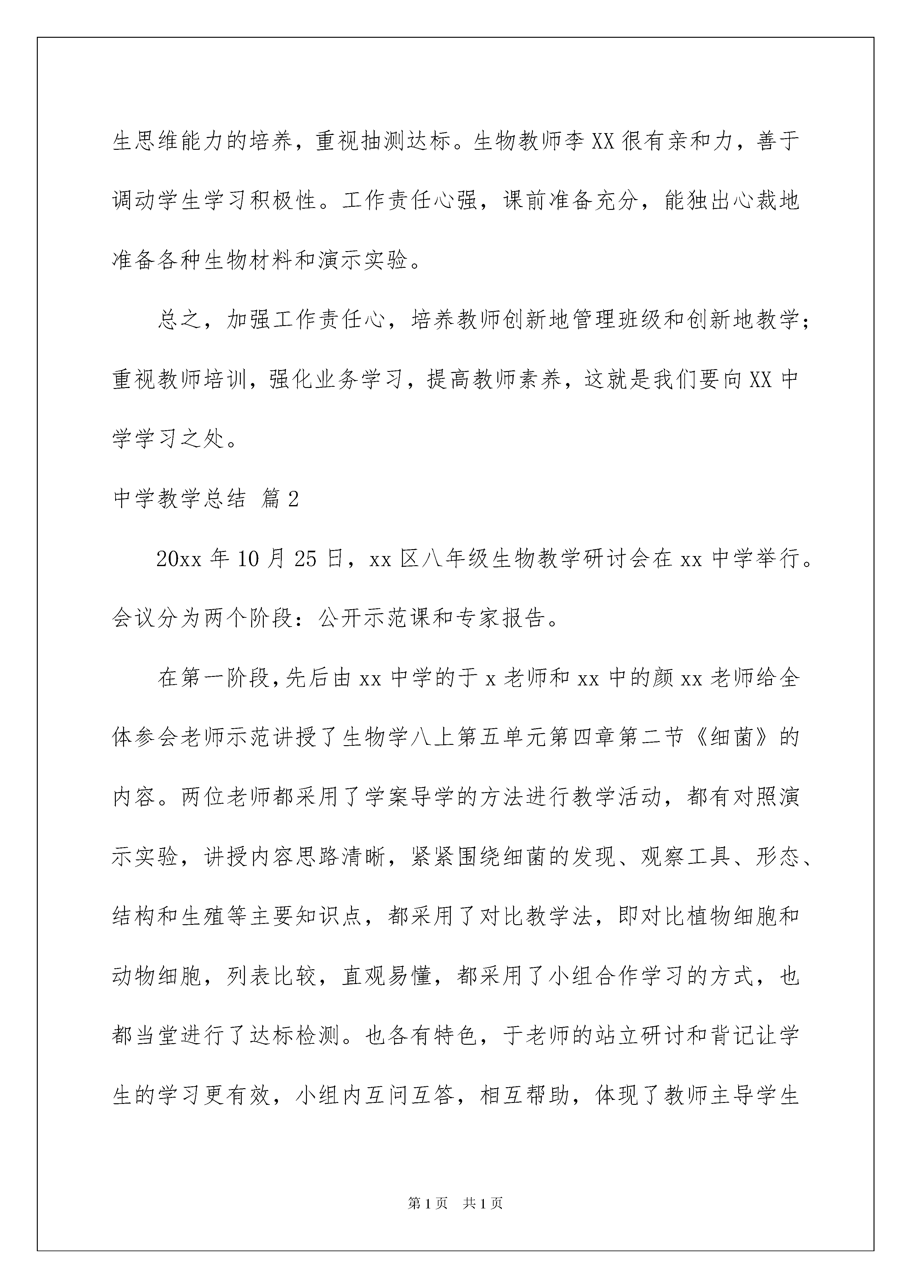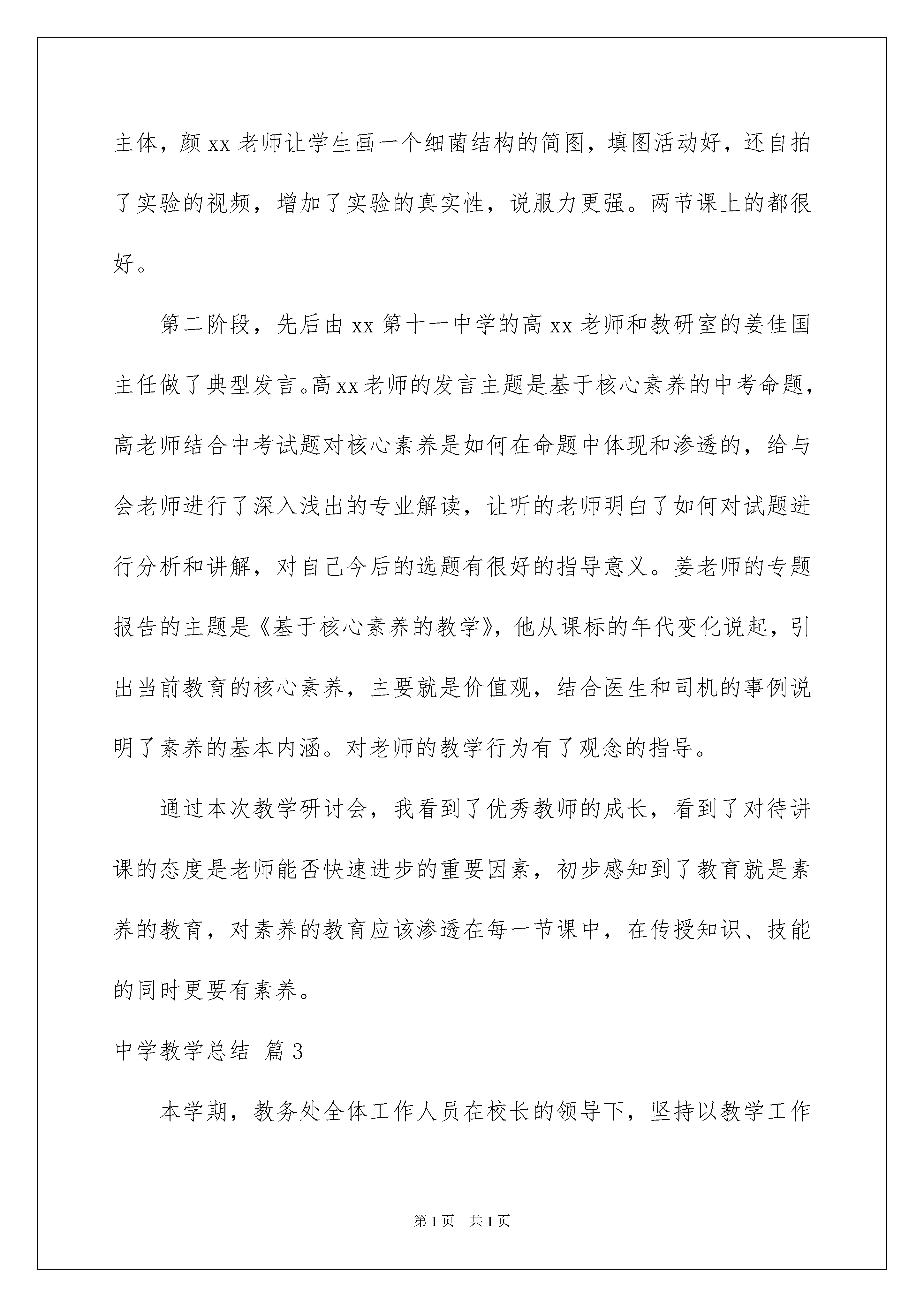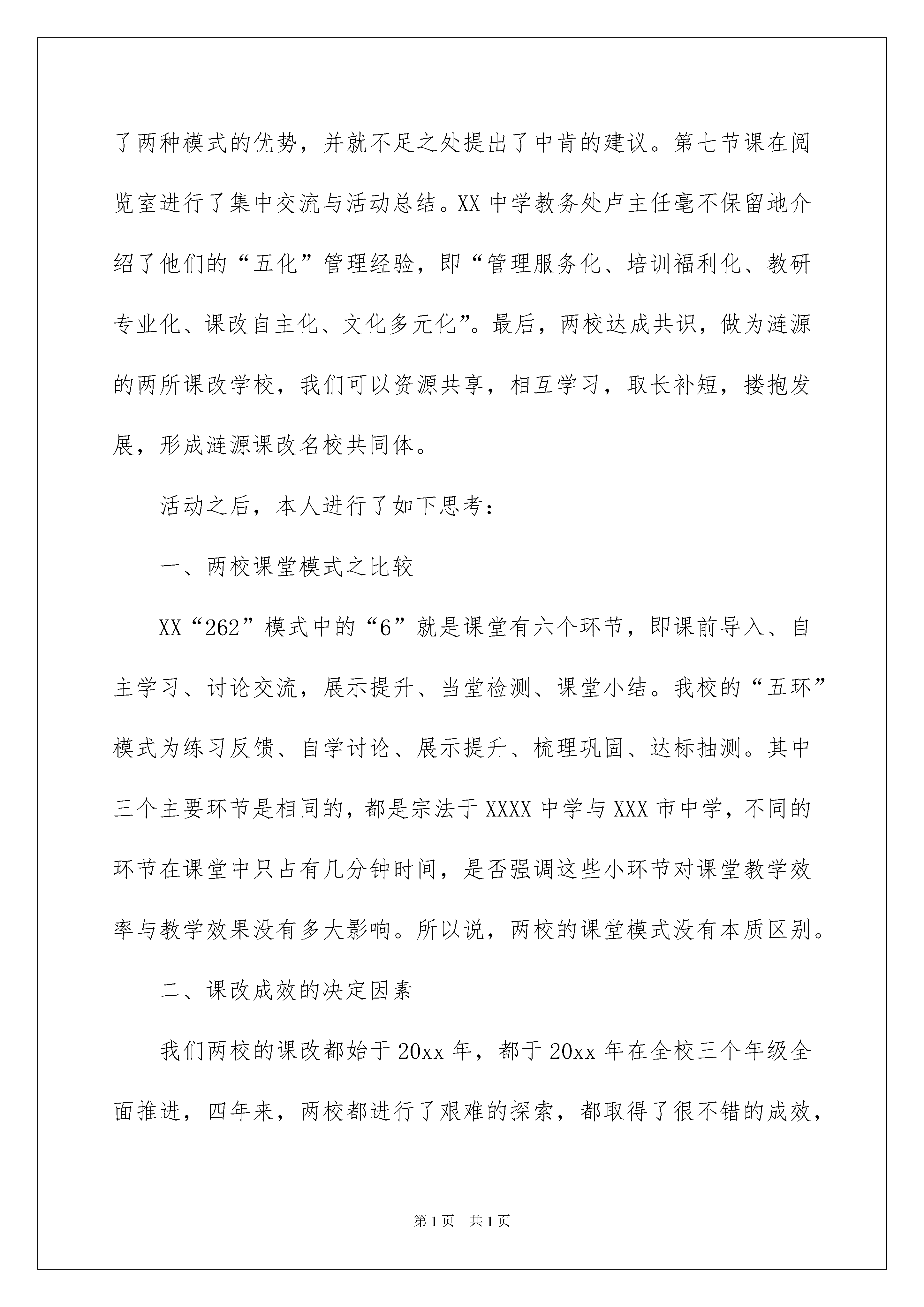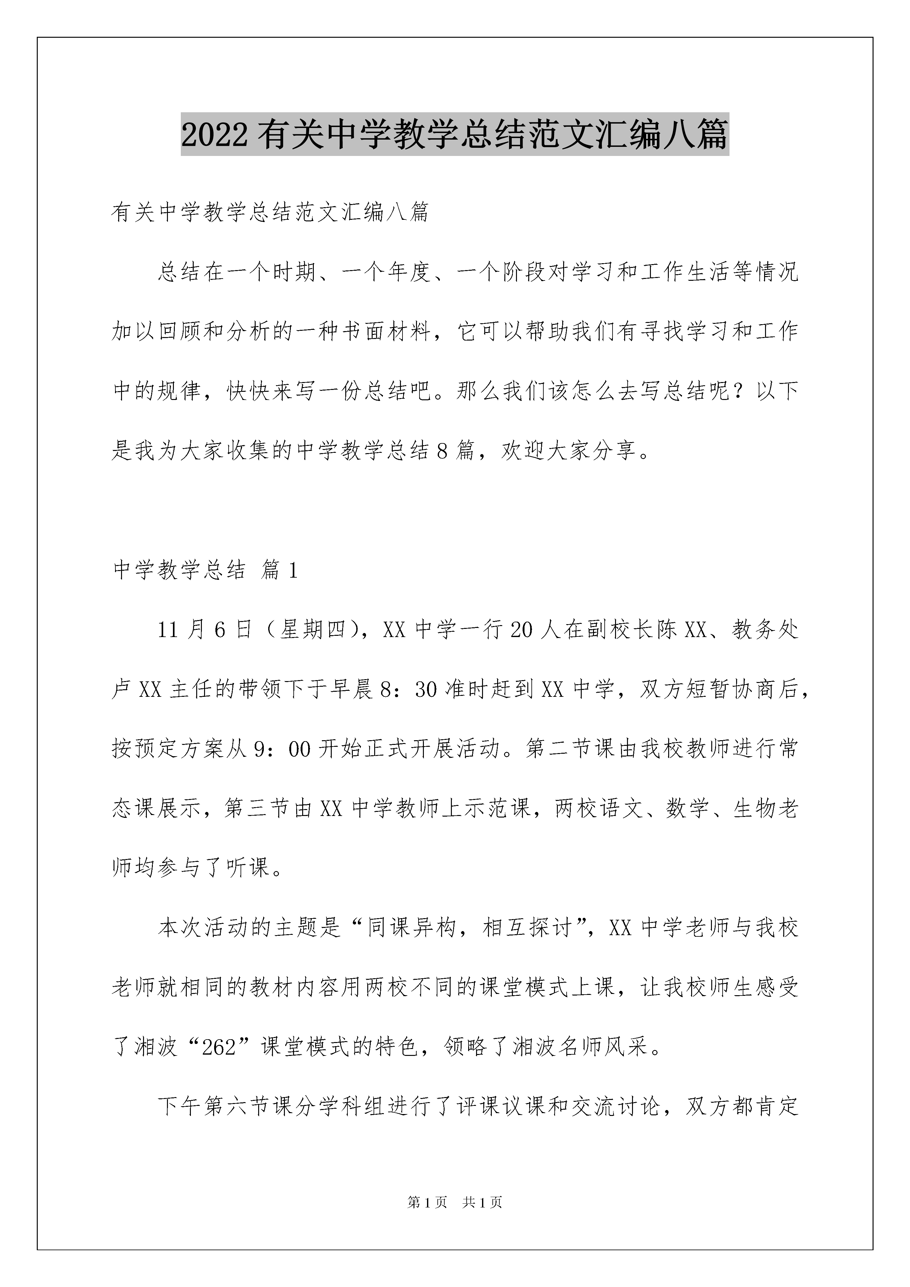 2022有关中学教学总结范文汇编八篇有关中学教学总结范文汇编八篇总结在一个时期、一个年度、一个阶段对学习和工作生活等情况加以回顾和分析的一种书面材料,它可以帮助我们有寻找学习和工作中的规律,快快来写一份总结吧。那么我们该怎么去写总结呢?以下是我为大家收集的中学教学总结8篇,欢迎大家分享。中学教学总结篇111月6日(星期四),XX中学一行20人在副校长陈XX、教务处卢XX主任的带领下于早晨8:30准时赶到XX中学,双方短暂协商后,按预定方案从9:00开始正式开展活动。第二节课由我校教师进行常态课展示,第三节由XX中学教师上示范课,两校语文、数学、生物老师均参与了听课。本次活动的主题是“同课异构,相互探讨”,XX中学老师与我校老师就相同的教材内容用两校不同的课堂模式上课,让我校师生感受了湘波“262”课堂模式的特色,领略了湘波名师风采。下午第六节课分学科组进行了评课议课和交流讨论,双方都肯定了两种模式的优势,并就不足之处提出了中肯的建议。第七节课在阅览室进行了集中交流与活动总结。XX中学教务处卢主任毫不保留地介绍了他们的“五化”管理经验,即“管理服务化、培训福利化、教研专业化、课改自主化、文化多元化”。最后,两校达成共识,做为涟源的两所课改学校,我们可以资源共享,相互学习,取长补短,搂抱发展,形成涟源课改名校共同体。活动之后,本人进行了如下思考:一、两校课堂模式之比较XX“262”模式中的“6”就是课堂有六个环节,即课前导入、自主学习、讨论交流,展示提升、当堂检测、课堂小结。我校的“五环”模式为练习反馈、自学讨论、展示提升、梳理巩固、达标抽测。其中三个主要环节是相同的,都是宗法于XXXX中学与XXX市中学,不同的环节在课堂中只占有几分钟时间,是否强调这些小环节对课堂教学效率与教学效果没有多大影响。所以说,两校的课堂模式没有本质区别。二、课改成效的决定因素我们两校的课改都始于20xx年,都于20xx年在全校三个年级全面推进,四年来,两校都进行了艰难的探索,都取得了很不错的成效,所以我认为课改的成效不在于模式的好坏,模式也没有好坏之分。课改的成效应该取决于是否有先进的课改理念,取决于是否有先进理念指导下的坚定行动。XX中学课改成效的取得,得益于他们有一个用先进课改理念武装起来的坚强领导集体,得益于他们有一支业务能力强、工作责任心强、思想积极上进的稳定的教师队伍。三、我校课堂特色我校课堂高度开放,学生表现精彩。课代表组织能力强,能独立主持课堂;小组长责任心强,在“兵教兵”时俨然是老师;其他学生也表现优秀,能积极点评、质疑、补充。但教师对模式的理解不够深刻,操作生硬,课堂模式化严重,没有个性。同时,教师知识功底浅薄,业务能力有待加强。四、湘波课堂特色语文课教师功底深厚,很有教学机智,善于引导启发,课堂模式规范,但“有模无痕”,境界很高。我曾经用一个比喻评价肖XX老师的课,说肖老师的课流畅自然,如行云流水,更如一曲优美舞蹈。XX邱XX老师的课如是也。数学教师肖XX教材处理能力强,重视定理的推导与辨析,重视学生思维能力的培养,重视抽测达标。生物教师李XX很有亲和力,善于调动学生学习积极性。工作责任心强,课前准备充分,能独出心裁地准备各种生物材料和演示实验。总之,加强工作责任心,培养教师创新地管理班级和创新地教学;重视教师培训,强化业务学习,提高教师素养,这就是我们要向XX中学学习之处。中学教学总结篇220xx年10月25日,xx区八年级生物教学研讨会在xx中学举行。会议分为两个阶段:公开示范课和专家报告。在第一阶段,先后由xx中学的于x老师和xx中的颜xx老师给全体参会老师示范讲授了生物学八上第五单元第四章第二节《细菌》的内容。两位老师都采用了学案导学的方法进行教学活动,都有对照演示实验,讲授内容思路清晰,紧紧围绕细菌的发现、观察工具、形态、结构和生殖等主要知识点,都采用了对比教学法,即对比植物细胞和动物细胞,列表比较,直观易懂,都采用了小组合作学习的方式,也都当堂进行了达标检测。也各有特色,于老师的站立研讨和背记让学生的学习更有效,小组内互问互答,相互帮助,体现了教师主导学生主体,颜xx老师让学生画一个细菌结构的简图,填图活动好,还自拍了实验的视频,增加了实验的真实性,说服力更强。两节课上的都很好。第二阶段,先后由xx第十一中学的高xx老师和教研室的姜佳国主任做了典型发言。高xx老师的发言主题是基于核心素养的中考命题,高老师结合中考试题对核心素养是如何在命题中体现和渗透的,给与会老师进行了深入浅出的专业解读,让听的老师明白了如何对试题进行分析和讲解,对自己今后的选题有很好的指导意义。姜