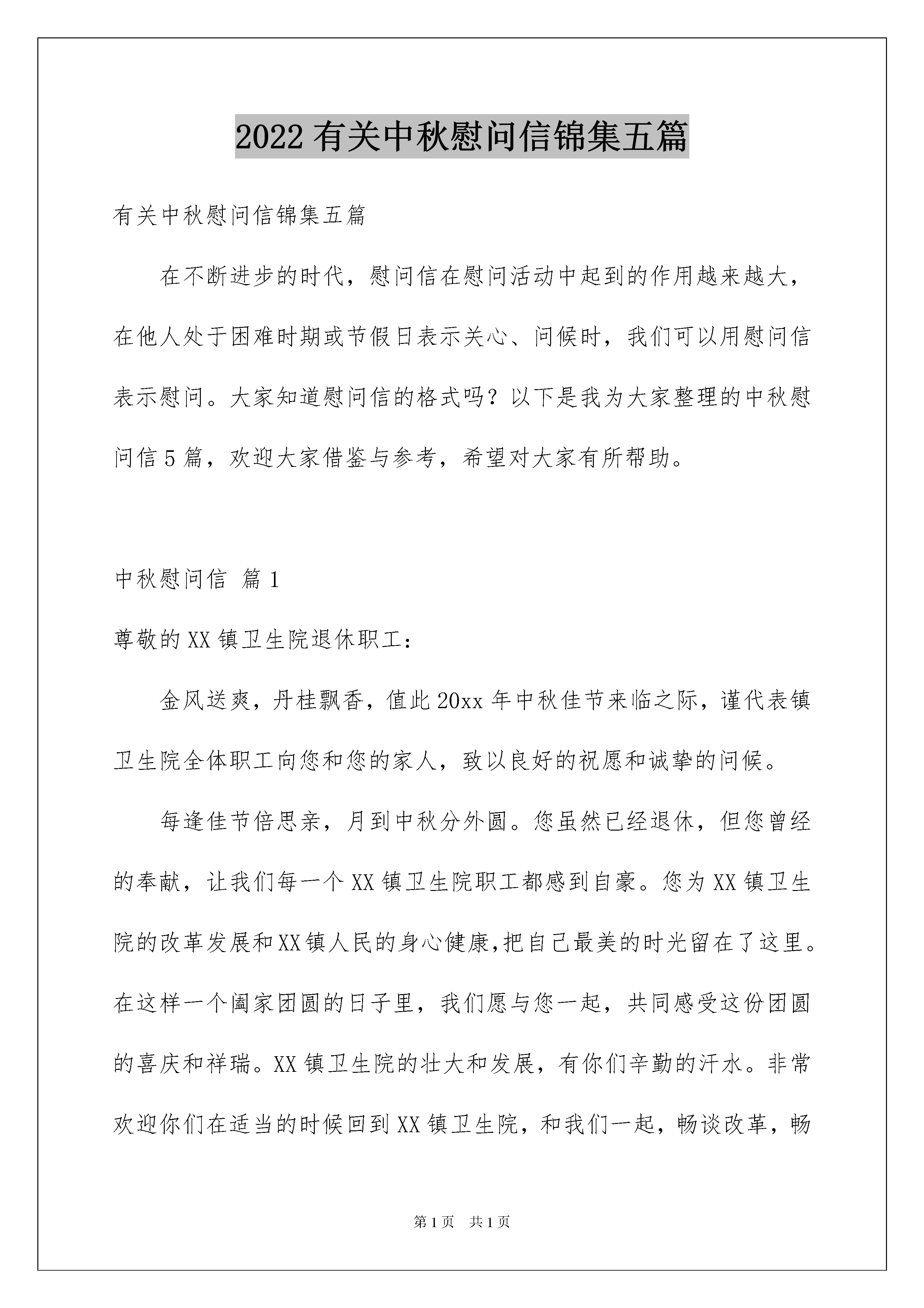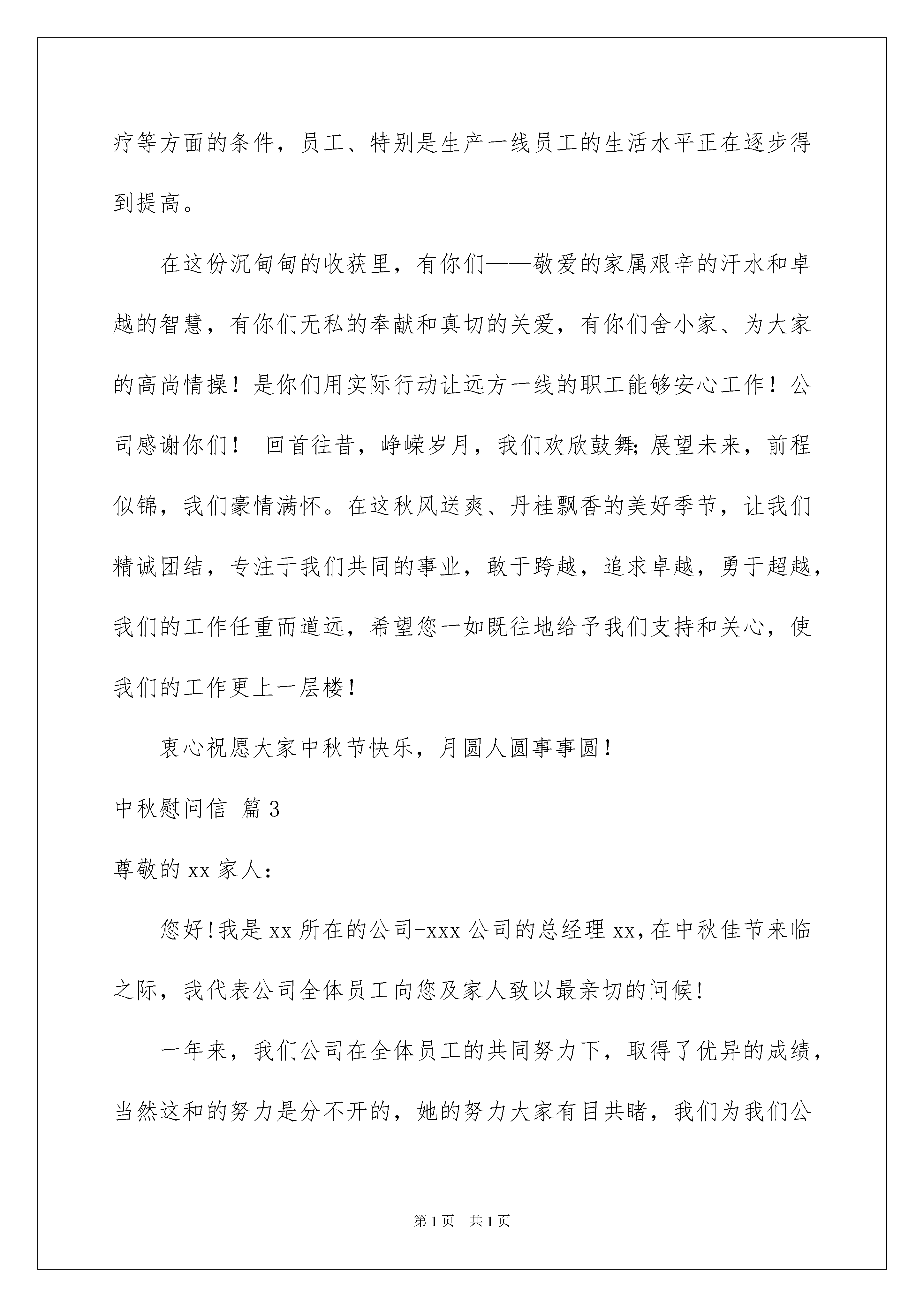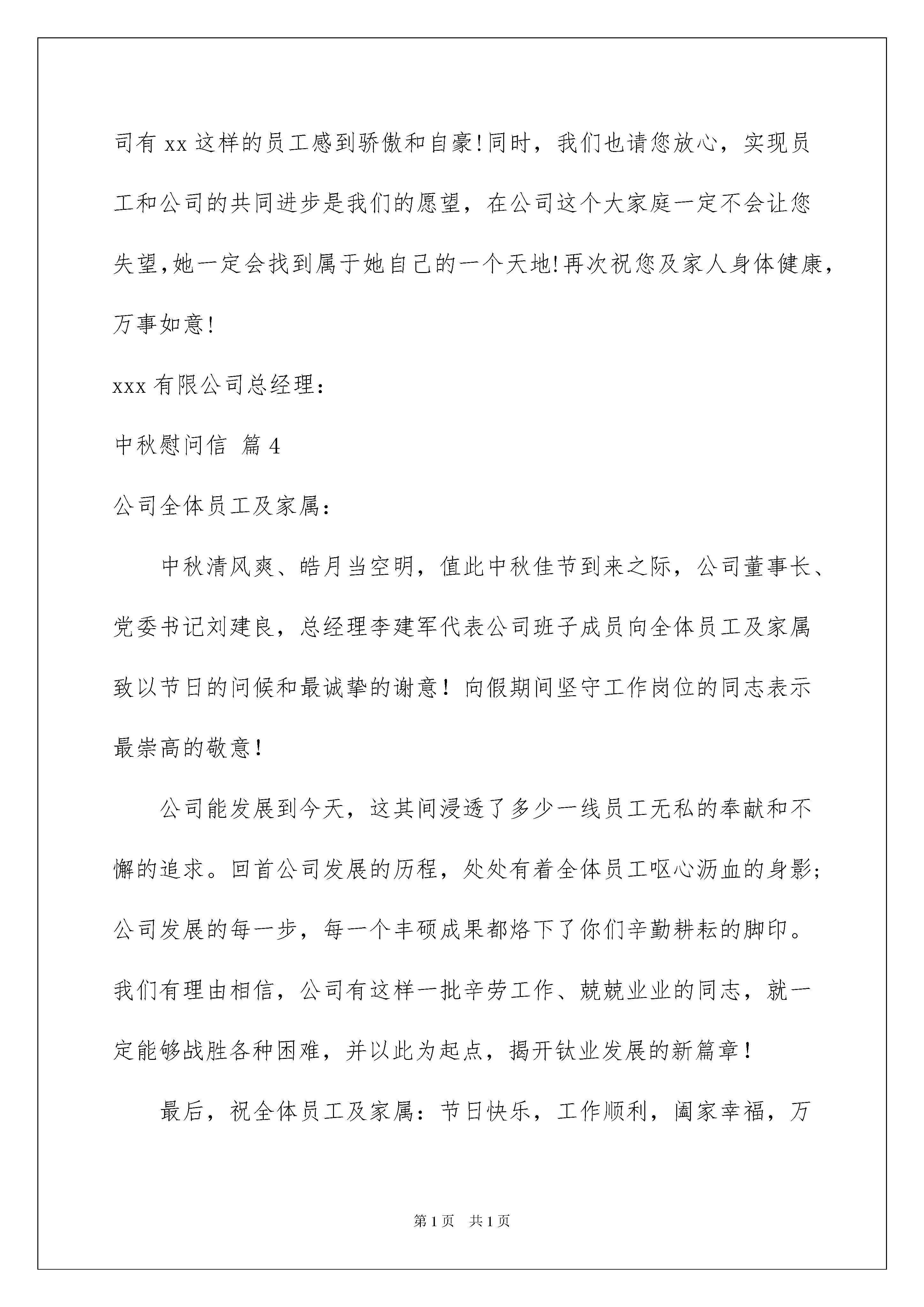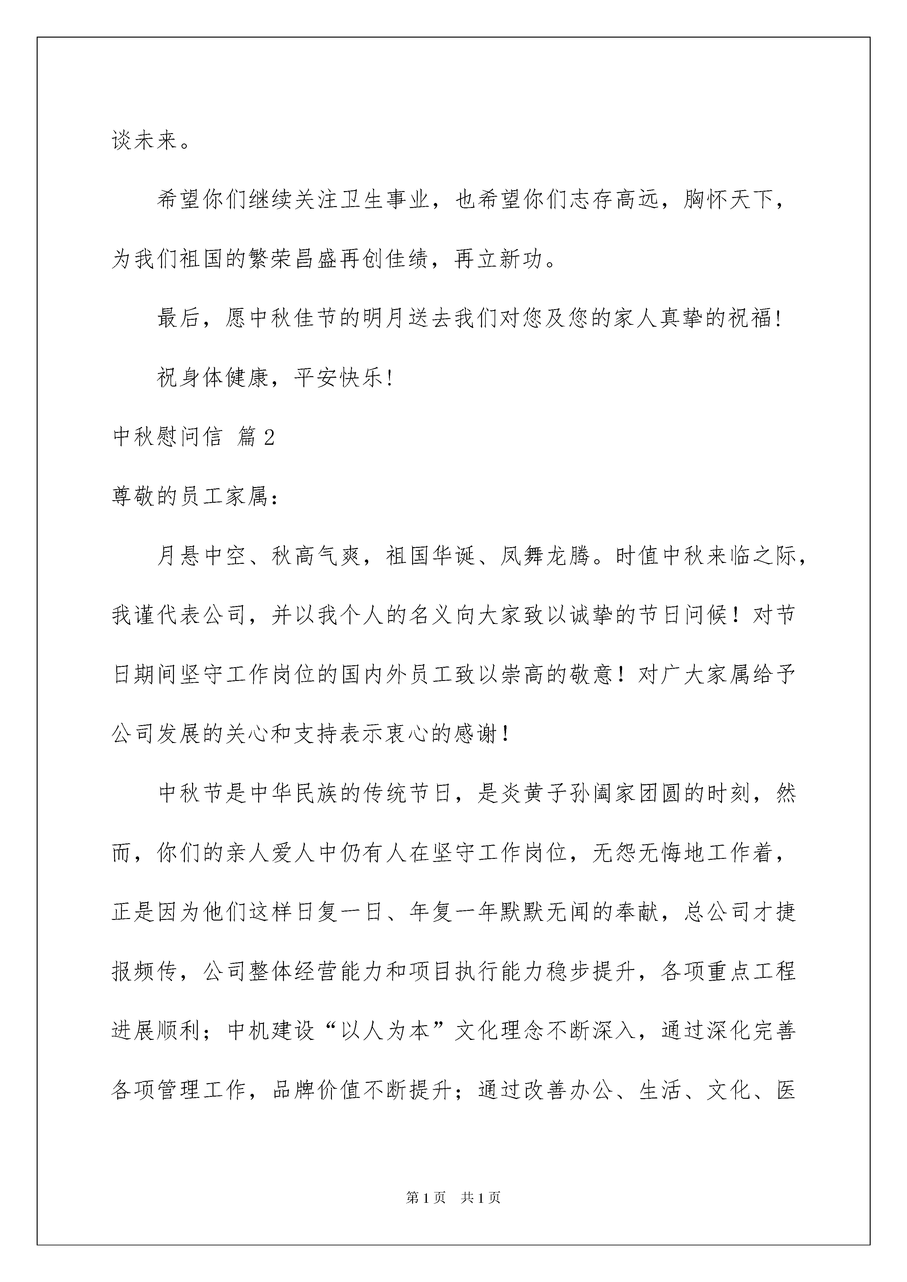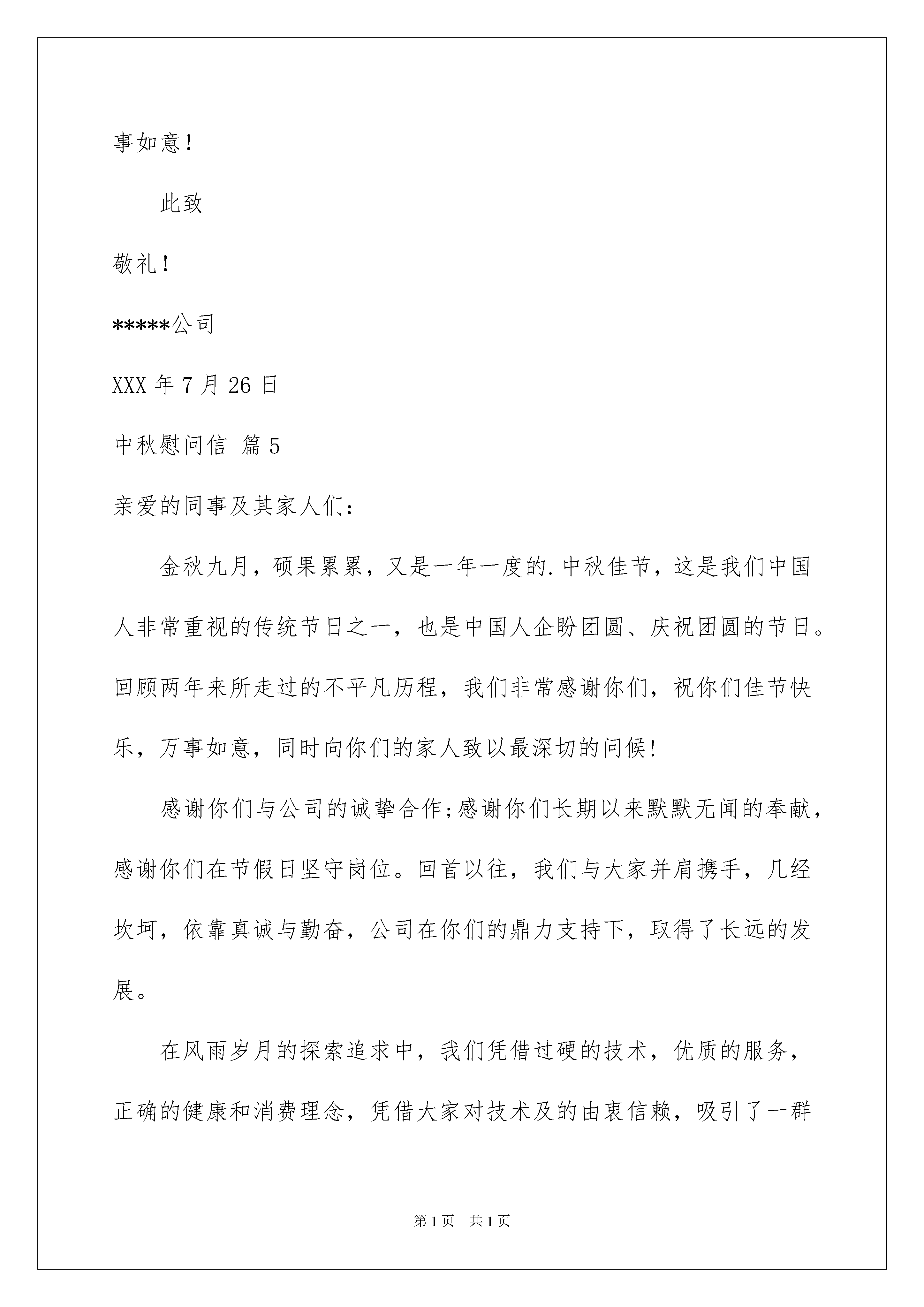 2022有关中秋慰问信锦集五篇有关中秋慰问信锦集五篇在不断进步的时代,慰问信在慰问活动中起到的作用越来越大,在他人处于困难时期或节假日表示关心、问候时,我们可以用慰问信表示慰问。大家知道慰问信的格式吗?以下是我为大家整理的中秋慰问信5篇,欢迎大家借鉴与参考,希望对大家有所帮助。中秋慰问信篇1尊敬的XX镇卫生院退休职工:金风送爽,丹桂飘香,值此20xx年中秋佳节来临之际,谨代表镇卫生院全体职工向您和您的家人,致以良好的祝愿和诚挚的问候。每逢佳节倍思亲,月到中秋分外圆。您虽然已经退休,但您曾经的奉献,让我们每一个XX镇卫生院职工都感到自豪。您为XX镇卫生院的改革发展和XX镇人民的身心健康,把自己最美的时光留在了这里。在这样一个阖家团圆的日子里,我们愿与您一起,共同感受这份团圆的喜庆和祥瑞。XX镇卫生院的壮大和发展,有你们辛勤的汗水。非常欢迎你们在适当的时候回到XX镇卫生院,和我们一起,畅谈改革,畅谈未来。希望你们继续关注卫生事业,也希望你们志存高远,胸怀天下,为我们祖国的繁荣昌盛再创佳绩,再立新功。最后,愿中秋佳节的明月送去我们对您及您的家人真挚的祝福!祝身体健康,平安快乐!中秋慰问信篇2尊敬的员工家属:月悬中空、秋高气爽,祖国华诞、凤舞龙腾。时值中秋来临之际,我谨代表公司,并以我个人的名义向大家致以诚挚的节日问候!对节日期间坚守工作岗位的国内外员工致以崇高的敬意!对广大家属给予公司发展的关心和支持表示衷心的感谢!中秋节是中华民族的传统节日,是炎黄子孙阖家团圆的时刻,然而,你们的亲人爱人中仍有人在坚守工作岗位,无怨无悔地工作着,正是因为他们这样日复一日、年复一年默默无闻的奉献,总公司才捷报频传,公司整体经营能力和项目执行能力稳步提升,各项重点工程进展顺利;中机建设“以人为本”文化理念不断深入,通过深化完善各项管理工作,品牌价值不断提升;通过改善办公、生活、文化、医疗等方面的条件,员工、特别是生产一线员工的生活水平正在逐步得到提高。在这份沉甸甸的收获里,有你们——敬爱的家属艰辛的汗水和卓越的智慧,有你们无私的奉献和真切的关爱,有你们舍小家、为大家的高尚情操!是你们用实际行动让远方一线的职工能够安心工作!公司感谢你们!回首往昔,峥嵘岁月,我们欢欣鼓舞;展望未来,前程似锦,我们豪情满怀。在这秋风送爽、丹桂飘香的美好季节,让我们精诚团结,专注于我们共同的事业,敢于跨越,追求卓越,勇于超越,我们的工作任重而道远,希望您一如既往地给予我们支持和关心,使我们的工作更上一层楼!衷心祝愿大家中秋节快乐,月圆人圆事事圆!中秋慰问信篇3尊敬的xx家人:您好!我是xx所在的公司-xxx公司的总经理xx,在中秋佳节来临之际,我代表公司全体员工向您及家人致以最亲切的问候!一年来,我们公司在全体员工的共同努力下,取得了优异的成绩,当然这和的努力是分不开的,她的努力大家有目共睹,我们为我们公司有xx这样的员工感到骄傲和自豪!同时,我们也请您放心,实现员工和公司的共同进步是我们的愿望,在公司这个大家庭一定不会让您失望,她一定会找到属于她自己的一个天地!再次祝您及家人身体健康,万事如意!xxx有限公司总经理:中秋慰问信篇4公司全体员工及家属:中秋清风爽、皓月当空明,值此中秋佳节到来之际,公司董事长、党委书记刘建良,总经理李建军代表公司班子成员向全体员工及家属致以节日的问候和最诚挚的谢意!向假期间坚守工作岗位的同志表示最崇高的敬意!公司能发展到今天,这其间浸透了多少一线员工无私的奉献和不懈的追求。回首公司发展的历程,处处有着全体员工呕心沥血的身影;公司发展的每一步,每一个丰硕成果都烙下了你们辛勤耕耘的脚印。我们有理由相信,公司有这样一批辛劳工作、兢兢业业的同志,就一定能够战胜各种困难,并以此为起点,揭开钛业发展的新篇章!最后,祝全体员工及家属:节日快乐,工作顺利,阖家幸福,万事如意!此致敬礼!*****公司XXX年7月26日中秋慰问信篇5亲爱的同事及其家人们:金秋九月,硕果累累,又是一年一度的.中秋佳节,这是我们中国人非常重视的传统节日之一,也是中国人企盼团圆、庆祝团圆的节日。回顾两年来所走过的不平凡历程,我们非常感谢你们,祝你们佳节快乐,万事如意,同时向你们的家人致以最深切的问候!感谢你们与公司的诚挚合作;感谢你们长期以来默默无闻的奉献,感谢你们在节假日坚守岗位。回首以往,我们与大家并肩携手,几经坎坷,依靠真诚与勤奋,公司在你们的鼎力支持下,取得了长远的发展。在风雨岁月的探索追求中,我们凭借过硬的技术,优质的服务,正确的健康和消费理念,凭借大家对技术及的由衷信赖,吸引了一群有识之士,服务了一大批热心消费者,这是
