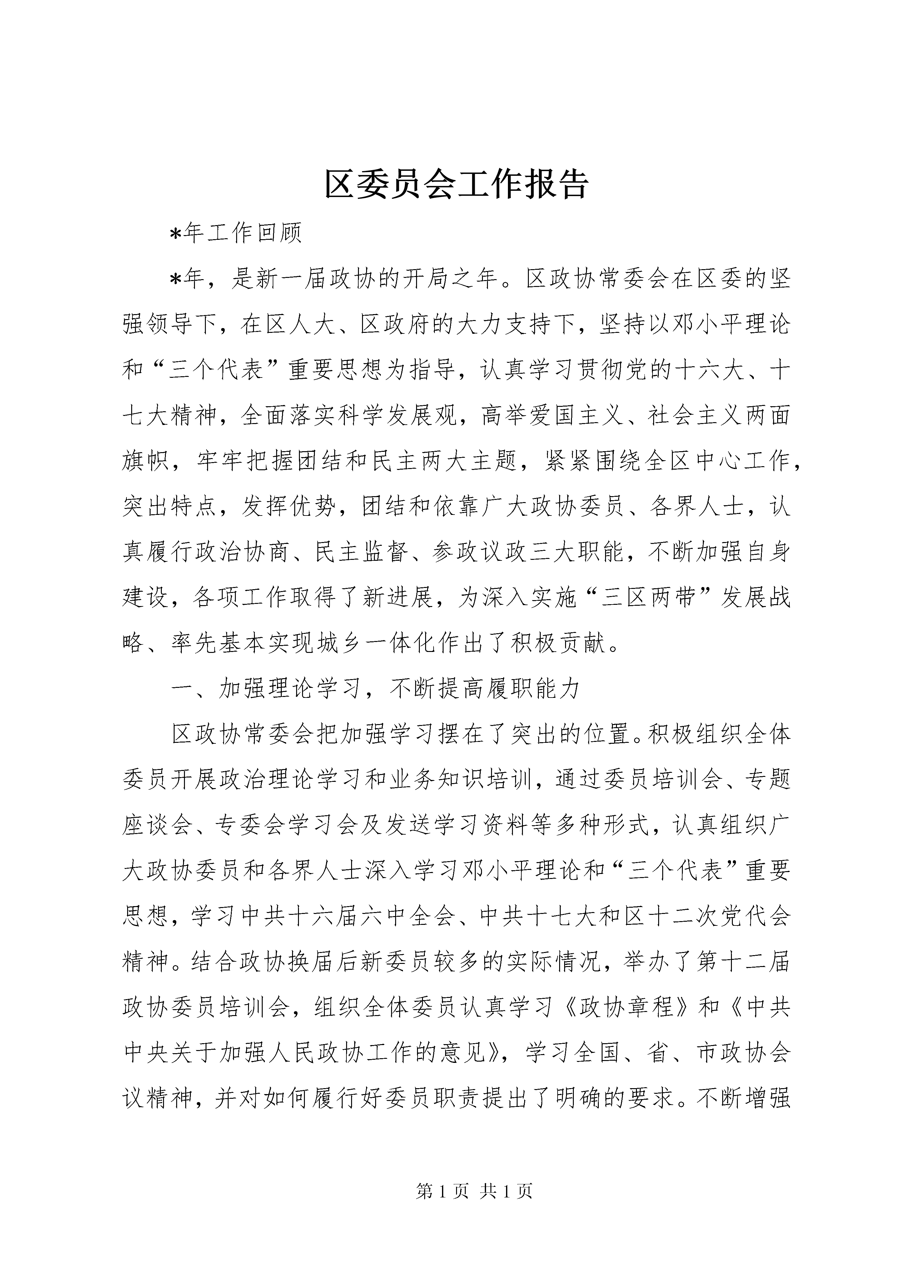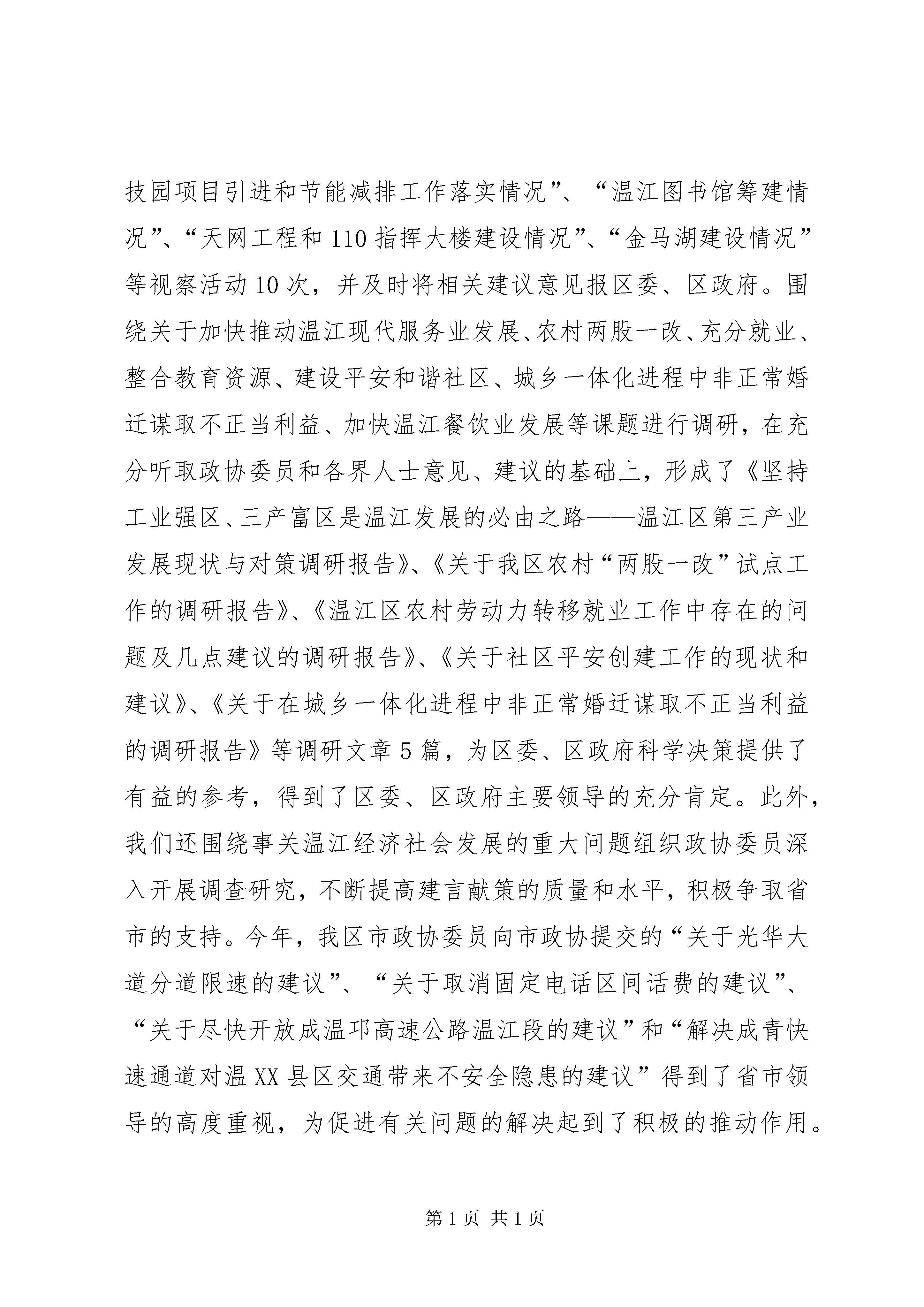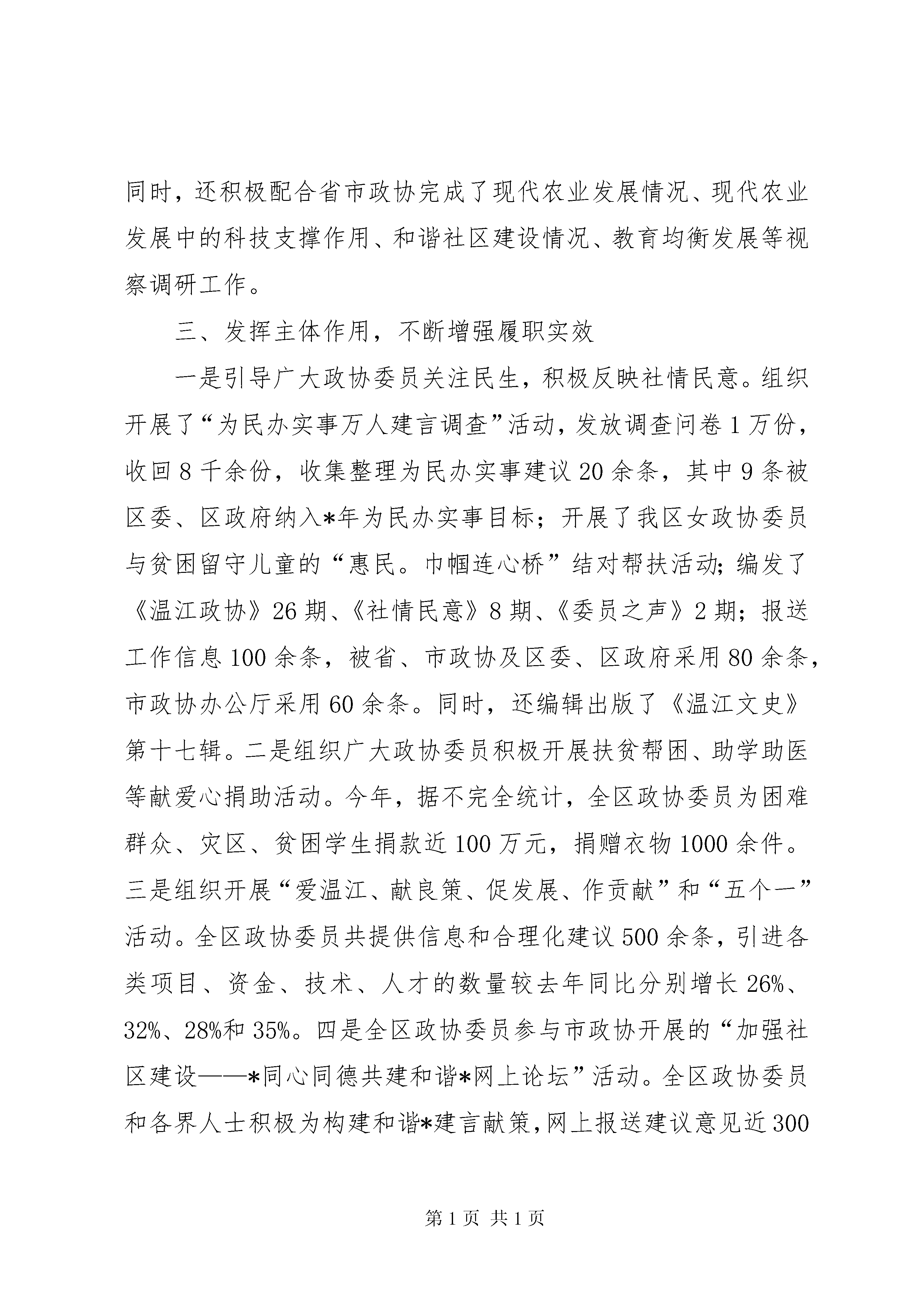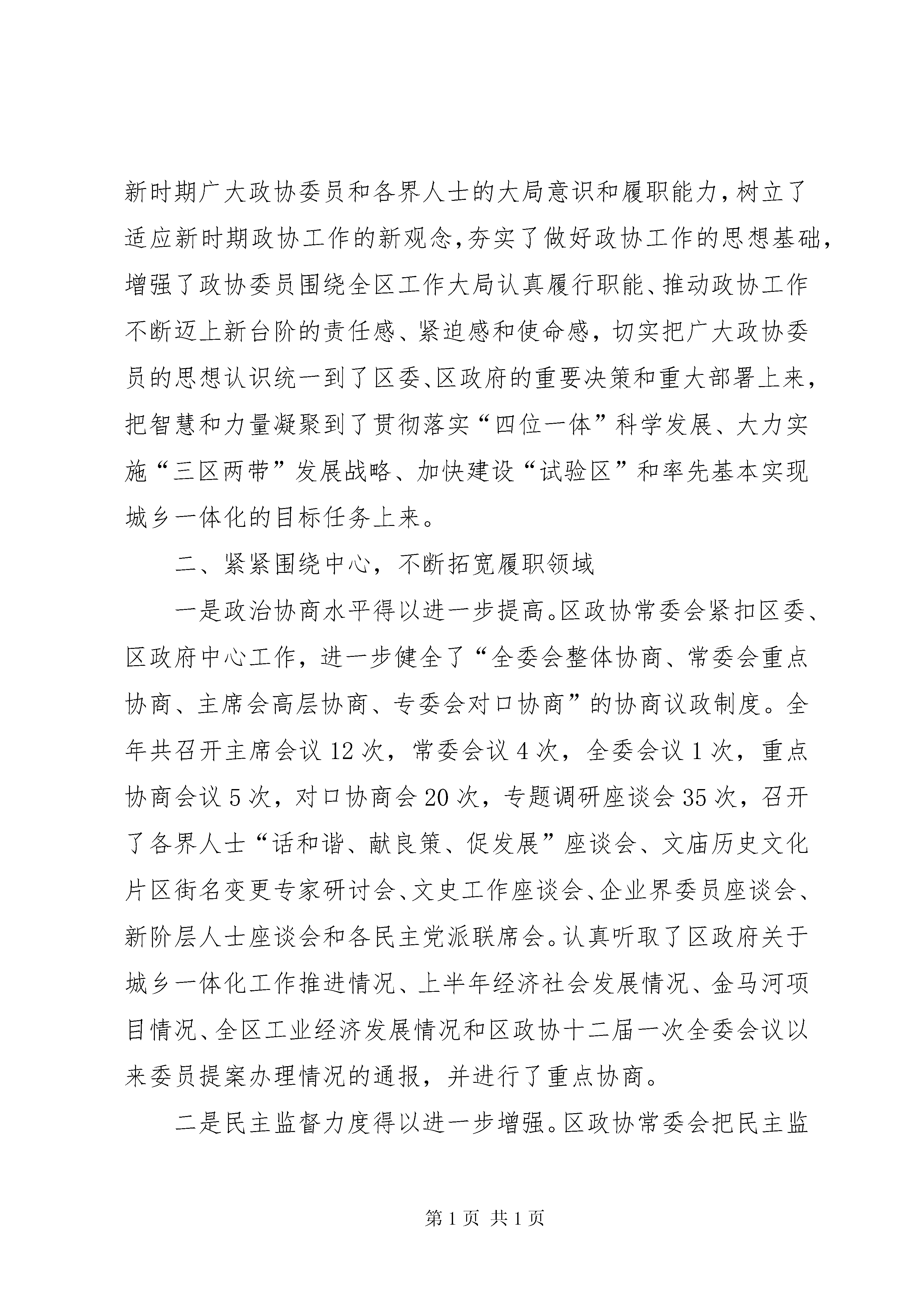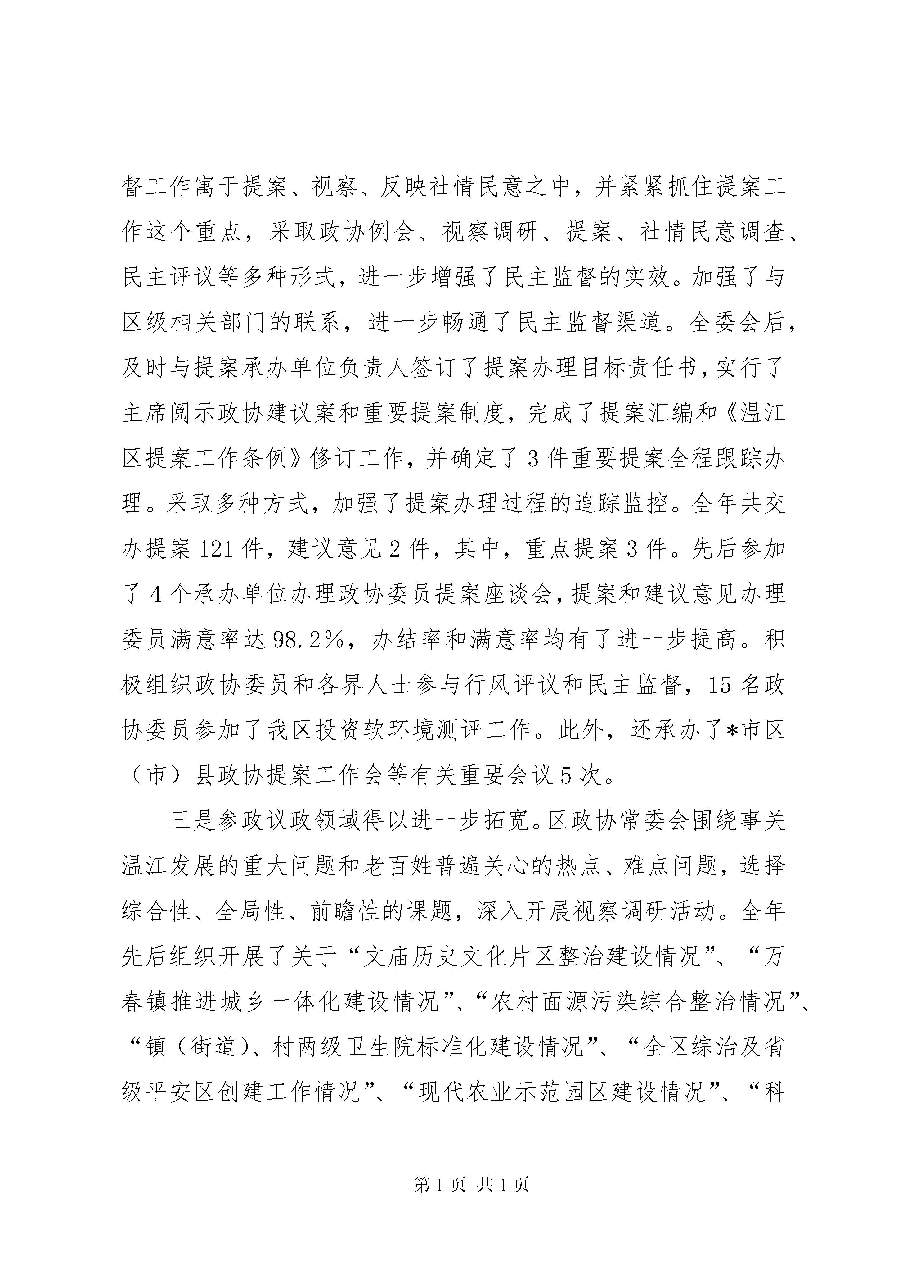 区委员会工作报告*年工作回顾*年,是新一届政协的开局之年。区政协常委会在区委的坚强领导下,在区人大、区政府的大力支持下,坚持以邓小平理论和“三个代表”重要思想为指导,认真学习贯彻党的十六大、十七大精神,全面落实科学发展观,高举爱国主义、社会主义两面旗帜,牢牢把握团结和民主两大主题,紧紧围绕全区中心工作,突出特点,发挥优势,团结和依靠广大政协委员、各界人士,认真履行政治协商、民主监督、参政议政三大职能,不断加强自身建设,各项工作取得了新进展,为深入实施“三区两带”发展战略、率先基本实现城乡一体化作出了积极贡献。一、加强理论学习,不断提高履职能力区政协常委会把加强学习摆在了突出的位置。积极组织全体委员开展政治理论学习和业务知识培训,通过委员培训会、专题座谈会、专委会学习会及发送学习资料等多种形式,认真组织广大政协委员和各界人士深入学习邓小平理论和“三个代表”重要思想,学习中共十六届六中全会、中共十七大和区十二次党代会精神。结合政协换届后新委员较多的实际情况,举办了第十二届政协委员培训会,组织全体委员认真学习《政协章程》和《中共中央关于加强人民政协工作的意见》,学习全国、省、市政协会议精神,并对如何履行好委员职责提出了明确的要求。不断增强新时期广大政协委员和各界人士的大局意识和履职能力,树立了适应新时期政协工作的新观念,夯实了做好政协工作的思想基础,增强了政协委员围绕全区工作大局认真履行职能、推动政协工作不断迈上新台阶的责任感、紧迫感和使命感,切实把广大政协委员的思想认识统一到了区委、区政府的重要决策和重大部署上来,把智慧和力量凝聚到了贯彻落实“四位一体”科学发展、大力实施“三区两带”发展战略、加快建设“试验区”和率先基本实现城乡一体化的目标任务上来。二、紧紧围绕中心,不断拓宽履职领域一是政治协商水平得以进一步提高。区政协常委会紧扣区委、区政府中心工作,进一步健全了“全委会整体协商、常委会重点协商、主席会高层协商、专委会对口协商”的协商议政制度。全年共召开主席会议12次,常委会议4次,全委会议1次,重点协商会议5次,对口协商会20次,专题调研座谈会35次,召开了各界人士“话和谐、献良策、促发展”座谈会、文庙历史文化片区街名变更专家研讨会、文史工作座谈会、企业界委员座谈会、新阶层人士座谈会和各民主党派联席会。认真听取了区政府关于城乡一体化工作推进情况、上半年经济社会发展情况、金马河项目情况、全区工业经济发展情况和区政协十二届一次全委会议以来委员提案办理情况的通报,并进行了重点协商。二是民主监督力度得以进一步增强。区政协常委会把民主监督工作寓于提案、视察、反映社情民意之中,并紧紧抓住提案工作这个重点,采取政协例会、视察调研、提案、社情民意调查、民主评议等多种形式,进一步增强了民主监督的实效。加强了与区级相关部门的联系,进一步畅通了民主监督渠道。全委会后,及时与提案承办单位负责人签订了提案办理目标责任书,实行了主席阅示政协建议案和重要提案制度,完成了提案汇编和《温江区提案工作条例》修订工作,并确定了3件重要提案全程跟踪办理。采取多种方式,加强了提案办理过程的追踪监控。全年共交办提案121件,建议意见2件,其中,重点提案3件。先后参加了4个承办单位办理政协委员提案座谈会,提案和建议意见办理委员满意率达98.2%,办结率和满意率均有了进一步提高。积极组织政协委员和各界人士参与行风评议和民主监督,15名政协委员参加了我区投资软环境测评工作。此外,还承办了*市区(市)县政协提案工作会等有关重要会议5次。三是参政议政领域得以进一步拓宽。区政协常委会围绕事关温江发展的重大问题和老百姓普遍关心的热点、难点问题,选择综合性、全局性、前瞻性的课题,深入开展视察调研活动。全年先后组织开展了关于“文庙历史文化片区整治建设情况”、“万春镇推进城乡一体化建设情况”、“农村面源污染综合整治情况”、“镇(街道)、村两级卫生院标准化建设情况”、“全区综治及省级平安区创建工作情况”、“现代农业示范园区建设情况”、“科技园项目引进和节能减排工作落实情况”、“温江图书馆筹建情况”、“天网工程和110指挥大楼建设情况”、“金马湖建设情况”等视察活动10次,并及时将相关建议意见报区委、区政府。围绕关于加快推动温江现代服务业发展、农村两股一改、充分就业、整合教育资源、建设平安和谐社区、城乡一体化进程中非正常婚迁谋取不正当利益、加快温江餐饮业发展等课题进行调研,在充分听取政协委员和各界人士意见、建议的基础上,形成了《坚持工业强区、三产富区是温江发展的必由之路——温江区第三产业发展现状与对策调研报告》、《关于我区农村“两股一改”试点工作的调研报告》、《温江区农村劳动力转移就业工作中存在的问题及几点建议的调研报告》、《关于社区平安创建工作的现状和建议》、《关于在