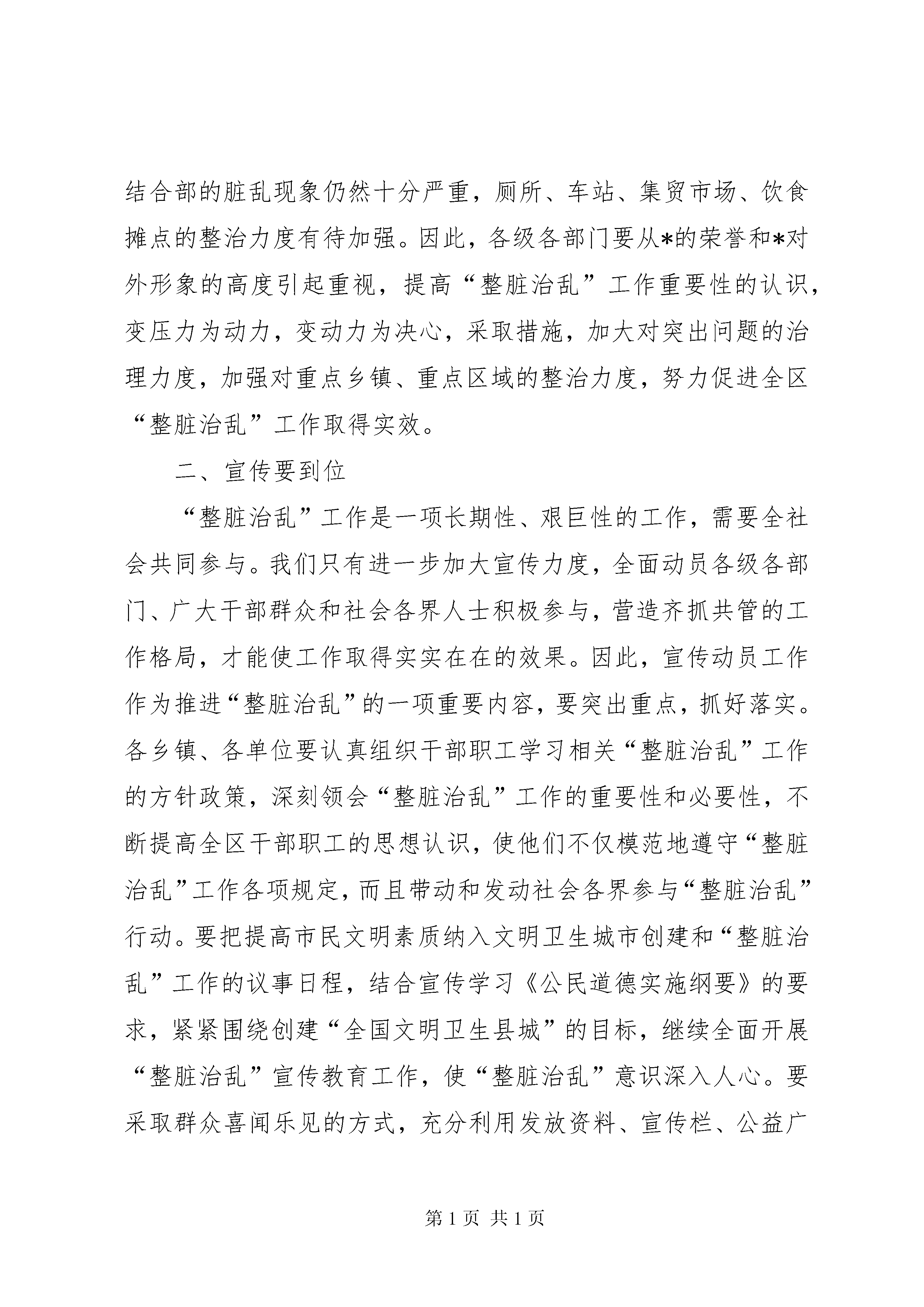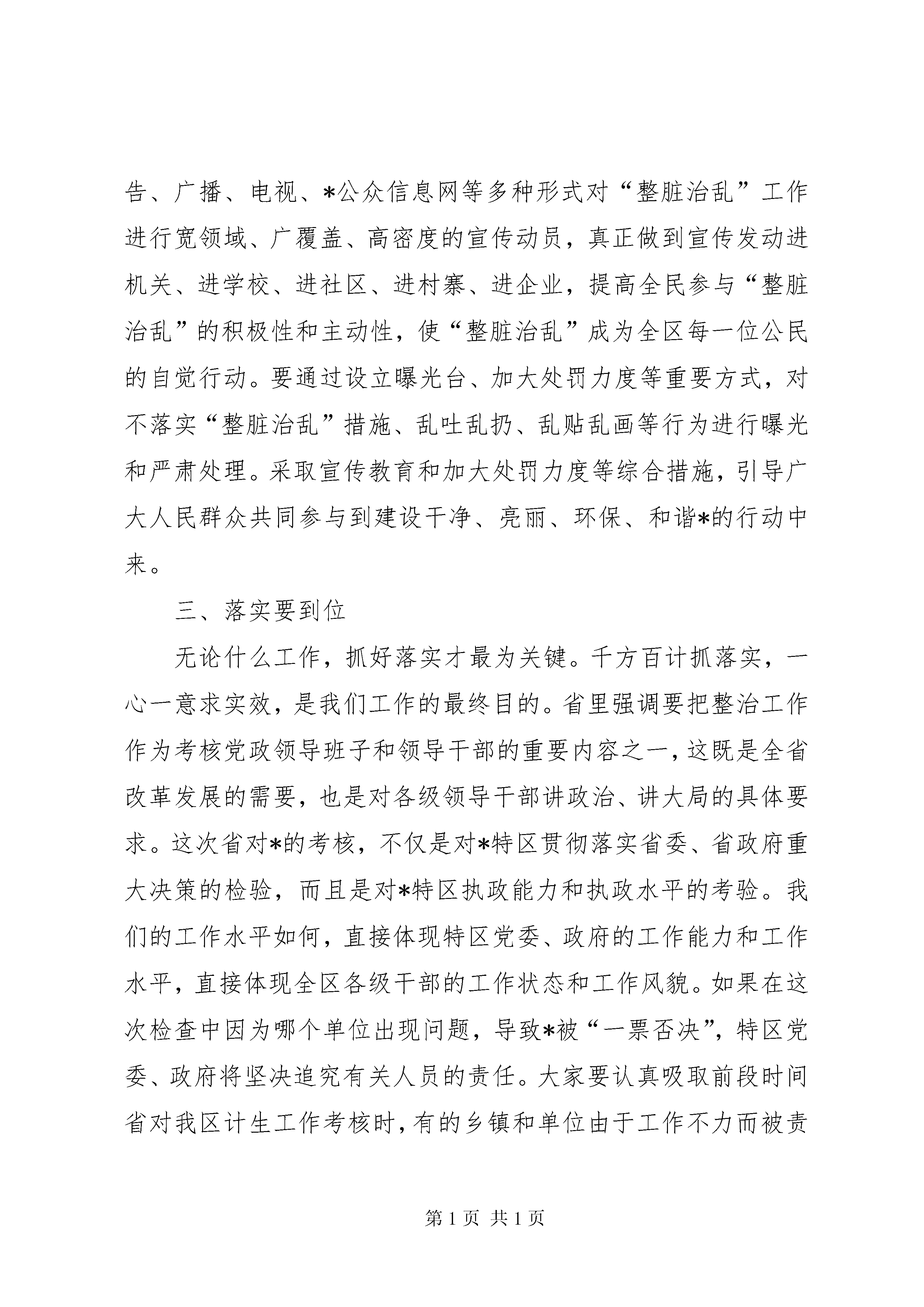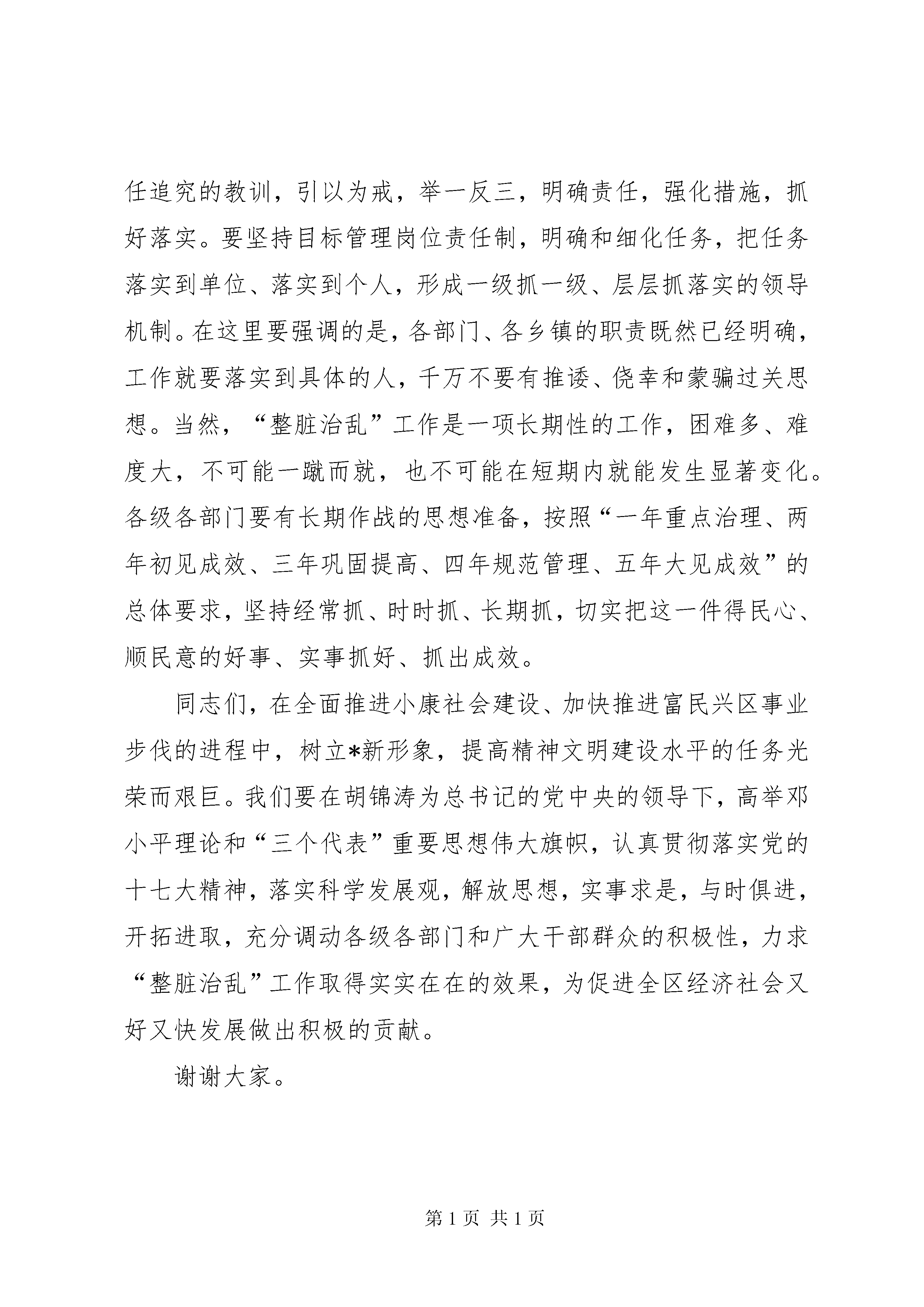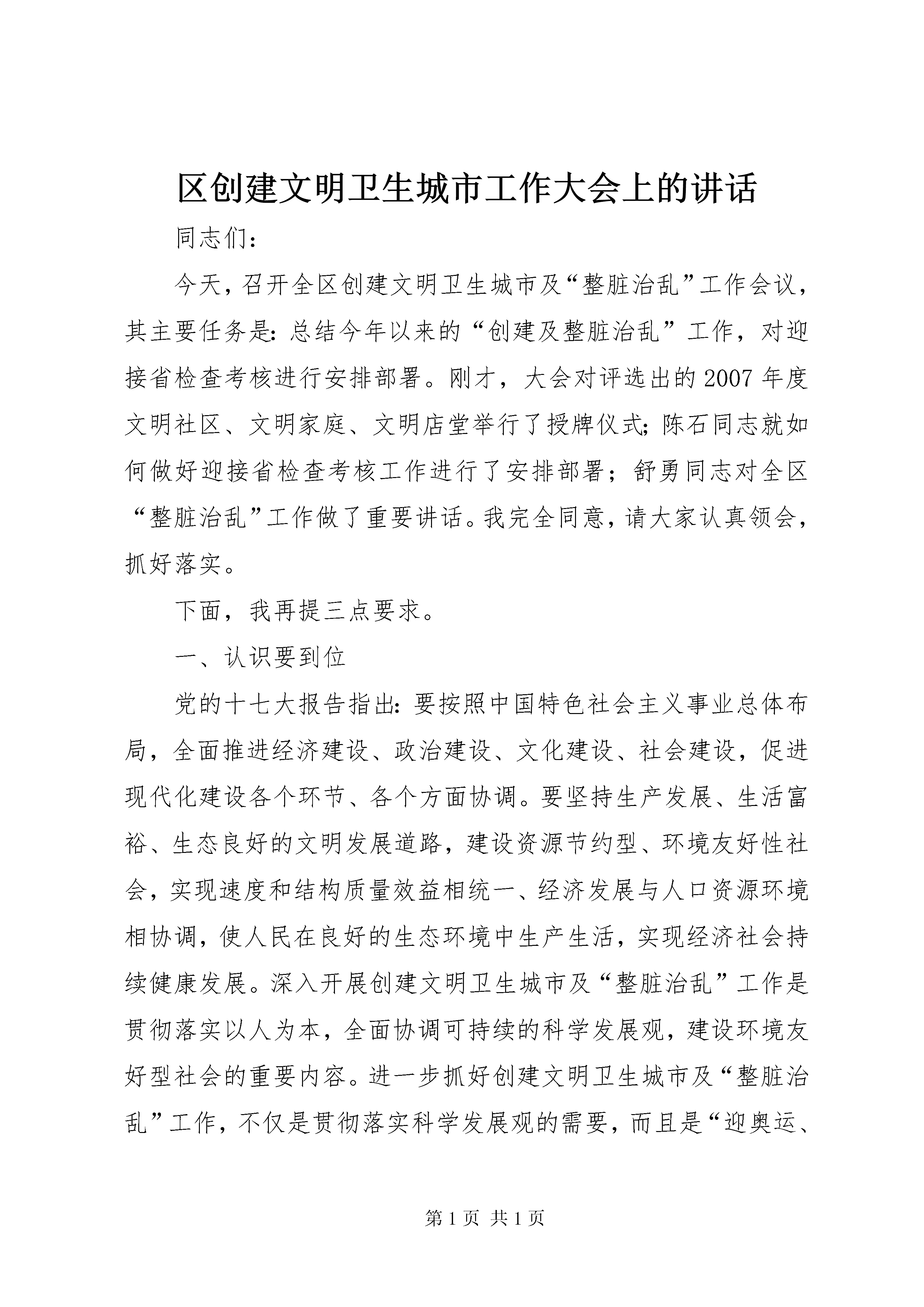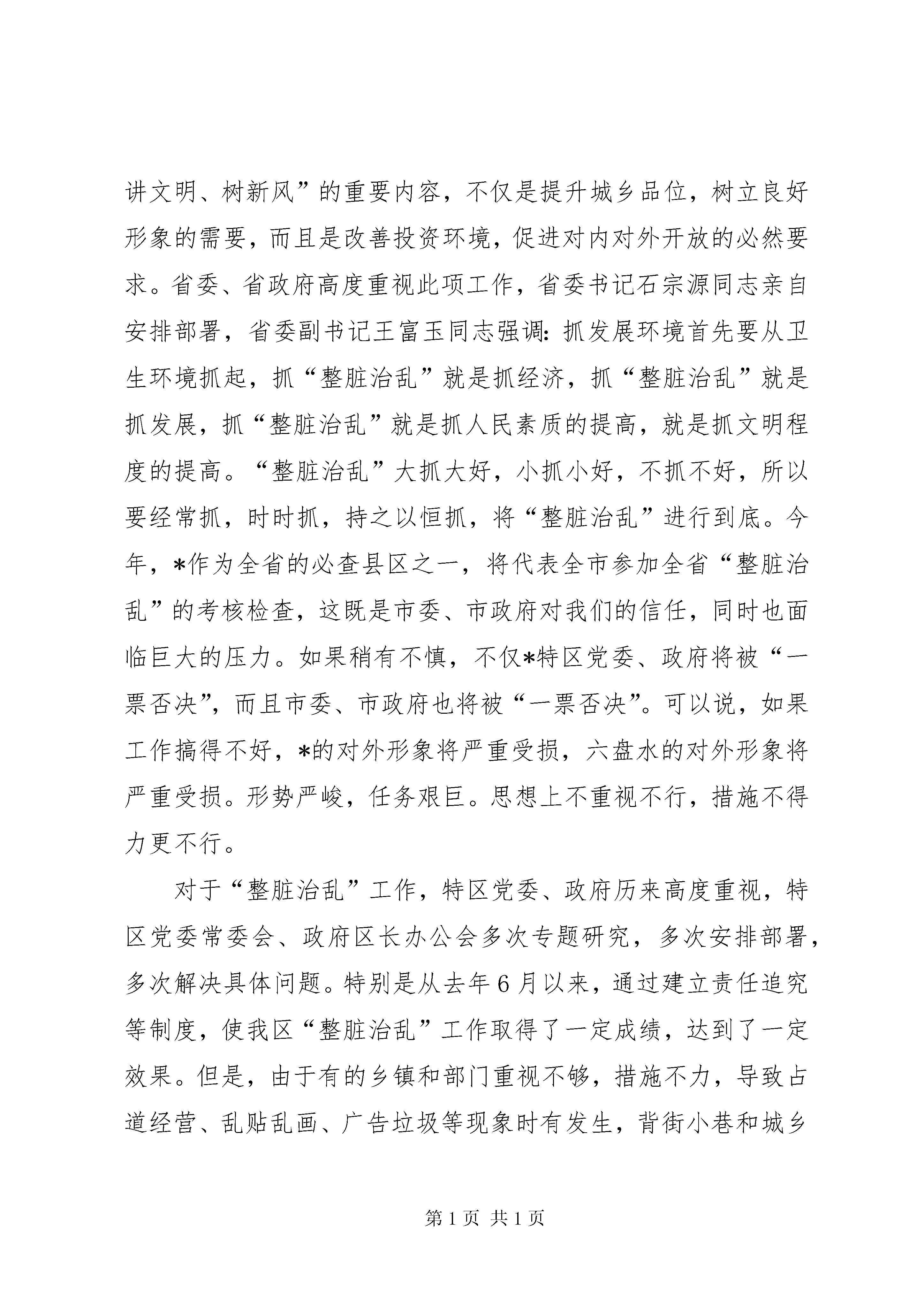 区创建文明卫生城市工作大会上的讲话同志们:今天,召开全区创建文明卫生城市及“整脏治乱”工作会议,其主要任务是:总结今年以来的“创建及整脏治乱”工作,对迎接省检查考核进行安排部署。刚才,大会对评选出的2007年度文明社区、文明家庭、文明店堂举行了授牌仪式;陈石同志就如何做好迎接省检查考核工作进行了安排部署;舒勇同志对全区“整脏治乱”工作做了重要讲话。我完全同意,请大家认真领会,抓好落实。下面,我再提三点要求。一、认识要到位党的十七大报告指出:要按照中国特色社会主义事业总体布局,全面推进经济建设、政治建设、文化建设、社会建设,促进现代化建设各个环节、各个方面协调。要坚持生产发展、生活富裕、生态良好的文明发展道路,建设资源节约型、环境友好性社会,实现速度和结构质量效益相统一、经济发展与人口资源环境相协调,使人民在良好的生态环境中生产生活,实现经济社会持续健康发展。深入开展创建文明卫生城市及“整脏治乱”工作是贯彻落实以人为本,全面协调可持续的科学发展观,建设环境友好型社会的重要内容。进一步抓好创建文明卫生城市及“整脏治乱”工作,不仅是贯彻落实科学发展观的需要,而且是“迎奥运、讲文明、树新风”的重要内容,不仅是提升城乡品位,树立良好形象的需要,而且是改善投资环境,促进对内对外开放的必然要求。省委、省政府高度重视此项工作,省委书记石宗源同志亲自安排部署,省委副书记王富玉同志强调:抓发展环境首先要从卫生环境抓起,抓“整脏治乱”就是抓经济,抓“整脏治乱”就是抓发展,抓“整脏治乱”就是抓人民素质的提高,就是抓文明程度的提高。“整脏治乱”大抓大好,小抓小好,不抓不好,所以要经常抓,时时抓,持之以恒抓,将“整脏治乱”进行到底。今年,*作为全省的必查县区之一,将代表全市参加全省“整脏治乱”的考核检查,这既是市委、市政府对我们的信任,同时也面临巨大的压力。如果稍有不慎,不仅*特区党委、政府将被“一票否决”,而且市委、市政府也将被“一票否决”。可以说,如果工作搞得不好,*的对外形象将严重受损,六盘水的对外形象将严重受损。形势严峻,任务艰巨。思想上不重视不行,措施不得力更不行。对于“整脏治乱”工作,特区党委、政府历来高度重视,特区党委常委会、政府区长办公会多次专题研究,多次安排部署,多次解决具体问题。特别是从去年6月以来,通过建立责任追究等制度,使我区“整脏治乱”工作取得了一定成绩,达到了一定效果。但是,由于有的乡镇和部门重视不够,措施不力,导致占道经营、乱贴乱画、广告垃圾等现象时有发生,背街小巷和城乡结合部的脏乱现象仍然十分严重,厕所、车站、集贸市场、饮食摊点的整治力度有待加强。因此,各级各部门要从*的荣誉和*对外形象的高度引起重视,提高“整脏治乱”工作重要性的认识,变压力为动力,变动力为决心,采取措施,加大对突出问题的治理力度,加强对重点乡镇、重点区域的整治力度,努力促进全区“整脏治乱”工作取得实效。二、宣传要到位“整脏治乱”工作是一项长期性、艰巨性的工作,需要全社会共同参与。我们只有进一步加大宣传力度,全面动员各级各部门、广大干部群众和社会各界人士积极参与,营造齐抓共管的工作格局,才能使工作取得实实在在的效果。因此,宣传动员工作作为推进“整脏治乱”的一项重要内容,要突出重点,抓好落实。各乡镇、各单位要认真组织干部职工学习相关“整脏治乱”工作的方针政策,深刻领会“整脏治乱”工作的重要性和必要性,不断提高全区干部职工的思想认识,使他们不仅模范地遵守“整脏治乱”工作各项规定,而且带动和发动社会各界参与“整脏治乱”行动。要把提高市民文明素质纳入文明卫生城市创建和“整脏治乱”工作的议事日程,结合宣传学习《公民道德实施纲要》的要求,紧紧围绕创建“全国文明卫生县城”的目标,继续全面开展“整脏治乱”宣传教育工作,使“整脏治乱”意识深入人心。要采取群众喜闻乐见的方式,充分利用发放资料、宣传栏、公益广告、广播、电视、*公众信息网等多种形式对“整脏治乱”工作进行宽领域、广覆盖、高密度的宣传动员,真正做到宣传发动进机关、进学校、进社区、进村寨、进企业,提高全民参与“整脏治乱”的积极性和主动性,使“整脏治乱”成为全区每一位公民的自觉行动。要通过设立曝光台、加大处罚力度等重要方式,对不落实“整脏治乱”措施、乱吐乱扔、乱贴乱画等行为进行曝光和严肃处理。采取宣传教育和加大处罚力度等综合措施,引导广大人民群众共同参与到建设干净、亮丽、环保、和谐*的行动中来。三、落实要到位无论什么工作,抓好落实才最为关键。千方百计抓落实,一心一意求实效,是我们工作的最终目的。省里强调要把整治工作作为考核党政领导班子和领导干部的重要内容之一,这既是全省改革发展的需要,也是对各级领导干部讲政治、讲大局的具体要求。这次省对*的考核,不仅是对*特区贯彻落实省委、省政府重大决策的检验,