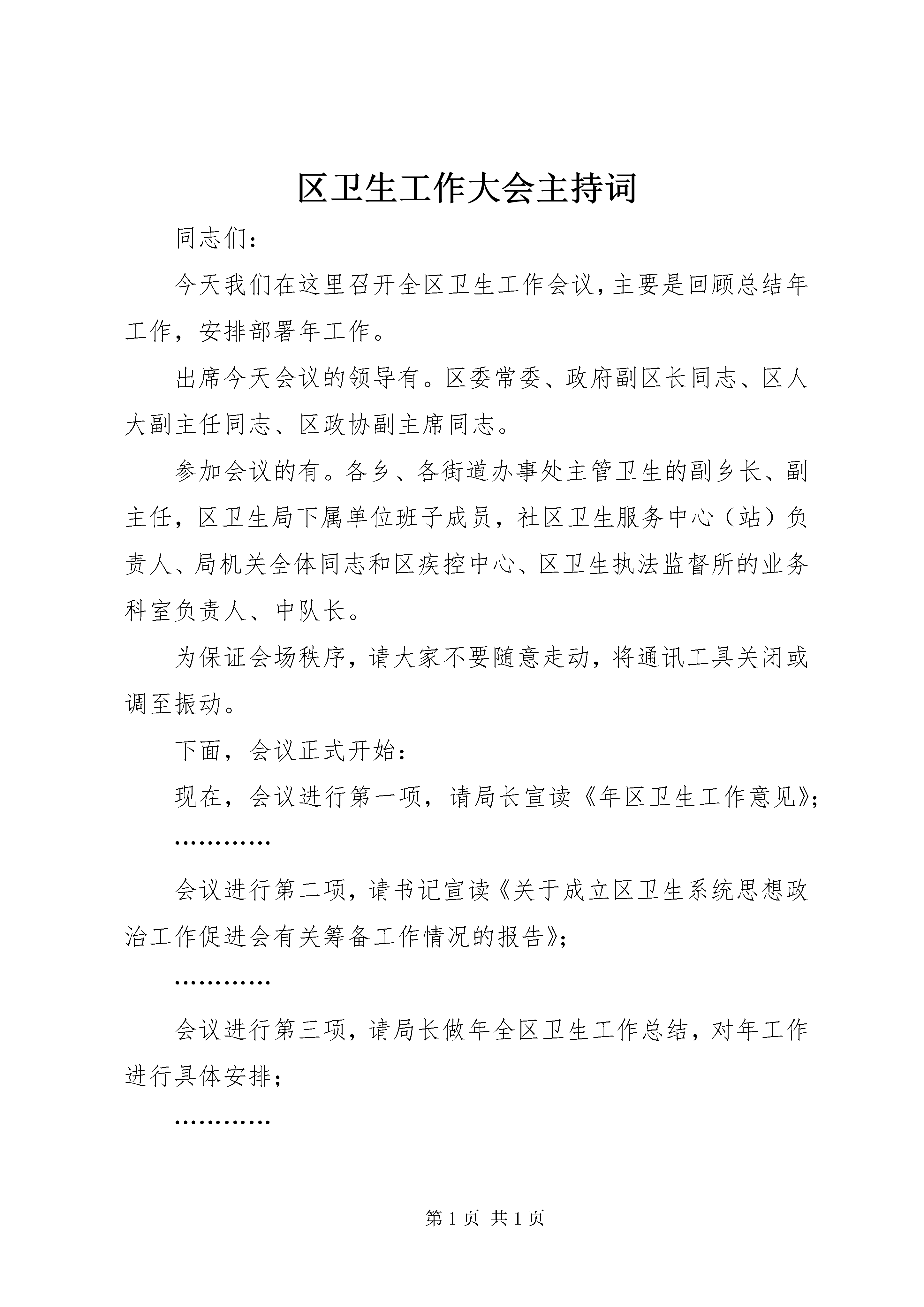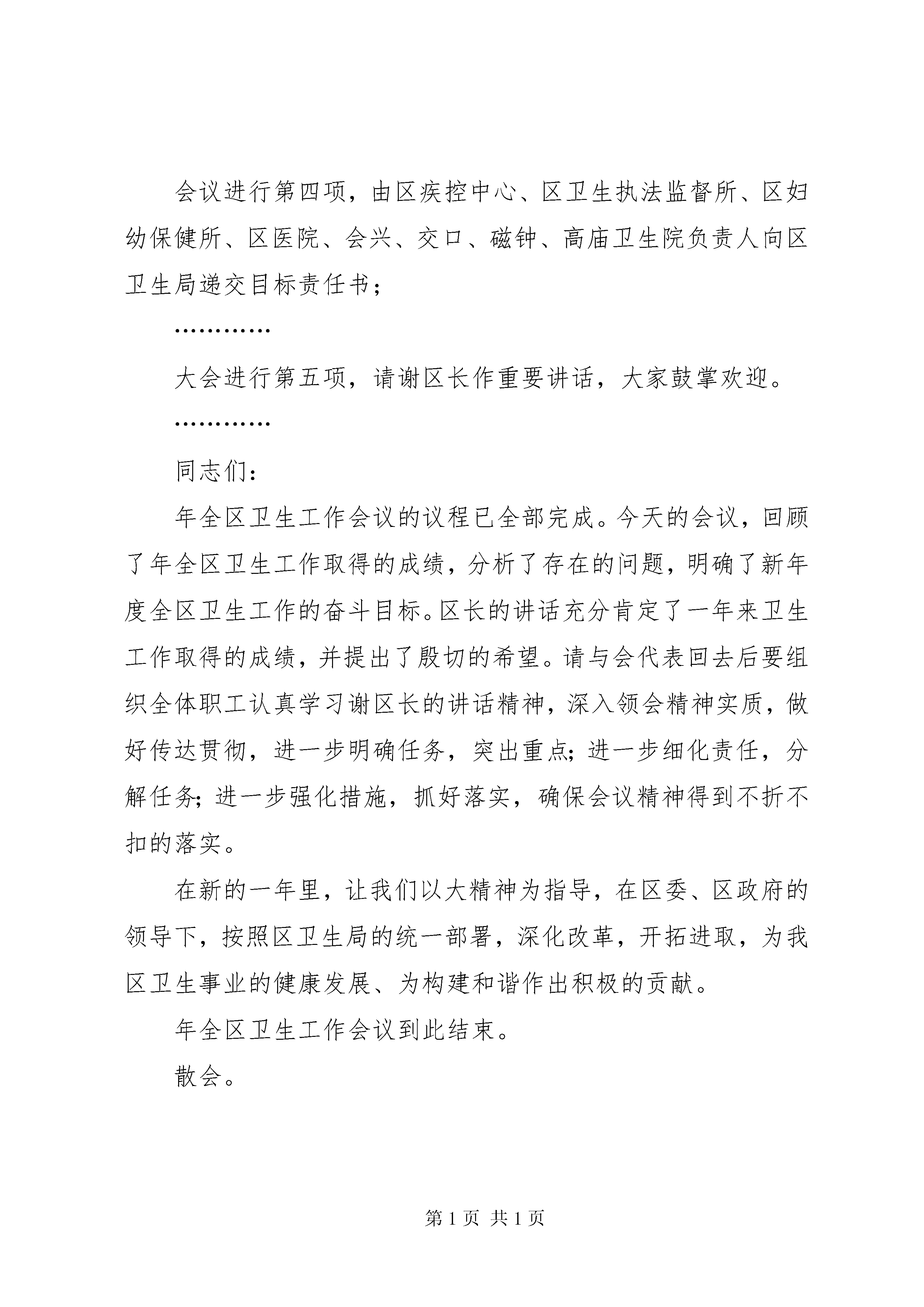 区卫生工作大会主持词同志们:今天我们在这里召开全区卫生工作会议,主要是回顾总结年工作,安排部署年工作。出席今天会议的领导有。区委常委、政府副区长同志、区人大副主任同志、区政协副主席同志。参加会议的有。各乡、各街道办事处主管卫生的副乡长、副主任,区卫生局下属单位班子成员,社区卫生服务中心(站)负责人、局机关全体同志和区疾控中心、区卫生执法监督所的业务科室负责人、中队长。为保证会场秩序,请大家不要随意走动,将通讯工具关闭或调至振动。下面,会议正式开始:现在,会议进行第一项,请局长宣读《年区卫生工作意见》;…………会议进行第二项,请书记宣读《关于成立区卫生系统思想政治工作促进会有关筹备工作情况的报告》;…………会议进行第三项,请局长做年全区卫生工作总结,对年工作进行具体安排;…………会议进行第四项,由区疾控中心、区卫生执法监督所、区妇幼保健所、区医院、会兴、交口、磁钟、高庙卫生院负责人向区卫生局递交目标责任书;…………大会进行第五项,请谢区长作重要讲话,大家鼓掌欢迎。…………同志们:年全区卫生工作会议的议程已全部完成。今天的会议,回顾了年全区卫生工作取得的成绩,分析了存在的问题,明确了新年度全区卫生工作的奋斗目标。区长的讲话充分肯定了一年来卫生工作取得的成绩,并提出了殷切的希望。请与会代表回去后要组织全体职工认真学习谢区长的讲话精神,深入领会精神实质,做好传达贯彻,进一步明确任务,突出重点;进一步细化责任,分解任务;进一步强化措施,抓好落实,确保会议精神得到不折不扣的落实。在新的一年里,让我们以大精神为指导,在区委、区政府的领导下,按照区卫生局的统一部署,深化改革,开拓进取,为我区卫生事业的健康发展、为构建和谐作出积极的贡献。年全区卫生工作会议到此结束。散会。