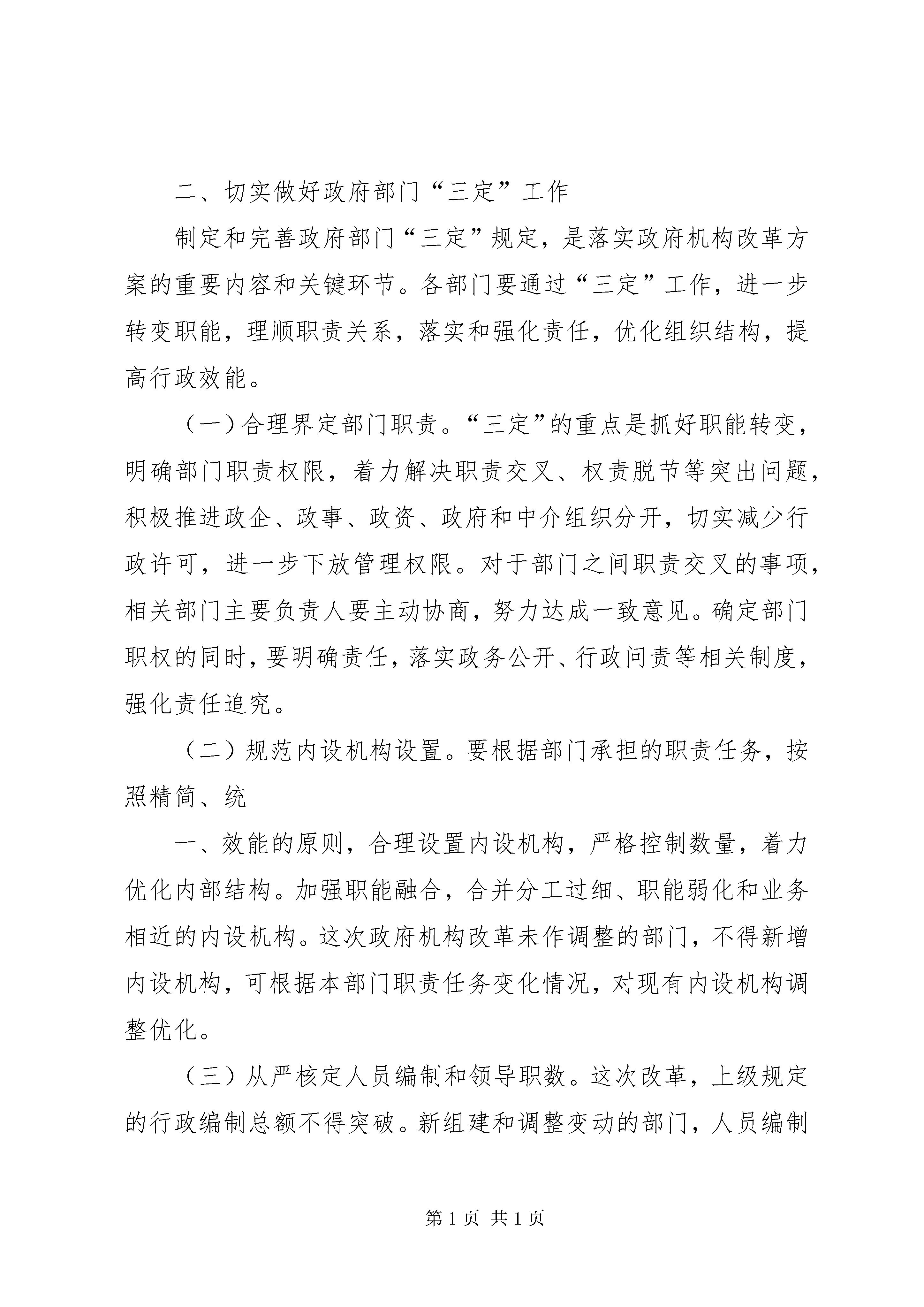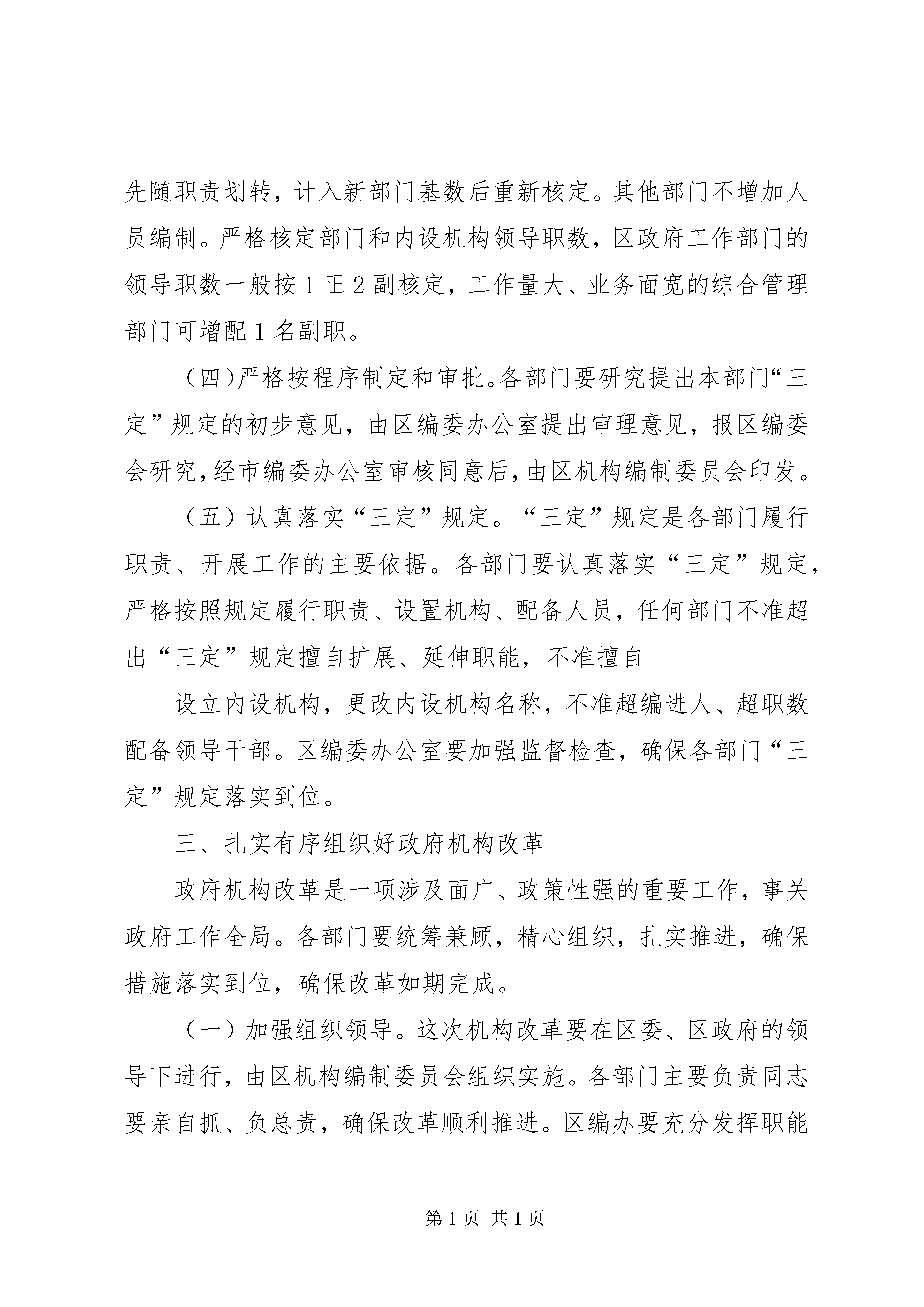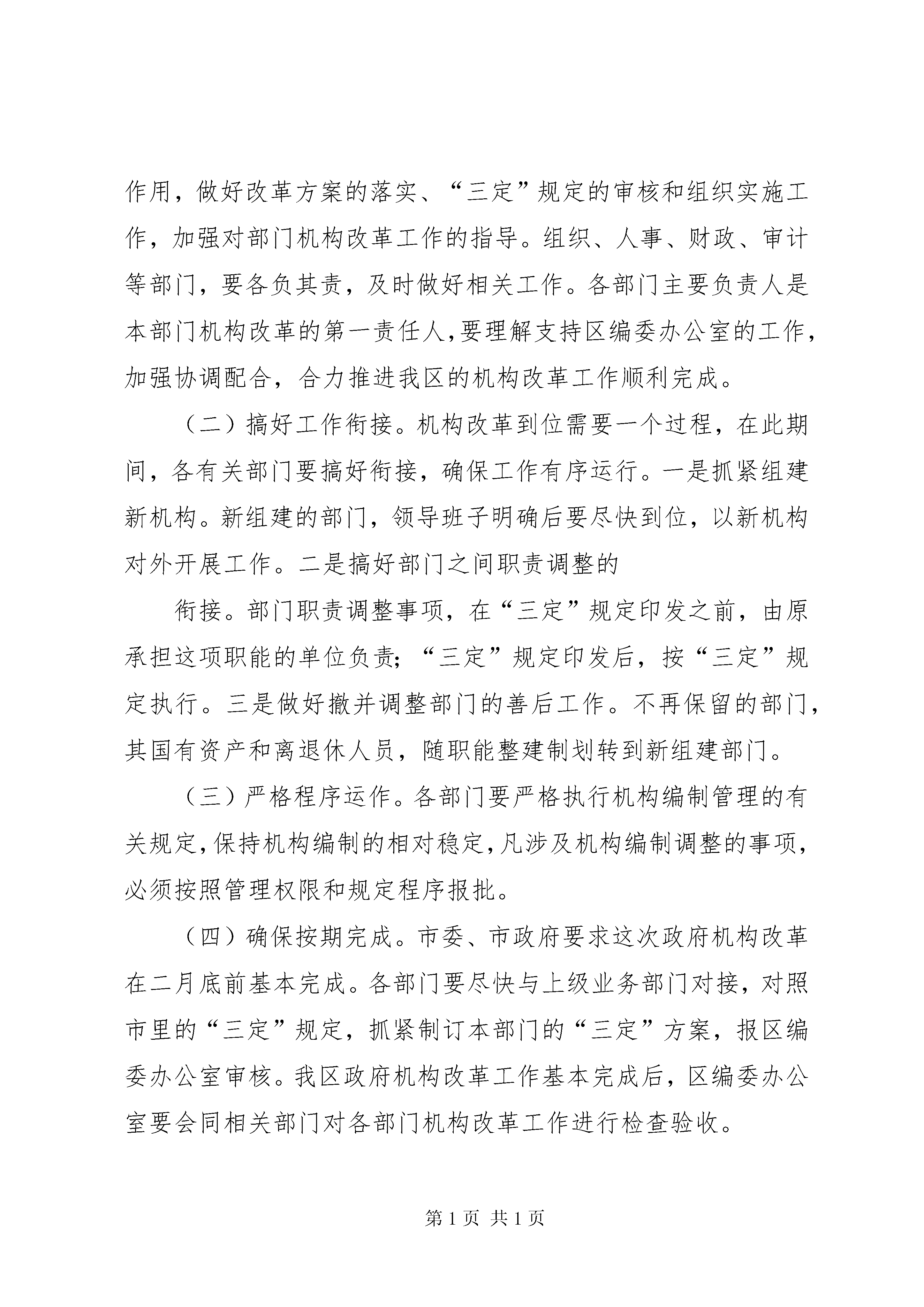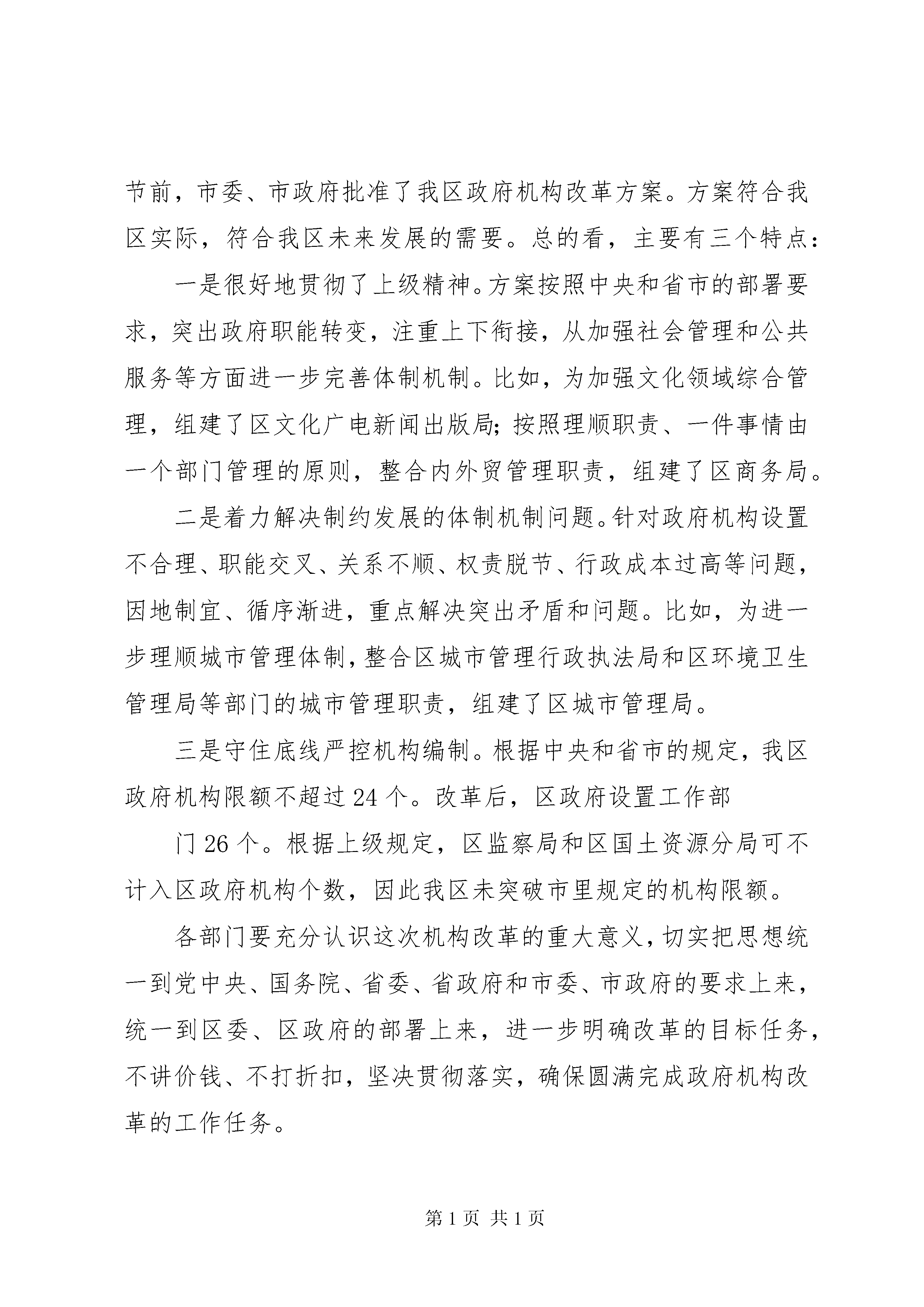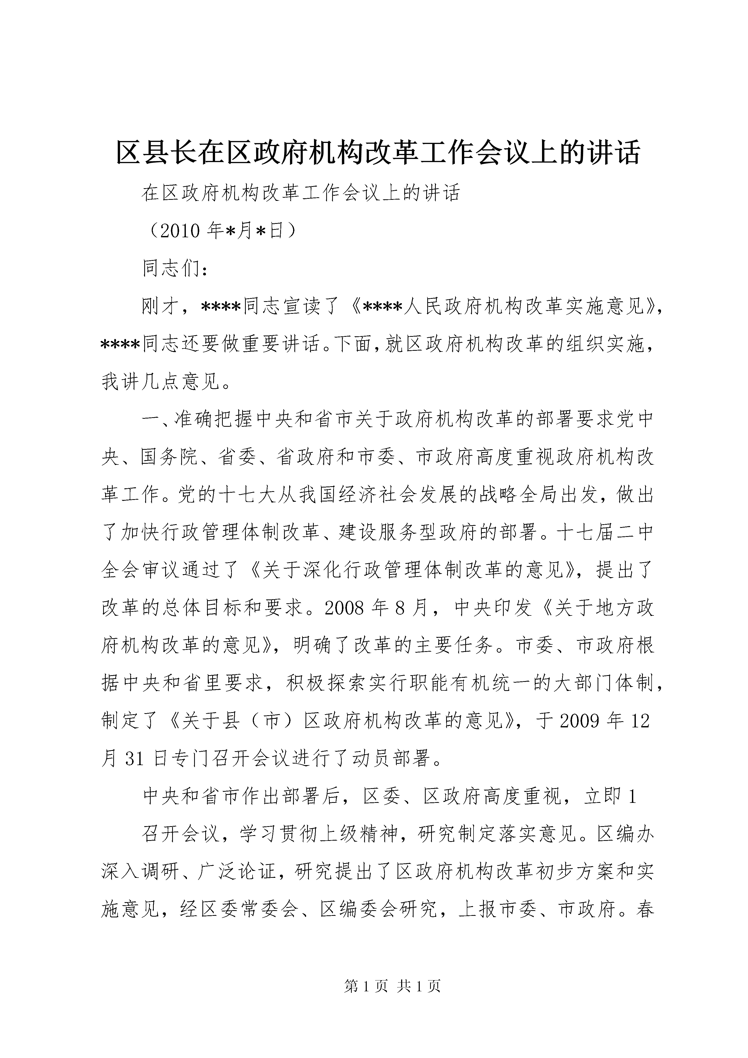 区县长在区政府机构改革工作会议上的讲话在区政府机构改革工作会议上的讲话(2010年*月*日)同志们:刚才,****同志宣读了《****人民政府机构改革实施意见》,****同志还要做重要讲话。下面,就区政府机构改革的组织实施,我讲几点意见。一、准确把握中央和省市关于政府机构改革的部署要求党中央、国务院、省委、省政府和市委、市政府高度重视政府机构改革工作。党的十七大从我国经济社会发展的战略全局出发,做出了加快行政管理体制改革、建设服务型政府的部署。十七届二中全会审议通过了《关于深化行政管理体制改革的意见》,提出了改革的总体目标和要求。2008年8月,中央印发《关于地方政府机构改革的意见》,明确了改革的主要任务。市委、市政府根据中央和省里要求,积极探索实行职能有机统一的大部门体制,制定了《关于县(市)区政府机构改革的意见》,于2009年12月31日专门召开会议进行了动员部署。中央和省市作出部署后,区委、区政府高度重视,立即1召开会议,学习贯彻上级精神,研究制定落实意见。区编办深入调研、广泛论证,研究提出了区政府机构改革初步方案和实施意见,经区委常委会、区编委会研究,上报市委、市政府。春节前,市委、市政府批准了我区政府机构改革方案。方案符合我区实际,符合我区未来发展的需要。总的看,主要有三个特点:一是很好地贯彻了上级精神。方案按照中央和省市的部署要求,突出政府职能转变,注重上下衔接,从加强社会管理和公共服务等方面进一步完善体制机制。比如,为加强文化领域综合管理,组建了区文化广电新闻出版局;按照理顺职责、一件事情由一个部门管理的原则,整合内外贸管理职责,组建了区商务局。二是着力解决制约发展的体制机制问题。针对政府机构设置不合理、职能交叉、关系不顺、权责脱节、行政成本过高等问题,因地制宜、循序渐进,重点解决突出矛盾和问题。比如,为进一步理顺城市管理体制,整合区城市管理行政执法局和区环境卫生管理局等部门的城市管理职责,组建了区城市管理局。三是守住底线严控机构编制。根据中央和省市的规定,我区政府机构限额不超过24个。改革后,区政府设置工作部门26个。根据上级规定,区监察局和区国土资源分局可不计入区政府机构个数,因此我区未突破市里规定的机构限额。各部门要充分认识这次机构改革的重大意义,切实把思想统一到党中央、国务院、省委、省政府和市委、市政府的要求上来,统一到区委、区政府的部署上来,进一步明确改革的目标任务,不讲价钱、不打折扣,坚决贯彻落实,确保圆满完成政府机构改革的工作任务。二、切实做好政府部门“三定”工作制定和完善政府部门“三定”规定,是落实政府机构改革方案的重要内容和关键环节。各部门要通过“三定”工作,进一步转变职能,理顺职责关系,落实和强化责任,优化组织结构,提高行政效能。(一)合理界定部门职责。“三定”的重点是抓好职能转变,明确部门职责权限,着力解决职责交叉、权责脱节等突出问题,积极推进政企、政事、政资、政府和中介组织分开,切实减少行政许可,进一步下放管理权限。对于部门之间职责交叉的事项,相关部门主要负责人要主动协商,努力达成一致意见。确定部门职权的同时,要明确责任,落实政务公开、行政问责等相关制度,强化责任追究。(二)规范内设机构设置。要根据部门承担的职责任务,按照精简、统一、效能的原则,合理设置内设机构,严格控制数量,着力优化内部结构。加强职能融合,合并分工过细、职能弱化和业务相近的内设机构。这次政府机构改革未作调整的部门,不得新增内设机构,可根据本部门职责任务变化情况,对现有内设机构调整优化。(三)从严核定人员编制和领导职数。这次改革,上级规定的行政编制总额不得突破。新组建和调整变动的部门,人员编制先随职责划转,计入新部门基数后重新核定。其他部门不增加人员编制。严格核定部门和内设机构领导职数,区政府工作部门的领导职数一般按1正2副核定,工作量大、业务面宽的综合管理部门可增配1名副职。(四)严格按程序制定和审批。各部门要研究提出本部门“三定”规定的初步意见,由区编委办公室提出审理意见,报区编委会研究,经市编委办公室审核同意后,由区机构编制委员会印发。(五)认真落实“三定”规定。“三定”规定是各部门履行职责、开展工作的主要依据。各部门要认真落实“三定”规定,严格按照规定履行职责、设置机构、配备人员,任何部门不准超出“三定”规定擅自扩展、延伸职能,不准擅自设立内设机构,更改内设机构名称,不准超编进人、超职数配备领导干部。区编委办公室要加强监督检查,确保各部门“三定”规定落实到位。三、扎实有序组织好政府机构改革政府机构改革是一项涉及面广、政策性强的重要工作,事关政府工作全局。各部门要统筹兼顾,精心组织,扎实推进,确保措施落实到位,确保改革如期完成。(一)加强组织领导。这次机构改革要在区委、区政府的领导下进行,由
