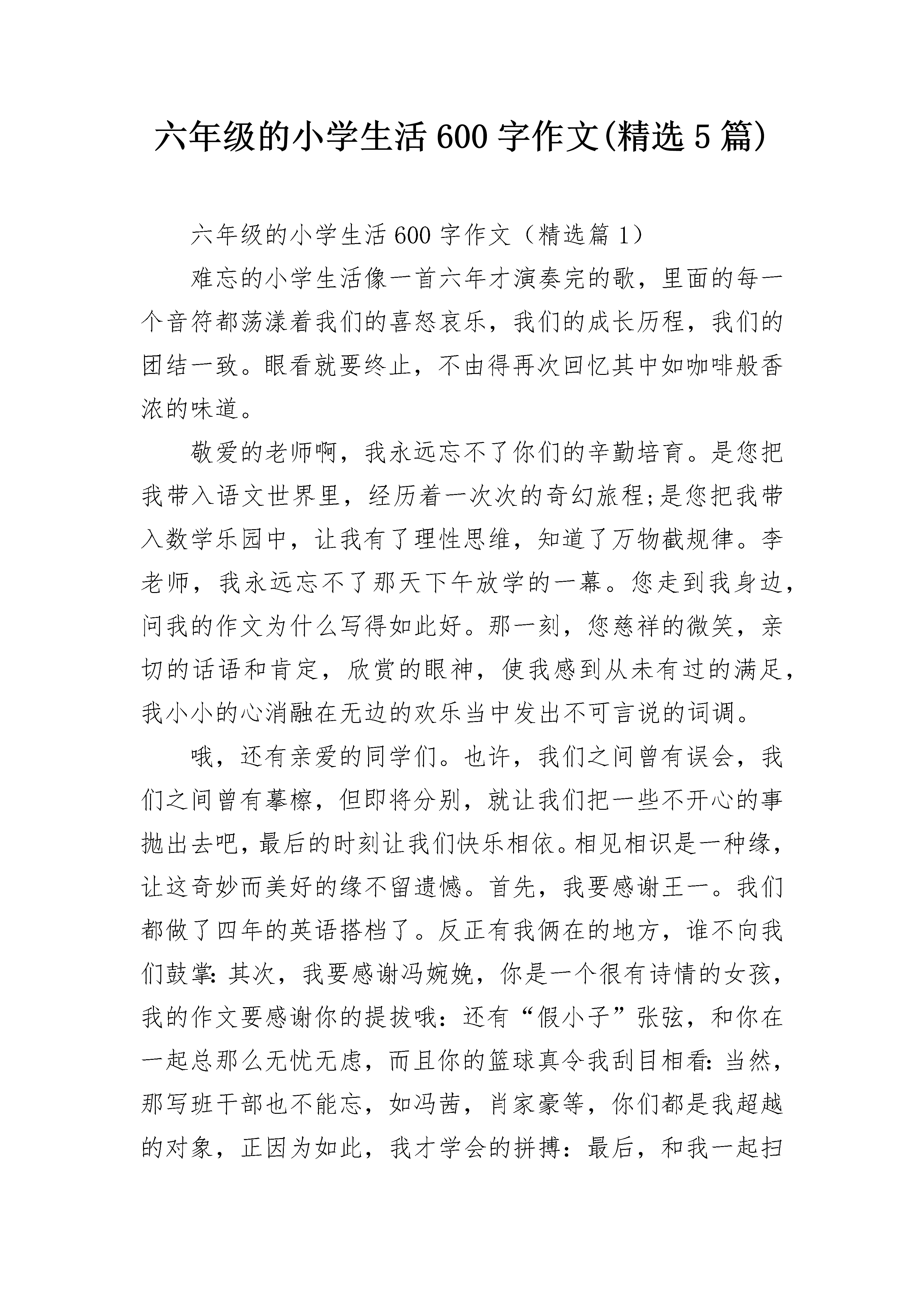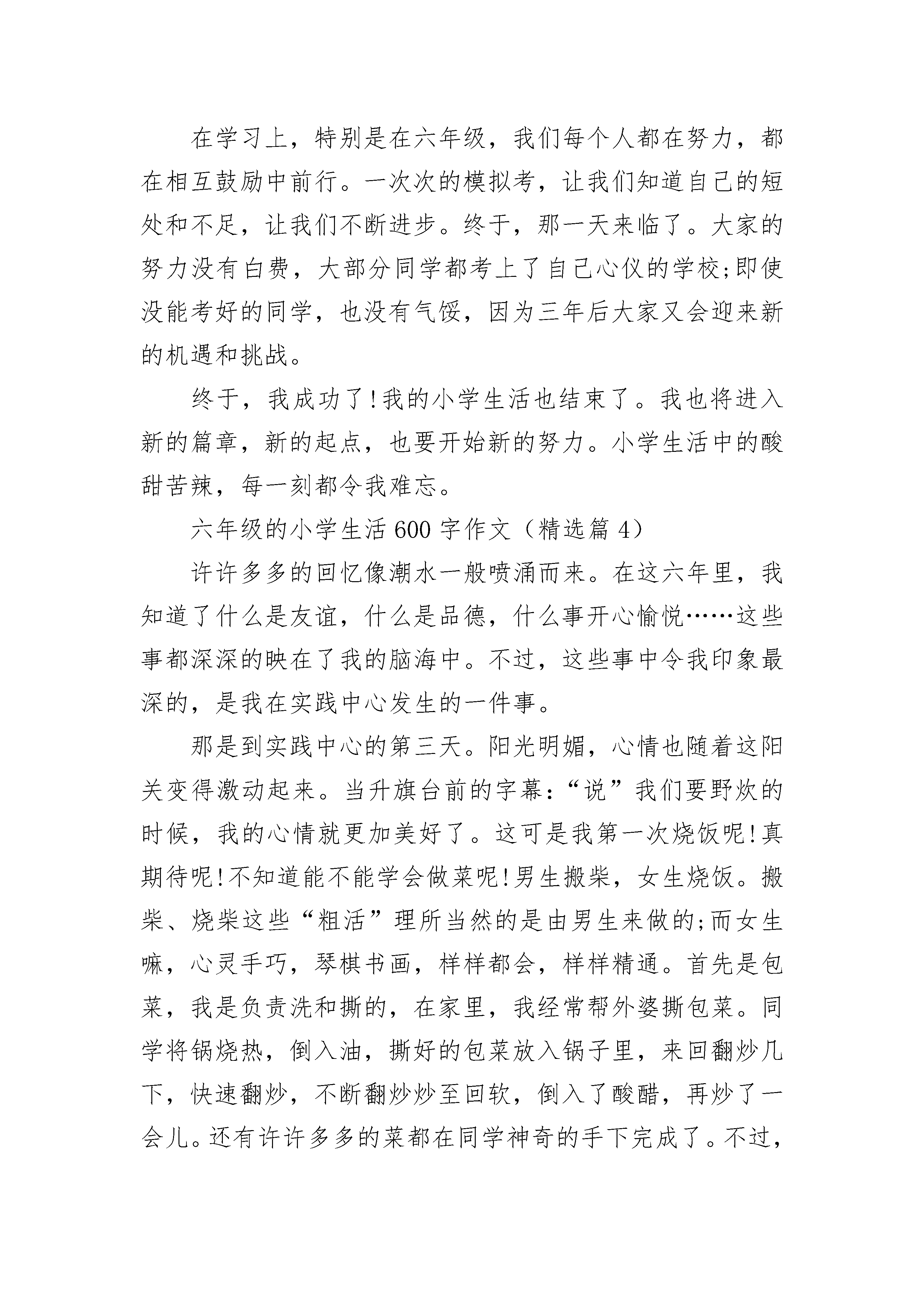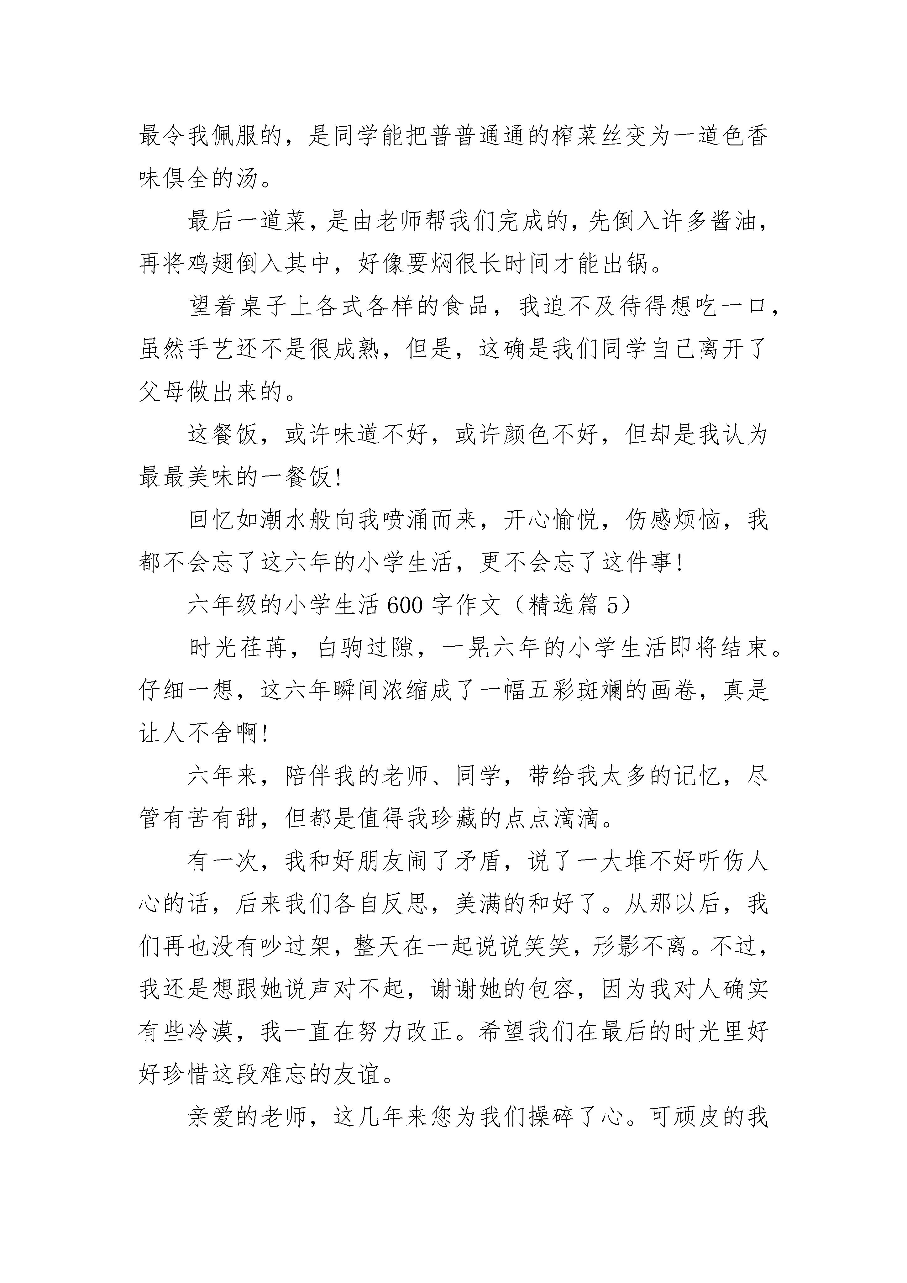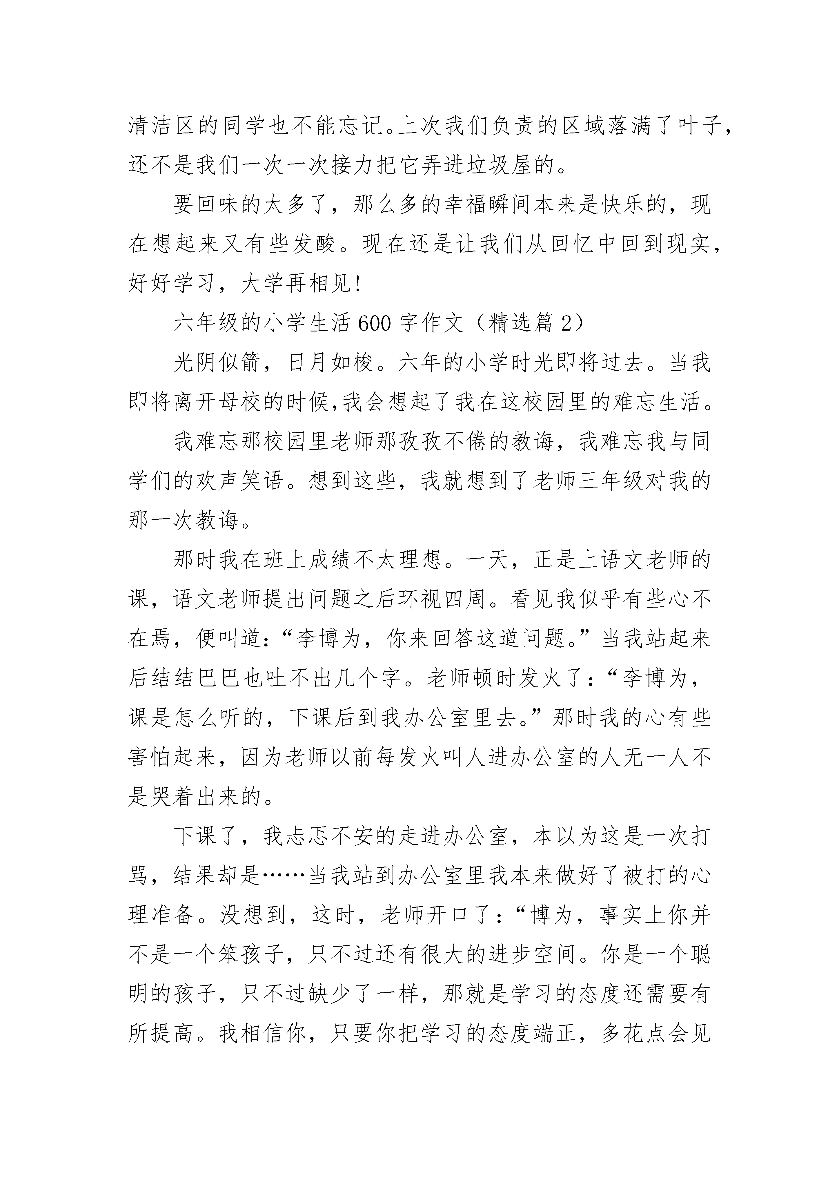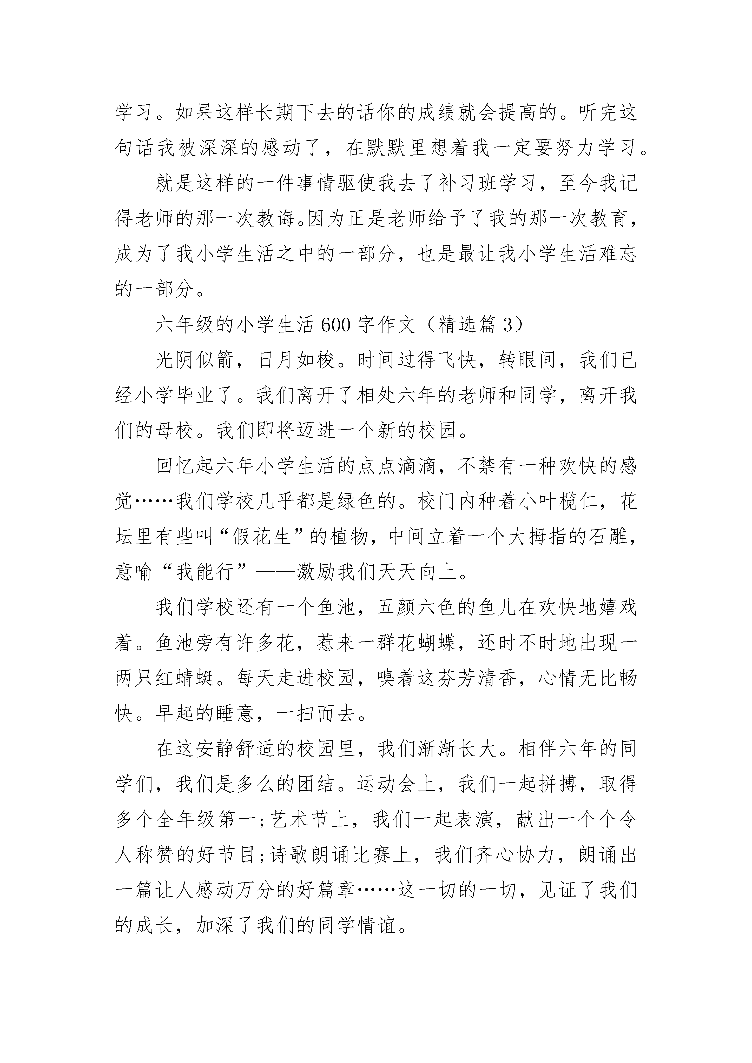 六年级的小学生活600字作文(精选5篇)六年级的小学生活600字作文(精选篇1)难忘的小学生活像一首六年才演奏完的歌,里面的每一个音符都荡漾着我们的喜怒哀乐,我们的成长历程,我们的团结一致。眼看就要终止,不由得再次回忆其中如咖啡般香浓的味道。敬爱的老师啊,我永远忘不了你们的辛勤培育。是您把我带入语文世界里,经历着一次次的奇幻旅程;是您把我带入数学乐园中,让我有了理性思维,知道了万物截规律。李老师,我永远忘不了那天下午放学的一幕。您走到我身边,问我的作文为什么写得如此好。那一刻,您慈祥的微笑,亲切的话语和肯定,欣赏的眼神,使我感到从未有过的满足,我小小的心消融在无边的欢乐当中发出不可言说的词调。哦,还有亲爱的同学们。也许,我们之间曾有误会,我们之间曾有摹檫,但即将分别,就让我们把一些不开心的事抛出去吧,最后的时刻让我们快乐相依。相见相识是一种缘,让这奇妙而美好的缘不留遗憾。首先,我要感谢王一。我们都做了四年的英语搭档了。反正有我俩在的地方,谁不向我们鼓掌:其次,我要感谢冯婉娩,你是一个很有诗情的女孩,我的作文要感谢你的提拔哦:还有“假小子”张弦,和你在一起总那么无忧无虑,而且你的篮球真令我刮目相看:当然,那写班干部也不能忘,如冯茜,肖家豪等,你们都是我超越的对象,正因为如此,我才学会的拼搏:最后,和我一起扫清洁区的同学也不能忘记。上次我们负责的区域落满了叶子,还不是我们一次一次接力把它弄进垃圾屋的。要回味的太多了,那么多的幸福瞬间本来是快乐的,现在想起来又有些发酸。现在还是让我们从回忆中回到现实,好好学习,大学再相见!六年级的小学生活600字作文(精选篇2)光阴似箭,日月如梭。六年的小学时光即将过去。当我即将离开母校的时候,我会想起了我在这校园里的难忘生活。我难忘那校园里老师那孜孜不倦的教诲,我难忘我与同学们的欢声笑语。想到这些,我就想到了老师三年级对我的那一次教诲。那时我在班上成绩不太理想。一天,正是上语文老师的课,语文老师提出问题之后环视四周。看见我似乎有些心不在焉,便叫道:“李博为,你来回答这道问题。”当我站起来后结结巴巴也吐不出几个字。老师顿时发火了:“李博为,课是怎么听的,下课后到我办公室里去。”那时我的心有些害怕起来,因为老师以前每发火叫人进办公室的人无一人不是哭着出来的。下课了,我忐忑不安的走进办公室,本以为这是一次打骂,结果却是……当我站到办公室里我本来做好了被打的心理准备。没想到,这时,老师开口了:“博为,事实上你并不是一个笨孩子,只不过还有很大的进步空间。你是一个聪明的孩子,只不过缺少了一样,那就是学习的态度还需要有所提高。我相信你,只要你把学习的态度端正,多花点会见学习。如果这样长期下去的话你的成绩就会提高的。听完这句话我被深深的感动了,在默默里想着我一定要努力学习。就是这样的一件事情驱使我去了补习班学习,至今我记得老师的那一次教诲。因为正是老师给予了我的那一次教育,成为了我小学生活之中的一部分,也是最让我小学生活难忘的一部分。六年级的小学生活600字作文(精选篇3)光阴似箭,日月如梭。时间过得飞快,转眼间,我们已经小学毕业了。我们离开了相处六年的老师和同学,离开我们的母校。我们即将迈进一个新的校园。回忆起六年小学生活的点点滴滴,不禁有一种欢快的感觉……我们学校几乎都是绿色的。校门内种着小叶榄仁,花坛里有些叫“假花生”的植物,中间立着一个大拇指的石雕,意喻“我能行”——激励我们天天向上。我们学校还有一个鱼池,五颜六色的鱼儿在欢快地嬉戏着。鱼池旁有许多花,惹来一群花蝴蝶,还时不时地出现一两只红蜻蜓。每天走进校园,嗅着这芬芳清香,心情无比畅快。早起的睡意,一扫而去。在这安静舒适的校园里,我们渐渐长大。相伴六年的同学们,我们是多么的团结。运动会上,我们一起拼搏,取得多个全年级第一;艺术节上,我们一起表演,献出一个个令人称赞的好节目;诗歌朗诵比赛上,我们齐心协力,朗诵出一篇让人感动万分的好篇章……这一切的一切,见证了我们的成长,加深了我们的同学情谊。在学习上,特别是在六年级,我们每个人都在努力,都在相互鼓励中前行。一次次的模拟考,让我们知道自己的短处和不足,让我们不断进步。终于,那一天来临了。大家的努力没有白费,大部分同学都考上了自己心仪的学校;即使没能考好的同学,也没有气馁,因为三年后大家又会迎来新的机遇和挑战。终于,我成功了!我的小学生活也结束了。我也将进入新的篇章,新的起点,也要开始新的努力。小学生活中的酸甜苦辣,每一刻都令我难忘。六年级的小学生活600字作文(精选篇4)许许多多的回忆像潮水一般喷涌而来。在这六年里,我知道了什么是友谊,什么是品德,什么事开心愉悦……这些事都深深的映在了我的脑海中。不过,这些事中令我印象最深的,是我在实践中心发生的一件事。那是到实践中心的第三天。阳光明媚,心情也随着这阳关变