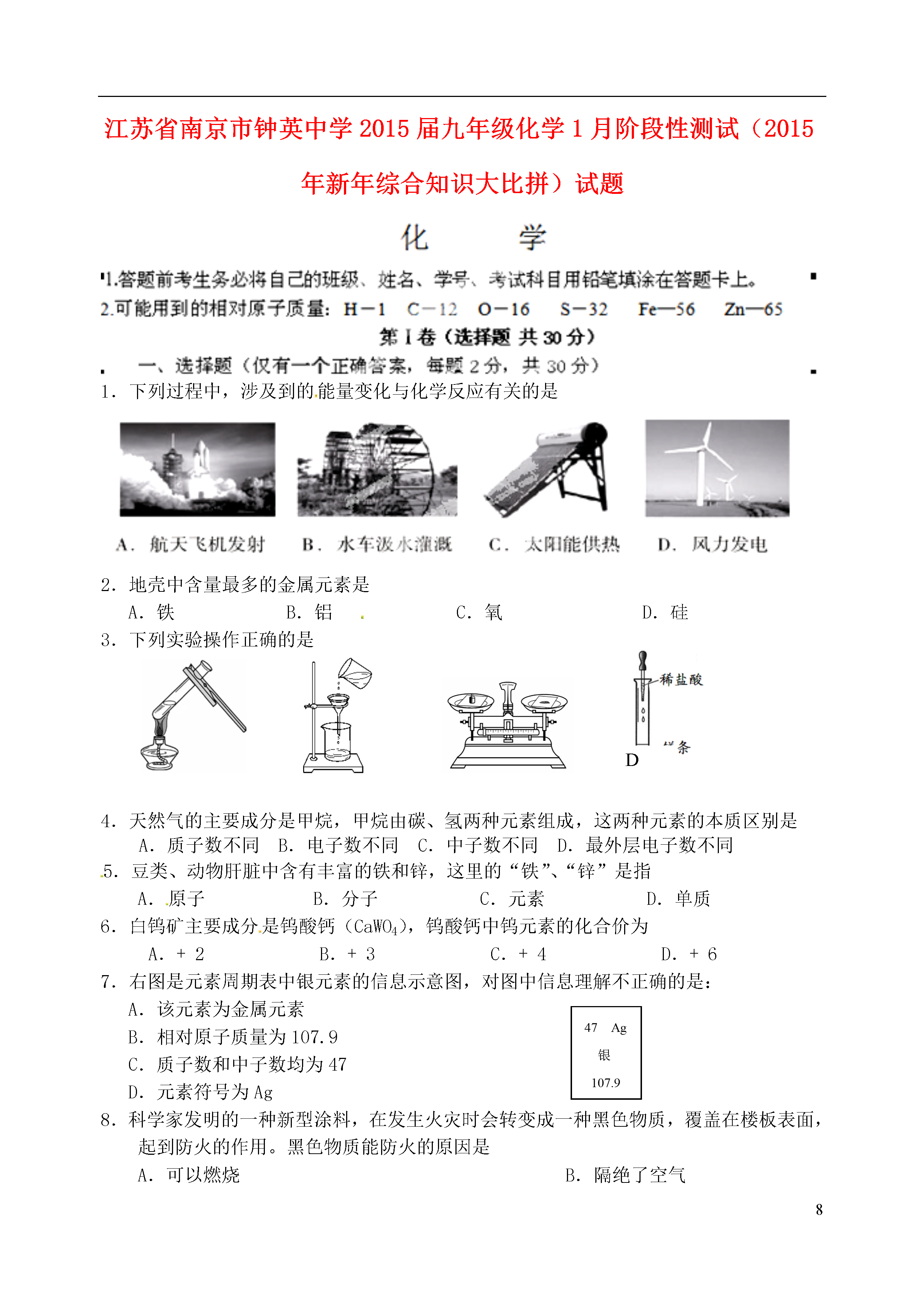 试题-江苏-2015_江苏省南京市钟英中学2015届九年级化学1月阶段性测试(2015年新年综合知识大比拼)试题.rar