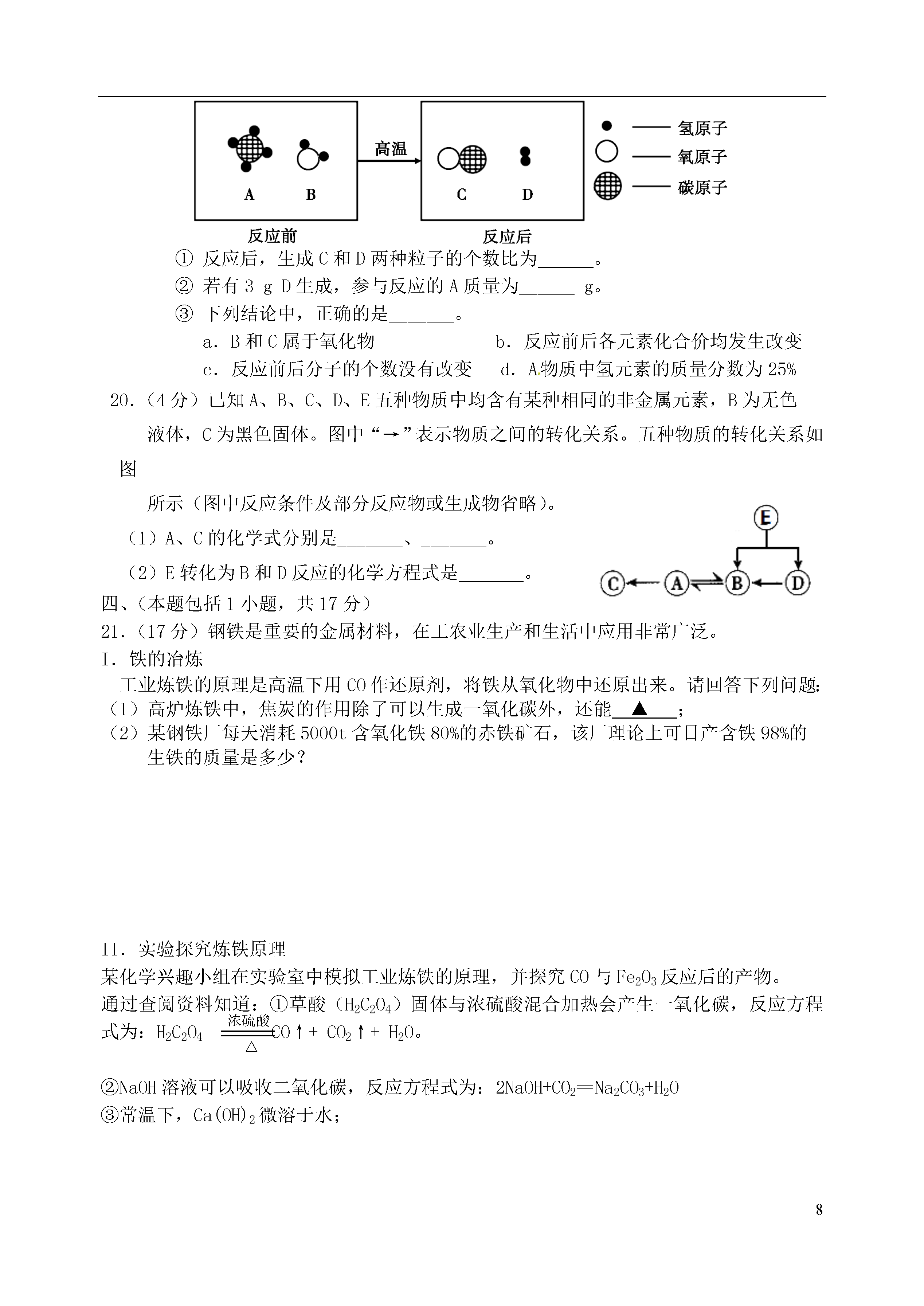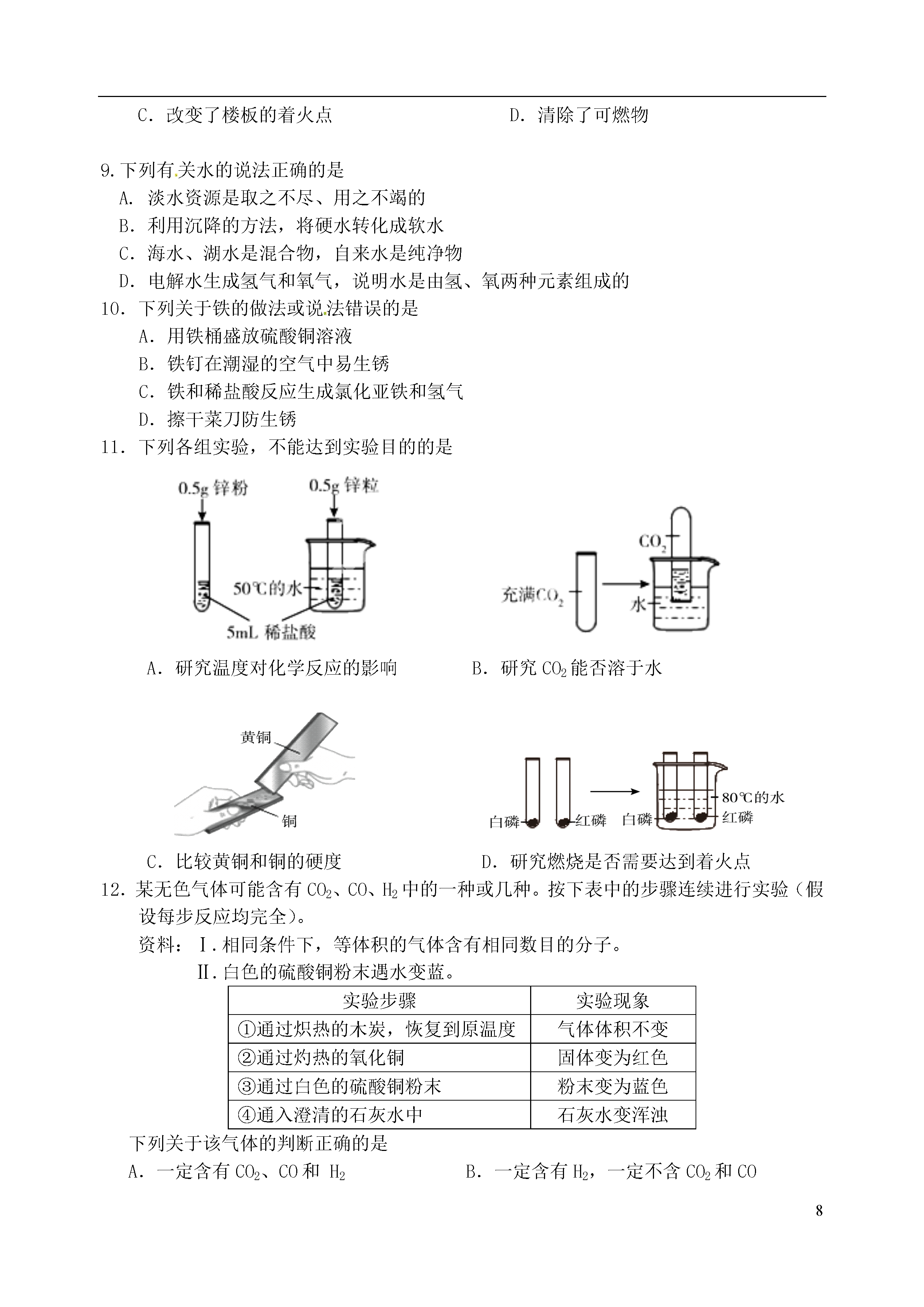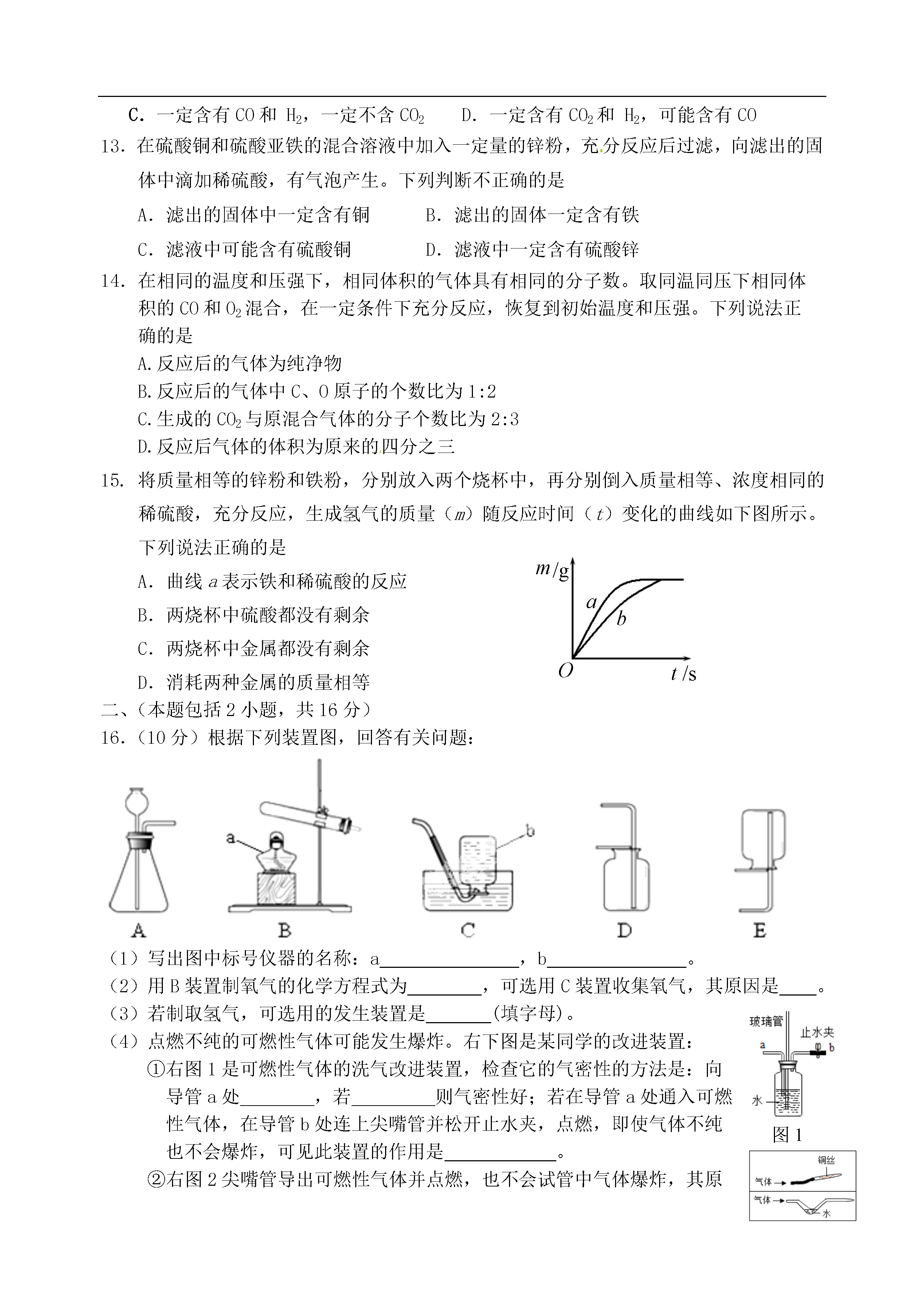 8江苏省南京市钟英中学2015届九年级化学1月阶段性测试(2015年新年综合知识大比拼)试题1.下列过程中,涉及到的能量变化与化学反应有关的是2.地壳中含量最多的金属元素是A.铁B.铝C.氧D.硅3.下列实验操作正确的是ABCD4.天然气的主要成分是甲烷,甲烷由碳、氢两种元素组成,这两种元素的本质区别是A.质子数不同B.电子数不同C.中子数不同D.最外层电子数不同5.豆类、动物肝脏中含有丰富的铁和锌,这里的“铁”、“锌”是指A.原子B.分子C.元素D.单质6.白钨矿主要成分是钨酸钙(CaWO4),钨酸钙中钨元素的化合价为A.+2B.+3C.+4D.+67.右图是元素周期表中银元素的信息示意图,对图中信息理解不正确的是:47Ag银107.9A.该元素为金属元素B.相对原子质量为107.9C.质子数和中子数均为47D.元素符号为Ag8.科学家发明的一种新型涂料,在发生火灾时会转变成一种黑色物质,覆盖在楼板表面,起到防火的作用。黑色物质能防火的原因是A.可以燃烧B.隔绝了空气C.改变了楼板的着火点D.清除了可燃物9.下列有关水的说法正确的是A.淡水资源是取之不尽、用之不竭的B.利用沉降的方法,将硬水转化成软水C.海水、湖水是混合物,自来水是纯净物D.电解水生成氢气和氧气,说明水是由氢、氧两种元素组成的10.下列关于铁的做法或说法错误的是A.用铁桶盛放硫酸铜溶液B.铁钉在潮湿的空气中易生锈C.铁和稀盐酸反应生成氯化亚铁和氢气D.擦干菜刀防生锈11.下列各组实验,不能达到实验目的的是A.研究温度对化学反应的影响B.研究CO2能否溶于水C.比较黄铜和铜的硬度D.研究燃烧是否需要达到着火点12.某无色气体可能含有CO2、CO、H2中的一种或几种。按下表中的步骤连续进行实验(假设每步反应均完全)。资料:Ⅰ.相同条件下,等体积的气体含有相同数目的分子。Ⅱ.白色的硫酸铜粉末遇水变蓝。实验步骤实验现象①通过炽热的木炭,恢复到原温度气体体积不变②通过灼热的氧化铜固体变为红色③通过白色的硫酸铜粉末粉末变为蓝色④通入澄清的石灰水中石灰水变浑浊下列关于该气体的判断正确的是A.一定含有CO2、CO和H2B.一定含有H2,一定不含CO2和COC.一定含有CO和H2,一定不含CO2D.一定含有CO2和H2,可能含有CO13.在硫酸铜和硫酸亚铁的混合溶液中加入一定量的锌粉,充分反应后过滤,向滤出的固体中滴加稀硫酸,有气泡产生。下列判断不正确的是A.滤出的固体中一定含有铜B.滤出的固体一定含有铁C.滤液中可能含有硫酸铜D.滤液中一定含有硫酸锌14.在相同的温度和压强下,相同体积的气体具有相同的分子数。取同温同压下相同体积的CO和O2混合,在一定条件下充分反应,恢复到初始温度和压强。下列说法正确的是A.反应后的气体为纯净物B.反应后的气体中C、O原子的个数比为1:2C.生成的CO2与原混合气体的分子个数比为2:3D.反应后气体的体积为原来的四分之三15.abt/sm/gO将质量相等的锌粉和铁粉,分别放入两个烧杯中,再分别倒入质量相等、浓度相同的稀硫酸,充分反应,生成氢气的质量(m)随反应时间(t)变化的曲线如下图所示。下列说法正确的是A.曲线a表示铁和稀硫酸的反应B.两烧杯中硫酸都没有剩余C.两烧杯中金属都没有剩余D.消耗两种金属的质量相等二、(本题包括2小题,共16分)16.(10分)根据下列装置图,回答有关问题:(1)写出图中标号仪器的名称:a,b。(2)用B装置制氧气的化学方程式为,可选用C装置收集氧气,其原因是。(3)若制取氢气,可选用的发生装置是(填字母)。(4)点燃不纯的可燃性气体可能发生爆炸。右下图是某同学的改进装置:①右图1是可燃性气体的洗气改进装置,检查它的气密性的方法是:向导管a处,若则气密性好;若在导管a处通入可燃图1性气体,在导管b处连上尖嘴管并松开止水夹,点燃,即使气体不纯也不会爆炸,可见此装置的作用是。②右图2尖嘴管导出可燃性气体并点燃,也不会试管中气体爆炸,其原理是铜丝或水可以。图217.(6分)人类生存离不开能源。(1)南京家用燃料的更新过程如下:①煤、液化石油气、管道煤气均属于(填“混合物”或“纯净物”)。②下列有关家用燃料更新的理由,不正确的是_____(填字母序号)。A.天然气属可再生能源B.气体燃料比固体燃料利用率更高C.减少燃烧过程中产生的污染物D.气体燃料便于管道输送③相同条件下,气体体积比等于分子数比。现有一套以液化石油气(主要成分为C4H10)为燃料的灶具,若要改为以天然气为燃料的灶具,应