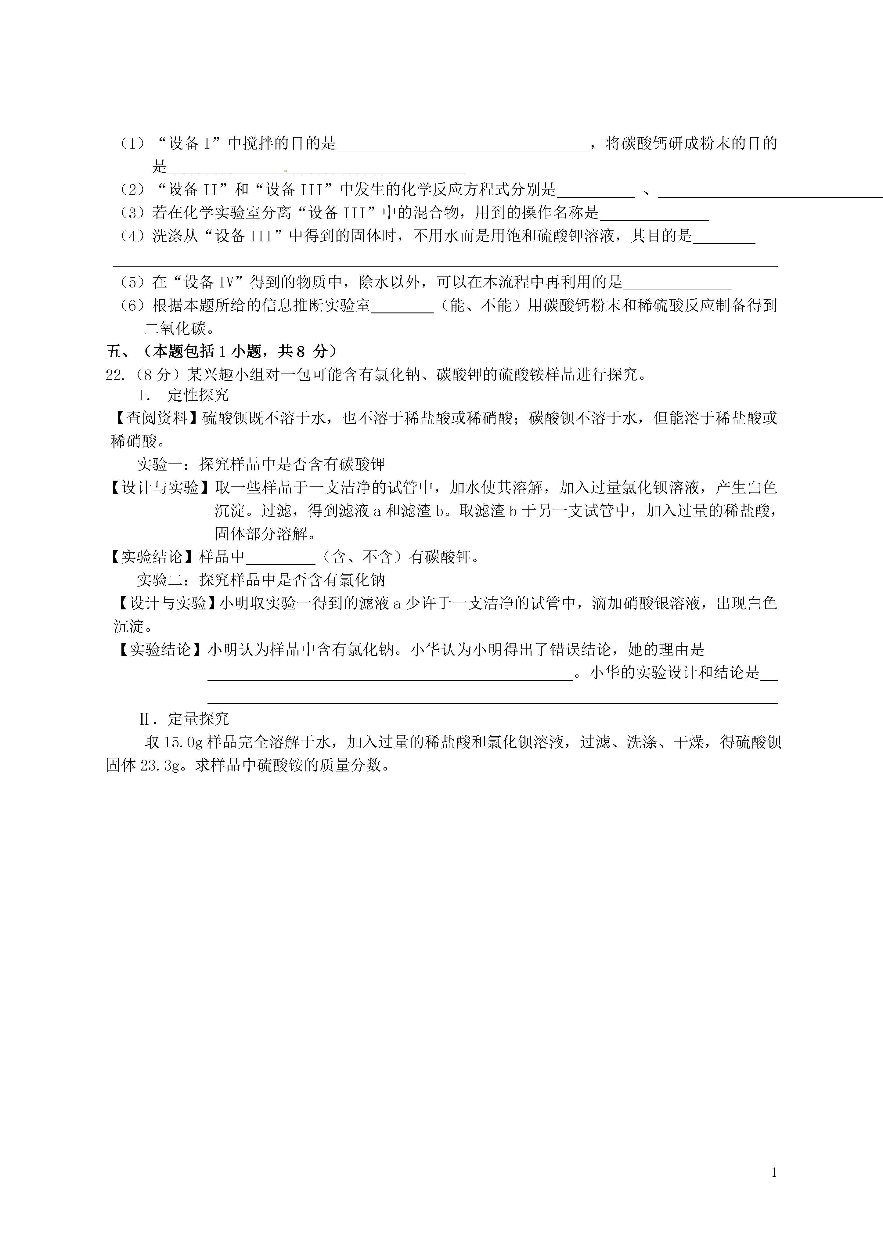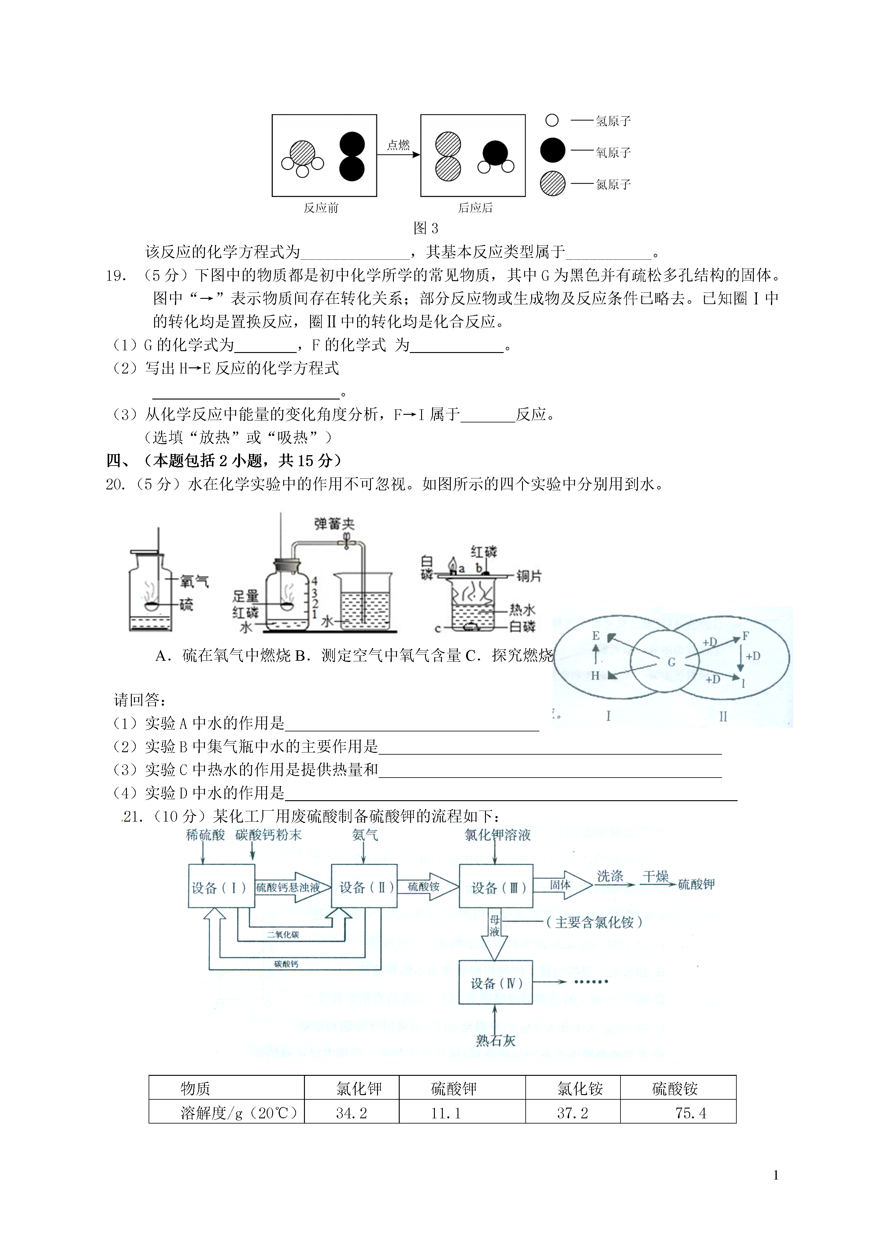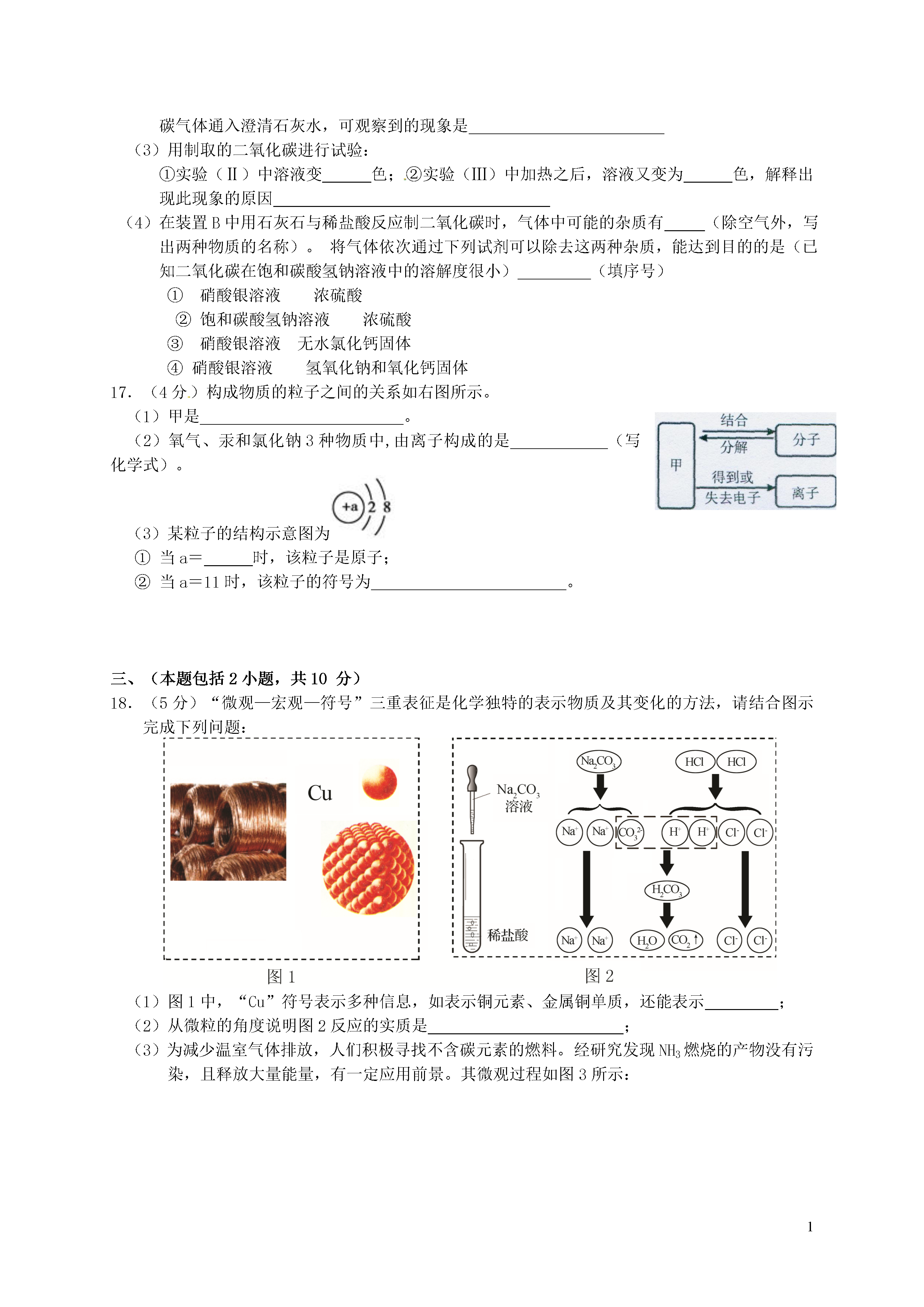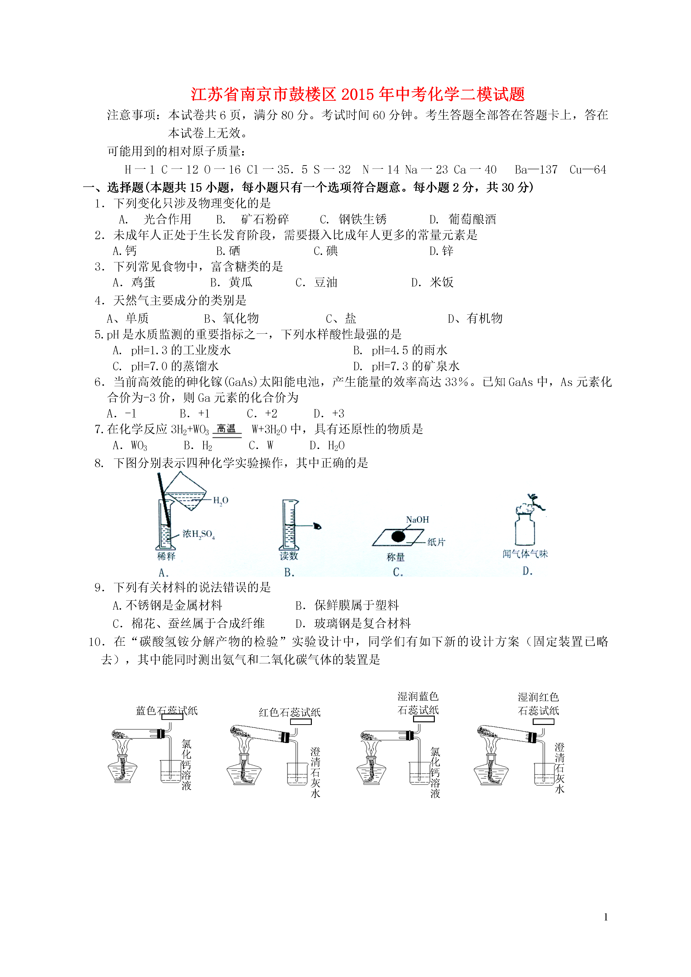 1江苏省南京市鼓楼区2015年中考化学二模试题注意事项:本试卷,满分80分。考试时间60分钟。考生答题全部答在答题卡上,答在本试卷上无效。可能用到的相对原子质量:H一1C一12O一16Cl一35.5S一32N一14Na一23Ca一40Ba—137Cu—64一、选择题(本题共15小题,每小题只有一个选项符合题意。每小题2分,共30分)1.下列变化只涉及物理变化的是A.光合作用B.矿石粉碎C.钢铁生锈D.葡萄酿酒2.未成年人正处于生长发育阶段,需要摄入比成年人更多的常量元素是A.钙B.硒C.碘D.锌3.下列常见食物中,富含糖类的是A.鸡蛋B.黄瓜C.豆油D.米饭4.天然气主要成分的类别是A、单质B、氧化物C、盐D、有机物5.pH是水质监测的重要指标之一,下列水样酸性最强的是A.pH=1.3的工业废水B.pH=4.5的雨水C.pH=7.0的蒸馏水D.pH=7.3的矿泉水6.当前高效能的砷化镓(GaAs)太阳能电池,产生能量的效率高达33%。已知GaAs中,As元素化合价为-3价,则Ga元素的化合价为A.-lB.+1C.+2D.+37.在化学反应3H2+WO3W+3H2O中,具有还原性的物质是A.WO3B.H2C.WD.H2O8.下图分别表示四种化学实验操作,其中正确的是9.下列有关材料的说法错误的是A.不锈钢是金属材料B.保鲜膜属于塑料C.棉花、蚕丝属于合成纤维D.玻璃钢是复合材料10.在“碳酸氢铵分解产物的检验”实验设计中,同学们有如下新的设计方案(固定装置已略去),其中能同时测出氨气和二氧化碳气体的装置是氯化钙溶液澄清石灰水氯化钙溶液澄清石灰水蓝色石蕊试纸红色石蕊试纸湿润蓝色石蕊试纸湿润红色石蕊试纸A.B.C.D.11.下列离子能在溶液中大量共存,并形成无色溶液A.Cu2+SO42-Na+OH-B.H+Na+CO32-Cl-C.K+Fe3+NO3-SO42-D.Na+Cl-K+NO3-12.豆浆被称为“植物奶”,其中含有的异黄酮(C15H10O2)具有防癌功能,下列说法正确的是A.异黄酮是有机高分子化合物C.异黄酮中C、H、O三种元素的质量比为15:10:2B.异黄酮中碳元素质量分数最大D.异黄酮的相对分子质量为222g13.a、b两种物质的溶解度曲线如图所示.下列说法不正确的是A.15℃时,60ga、b的饱和溶液中均含有10g溶质B.加水或升温均可使b的饱和溶液变为不饱和溶液C.将30℃时a的饱和溶液降温至15℃,溶质的质量分数变大D.向100g水中加入20ga,升温至30℃,所得溶液为饱和溶液14.除去下列物质中混有的少量杂质(括号内为杂质),所用方法正确的是A.KCl固体(MnO2固体)——加水充分溶解,过滤,蒸发结晶B.CO2气体(CO气体)——通入氧气C.CaO固体(CaCO3固体)——加水充分溶解,过滤D.KCl溶液(CaC12溶液)——滴加碳酸钠溶液至恰好完全反应,过滤15.小明同学分别取20gNaOH固体A、B、C,采用不同方法保存。几天后,A未变质、B部分变质、C全部变质,他将三份固体分别配成溶液并滴入20%的稀硫酸直到正好反应。下列说法正确的是:A.几天后,三份固体的质量为:A=B=C;B.为控制正好反应,A不能用酚酞试液指示,B、C可滴加稀硫酸直到正好不冒气泡;C.正好反应时,消耗稀硫酸的质量由大到小的顺序为:A>B>C;D.正好反应时,生成硫酸钠的质量都相等,均为35.5g;二、(本题包括2小题,共17分)16.(13分)根据如图回答问题:(1)若选用A装置加热氯酸钾和二氧化锰制取氧气,还需补充的一种仪器是反应的化学方程式为(2)实验室若选用装置B制取二氧化碳,则需要改正的一点是,请你写出用石灰石与稀盐酸反应制取二氧化碳的化学方程式,将产生的二氧化碳气体通入澄清石灰水,可观察到的现象是(3)用制取的二氧化碳进行试验:①实验(Ⅱ)中溶液变色;②实验(Ⅲ)中加热之后,溶液又变为色,解释出现此现象的原因(4)在装置B中用石灰石与稀盐酸反应制二氧化碳时,气体中可能的杂质有(除空气外,写出两种物质的名称)。将气体依次通过下列试剂可以除去这两种杂质,能达到目的的是(已知二氧化碳在饱和碳酸氢钠溶液中的溶解度很小)(填序号)①硝酸银溶液浓硫酸②饱和碳酸氢钠溶液浓硫酸③硝酸银溶液无水氯化钙固体④硝酸银溶液氢氧化钠和氧化钙固体17.(4分)构成物质的粒子之间的关系如右图所示。(1)甲是。(2)氧气、汞和氯化钠3种物质中,由离