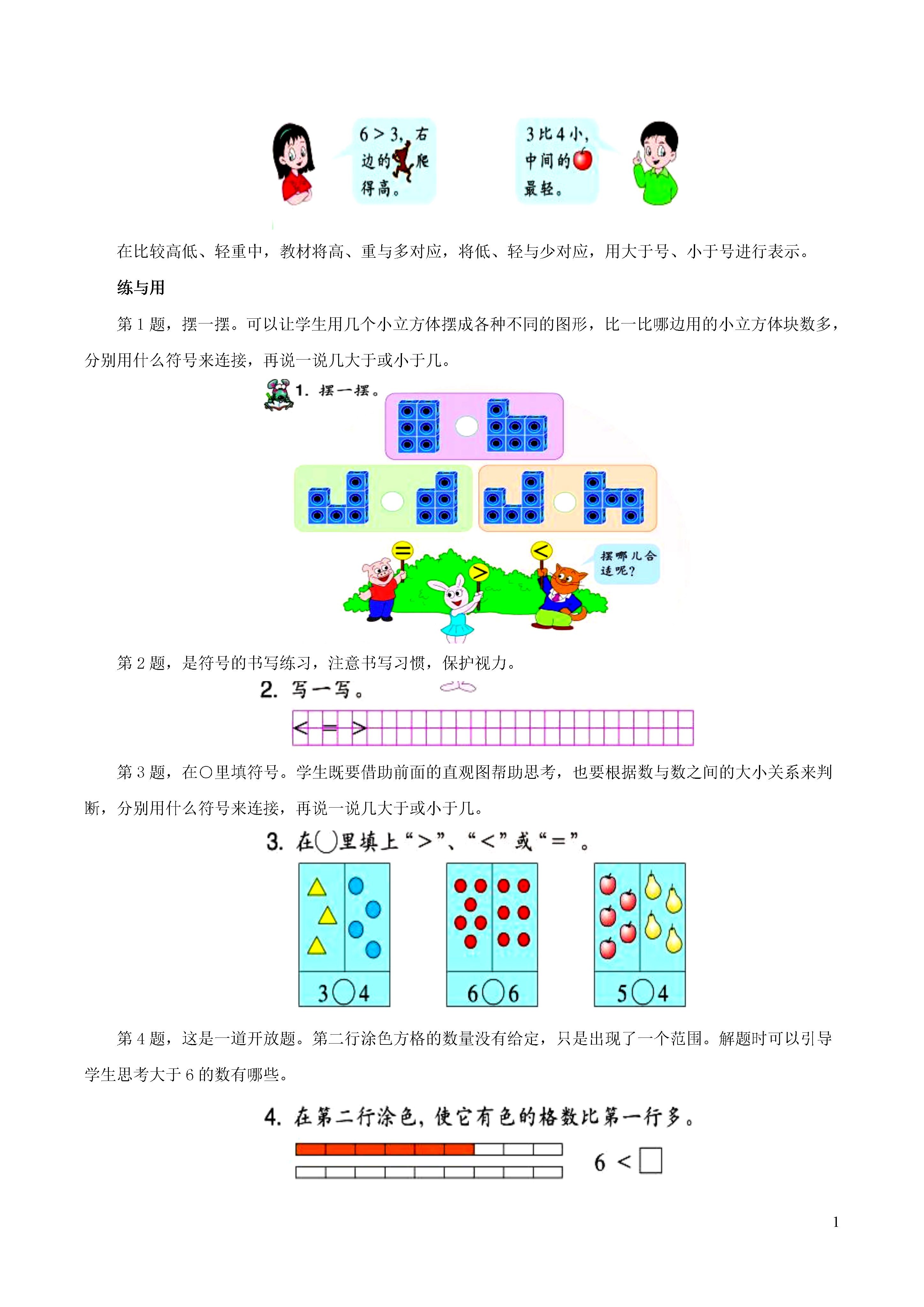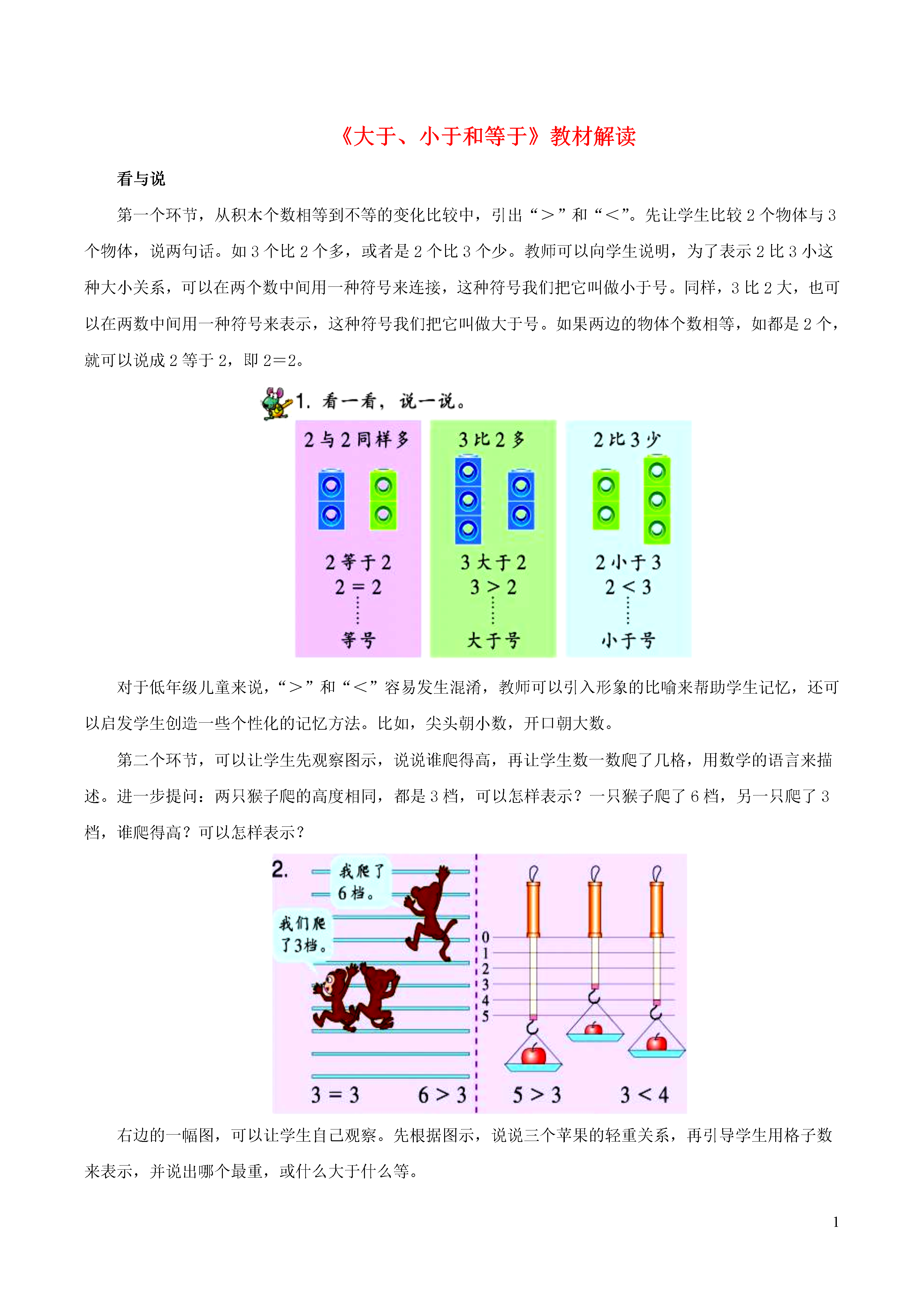 1《大于、小于和等于》教材解读看与说第一个环节,从积木个数相等到不等的变化比较中,引出“>”和“<”。先让学生比较2个物体与3个物体,说两句话。如3个比2个多,或者是2个比3个少。教师可以向学生说明,为了表示2比3小这种大小关系,可以在两个数中间用一种符号来连接,这种符号我们把它叫做小于号。同样,3比2大,也可以在两数中间用一种符号来表示,这种符号我们把它叫做大于号。如果两边的物体个数相等,如都是2个,就可以说成2等于2,即2=2。对于低年级儿童来说,“>”和“<”容易发生混淆,教师可以引入形象的比喻来帮助学生记忆,还可以启发学生创造一些个性化的记忆方法。比如,尖头朝小数,开口朝大数。第二个环节,可以让学生先观察图示,说说谁爬得高,再让学生数一数爬了几格,用数学的语言来描述。进一步提问:两只猴子爬的高度相同,都是3档,可以怎样表示?一只猴子爬了6档,另一只爬了3档,谁爬得高?可以怎样表示?右边的一幅图,可以让学生自己观察。先根据图示,说说三个苹果的轻重关系,再引导学生用格子数来表示,并说出哪个最重,或什么大于什么等。在比较高低、轻重中,教材将高、重与多对应,将低、轻与少对应,用大于号、小于号进行表示。练与用第1题,摆一摆。可以让学生用几个小立方体摆成各种不同的图形,比一比哪边用的小立方体块数多,分别用什么符号来连接,再说一说几大于或小于几。第2题,是符号的书写练习,注意书写习惯,保护视力。第3题,在○里填符号。学生既要借助前面的直观图帮助思考,也要根据数与数之间的大小关系来判断,分别用什么符号来连接,再说一说几大于或小于几。第4题,这是一道开放题。第二行涂色方格的数量没有给定,只是出现了一个范围。解题时可以引导学生思考大于6的数有哪些。