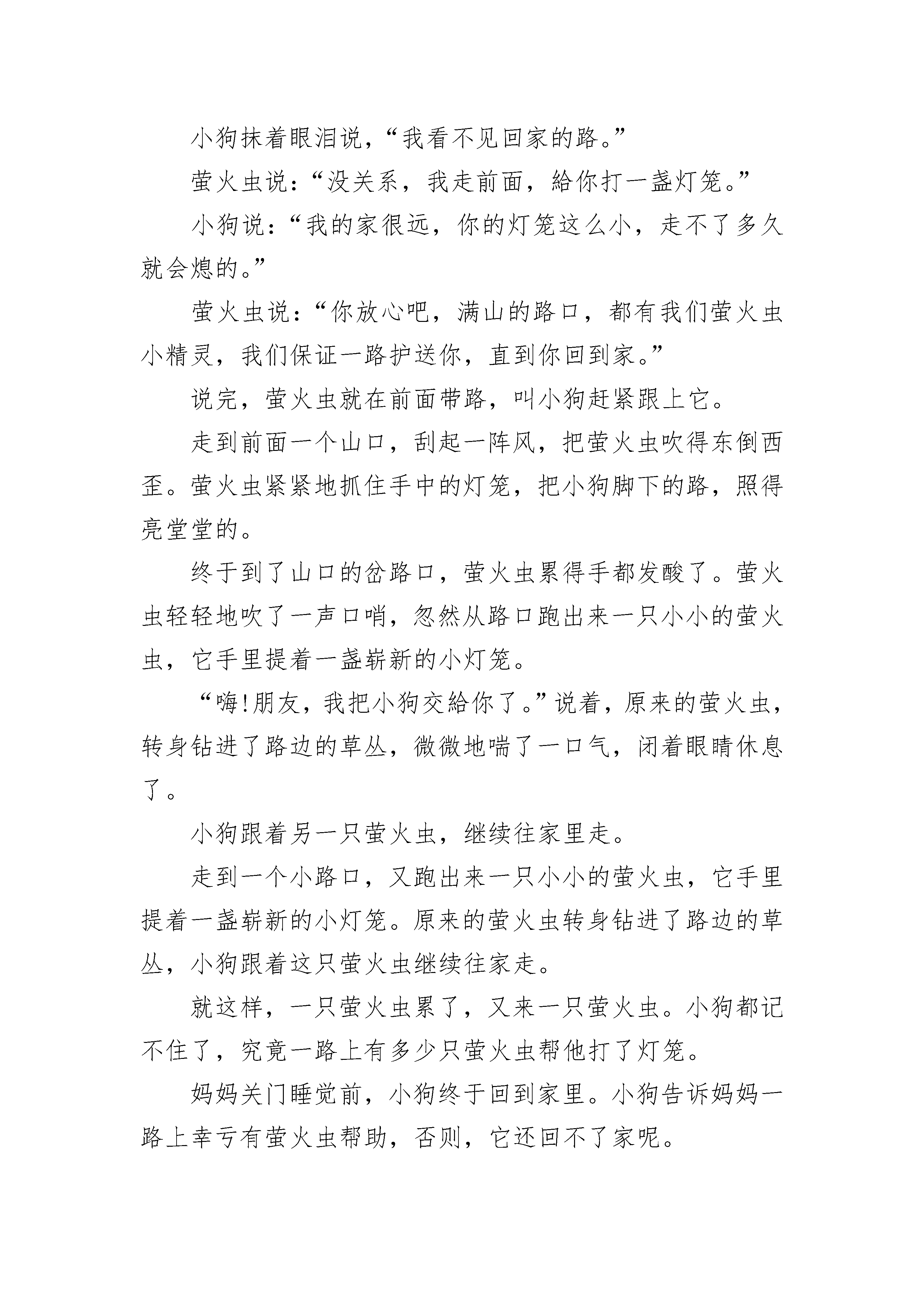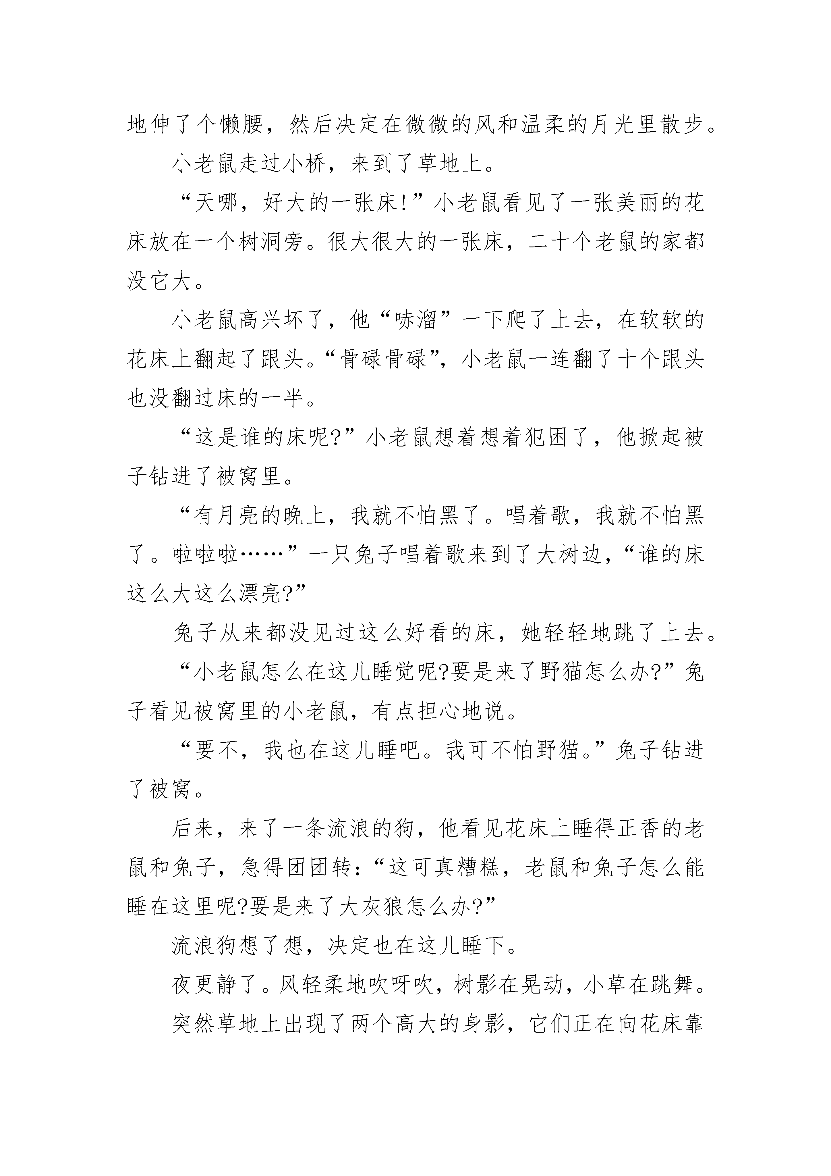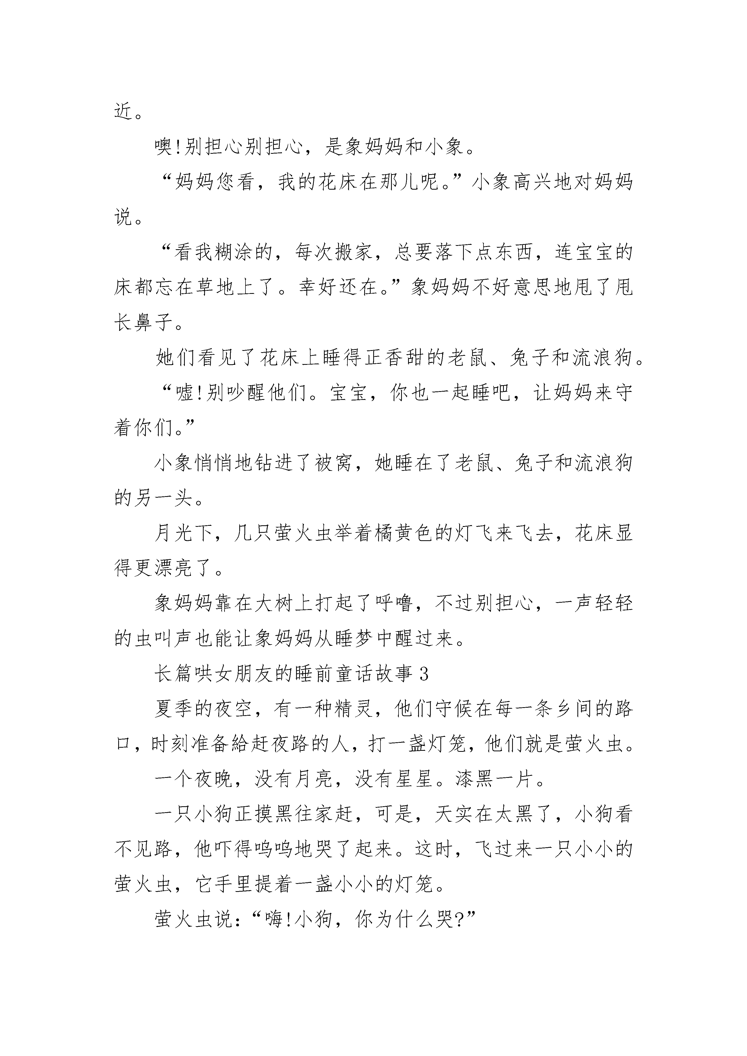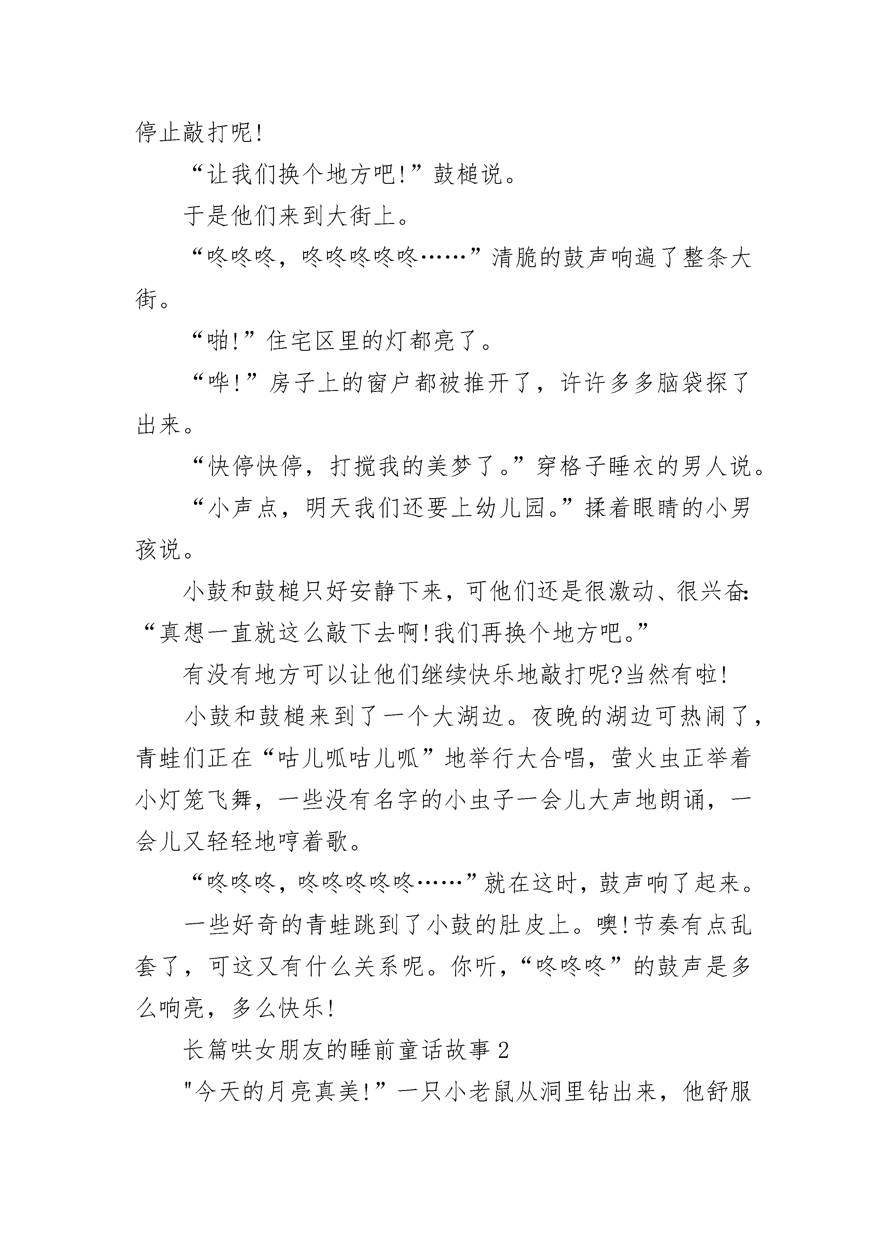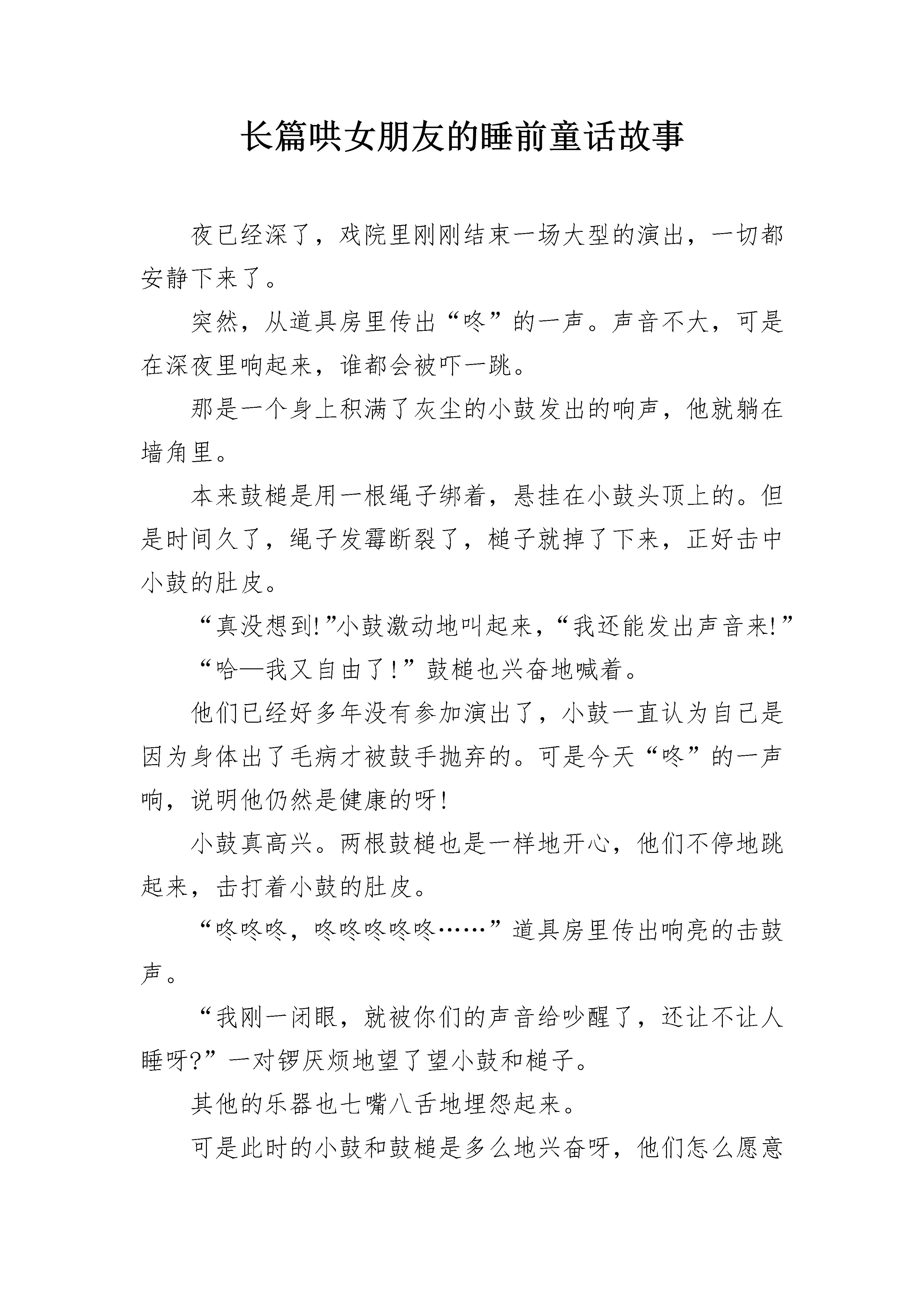 长篇哄女朋友的睡前童话故事夜已经深了,戏院里刚刚结束一场大型的演出,一切都安静下来了。突然,从道具房里传出“咚”的一声。声音不大,可是在深夜里响起来,谁都会被吓一跳。那是一个身上积满了灰尘的小鼓发出的响声,他就躺在墙角里。本来鼓槌是用一根绳子绑着,悬挂在小鼓头顶上的。但是时间久了,绳子发霉断裂了,槌子就掉了下来,正好击中小鼓的肚皮。“真没想到!”小鼓激动地叫起来,“我还能发出声音来!”“哈—我又自由了!”鼓槌也兴奋地喊着。他们已经好多年没有参加演出了,小鼓一直认为自己是因为身体出了毛病才被鼓手抛弃的。可是今天“咚”的一声响,说明他仍然是健康的呀!小鼓真高兴。两根鼓槌也是一样地开心,他们不停地跳起来,击打着小鼓的肚皮。“咚咚咚,咚咚咚咚咚……”道具房里传出响亮的击鼓声。“我刚一闭眼,就被你们的声音给吵醒了,还让不让人睡呀?”一对锣厌烦地望了望小鼓和槌子。其他的乐器也七嘴八舌地埋怨起来。可是此时的小鼓和鼓槌是多么地兴奋呀,他们怎么愿意停止敲打呢!“让我们换个地方吧!”鼓槌说。于是他们来到大街上。“咚咚咚,咚咚咚咚咚……”清脆的鼓声响遍了整条大街。“啪!”住宅区里的灯都亮了。“哗!”房子上的窗户都被推开了,许许多多脑袋探了出来。“快停快停,打搅我的美梦了。”穿格子睡衣的男人说。“小声点,明天我们还要上幼儿园。”揉着眼睛的小男孩说。小鼓和鼓槌只好安静下来,可他们还是很激动、很兴奋:“真想一直就这么敲下去啊!我们再换个地方吧。”有没有地方可以让他们继续快乐地敲打呢?当然有啦!小鼓和鼓槌来到了一个大湖边。夜晚的湖边可热闹了,青蛙们正在“咕儿呱咕儿呱”地举行大合唱,萤火虫正举着小灯笼飞舞,一些没有名字的小虫子一会儿大声地朗诵,一会儿又轻轻地哼着歌。“咚咚咚,咚咚咚咚咚……”就在这时,鼓声响了起来。一些好奇的青蛙跳到了小鼓的肚皮上。噢!节奏有点乱套了,可这又有什么关系呢。你听,“咚咚咚”的鼓声是多么响亮,多么快乐!长篇哄女朋友的睡前童话故事2"今天的月亮真美!”一只小老鼠从洞里钻出来,他舒服地伸了个懒腰,然后决定在微微的风和温柔的月光里散步。小老鼠走过小桥,来到了草地上。“天哪,好大的一张床!”小老鼠看见了一张美丽的花床放在一个树洞旁。很大很大的一张床,二十个老鼠的家都没它大。小老鼠高兴坏了,他“哧溜”一下爬了上去,在软软的花床上翻起了跟头。“骨碌骨碌”,小老鼠一连翻了十个跟头也没翻过床的一半。“这是谁的床呢?”小老鼠想着想着犯困了,他掀起被子钻进了被窝里。“有月亮的晚上,我就不怕黑了。唱着歌,我就不怕黑了。啦啦啦……”一只兔子唱着歌来到了大树边,“谁的床这么大这么漂亮?”兔子从来都没见过这么好看的床,她轻轻地跳了上去。“小老鼠怎么在这儿睡觉呢?要是来了野猫怎么办?”兔子看见被窝里的小老鼠,有点担心地说。“要不,我也在这儿睡吧。我可不怕野猫。”兔子钻进了被窝。后来,来了一条流浪的狗,他看见花床上睡得正香的老鼠和兔子,急得团团转:“这可真糟糕,老鼠和兔子怎么能睡在这里呢?要是来了大灰狼怎么办?”流浪狗想了想,决定也在这儿睡下。夜更静了。风轻柔地吹呀吹,树影在晃动,小草在跳舞。突然草地上出现了两个高大的身影,它们正在向花床靠近。噢!别担心别担心,是象妈妈和小象。“妈妈您看,我的花床在那儿呢。”小象高兴地对妈妈说。“看我糊涂的,每次搬家,总要落下点东西,连宝宝的床都忘在草地上了。幸好还在。”象妈妈不好意思地甩了甩长鼻子。她们看见了花床上睡得正香甜的老鼠、兔子和流浪狗。“嘘!别吵醒他们。宝宝,你也一起睡吧,让妈妈来守着你们。”小象悄悄地钻进了被窝,她睡在了老鼠、兔子和流浪狗的另一头。月光下,几只萤火虫举着橘黄色的灯飞来飞去,花床显得更漂亮了。象妈妈靠在大树上打起了呼噜,不过别担心,一声轻轻的虫叫声也能让象妈妈从睡梦中醒过来。长篇哄女朋友的睡前童话故事3夏季的夜空,有一种精灵,他们守候在每一条乡间的路口,时刻准备給赶夜路的人,打一盏灯笼,他们就是萤火虫。一个夜晚,没有月亮,没有星星。漆黑一片。一只小狗正摸黑往家赶,可是,天实在太黑了,小狗看不见路,他吓得呜呜地哭了起来。这时,飞过来一只小小的萤火虫,它手里提着一盏小小的灯笼。萤火虫说:“嗨!小狗,你为什么哭?”小狗抹着眼泪说,“我看不见回家的路。”萤火虫说:“没关系,我走前面,給你打一盏灯笼。”小狗说:“我的家很远,你的灯笼这么小,走不了多久就会熄的。”萤火虫说:“你放心吧,满山的路口,都有我们萤火虫小精灵,我们保证一路护送你,直到你回到家。”说完,萤火虫就在前面带路,叫小狗赶紧跟上它。走到前面一个山口,刮起一阵风,把萤火虫吹得东倒西歪。萤火虫紧紧地抓住手中的灯笼,把小狗脚下的路,照得亮堂堂的。终于到了山口的岔路口,萤火虫累得手都发酸了。萤火虫轻轻地吹了一声口哨,忽然从路口跑出来一只小小的萤火虫,它