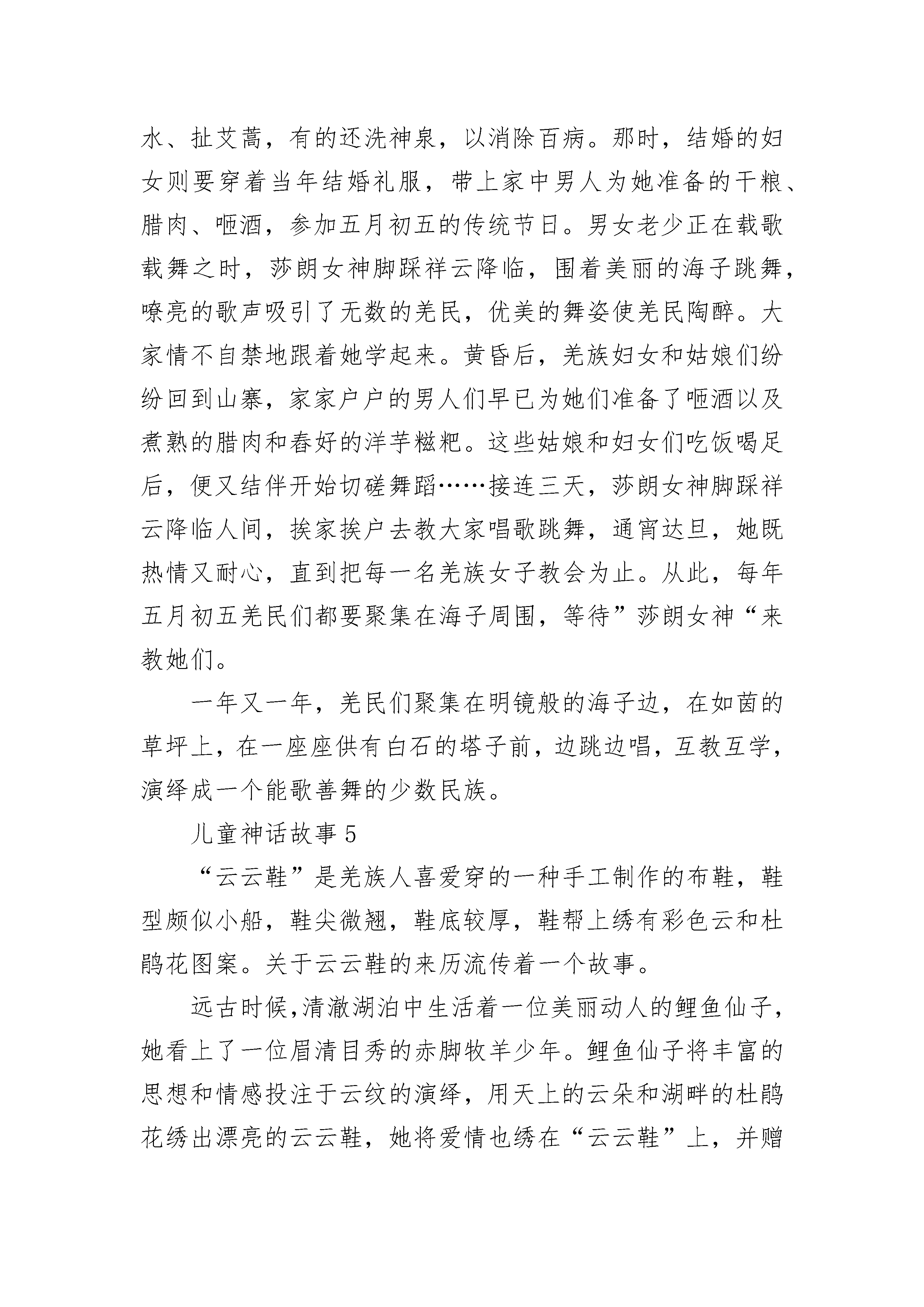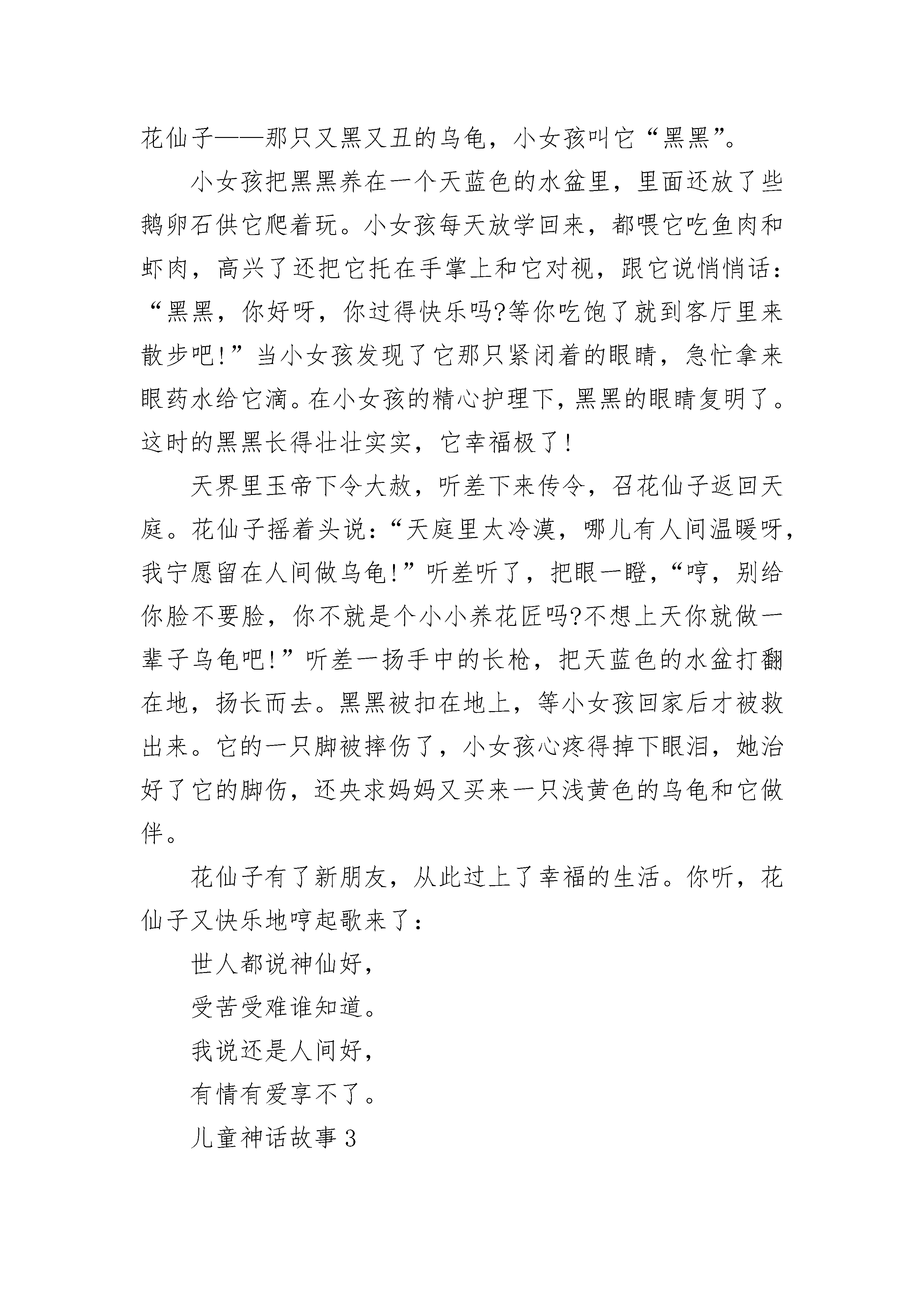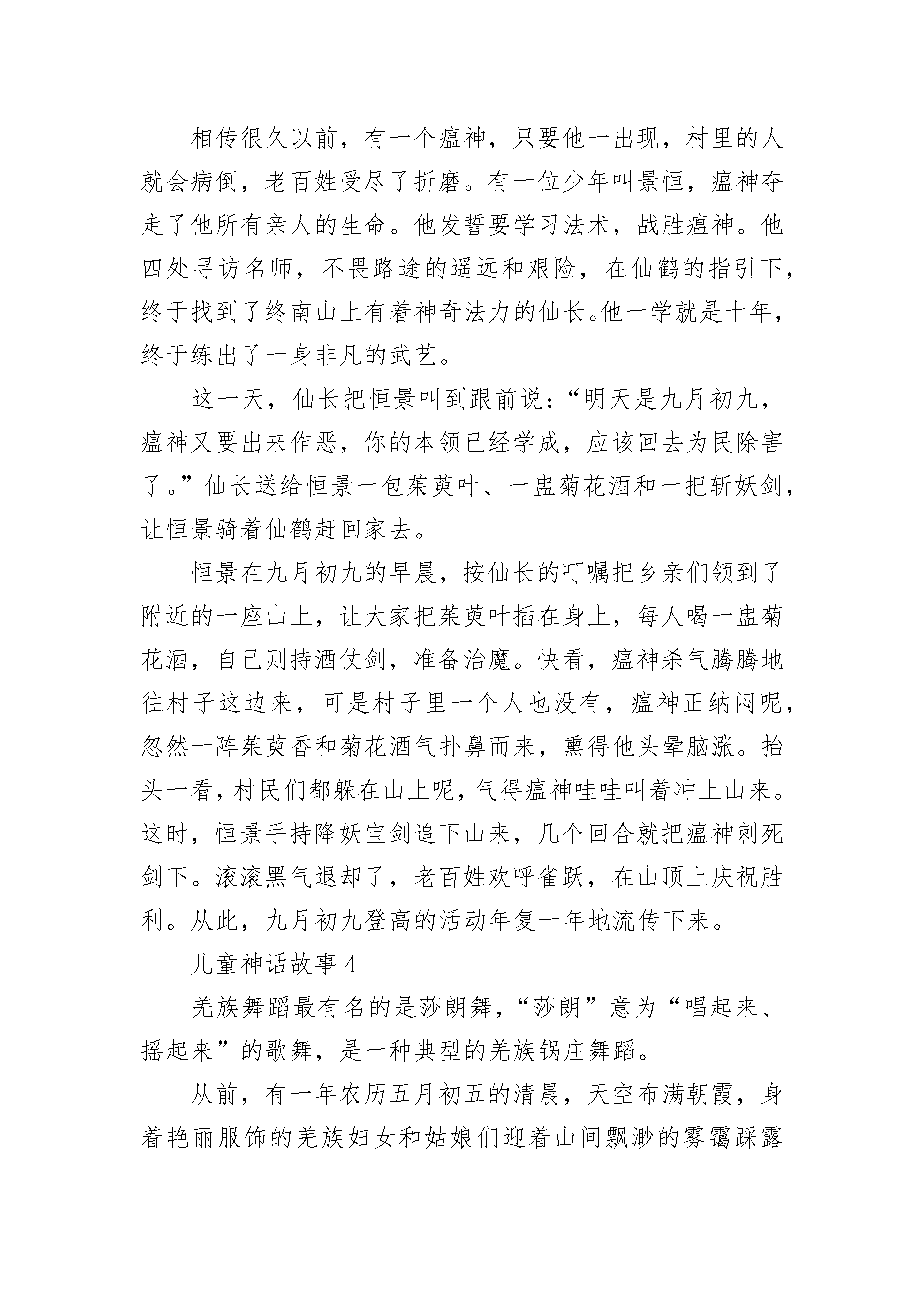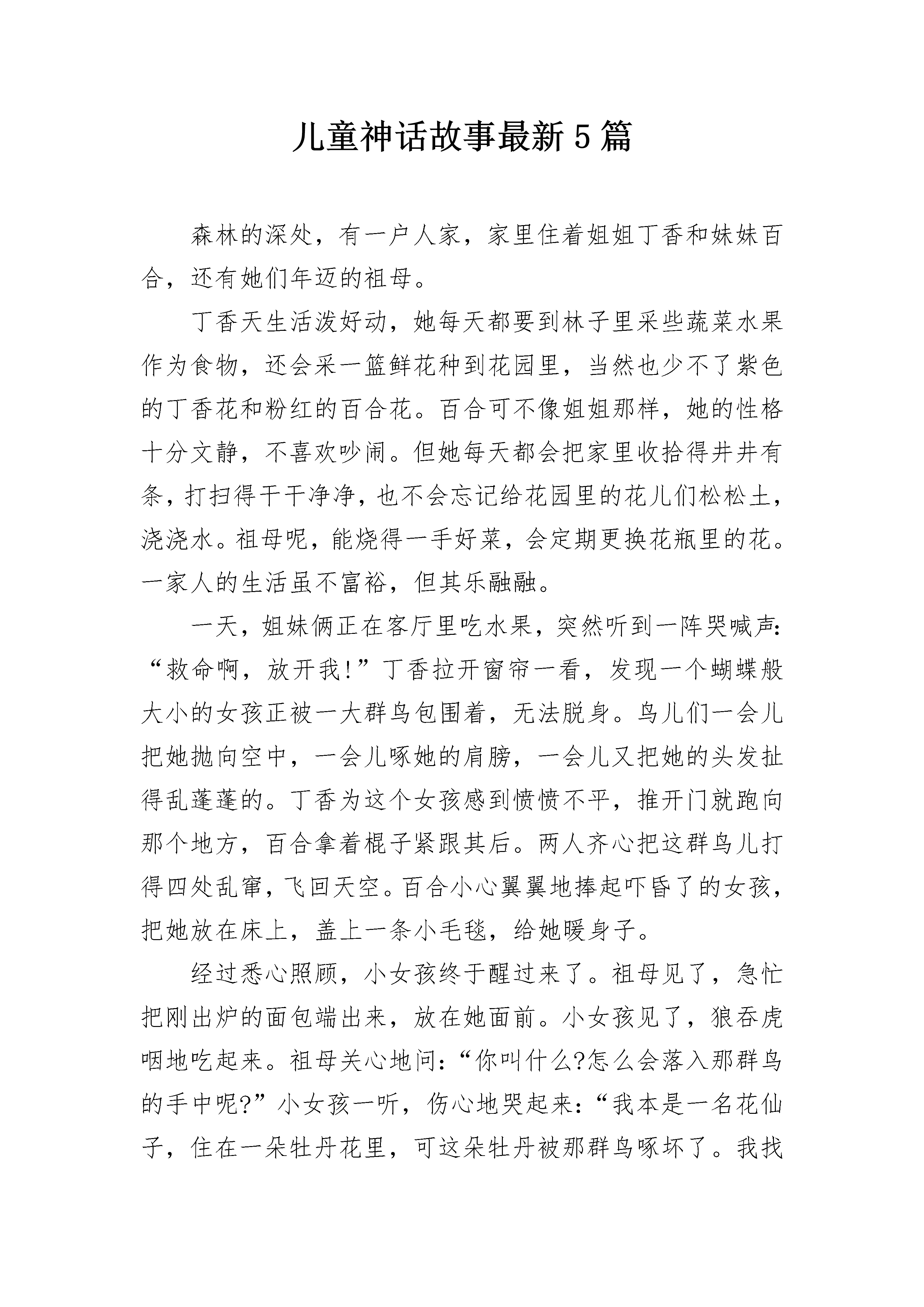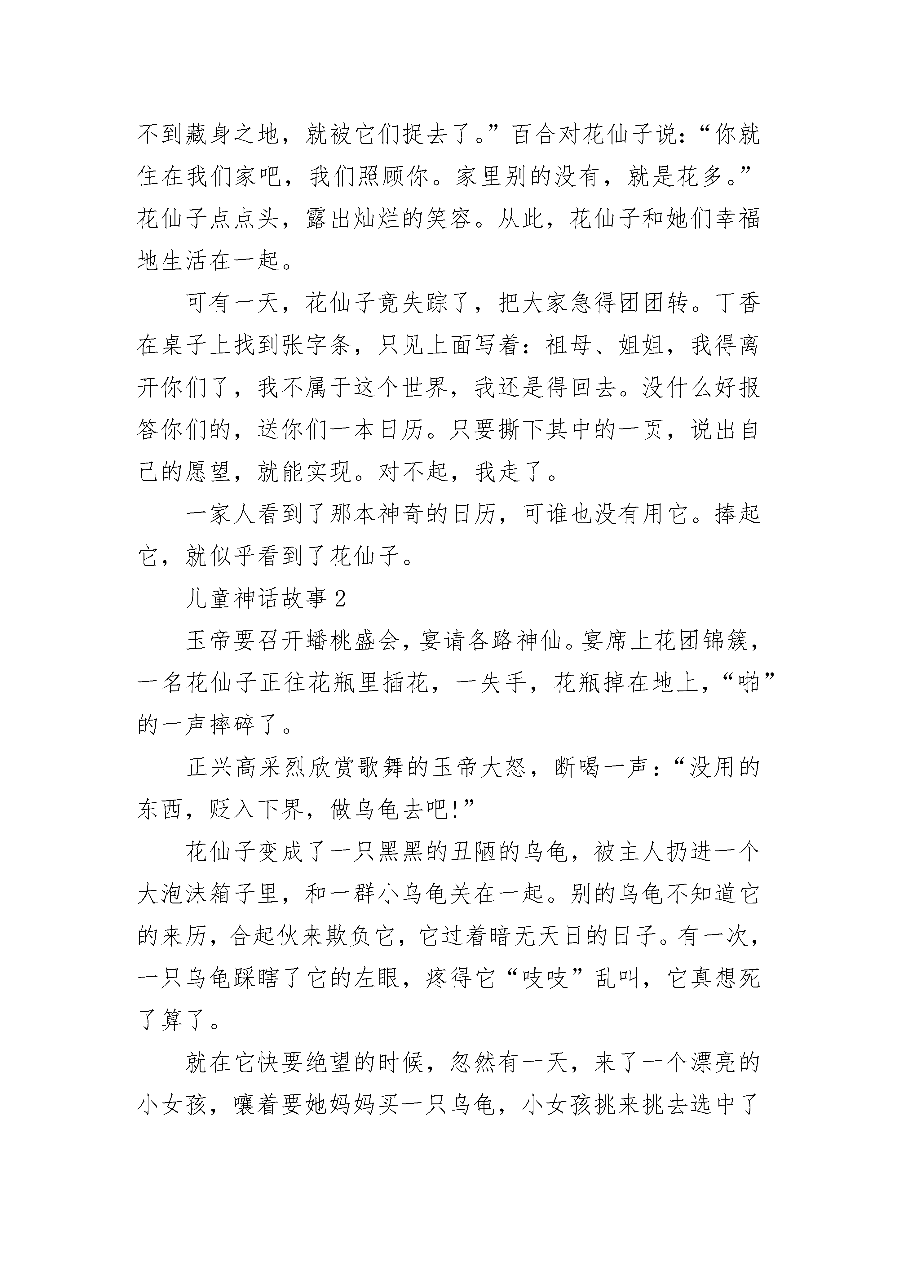 儿童神话故事最新5篇森林的深处,有一户人家,家里住着姐姐丁香和妹妹百合,还有她们年迈的祖母。丁香天生活泼好动,她每天都要到林子里采些蔬菜水果作为食物,还会采一篮鲜花种到花园里,当然也少不了紫色的丁香花和粉红的百合花。百合可不像姐姐那样,她的性格十分文静,不喜欢吵闹。但她每天都会把家里收拾得井井有条,打扫得干干净净,也不会忘记给花园里的花儿们松松土,浇浇水。祖母呢,能烧得一手好菜,会定期更换花瓶里的花。一家人的生活虽不富裕,但其乐融融。一天,姐妹俩正在客厅里吃水果,突然听到一阵哭喊声:“救命啊,放开我!”丁香拉开窗帘一看,发现一个蝴蝶般大小的女孩正被一大群鸟包围着,无法脱身。鸟儿们一会儿把她抛向空中,一会儿啄她的肩膀,一会儿又把她的头发扯得乱蓬蓬的。丁香为这个女孩感到愤愤不平,推开门就跑向那个地方,百合拿着棍子紧跟其后。两人齐心把这群鸟儿打得四处乱窜,飞回天空。百合小心翼翼地捧起吓昏了的女孩,把她放在床上,盖上一条小毛毯,给她暖身子。经过悉心照顾,小女孩终于醒过来了。祖母见了,急忙把刚出炉的面包端出来,放在她面前。小女孩见了,狼吞虎咽地吃起来。祖母关心地问:“你叫什么?怎么会落入那群鸟的手中呢?”小女孩一听,伤心地哭起来:“我本是一名花仙子,住在一朵牡丹花里,可这朵牡丹被那群鸟啄坏了。我找不到藏身之地,就被它们捉去了。”百合对花仙子说:“你就住在我们家吧,我们照顾你。家里别的没有,就是花多。”花仙子点点头,露出灿烂的笑容。从此,花仙子和她们幸福地生活在一起。可有一天,花仙子竟失踪了,把大家急得团团转。丁香在桌子上找到张字条,只见上面写着:祖母、姐姐,我得离开你们了,我不属于这个世界,我还是得回去。没什么好报答你们的,送你们一本日历。只要撕下其中的一页,说出自己的愿望,就能实现。对不起,我走了。一家人看到了那本神奇的日历,可谁也没有用它。捧起它,就似乎看到了花仙子。儿童神话故事2玉帝要召开蟠桃盛会,宴请各路神仙。宴席上花团锦簇,一名花仙子正往花瓶里插花,一失手,花瓶掉在地上,“啪”的一声摔碎了。正兴高采烈欣赏歌舞的玉帝大怒,断喝一声:“没用的东西,贬入下界,做乌龟去吧!”花仙子变成了一只黑黑的丑陋的乌龟,被主人扔进一个大泡沫箱子里,和一群小乌龟关在一起。别的乌龟不知道它的来历,合起伙来欺负它,它过着暗无天日的日子。有一次,一只乌龟踩瞎了它的左眼,疼得它“吱吱”乱叫,它真想死了算了。就在它快要绝望的时候,忽然有一天,来了一个漂亮的小女孩,嚷着要她妈妈买一只乌龟,小女孩挑来挑去选中了花仙子——那只又黑又丑的乌龟,小女孩叫它“黑黑”。小女孩把黑黑养在一个天蓝色的水盆里,里面还放了些鹅卵石供它爬着玩。小女孩每天放学回来,都喂它吃鱼肉和虾肉,高兴了还把它托在手掌上和它对视,跟它说悄悄话:“黑黑,你好呀,你过得快乐吗?等你吃饱了就到客厅里来散步吧!”当小女孩发现了它那只紧闭着的眼睛,急忙拿来眼药水给它滴。在小女孩的精心护理下,黑黑的眼睛复明了。这时的黑黑长得壮壮实实,它幸福极了!天界里玉帝下令大赦,听差下来传令,召花仙子返回天庭。花仙子摇着头说:“天庭里太冷漠,哪儿有人间温暖呀,我宁愿留在人间做乌龟!”听差听了,把眼一瞪,“哼,别给你脸不要脸,你不就是个小小养花匠吗?不想上天你就做一辈子乌龟吧!”听差一扬手中的长枪,把天蓝色的水盆打翻在地,扬长而去。黑黑被扣在地上,等小女孩回家后才被救出来。它的一只脚被摔伤了,小女孩心疼得掉下眼泪,她治好了它的脚伤,还央求妈妈又买来一只浅黄色的乌龟和它做伴。花仙子有了新朋友,从此过上了幸福的生活。你听,花仙子又快乐地哼起歌来了:世人都说神仙好,受苦受难谁知道。我说还是人间好,有情有爱享不了。儿童神话故事3相传很久以前,有一个瘟神,只要他一出现,村里的人就会病倒,老百姓受尽了折磨。有一位少年叫景恒,瘟神夺走了他所有亲人的生命。他发誓要学习法术,战胜瘟神。他四处寻访名师,不畏路途的遥远和艰险,在仙鹤的指引下,终于找到了终南山上有着神奇法力的仙长。他一学就是十年,终于练出了一身非凡的武艺。这一天,仙长把恒景叫到跟前说:“明天是九月初九,瘟神又要出来作恶,你的本领已经学成,应该回去为民除害了。”仙长送给恒景一包茱萸叶、一盅菊花酒和一把斩妖剑,让恒景骑着仙鹤赶回家去。恒景在九月初九的早晨,按仙长的叮嘱把乡亲们领到了附近的一座山上,让大家把茱萸叶插在身上,每人喝一盅菊花酒,自己则持酒仗剑,准备治魔。快看,瘟神杀气腾腾地往村子这边来,可是村子里一个人也没有,瘟神正纳闷呢,忽然一阵茱萸香和菊花酒气扑鼻而来,熏得他头晕脑涨。抬头一看,村民们都躲在山上呢,气得瘟神哇哇叫着冲上山来。这时,恒景手持降妖宝剑追下山来,几个回合就把瘟神刺死剑下。滚滚黑气退却了,老百姓欢呼雀跃,在山顶上庆祝胜利。从此,九月初九登高的活动年复一年地流传