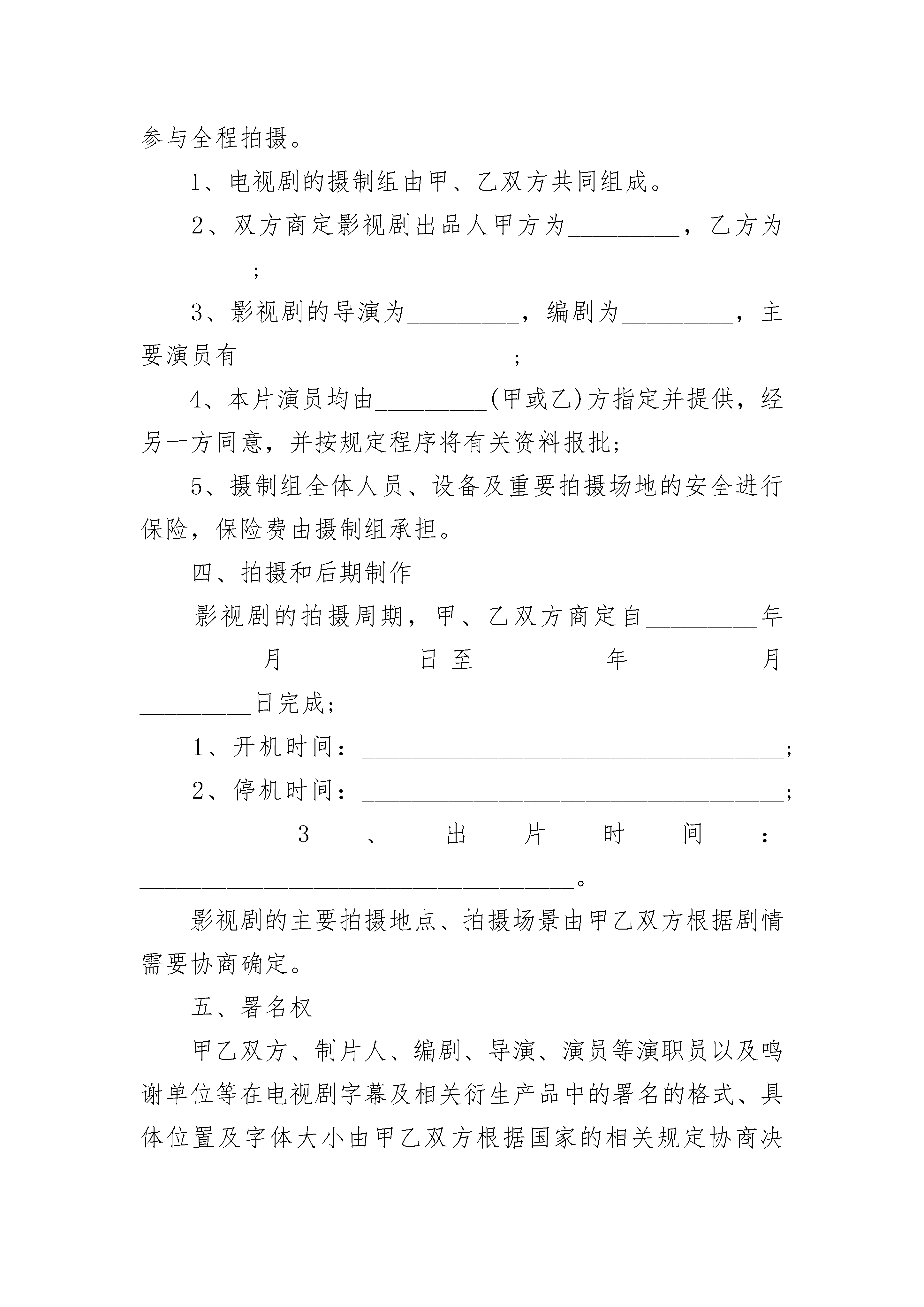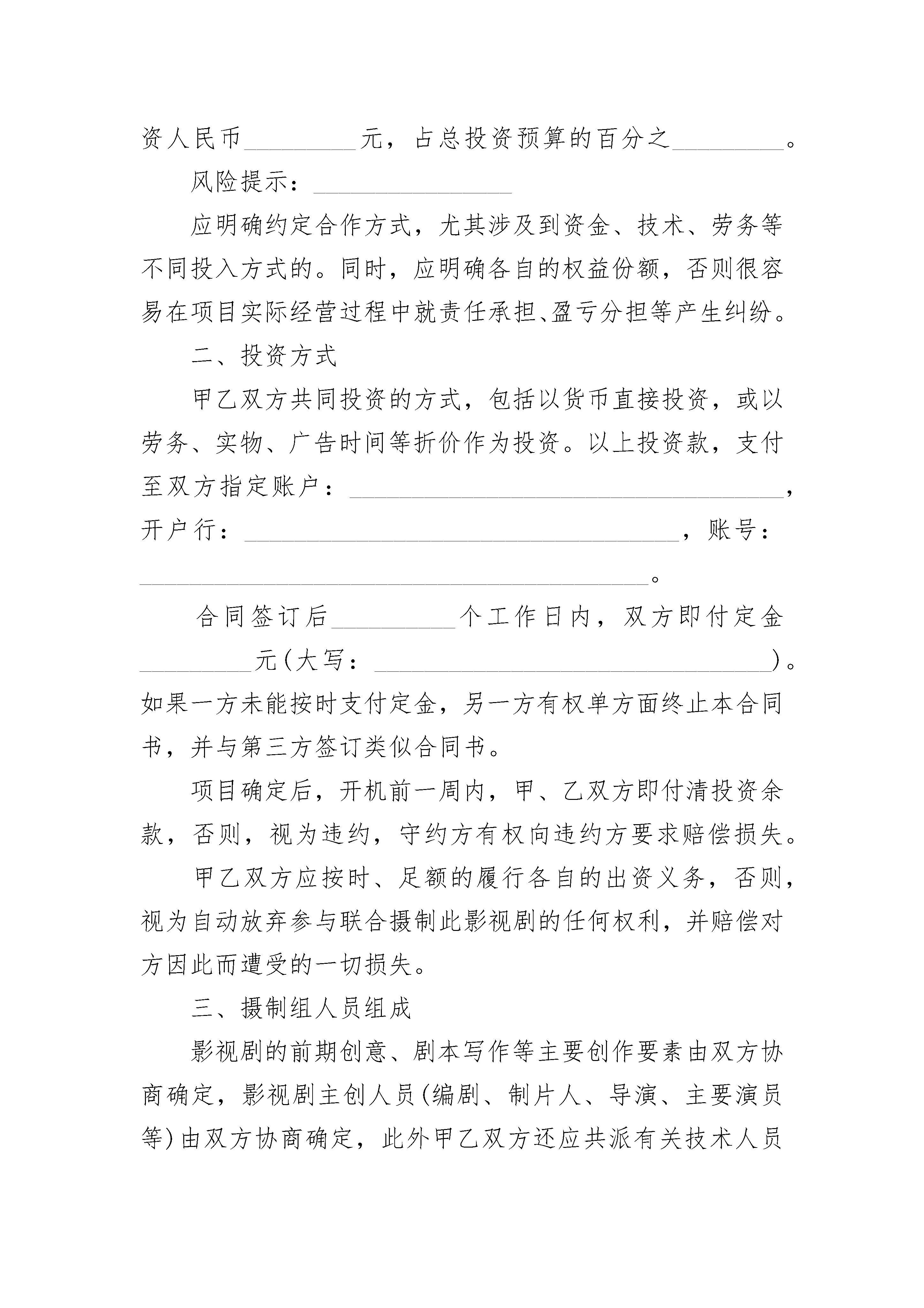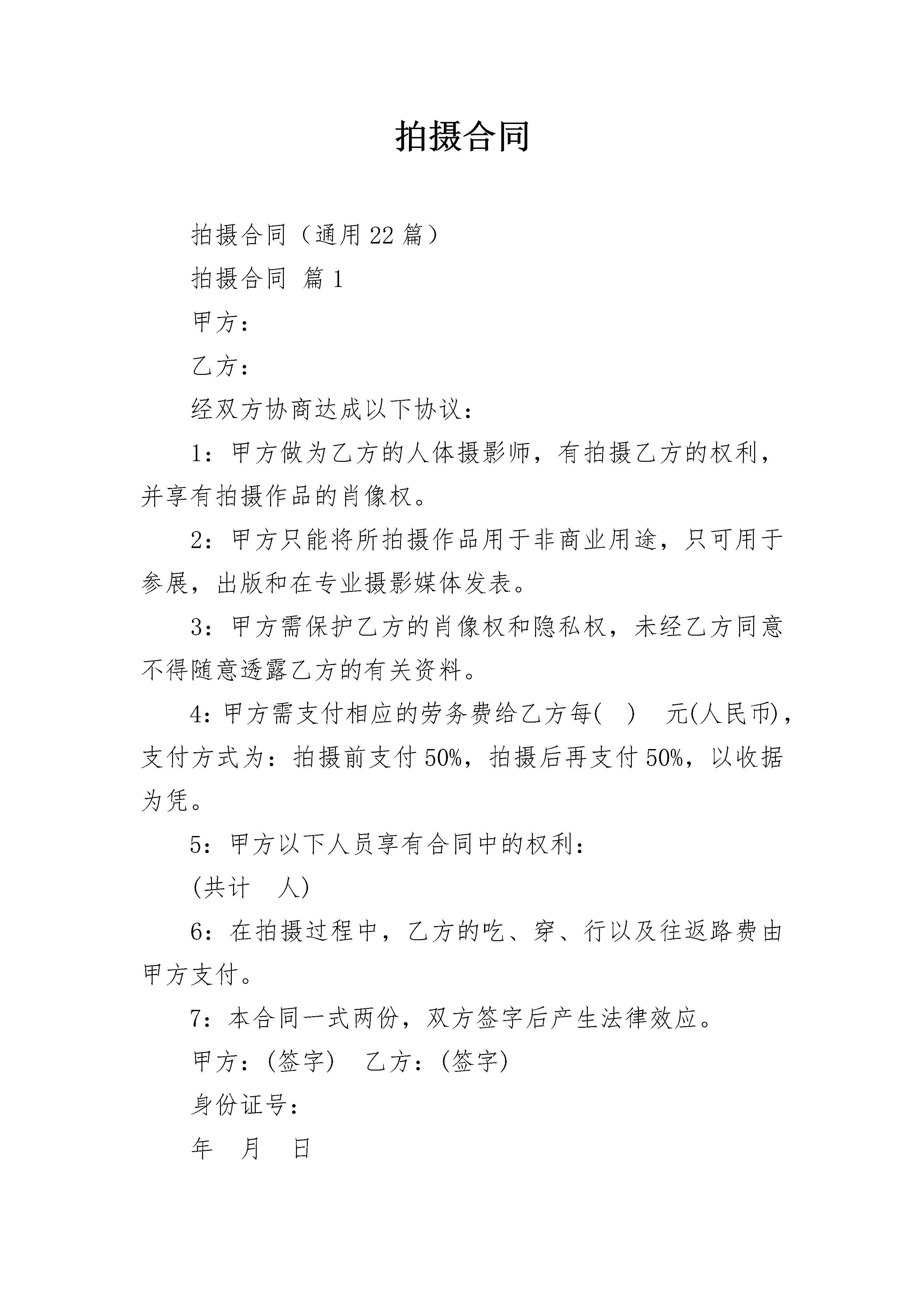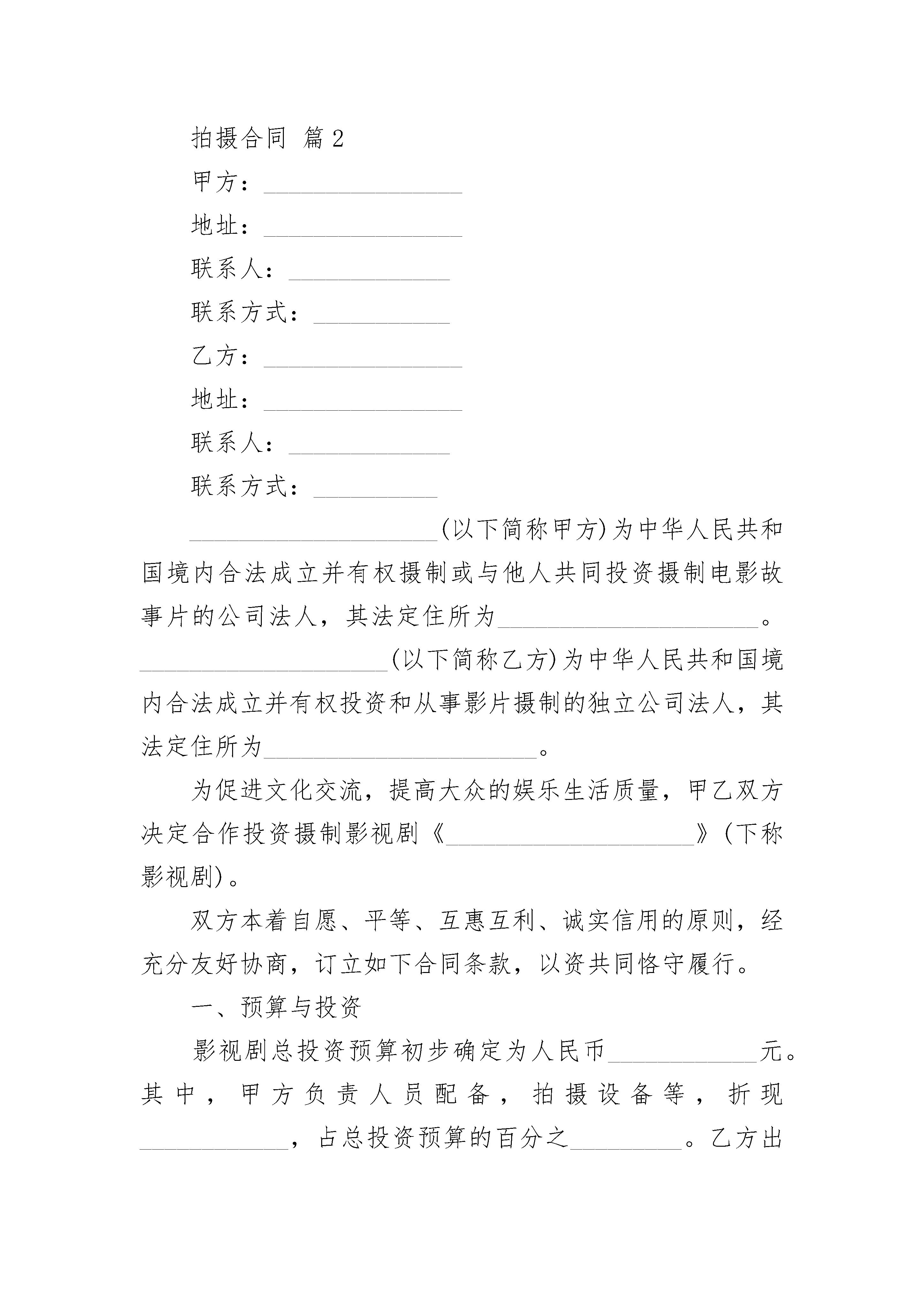 拍摄合同拍摄合同(通用22篇)拍摄合同篇1甲方:乙方:经双方协商达成以下协议:1:甲方做为乙方的人体摄影师,有拍摄乙方的权利,并享有拍摄作品的肖像权。2:甲方只能将所拍摄作品用于非商业用途,只可用于参展,出版和在专业摄影媒体发表。3:甲方需保护乙方的肖像权和隐私权,未经乙方同意不得随意透露乙方的有关资料。4:甲方需支付相应的劳务费给乙方每()元(人民币),支付方式为:拍摄前支付50%,拍摄后再支付50%,以收据为凭。5:甲方以下人员享有合同中的权利:(共计人)6:在拍摄过程中,乙方的吃、穿、行以及往返路费由甲方支付。7:本合同一式两份,双方签字后产生法律效应。甲方:(签字)乙方:(签字)身份证号:年月日拍摄合同篇2甲方:________________地址:________________联系人:_____________联系方式:___________乙方:________________地址:________________联系人:_____________联系方式:______________________________(以下简称甲方)为中华人民共和国境内合法成立并有权摄制或与他人共同投资摄制电影故事片的公司法人,其法定住所为_____________________。____________________(以下简称乙方)为中华人民共和国境内合法成立并有权投资和从事影片摄制的独立公司法人,其法定住所为______________________。为促进文化交流,提高大众的娱乐生活质量,甲乙双方决定合作投资摄制影视剧《____________________》(下称影视剧)。双方本着自愿、平等、互惠互利、诚实信用的原则,经充分友好协商,订立如下合同条款,以资共同恪守履行。一、预算与投资影视剧总投资预算初步确定为人民币____________元。其中,甲方负责人员配备,拍摄设备等,折现____________,占总投资预算的百分之_________。乙方出资人民币_________元,占总投资预算的百分之_________。风险提示:________________应明确约定合作方式,尤其涉及到资金、技术、劳务等不同投入方式的。同时,应明确各自的权益份额,否则很容易在项目实际经营过程中就责任承担、盈亏分担等产生纠纷。二、投资方式甲乙双方共同投资的方式,包括以货币直接投资,或以劳务、实物、广告时间等折价作为投资。以上投资款,支付至双方指定账户:___________________________________,开户行:___________________________________,账号:_________________________________________。合同签订后__________个工作日内,双方即付定金_________元(大写:________________________________)。如果一方未能按时支付定金,另一方有权单方面终止本合同书,并与第三方签订类似合同书。项目确定后,开机前一周内,甲、乙双方即付清投资余款,否则,视为违约,守约方有权向违约方要求赔偿损失。甲乙双方应按时、足额的履行各自的出资义务,否则,视为自动放弃参与联合摄制此影视剧的任何权利,并赔偿对方因此而遭受的一切损失。三、摄制组人员组成影视剧的前期创意、剧本写作等主要创作要素由双方协商确定,影视剧主创人员(编剧、制片人、导演、主要演员等)由双方协商确定,此外甲乙双方还应共派有关技术人员参与全程拍摄。1、电视剧的摄制组由甲、乙双方共同组成。2、双方商定影视剧出品人甲方为_________,乙方为_________;3、影视剧的导演为_________,编剧为_________,主要演员有______________________;4、本片演员均由_________(甲或乙)方指定并提供,经另一方同意,并按规定程序将有关资料报批;5、摄制组全体人员、设备及重要拍摄场地的安全进行保险,保险费由摄制组承担。四、拍摄和后期制作影视剧的拍摄周期,甲、乙双方商定自_________年_________月_________日至_________年_________月_________日完成;1、开机时间:__________________________________;2、停机时间:__________________________________;3、出片时间:___________________________________。影视剧的主要拍摄地点、拍摄场景由甲乙双方根据剧情需要协商确定。五、署名权甲乙双方、制片人、编剧、导演、演员等演职员以及鸣谢单位等在电视剧字幕及相关衍生产品中的署名的格式、具