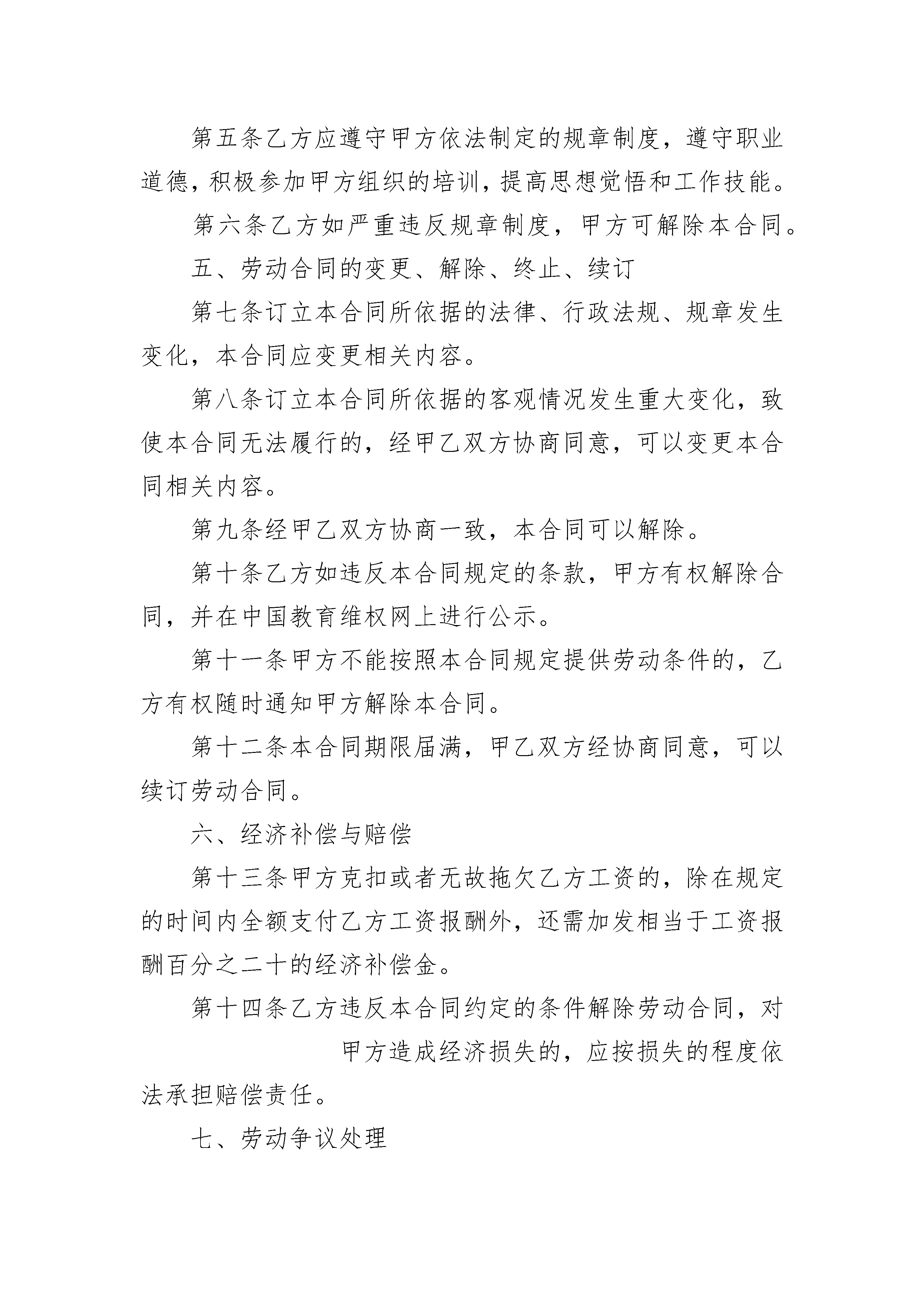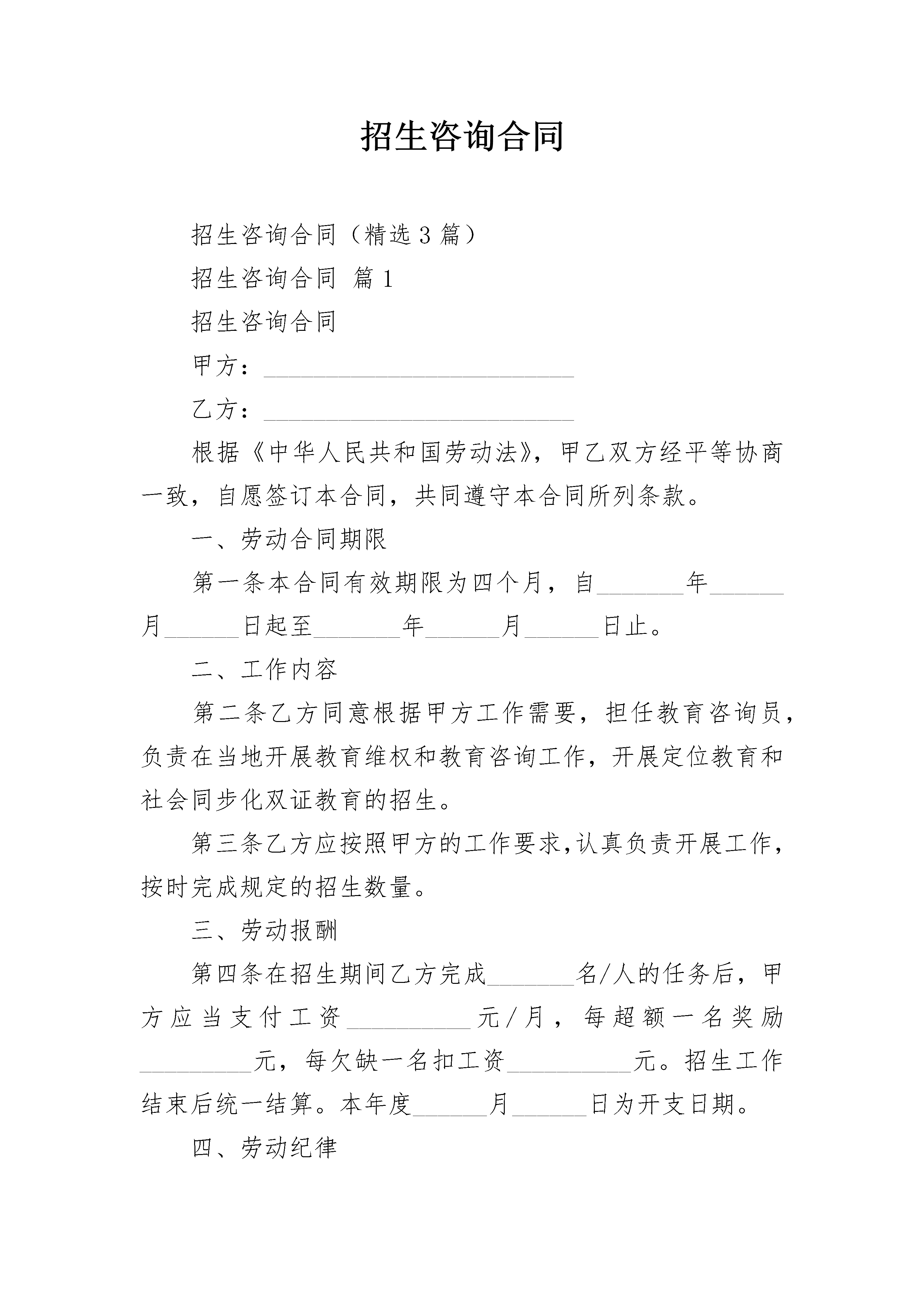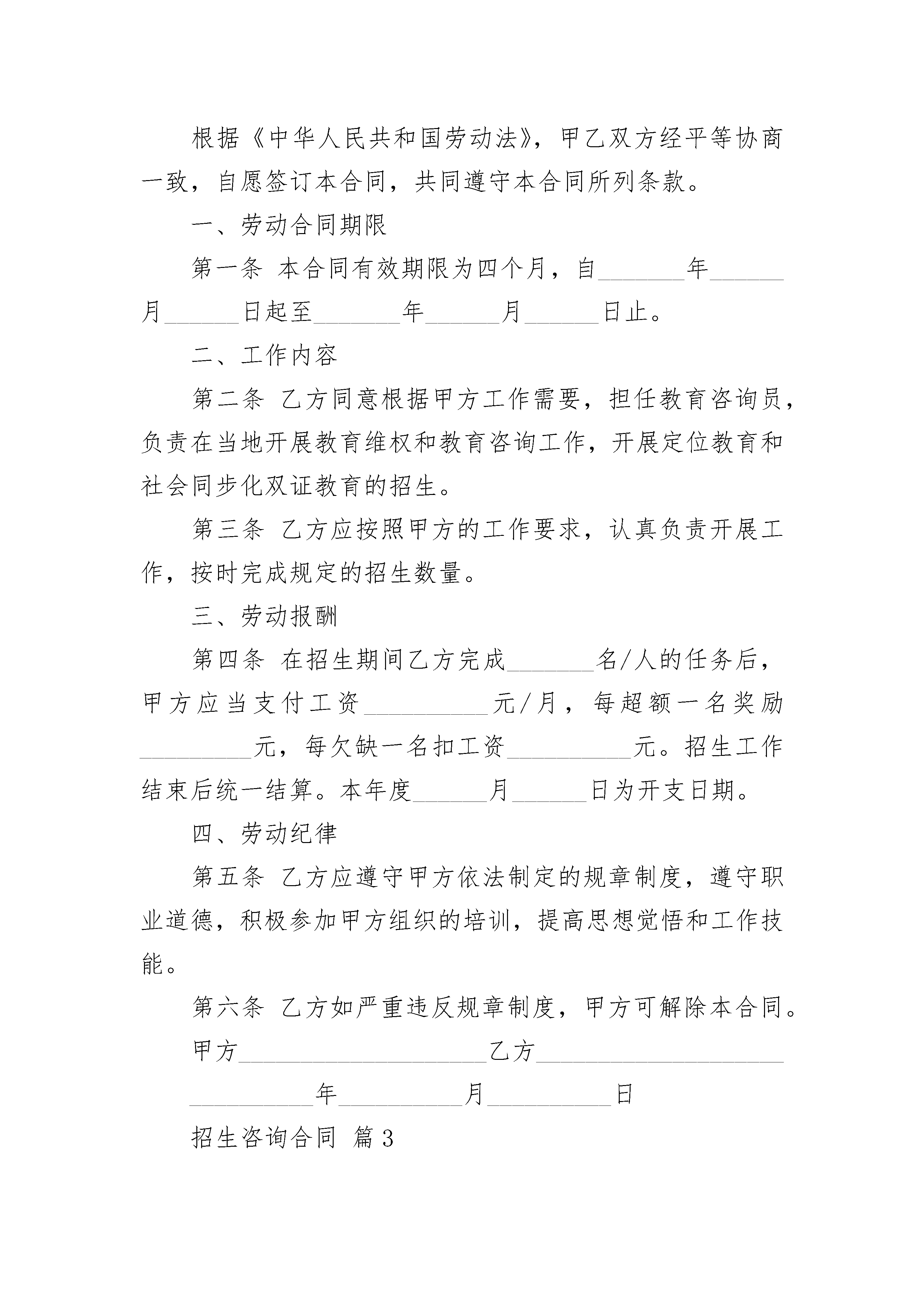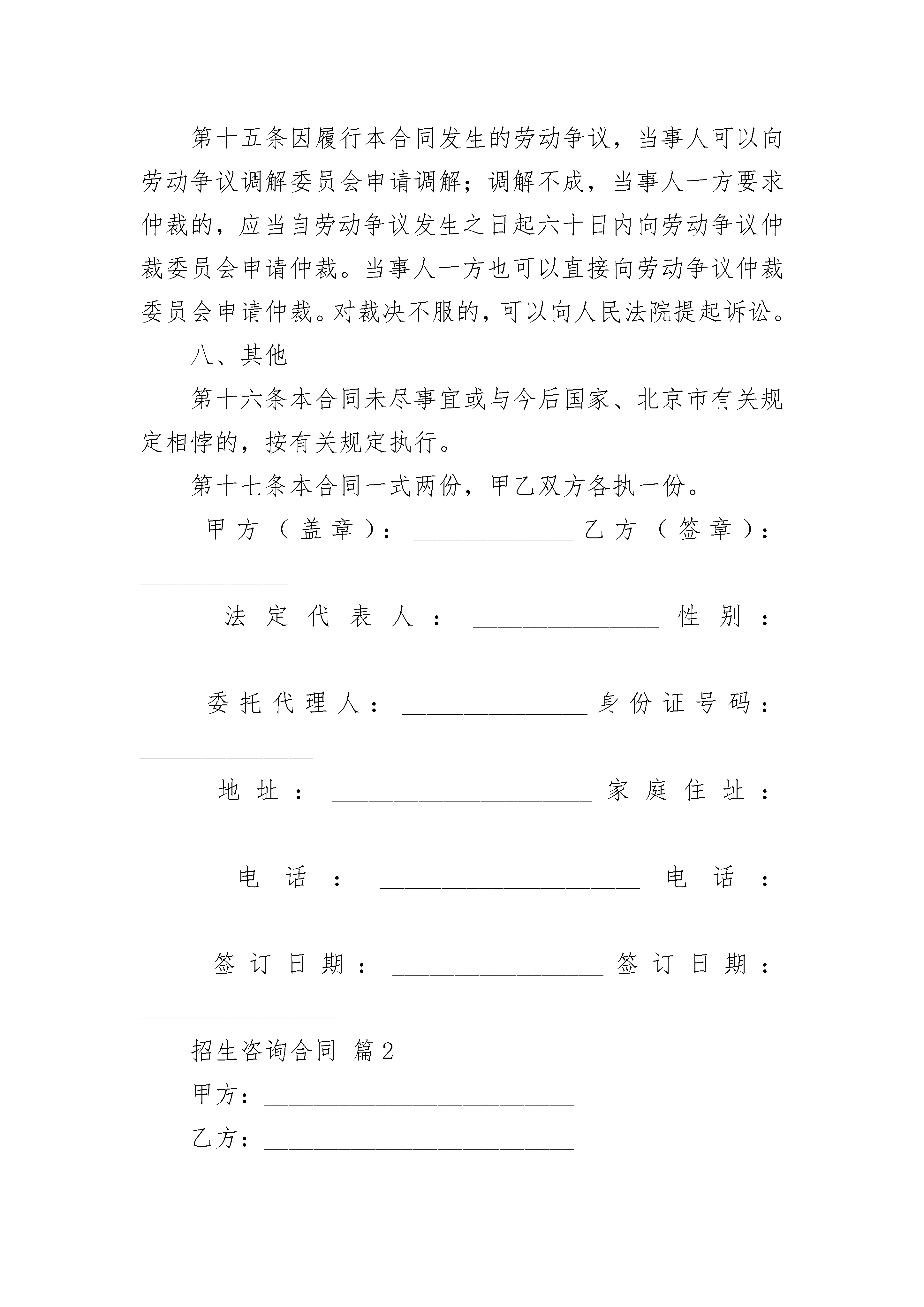 招生咨询合同招生咨询合同(精选3篇)招生咨询合同篇1招生咨询合同甲方:_________________________乙方:_________________________根据《中华人民共和国劳动法》,甲乙双方经平等协商一致,自愿签订本合同,共同遵守本合同所列条款。一、劳动合同期限第一条本合同有效期限为四个月,自_______年______月______日起至_______年______月______日止。二、工作内容第二条乙方同意根据甲方工作需要,担任教育咨询员,负责在当地开展教育维权和教育咨询工作,开展定位教育和社会同步化双证教育的招生。第三条乙方应按照甲方的工作要求,认真负责开展工作,按时完成规定的招生数量。三、劳动报酬第四条在招生期间乙方完成_______名/人的任务后,甲方应当支付工资__________元/月,每超额一名奖励_________元,每欠缺一名扣工资__________元。招生工作结束后统一结算。本年度______月______日为开支日期。四、劳动纪律第五条乙方应遵守甲方依法制定的规章制度,遵守职业道德,积极参加甲方组织的培训,提高思想觉悟和工作技能。第六条乙方如严重违反规章制度,甲方可解除本合同。五、劳动合同的变更、解除、终止、续订第七条订立本合同所依据的法律、行政法规、规章发生变化,本合同应变更相关内容。第八条订立本合同所依据的客观情况发生重大变化,致使本合同无法履行的,经甲乙双方协商同意,可以变更本合同相关内容。第九条经甲乙双方协商一致,本合同可以解除。第十条乙方如违反本合同规定的条款,甲方有权解除合同,并在中国教育维权网上进行公示。第十一条甲方不能按照本合同规定提供劳动条件的,乙方有权随时通知甲方解除本合同。第十二条本合同期限届满,甲乙双方经协商同意,可以续订劳动合同。六、经济补偿与赔偿第十三条甲方克扣或者无故拖欠乙方工资的,除在规定的时间内全额支付乙方工资报酬外,还需加发相当于工资报酬百分之二十的经济补偿金。第十四条乙方违反本合同约定的条件解除劳动合同,对甲方造成经济损失的,应按损失的程度依法承担赔偿责任。七、劳动争议处理第十五条因履行本合同发生的劳动争议,当事人可以向劳动争议调解委员会申请调解;调解不成,当事人一方要求仲裁的,应当自劳动争议发生之日起六十日内向劳动争议仲裁委员会申请仲裁。当事人一方也可以直接向劳动争议仲裁委员会申请仲裁。对裁决不服的,可以向人民法院提起诉讼。八、其他第十六条本合同未尽事宜或与今后国家、北京市有关规定相悖的,按有关规定执行。第十七条本合同一式两份,甲乙双方各执一份。甲方(盖章):_____________乙方(签章):____________法定代表人:_______________性别:____________________委托代理人:_______________身份证号码:______________地址:_____________________家庭住址:________________电话:_____________________电话:____________________签订日期:_________________签订日期:________________招生咨询合同篇2甲方:_________________________乙方:_________________________根据《中华人民共和国劳动法》,甲乙双方经平等协商一致,自愿签订本合同,共同遵守本合同所列条款。一、劳动合同期限第一条本合同有效期限为四个月,自_______年______月______日起至_______年______月______日止。二、工作内容第二条乙方同意根据甲方工作需要,担任教育咨询员,负责在当地开展教育维权和教育咨询工作,开展定位教育和社会同步化双证教育的招生。第三条乙方应按照甲方的工作要求,认真负责开展工作,按时完成规定的招生数量。三、劳动报酬第四条在招生期间乙方完成_______名/人的任务后,甲方应当支付工资__________元/月,每超额一名奖励_________元,每欠缺一名扣工资__________元。招生工作结束后统一结算。本年度______月______日为开支日期。四、劳动纪律第五条乙方应遵守甲方依法制定的规章制度,遵守职业道德,积极参加甲方组织的培训,提高思想觉悟和工作技能。第六条乙方如严重违反规章制度,甲方可解除本合同。甲方____________________乙方______________________________年__________月__________日招生咨询合同篇3合同编号:____________________项目名称:____________________________
