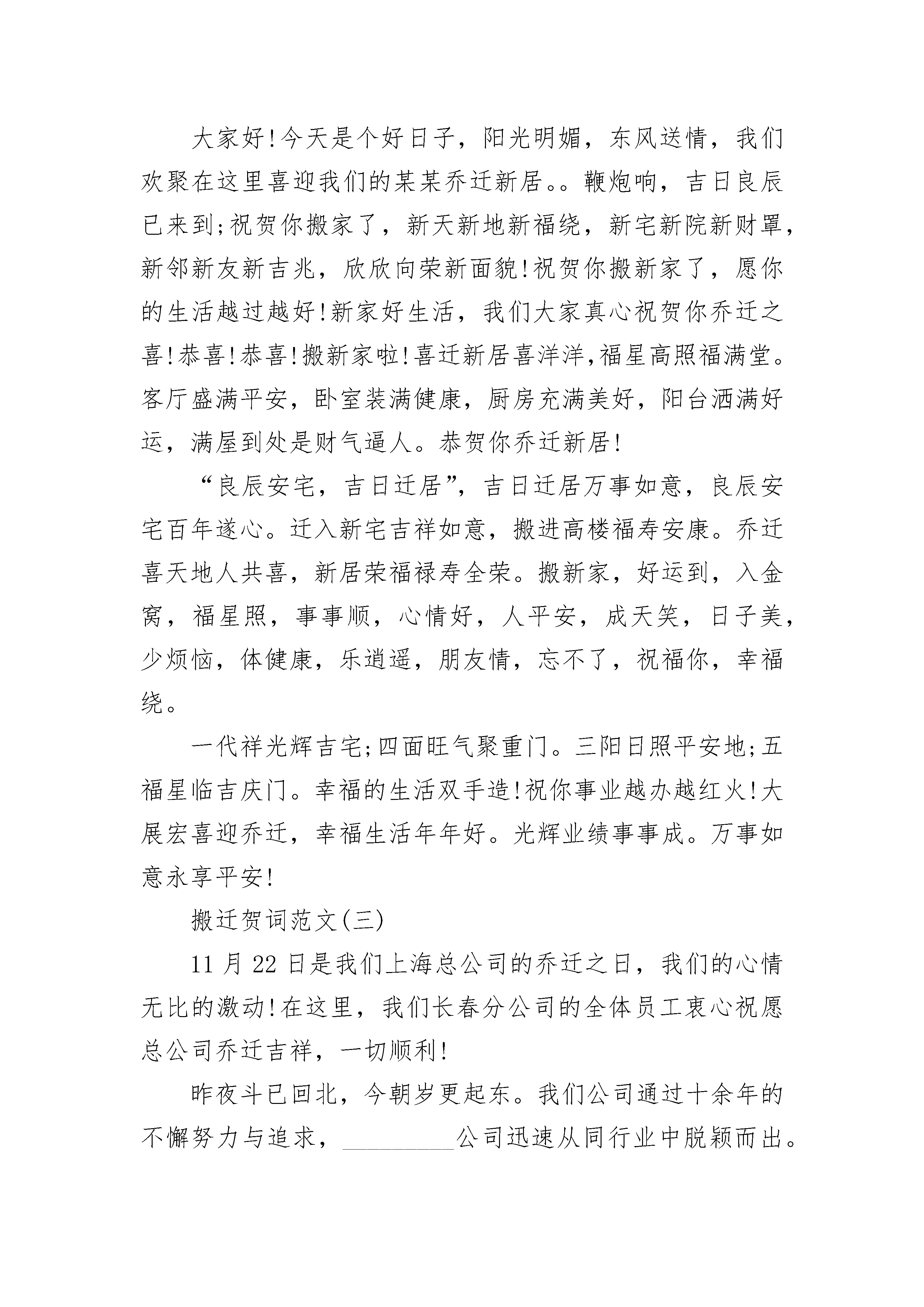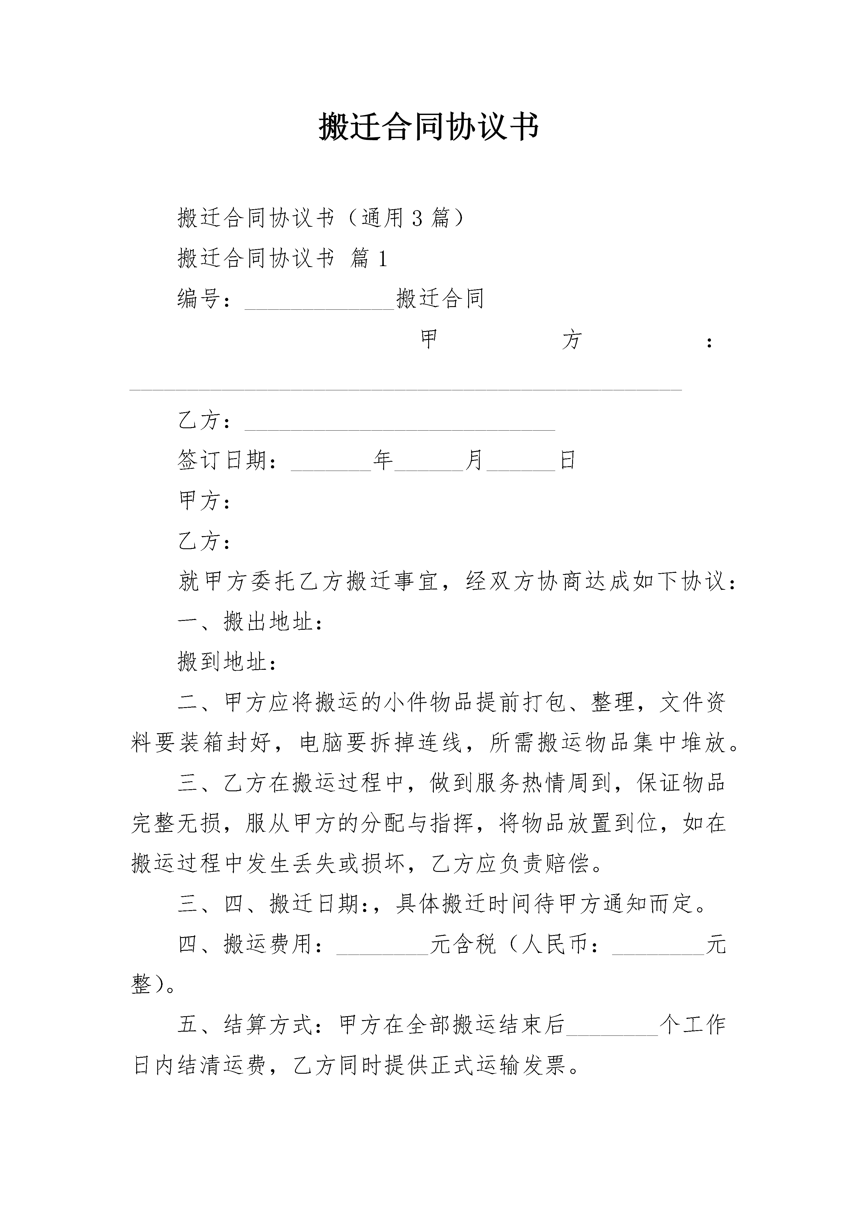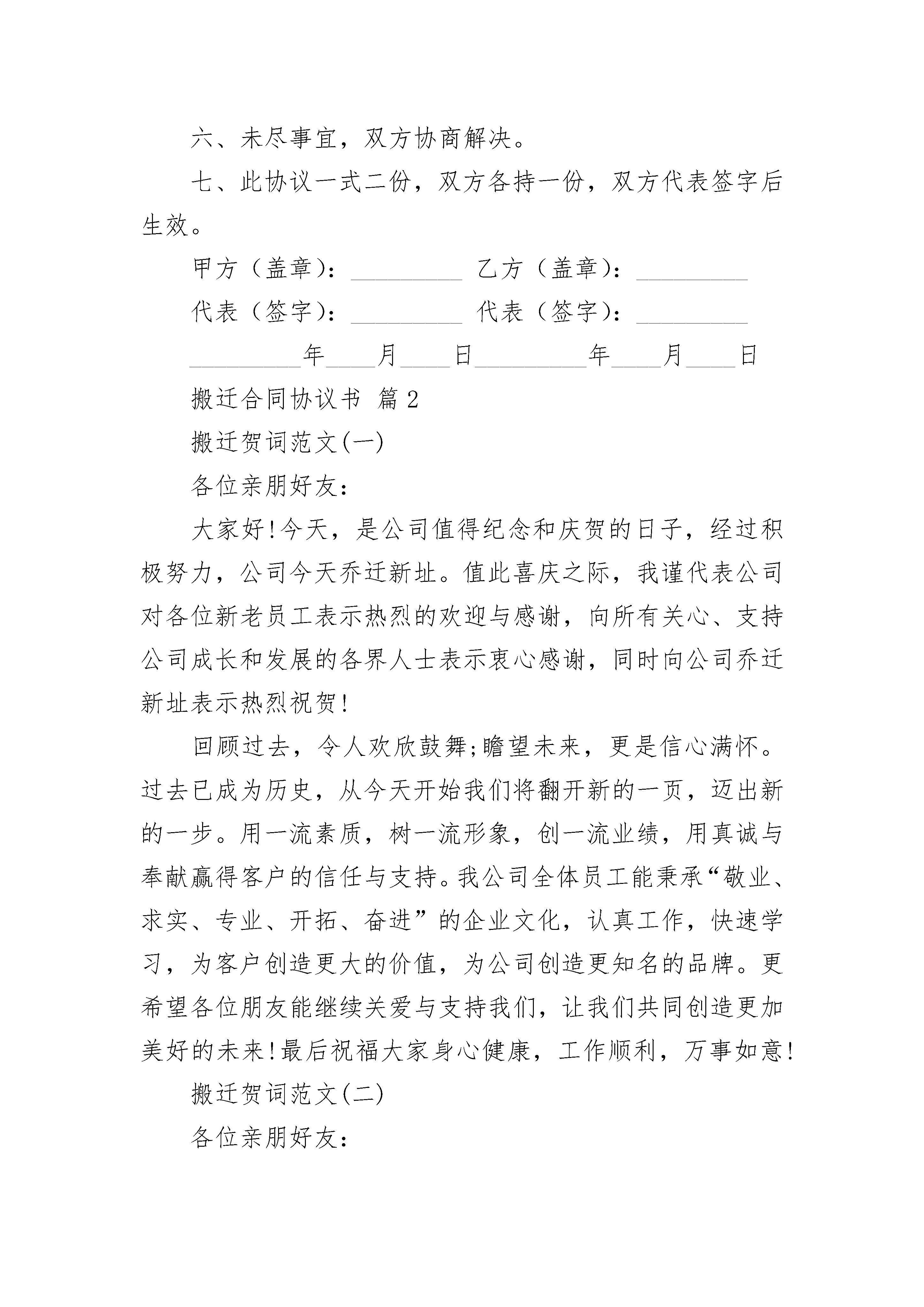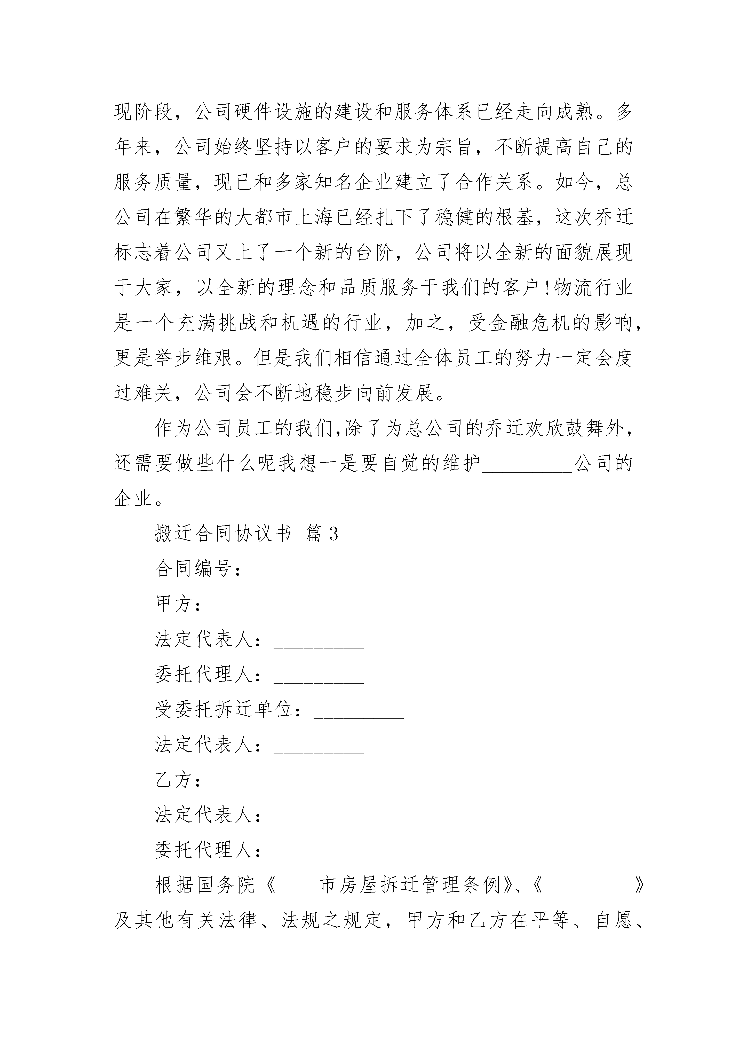 搬迁合同协议书搬迁合同协议书(通用3篇)搬迁合同协议书篇1编号:_____________搬迁合同甲方:________________________________________________乙方:___________________________签订日期:_______年______月______日甲方:乙方:就甲方委托乙方搬迁事宜,经双方协商达成如下协议:一、搬出地址:搬到地址:二、甲方应将搬运的小件物品提前打包、整理,文件资料要装箱封好,电脑要拆掉连线,所需搬运物品集中堆放。三、乙方在搬运过程中,做到服务热情周到,保证物品完整无损,服从甲方的分配与指挥,将物品放置到位,如在搬运过程中发生丢失或损坏,乙方应负责赔偿。三、四、搬迁日期:,具体搬迁时间待甲方通知而定。四、搬运费用:________元含税(人民币:________元整)。五、结算方式:甲方在全部搬运结束后________个工作日内结清运费,乙方同时提供正式运输发票。六、未尽事宜,双方协商解决。七、此协议一式二份,双方各持一份,双方代表签字后生效。甲方(盖章):_________乙方(盖章):_________代表(签字):_________代表(签字):__________________年____月____日_________年____月____日搬迁合同协议书篇2搬迁贺词范文(一)各位亲朋好友:大家好!今天,是公司值得纪念和庆贺的日子,经过积极努力,公司今天乔迁新址。值此喜庆之际,我谨代表公司对各位新老员工表示热烈的欢迎与感谢,向所有关心、支持公司成长和发展的各界人士表示衷心感谢,同时向公司乔迁新址表示热烈祝贺!回顾过去,令人欢欣鼓舞;瞻望未来,更是信心满怀。过去已成为历史,从今天开始我们将翻开新的一页,迈出新的一步。用一流素质,树一流形象,创一流业绩,用真诚与奉献赢得客户的信任与支持。我公司全体员工能秉承“敬业、求实、专业、开拓、奋进”的企业文化,认真工作,快速学习,为客户创造更大的价值,为公司创造更知名的品牌。更希望各位朋友能继续关爱与支持我们,让我们共同创造更加美好的未来!最后祝福大家身心健康,工作顺利,万事如意!搬迁贺词范文(二)各位亲朋好友:大家好!今天是个好日子,阳光明媚,东风送情,我们欢聚在这里喜迎我们的某某乔迁新居。。鞭炮响,吉日良辰已来到;祝贺你搬家了,新天新地新福绕,新宅新院新财罩,新邻新友新吉兆,欣欣向荣新面貌!祝贺你搬新家了,愿你的生活越过越好!新家好生活,我们大家真心祝贺你乔迁之喜!恭喜!恭喜!搬新家啦!喜迁新居喜洋洋,福星高照福满堂。客厅盛满平安,卧室装满健康,厨房充满美好,阳台洒满好运,满屋到处是财气逼人。恭贺你乔迁新居!“良辰安宅,吉日迁居”,吉日迁居万事如意,良辰安宅百年遂心。迁入新宅吉祥如意,搬进高楼福寿安康。乔迁喜天地人共喜,新居荣福禄寿全荣。搬新家,好运到,入金窝,福星照,事事顺,心情好,人平安,成天笑,日子美,少烦恼,体健康,乐逍遥,朋友情,忘不了,祝福你,幸福绕。一代祥光辉吉宅;四面旺气聚重门。三阳日照平安地;五福星临吉庆门。幸福的生活双手造!祝你事业越办越红火!大展宏喜迎乔迁,幸福生活年年好。光辉业绩事事成。万事如意永享平安!搬迁贺词范文(三)11月22日是我们上海总公司的乔迁之日,我们的心情无比的激动!在这里,我们长春分公司的全体员工衷心祝愿总公司乔迁吉祥,一切顺利!昨夜斗已回北,今朝岁更起东。我们公司通过十余年的不懈努力与追求,_________公司迅速从同行业中脱颖而出。现阶段,公司硬件设施的建设和服务体系已经走向成熟。多年来,公司始终坚持以客户的要求为宗旨,不断提高自己的服务质量,现已和多家知名企业建立了合作关系。如今,总公司在繁华的大都市上海已经扎下了稳健的根基,这次乔迁标志着公司又上了一个新的台阶,公司将以全新的面貌展现于大家,以全新的理念和品质服务于我们的客户!物流行业是一个充满挑战和机遇的行业,加之,受金融危机的影响,更是举步维艰。但是我们相信通过全体员工的努力一定会度过难关,公司会不断地稳步向前发展。作为公司员工的我们,除了为总公司的乔迁欢欣鼓舞外,还需要做些什么呢我想一是要自觉的维护_________公司的企业。搬迁合同协议书篇3合同编号:_________甲方:_________法定代表人:_________委托代理人:_________受委托拆迁单位:_________法定代表人:_________乙方:_________法定代表人:_________委托代理人:_________根据国务院《____市房屋拆迁管理条例》、《_________》及其他有关法律、法规之规定,甲方和乙方在平等、自愿、协商一致的基础上就房屋拆迁补偿安置达成如下协议:第一条拆迁房屋依据甲方因项目建设