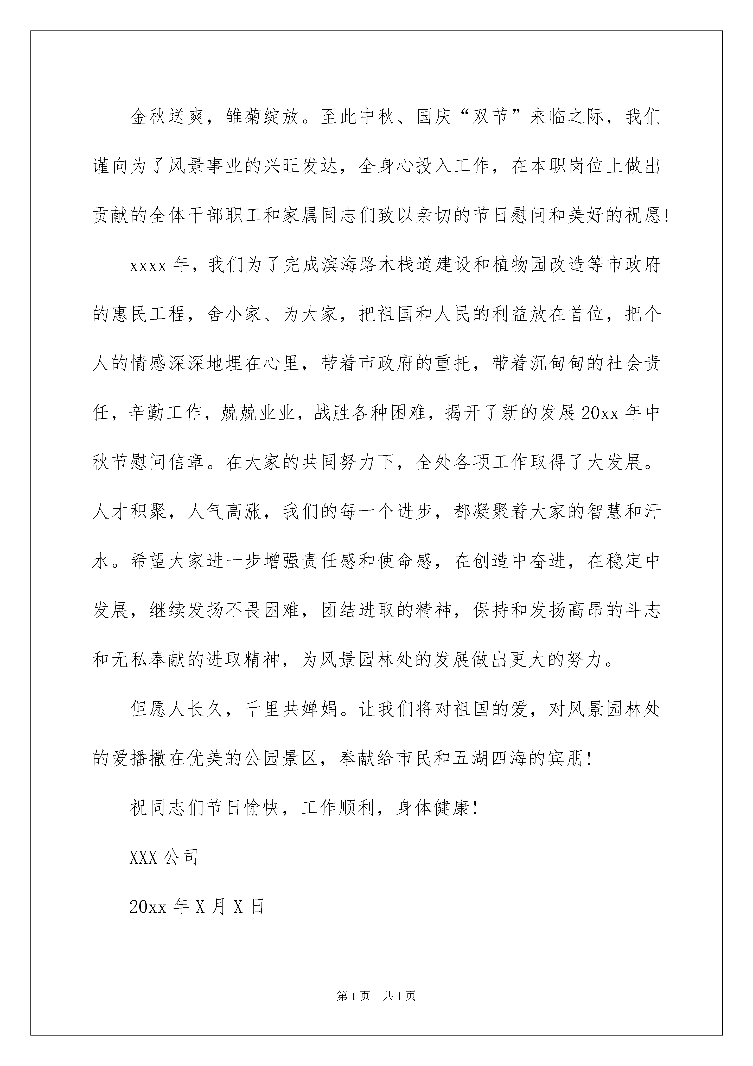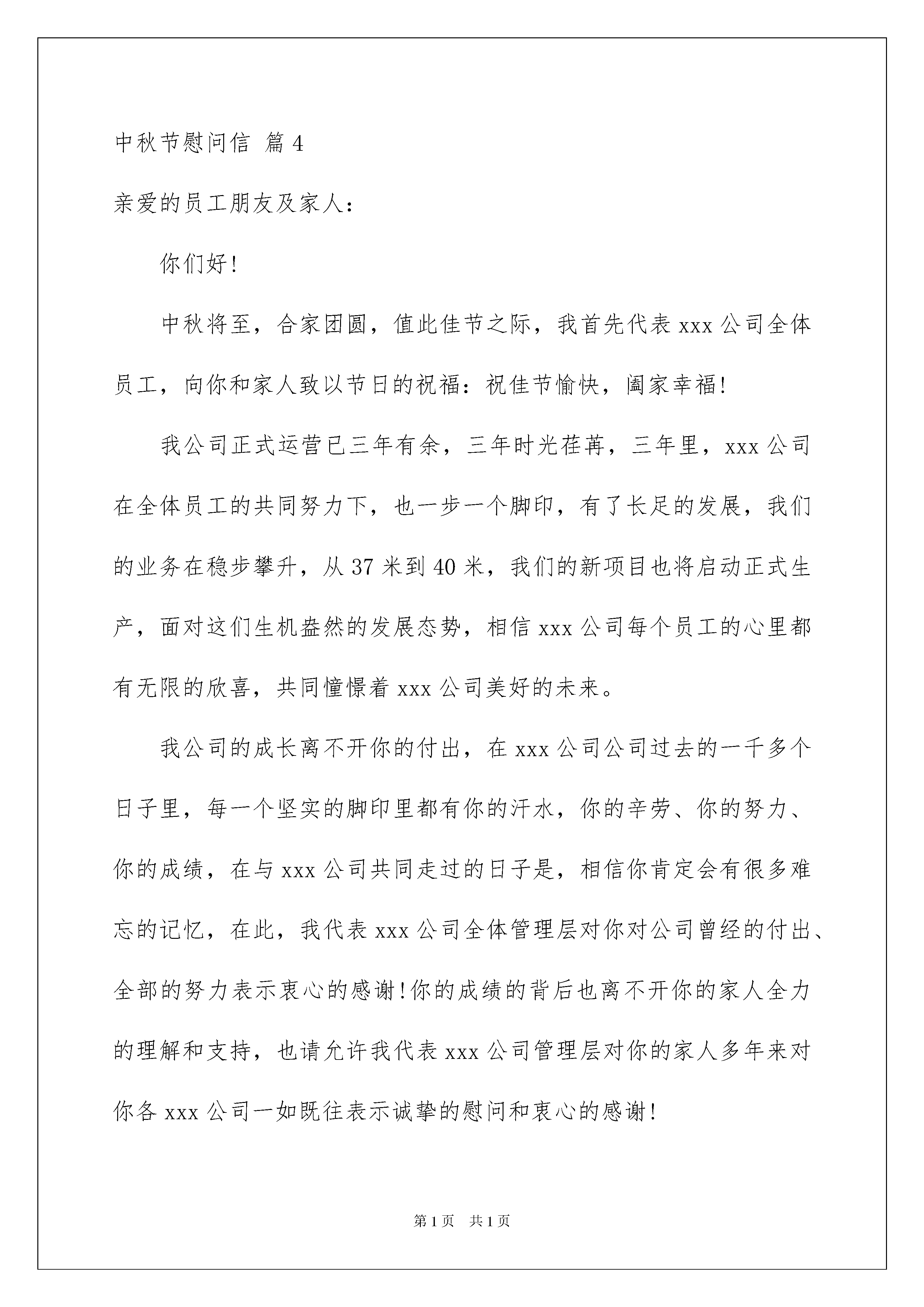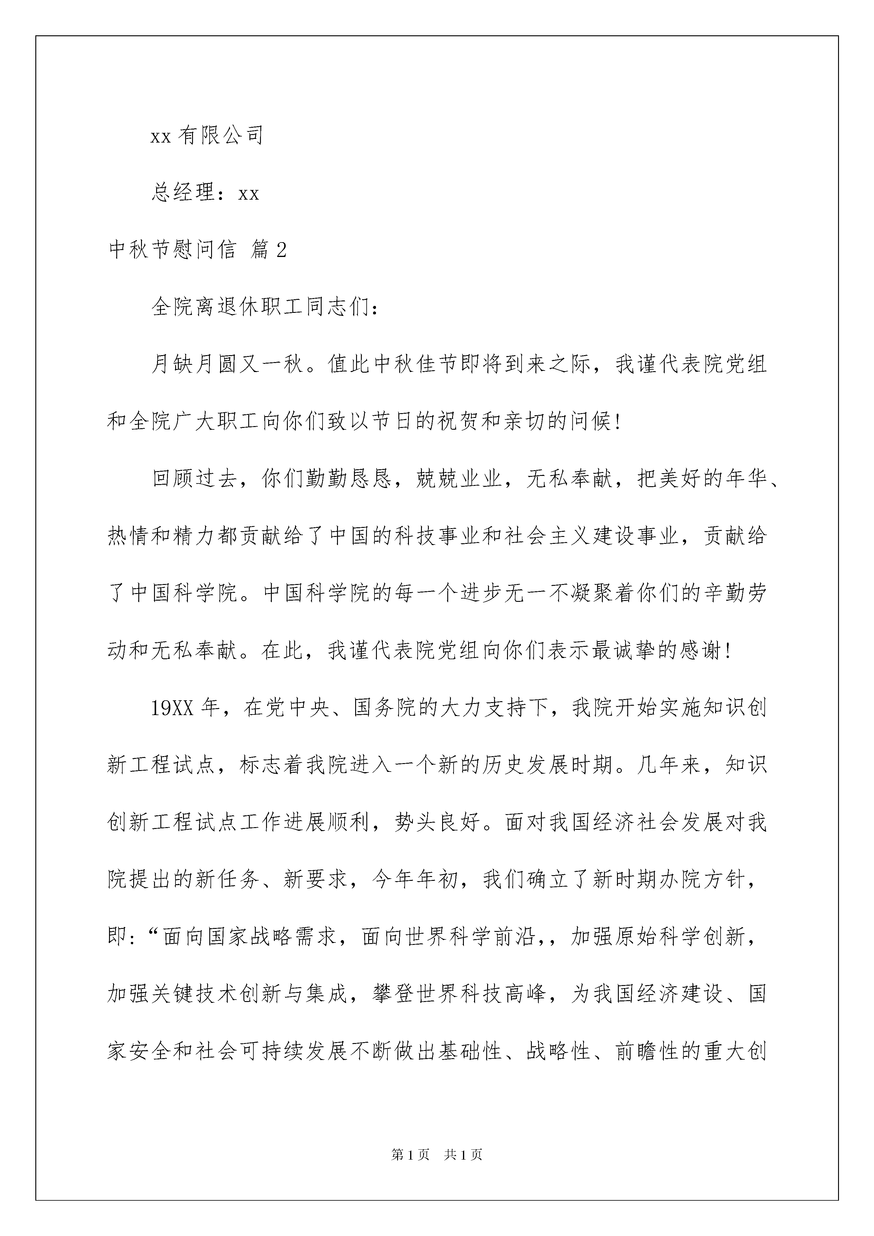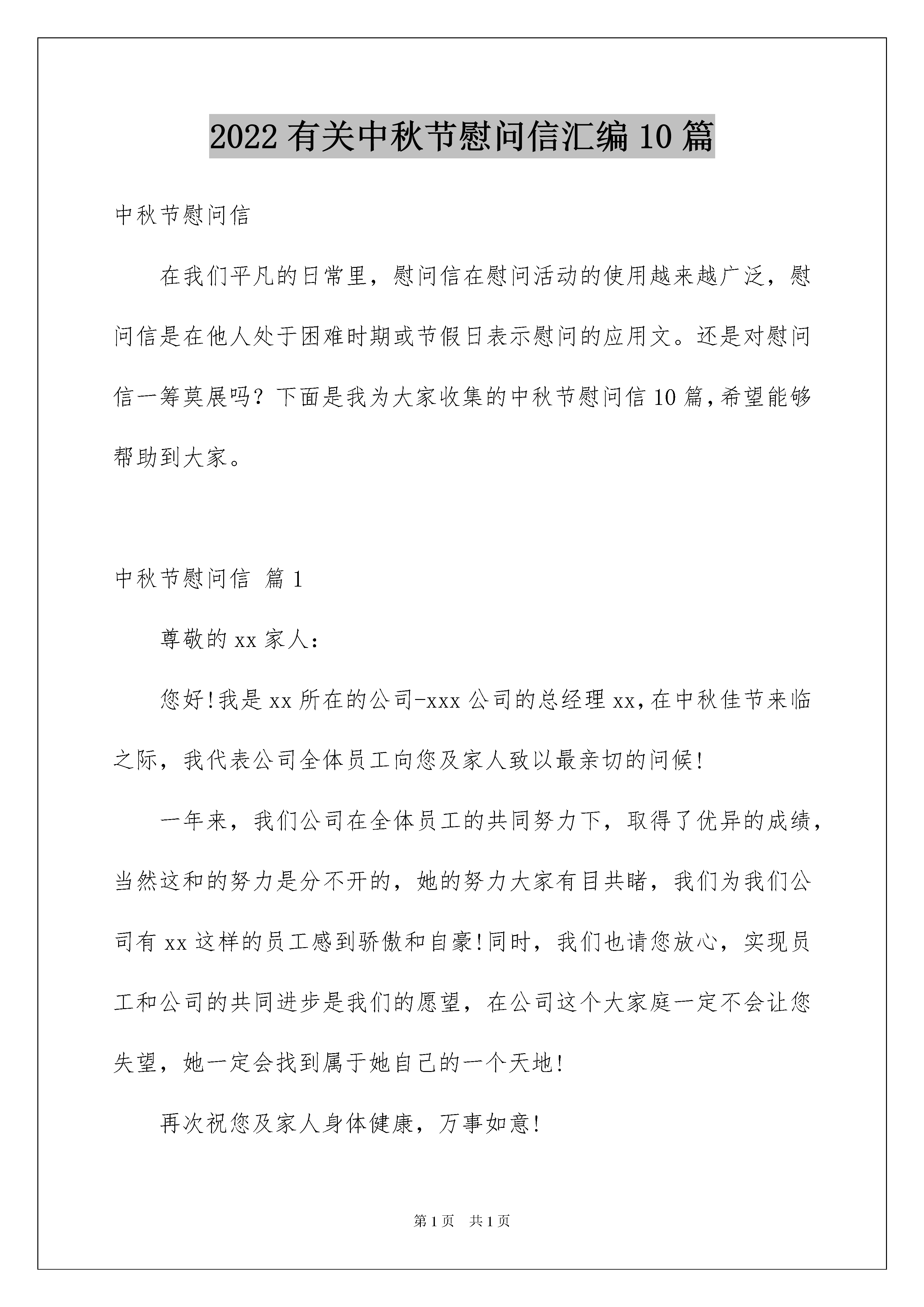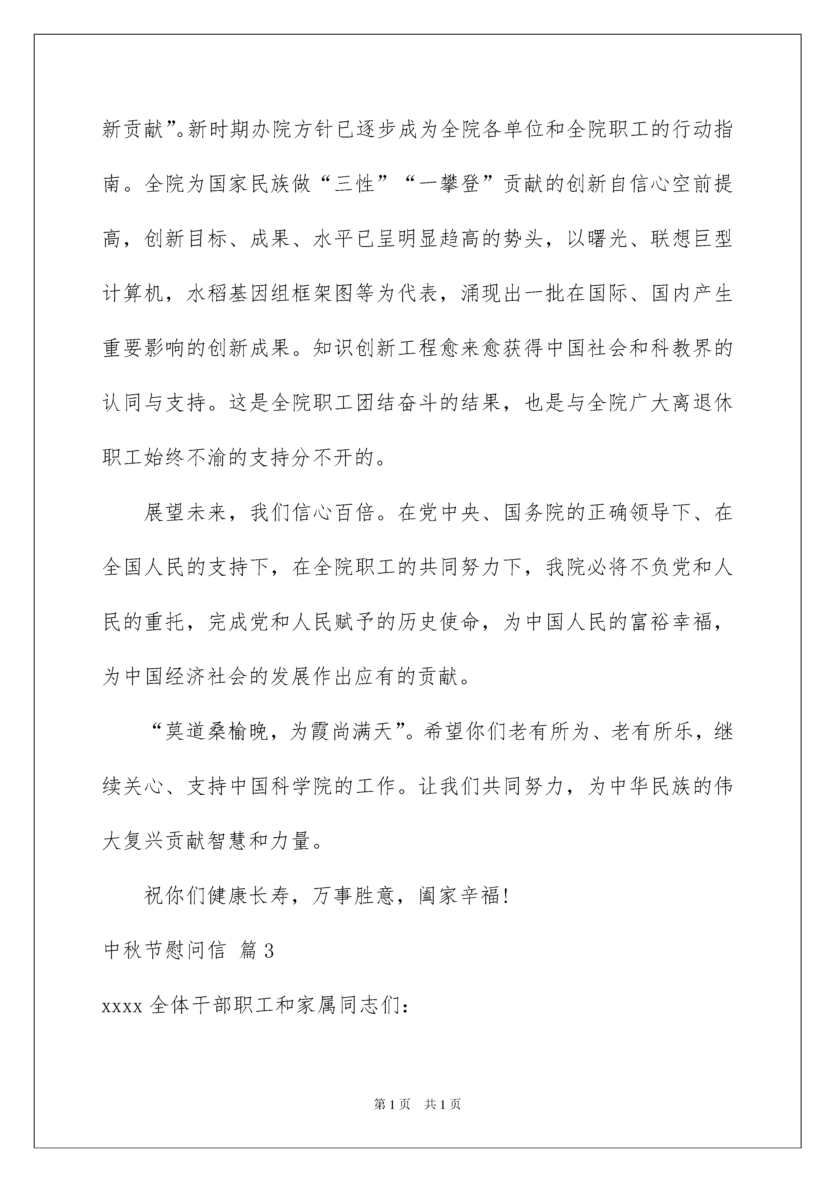 2022有关中秋节慰问信汇编10篇中秋节慰问信在我们平凡的日常里,慰问信在慰问活动的使用越来越广泛,慰问信是在他人处于困难时期或节假日表示慰问的应用文。还是对慰问信一筹莫展吗?下面是我为大家收集的中秋节慰问信10篇,希望能够帮助到大家。中秋节慰问信篇1尊敬的xx家人:您好!我是xx所在的公司-xxx公司的总经理xx,在中秋佳节来临之际,我代表公司全体员工向您及家人致以最亲切的问候!一年来,我们公司在全体员工的共同努力下,取得了优异的成绩,当然这和的努力是分不开的,她的努力大家有目共睹,我们为我们公司有xx这样的员工感到骄傲和自豪!同时,我们也请您放心,实现员工和公司的共同进步是我们的愿望,在公司这个大家庭一定不会让您失望,她一定会找到属于她自己的一个天地!再次祝您及家人身体健康,万事如意!xx有限公司总经理:xx中秋节慰问信篇2全院离退休职工同志们:月缺月圆又一秋。值此中秋佳节即将到来之际,我谨代表院党组和全院广大职工向你们致以节日的祝贺和亲切的问候!回顾过去,你们勤勤恳恳,兢兢业业,无私奉献,把美好的年华、热情和精力都贡献给了中国的科技事业和社会主义建设事业,贡献给了中国科学院。中国科学院的每一个进步无一不凝聚着你们的辛勤劳动和无私奉献。在此,我谨代表院党组向你们表示最诚挚的感谢!19XX年,在党中央、国务院的大力支持下,我院开始实施知识创新工程试点,标志着我院进入一个新的历史发展时期。几年来,知识创新工程试点工作进展顺利,势头良好。面对我国经济社会发展对我院提出的新任务、新要求,今年年初,我们确立了新时期办院方针,即:“面向国家战略需求,面向世界科学前沿,,加强原始科学创新,加强关键技术创新与集成,攀登世界科技高峰,为我国经济建设、国家安全和社会可持续发展不断做出基础性、战略性、前瞻性的重大创新贡献”。新时期办院方针已逐步成为全院各单位和全院职工的行动指南。全院为国家民族做“三性”“一攀登”贡献的创新自信心空前提高,创新目标、成果、水平已呈明显趋高的势头,以曙光、联想巨型计算机,水稻基因组框架图等为代表,涌现出一批在国际、国内产生重要影响的创新成果。知识创新工程愈来愈获得中国社会和科教界的认同与支持。这是全院职工团结奋斗的结果,也是与全院广大离退休职工始终不渝的支持分不开的。展望未来,我们信心百倍。在党中央、国务院的正确领导下、在全国人民的支持下,在全院职工的共同努力下,我院必将不负党和人民的重托,完成党和人民赋予的历史使命,为中国人民的富裕幸福,为中国经济社会的发展作出应有的贡献。“莫道桑榆晚,为霞尚满天”。希望你们老有所为、老有所乐,继续关心、支持中国科学院的工作。让我们共同努力,为中华民族的伟大复兴贡献智慧和力量。祝你们健康长寿,万事胜意,阖家辛福!中秋节慰问信篇3xxxx全体干部职工和家属同志们:金秋送爽,雏菊绽放。至此中秋、国庆“双节”来临之际,我们谨向为了风景事业的兴旺发达,全身心投入工作,在本职岗位上做出贡献的全体干部职工和家属同志们致以亲切的节日慰问和美好的祝愿!xxxx年,我们为了完成滨海路木栈道建设和植物园改造等市政府的惠民工程,舍小家、为大家,把祖国和人民的利益放在首位,把个人的情感深深地埋在心里,带着市政府的重托,带着沉甸甸的社会责任,辛勤工作,兢兢业业,战胜各种困难,揭开了新的发展20xx年中秋节慰问信章。在大家的共同努力下,全处各项工作取得了大发展。人才积聚,人气高涨,我们的每一个进步,都凝聚着大家的智慧和汗水。希望大家进一步增强责任感和使命感,在创造中奋进,在稳定中发展,继续发扬不畏困难,团结进取的精神,保持和发扬高昂的斗志和无私奉献的进取精神,为风景园林处的发展做出更大的努力。但愿人长久,千里共婵娟。让我们将对祖国的爱,对风景园林处的爱播撒在优美的公园景区,奉献给市民和五湖四海的宾朋!祝同志们节日愉快,工作顺利,身体健康!XXX公司20xx年X月X日中秋节慰问信篇4亲爱的员工朋友及家人:你们好!中秋将至,合家团圆,值此佳节之际,我首先代表xxx公司全体员工,向你和家人致以节日的祝福:祝佳节愉快,阖家幸福!我公司正式运营已三年有余,三年时光荏苒,三年里,xxx公司在全体员工的共同努力下,也一步一个脚印,有了长足的发展,我们的业务在稳步攀升,从37米到40米,我们的新项目也将启动正式生产,面对这们生机盎然的发展态势,相信xxx公司每个员工的心里都有无限的欣喜,共同憧憬着xxx公司美好的未来。我公司的成长离不开你的付出,在xxx公司公司过去的一千多个日子里,每一个坚实的脚印里都有你的汗水,你的辛劳、你的努力、你的成绩,在与xxx公司共同走过的