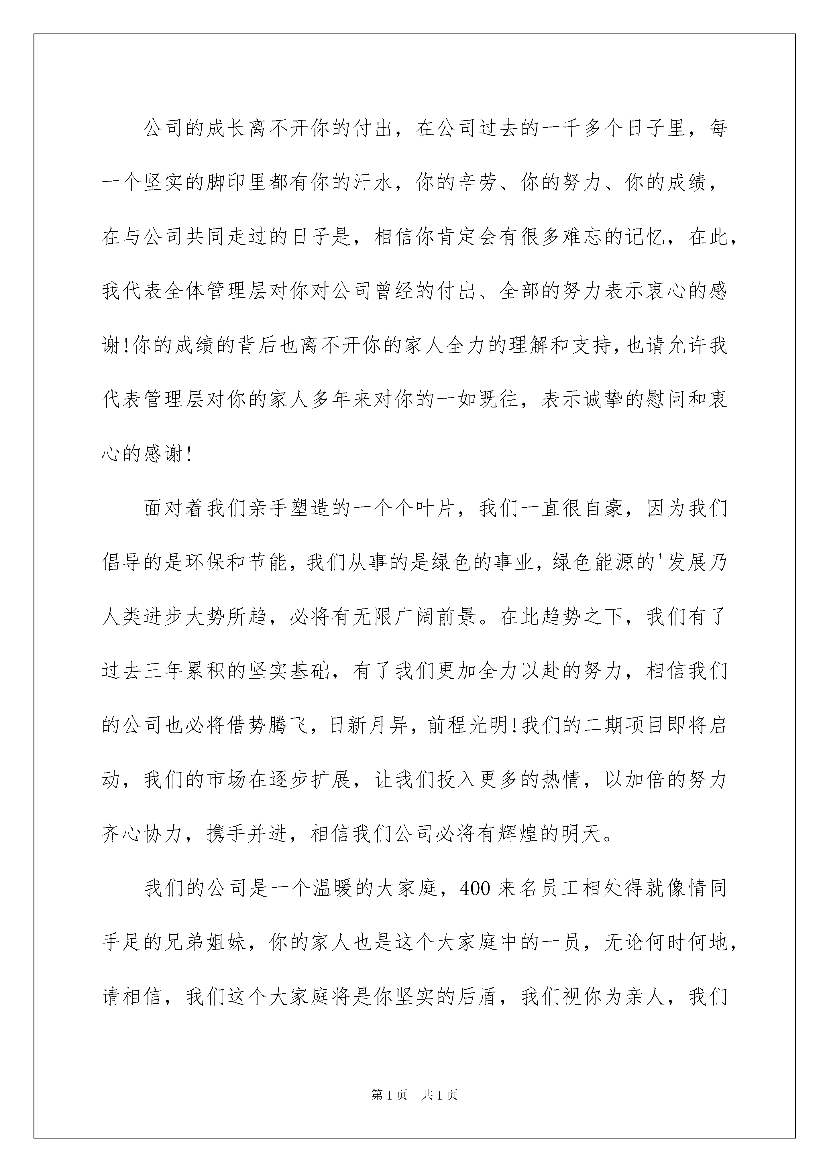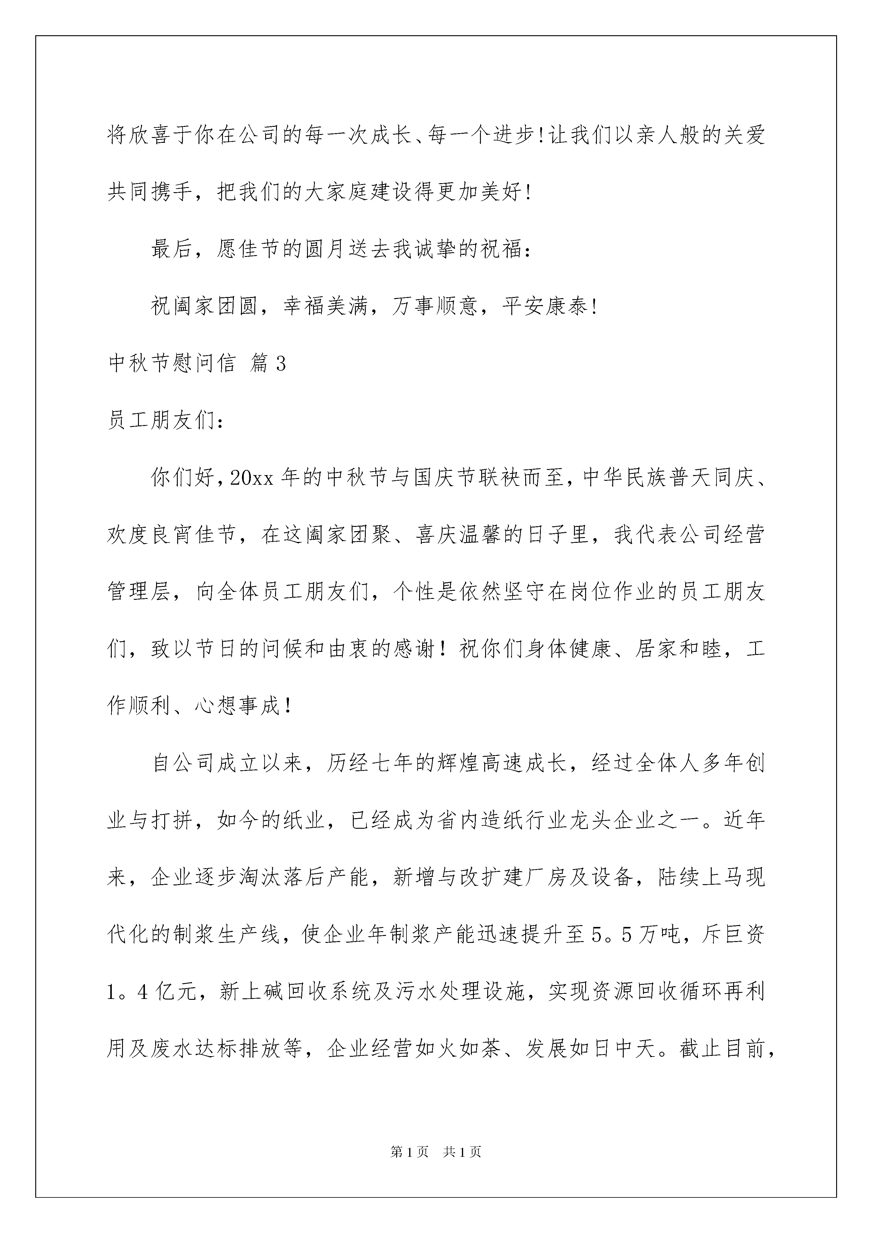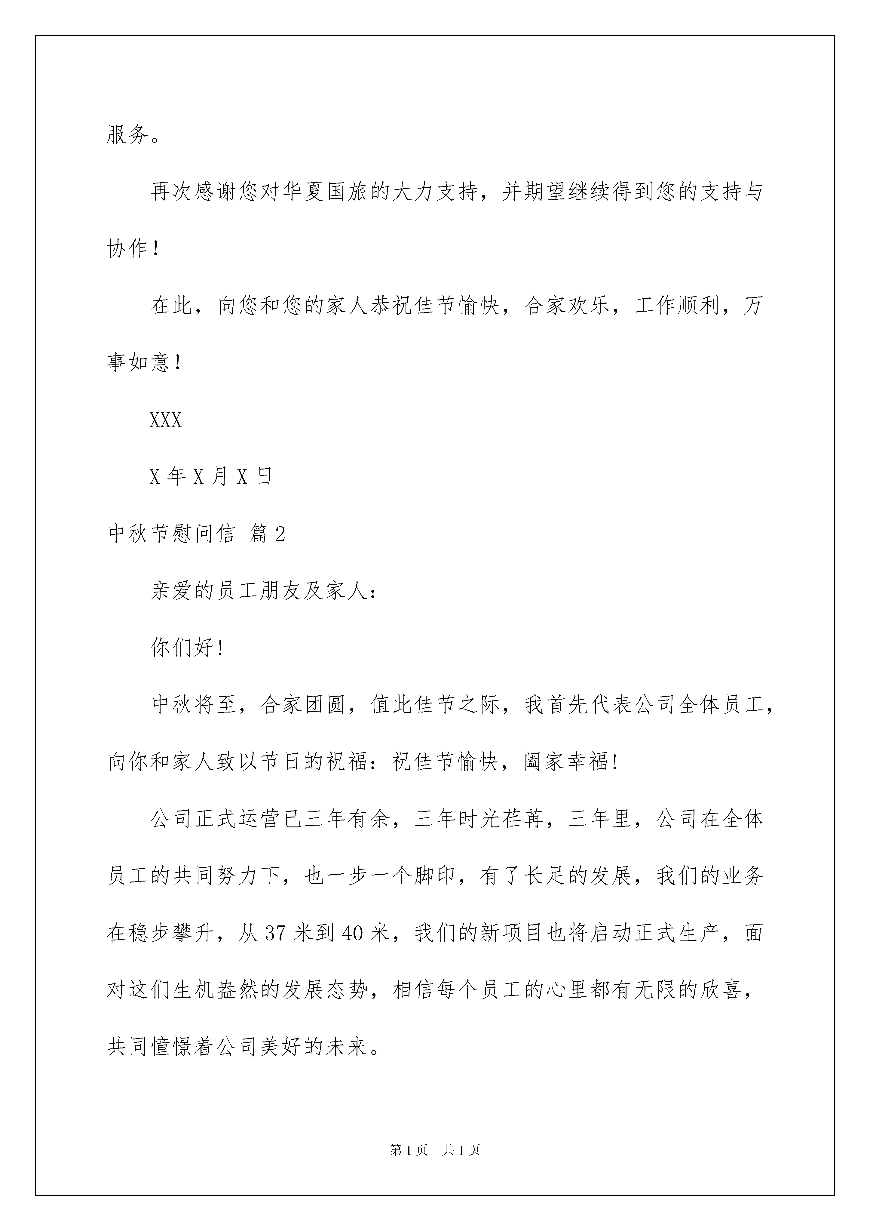 2022有关中秋节慰问信范文汇编六篇有关中秋节慰问信范文汇编六篇在不断进步的时代,我们在许多慰问活动中都可能会用到慰问信,慰问信是在他人处于困难时期或节假日表示慰问的应用文。那么,怎么去写慰问信呢?下面是我为大家收集的中秋节慰问信6篇,希望对大家有所帮助。中秋节慰问信篇1尊敬的客户:值此中秋佳节之际,请接受我们诚挚的祝福和感谢!感谢您一直以来对华夏国旅的支持、鞭策与鼓励!云南华夏国旅成立至今已八年有余,目前在全国直航昆明的30余个城市设立了自己的分公司和旅游营销中心。产品和服务的不断完善与提高,被广大客户所接受认可,这中间有我们华夏国旅全体员工付出的心血,也有您——我们尊敬的客户的一份功劳,您的信任、您的选择、您的理解、您的支持都让我们受益良多。我们将不断地改进和完善服务,加强和提高产品品质,确保为您提供更全面更优质的旅游服务。再次感谢您对华夏国旅的大力支持,并期望继续得到您的支持与协作!在此,向您和您的家人恭祝佳节愉快,合家欢乐,工作顺利,万事如意!XXXX年X月X日中秋节慰问信篇2亲爱的员工朋友及家人:你们好!中秋将至,合家团圆,值此佳节之际,我首先代表公司全体员工,向你和家人致以节日的祝福:祝佳节愉快,阖家幸福!公司正式运营已三年有余,三年时光荏苒,三年里,公司在全体员工的共同努力下,也一步一个脚印,有了长足的发展,我们的业务在稳步攀升,从37米到40米,我们的新项目也将启动正式生产,面对这们生机盎然的发展态势,相信每个员工的心里都有无限的欣喜,共同憧憬着公司美好的未来。公司的成长离不开你的付出,在公司过去的一千多个日子里,每一个坚实的脚印里都有你的汗水,你的辛劳、你的努力、你的成绩,在与公司共同走过的日子是,相信你肯定会有很多难忘的记忆,在此,我代表全体管理层对你对公司曾经的付出、全部的努力表示衷心的感谢!你的成绩的背后也离不开你的家人全力的理解和支持,也请允许我代表管理层对你的家人多年来对你的一如既往,表示诚挚的慰问和衷心的感谢!面对着我们亲手塑造的一个个叶片,我们一直很自豪,因为我们倡导的是环保和节能,我们从事的是绿色的事业,绿色能源的'发展乃人类进步大势所趋,必将有无限广阔前景。在此趋势之下,我们有了过去三年累积的坚实基础,有了我们更加全力以赴的努力,相信我们的公司也必将借势腾飞,日新月异,前程光明!我们的二期项目即将启动,我们的市场在逐步扩展,让我们投入更多的热情,以加倍的努力齐心协力,携手并进,相信我们公司必将有辉煌的明天。我们的公司是一个温暖的大家庭,400来名员工相处得就像情同手足的兄弟姐妹,你的家人也是这个大家庭中的一员,无论何时何地,请相信,我们这个大家庭将是你坚实的后盾,我们视你为亲人,我们将欣喜于你在公司的每一次成长、每一个进步!让我们以亲人般的关爱共同携手,把我们的大家庭建设得更加美好!最后,愿佳节的圆月送去我诚挚的祝福:祝阖家团圆,幸福美满,万事顺意,平安康泰!中秋节慰问信篇3员工朋友们:你们好,20xx年的中秋节与国庆节联袂而至,中华民族普天同庆、欢度良宵佳节,在这阖家团聚、喜庆温馨的日子里,我代表公司经营管理层,向全体员工朋友们,个性是依然坚守在岗位作业的员工朋友们,致以节日的问候和由衷的感谢!祝你们身体健康、居家和睦,工作顺利、心想事成!自公司成立以来,历经七年的辉煌高速成长,经过全体人多年创业与打拼,如今的纸业,已经成为省内造纸行业龙头企业之一。近年来,企业逐步淘汰落后产能,新增与改扩建厂房及设备,陆续上马现代化的制浆生产线,使企业年制浆产能迅速提升至5。5万吨,斥巨资1。4亿元,新上碱回收系统及污水处理设施,实现资源回收循环再利用及废水达标排放等,企业经营如火如荼、发展如日中天。截止目前,企业资产总额约2。8亿元,累计实现产值约8亿元,年吸纳安置就业近百人次,并有力拉动周边农业、交通、能源、消费品等行业企业快速发展,为驻地经济繁荣及社会和谐稳定做出应有的贡献。同时企业文化不断深入,标准化管理体系逐渐完善,销售布局网络稳步开拓,人才集聚、士气高涨……而取得这样的成果是大家共同努力、以及全体员工家属们的倾力支持才得以实现,纸业的成长历程,每一步都凝结着大家的智慧和汗水,在此真诚的向您们道一声“多谢!”在前进的道路上,不可能没有挫折,磨难是人生宝贵的财富,更是成就企业卓越发展的有利契机。在20xx年上半年里,受国际金融危机及国内经济下滑影响,国内各行各业均不一样程度表现出经济萎靡之势,制造业、地产业及能源业等均面临着严峻的考验。自年初以来,造纸行业受到的波及影响很大,已知周边部分造纸企业已经减停产,从当前经济走势分析决定,可能会在一段