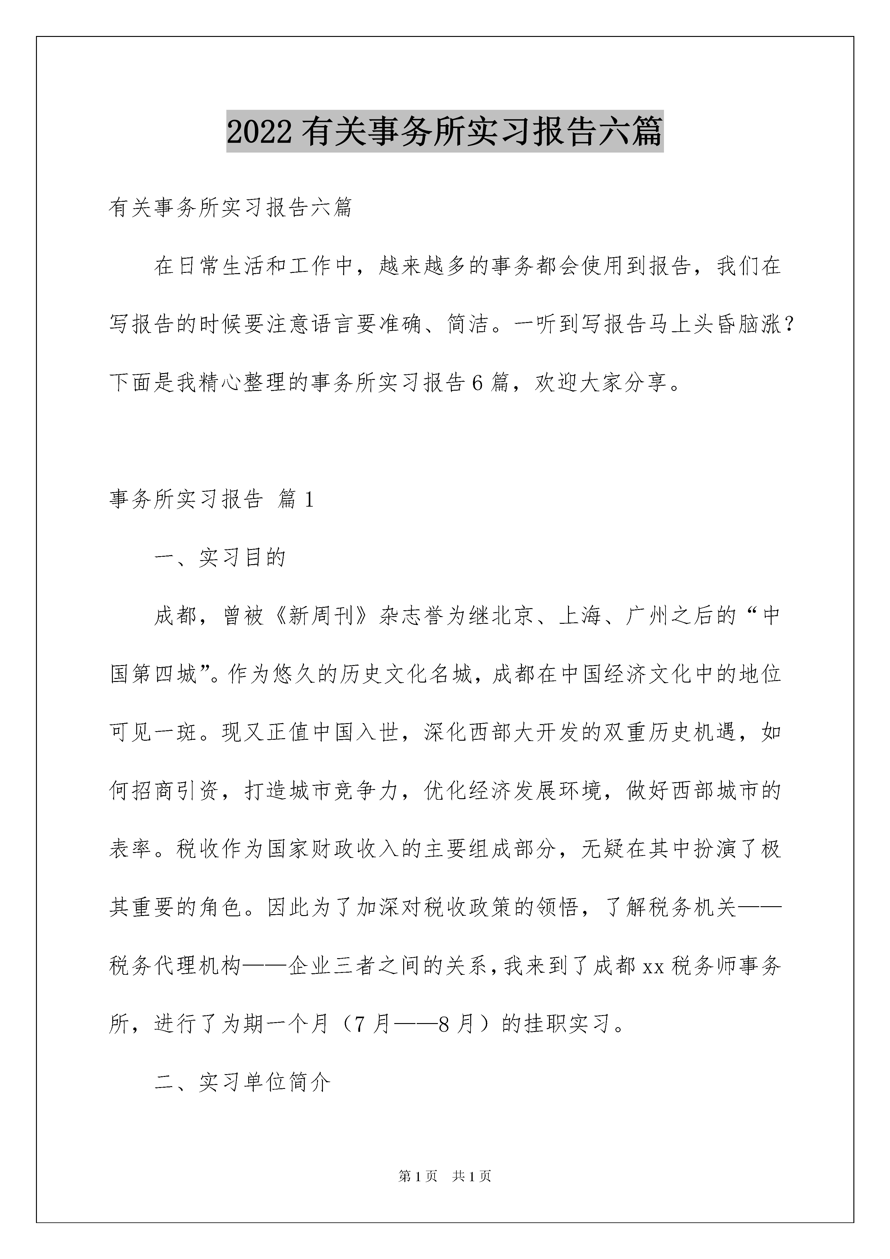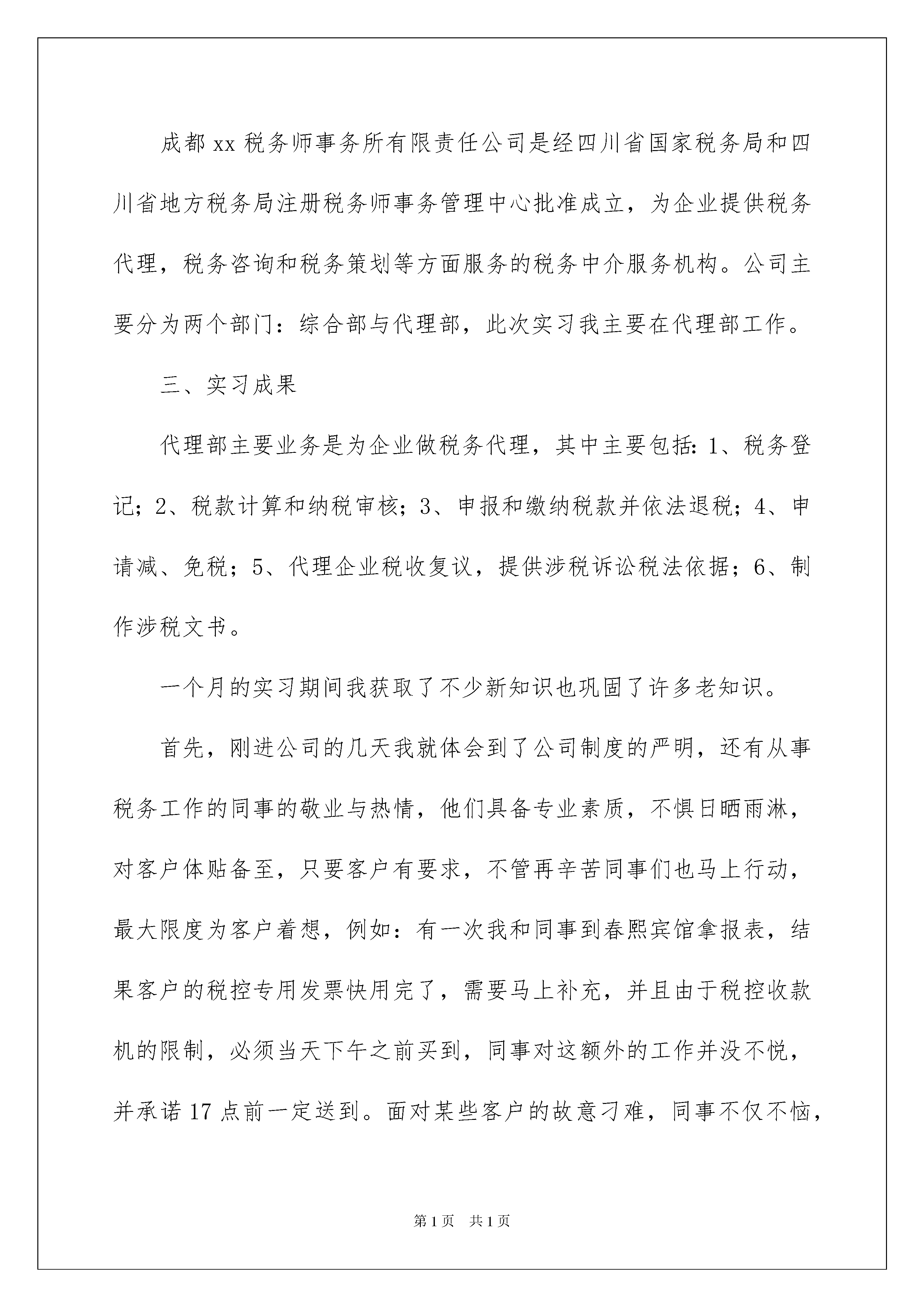 2022有关事务所实习报告六篇有关事务所实习报告六篇在日常生活和工作中,越来越多的事务都会使用到报告,我们在写报告的时候要注意语言要准确、简洁。一听到写报告马上头昏脑涨?下面是我精心整理的事务所实习报告6篇,欢迎大家分享。事务所实习报告篇1一、实习目的成都,曾被《新周刊》杂志誉为继北京、上海、广州之后的“中国第四城”。作为悠久的历史文化名城,成都在中国经济文化中的地位可见一斑。现又正值中国入世,深化西部大开发的双重历史机遇,如何招商引资,打造城市竞争力,优化经济发展环境,做好西部城市的表率。税收作为国家财政收入的主要组成部分,无疑在其中扮演了极其重要的角色。因此为了加深对税收政策的领悟,了解税务机关——税务代理机构——企业三者之间的关系,我来到了成都xx税务师事务所,进行了为期一个月(7月——8月)的挂职实习。二、实习单位简介成都xx税务师事务所有限责任公司是经四川省国家税务局和四川省地方税务局注册税务师事务管理中心批准成立,为企业提供税务代理,税务咨询和税务策划等方面服务的税务中介服务机构。公司主要分为两个部门:综合部与代理部,此次实习我主要在代理部工作。三、实习成果代理部主要业务是为企业做税务代理,其中主要包括:1、税务登记;2、税款计算和纳税审核;3、申报和缴纳税款并依法退税;4、申请减、免税;5、代理企业税收复议,提供涉税诉讼税法依据;6、制作涉税文书。一个月的实习期间我获取了不少新知识也巩固了许多老知识。首先,刚进公司的几天我就体会到了公司制度的严明,还有从事税务工作的同事的敬业与热情,他们具备专业素质,不惧日晒雨淋,对客户体贴备至,只要客户有要求,不管再辛苦同事们也马上行动,最大限度为客户着想,例如:有一次我和同事到春熙宾馆拿报表,结果客户的税控专用发票快用完了,需要马上补充,并且由于税控收款机的限制,必须当天下午之前买到,同事对这额外的工作并没不悦,并承诺17点前一定送到。面对某些客户的故意刁难,同事不仅不恼,而且笑面相对耐心的解开他们的疑惑。例如:成都市政府就安置残疾人员下达了一号政令,这本一项是造福残疾人同志的很好政策,体现了社会主义国家的优越性。但是,当同事们把文件和相关资料送达企业手中时,企业却认为,是政府有意借此增加他们的税赋,十分不理解,同事们面对企业的刁难,并不是一问三不知,也不是有意推卸,而是耐心的向企业解释,对企业做工作,使很多企业最终明白了政府的用心良苦。其次,纳税的申报期决定了代理部业务期的特点。每月的1号到10号是企业纳税申报期,因此这段时间的代理部的业务也是最繁忙的,此后的一段时期,时间就相对宽松些,同事们就可以利用这段时间来为自己“充电”,在所订的资料中,我能学到很多知识,尤其是《成都税务公报》这份杂志是由成都市地方税务局主办的,其中,“在税法公告”栏中,我能了解到最新的税务政策,例如,《成都市地方税务局关于开展落实下岗职工再就业税收优惠政策检查的通知》“依法治税”栏中我能了解到不法企业为了偷逃纳税所采用的各式花招,但是,魔高一尺道高一丈,恢恢法网,总是能将其一网打尽;“征管天地”栏是我最喜欢的,它通过一些具体实例,来告诉我们一个税种的征管,并且对一些特例也有说明。比如,我对个人所得税的征管,原来就只知道工资,薪金所得,税法规定以每月收入额除去费用800元后的余额为应纳税所得额,但是实际上考虑到不属于工资,薪金性质的补贴,津贴收入,不征税,要从个人所得税扣除,为便于计算,对不征税的项目从总的所得中扣除200元,加上税法规定扣除标准800元,故在实际操作中按1000元/月的定额标准进行扣除,所以工资,薪金应纳税所得=(月收入额-1000)?适用税率-速算扣除数。四、实习总结在大家的帮助和学习下,我慢慢的学会了那些从未接触的东西:贴凭证和装订凭证,是我在会计部学到的第一样东西,很多人觉得贴凭证很烦很无聊,但是我习惯边贴凭证别细看凭证是怎么录的,还可以熟悉一下各种各样的发票,所以这算是我最喜欢做的事情之一了。以前在学习的时候,知道增值税发票有专用和普通之分,在贴凭证的时候总算是真实看到了。而且,当你把凭证打印出来,然后整理粘贴整齐到最后的装订成册,一本本整齐的凭证会带给你小小的喜悦和成就感。固定资产折旧,做固定资产折旧表,首先要确定使用的折旧方法,而本月计提折旧,需要重新计算一遍每一项固定资产的残值、月折旧额、本月累计折旧额和净值,以此检查过往固定资产折旧表是否正确无误。做出本月的固定资产折旧表,填制相关会计分录。同时也要在用友u8中检查账上每一项固定资产累计折旧和月折旧额与固定资产累计折旧表上的本月累计折旧和月折旧额是否一致。银行余额
