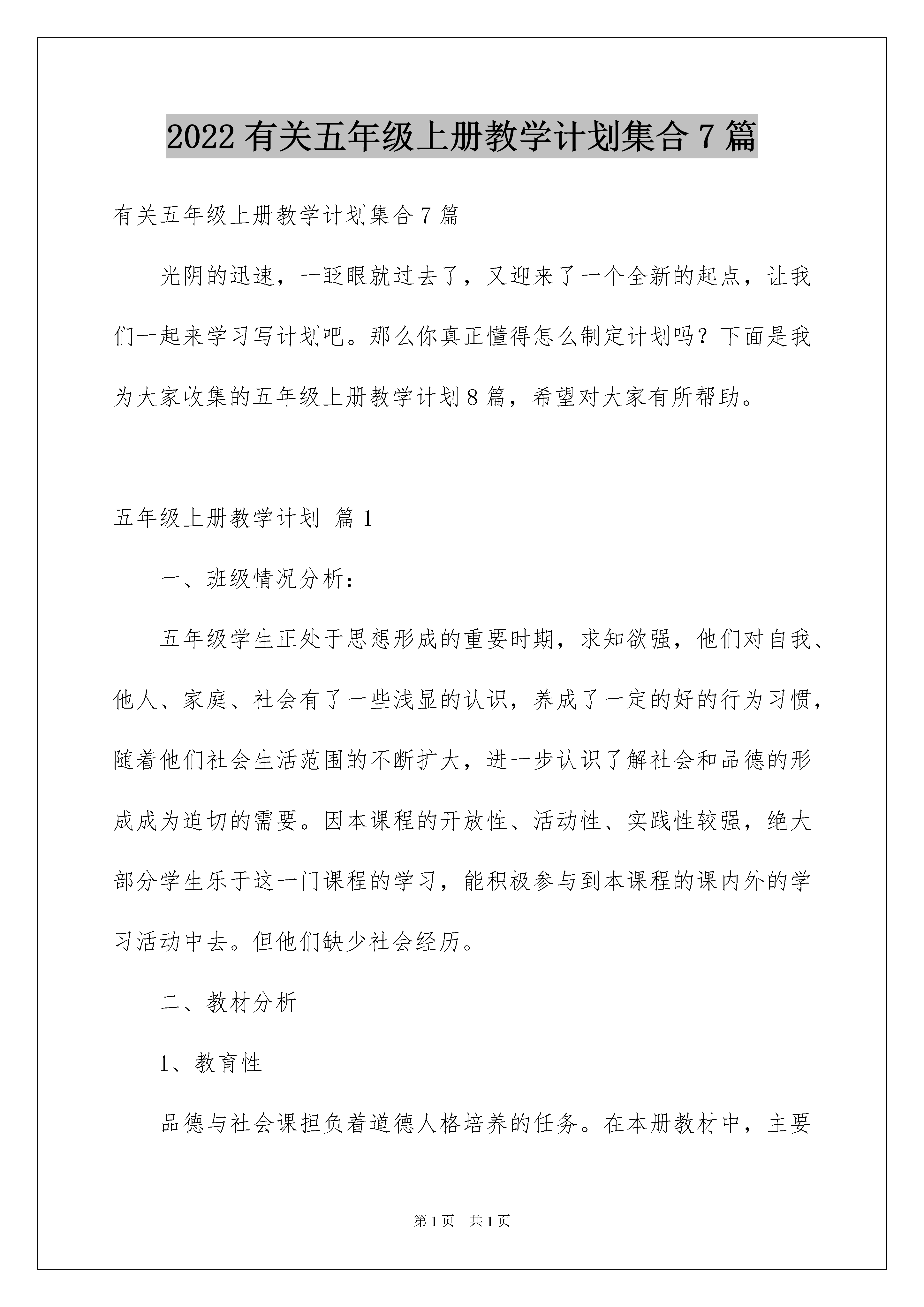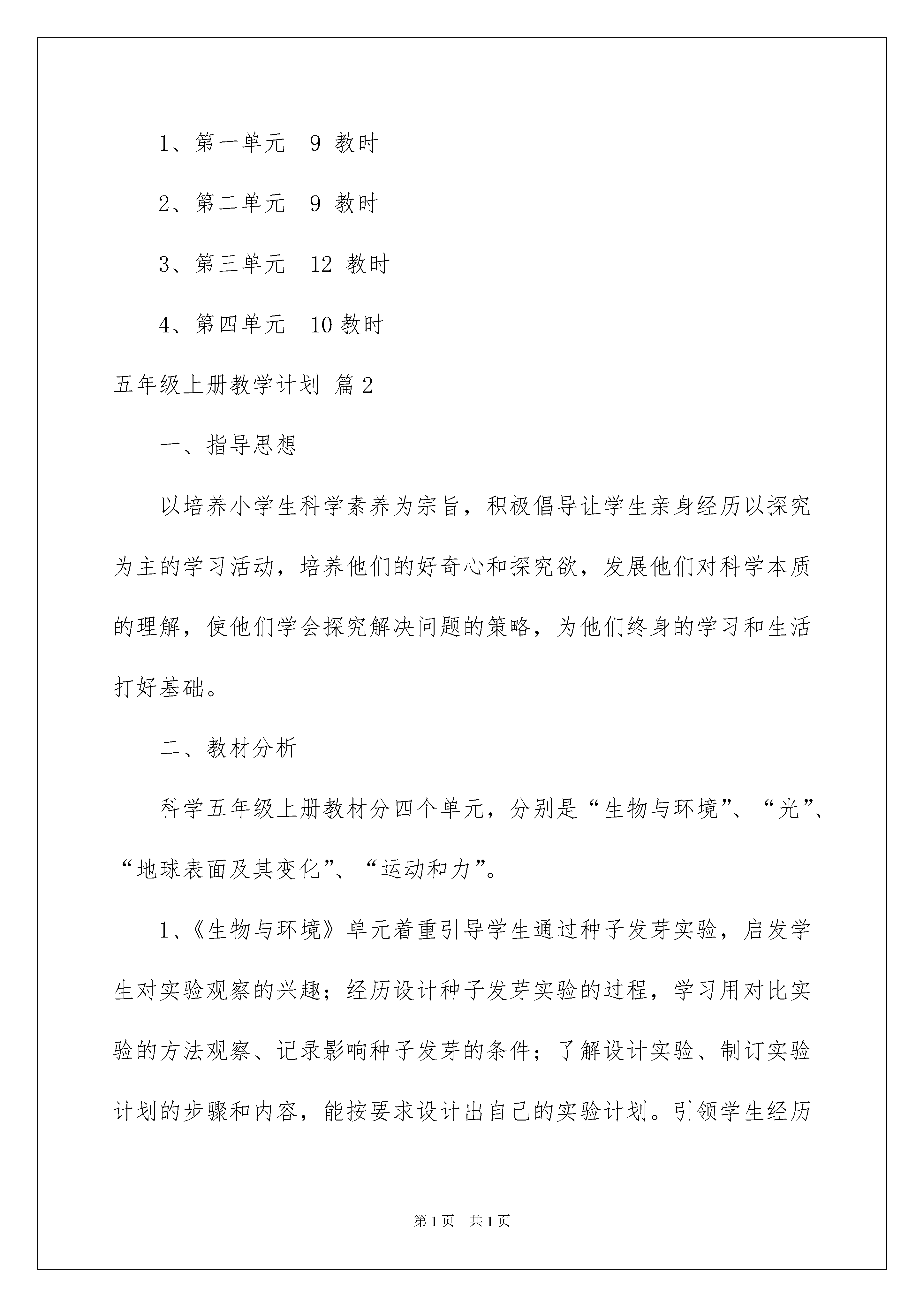 2022有关五年级上册教学计划集合7篇有关五年级上册教学计划集合7篇光阴的迅速,一眨眼就过去了,又迎来了一个全新的起点,让我们一起来学习写计划吧。那么你真正懂得怎么制定计划吗?下面是我为大家收集的五年级上册教学计划8篇,希望对大家有所帮助。五年级上册教学计划篇1一、班级情况分析:五年级学生正处于思想形成的重要时期,求知欲强,他们对自我、他人、家庭、社会有了一些浅显的认识,养成了一定的好的行为习惯,随着他们社会生活范围的不断扩大,进一步认识了解社会和品德的形成成为迫切的需要。因本课程的开放性、活动性、实践性较强,绝大部分学生乐于这一门课程的学习,能积极参与到本课程的课内外的学习活动中去。但他们缺少社会经历。二、教材分析1、教育性品德与社会课担负着道德人格培养的任务。在本册教材中,主要进行以下方面内容的教育:以多种形式促进这两个我的对话,引导儿童逐步完成两个“自我”的分化;向儿童呈现他们生活中的各种关系,让他们从这种关系中去理解和体验,引导儿童逐步建构起共生型的人格;通过历史与文化的启蒙,对学生进行热爱祖国的教育,引发学生对祖国的认同感、归属感等等。2、综合性本册教材几乎涵盖思想品德、历史、地理、社会等多方面的内容。所有这些内容都是通过“个人——人与人——人与社会”这条主线来串联的,使之形成一个完整的教学线索。3、参与性为了使学生能真正体味到教材所要表达的思想、观点,就需要为学生提供自己亲自参与、亲身体验的机会,本册教材中设计了大量的问题、案例,让学生参与,让学生仿佛置身于真实的社会场景中,通过学生与家庭、学生与学校、学生与社会生活中的具体事例以及对这些事例的认识与实践来提高自己,完善自己。4、直观性本册教材呈现的是一页页文字与画面有机融合的版面,力图通过各种精选的图画、照片、示意图、地图和表格等,来最大程度地阐述教材所要反映的思想、意图。例如第四单元《我们都是炎黄子孙》,根据五年级学生的年龄特点,在文字的基础上,安排了大量的插图,这些插图,已不再仅仅是一些图画,还有示意图和大量的照片,通过这些插图,不仅增加了历史审美感和历史直观性。也帮助学生能够更好地理解本单元的内容。从而达到品德与社会课程所要达到的教学目的。三、教学目标:1、引导学生走进家庭深处,走进父母的内心世界。2、引导儿童进入公共生活,探索中国公民教育的范式。3、呈现历史的“人化”,引导儿童走进历史。4、引导儿童逐步完成两个自我的分化。5、引导儿童逐步建构起共生型的人格。6、通过历史与文化的启蒙引发对祖国的认同感、归属感。四、教材重点难点重点:“走出深重的历史灾难”这一教育主题是本册教材的重难点,本学期在本课程中出现与原有历史教材设计有很大的区别,注重呈现历史细节,让历史人站在儿童面前,与儿童对话,本主题旨在引领儿童从自己的现实生活中走近历史,在自己生活中找到历史文化的足迹,引起他们与之交往的愿望和冲动,表现出对祖国地理、历史发展状况的尊重、关注,并引以为光荣和骄傲。五、教学措施1、力求突破知识单一的传统模式,注重促进学生的情感、态度、价值观、能力、知识在相互联系中得到和谐发展,以较好地落实“三维”目标。2.根据本校的实际和学生的实际生活,加强课程资源的开发,提高教育的针对性、实效性。3.进一步加强本课程开放式教学方式的课题研究,通过艺术、活动等多种形式对学生进行情景教育。培养学生明辨是非的能力。4.通过书面、口头调查的方式,了解学生的内心世界。5、为了使学生真正体味本课程所要达到的教育目标,就力求尽可能提供学生参与、亲身体验的机会。六、课时安排每周两课,其间也可安排一些劳动、参观、调查等实践活动。七、本册教学时间安排1、第一单元9教时2、第二单元9教时3、第三单元12教时4、第四单元10教时五年级上册教学计划篇2一、指导思想以培养小学生科学素养为宗旨,积极倡导让学生亲身经历以探究为主的学习活动,培养他们的好奇心和探究欲,发展他们对科学本质的理解,使他们学会探究解决问题的策略,为他们终身的学习和生活打好基础。二、教材分析科学五年级上册教材分四个单元,分别是“生物与环境”、“光”、“地球表面及其变化”、“运动和力”。1、《生物与环境》单元着重引导学生通过种子发芽实验,启发学生对实验观察的兴趣;经历设计种子发芽实验的过程,学习用对比实验的方法观察、记录影响种子发芽的条件;了解设计实验、制订实验计划的步骤和内容,能按要求设计出自己的实验计划。引领学生经历一些有目的的调查、考察活动,在活动的基础上进行科学推理,进一步体验生物与环境之间的关系,认识生物与生物之间是相互依存、相互作用和相互制约的,特别是认识到一种动物或植物可能